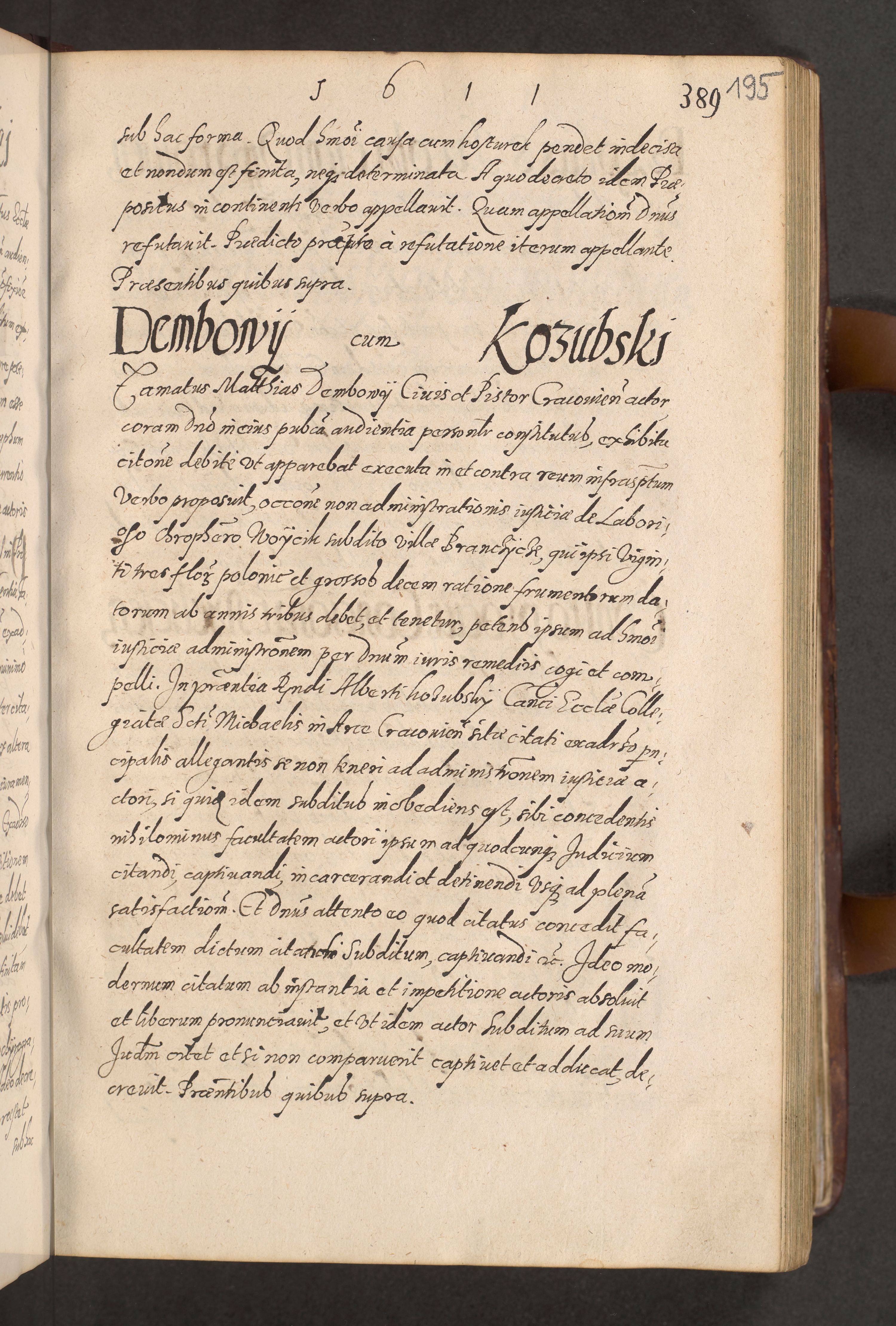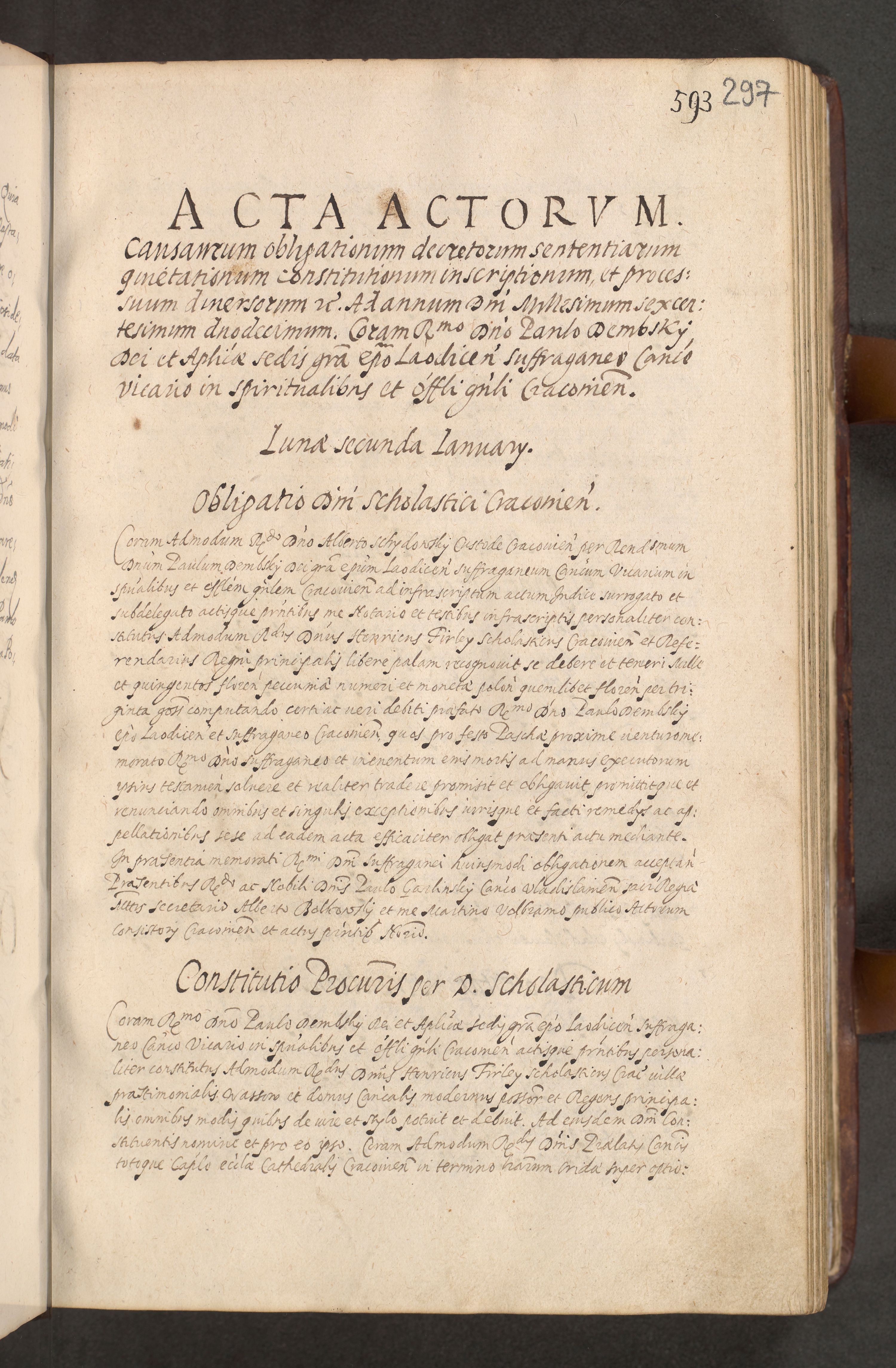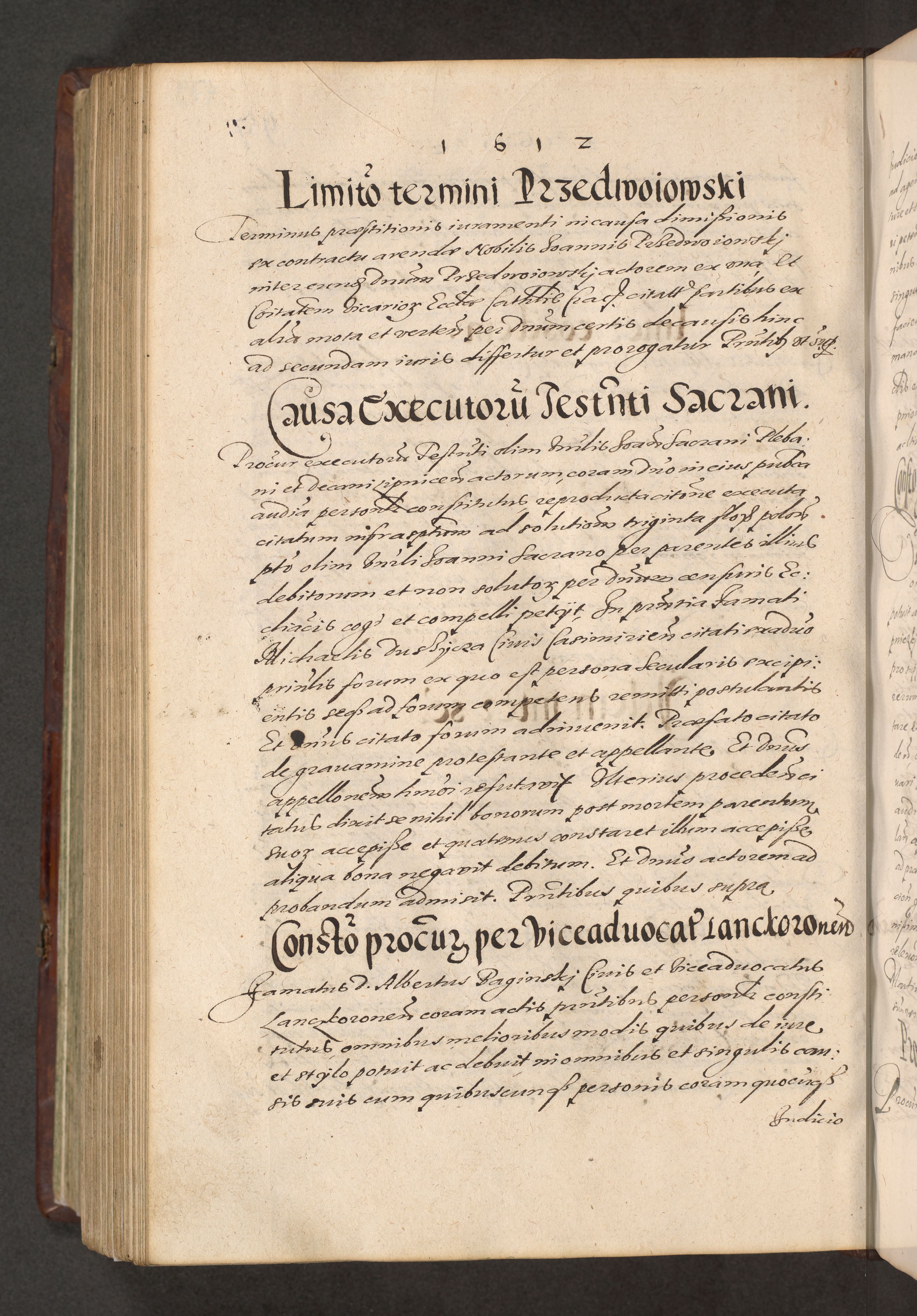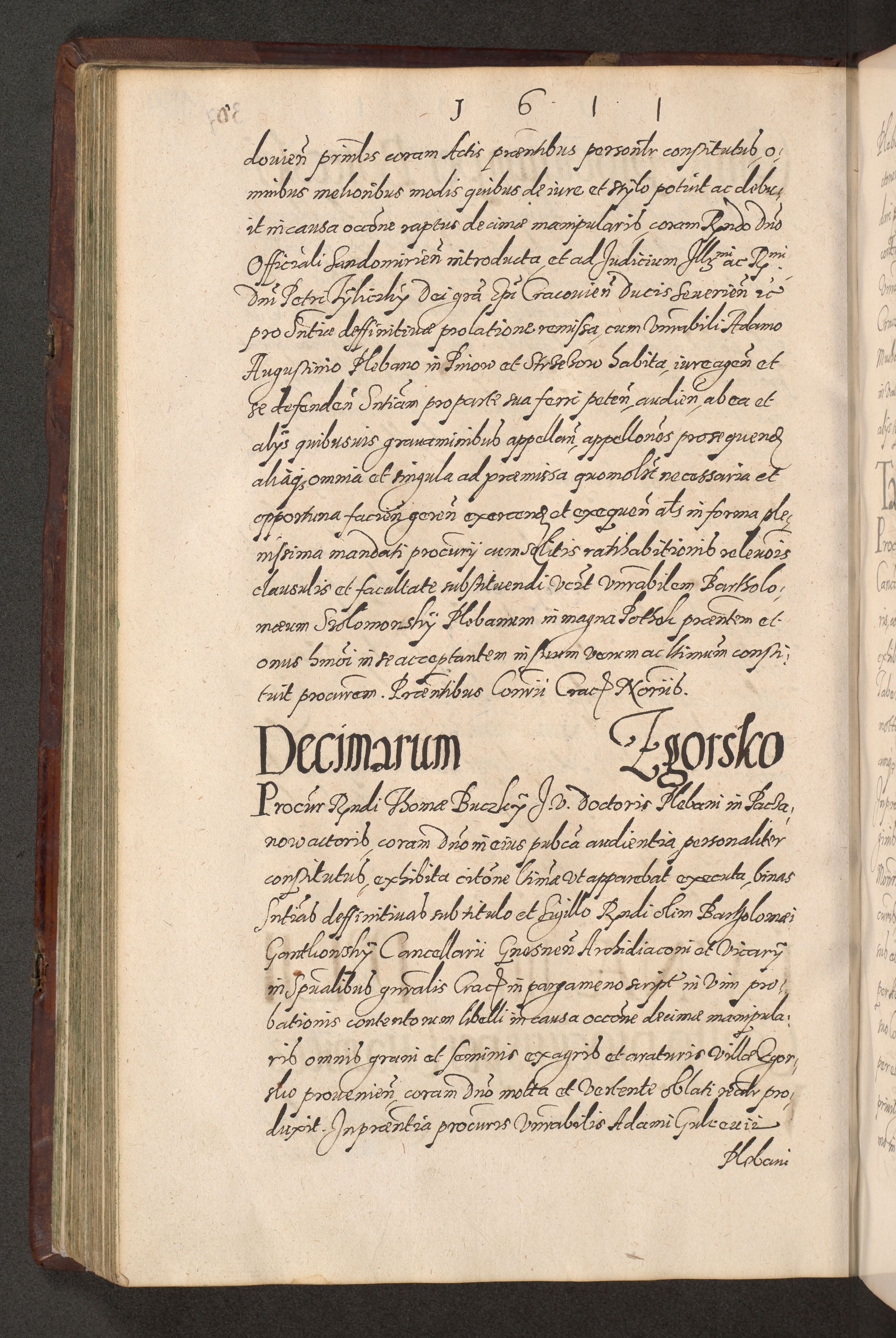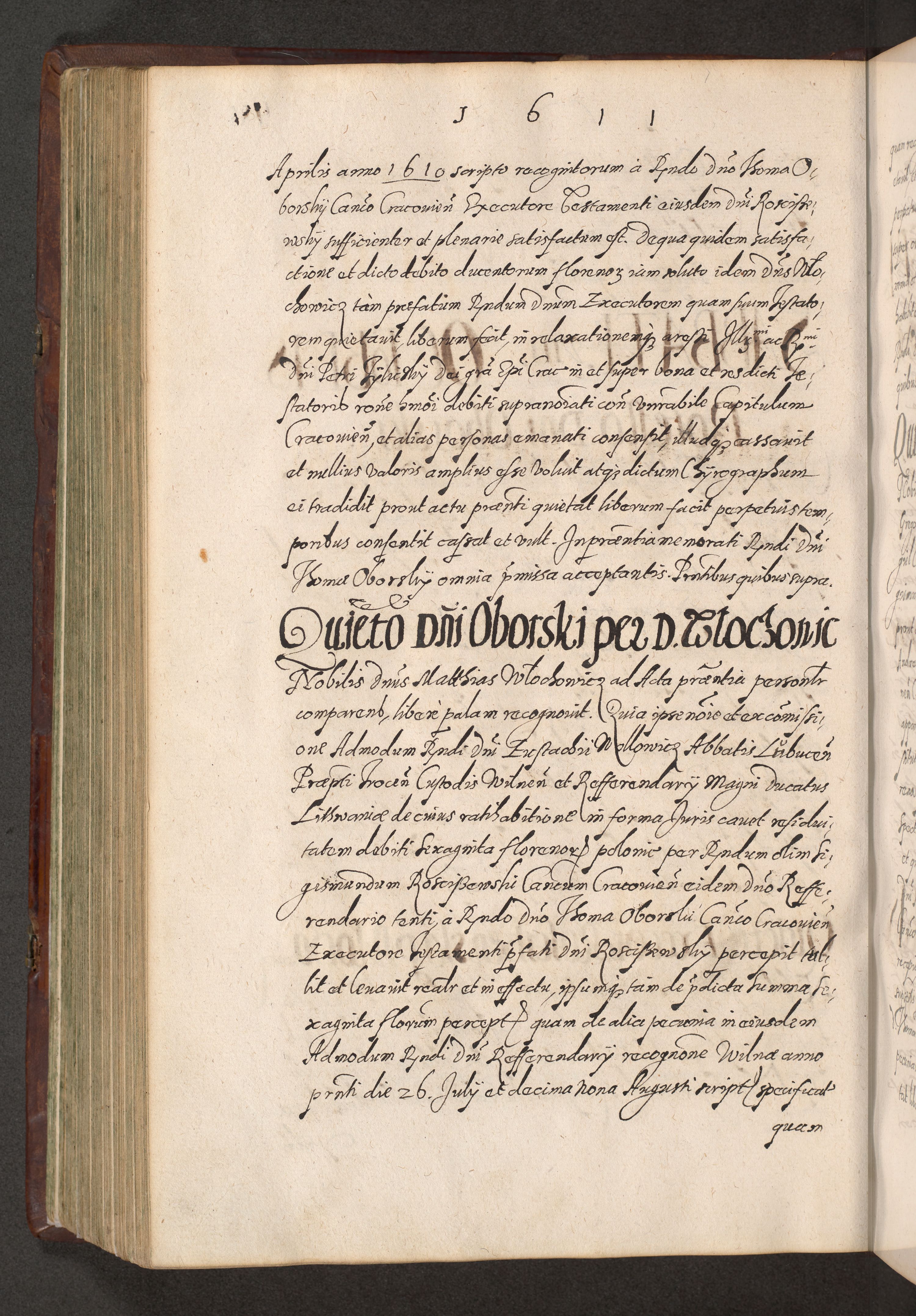 Acta actorum causarum sententiarum tam diffinitiuarum quam interloquutorisrum decretorum obligationum quietationum procuratorum constitutionum etc. etc. coram Reverendo Domino Paulo Dembski Dei et Apostolice Sedis Gratia Episcopalo Dicensis Suffraganeo Canonico Vicario in Spiritualibus et Officiali Generali Cracoviensis ad Annum Domini Millesimum Sexcentesimum Undecimum cuius indictio octava pontificatus Sanctissimi Domini Nostri Domini Pauli Divina Providentia Papae Vti foeliciter continuantur