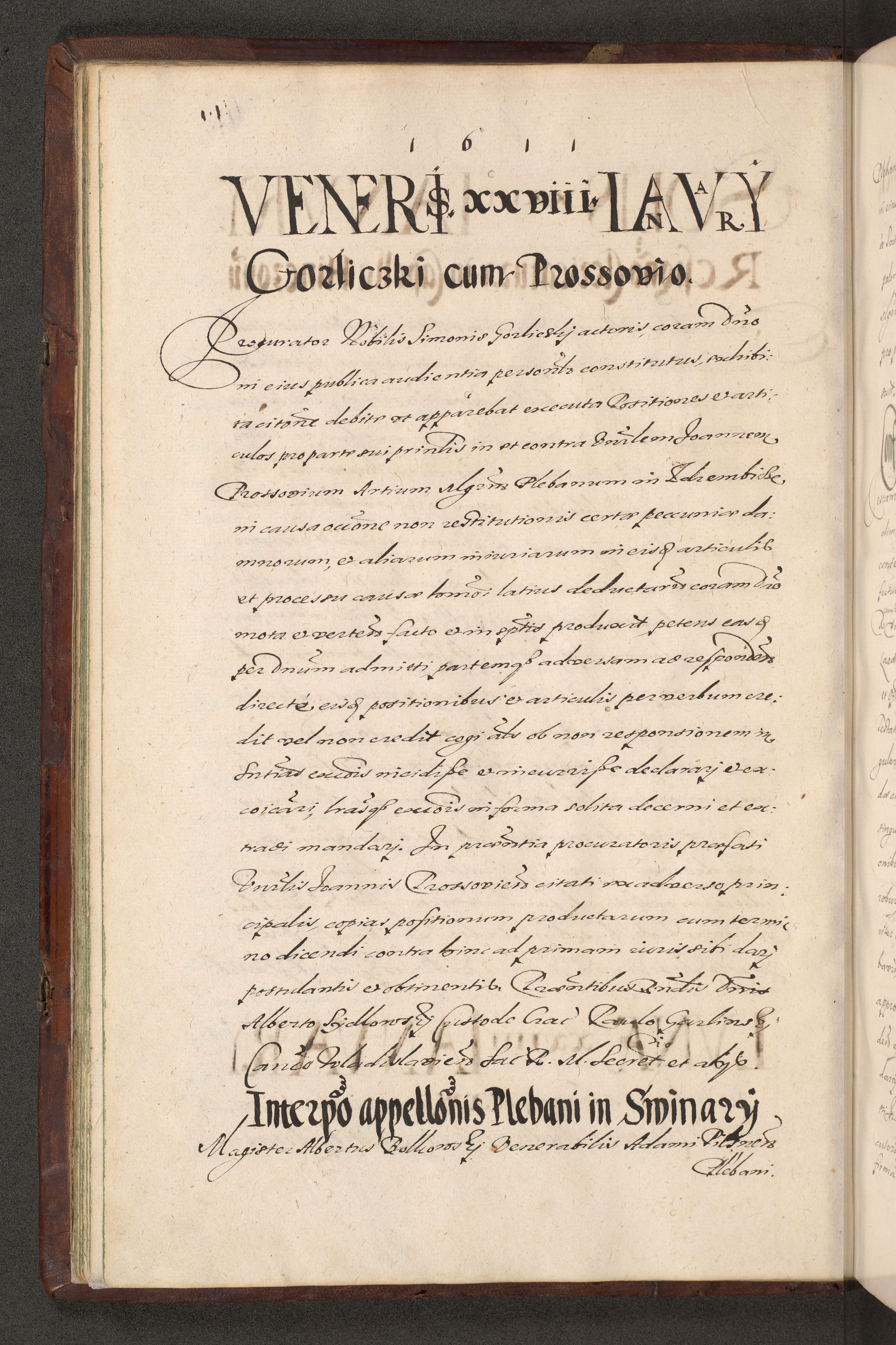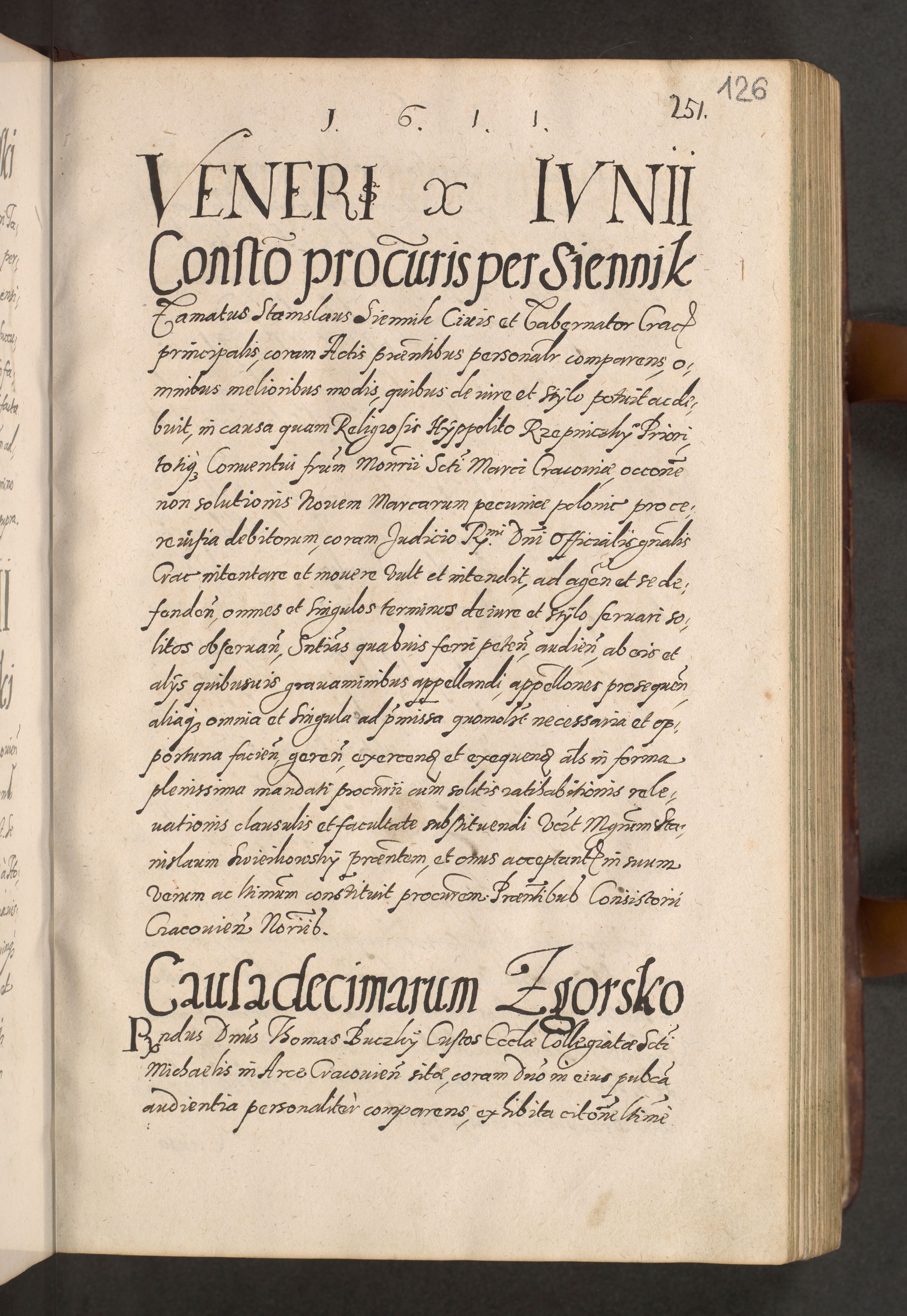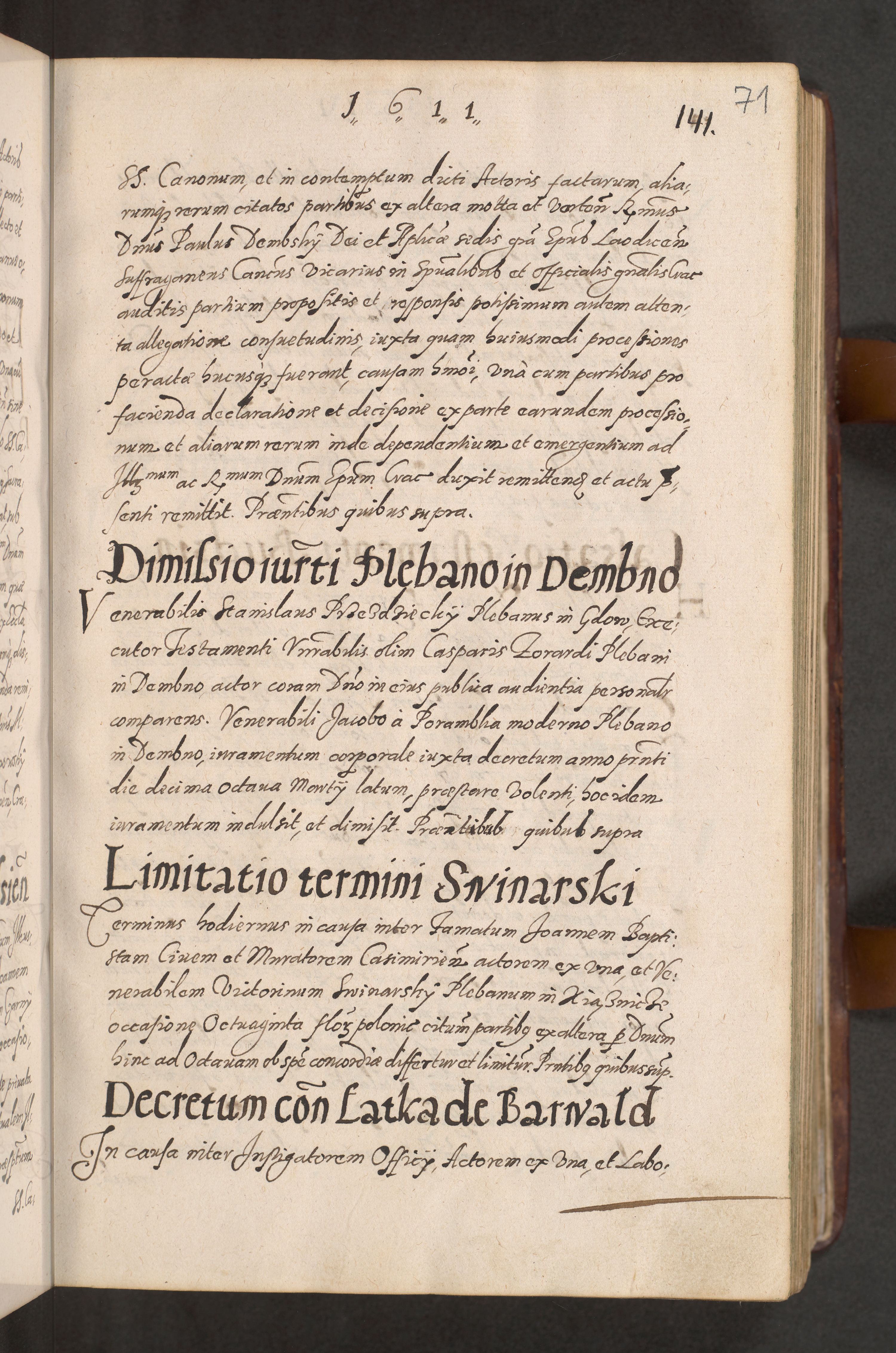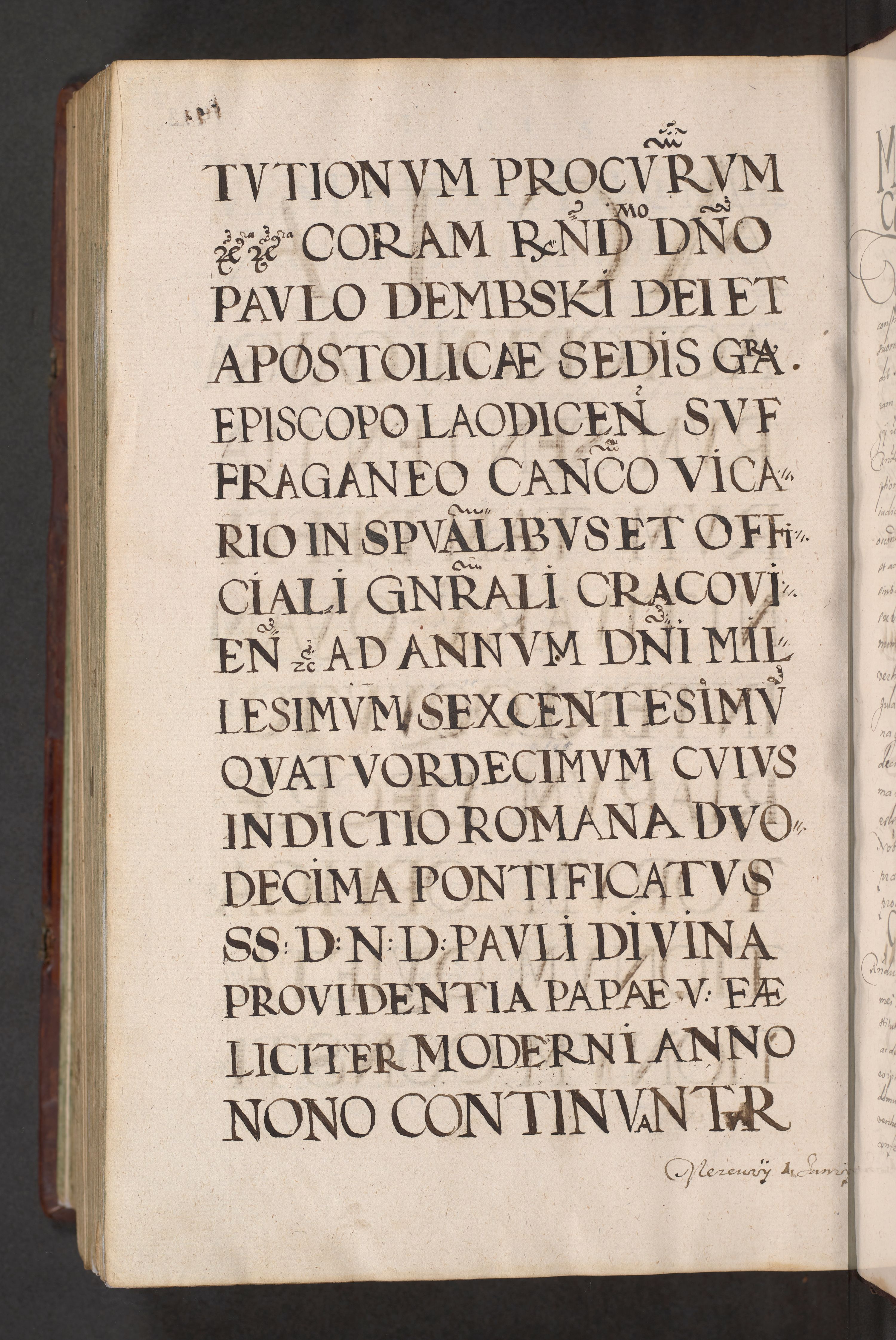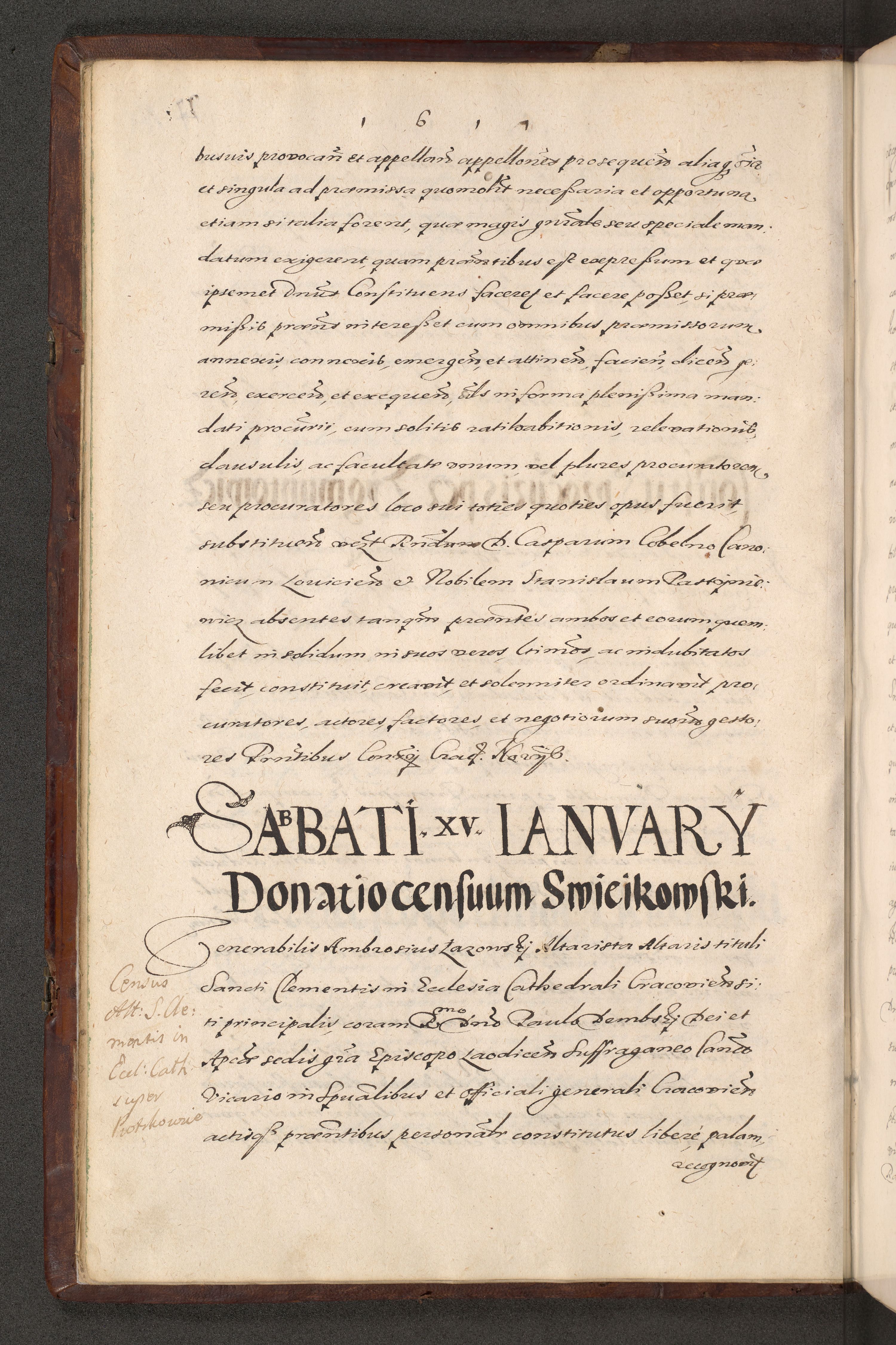 Acta actorum causarum sententiarum tam diffinitiuarum quam interloquutorisrum decretorum obligationum quietationum procuratorum constitutionum etc. etc. coram Reverendo Domino Paulo Dembski Dei et Apostolice Sedis Gratia Episcopalo Dicensis Suffraganeo Canonico Vicario in Spiritualibus et Officiali Generali Cracoviensis ad Annum Domini Millesimum Sexcentesimum Undecimum cuius indictio octava pontificatus Sanctissimi Domini Nostri Domini Pauli Divina Providentia Papae Vti foeliciter continuantur