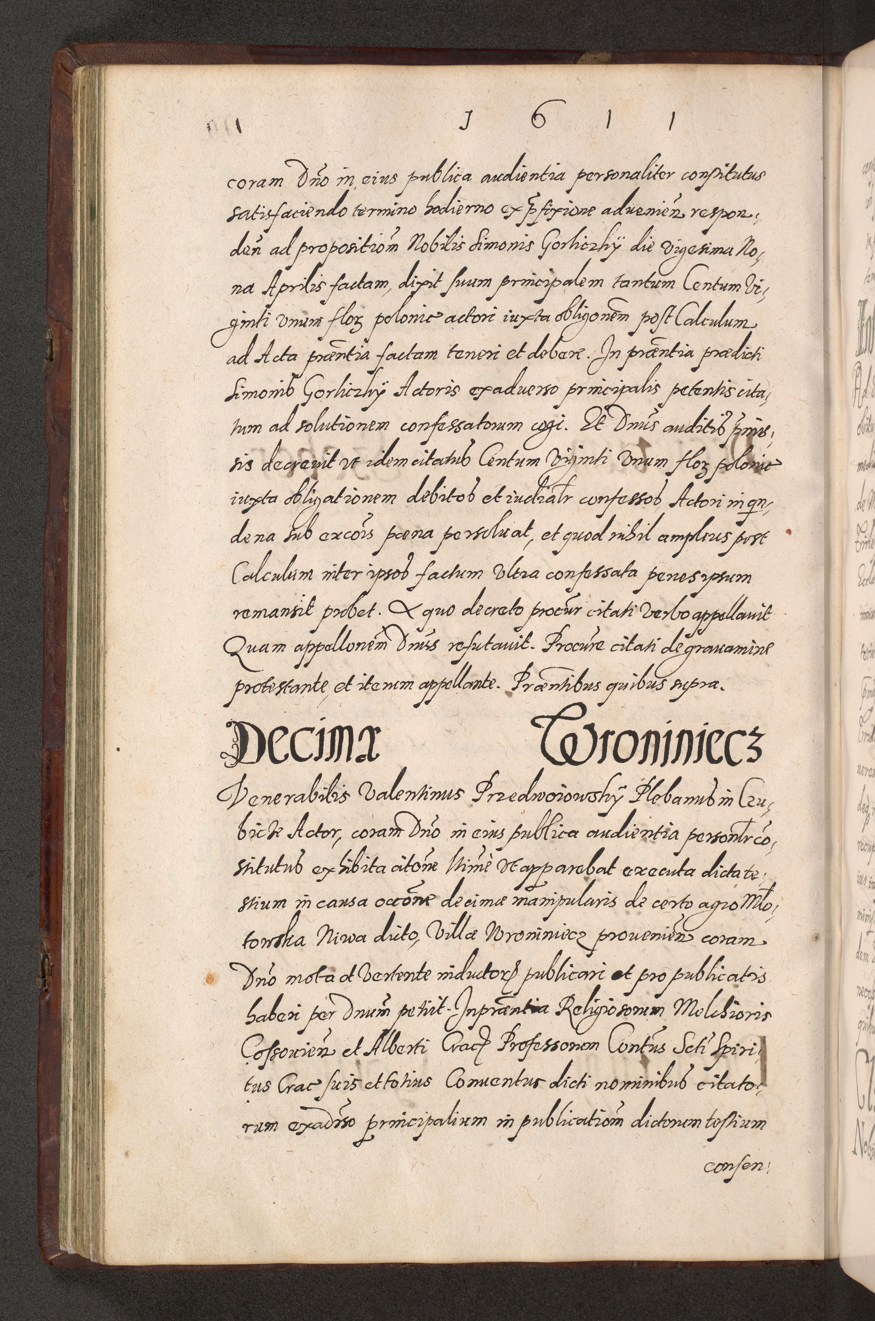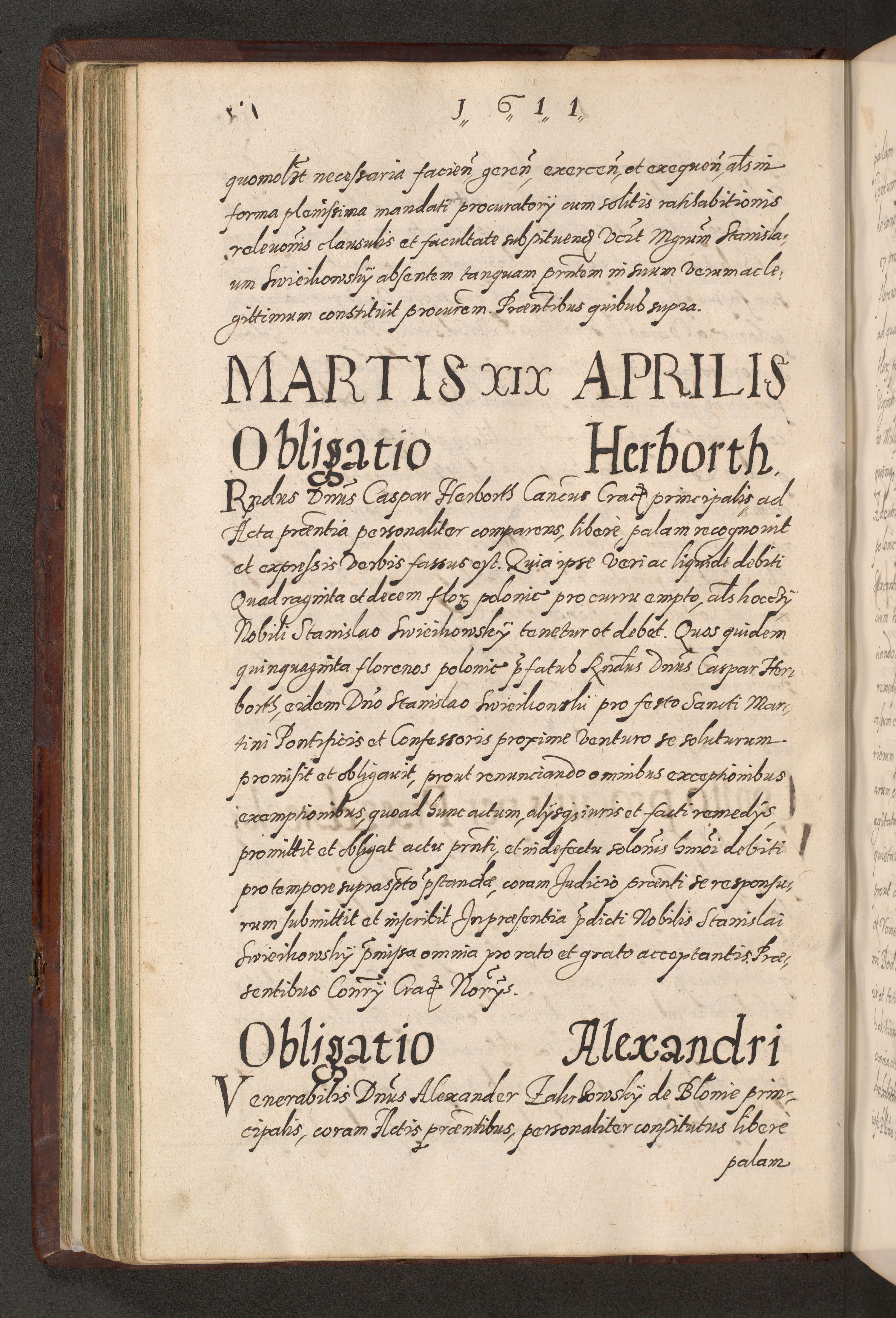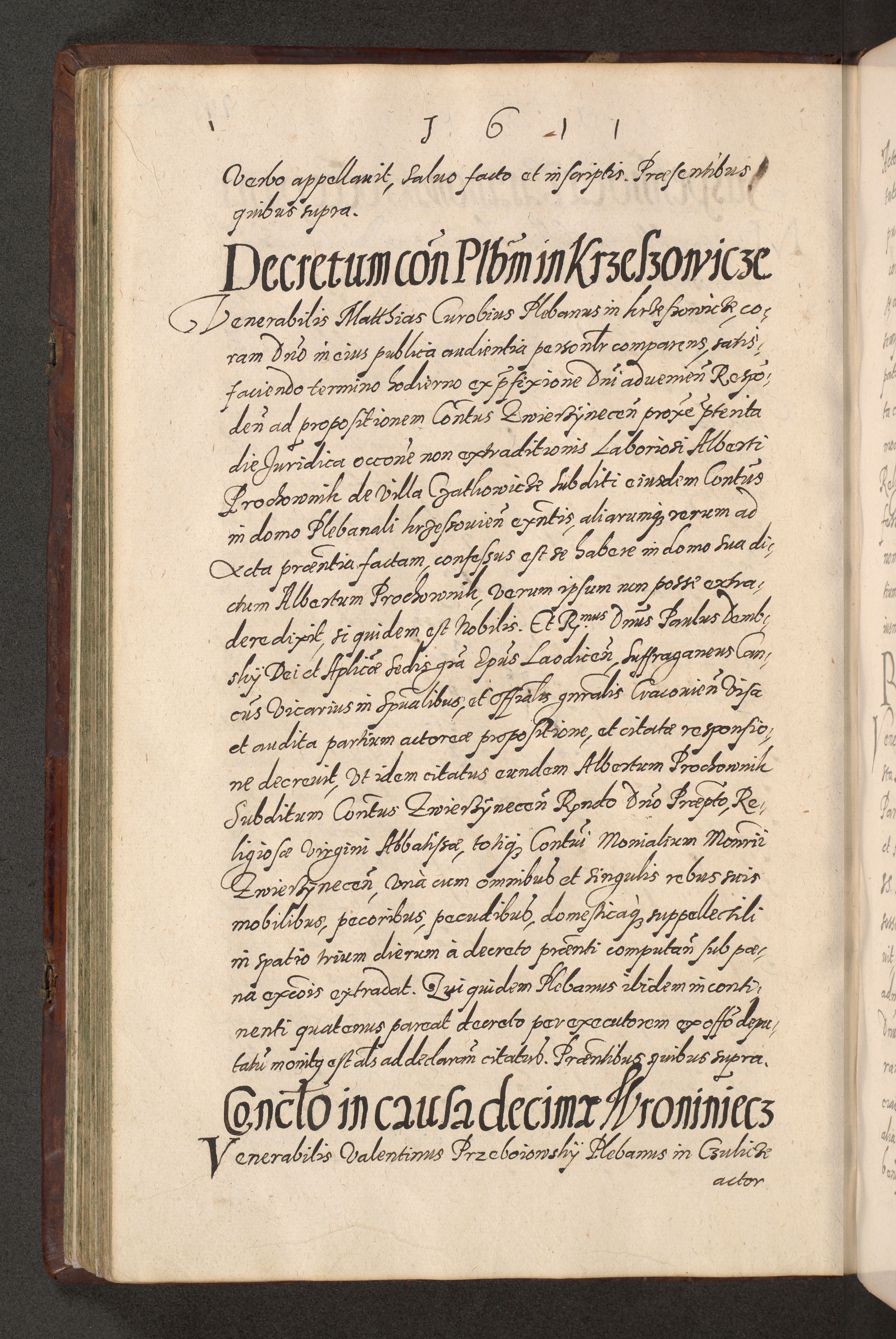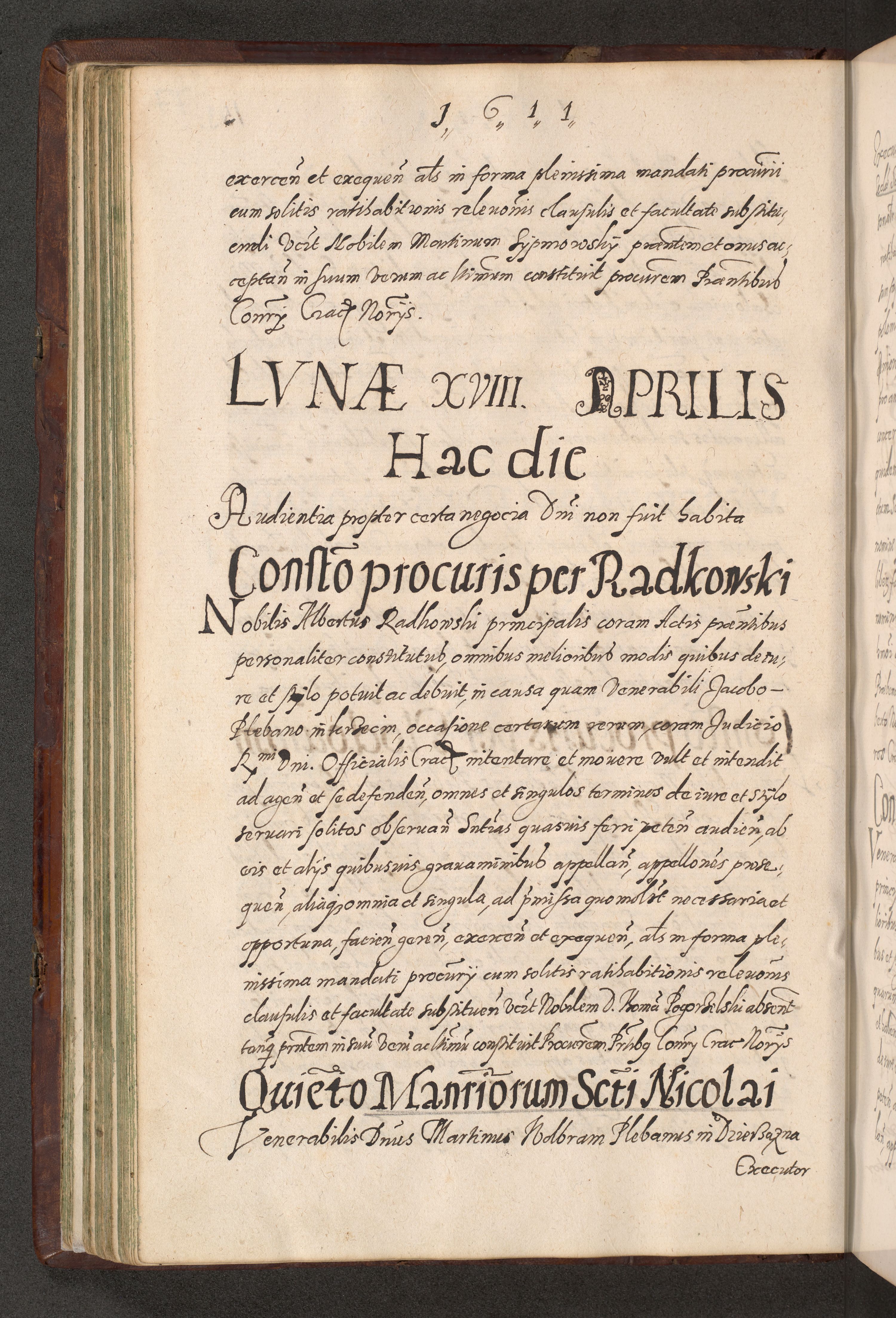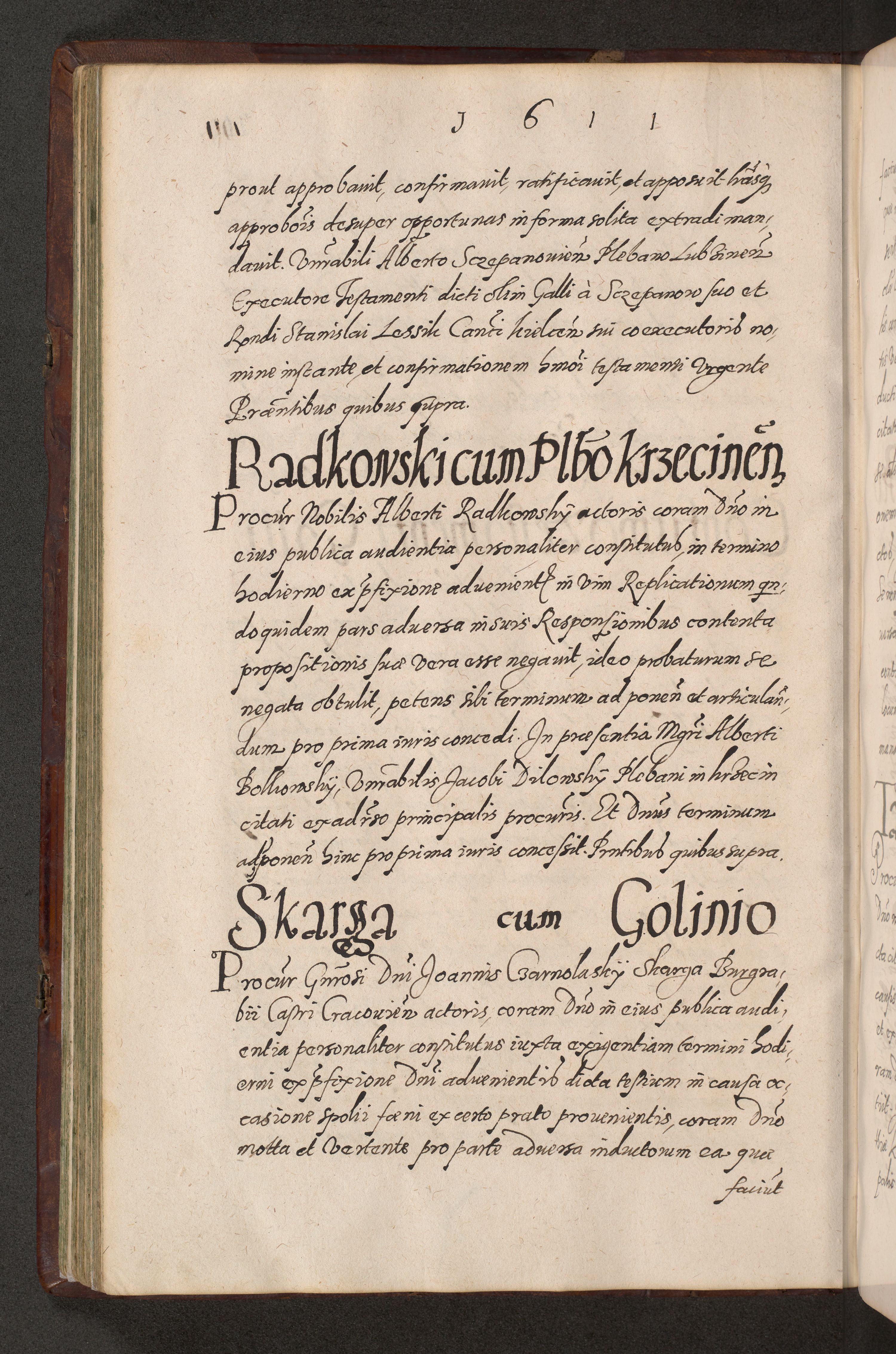 Acta actorum causarum sententiarum tam diffinitiuarum quam interloquutorisrum decretorum obligationum quietationum procuratorum constitutionum etc. etc. coram Reverendo Domino Paulo Dembski Dei et Apostolice Sedis Gratia Episcopalo Dicensis Suffraganeo Canonico Vicario in Spiritualibus et Officiali Generali Cracoviensis ad Annum Domini Millesimum Sexcentesimum Undecimum cuius indictio octava pontificatus Sanctissimi Domini Nostri Domini Pauli Divina Providentia Papae Vti foeliciter continuantur