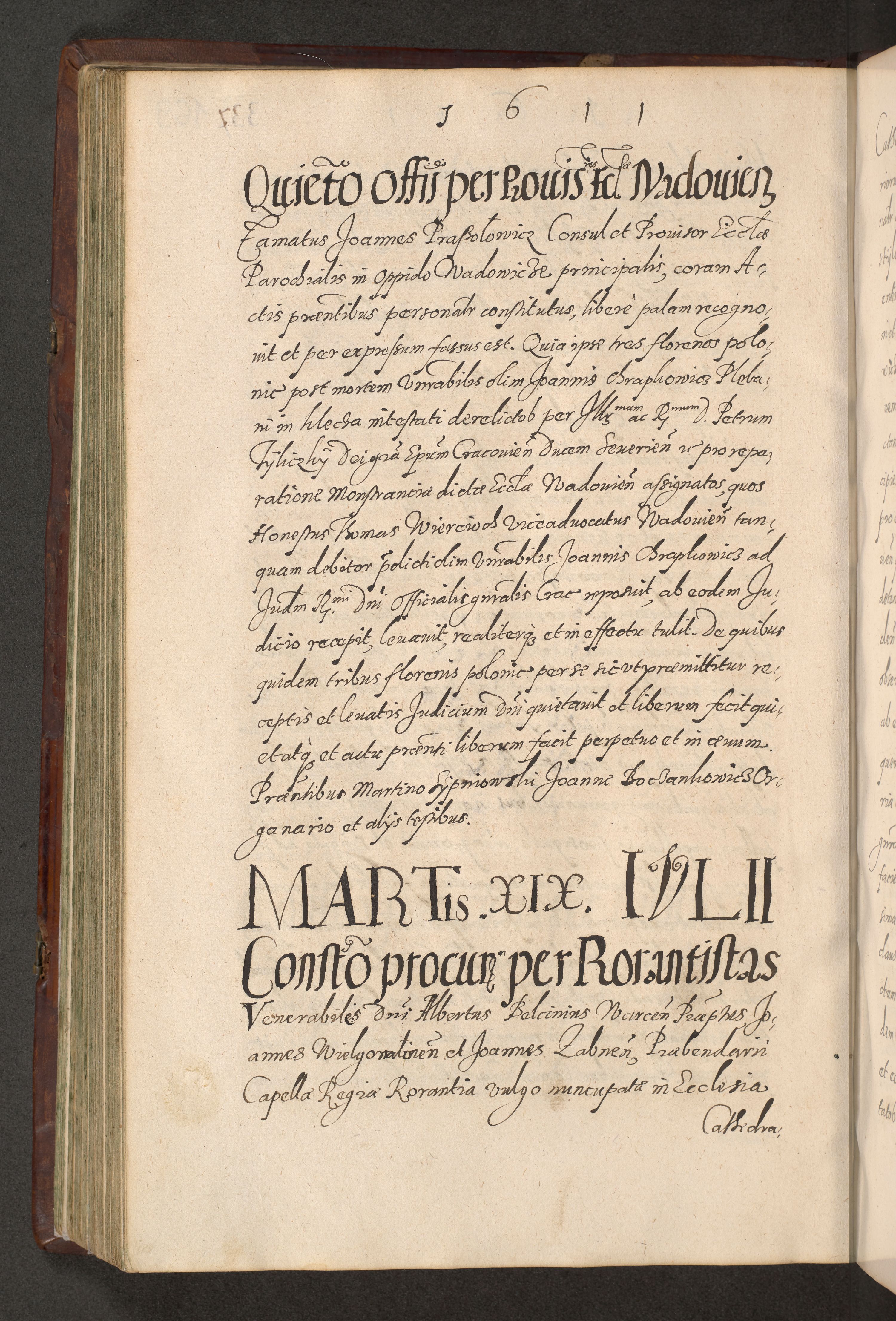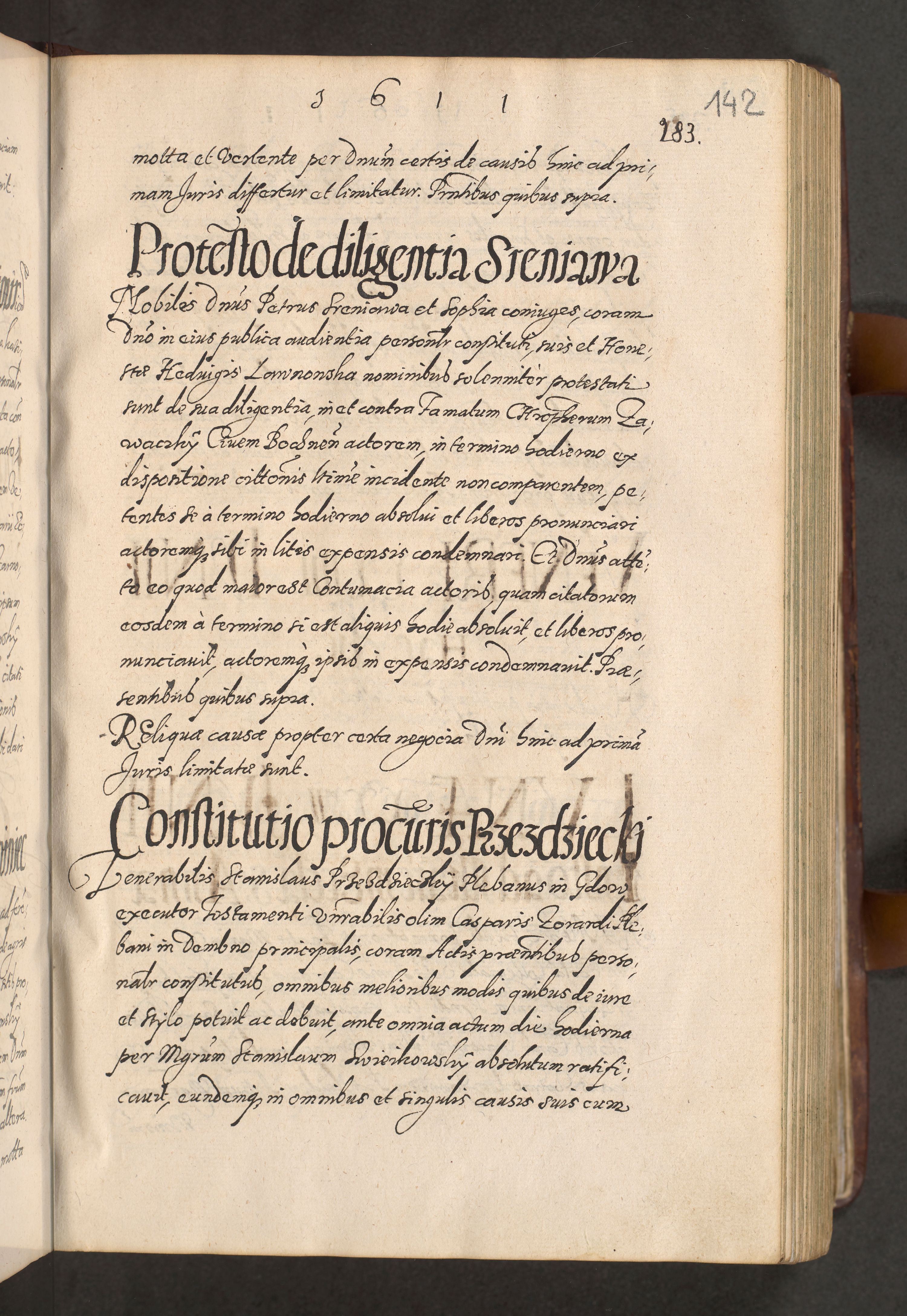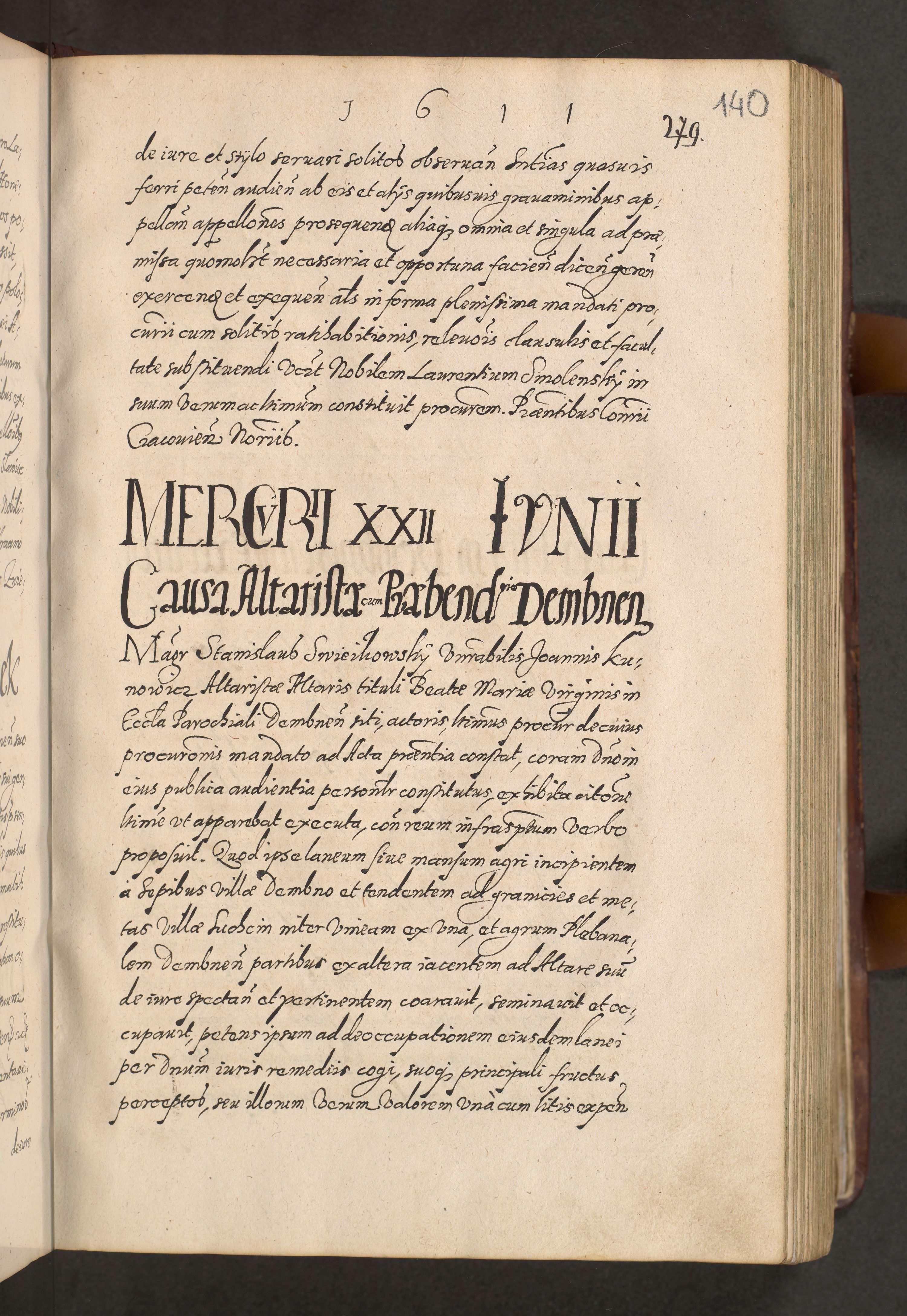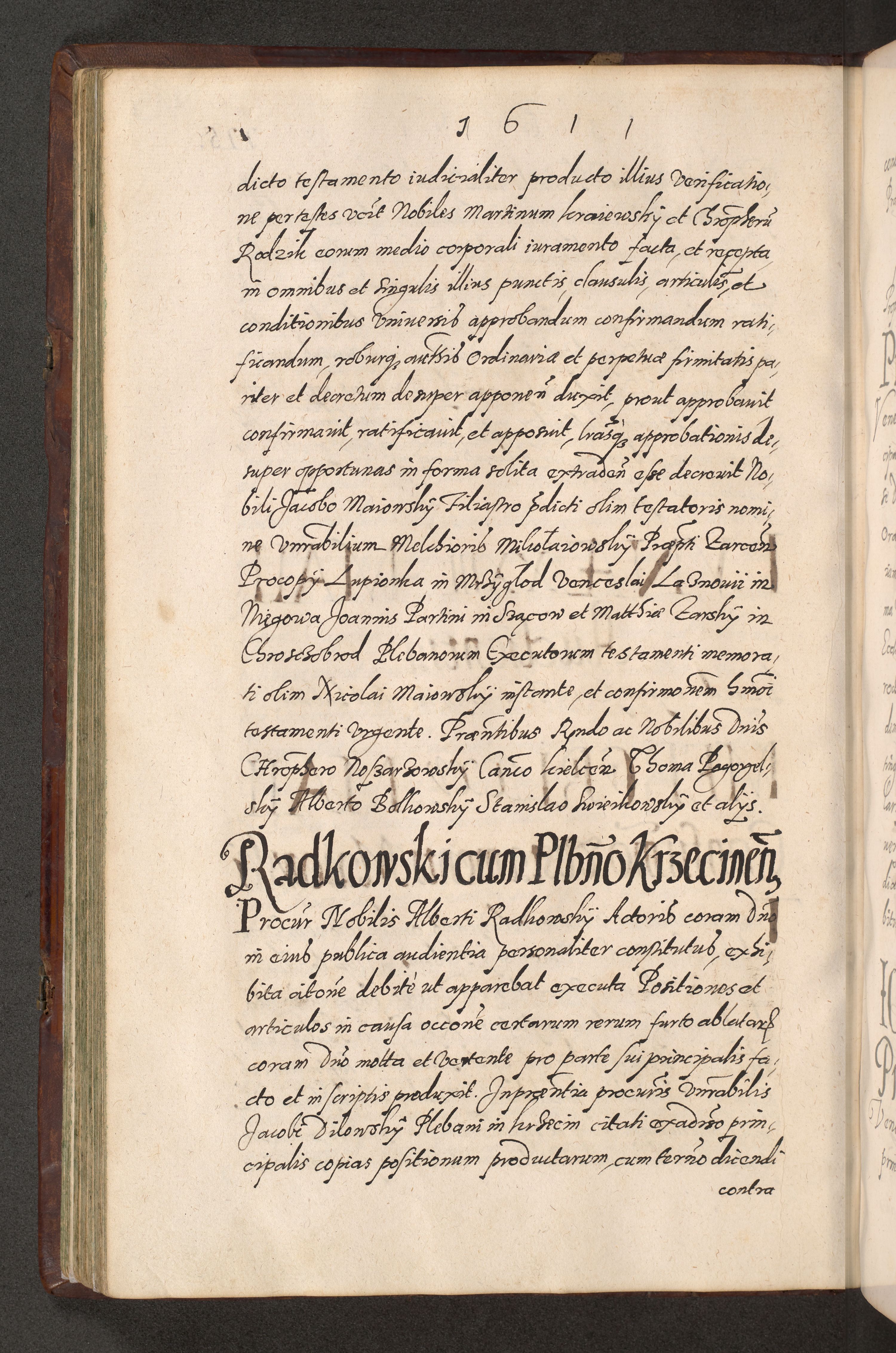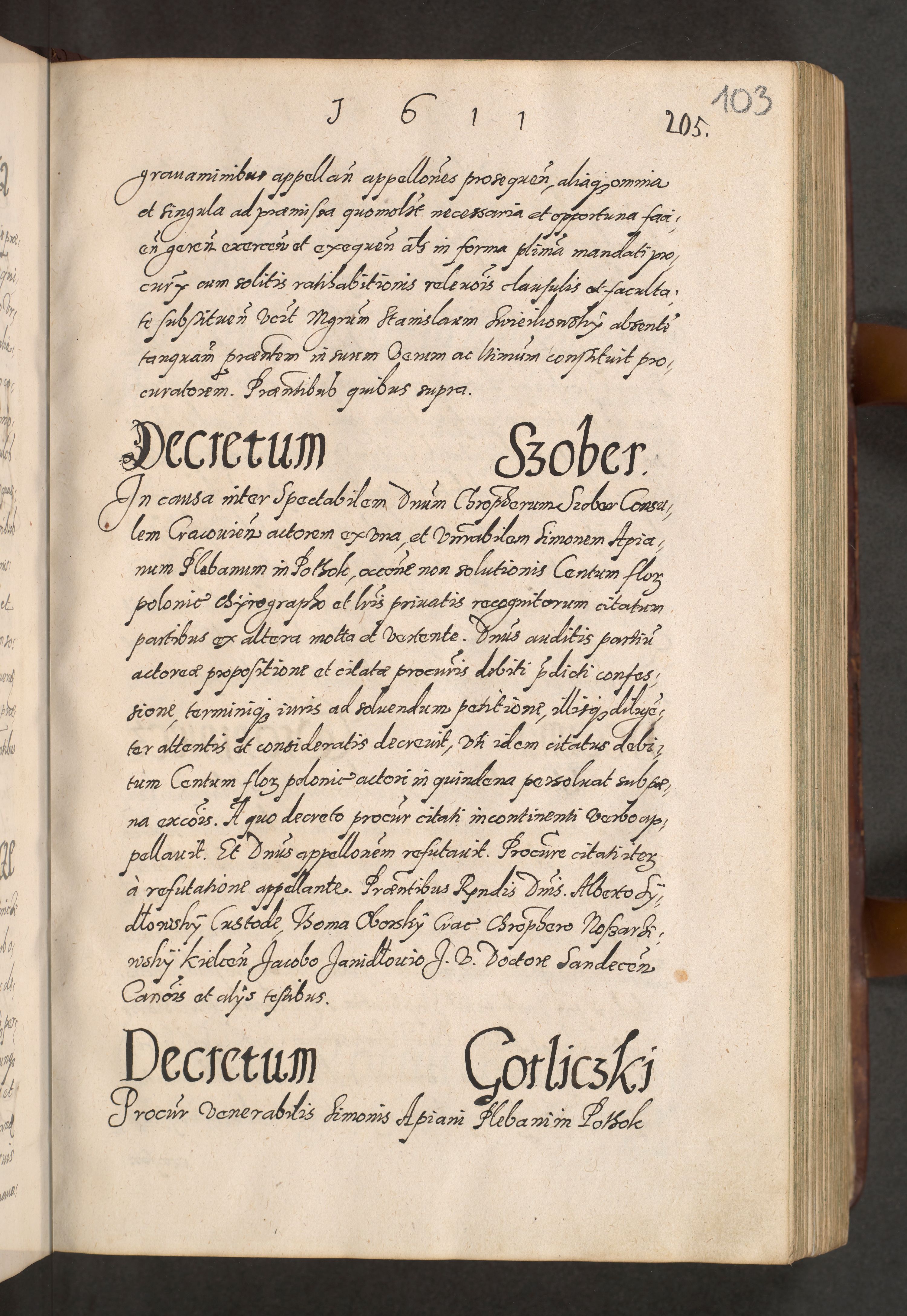 Acta actorum causarum sententiarum tam diffinitiuarum quam interloquutorisrum decretorum obligationum quietationum procuratorum constitutionum etc. etc. coram Reverendo Domino Paulo Dembski Dei et Apostolice Sedis Gratia Episcopalo Dicensis Suffraganeo Canonico Vicario in Spiritualibus et Officiali Generali Cracoviensis ad Annum Domini Millesimum Sexcentesimum Undecimum cuius indictio octava pontificatus Sanctissimi Domini Nostri Domini Pauli Divina Providentia Papae Vti foeliciter continuantur