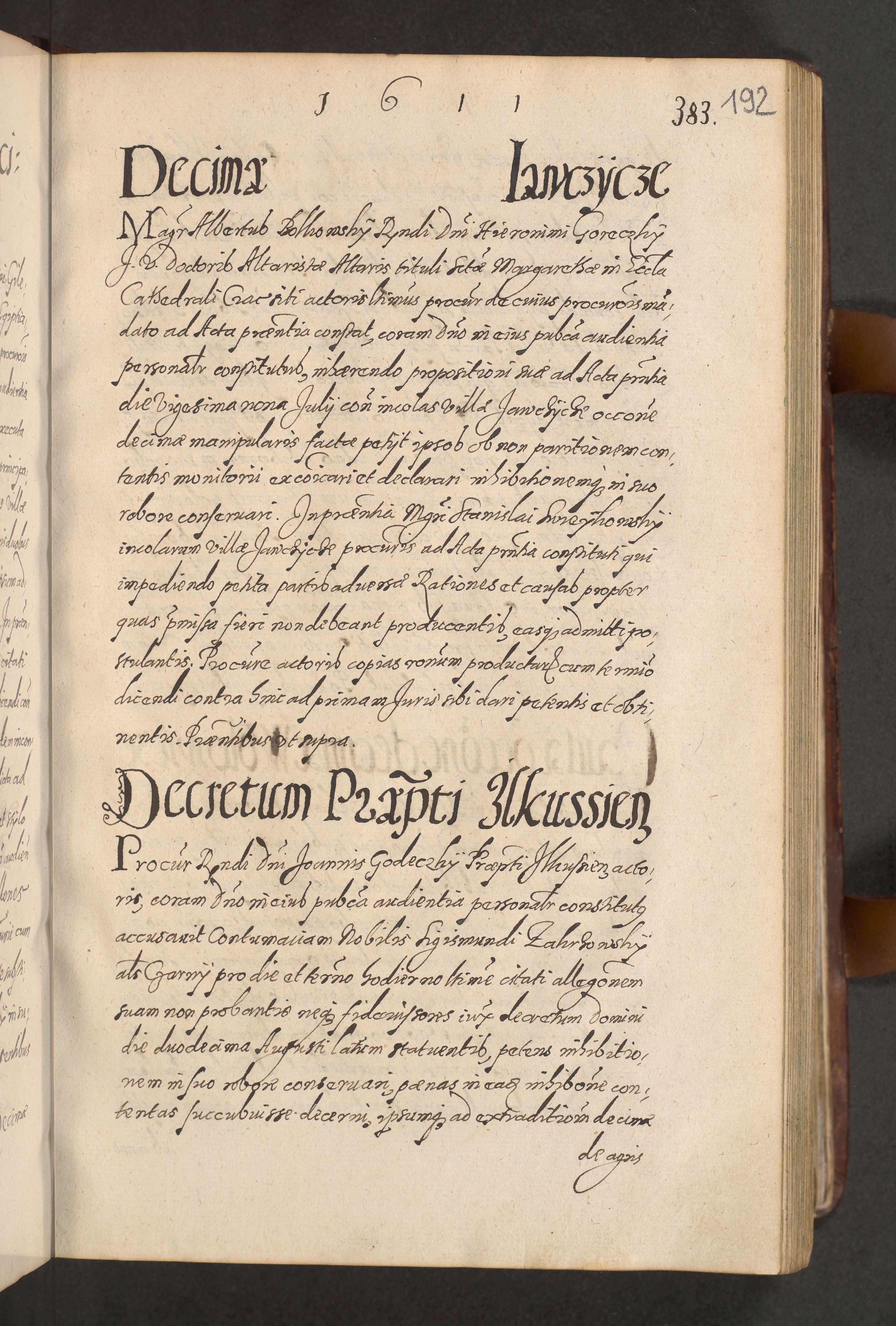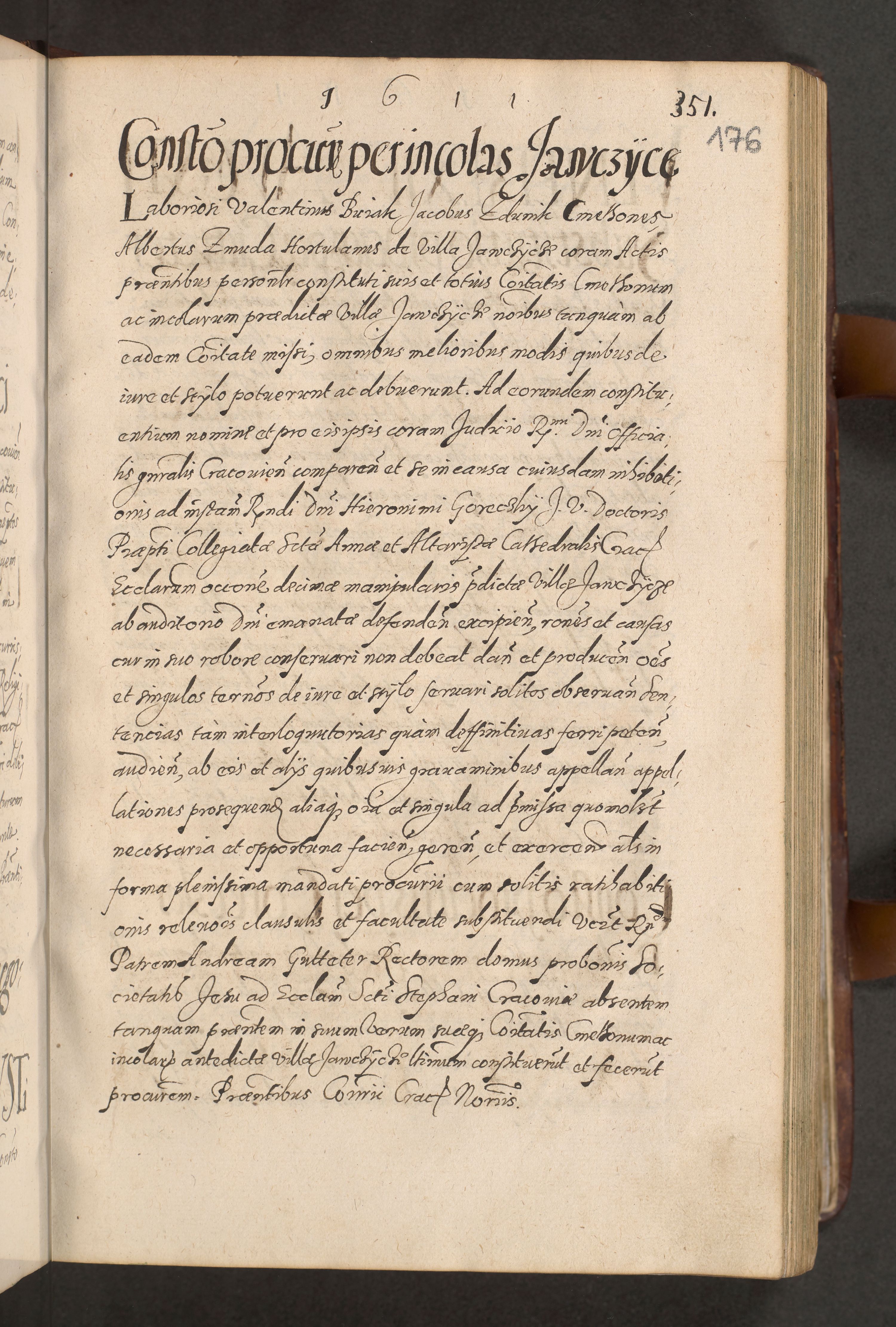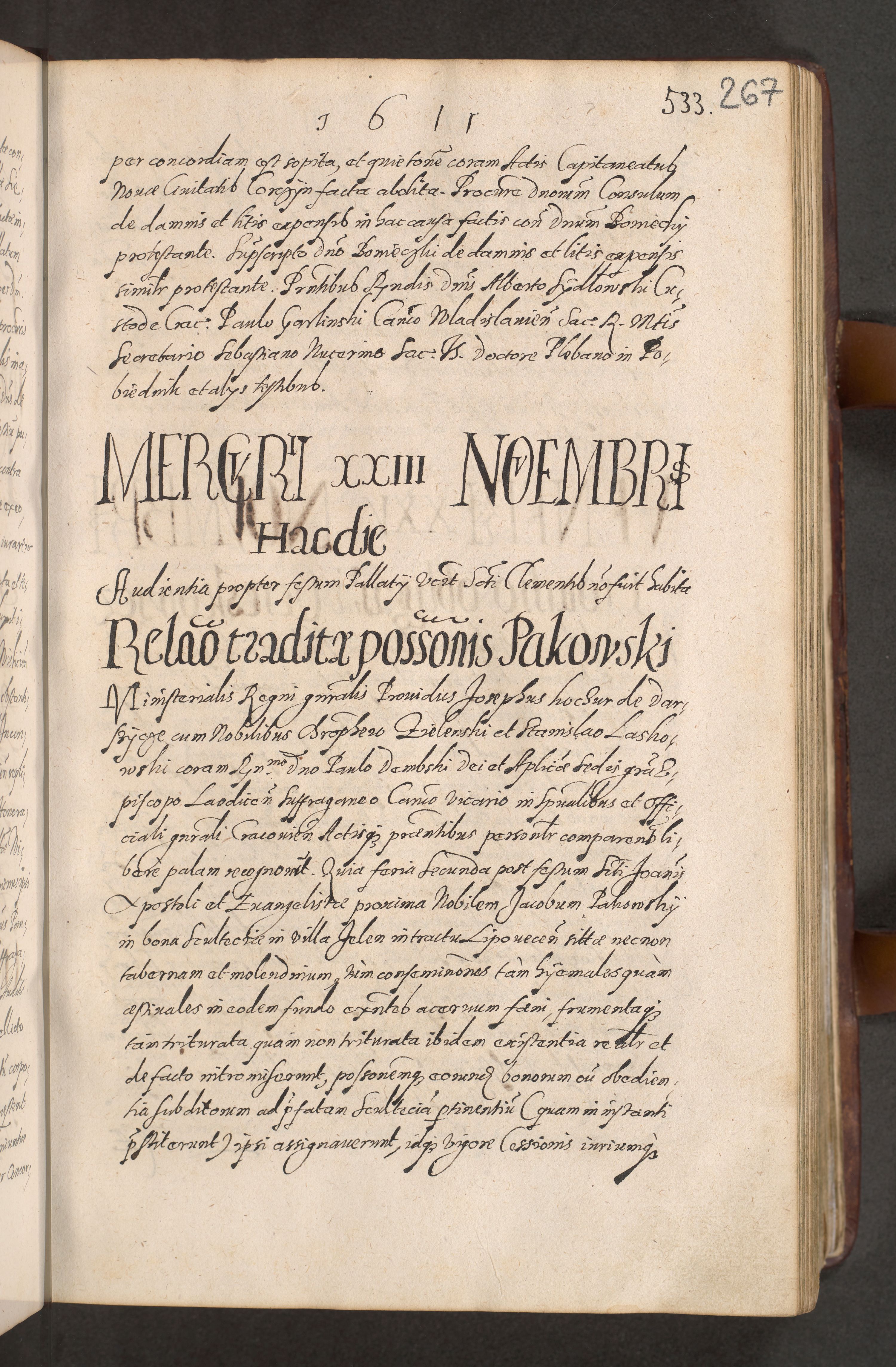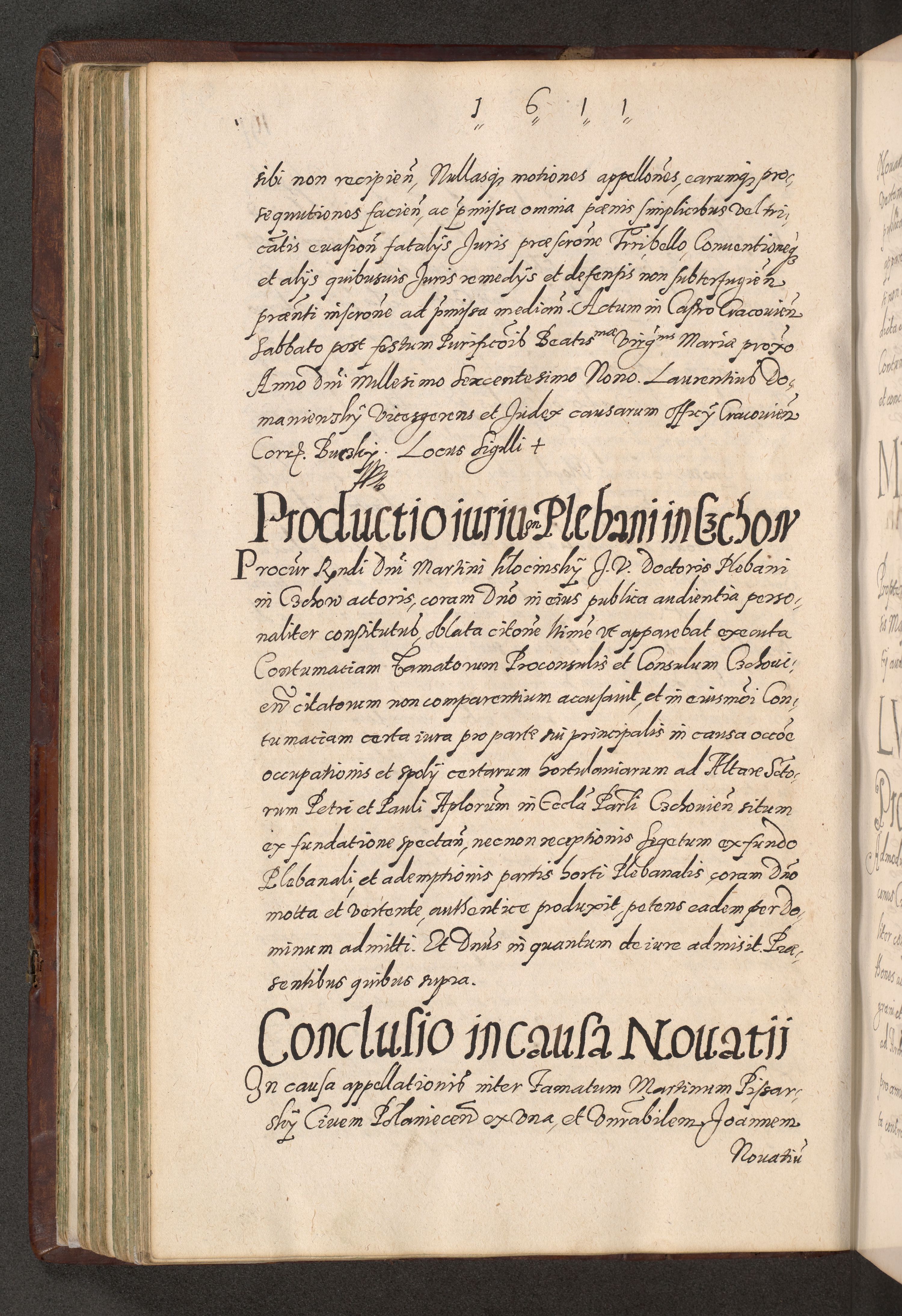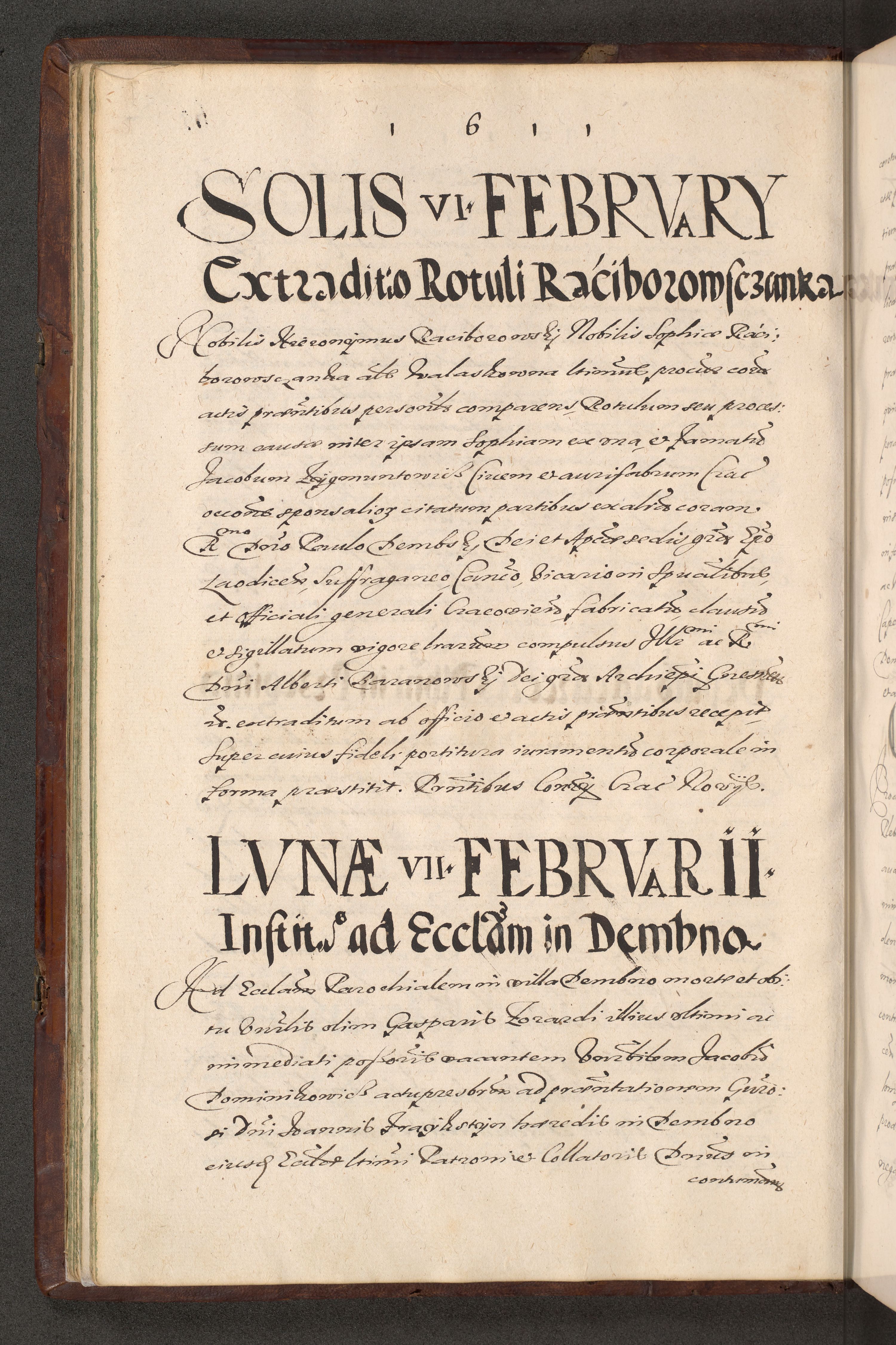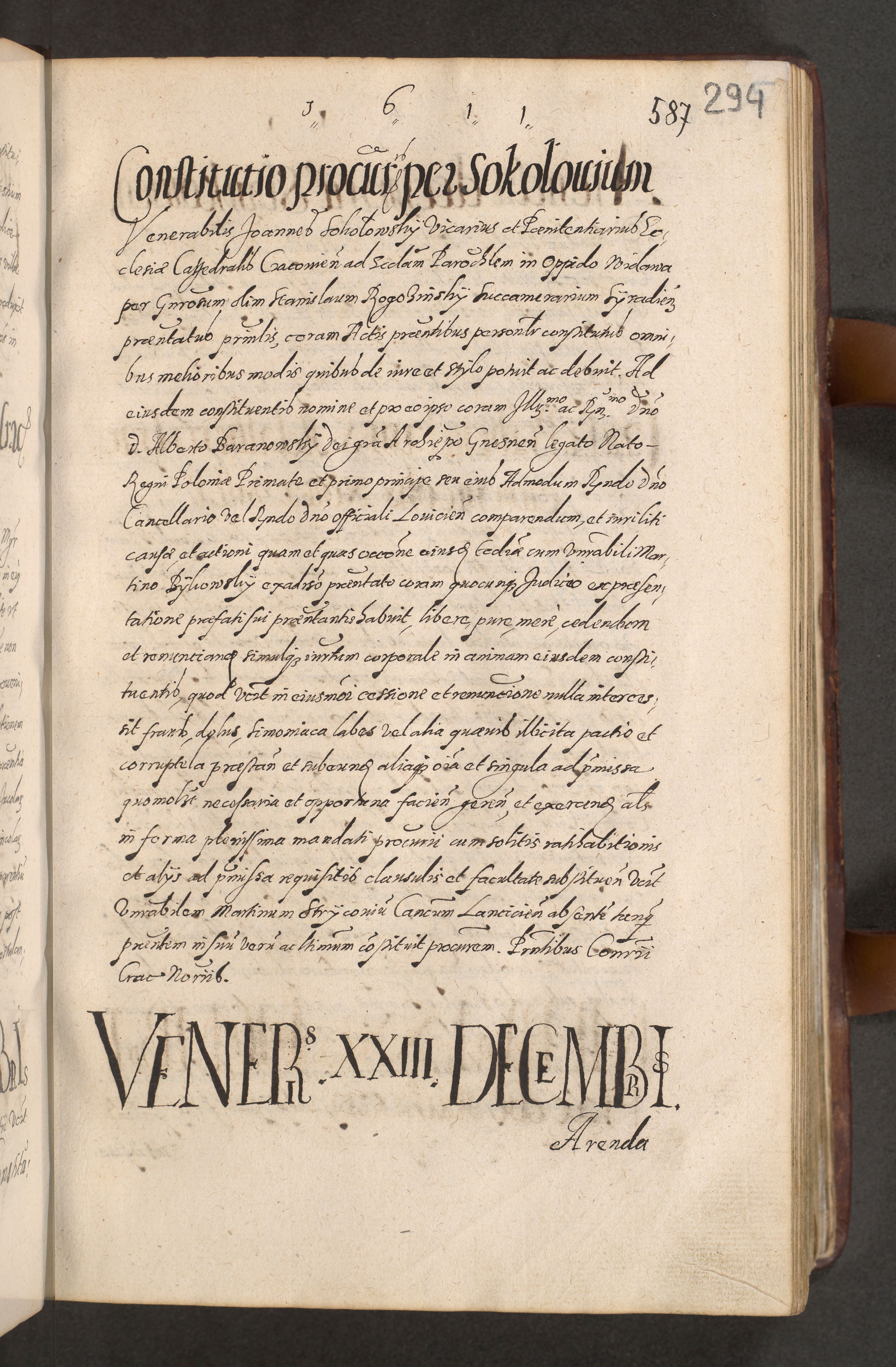 Acta actorum causarum sententiarum tam diffinitiuarum quam interloquutorisrum decretorum obligationum quietationum procuratorum constitutionum etc. etc. coram Reverendo Domino Paulo Dembski Dei et Apostolice Sedis Gratia Episcopalo Dicensis Suffraganeo Canonico Vicario in Spiritualibus et Officiali Generali Cracoviensis ad Annum Domini Millesimum Sexcentesimum Undecimum cuius indictio octava pontificatus Sanctissimi Domini Nostri Domini Pauli Divina Providentia Papae Vti foeliciter continuantur