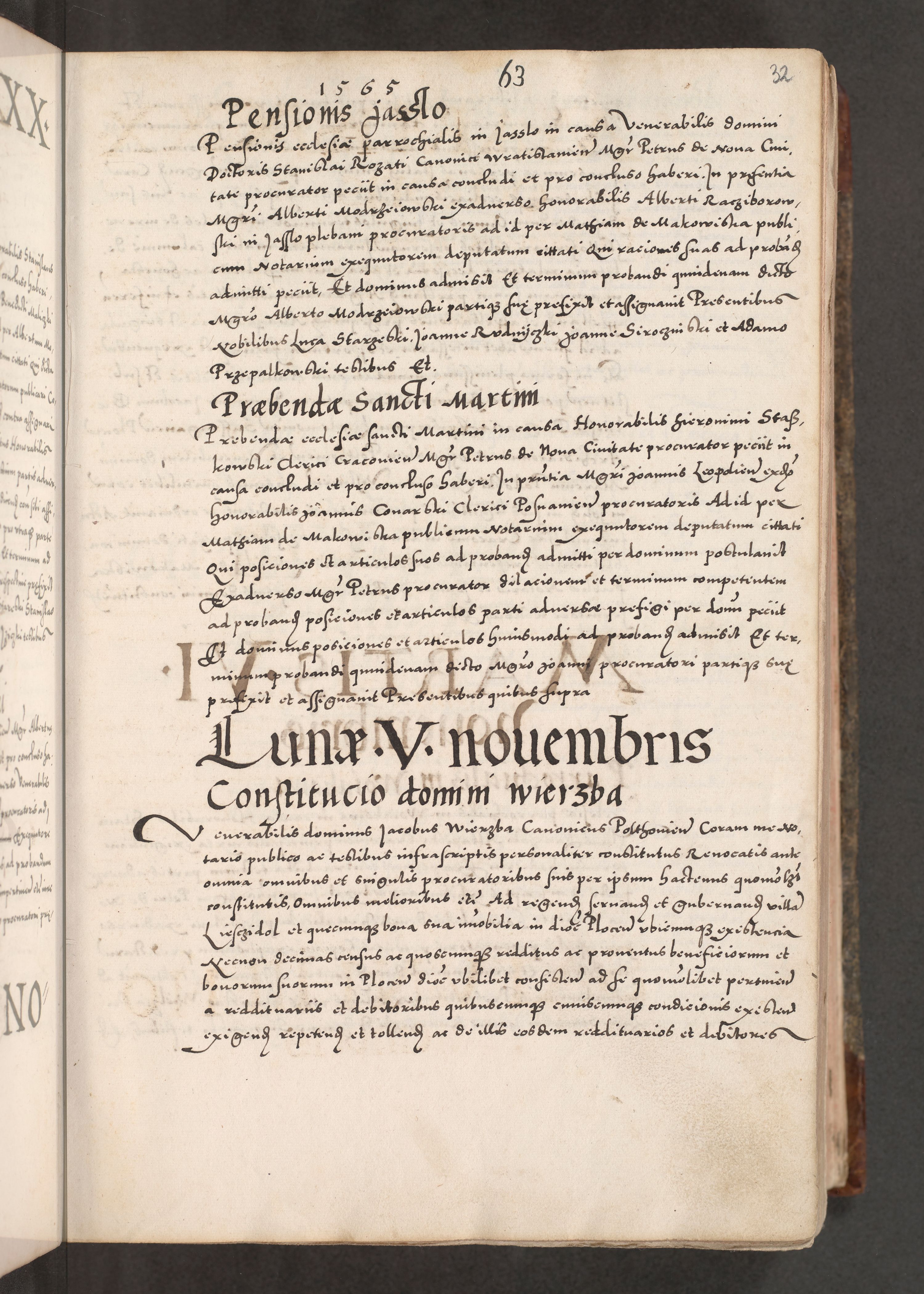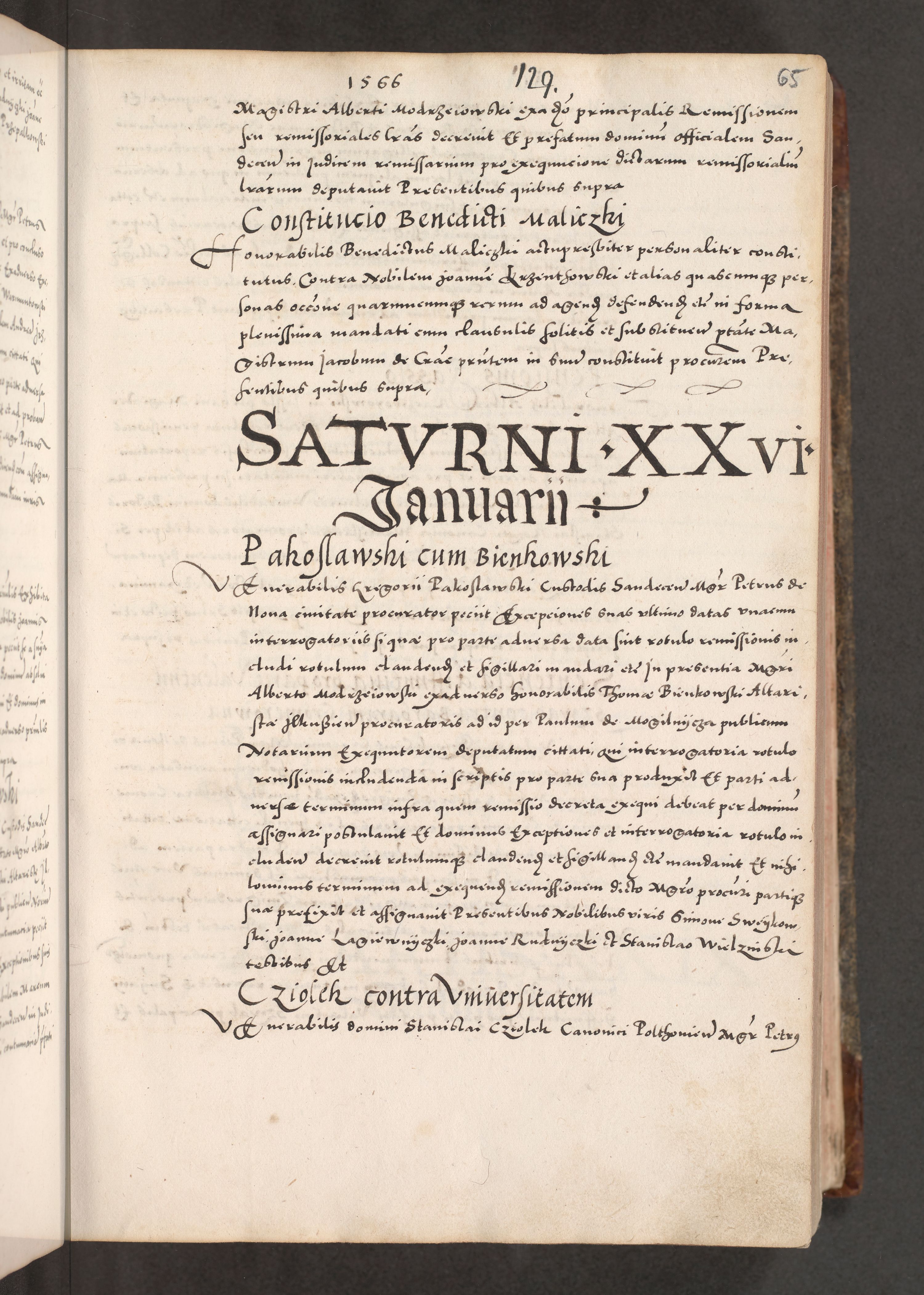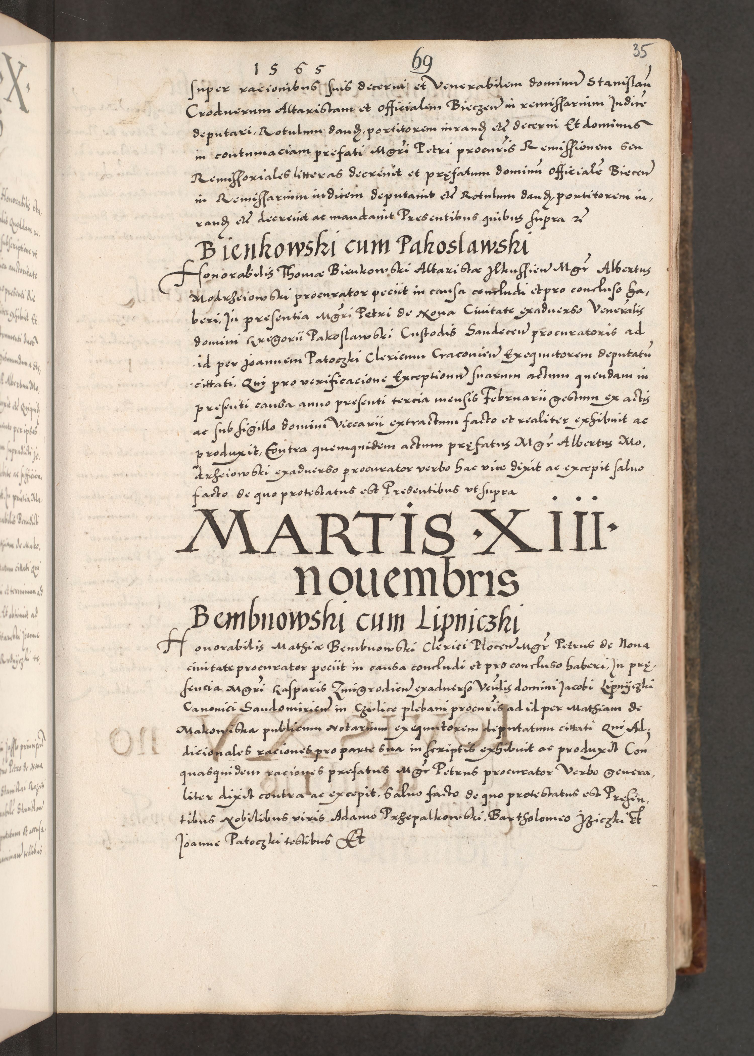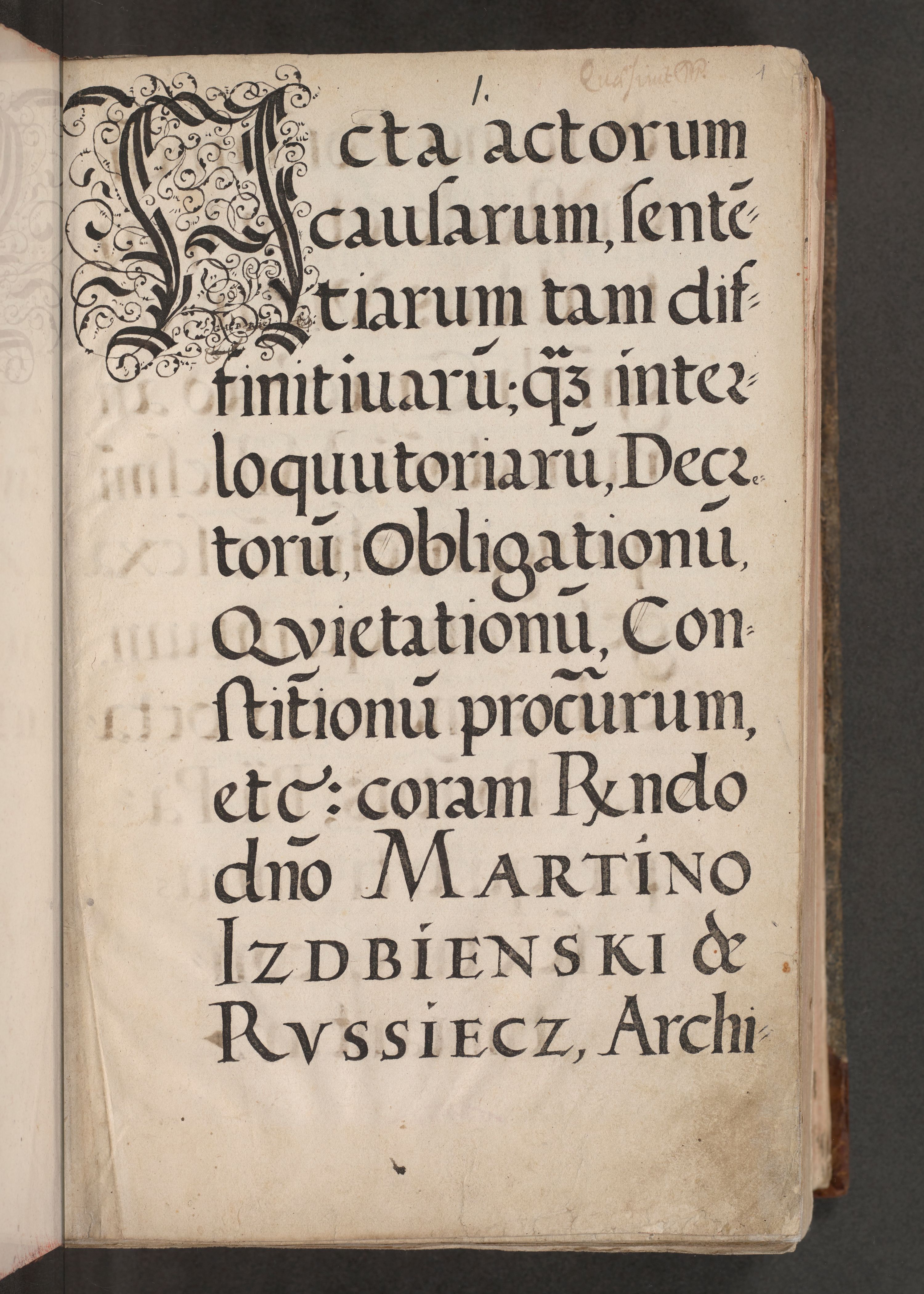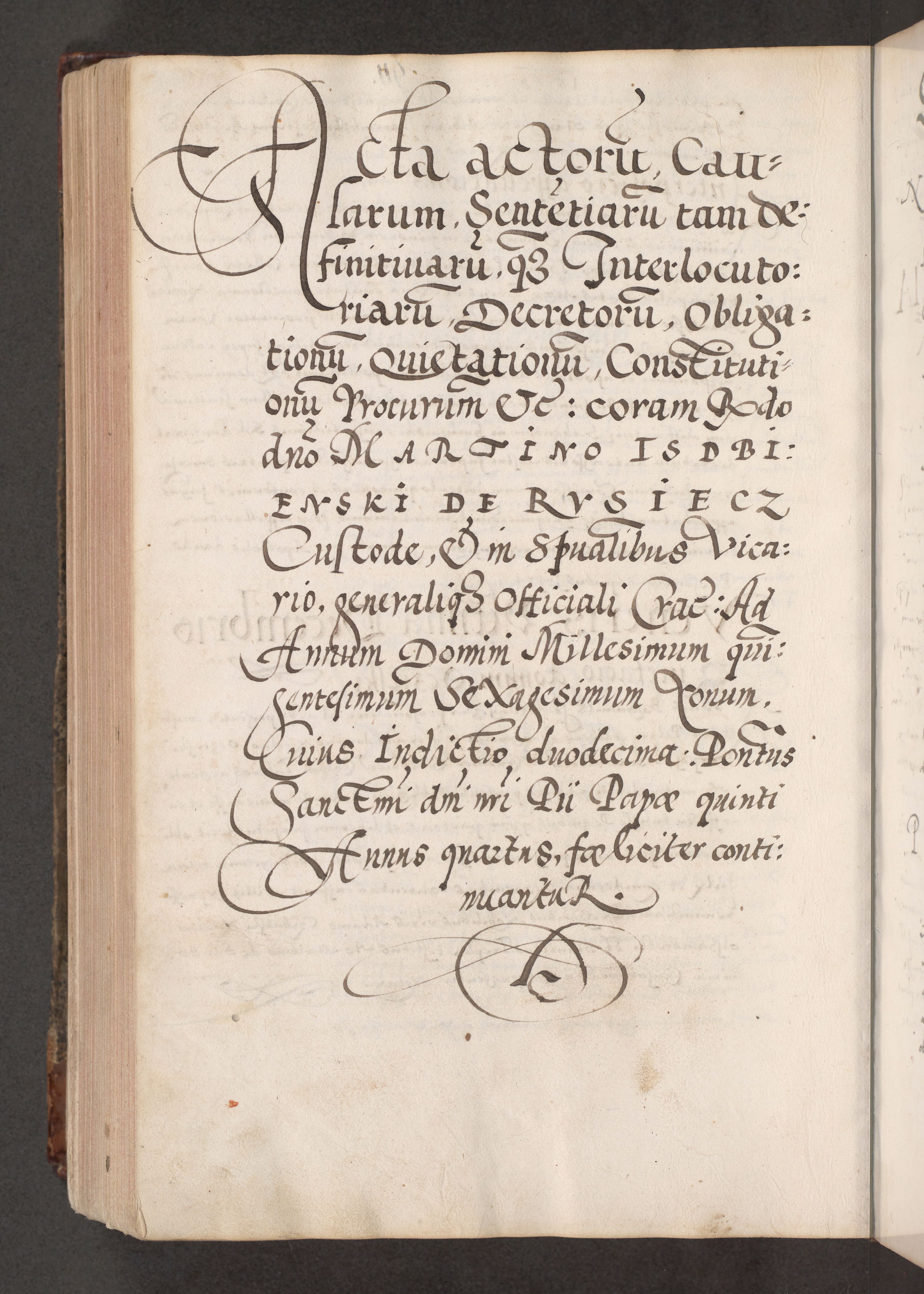 Acta actorum causarum, sententiarum tam diffinitivarum quam interloquutoriarum, decretorum, obligationum, quietationum, constitutionum procuratorum etc. coram reverendo domino Martino Izdbienski de Russiecz archidiacono Posnaniensi, custode et in spiritualibus vicario generali Cracoviensi, ad annum Domini millesimum quingesimum sexagesimum quintum, cuius indictio octava, pontificatus Pii pape, annus sextus, continuantur