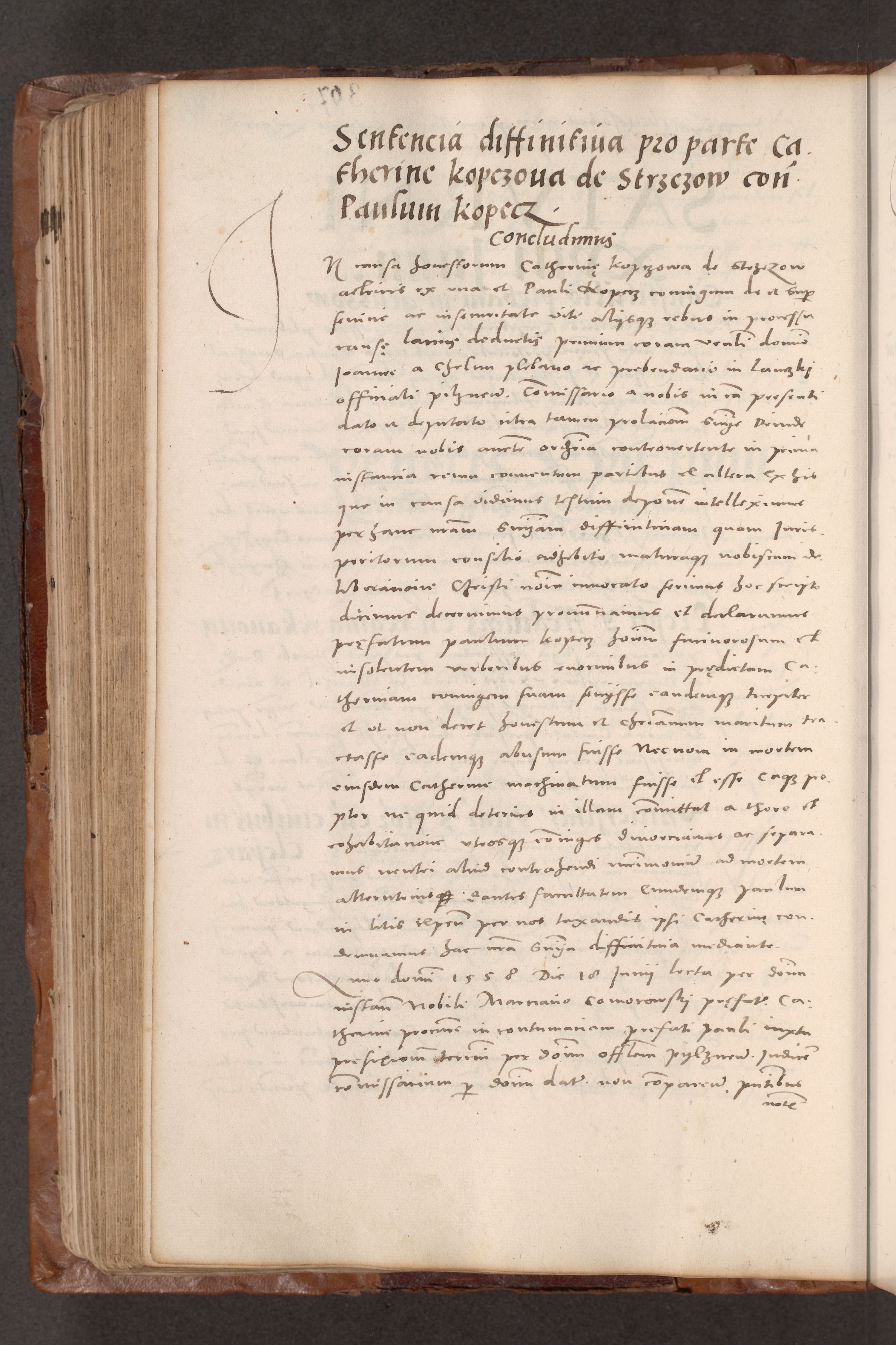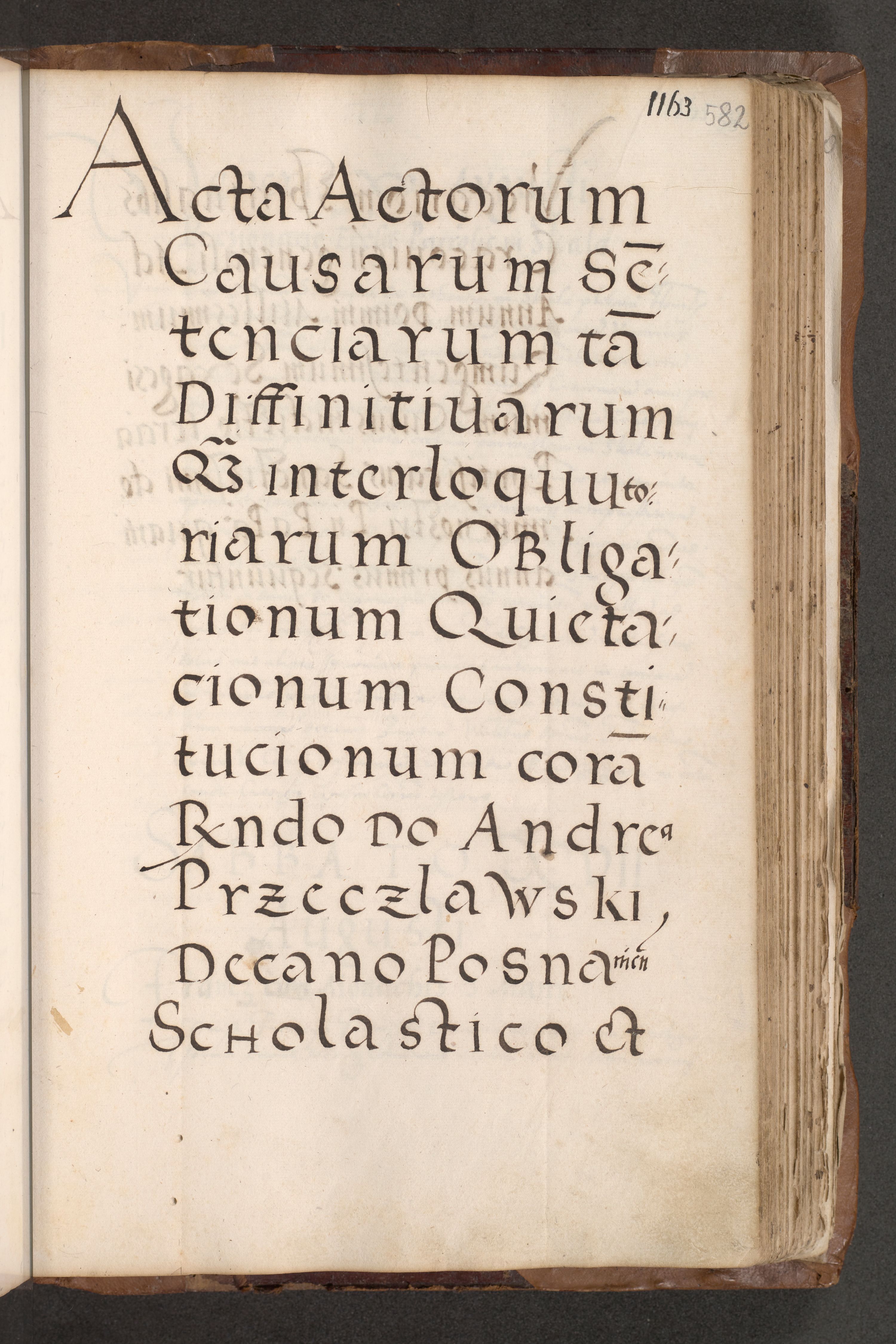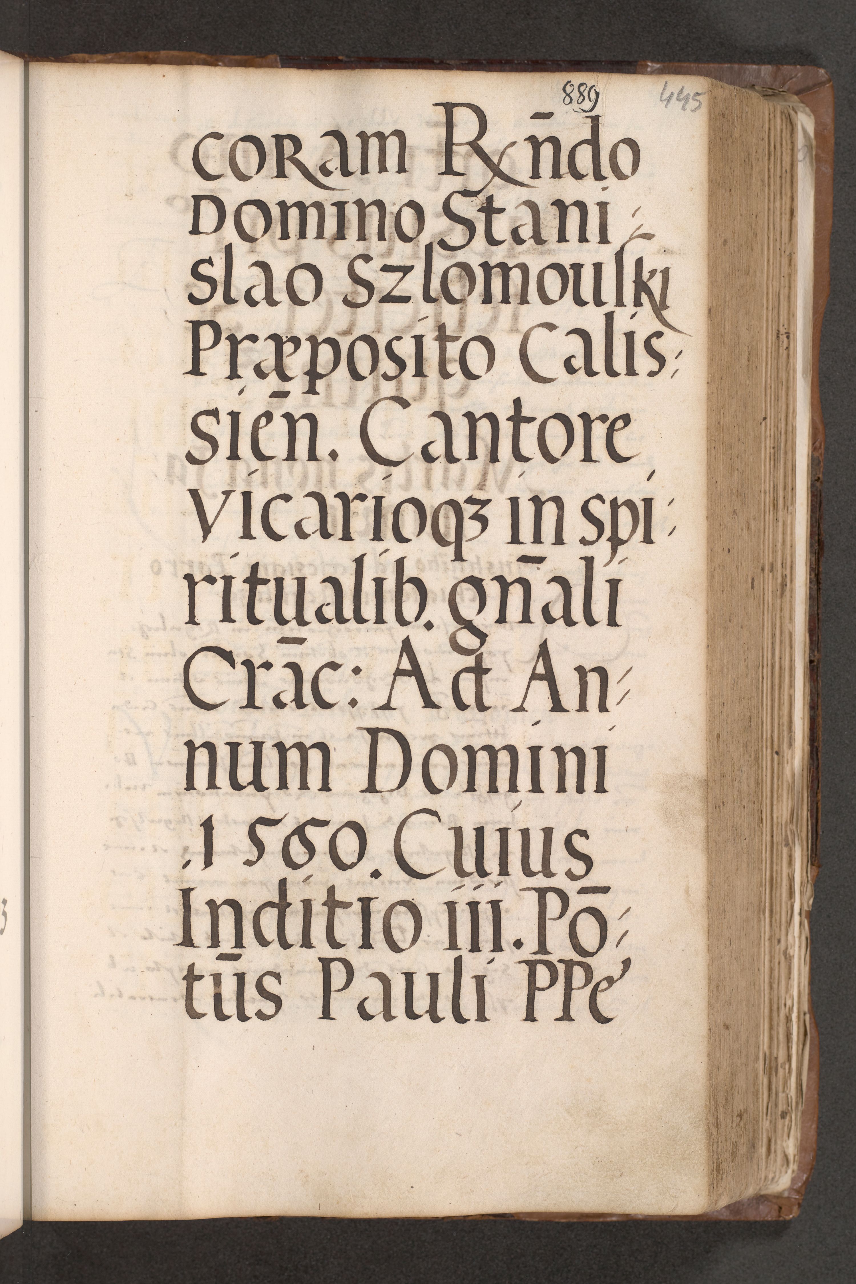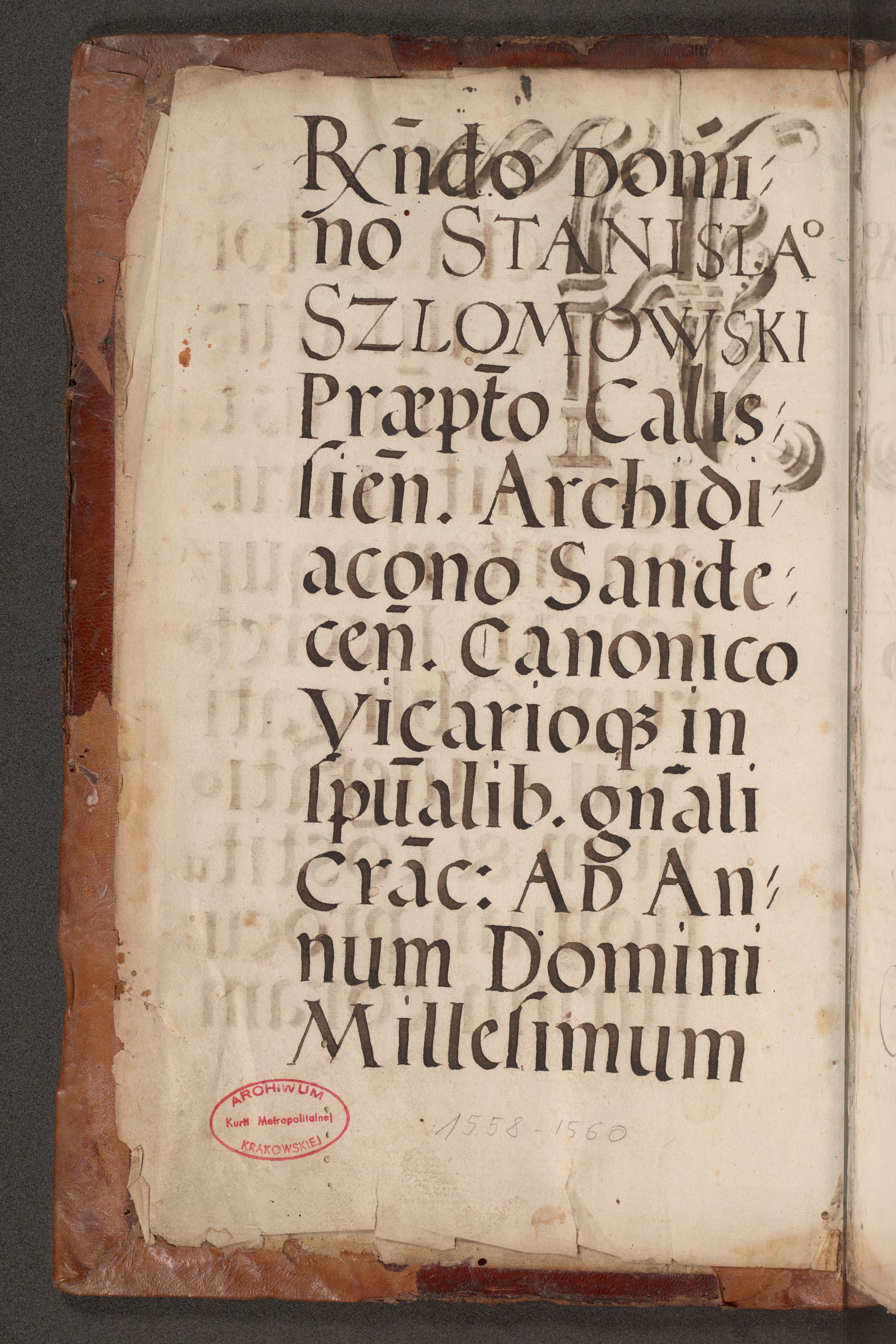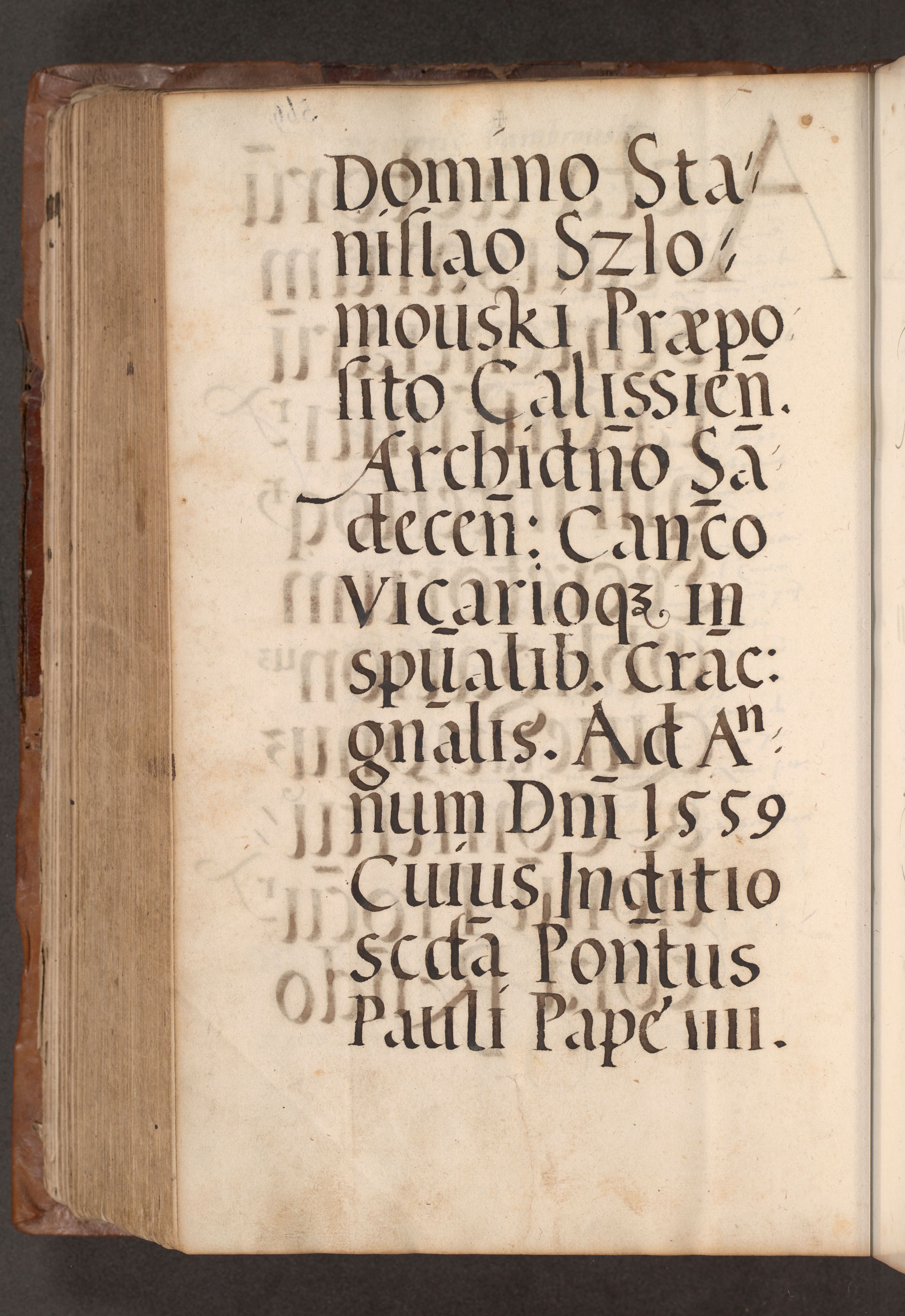 Acta actorum causarum, sententiarum tam diffinivarum quam interloquutoriarum, decretorum, obligationum, quietationum et constitutionum procuratorum coram reverendo domino Stanislao Szlomowski praeposito Calissieensi, archidiacono Sandecensi, canonico vicarioque in spiritualibus generali Cracoviensi ad annum Domini millesimum quingentesimum quinquagesimum octavum, cuius indicio prima, pontificatus sanctissimi domini nostri Pauli divina providencia pape quarti, anno illius tercio, feliciter sequuntur.