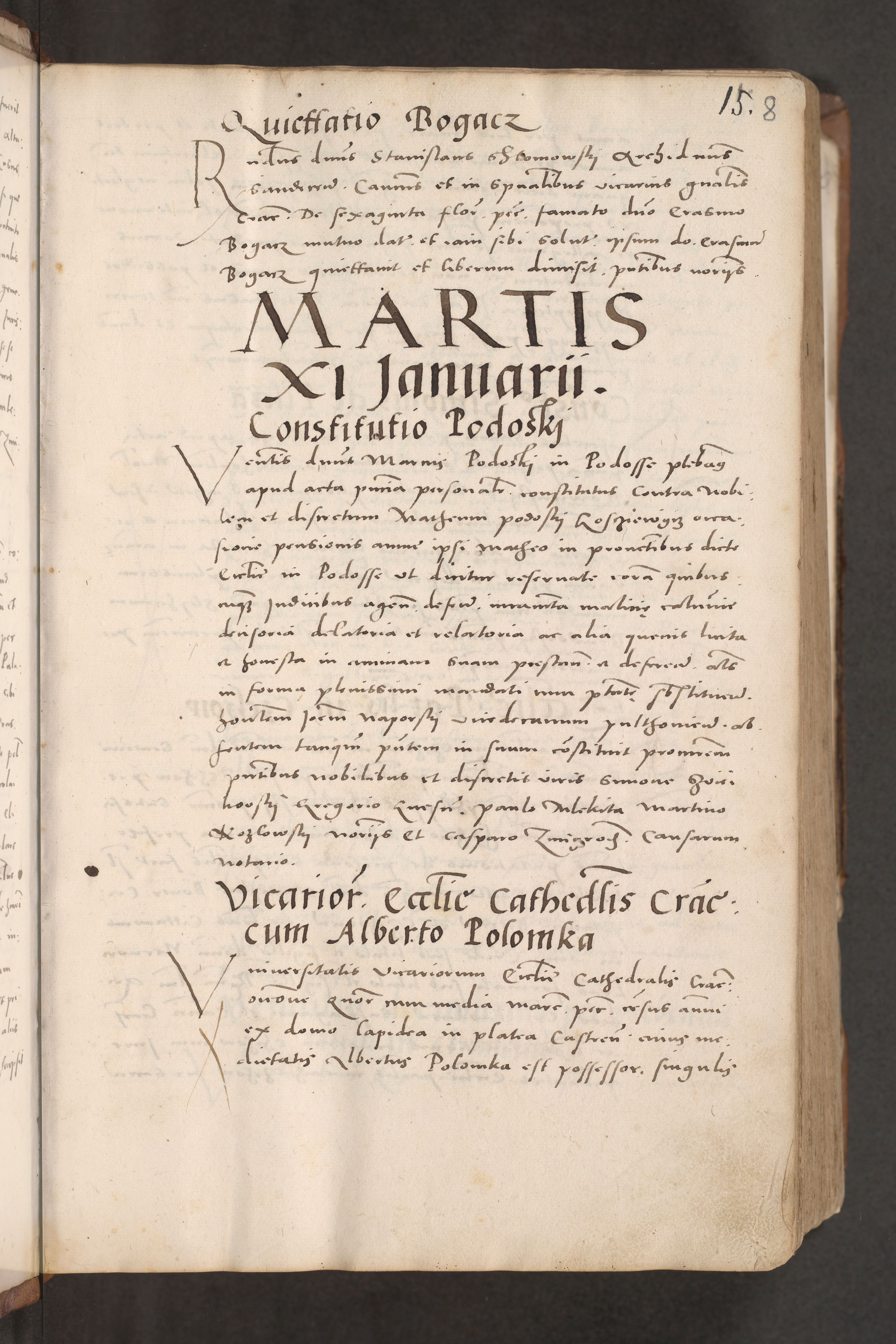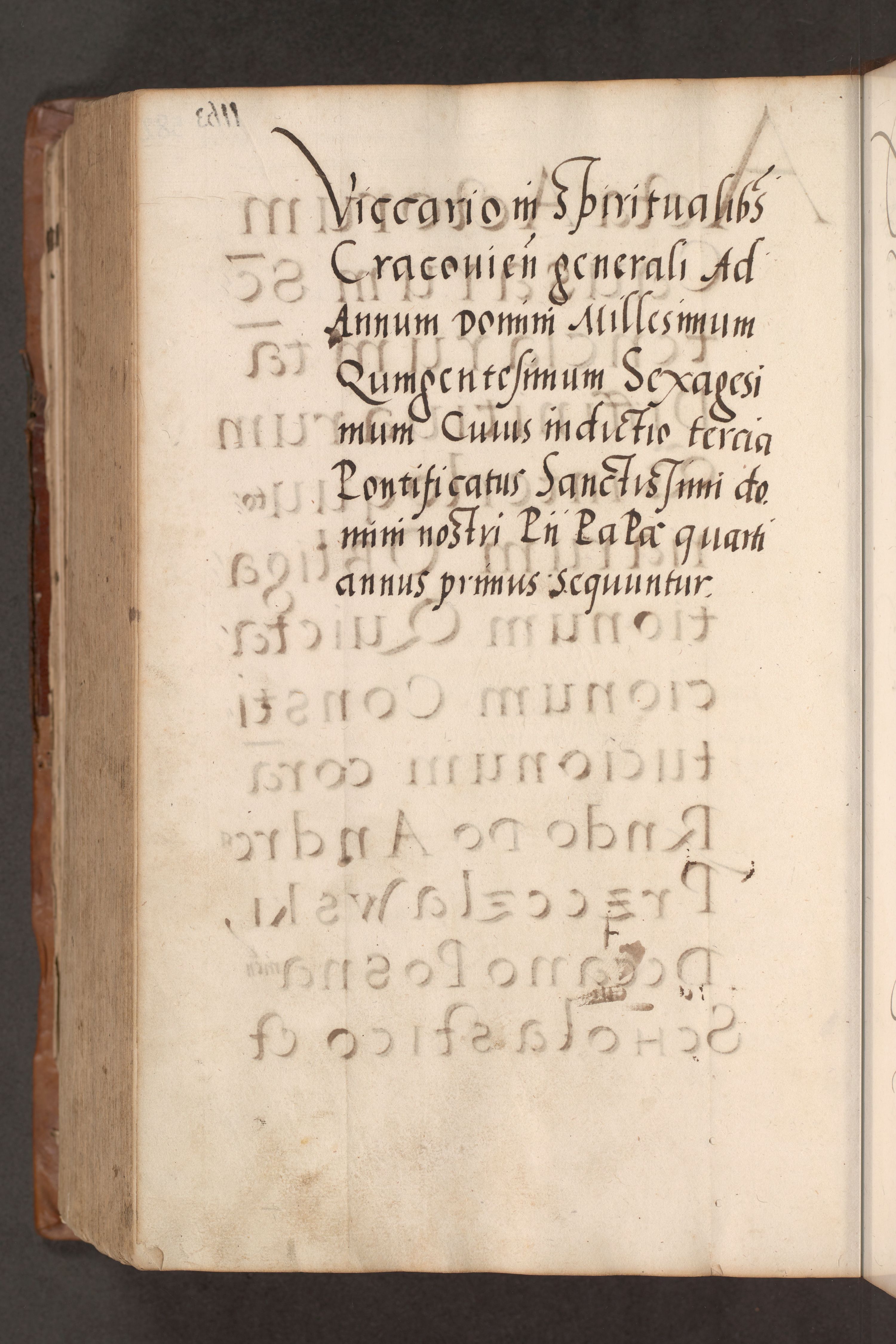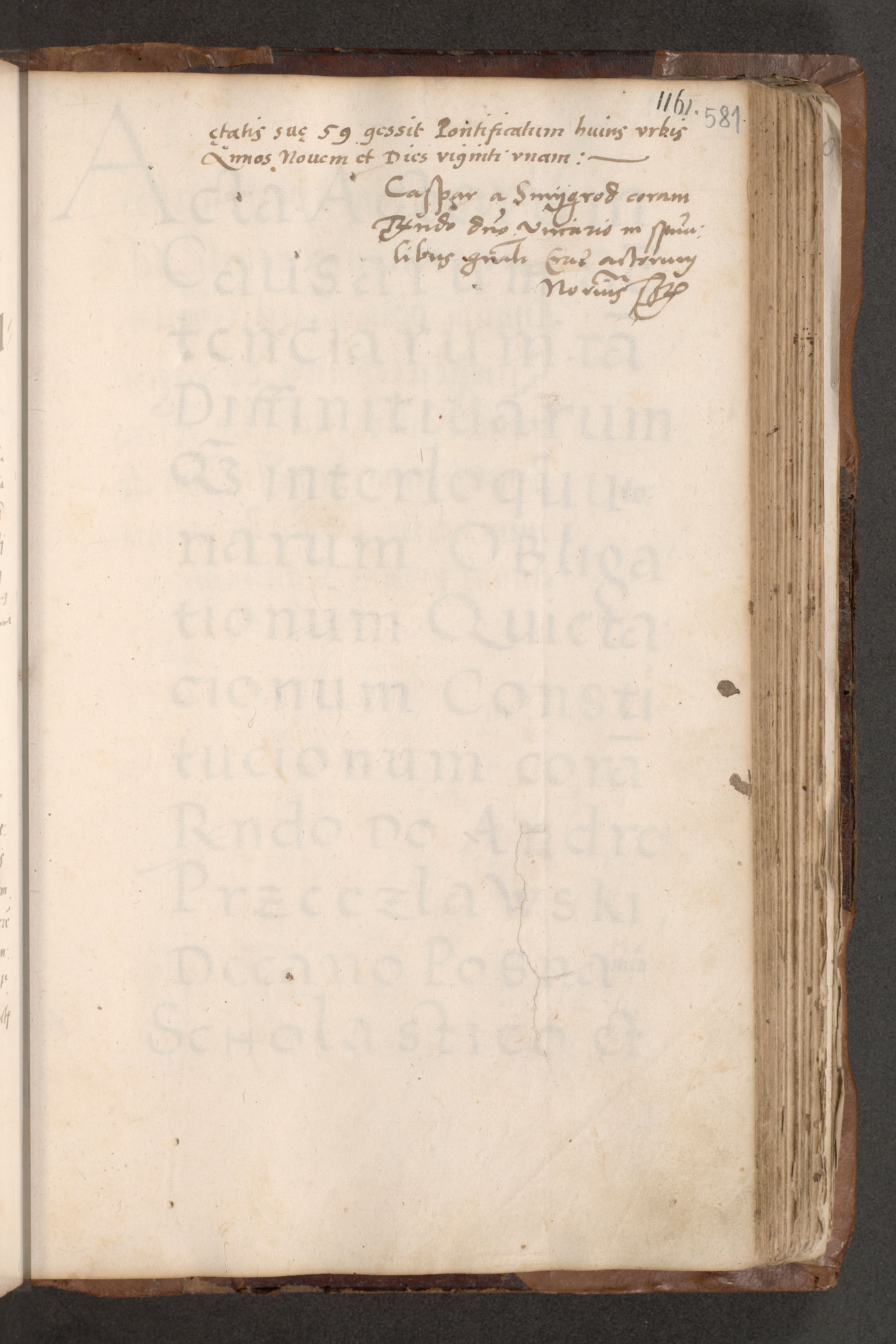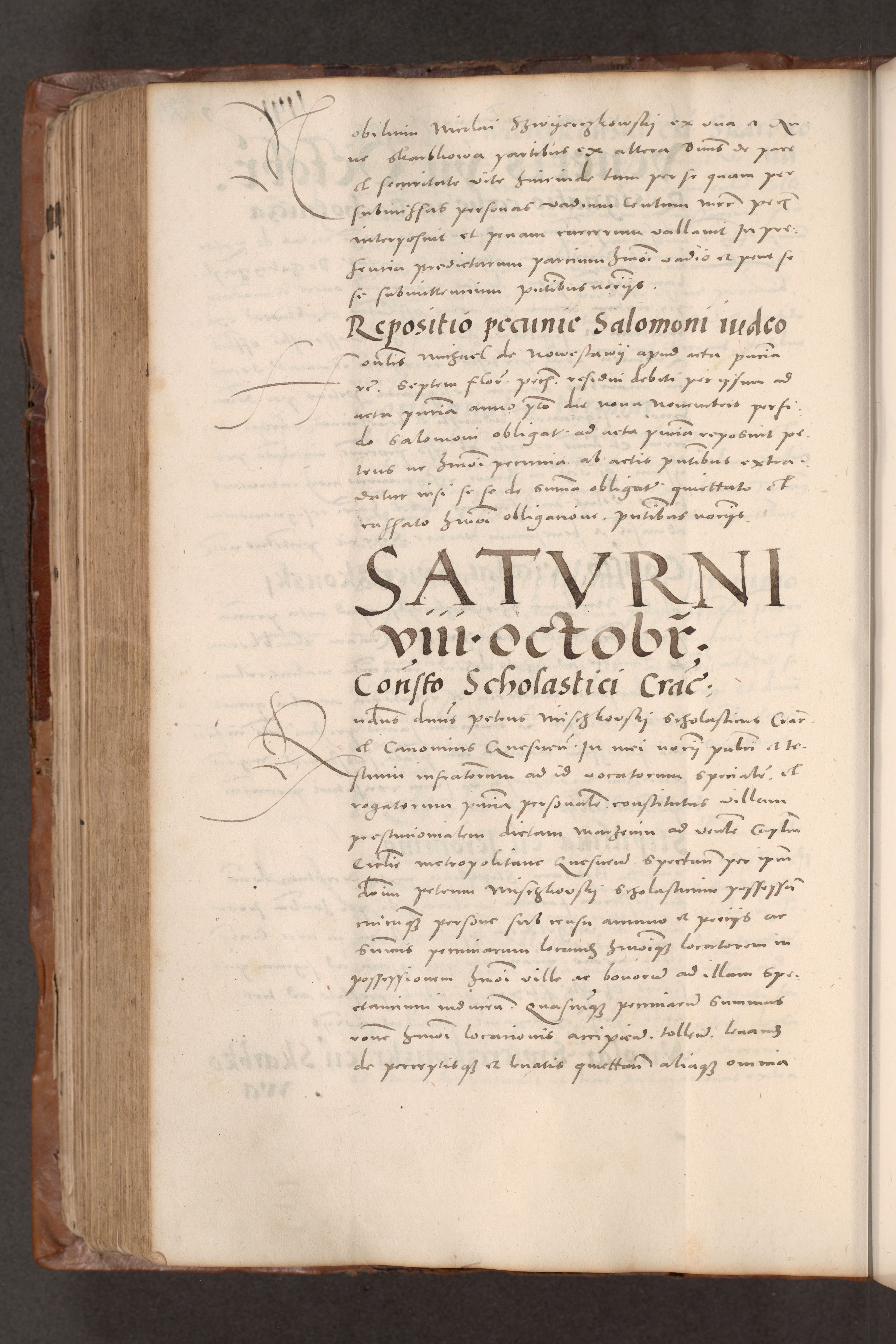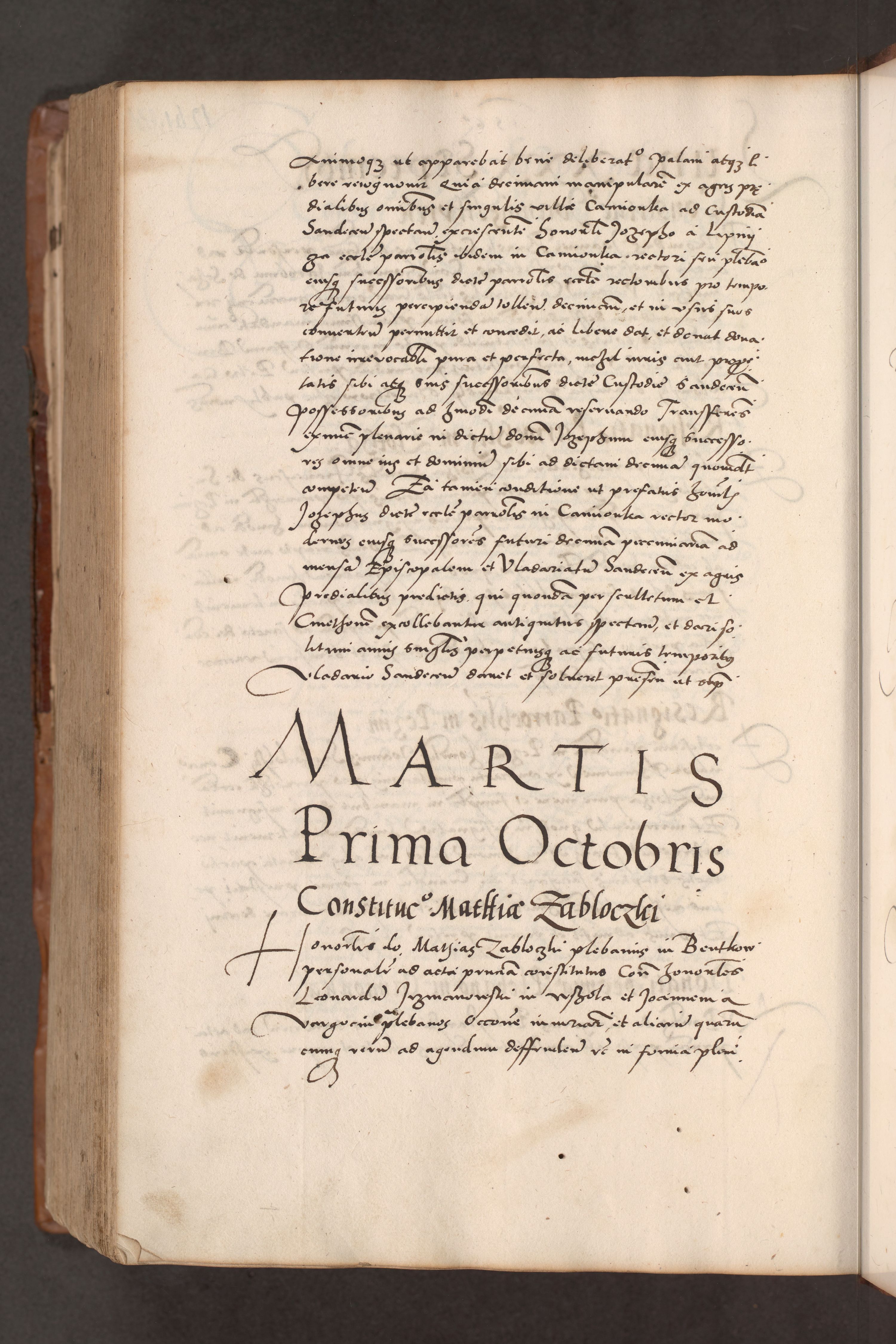 Acta actorum causarum, sententiarum tam diffinivarum quam interloquutoriarum, decretorum, obligationum, quietationum et constitutionum procuratorum coram reverendo domino Stanislao Szlomowski praeposito Calissieensi, archidiacono Sandecensi, canonico vicarioque in spiritualibus generali Cracoviensi ad annum Domini millesimum quingentesimum quinquagesimum octavum, cuius indicio prima, pontificatus sanctissimi domini nostri Pauli divina providencia pape quarti, anno illius tercio, feliciter sequuntur.