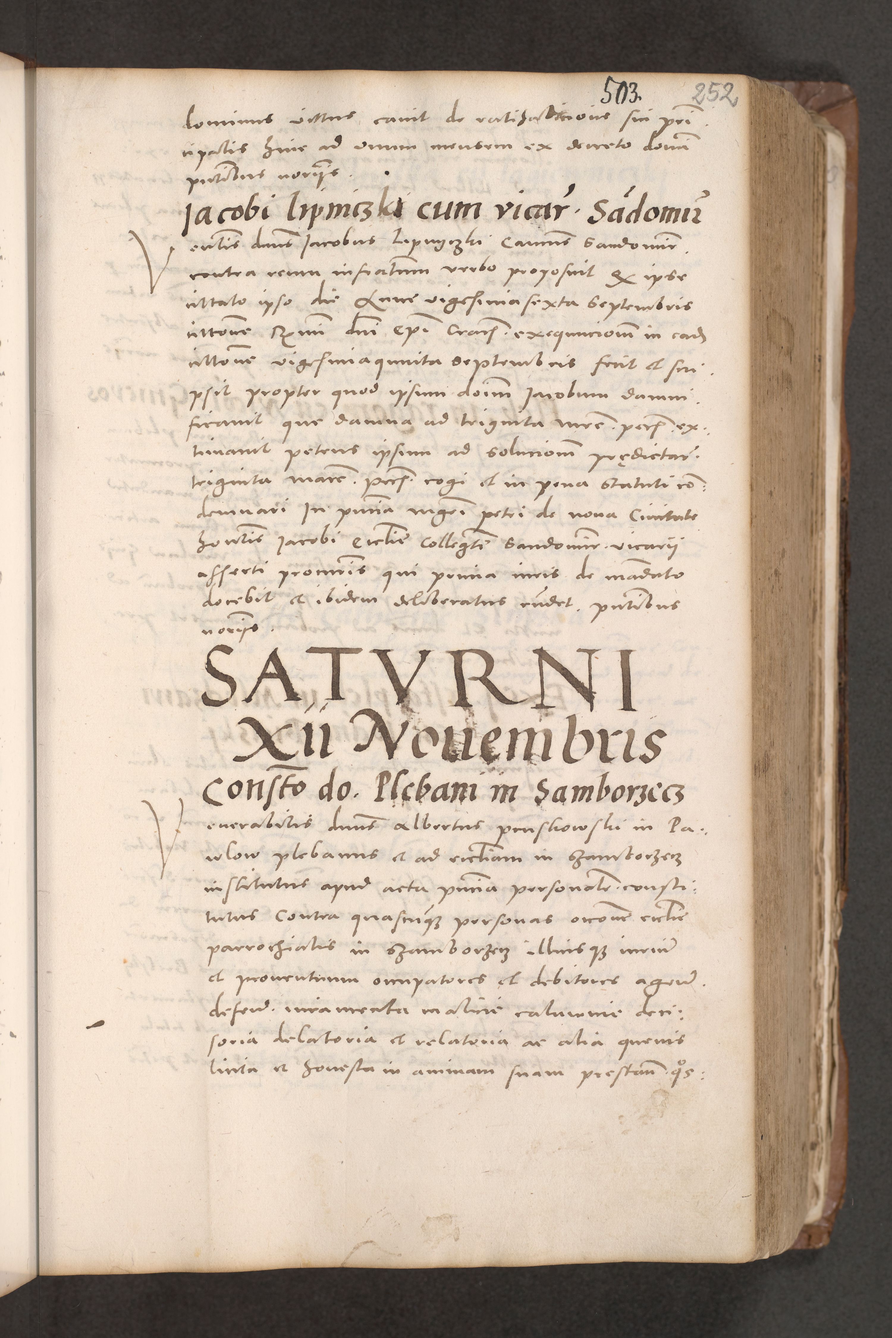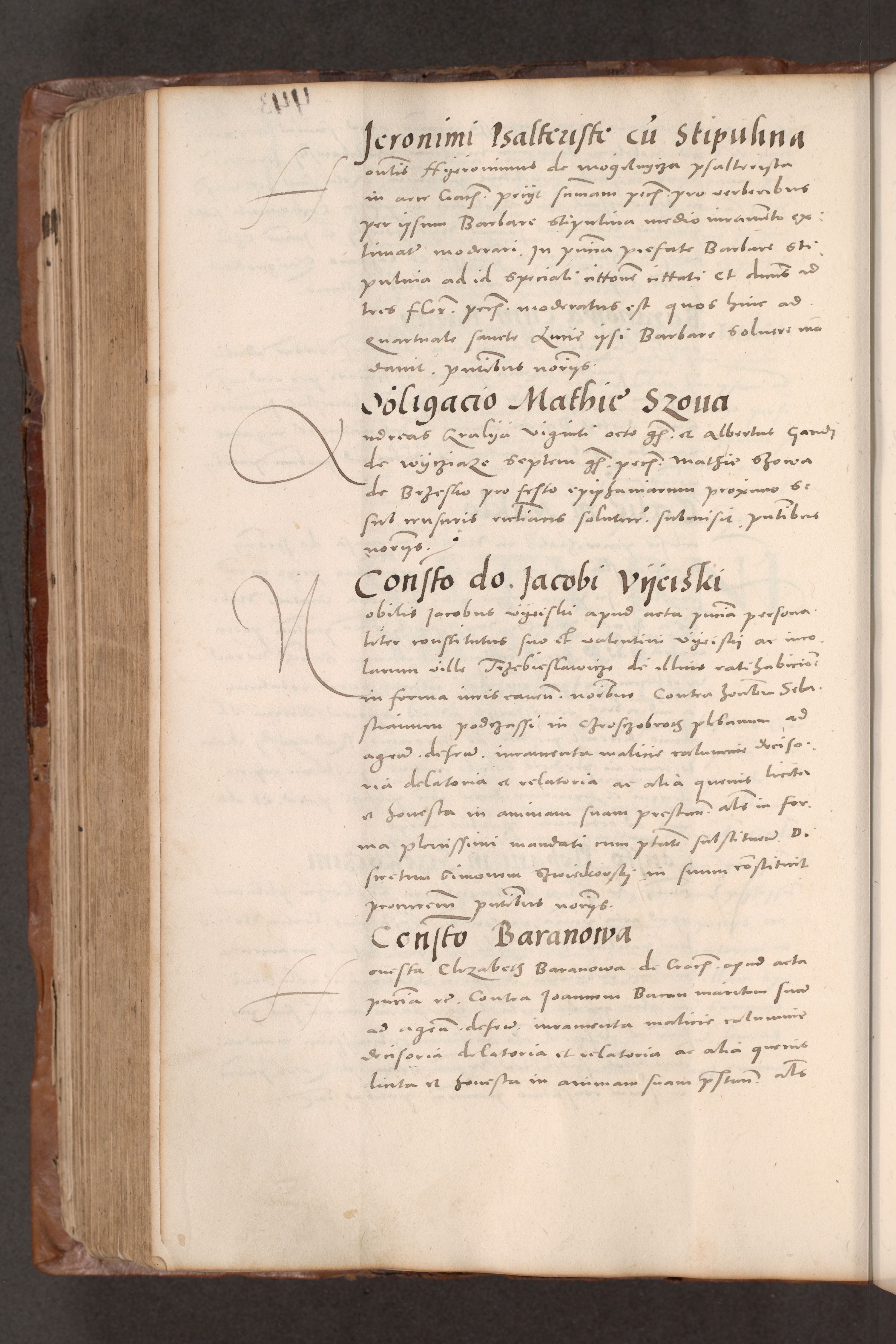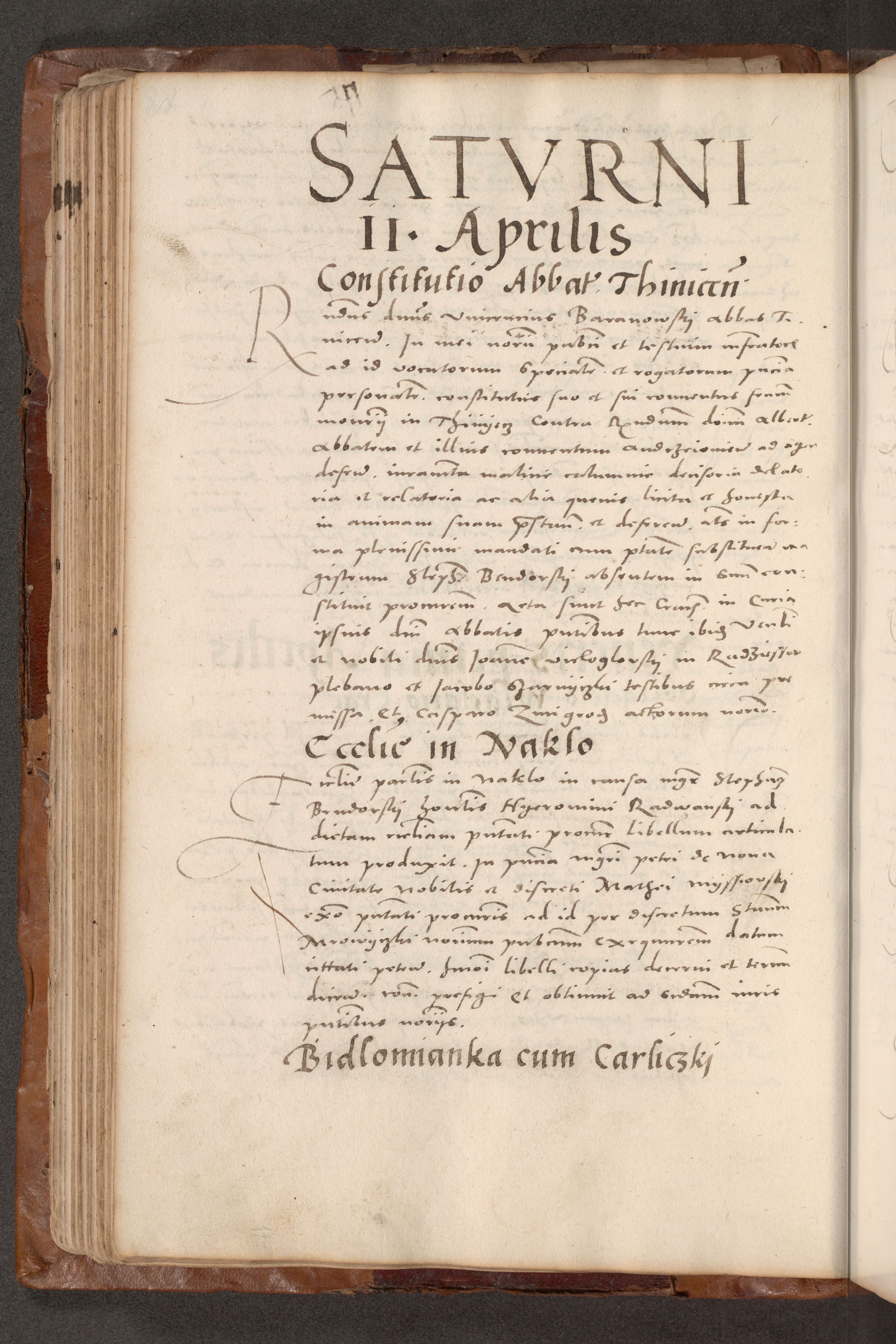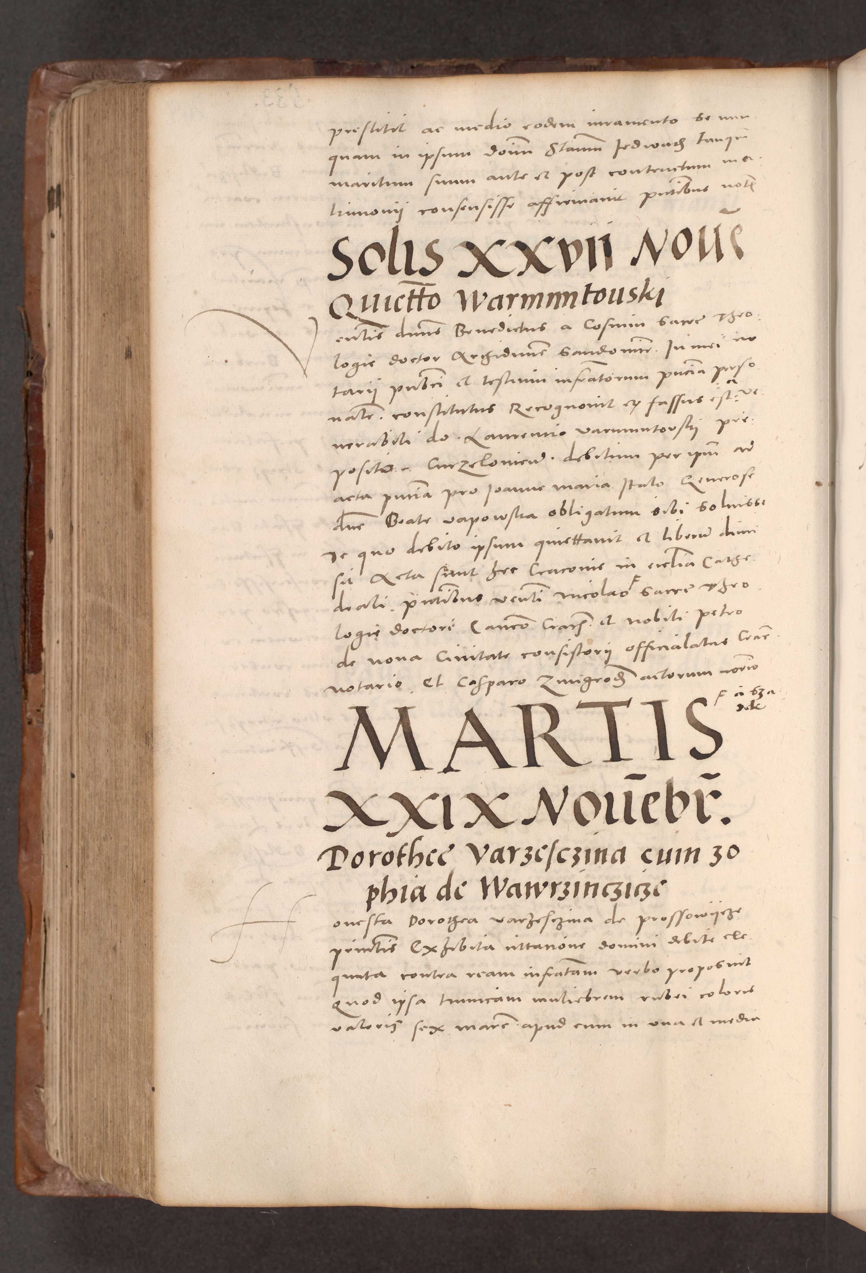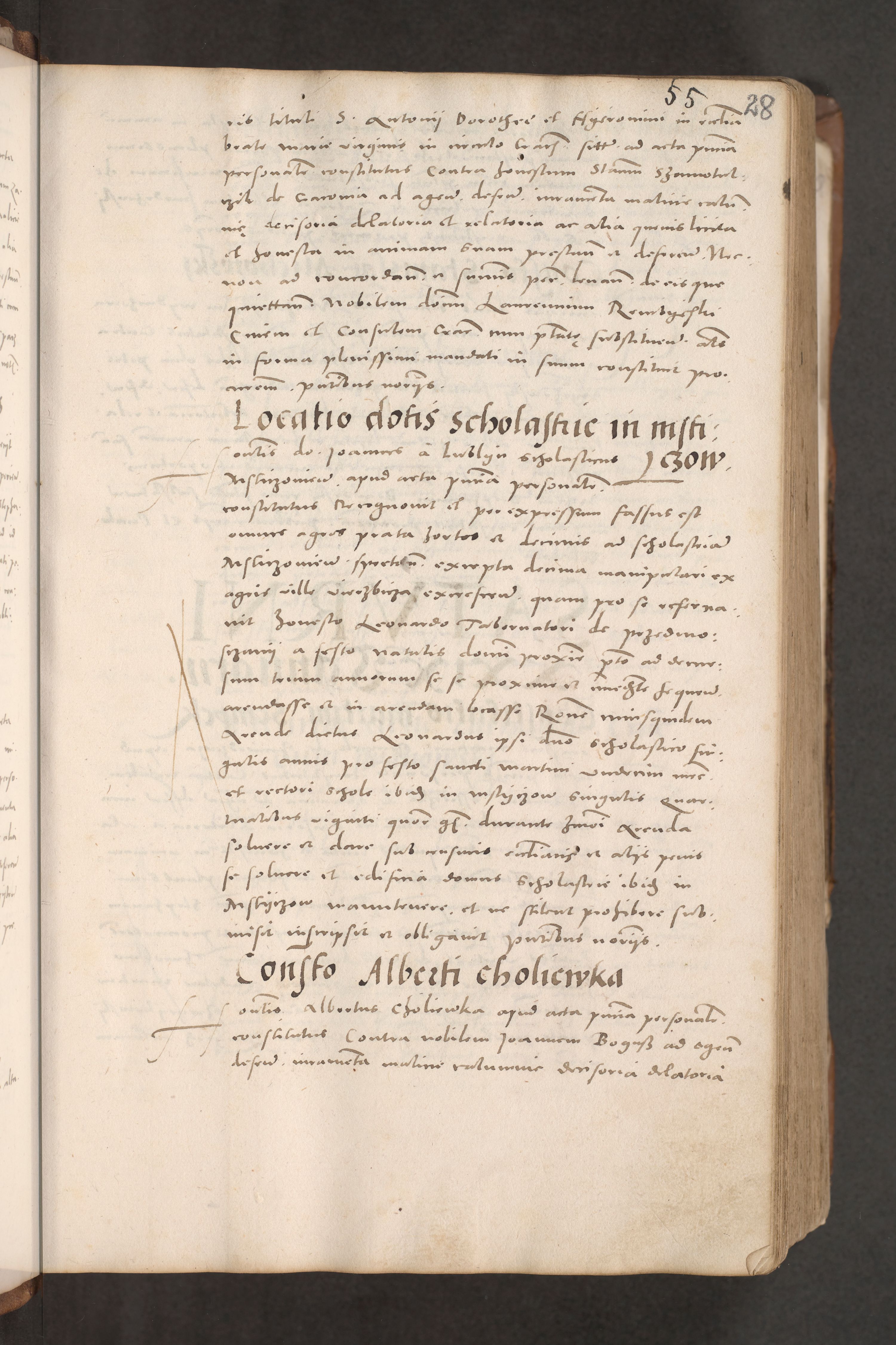 Acta actorum causarum, sententiarum tam diffinivarum quam interloquutoriarum, decretorum, obligationum, quietationum et constitutionum procuratorum coram reverendo domino Stanislao Szlomowski praeposito Calissieensi, archidiacono Sandecensi, canonico vicarioque in spiritualibus generali Cracoviensi ad annum Domini millesimum quingentesimum quinquagesimum octavum, cuius indicio prima, pontificatus sanctissimi domini nostri Pauli divina providencia pape quarti, anno illius tercio, feliciter sequuntur.