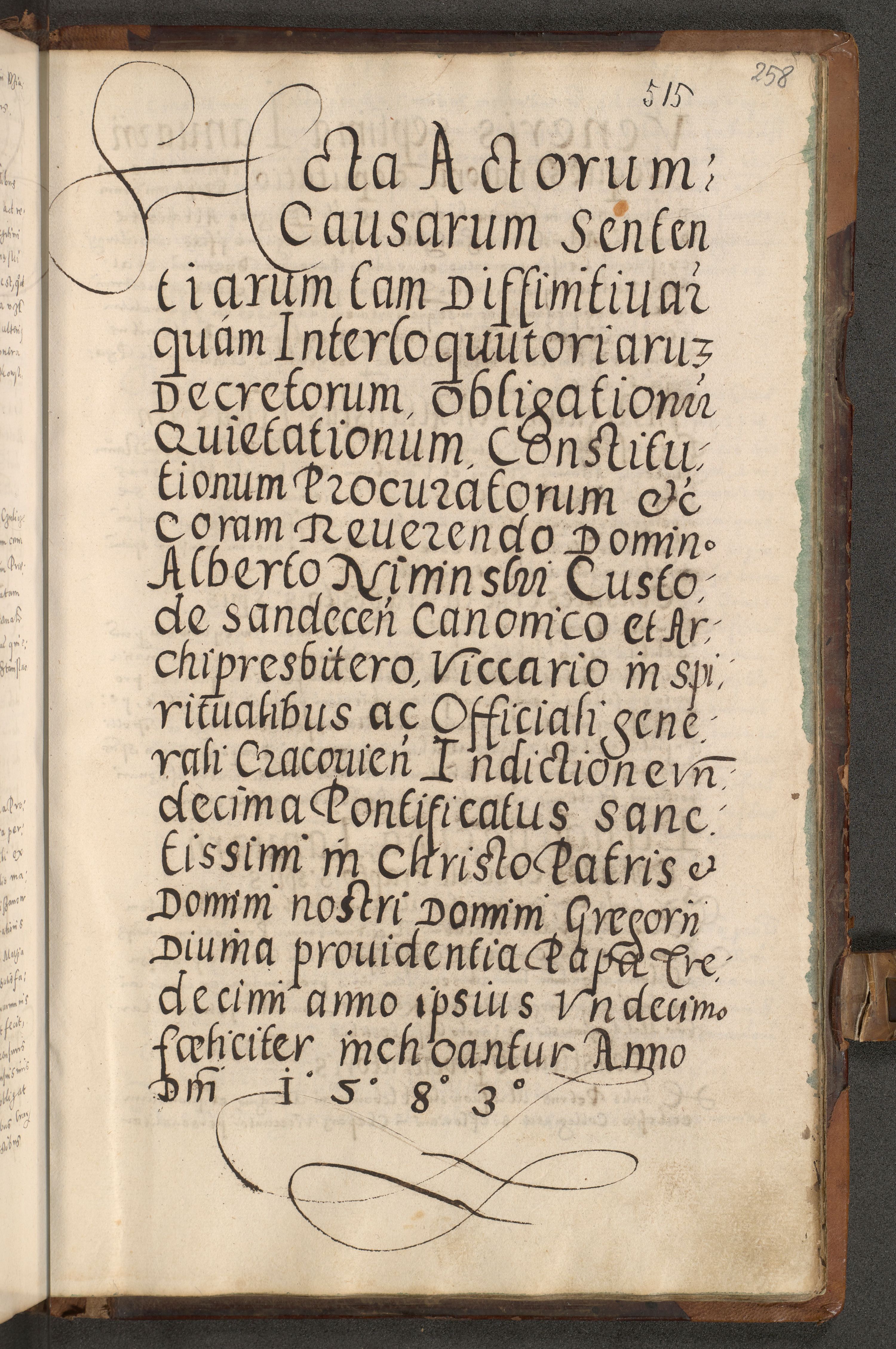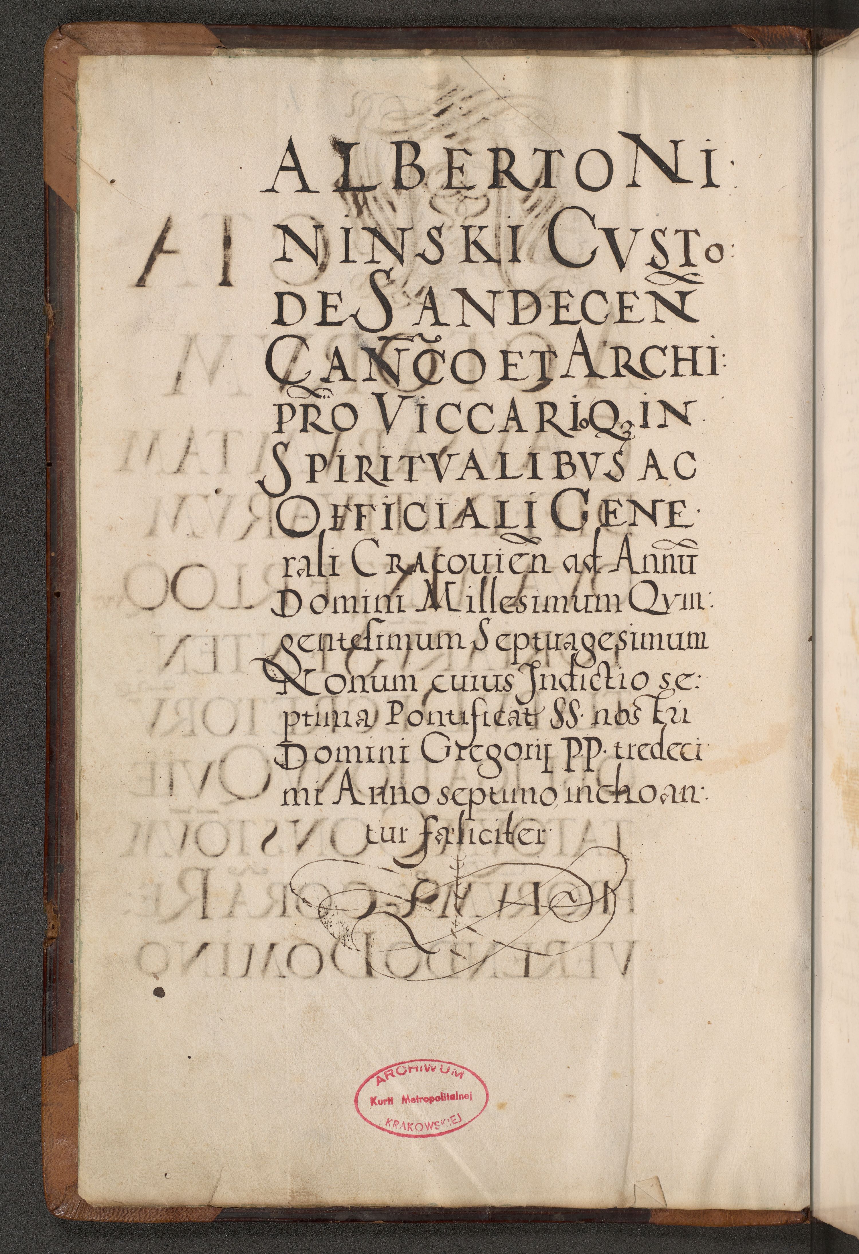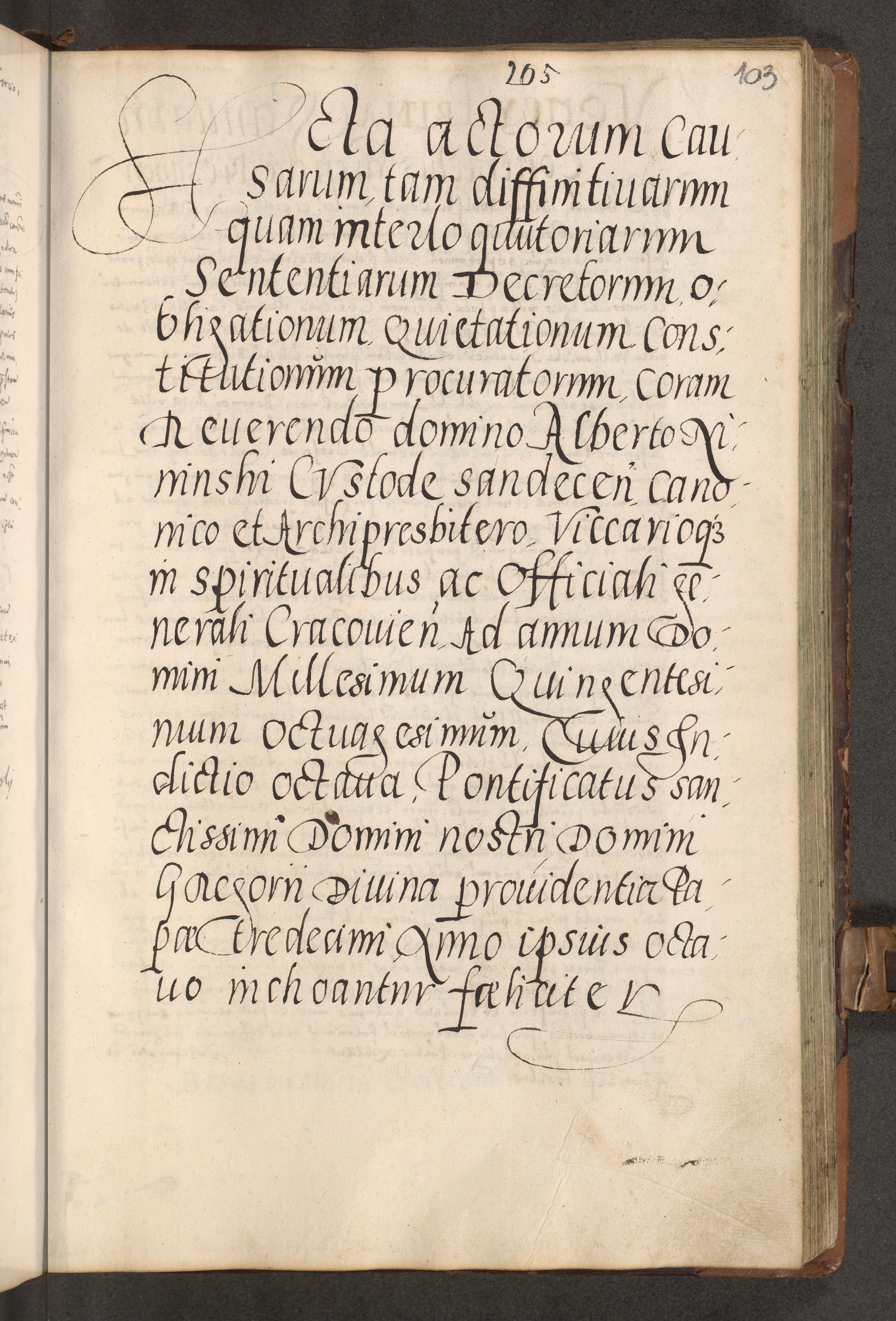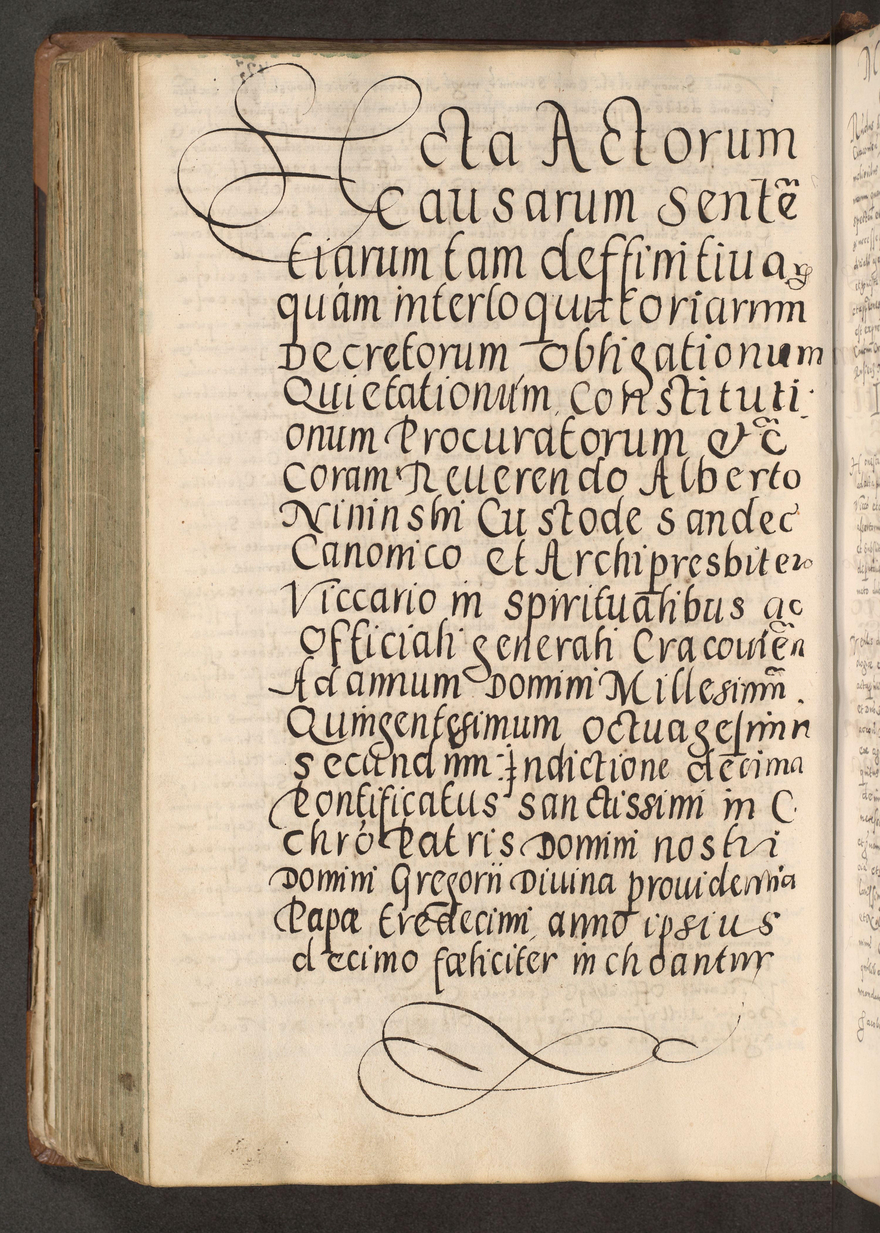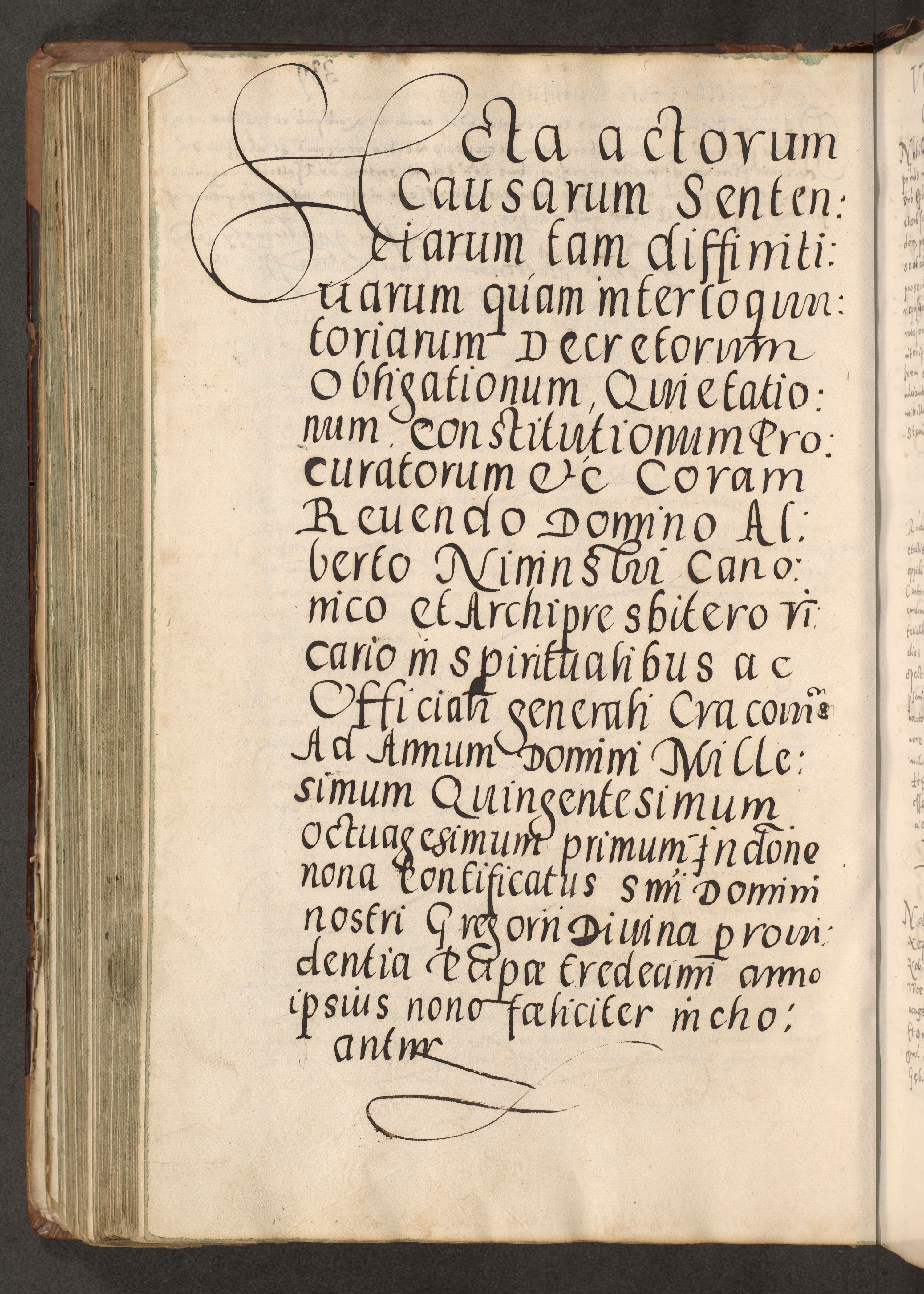 Acta actorum causarum tam diffinitivarum quam interloquutoriarum sententiarum decretorum obligationum quietatorum constuorum pro reverendum coram Reverendo Domino Alberto Nininski Custode Sandecensis Canonico et Archipresbitero Viccarioque in Spiritualibus ac Officiali Generali Cracoviensis ad Annum Domini Millesimum Qumgentesimum Septuagentesimum Nonum cuius Judictio septima Pontificat SS. nostri Domini Gregory pp. tredecimi Anno septimo inchoantur faliciter