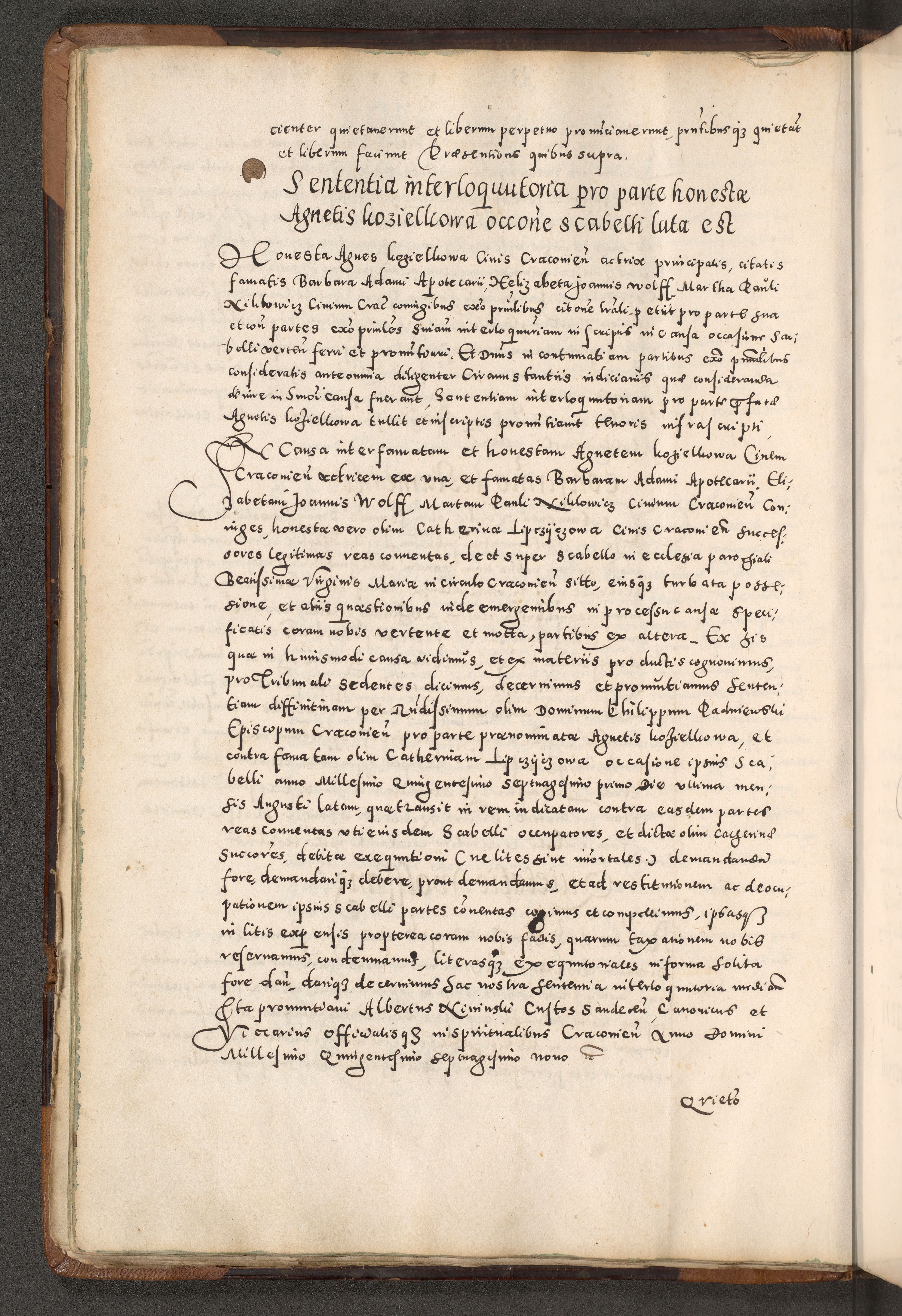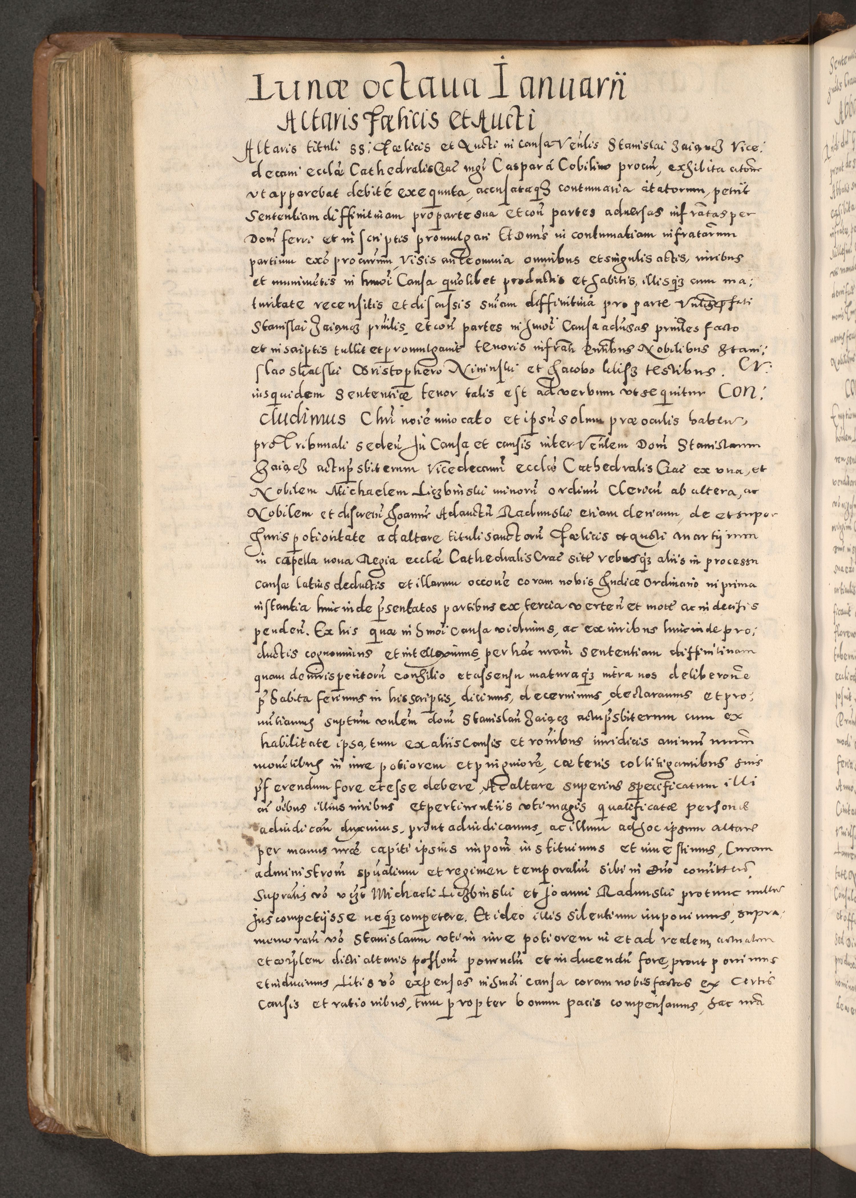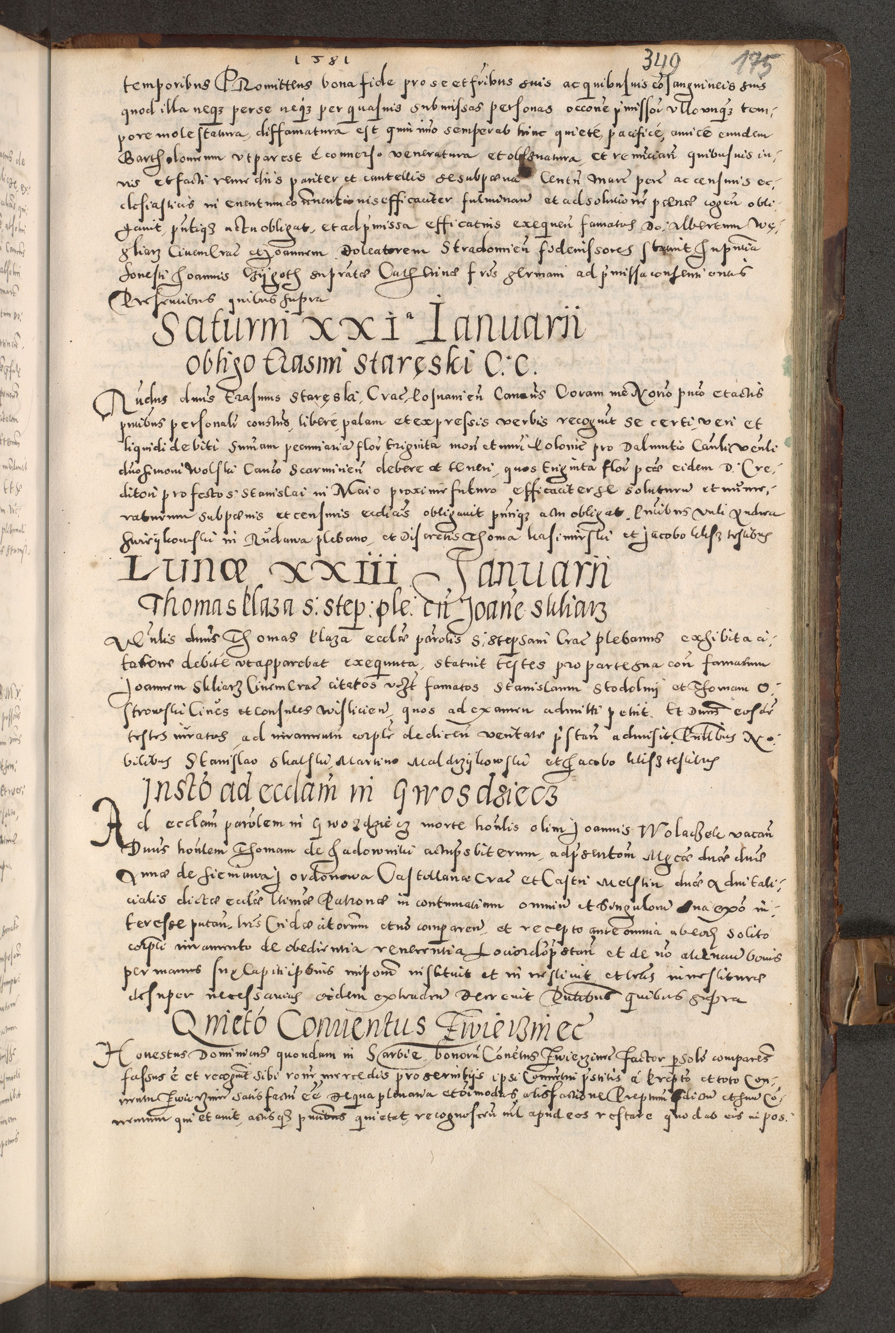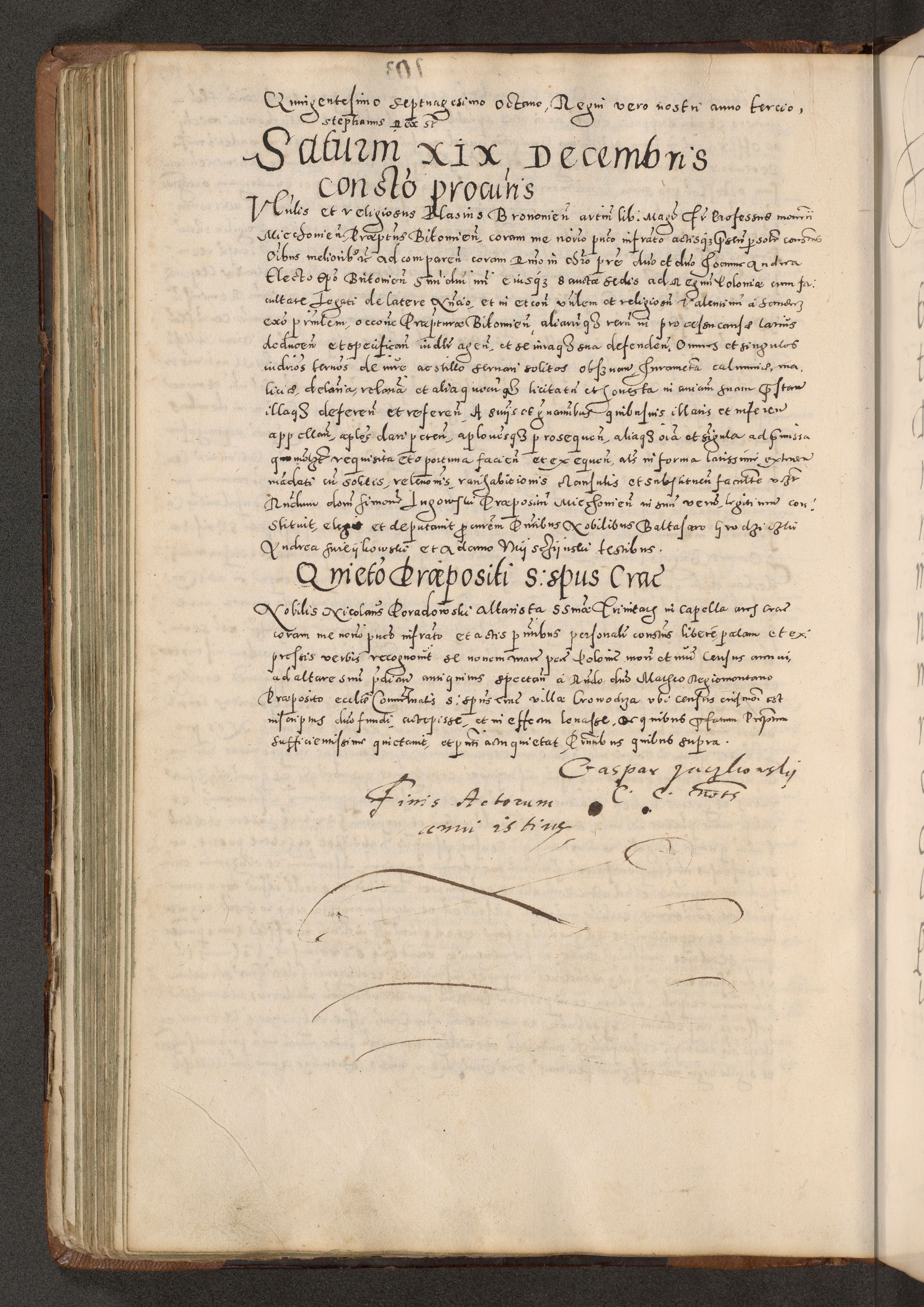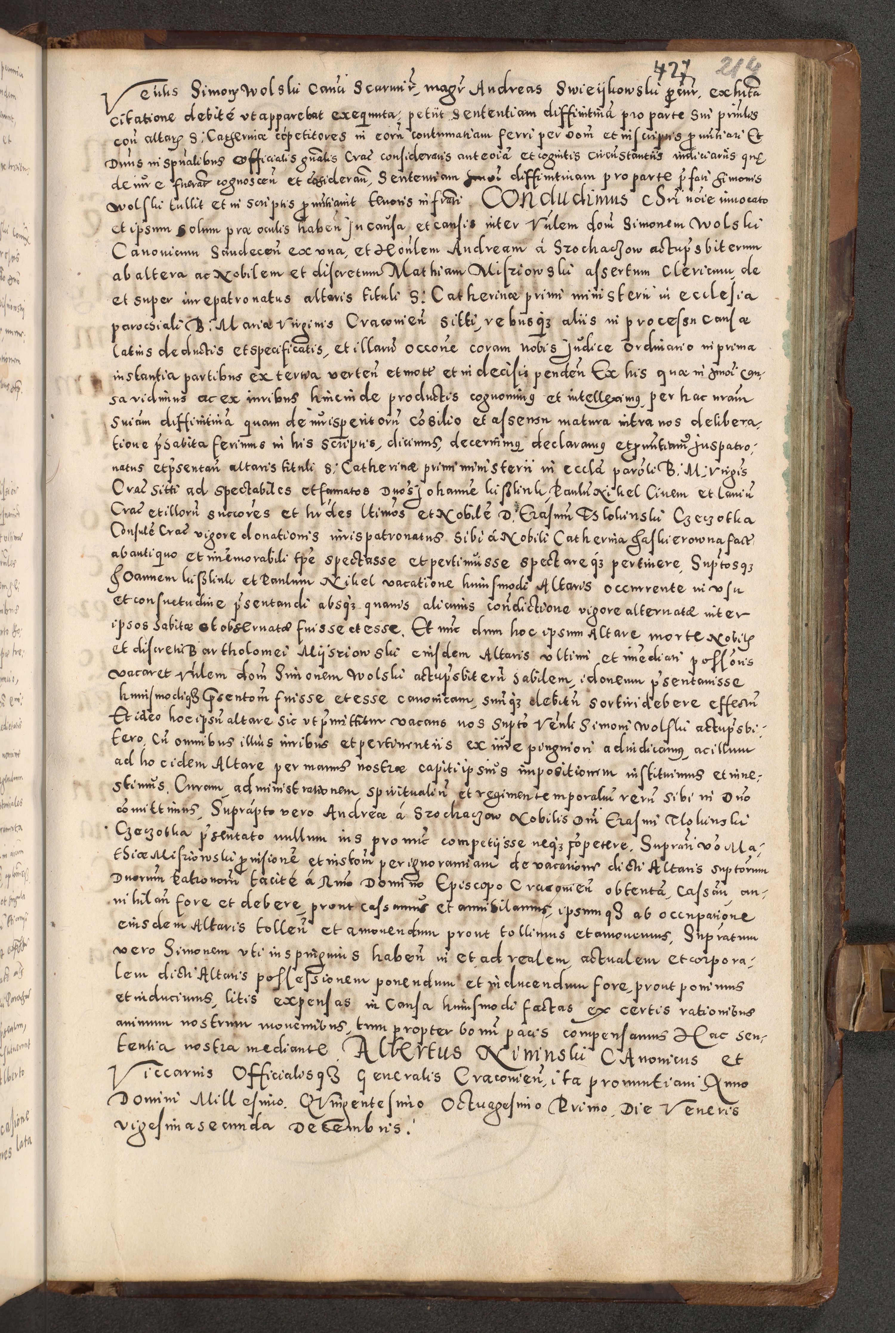 Acta actorum causarum tam diffinitivarum quam interloquutoriarum sententiarum decretorum obligationum quietatorum constuorum pro reverendum coram Reverendo Domino Alberto Nininski Custode Sandecensis Canonico et Archipresbitero Viccarioque in Spiritualibus ac Officiali Generali Cracoviensis ad Annum Domini Millesimum Qumgentesimum Septuagentesimum Nonum cuius Judictio septima Pontificat SS. nostri Domini Gregory pp. tredecimi Anno septimo inchoantur faliciter