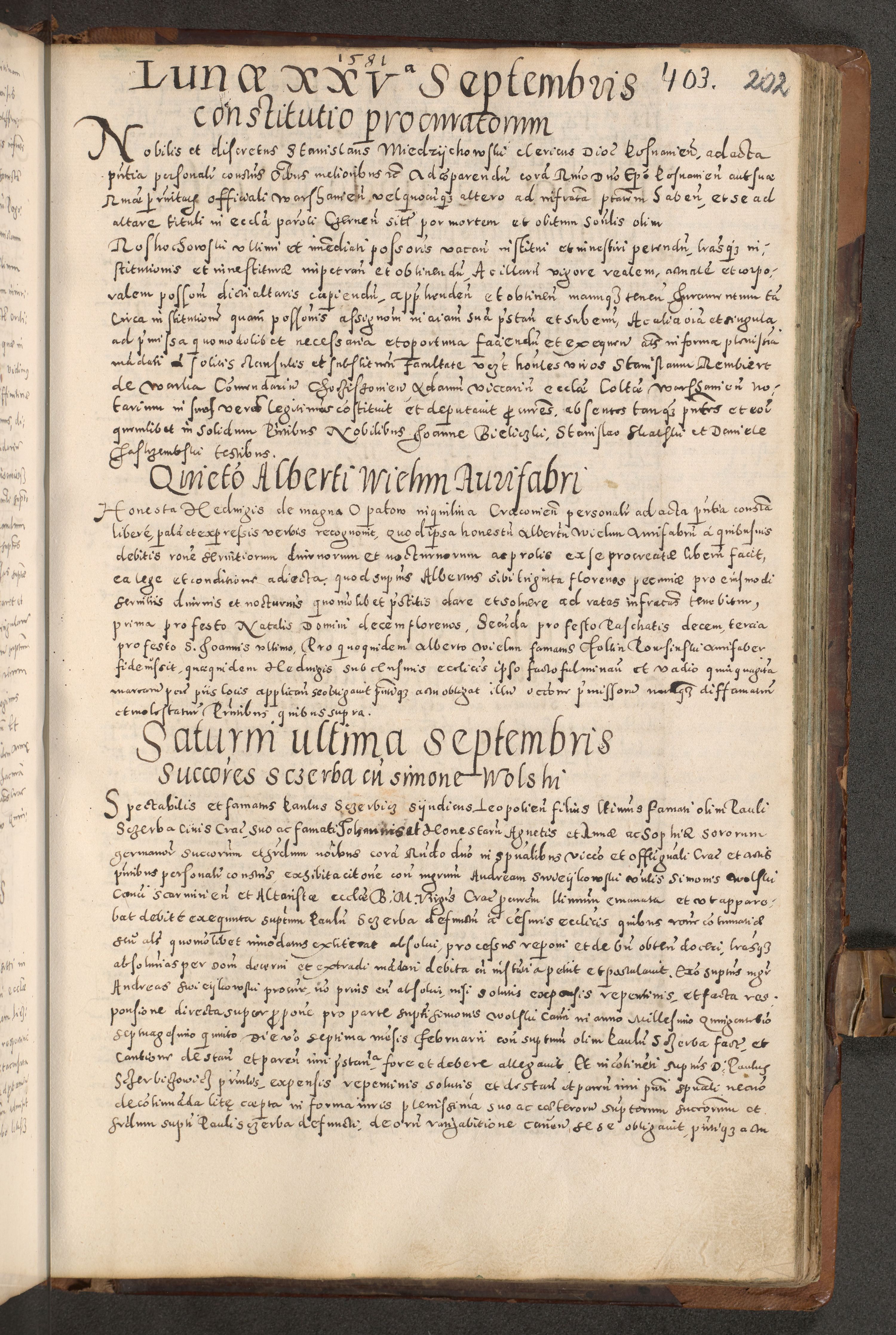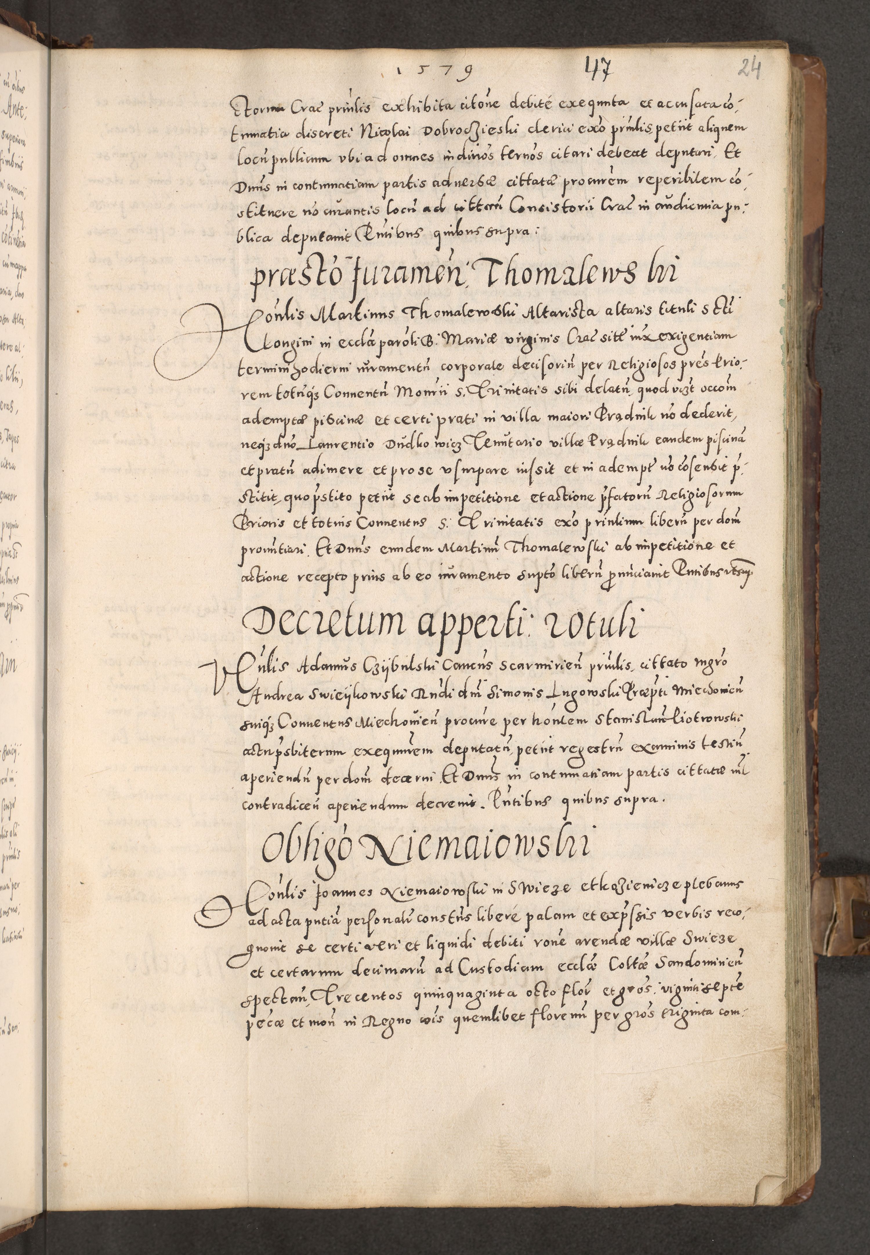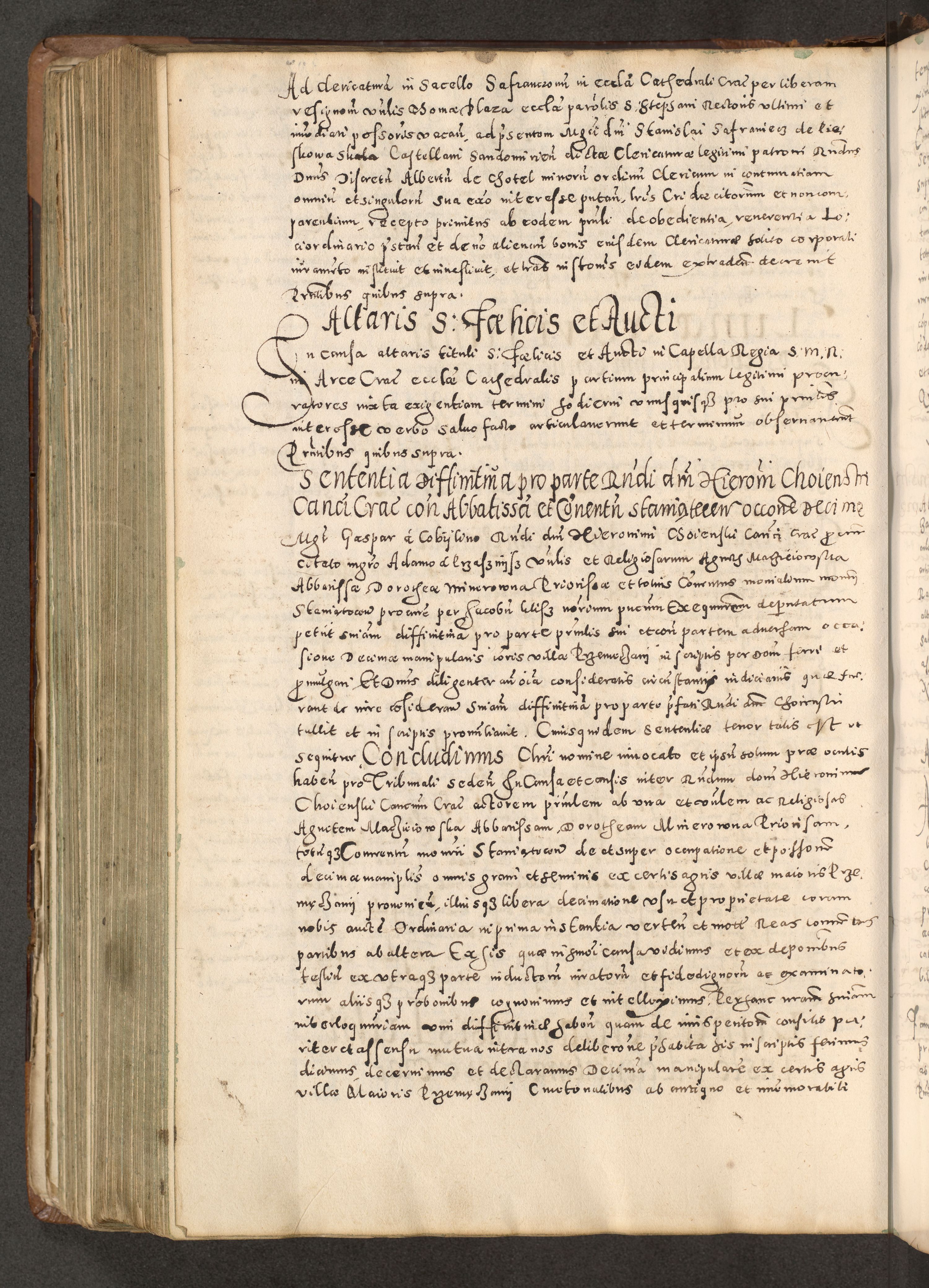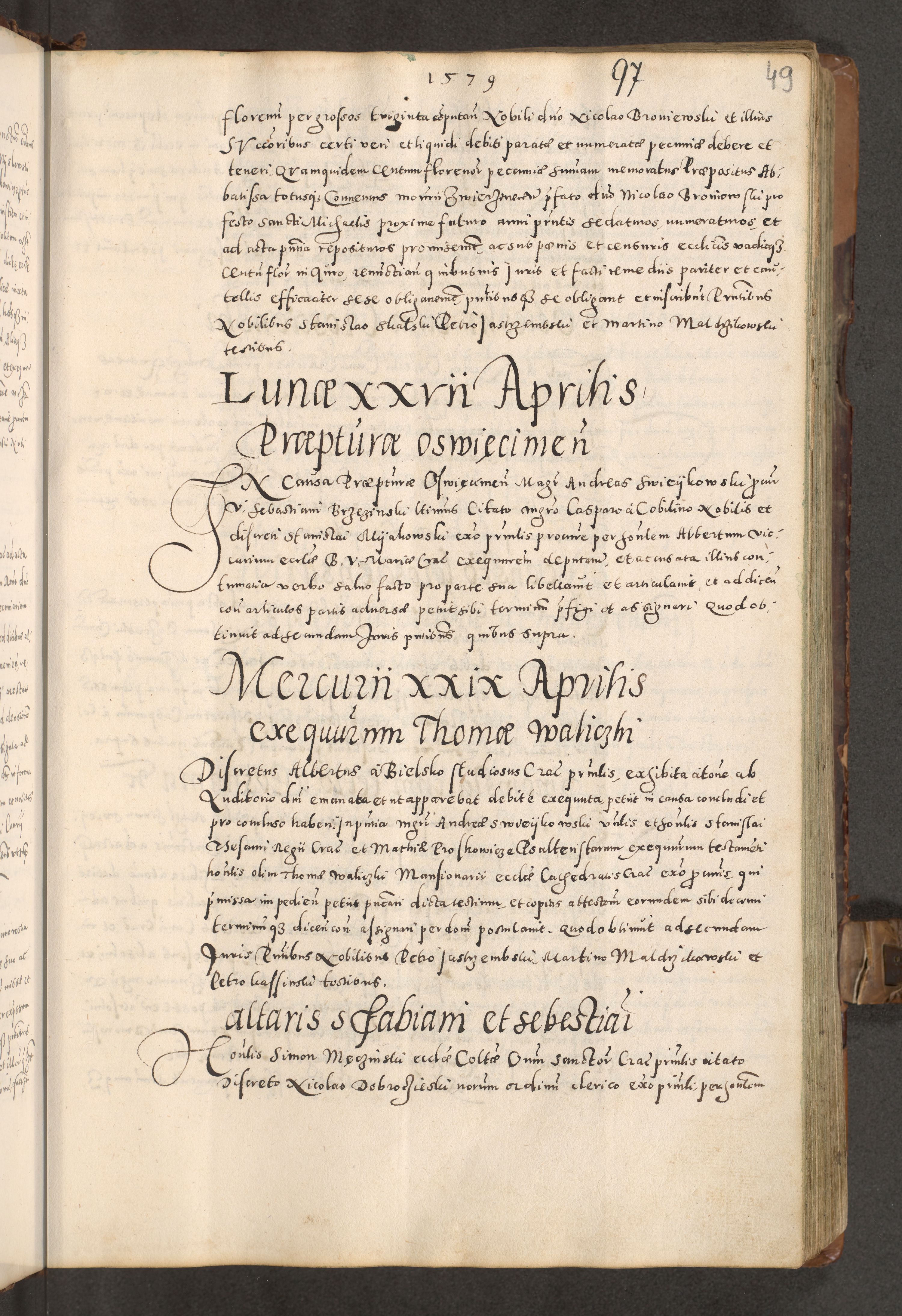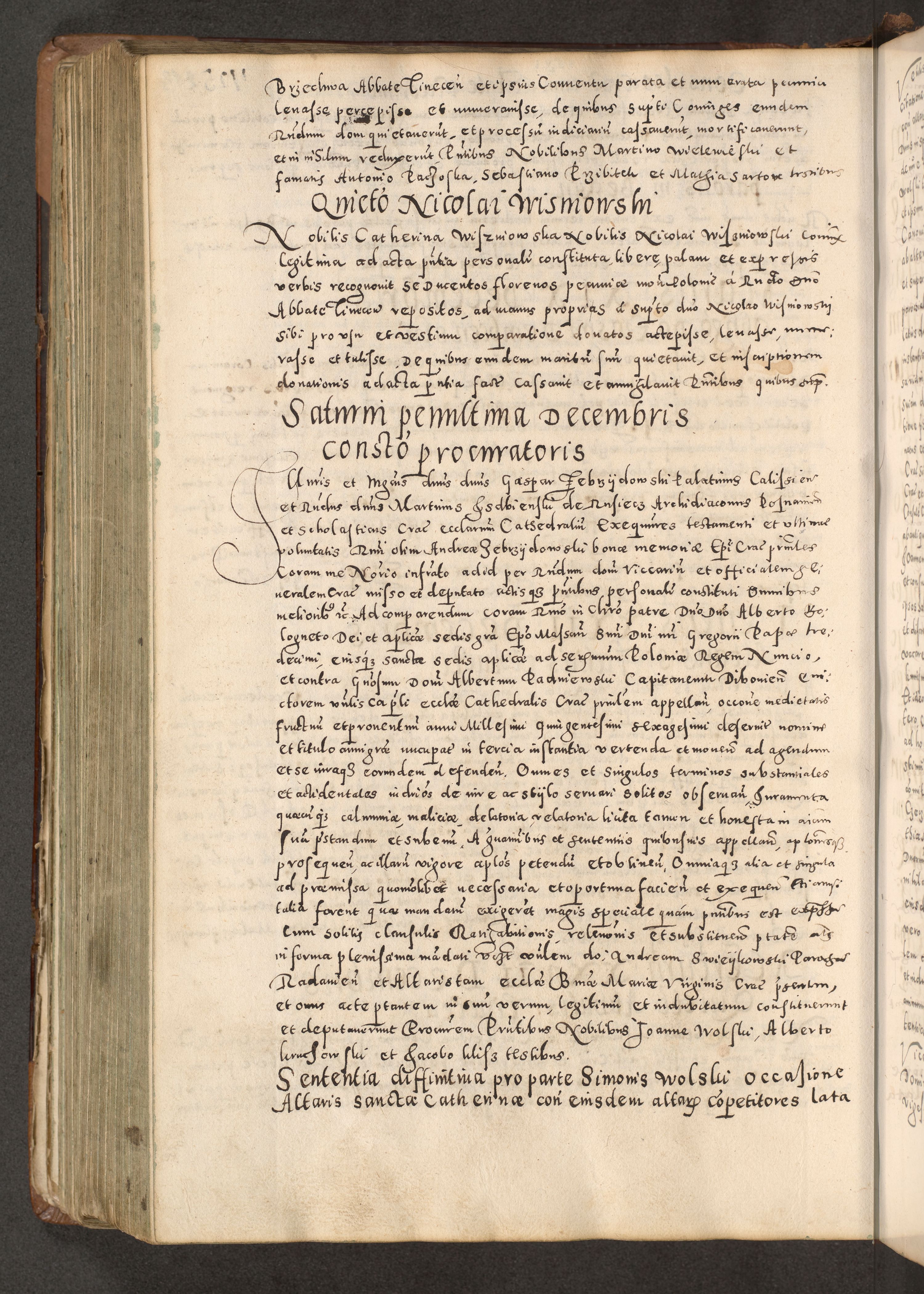 Acta actorum causarum tam diffinitivarum quam interloquutoriarum sententiarum decretorum obligationum quietatorum constuorum pro reverendum coram Reverendo Domino Alberto Nininski Custode Sandecensis Canonico et Archipresbitero Viccarioque in Spiritualibus ac Officiali Generali Cracoviensis ad Annum Domini Millesimum Qumgentesimum Septuagentesimum Nonum cuius Judictio septima Pontificat SS. nostri Domini Gregory pp. tredecimi Anno septimo inchoantur faliciter