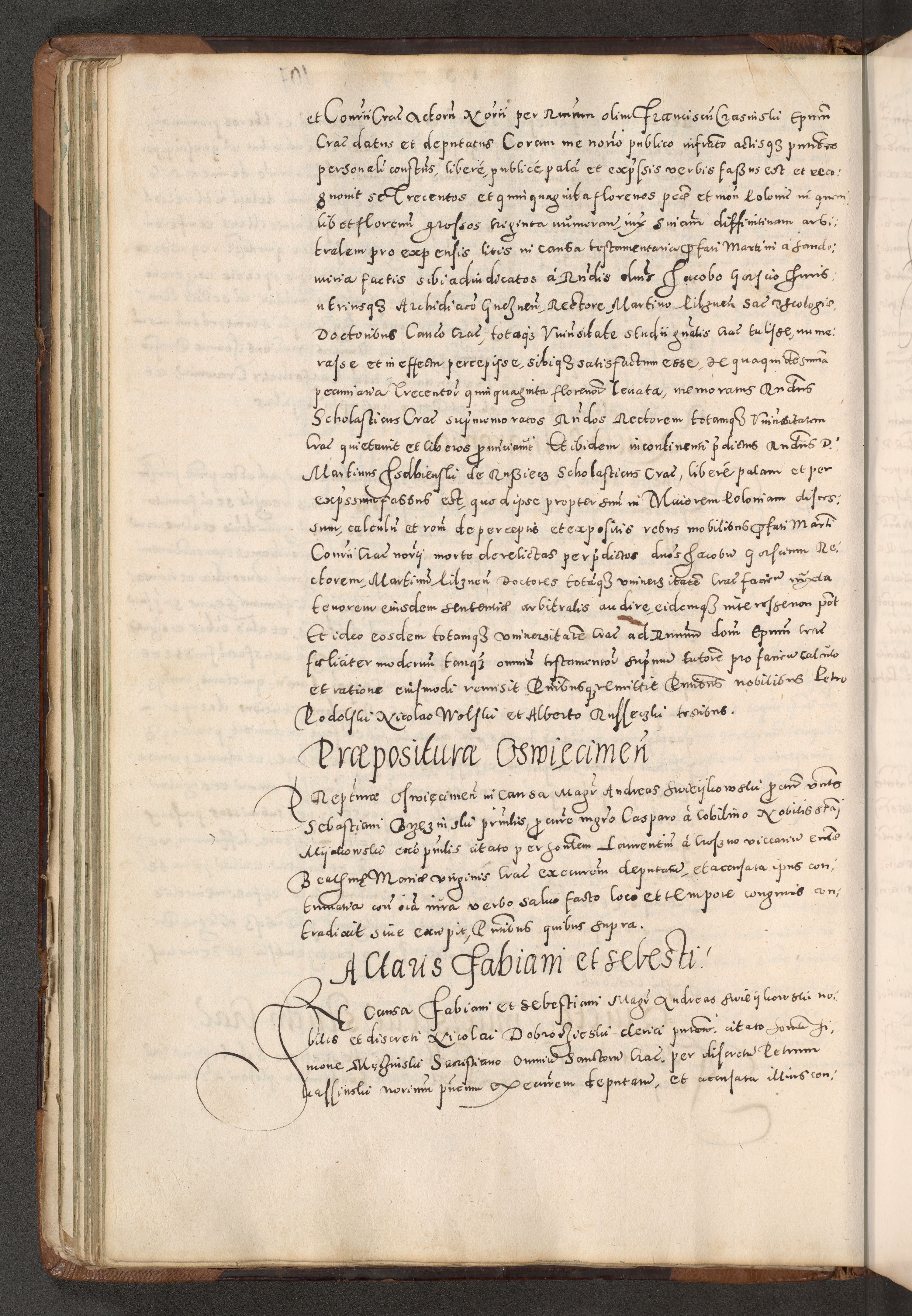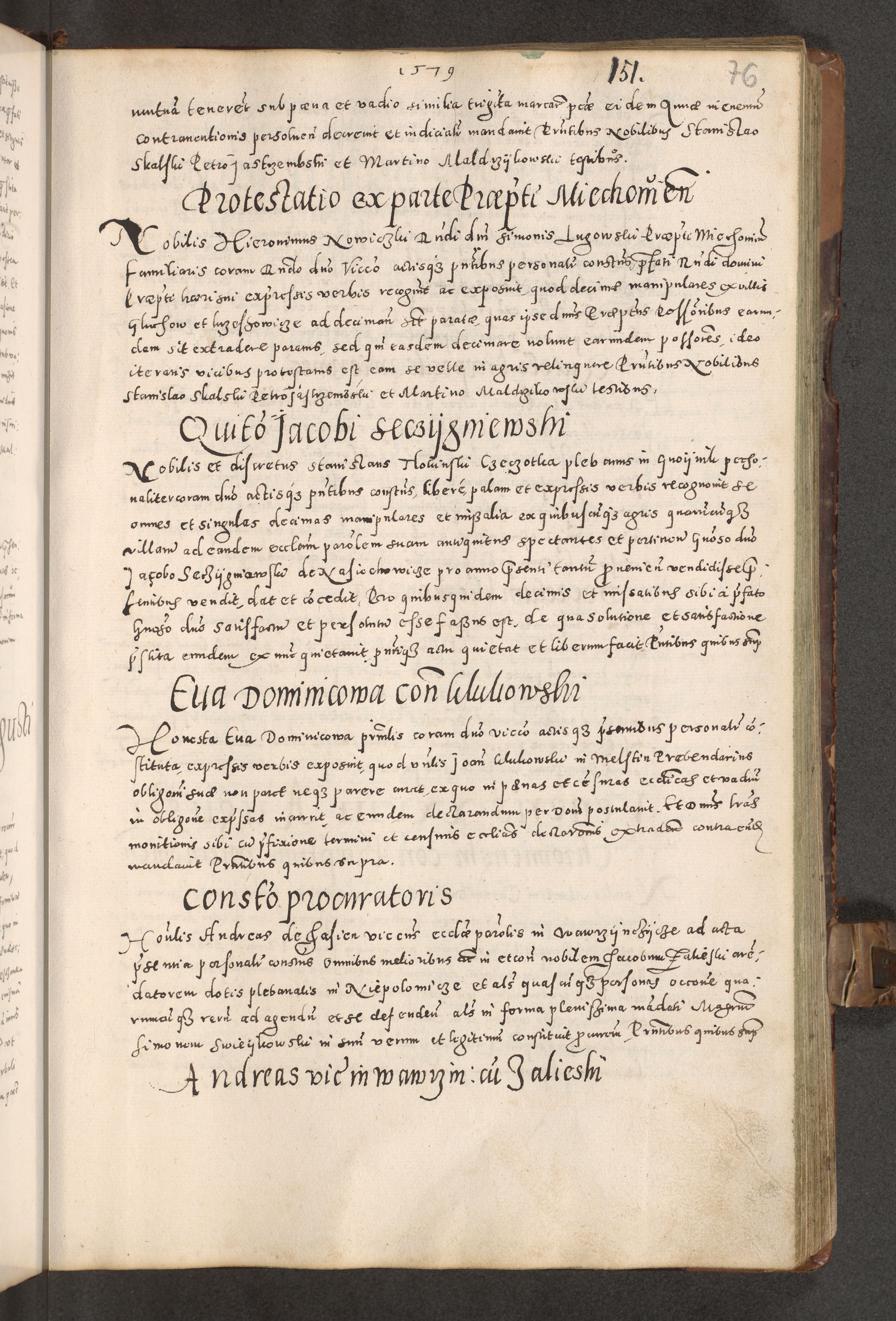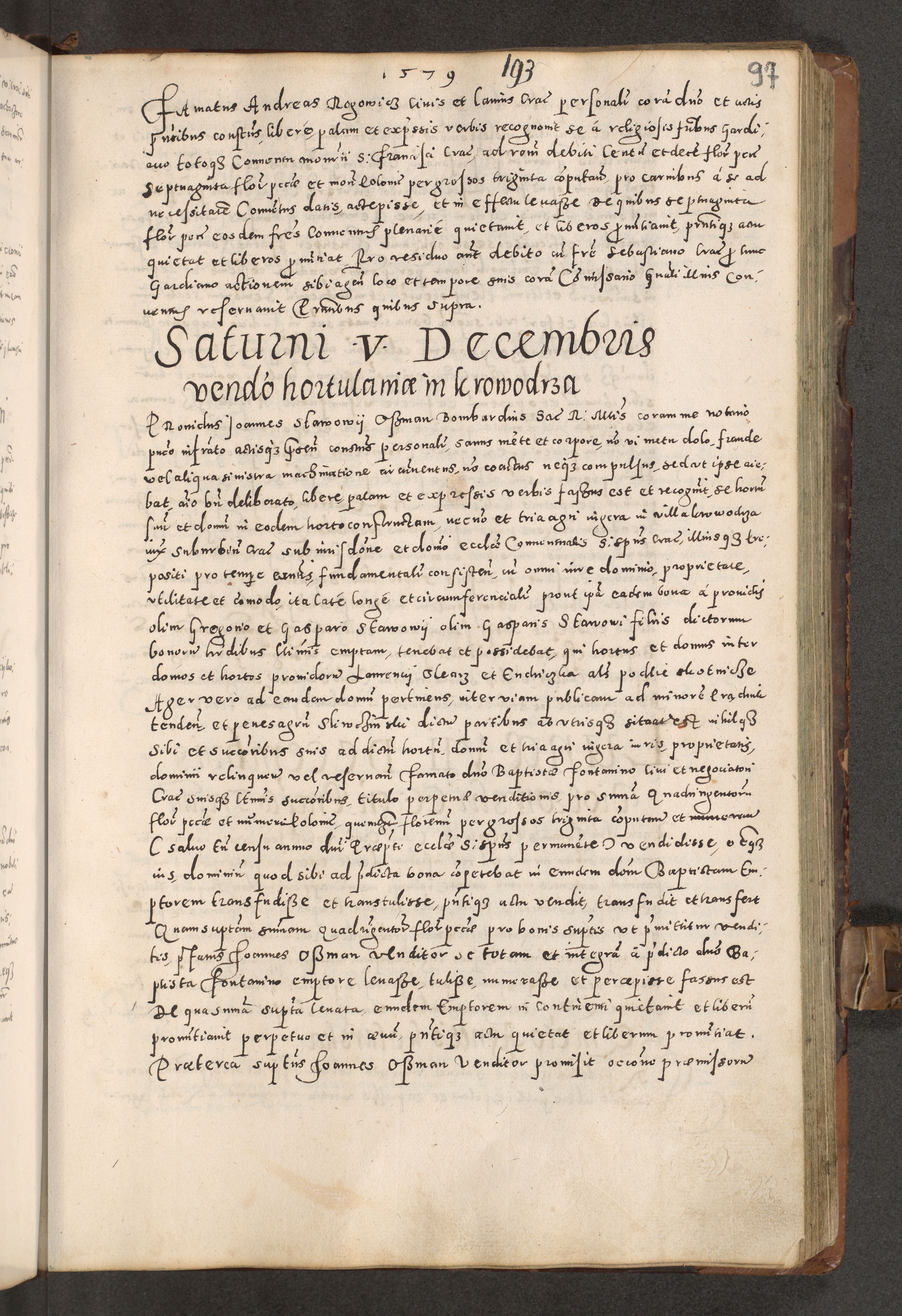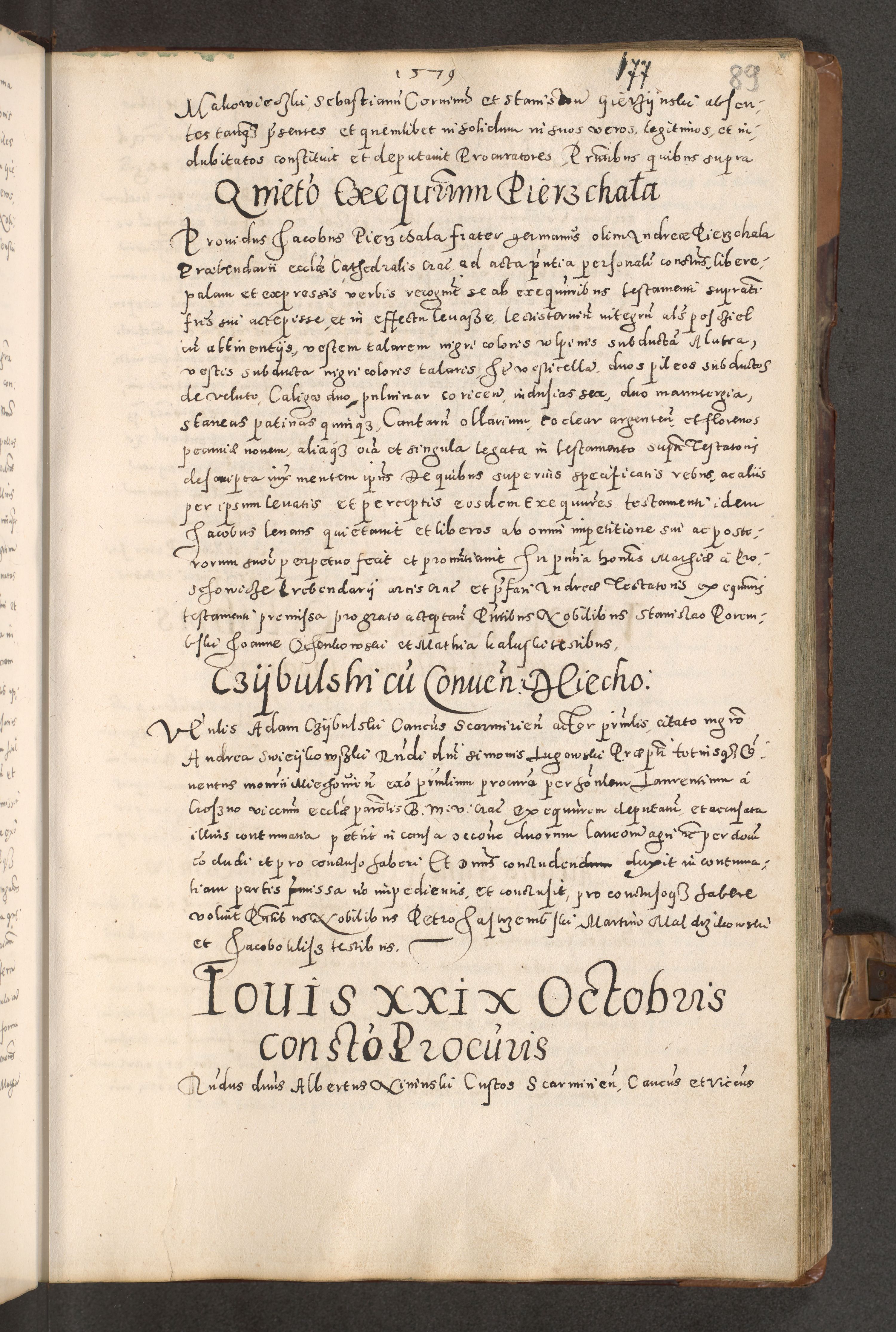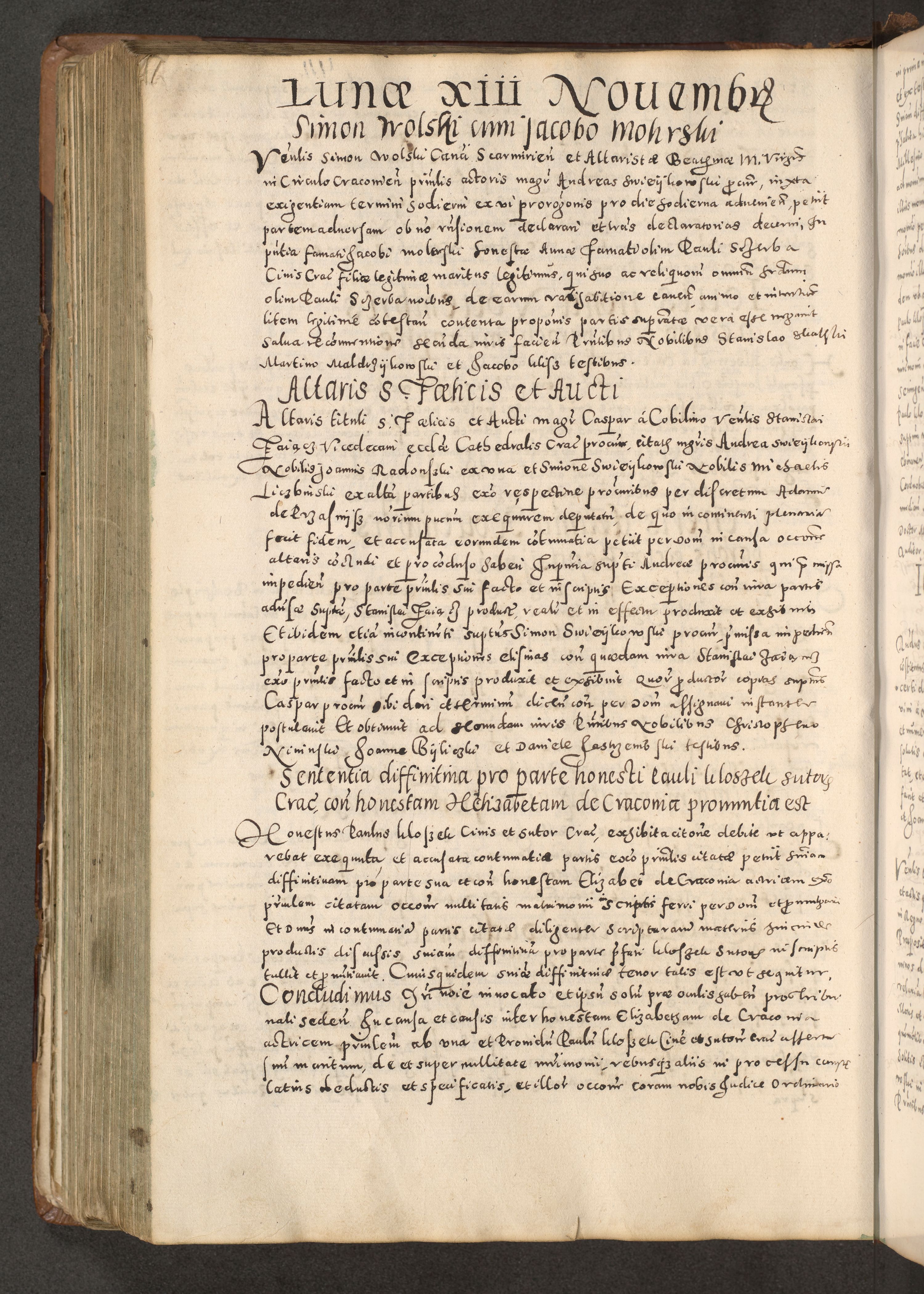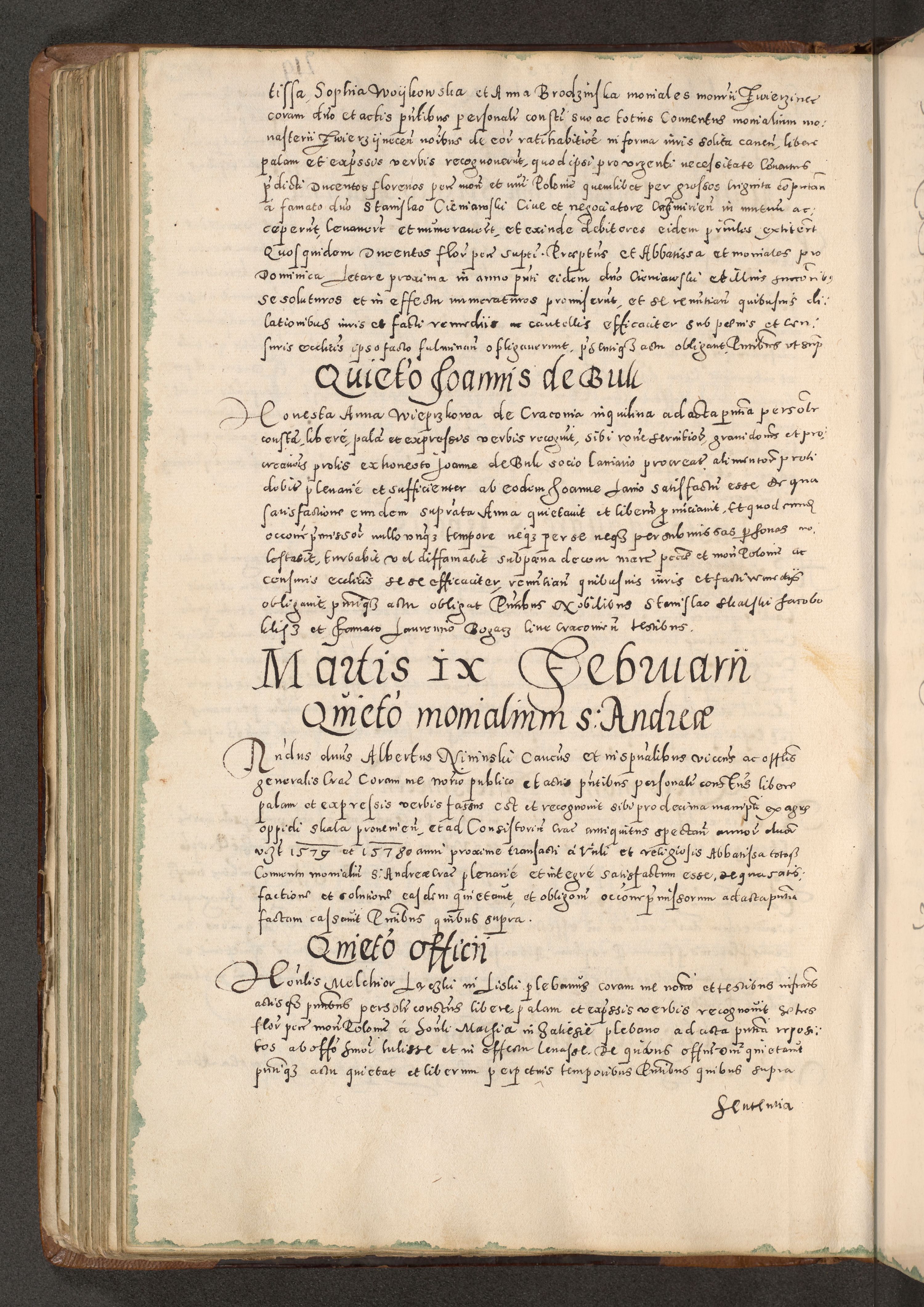 Acta actorum causarum tam diffinitivarum quam interloquutoriarum sententiarum decretorum obligationum quietatorum constuorum pro reverendum coram Reverendo Domino Alberto Nininski Custode Sandecensis Canonico et Archipresbitero Viccarioque in Spiritualibus ac Officiali Generali Cracoviensis ad Annum Domini Millesimum Qumgentesimum Septuagentesimum Nonum cuius Judictio septima Pontificat SS. nostri Domini Gregory pp. tredecimi Anno septimo inchoantur faliciter