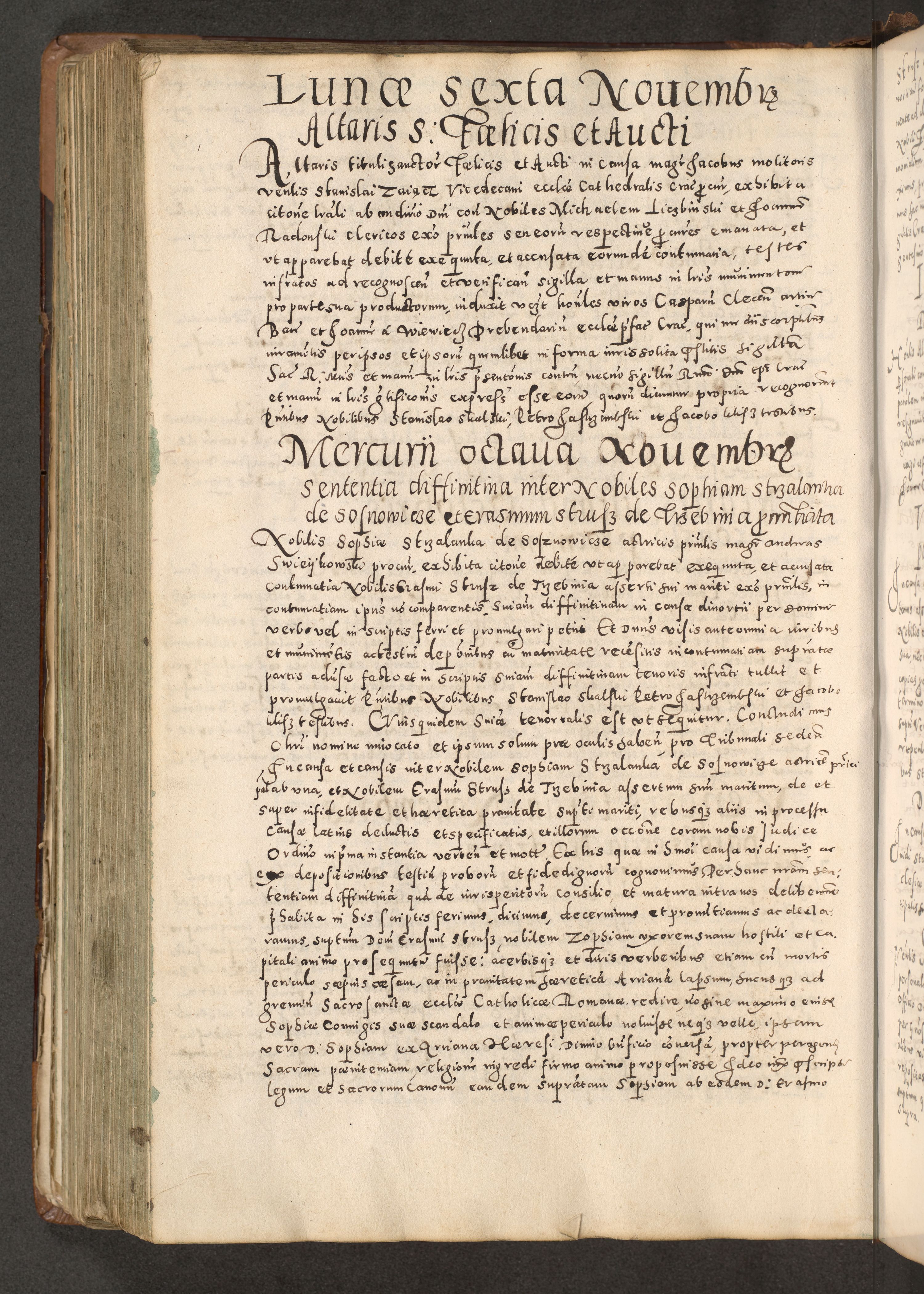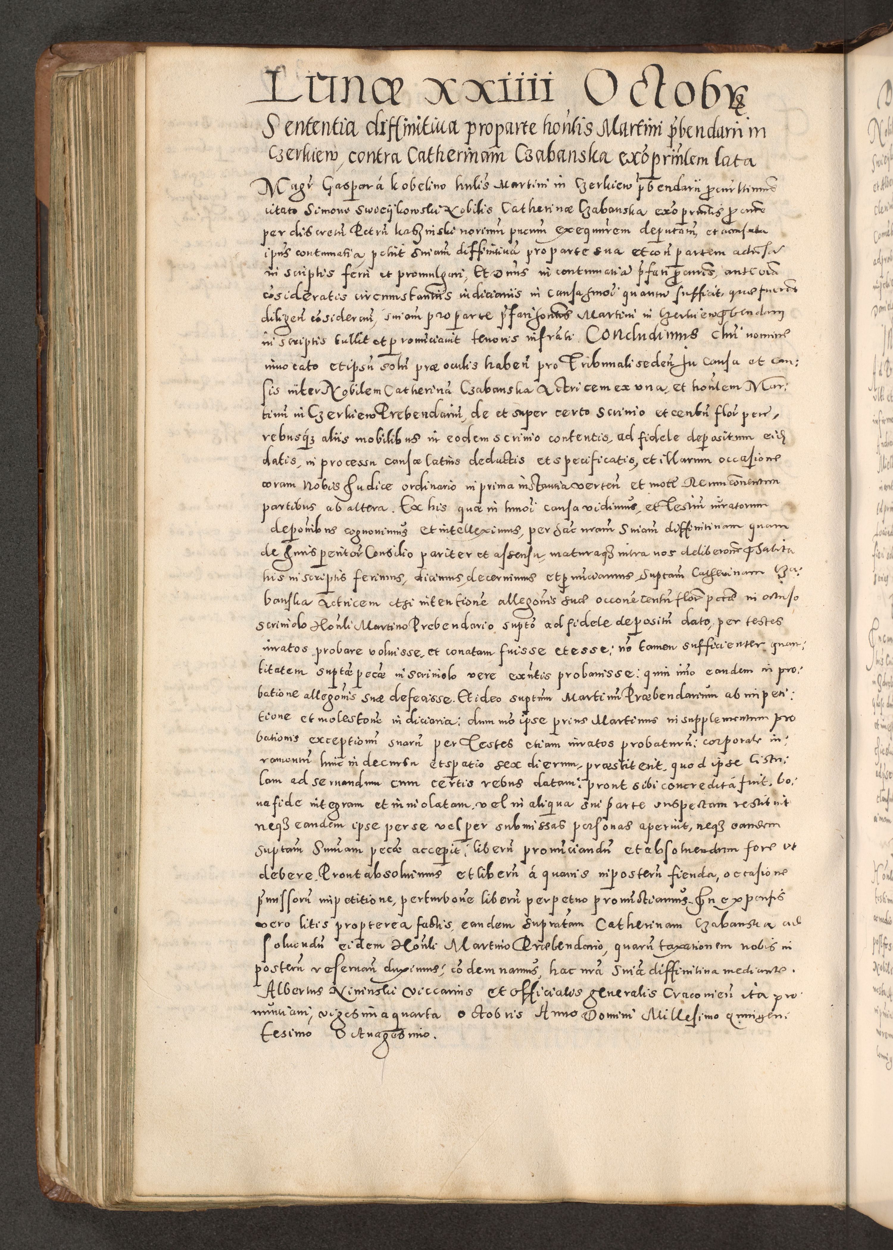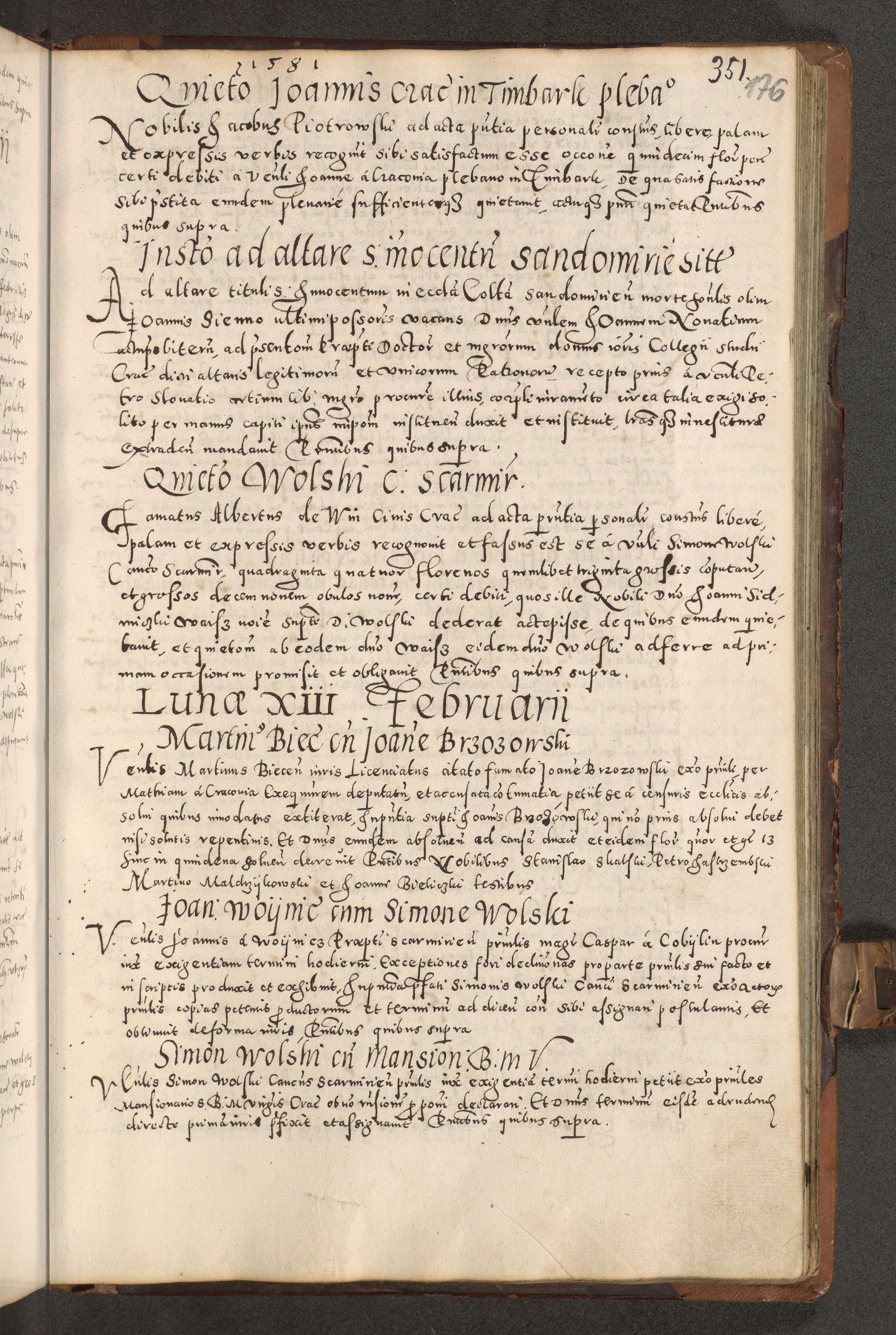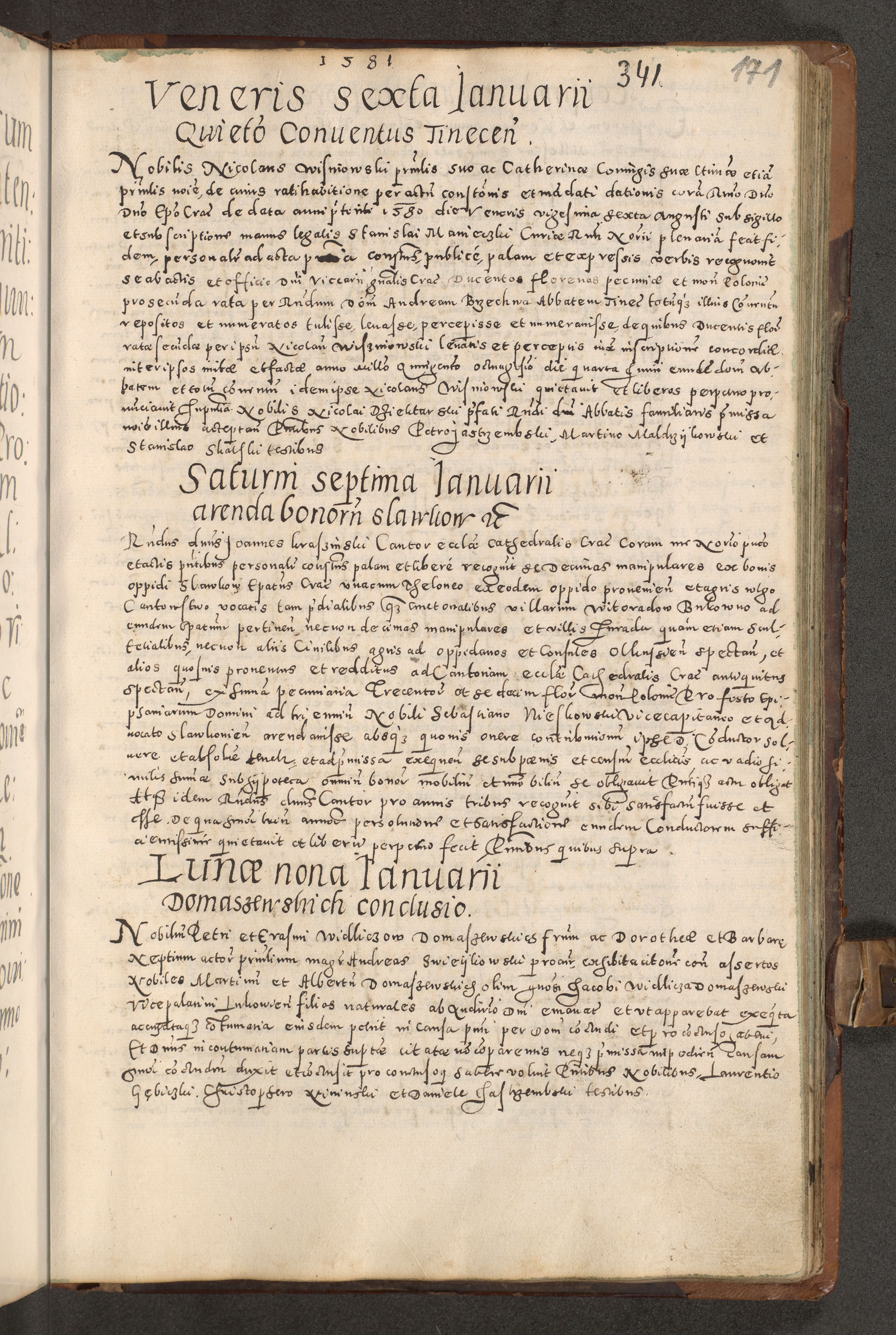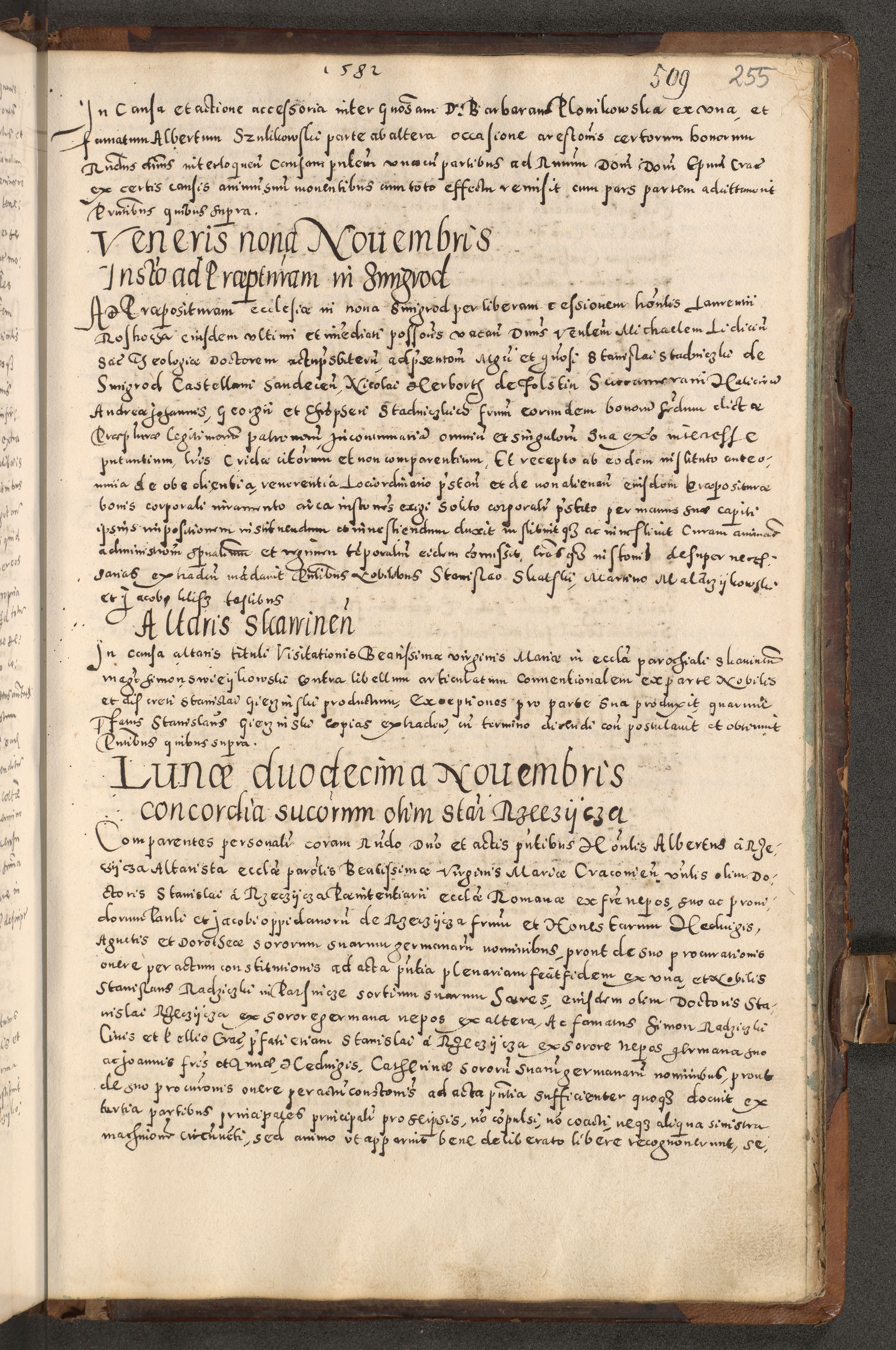 Acta actorum causarum tam diffinitivarum quam interloquutoriarum sententiarum decretorum obligationum quietatorum constuorum pro reverendum coram Reverendo Domino Alberto Nininski Custode Sandecensis Canonico et Archipresbitero Viccarioque in Spiritualibus ac Officiali Generali Cracoviensis ad Annum Domini Millesimum Qumgentesimum Septuagentesimum Nonum cuius Judictio septima Pontificat SS. nostri Domini Gregory pp. tredecimi Anno septimo inchoantur faliciter