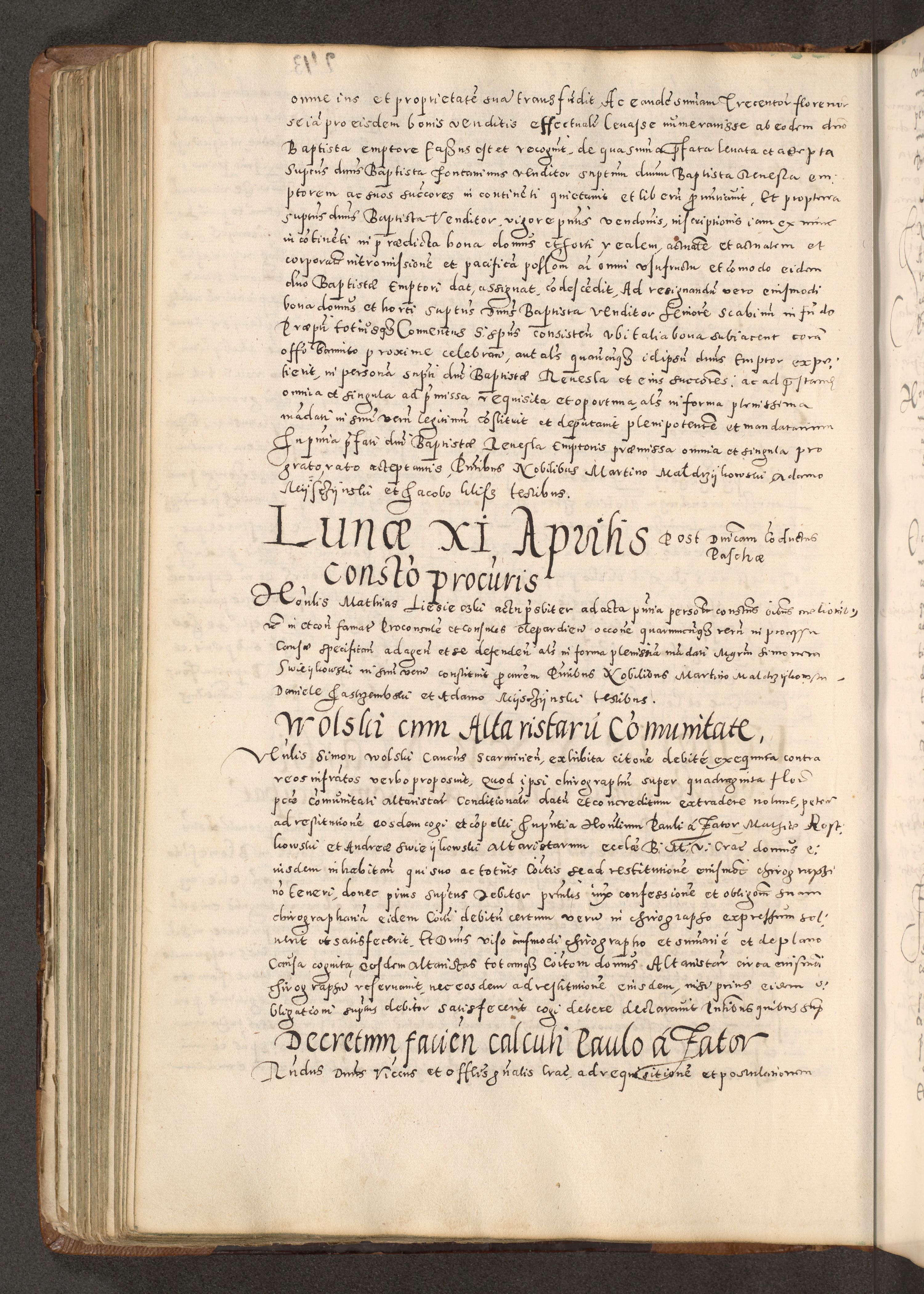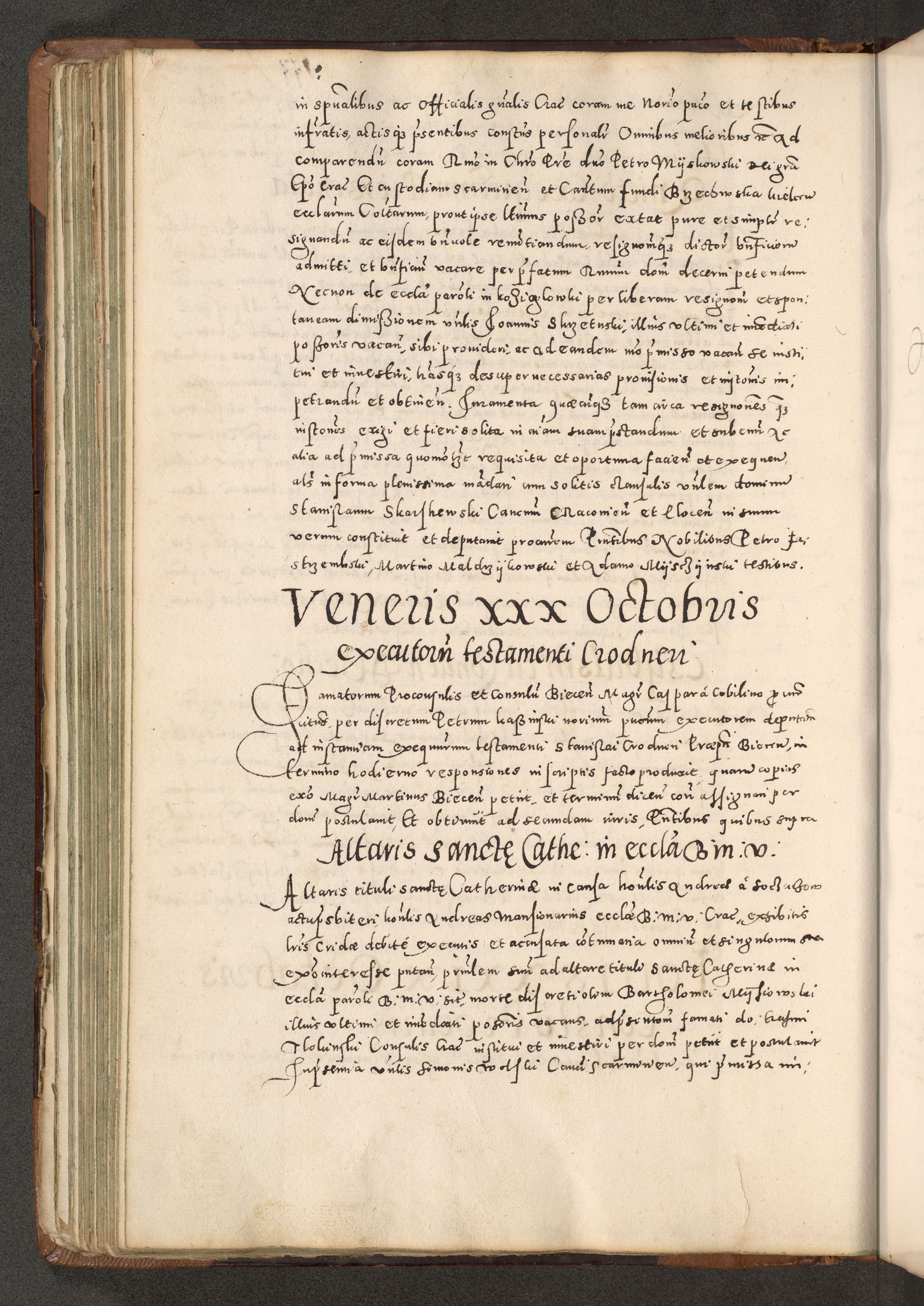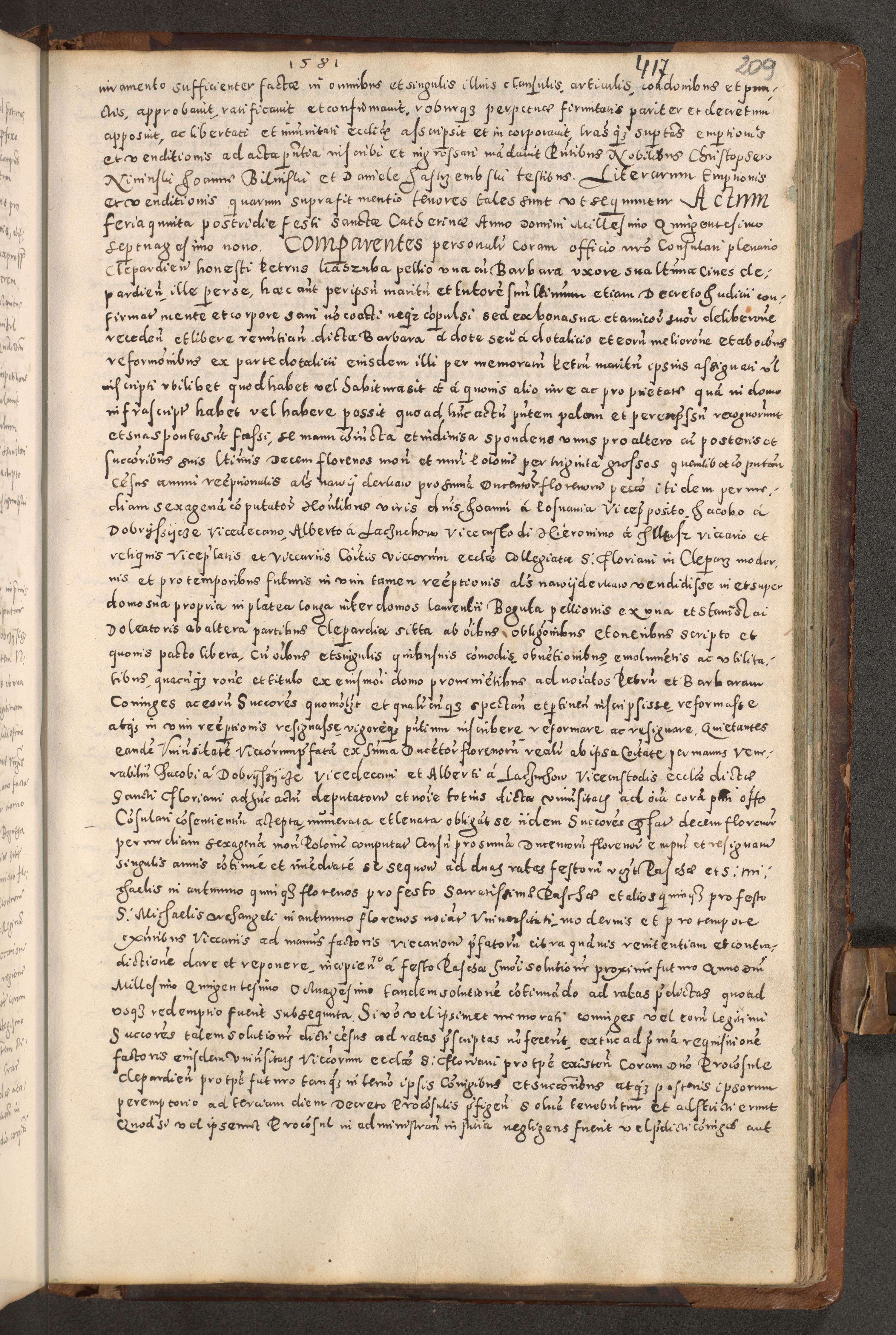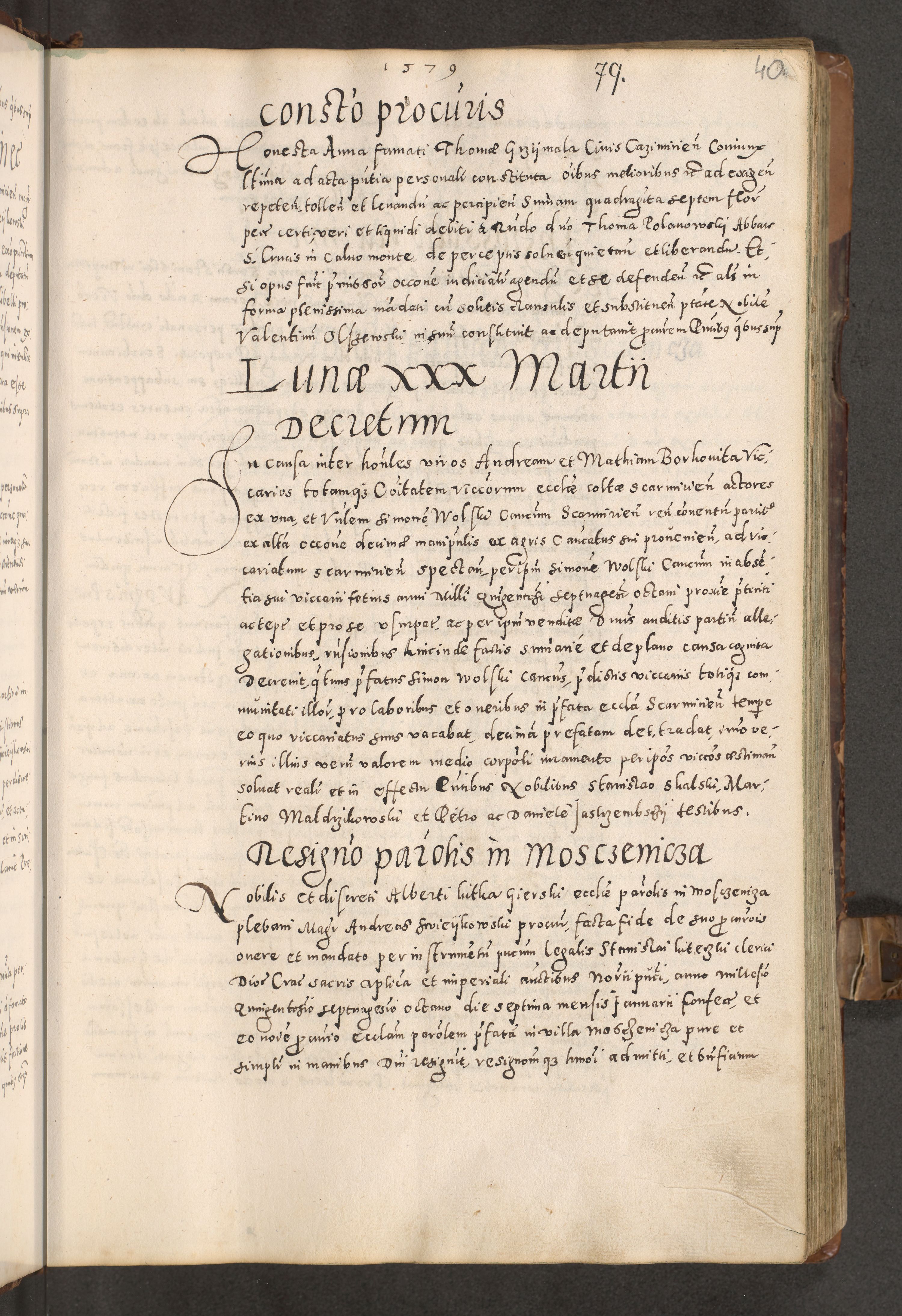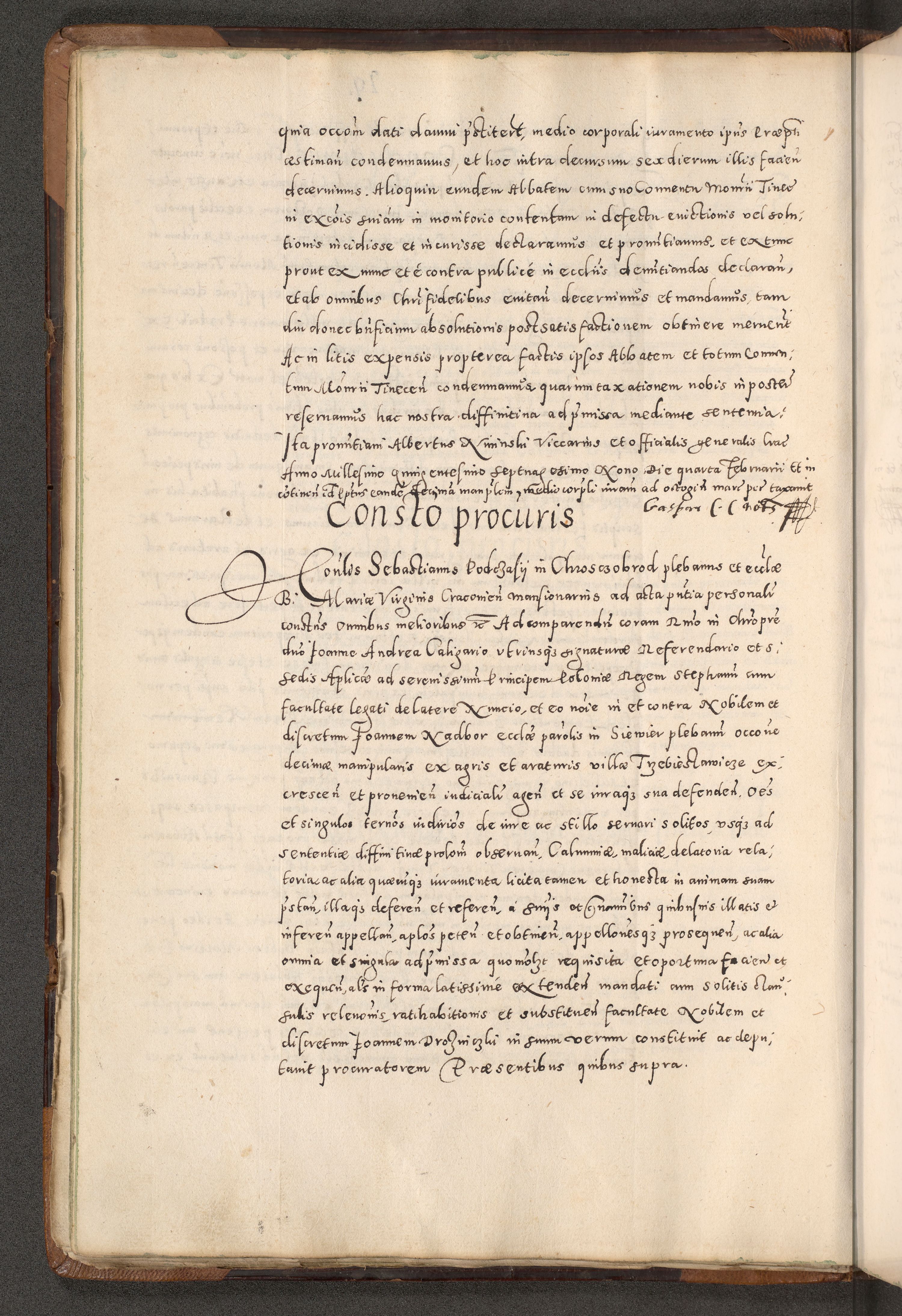 Acta actorum causarum tam diffinitivarum quam interloquutoriarum sententiarum decretorum obligationum quietatorum constuorum pro reverendum coram Reverendo Domino Alberto Nininski Custode Sandecensis Canonico et Archipresbitero Viccarioque in Spiritualibus ac Officiali Generali Cracoviensis ad Annum Domini Millesimum Qumgentesimum Septuagentesimum Nonum cuius Judictio septima Pontificat SS. nostri Domini Gregory pp. tredecimi Anno septimo inchoantur faliciter