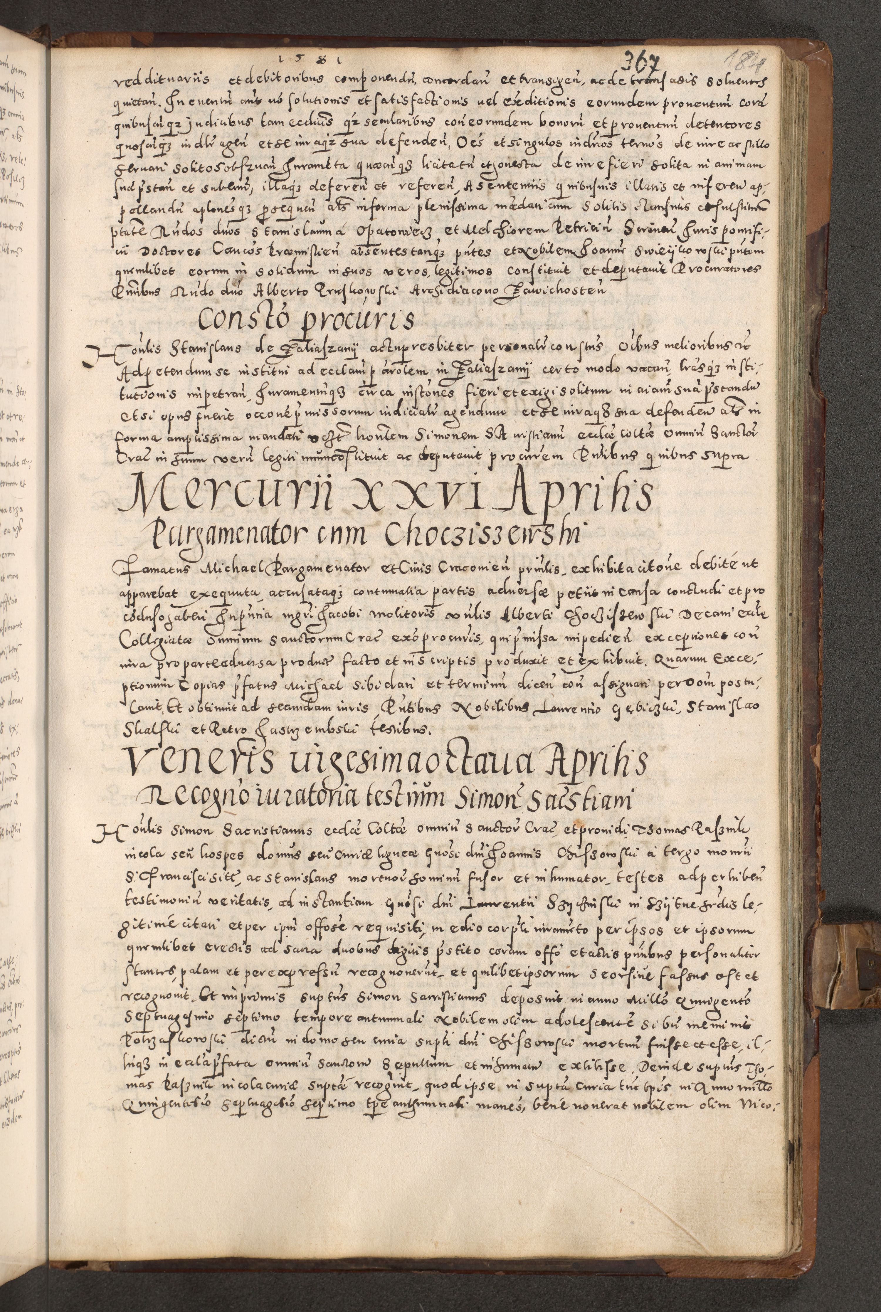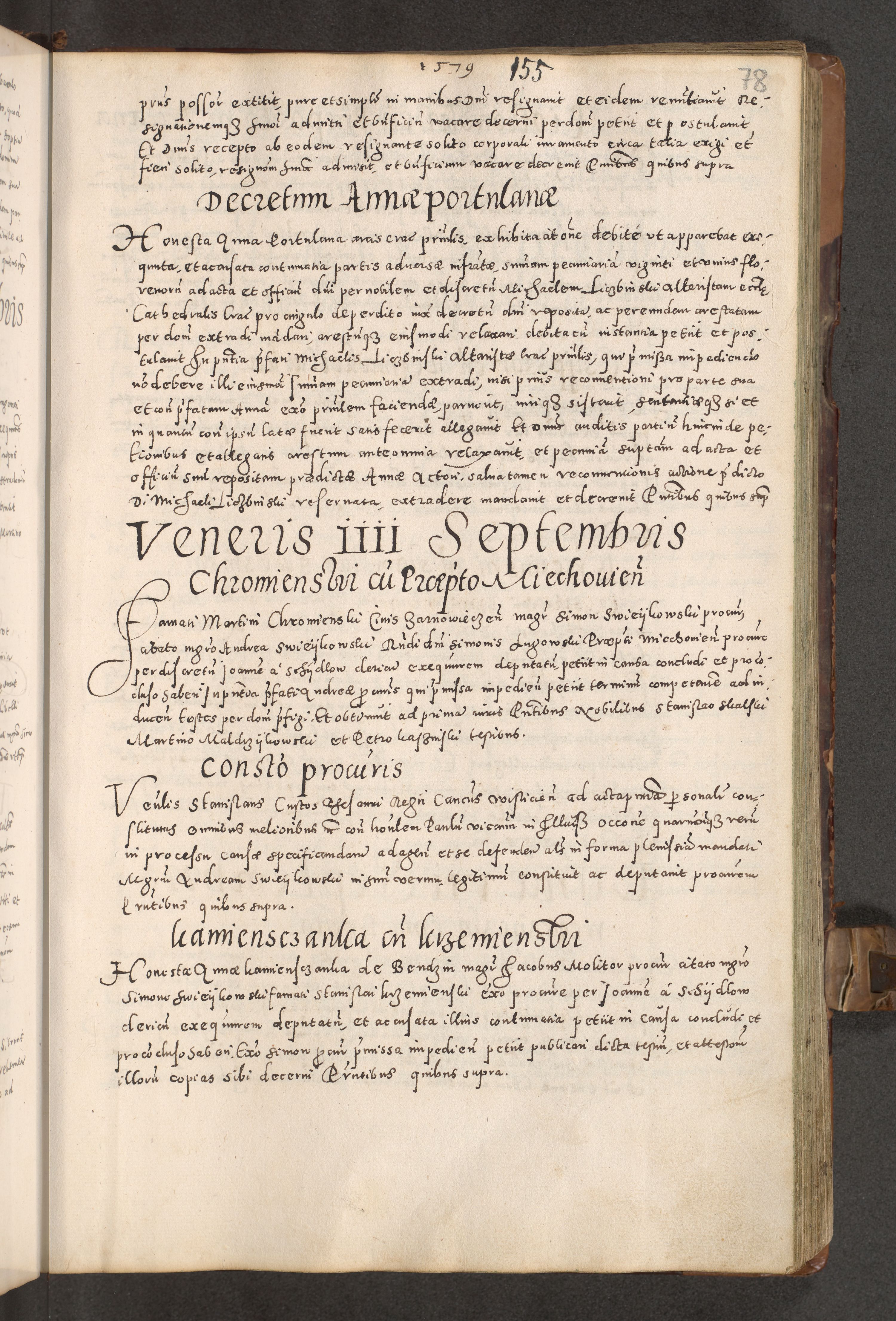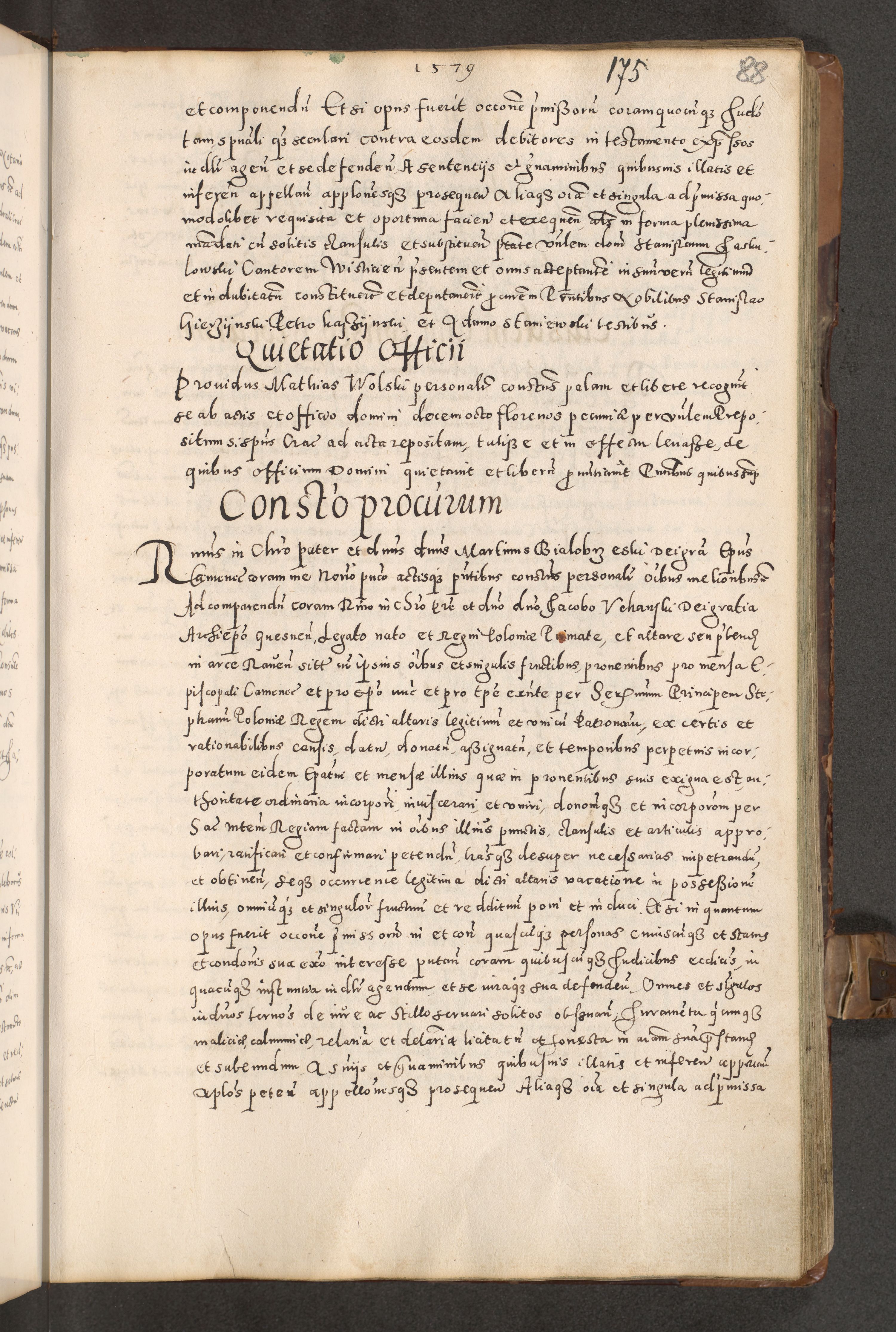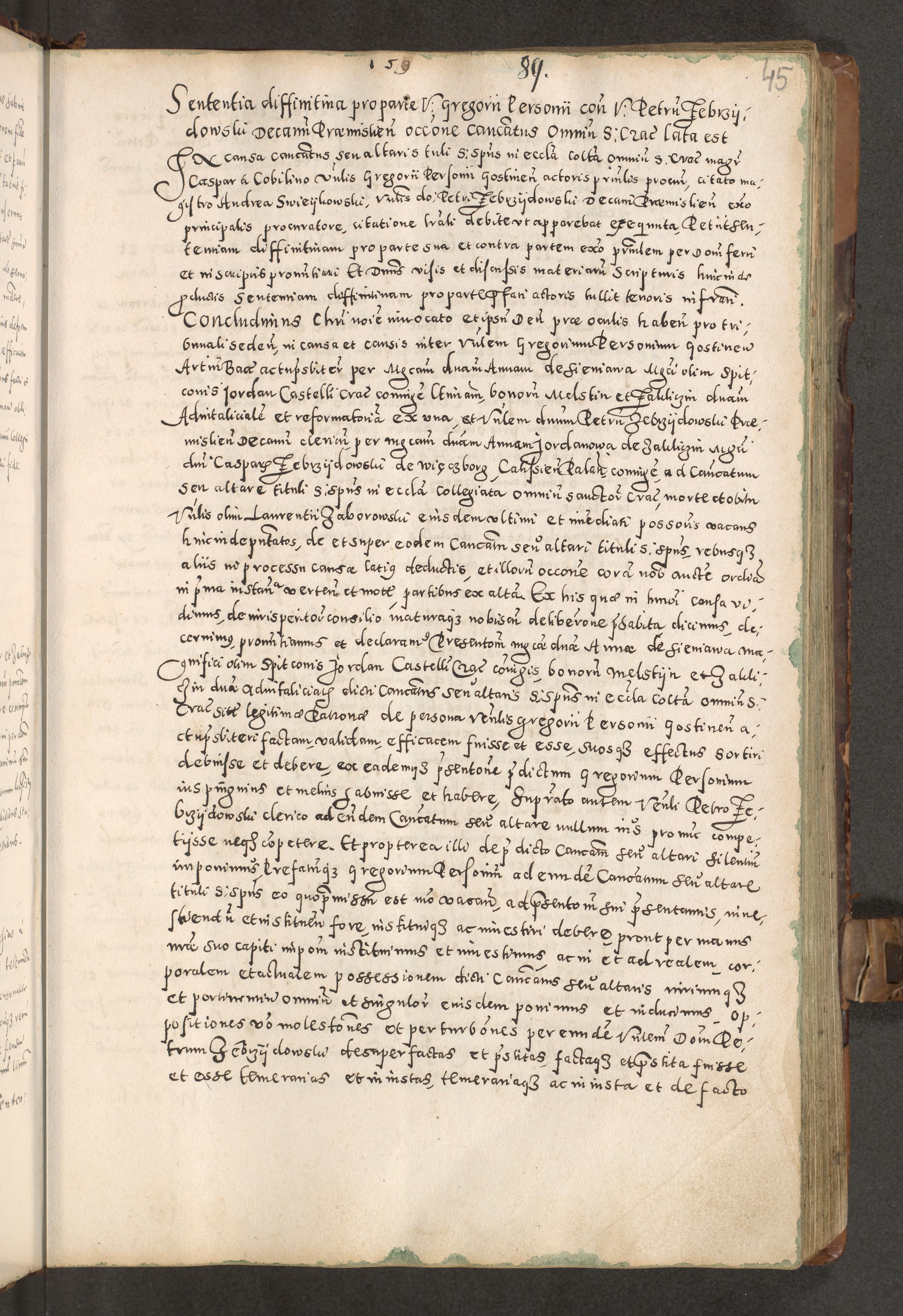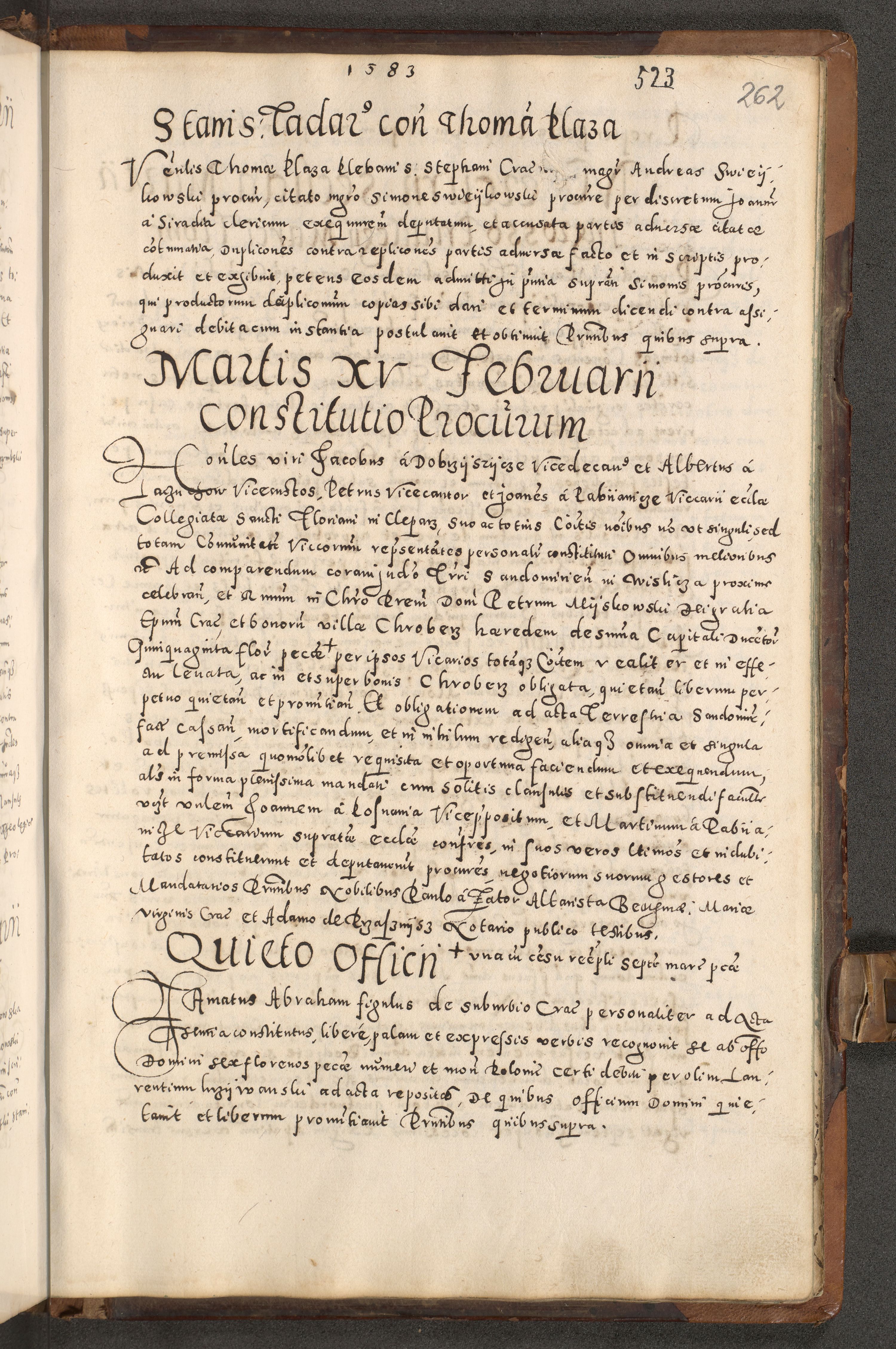 Acta actorum causarum tam diffinitivarum quam interloquutoriarum sententiarum decretorum obligationum quietatorum constuorum pro reverendum coram Reverendo Domino Alberto Nininski Custode Sandecensis Canonico et Archipresbitero Viccarioque in Spiritualibus ac Officiali Generali Cracoviensis ad Annum Domini Millesimum Qumgentesimum Septuagentesimum Nonum cuius Judictio septima Pontificat SS. nostri Domini Gregory pp. tredecimi Anno septimo inchoantur faliciter