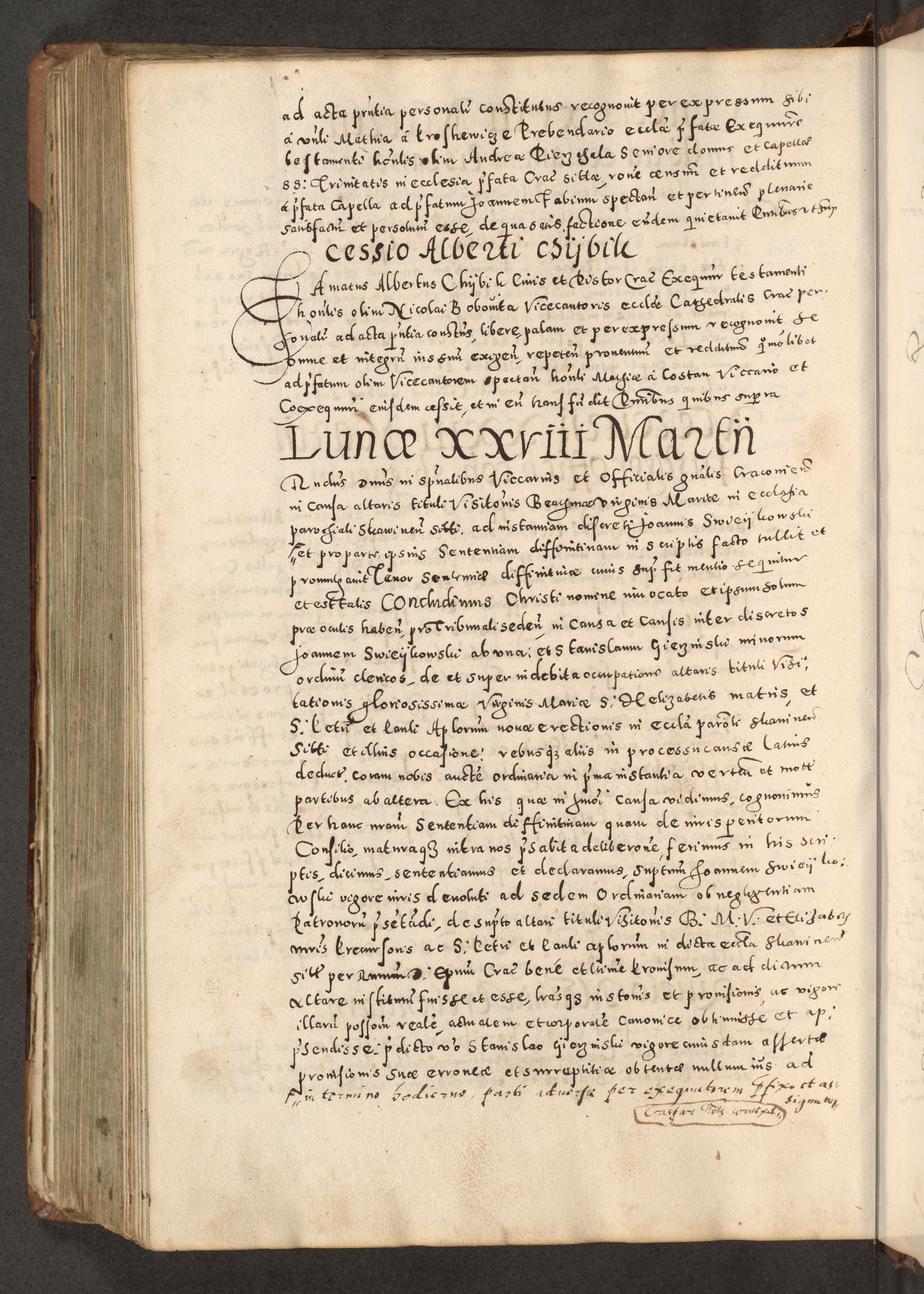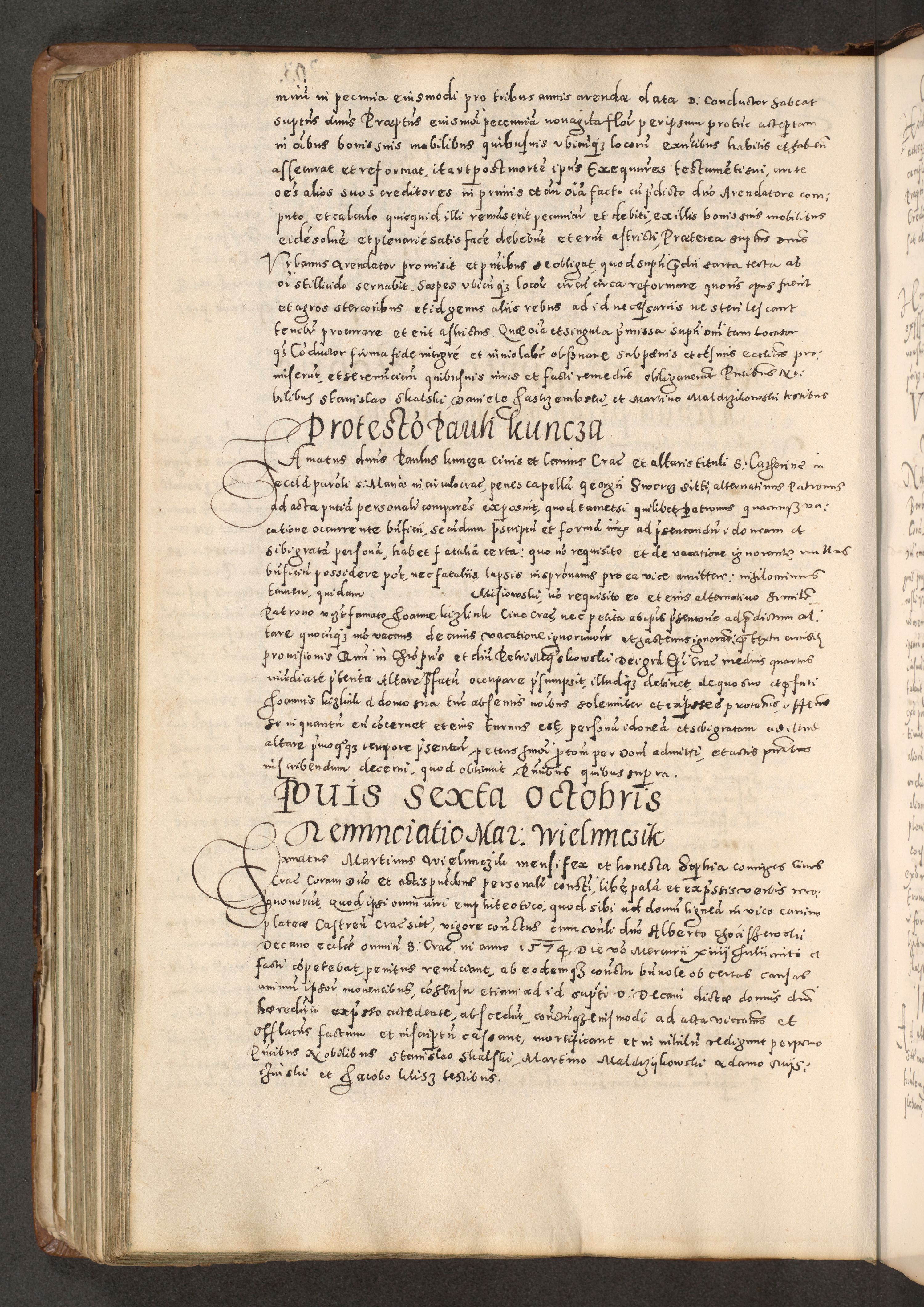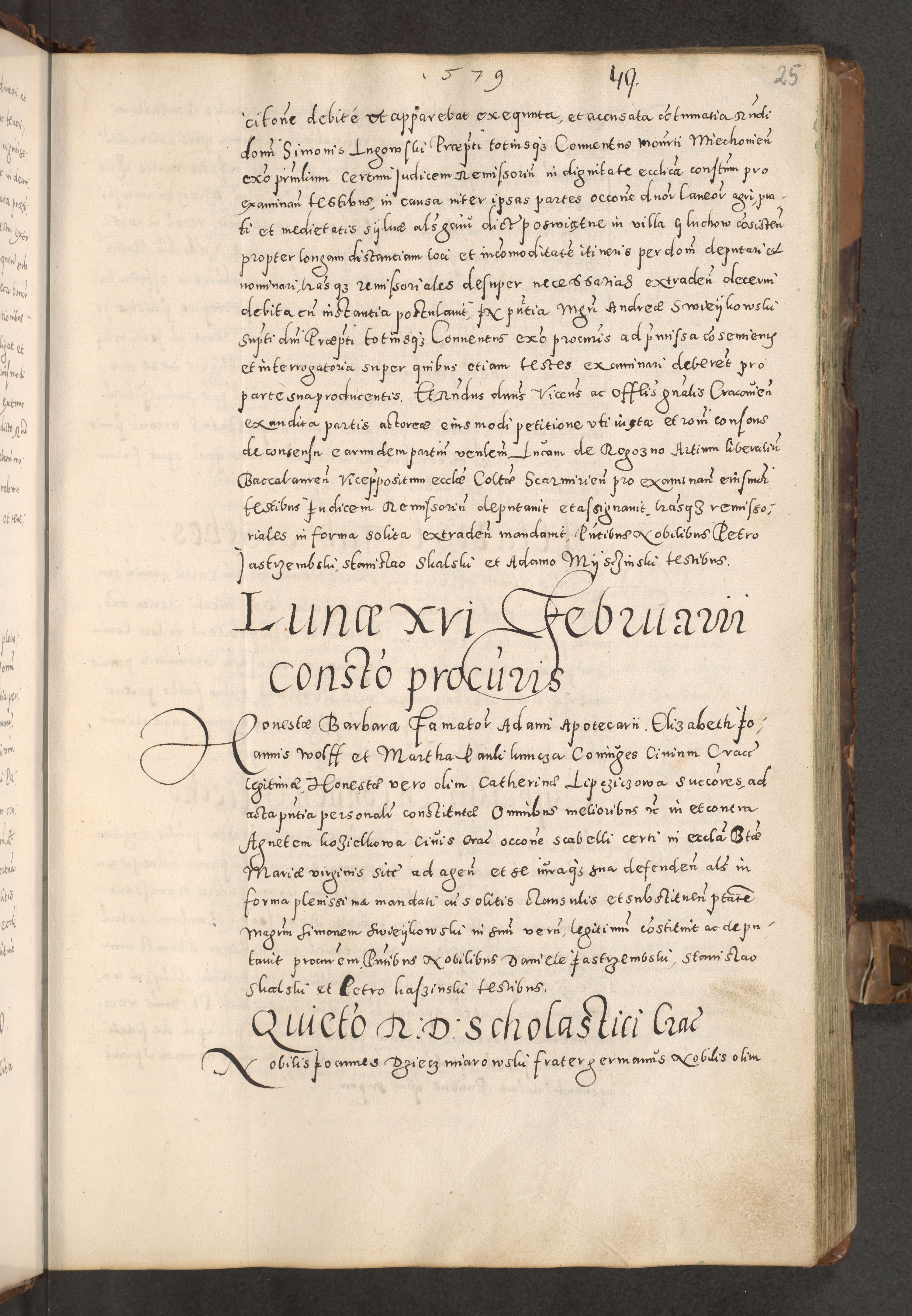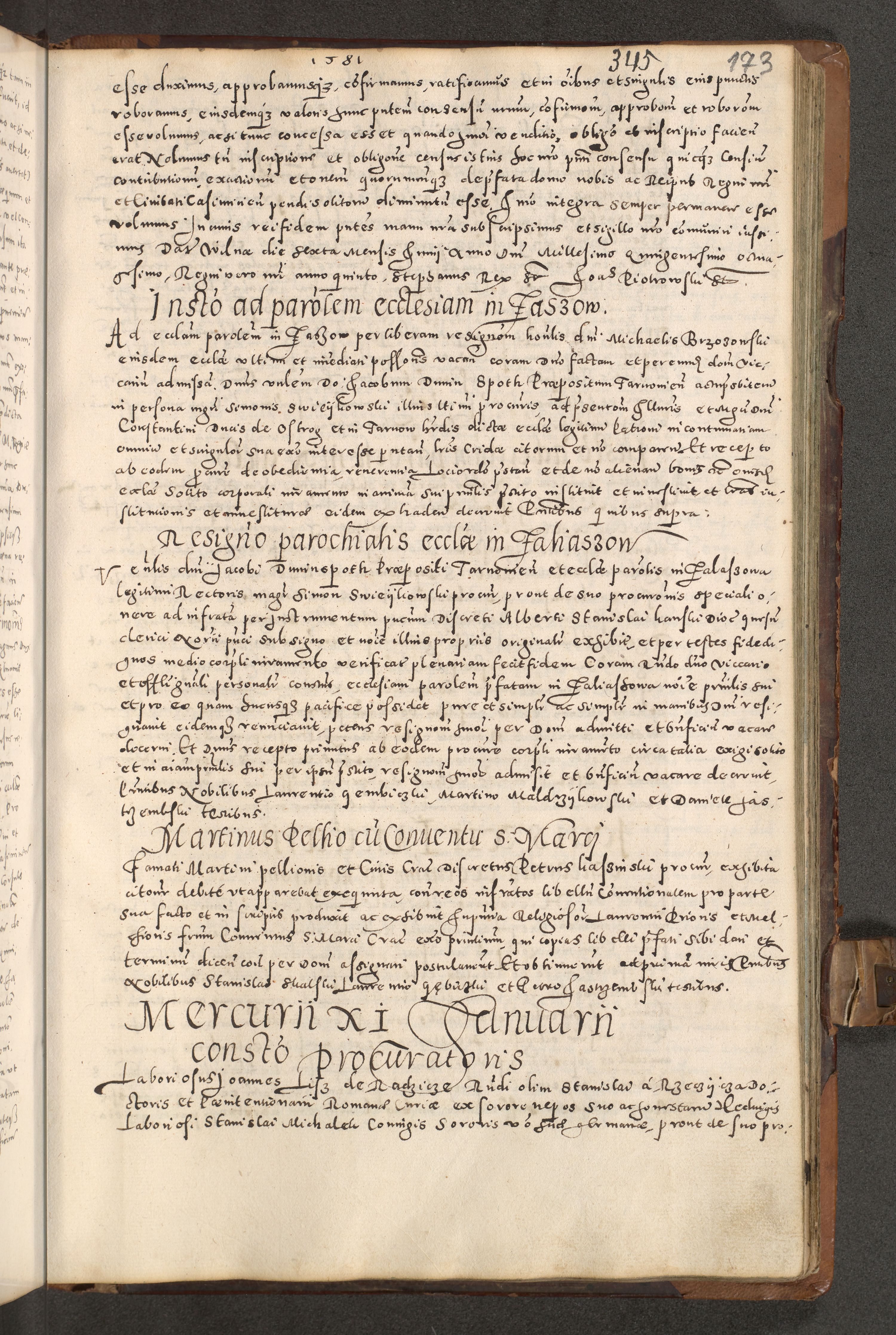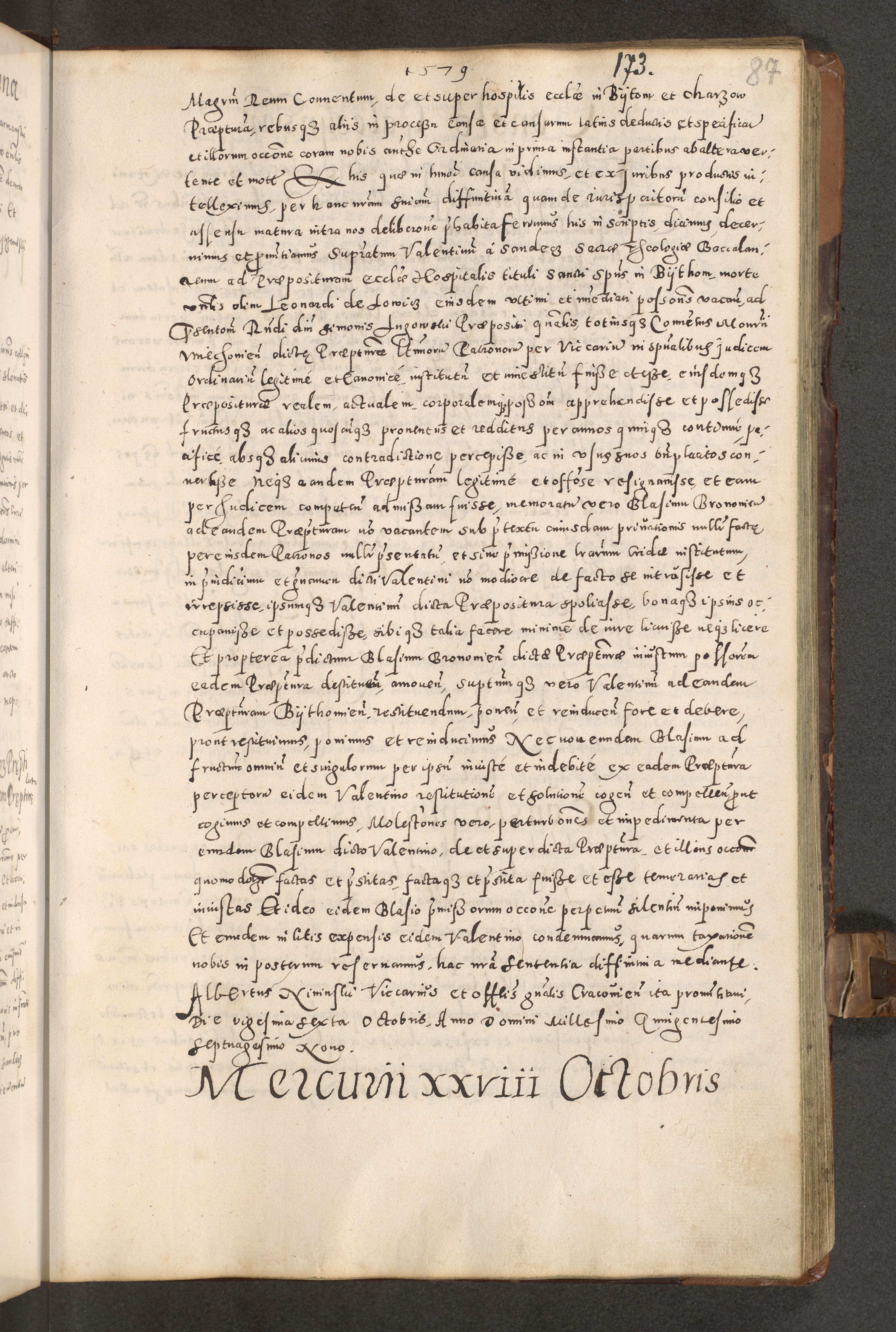 Acta actorum causarum tam diffinitivarum quam interloquutoriarum sententiarum decretorum obligationum quietatorum constuorum pro reverendum coram Reverendo Domino Alberto Nininski Custode Sandecensis Canonico et Archipresbitero Viccarioque in Spiritualibus ac Officiali Generali Cracoviensis ad Annum Domini Millesimum Qumgentesimum Septuagentesimum Nonum cuius Judictio septima Pontificat SS. nostri Domini Gregory pp. tredecimi Anno septimo inchoantur faliciter