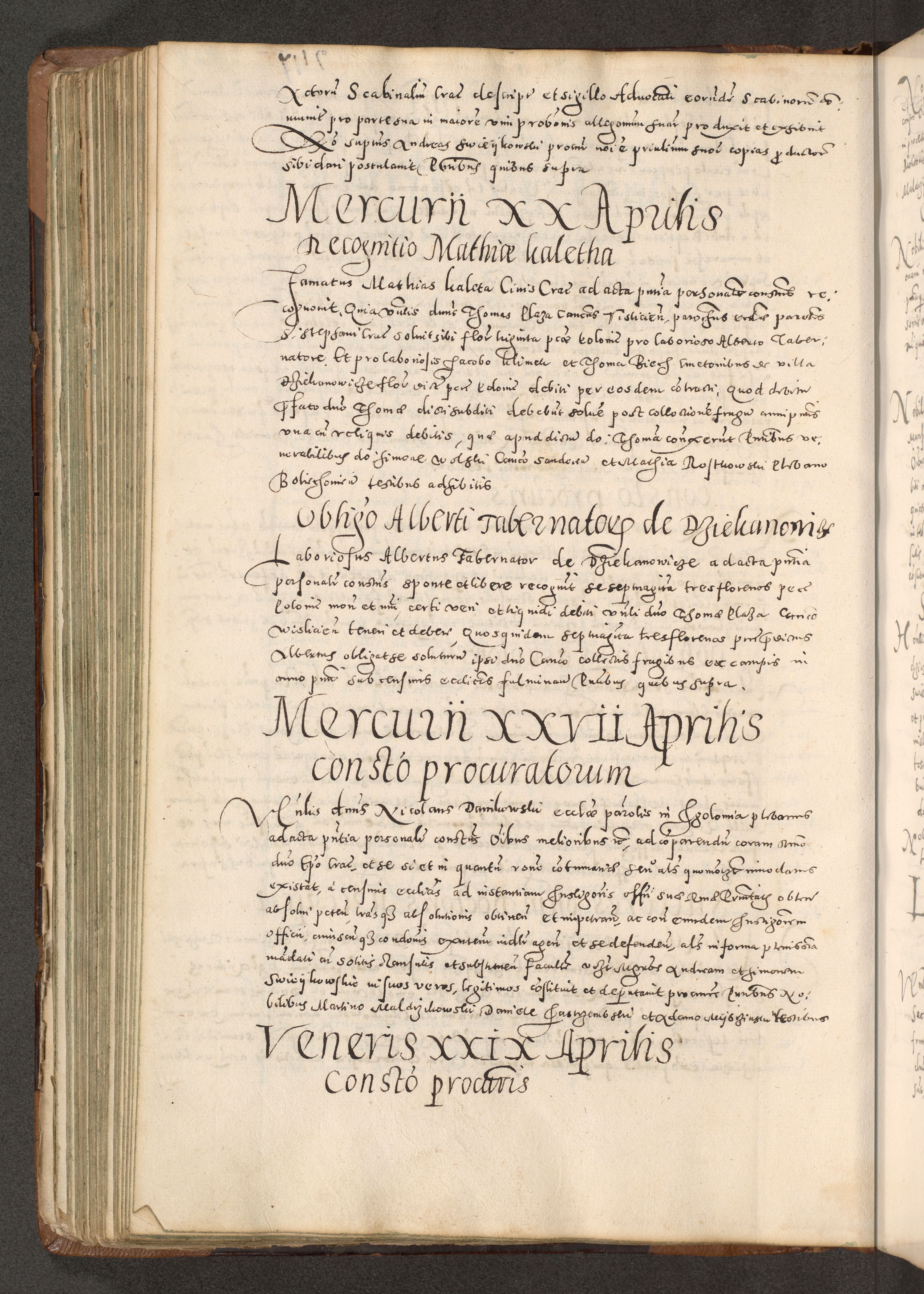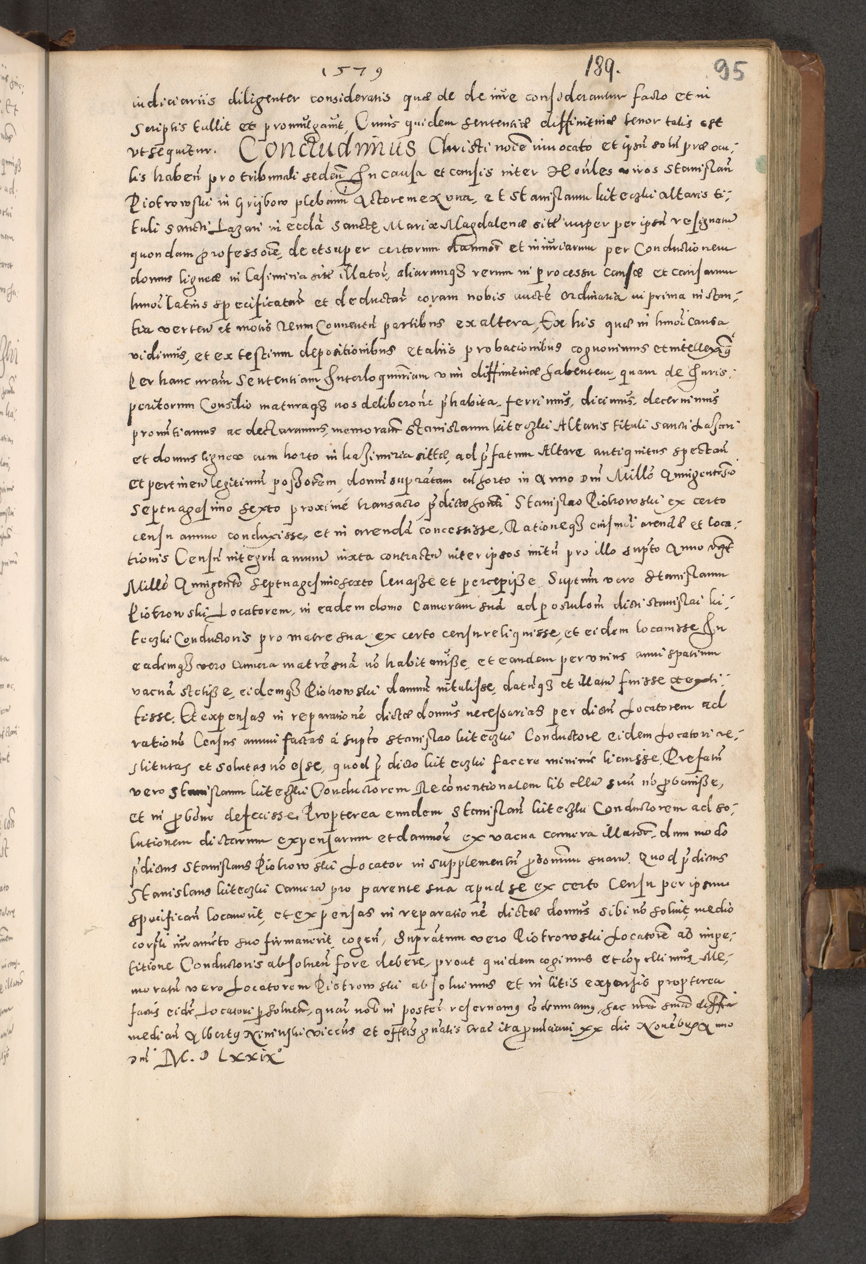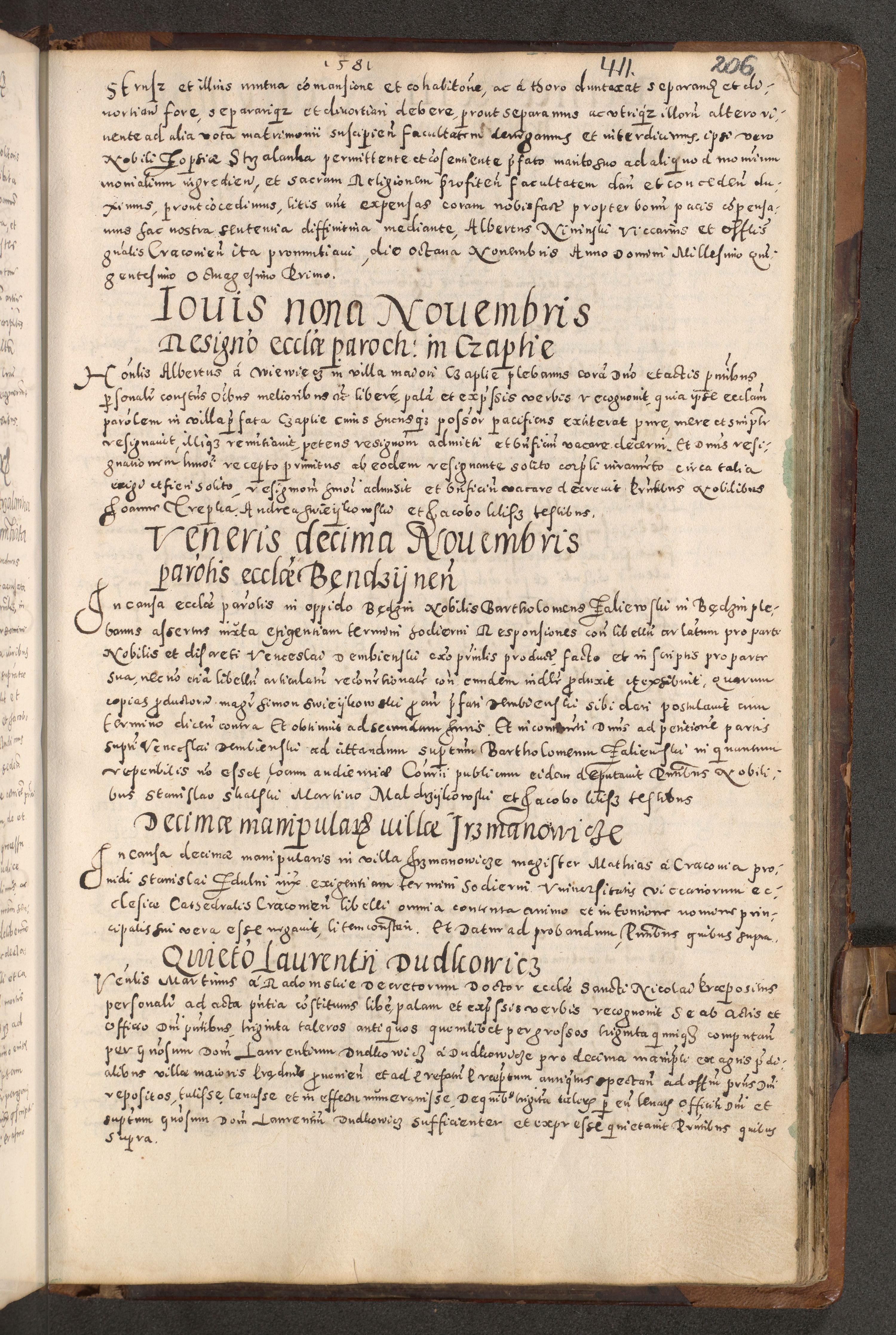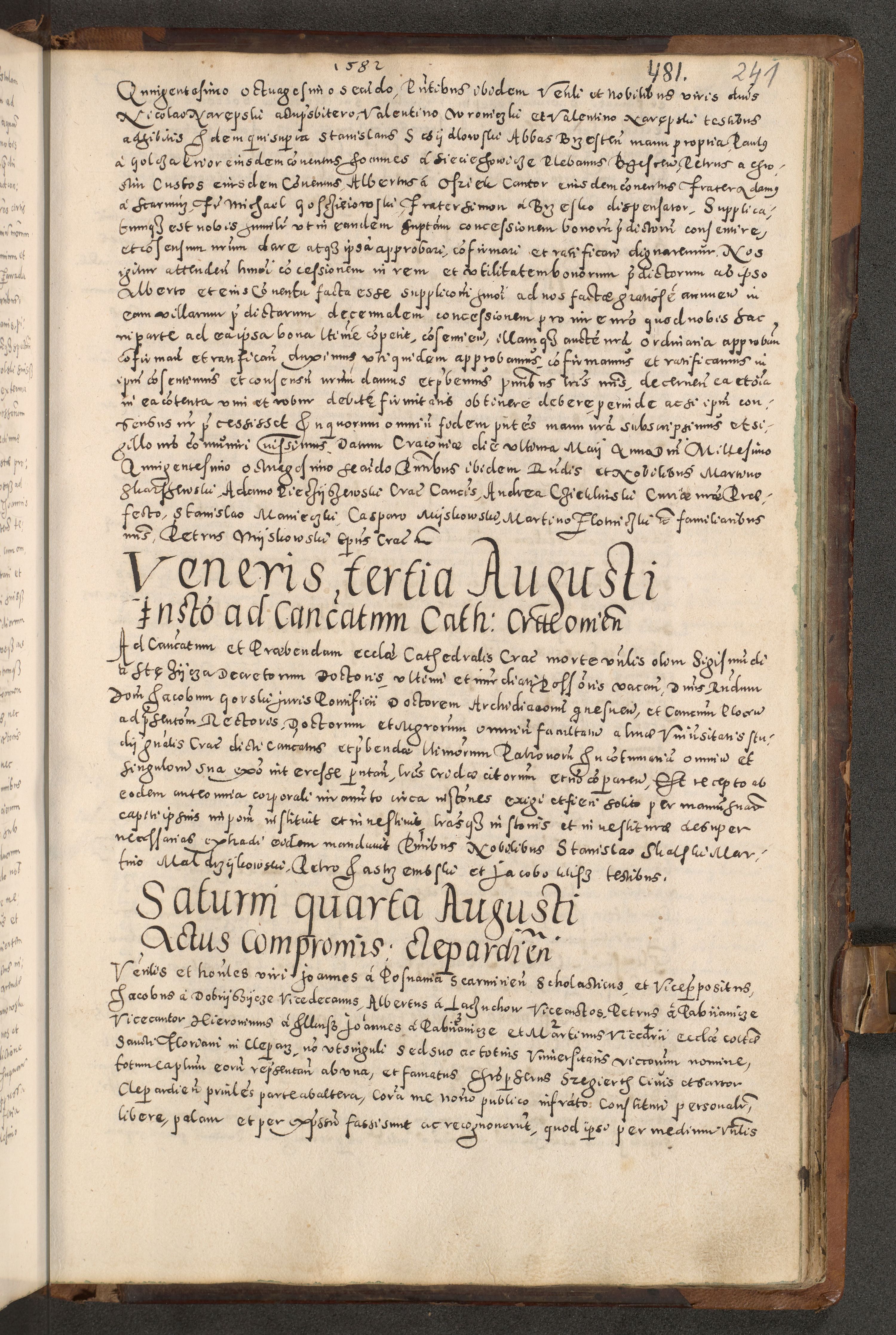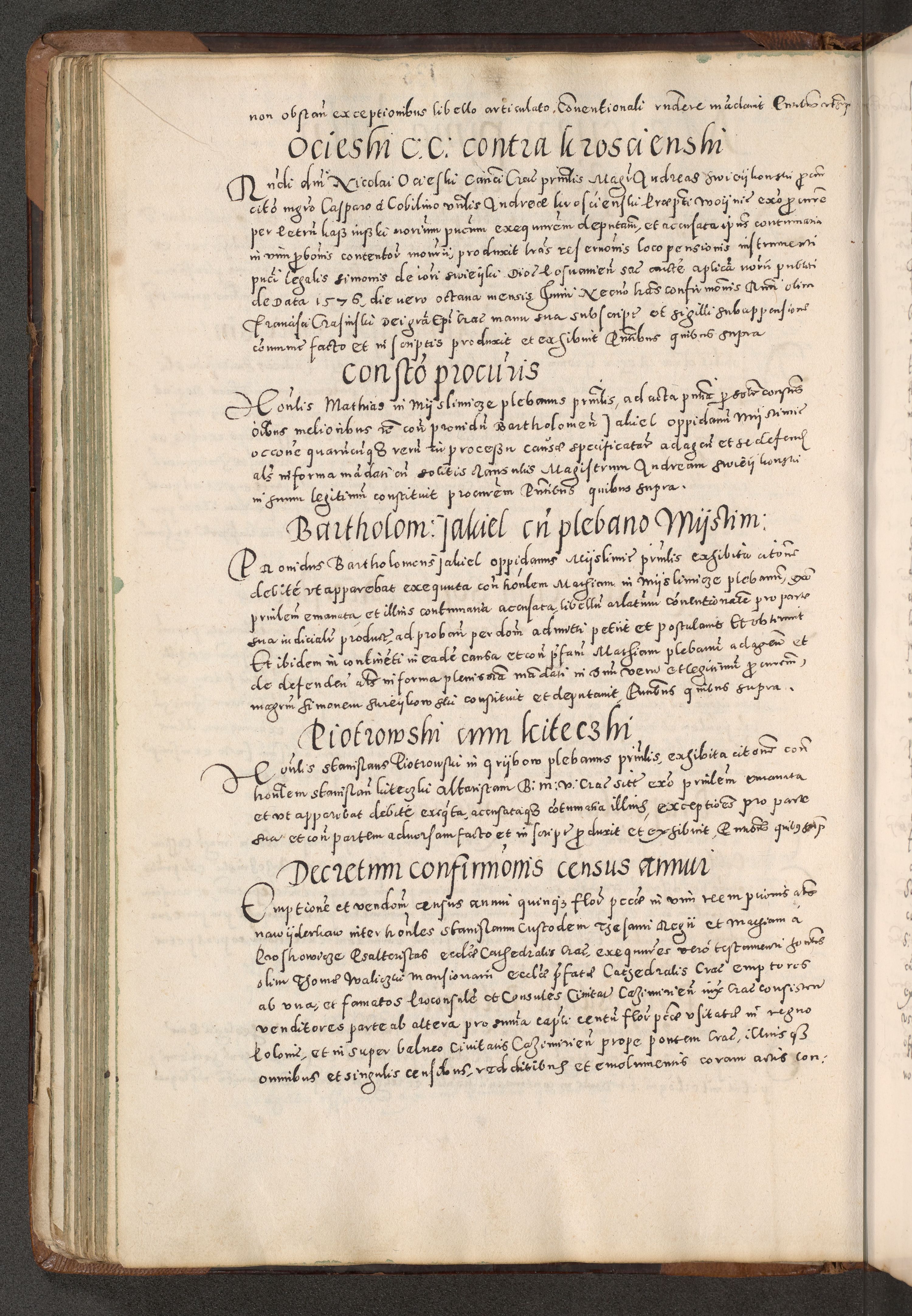 Acta actorum causarum tam diffinitivarum quam interloquutoriarum sententiarum decretorum obligationum quietatorum constuorum pro reverendum coram Reverendo Domino Alberto Nininski Custode Sandecensis Canonico et Archipresbitero Viccarioque in Spiritualibus ac Officiali Generali Cracoviensis ad Annum Domini Millesimum Qumgentesimum Septuagentesimum Nonum cuius Judictio septima Pontificat SS. nostri Domini Gregory pp. tredecimi Anno septimo inchoantur faliciter