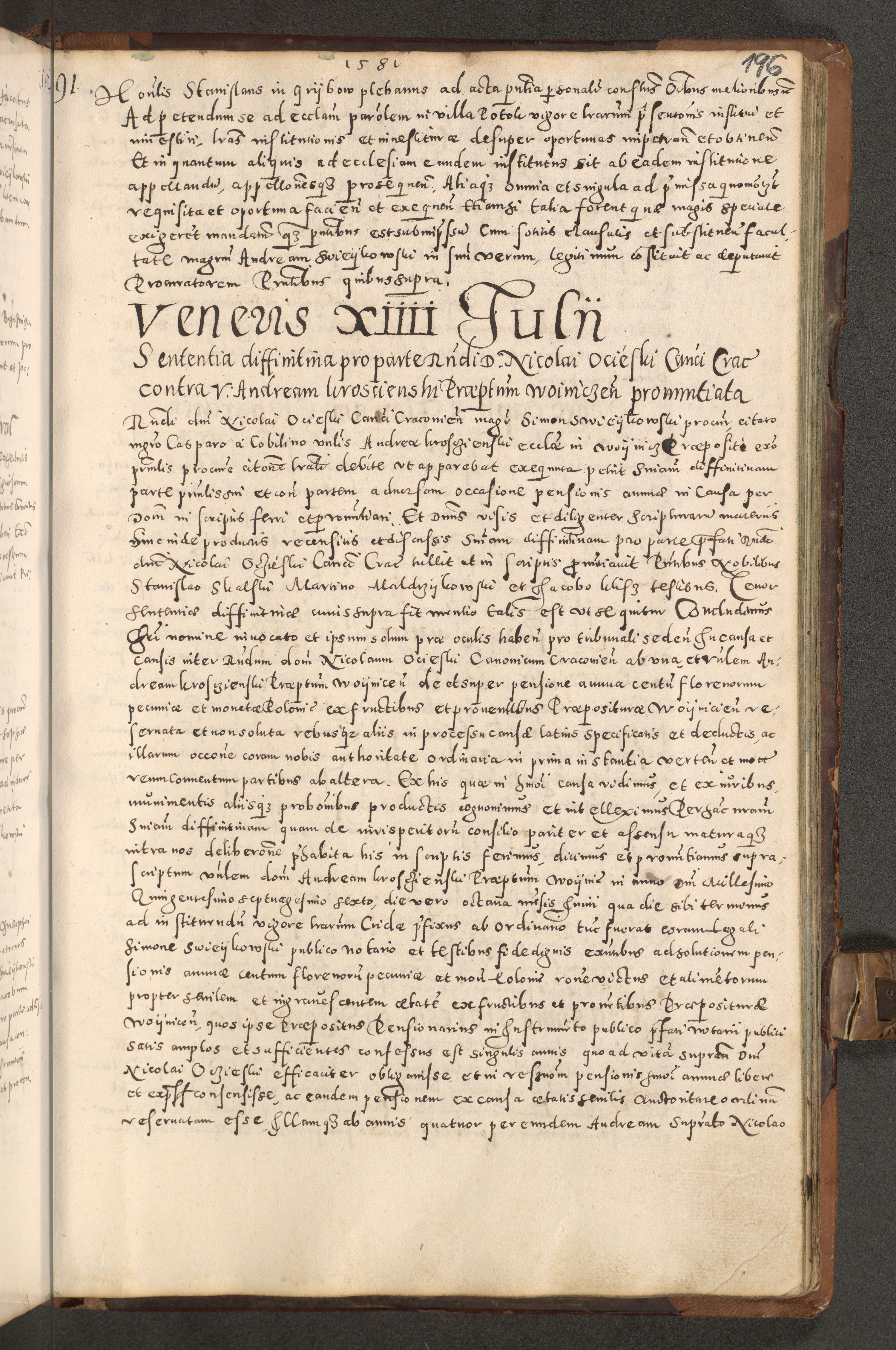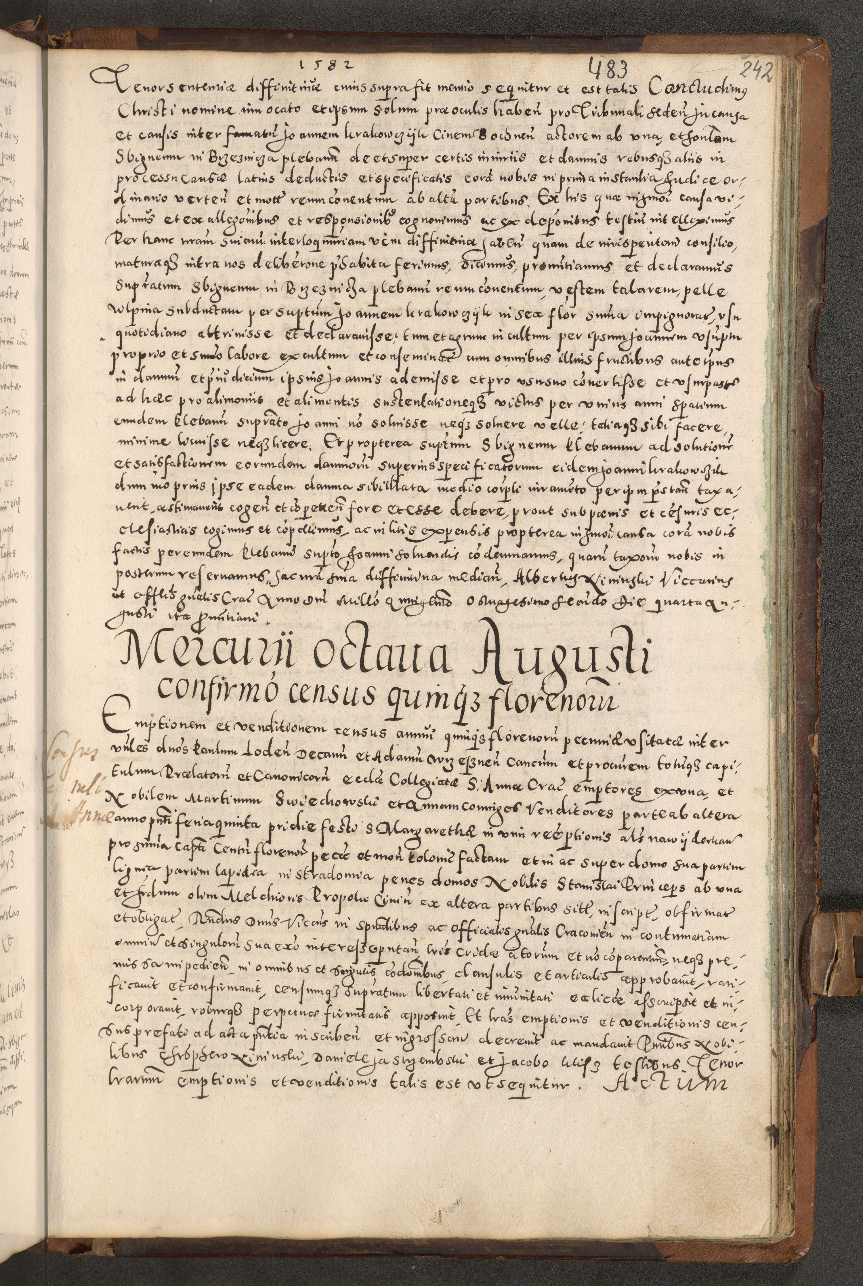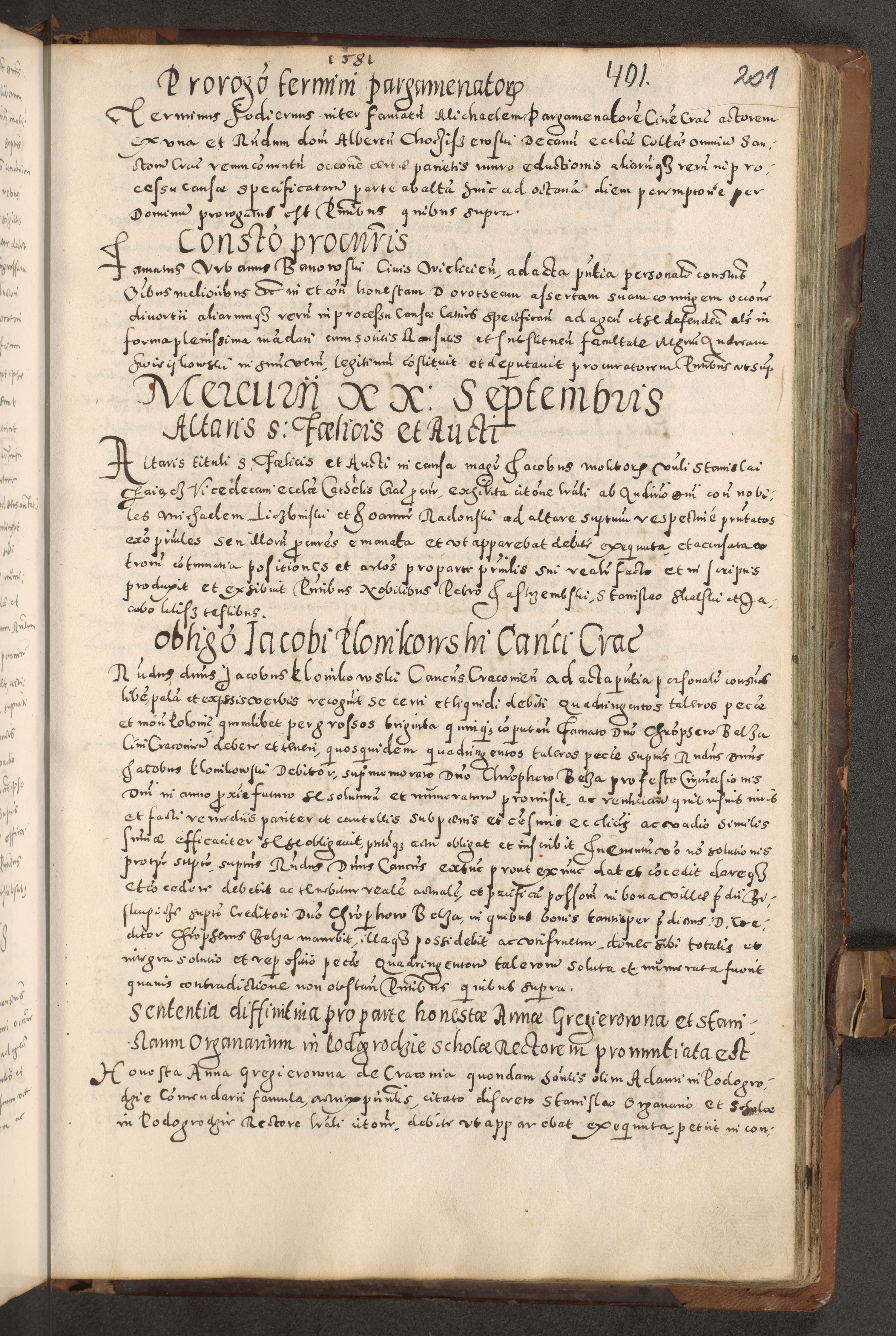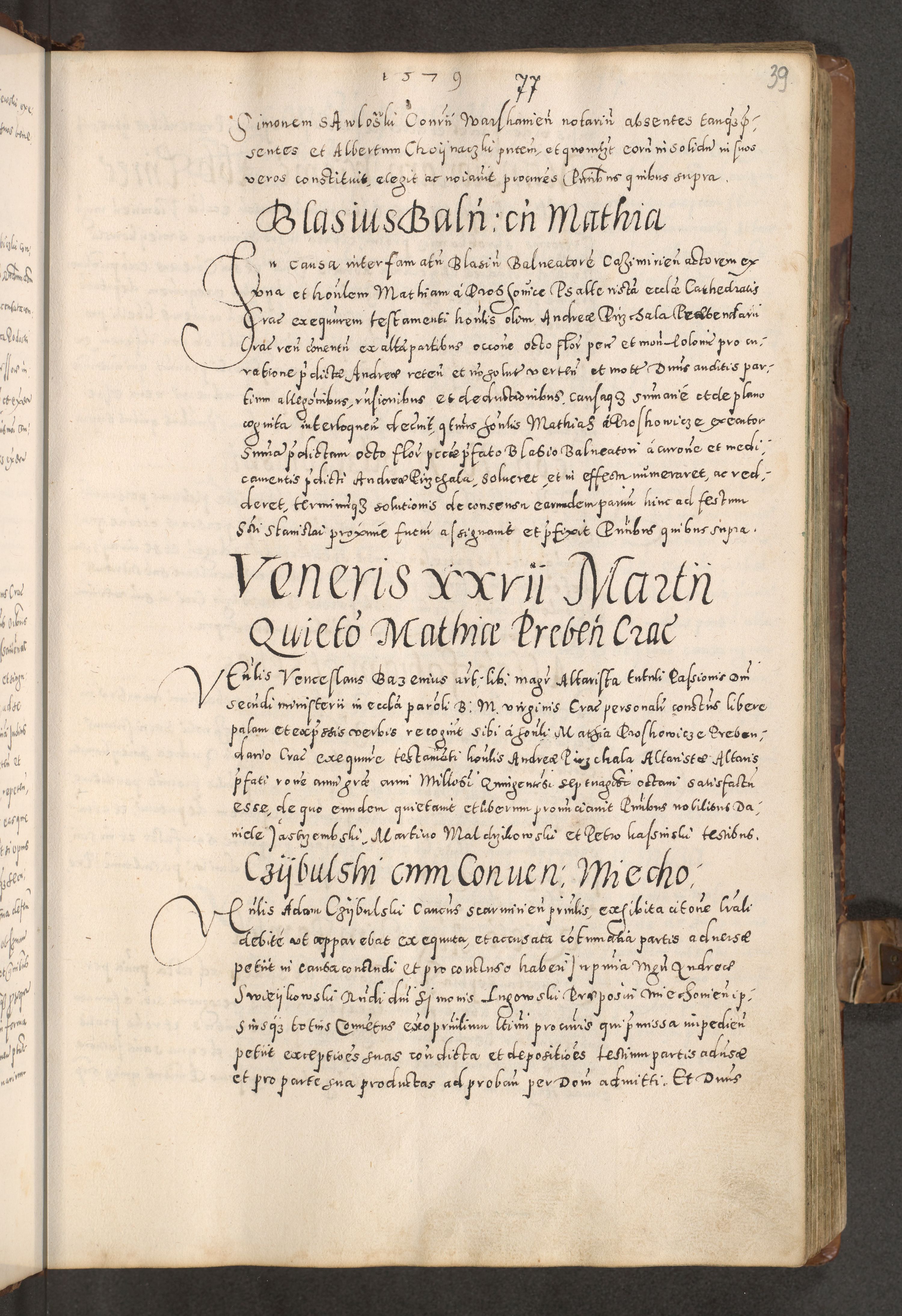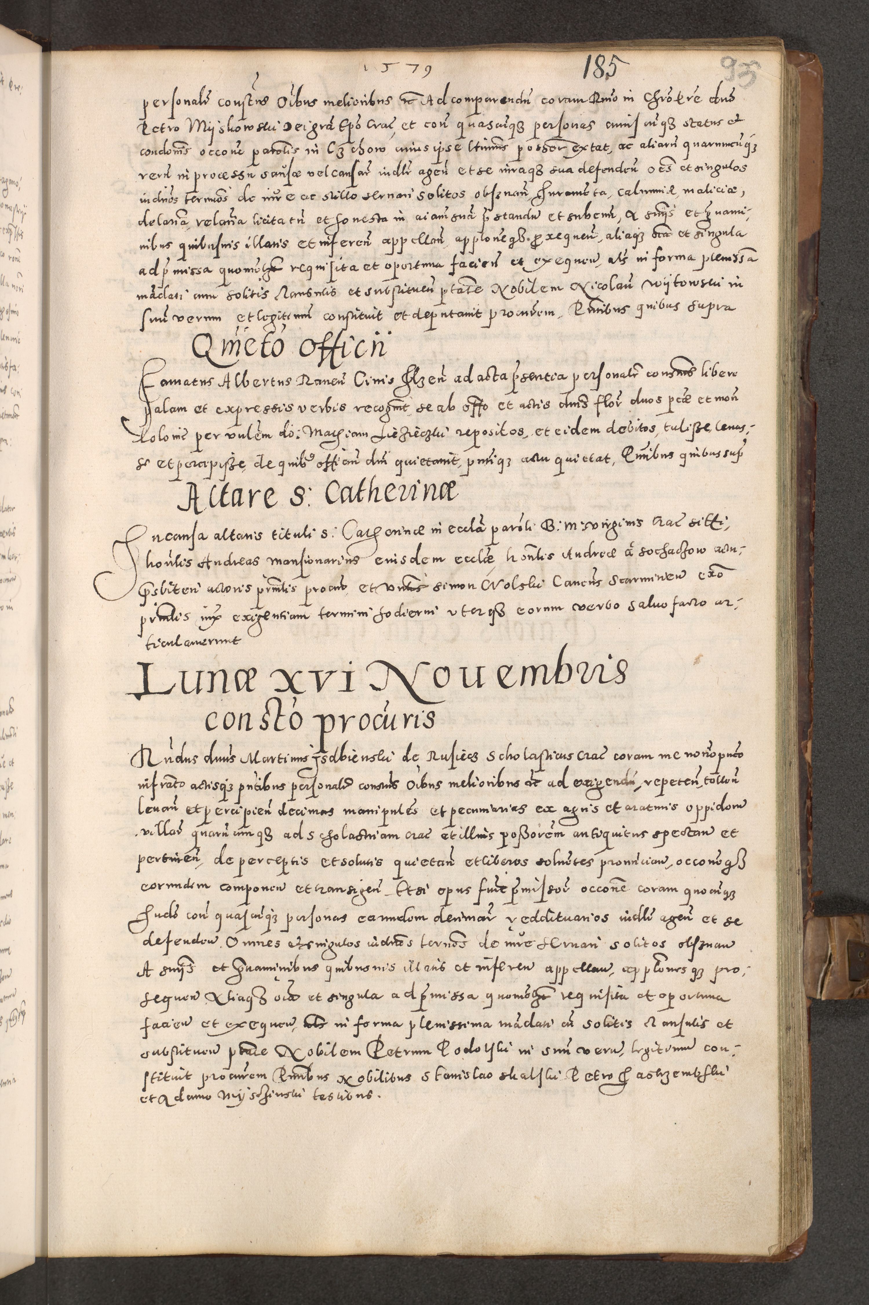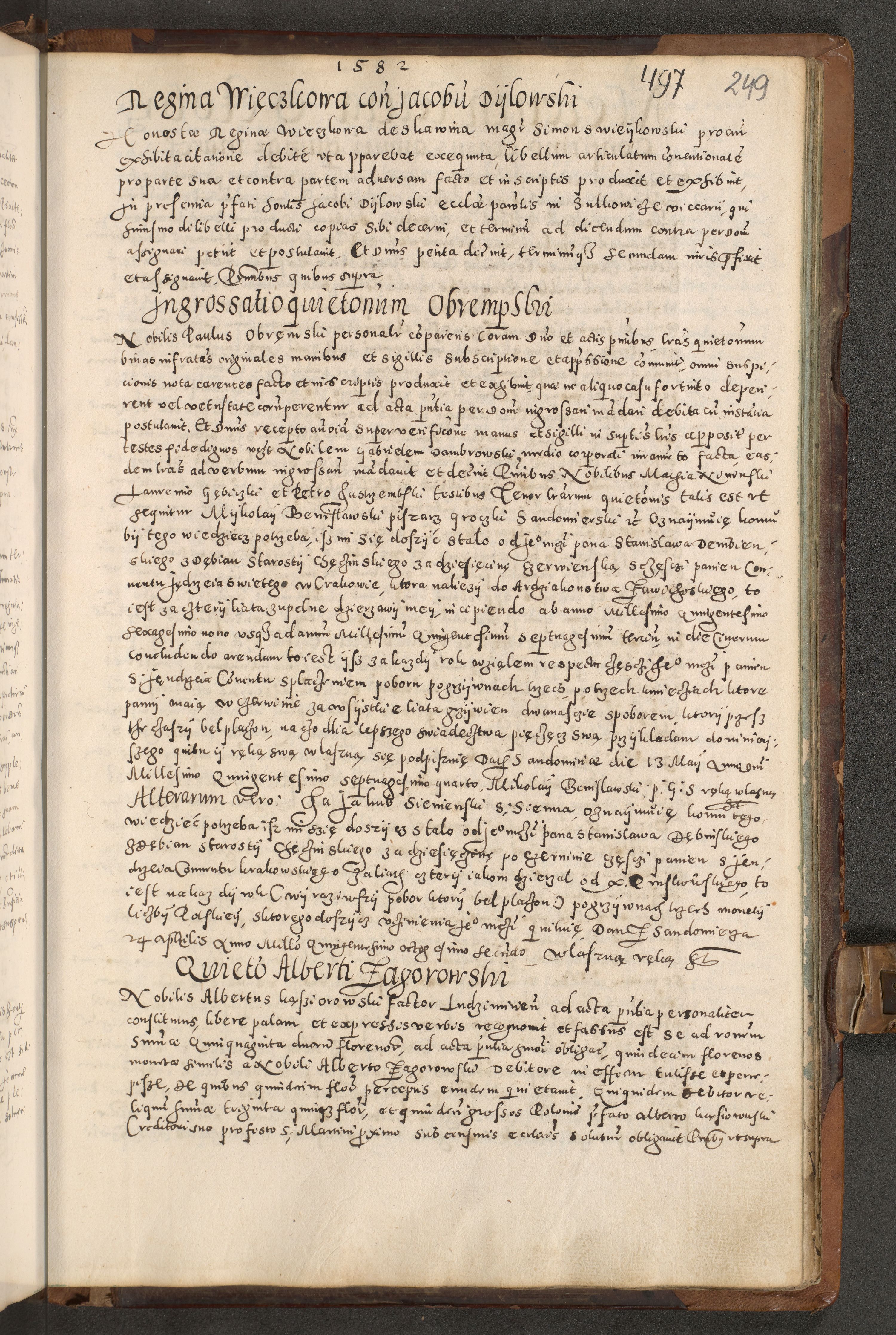 Acta actorum causarum tam diffinitivarum quam interloquutoriarum sententiarum decretorum obligationum quietatorum constuorum pro reverendum coram Reverendo Domino Alberto Nininski Custode Sandecensis Canonico et Archipresbitero Viccarioque in Spiritualibus ac Officiali Generali Cracoviensis ad Annum Domini Millesimum Qumgentesimum Septuagentesimum Nonum cuius Judictio septima Pontificat SS. nostri Domini Gregory pp. tredecimi Anno septimo inchoantur faliciter