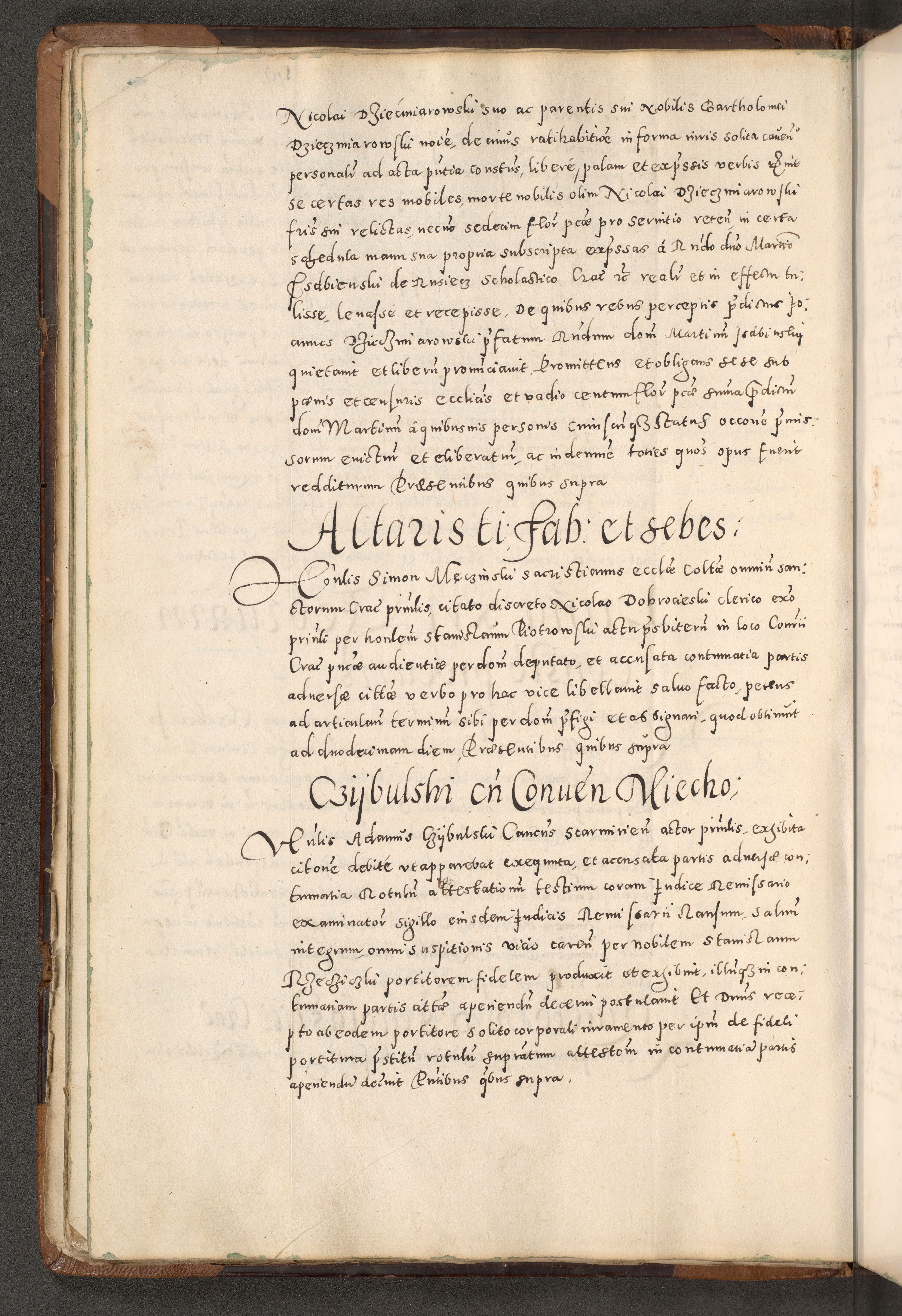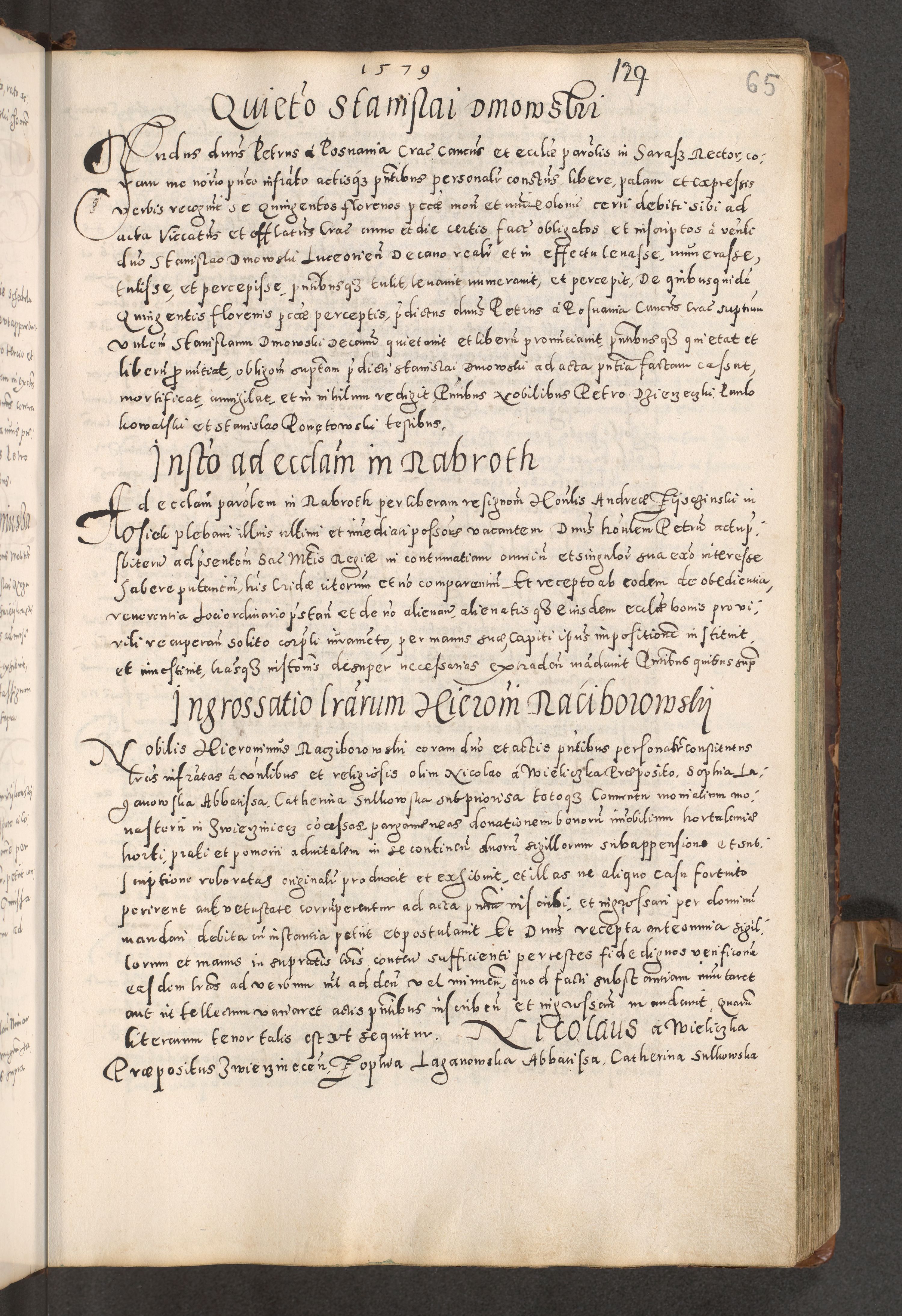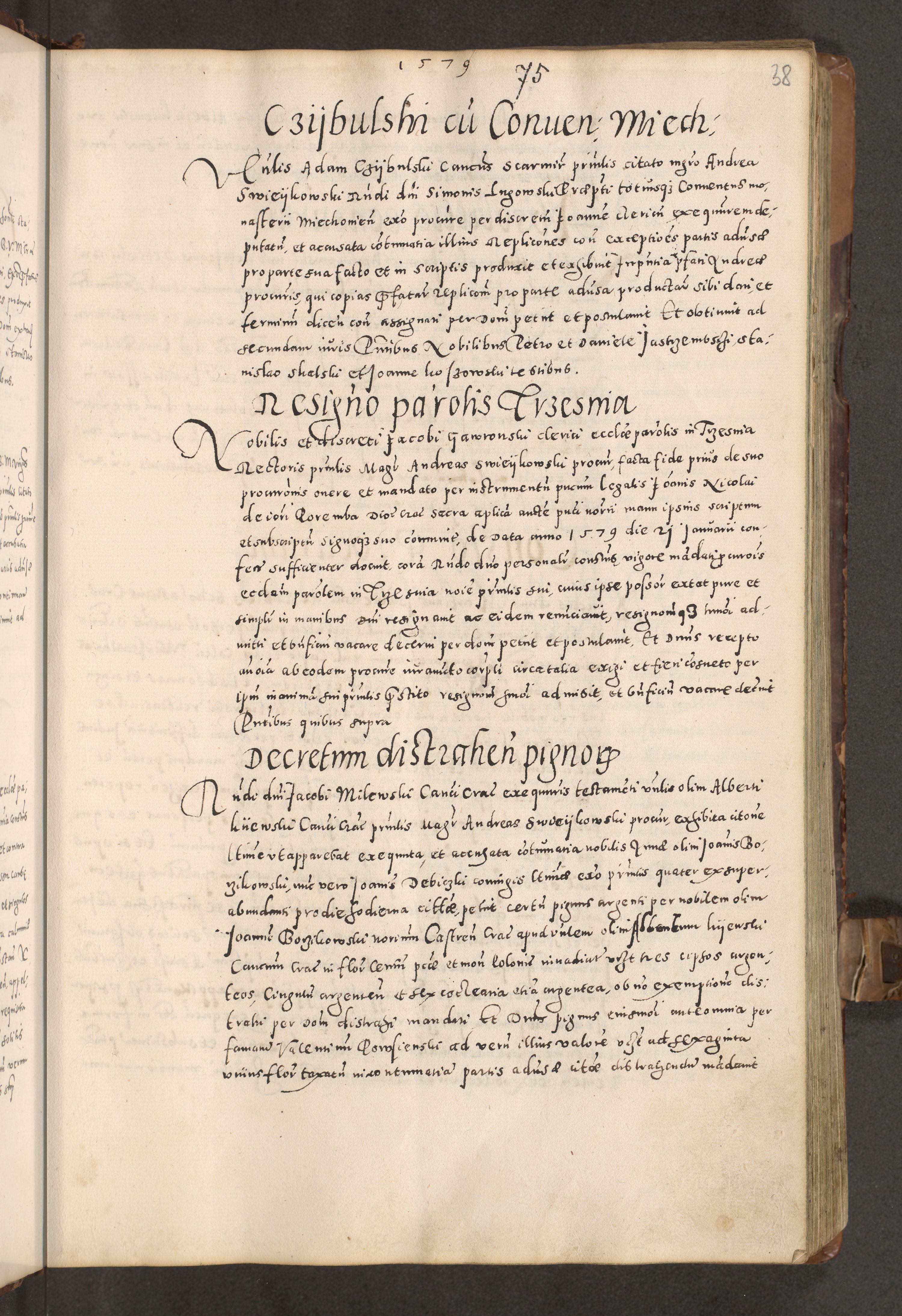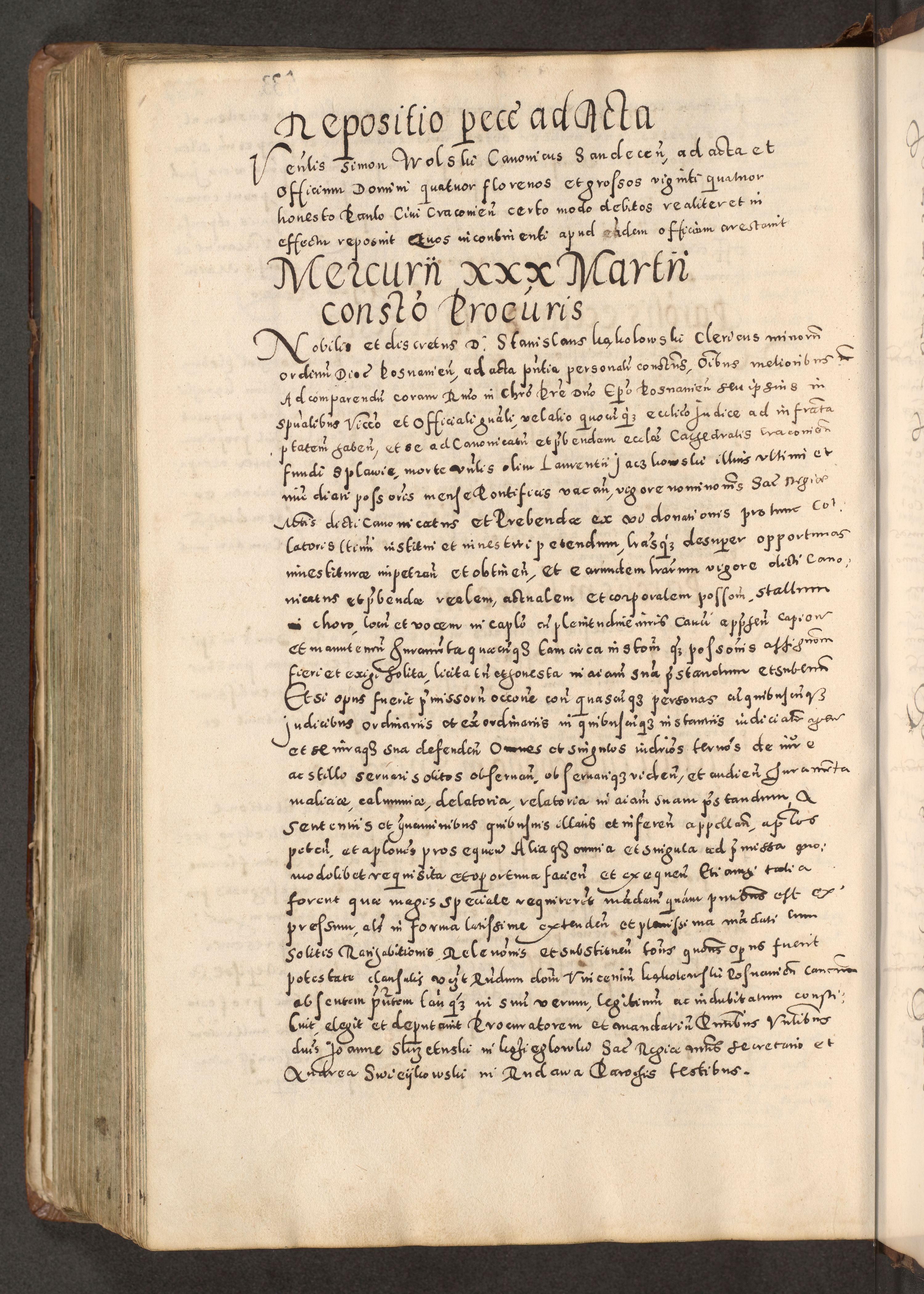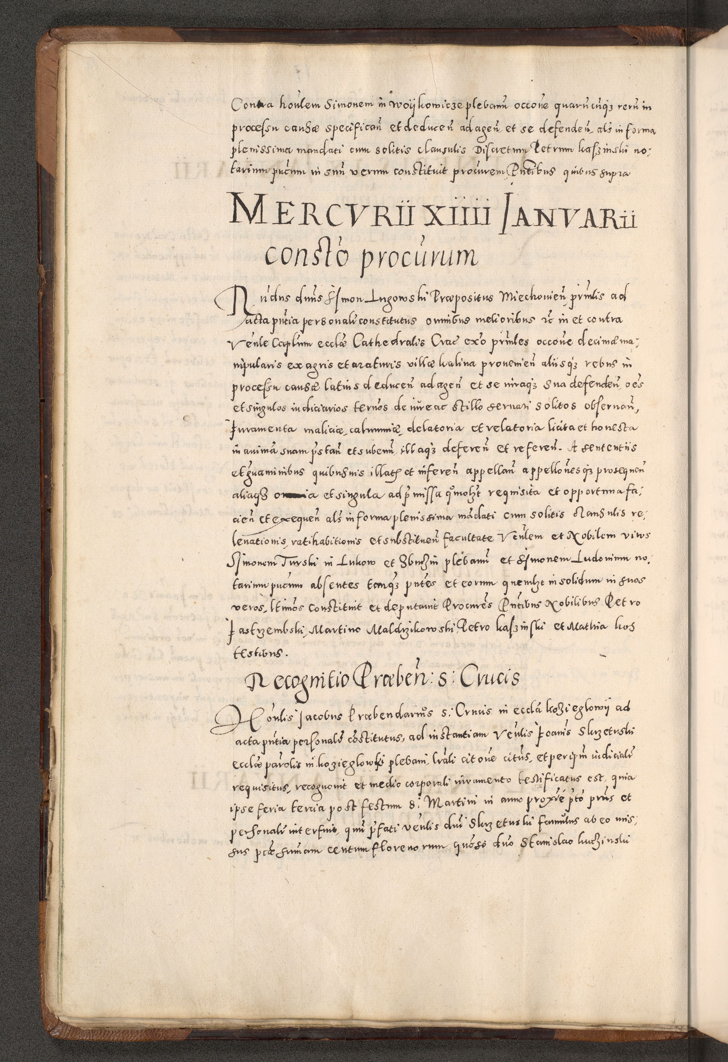 Acta actorum causarum tam diffinitivarum quam interloquutoriarum sententiarum decretorum obligationum quietatorum constuorum pro reverendum coram Reverendo Domino Alberto Nininski Custode Sandecensis Canonico et Archipresbitero Viccarioque in Spiritualibus ac Officiali Generali Cracoviensis ad Annum Domini Millesimum Qumgentesimum Septuagentesimum Nonum cuius Judictio septima Pontificat SS. nostri Domini Gregory pp. tredecimi Anno septimo inchoantur faliciter