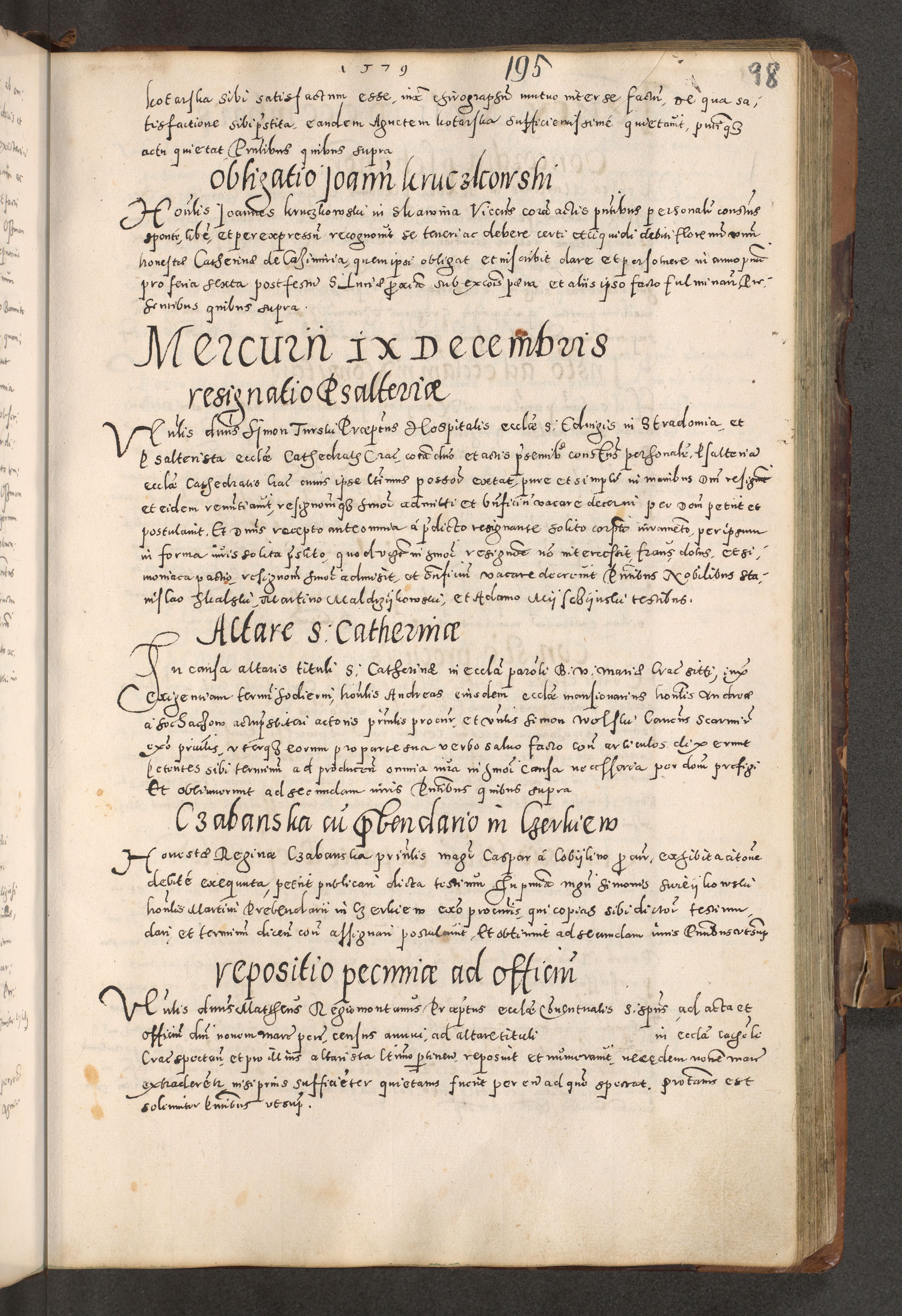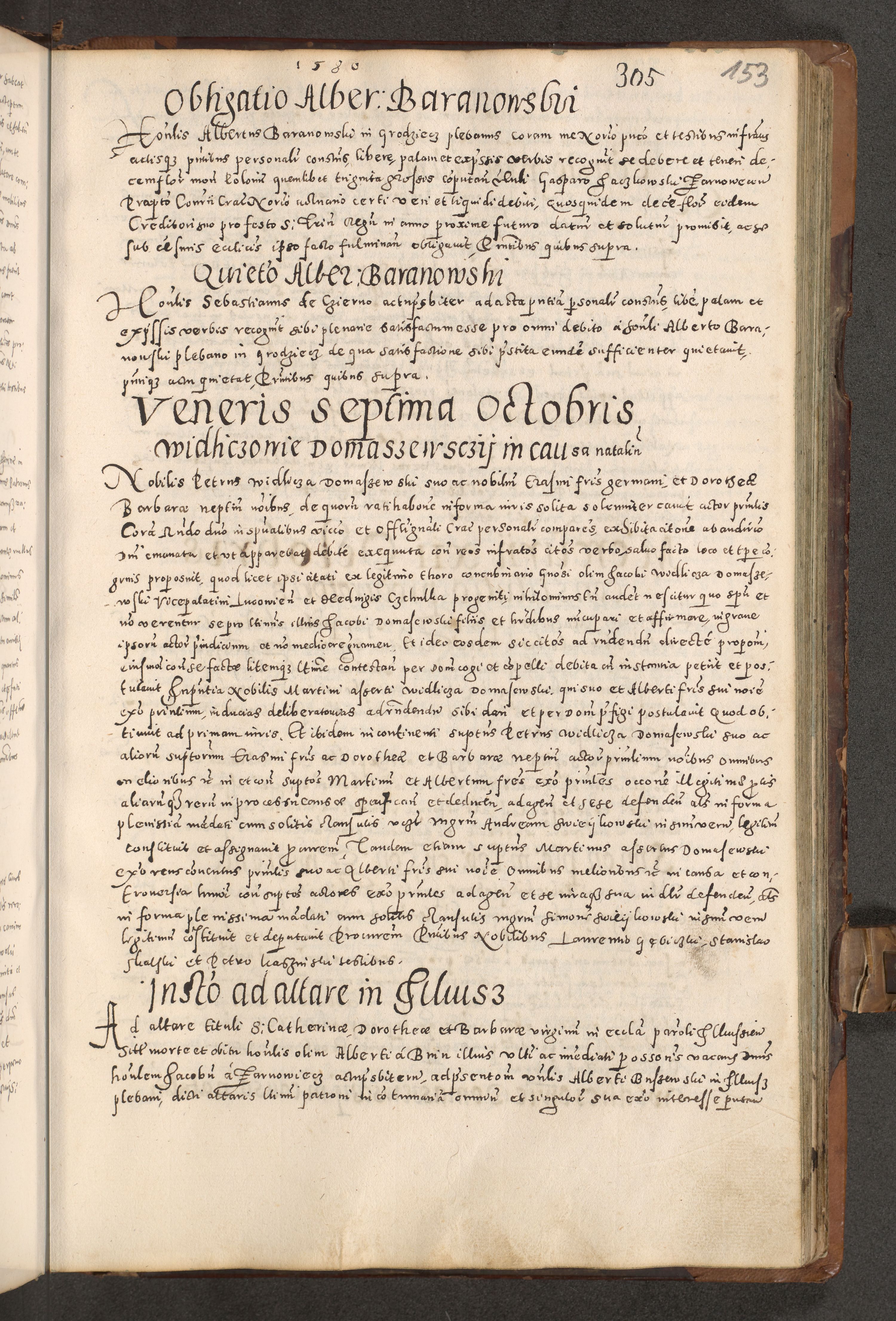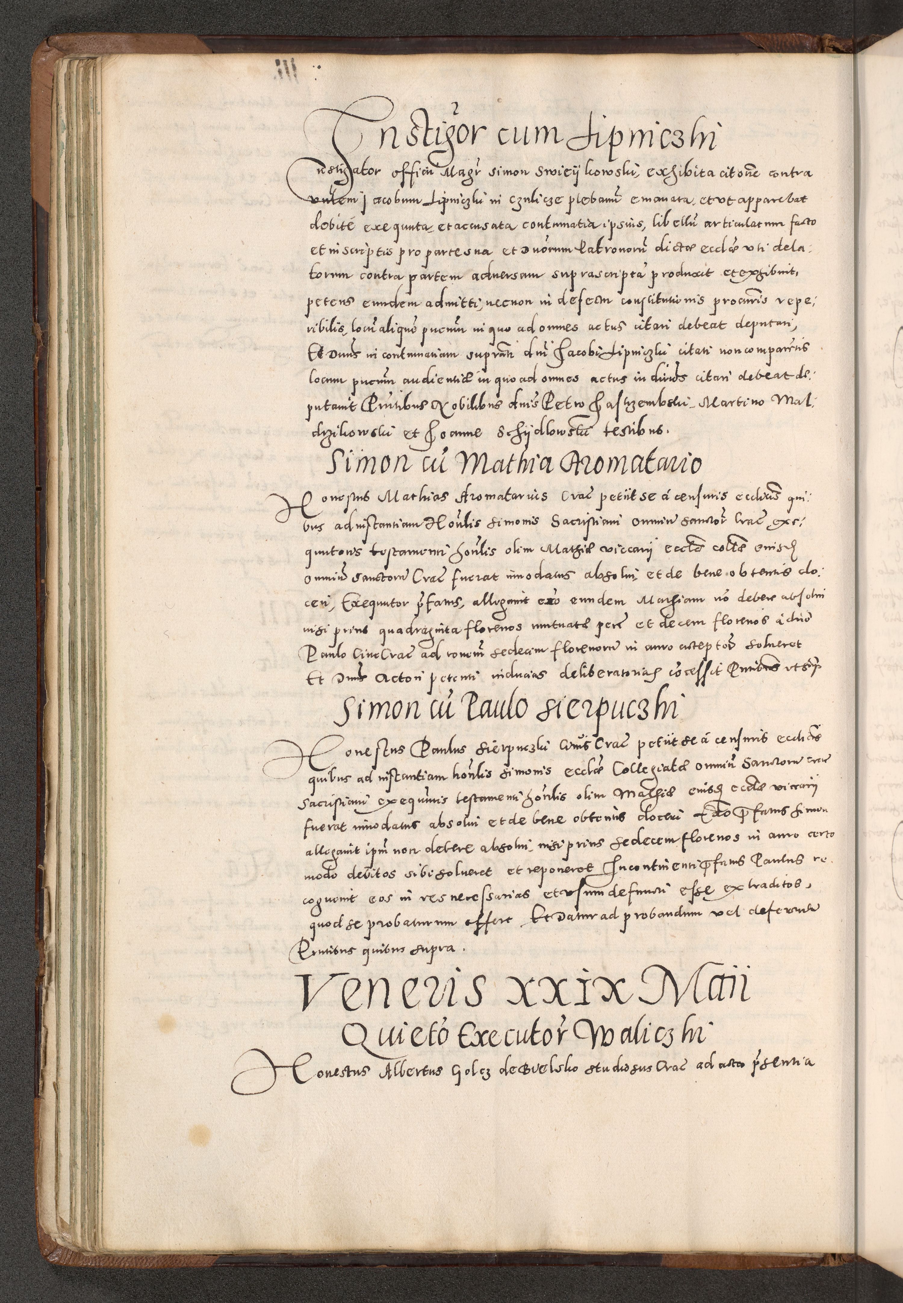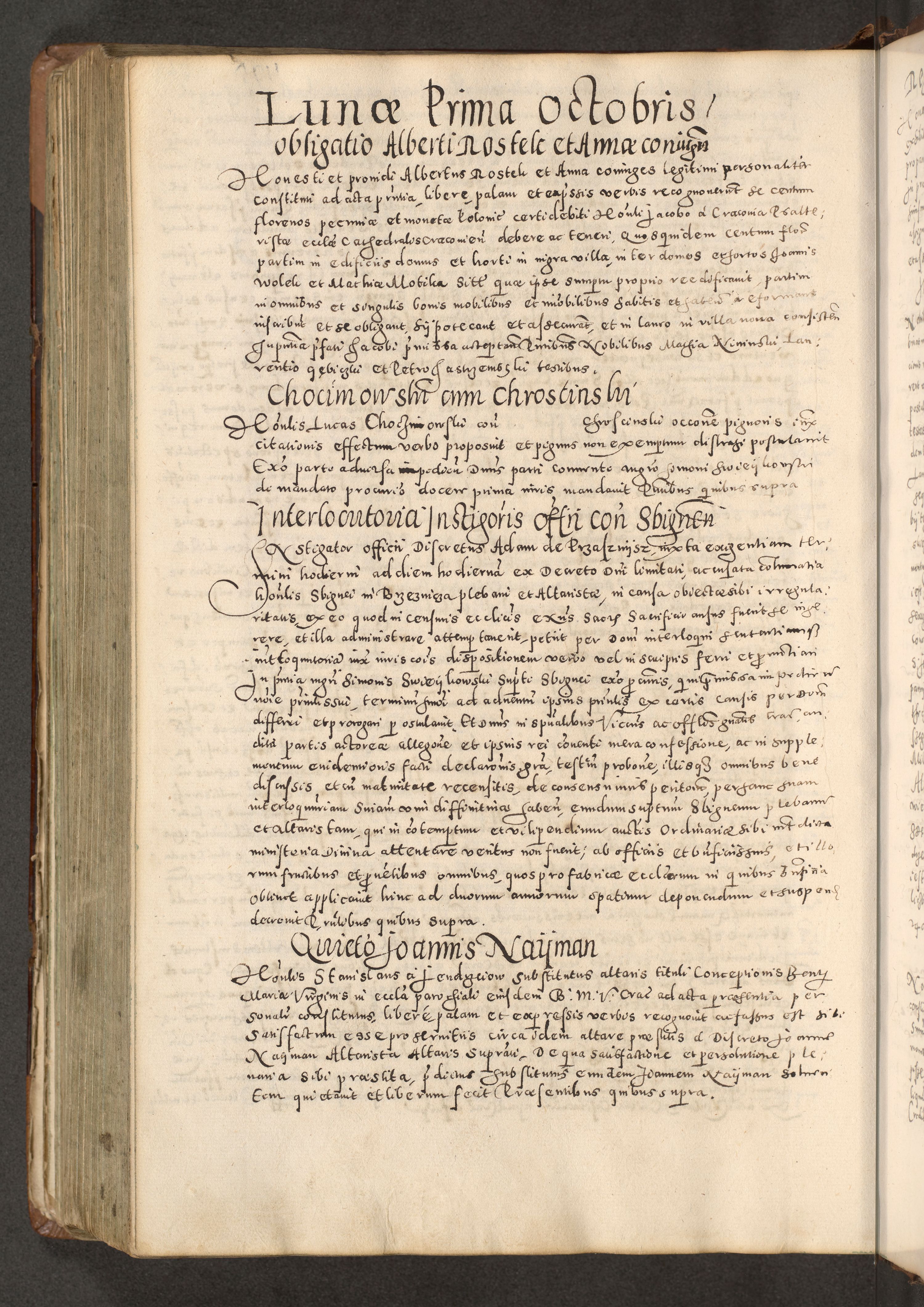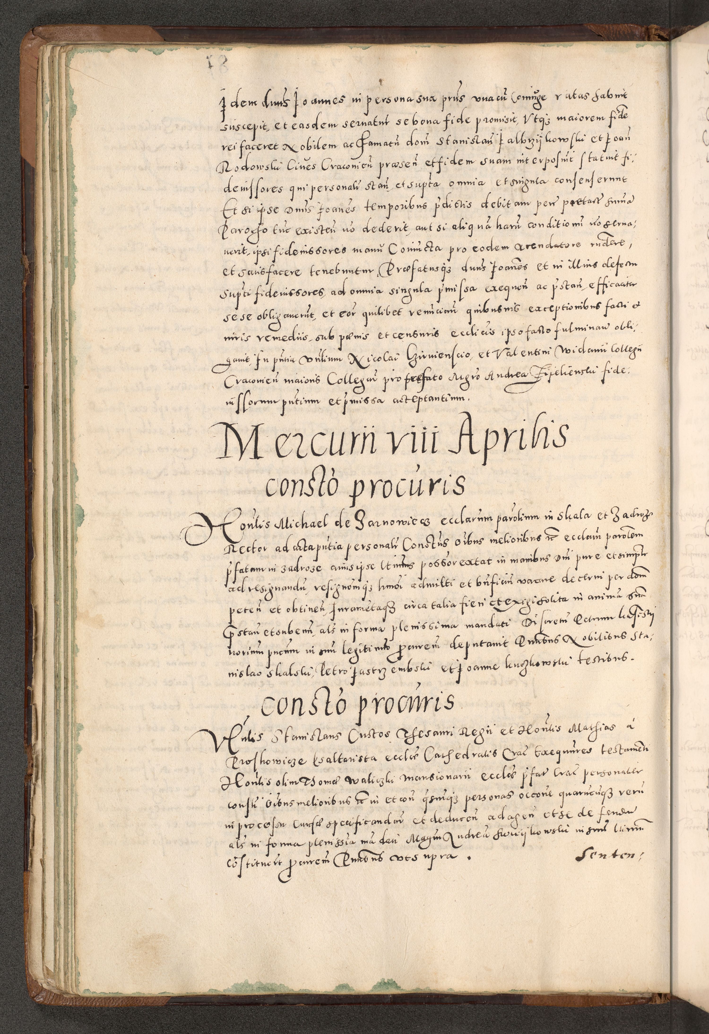 Acta actorum causarum tam diffinitivarum quam interloquutoriarum sententiarum decretorum obligationum quietatorum constuorum pro reverendum coram Reverendo Domino Alberto Nininski Custode Sandecensis Canonico et Archipresbitero Viccarioque in Spiritualibus ac Officiali Generali Cracoviensis ad Annum Domini Millesimum Qumgentesimum Septuagentesimum Nonum cuius Judictio septima Pontificat SS. nostri Domini Gregory pp. tredecimi Anno septimo inchoantur faliciter