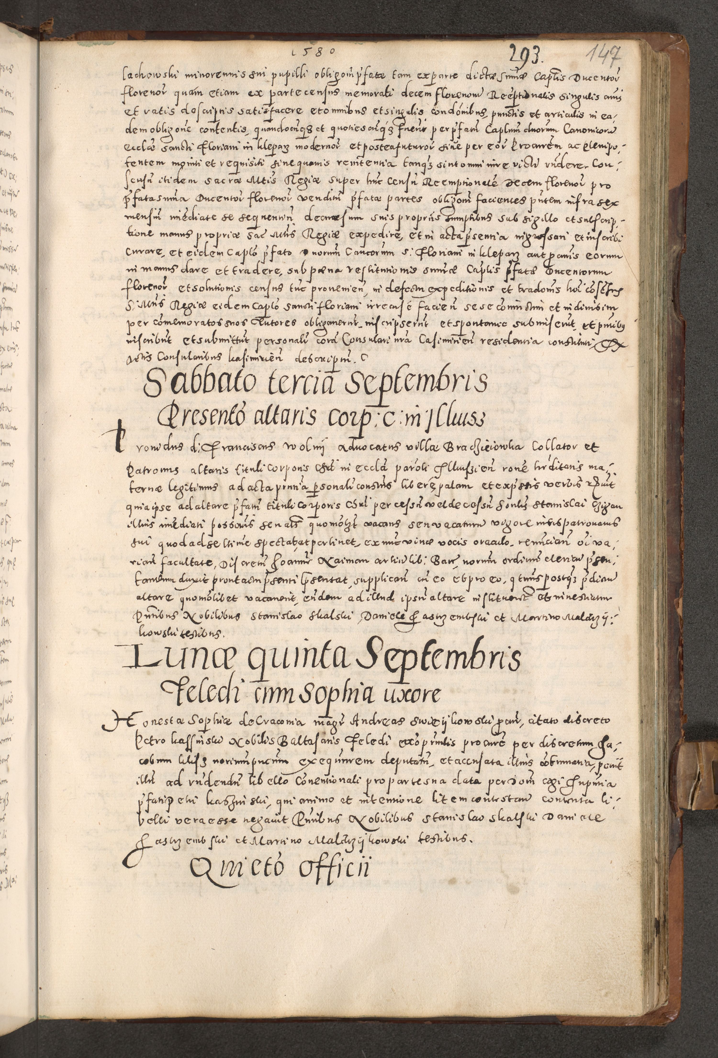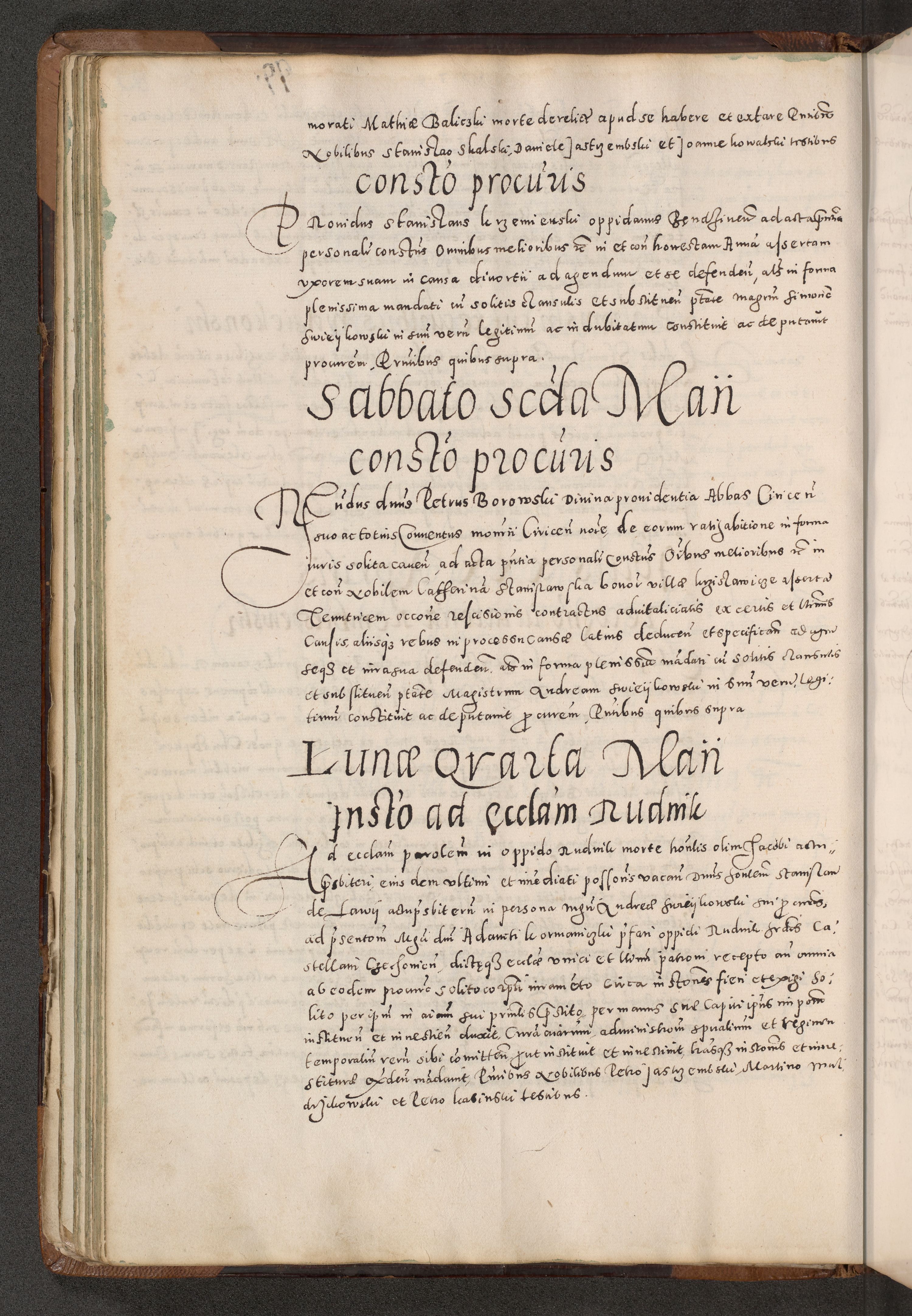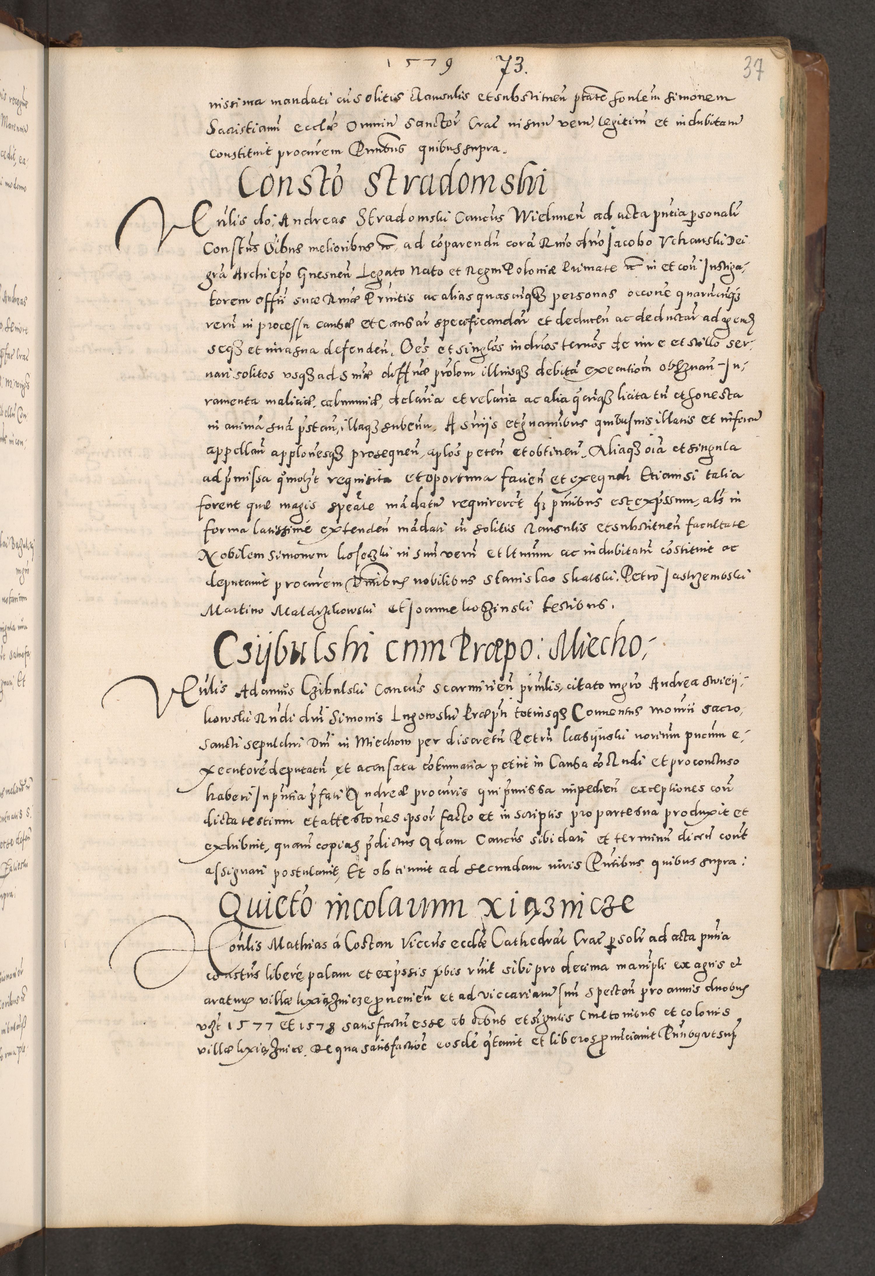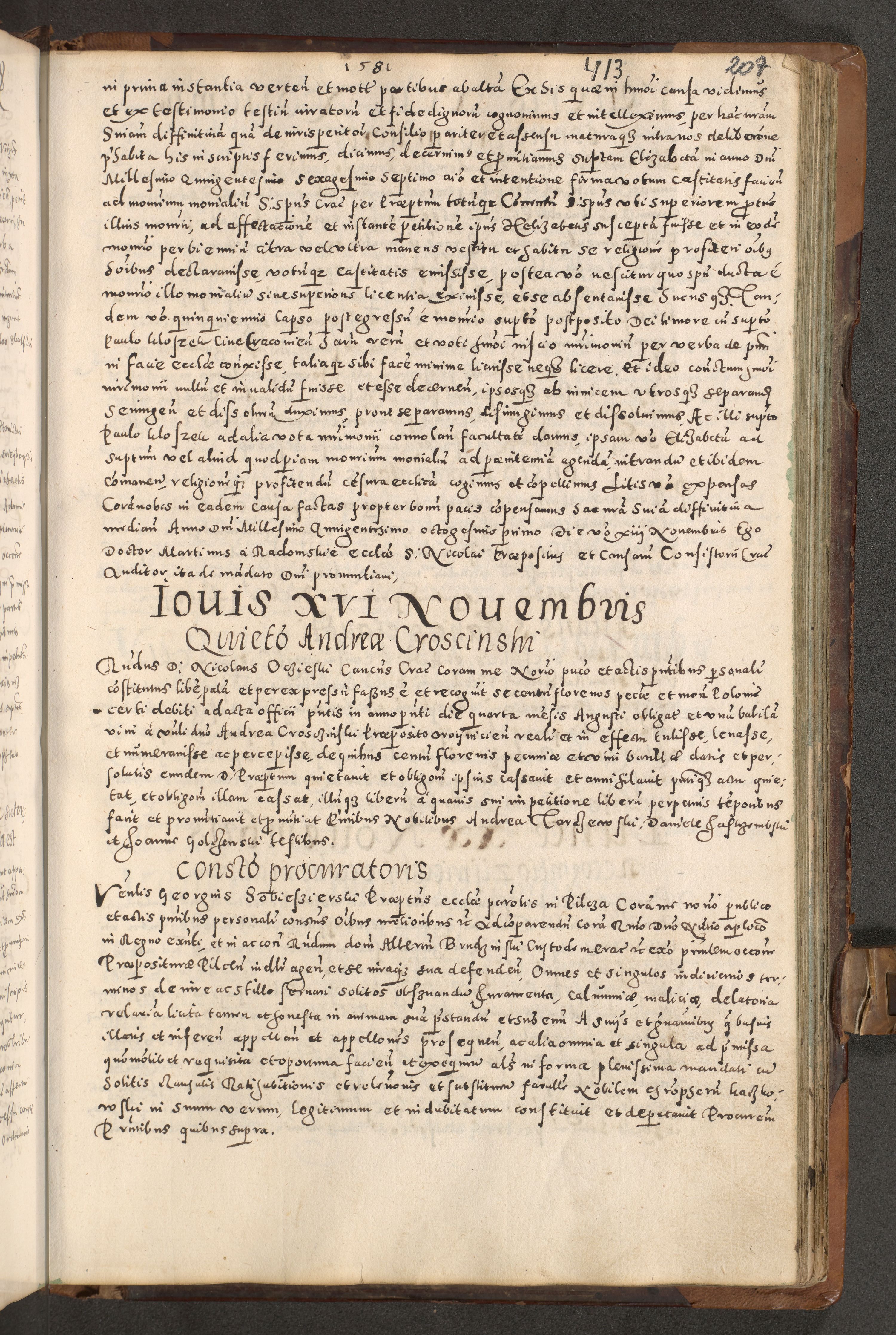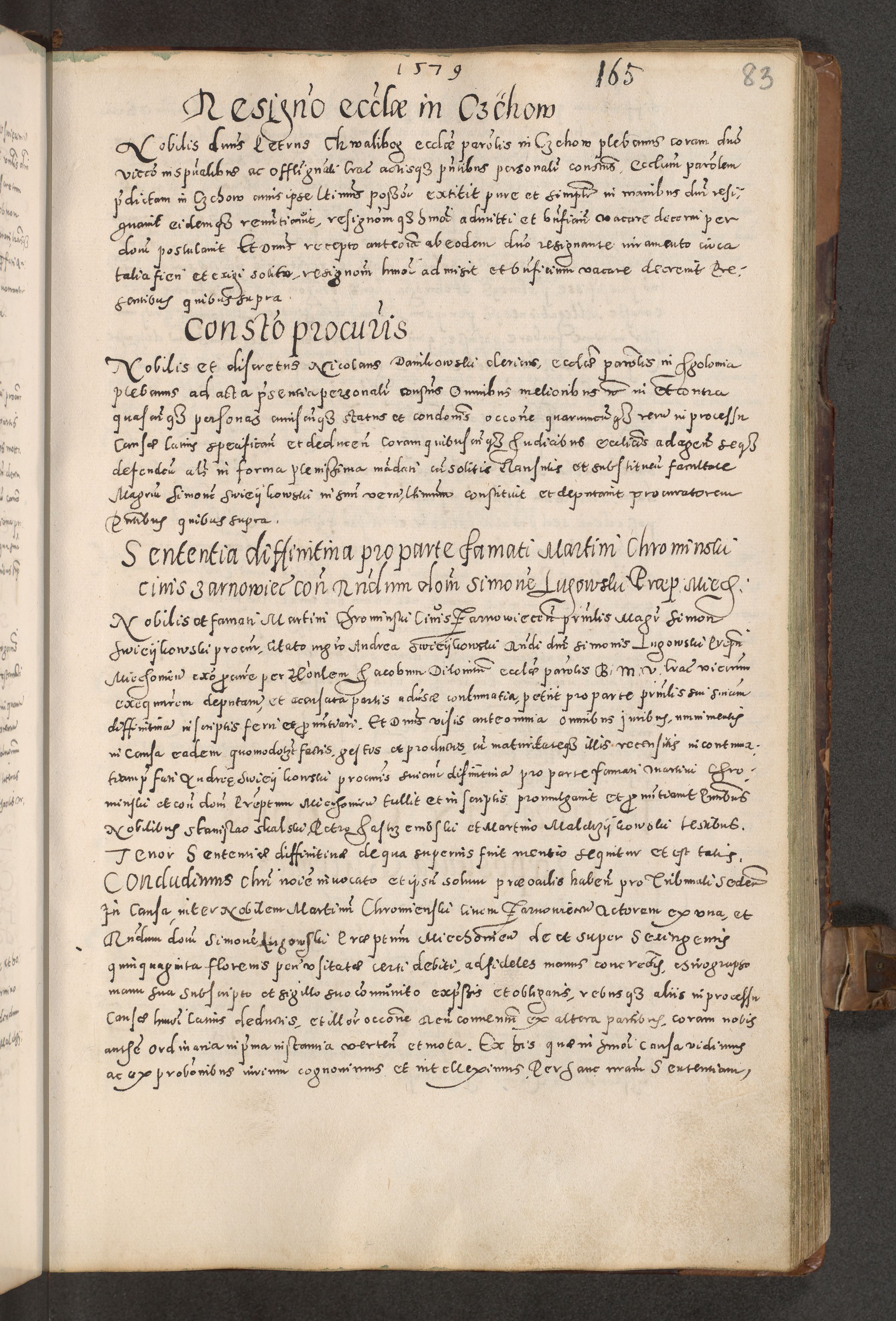 Acta actorum causarum tam diffinitivarum quam interloquutoriarum sententiarum decretorum obligationum quietatorum constuorum pro reverendum coram Reverendo Domino Alberto Nininski Custode Sandecensis Canonico et Archipresbitero Viccarioque in Spiritualibus ac Officiali Generali Cracoviensis ad Annum Domini Millesimum Qumgentesimum Septuagentesimum Nonum cuius Judictio septima Pontificat SS. nostri Domini Gregory pp. tredecimi Anno septimo inchoantur faliciter
