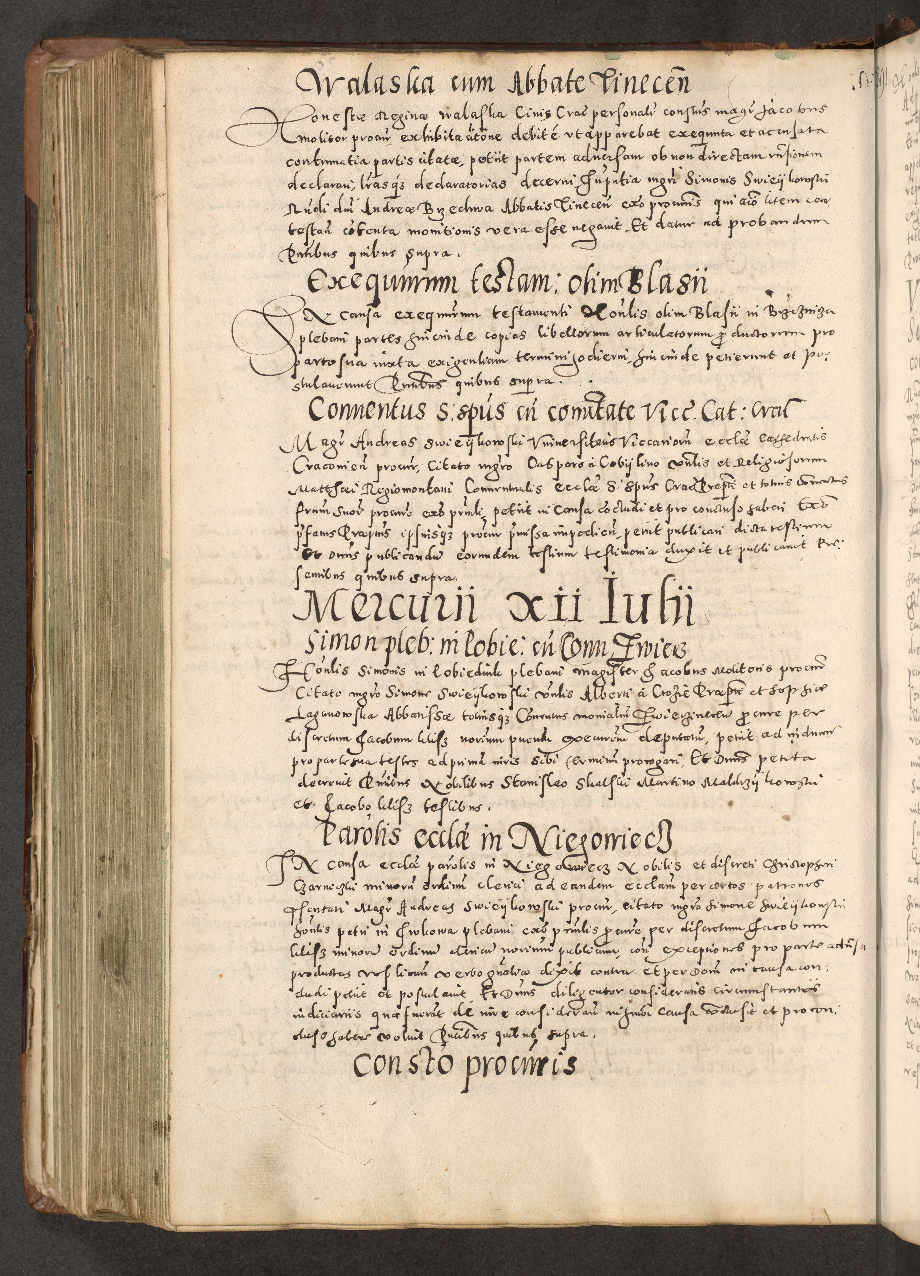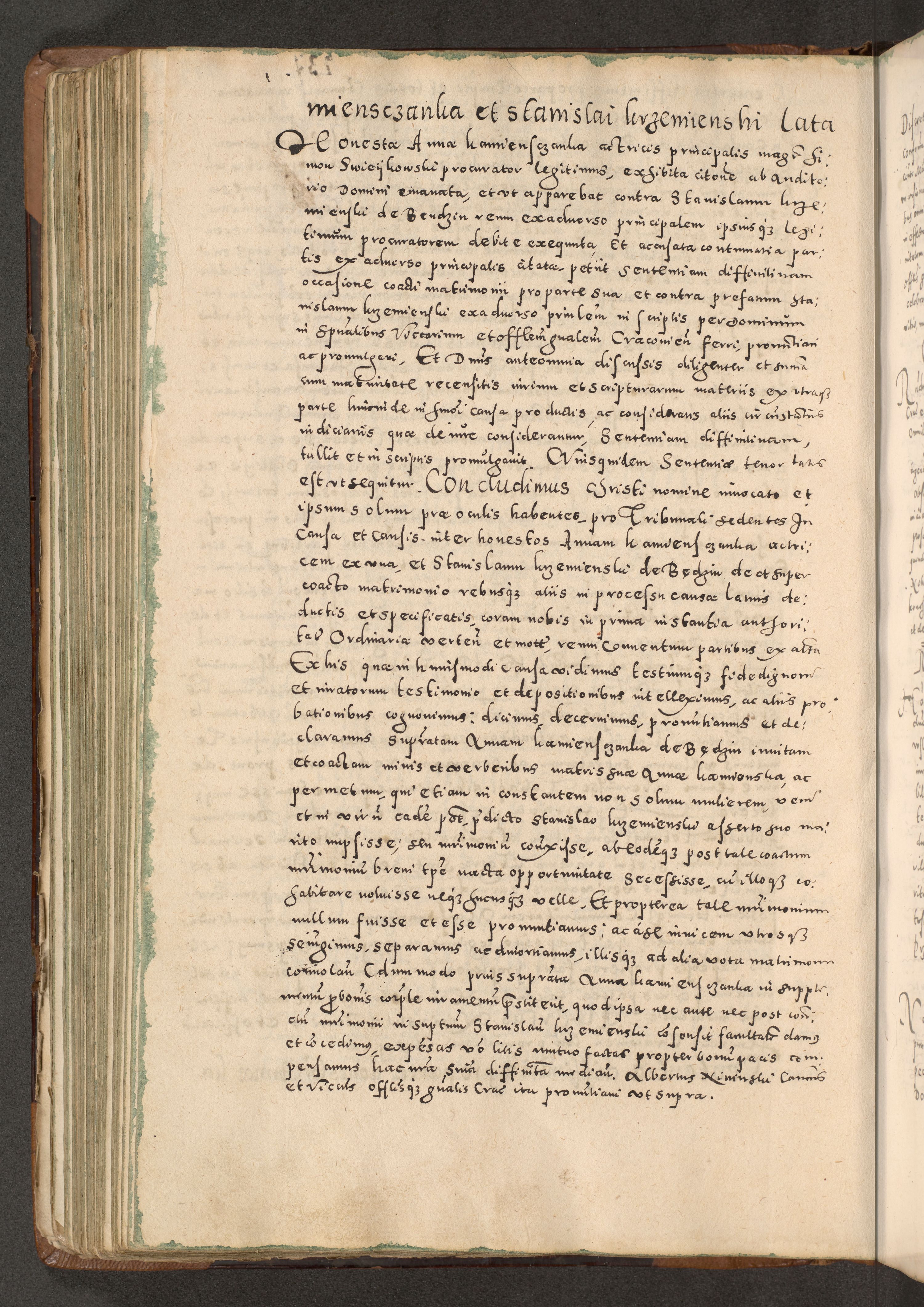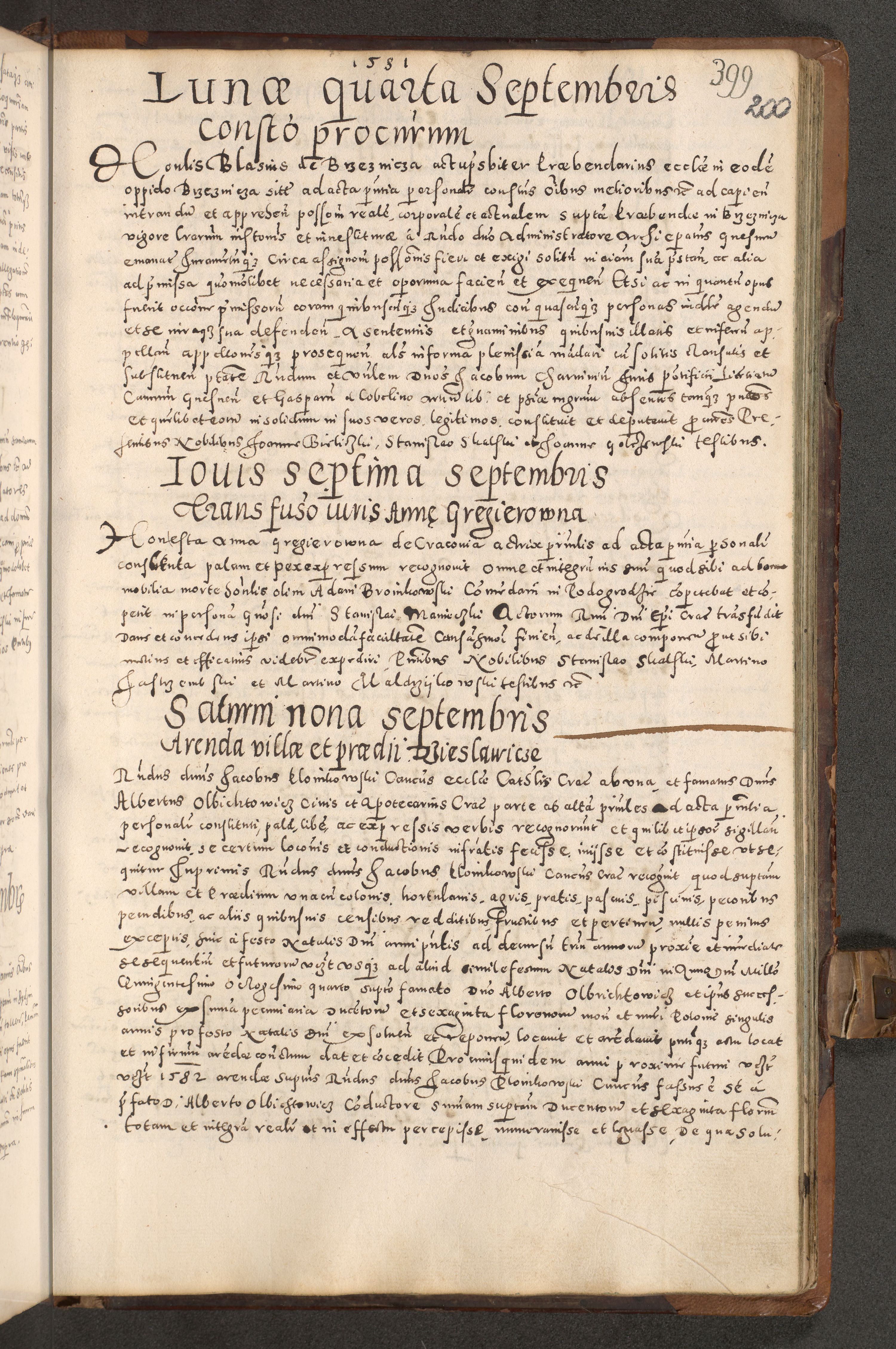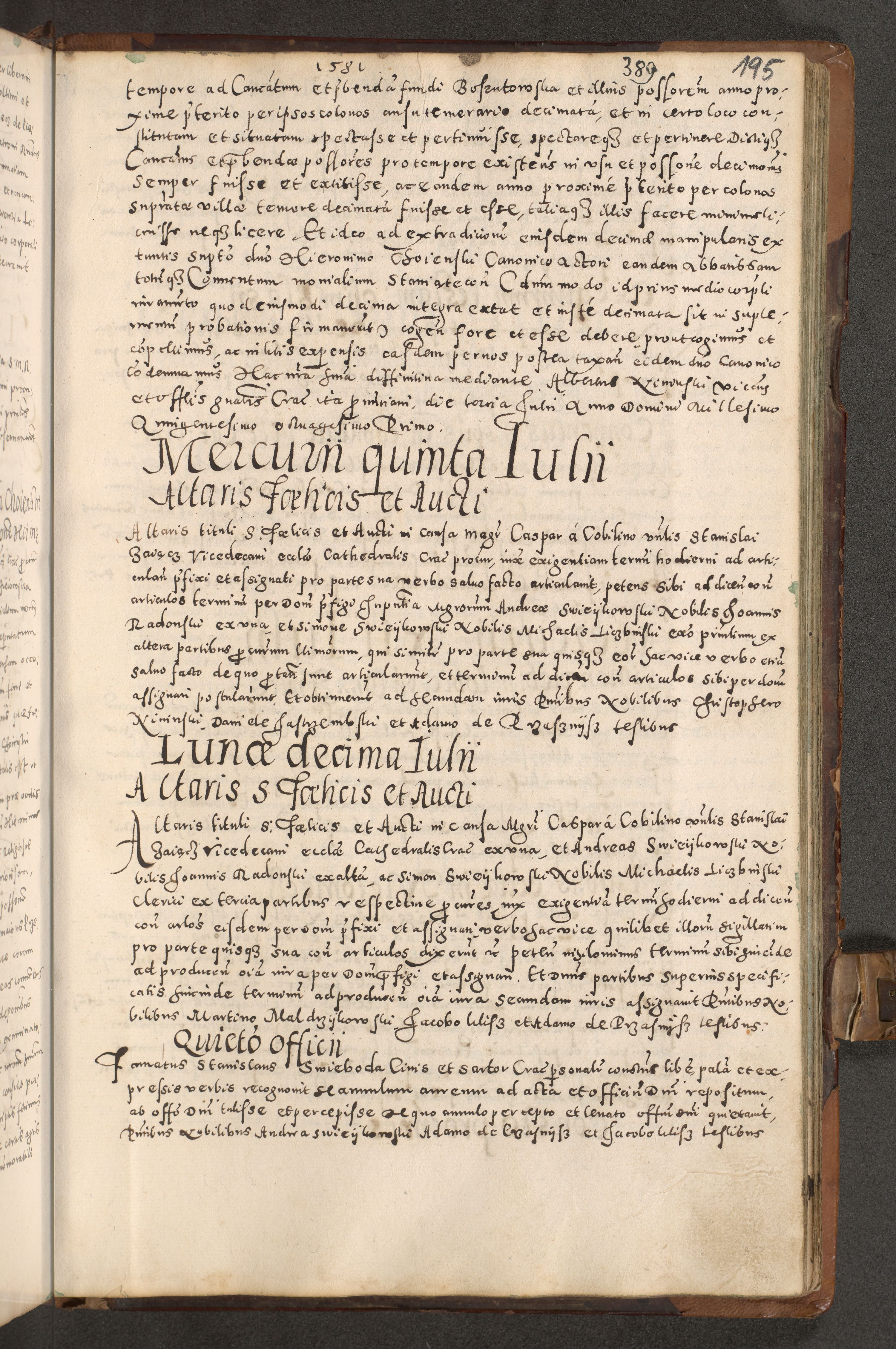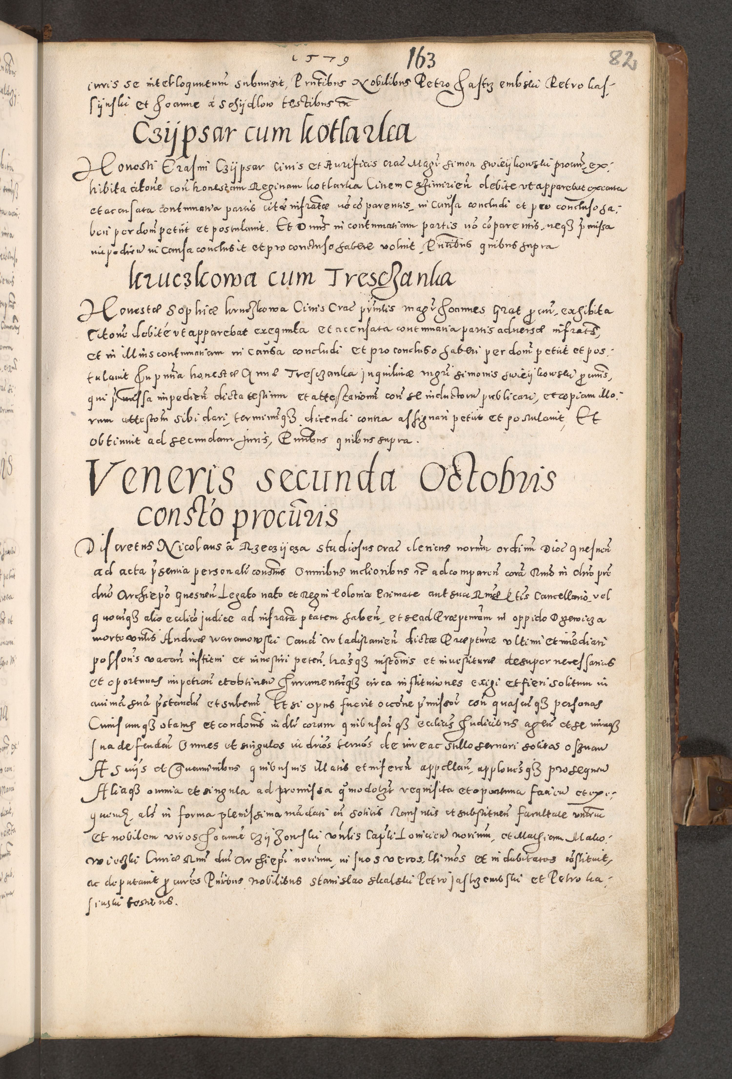 Acta actorum causarum tam diffinitivarum quam interloquutoriarum sententiarum decretorum obligationum quietatorum constuorum pro reverendum coram Reverendo Domino Alberto Nininski Custode Sandecensis Canonico et Archipresbitero Viccarioque in Spiritualibus ac Officiali Generali Cracoviensis ad Annum Domini Millesimum Qumgentesimum Septuagentesimum Nonum cuius Judictio septima Pontificat SS. nostri Domini Gregory pp. tredecimi Anno septimo inchoantur faliciter