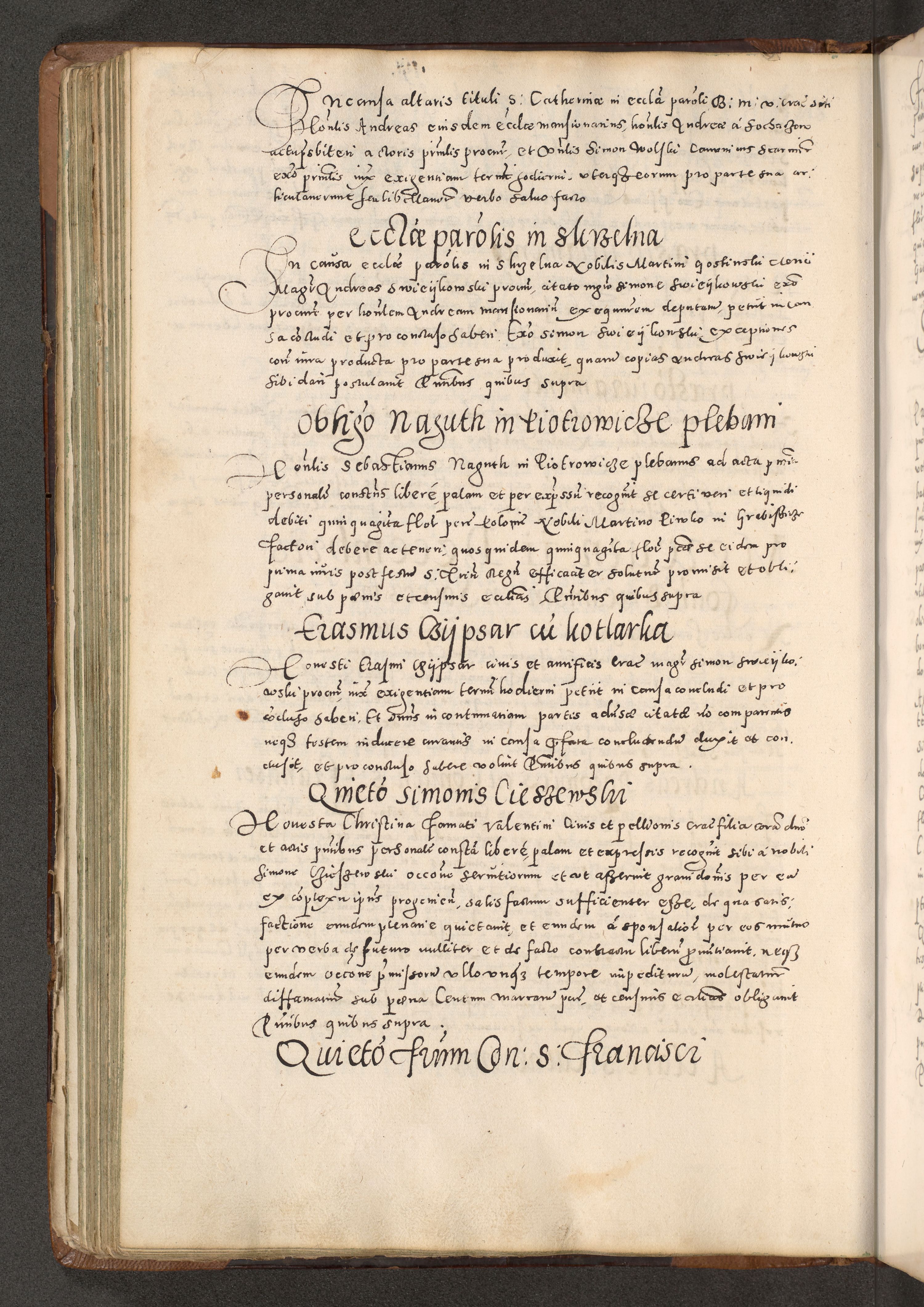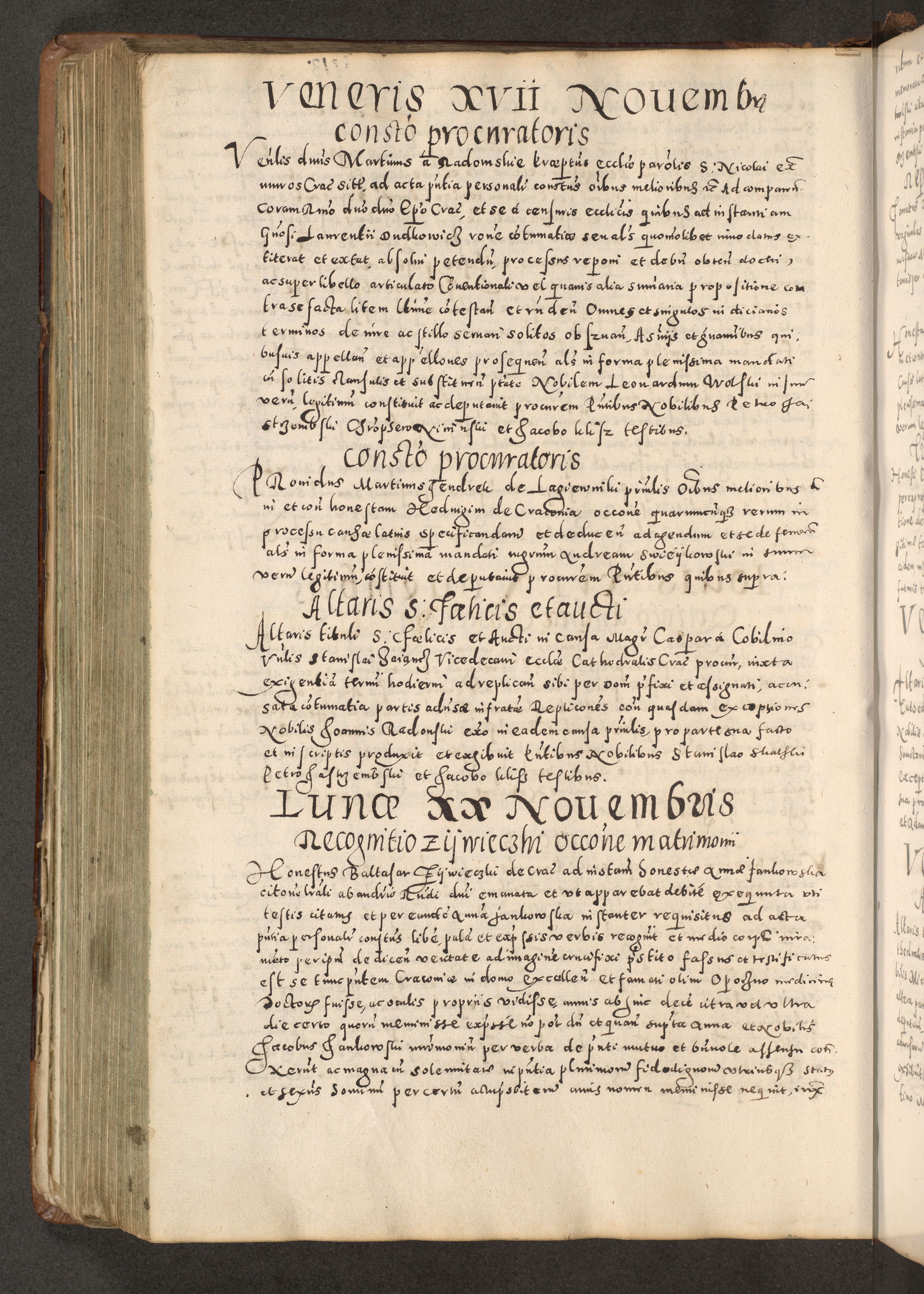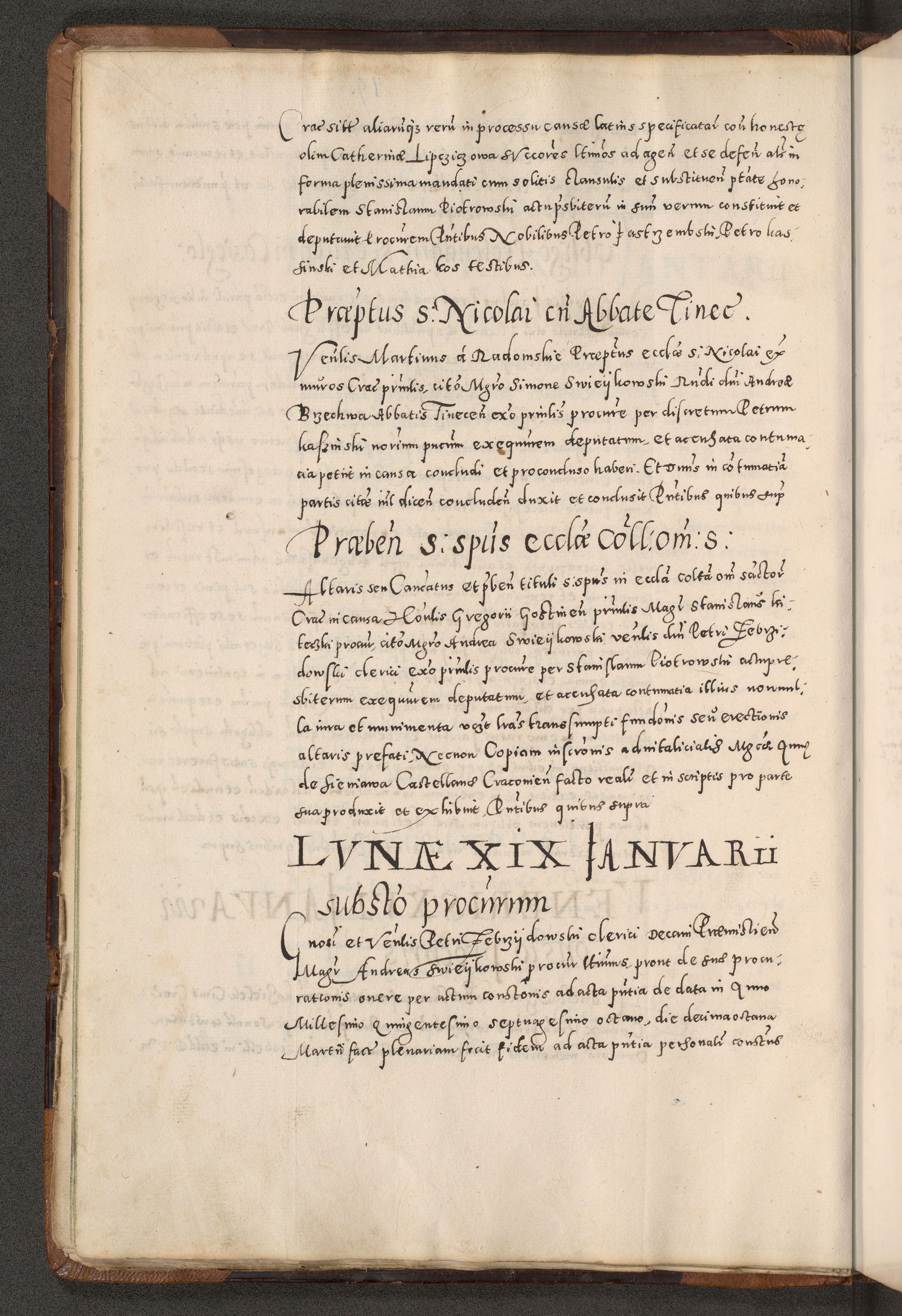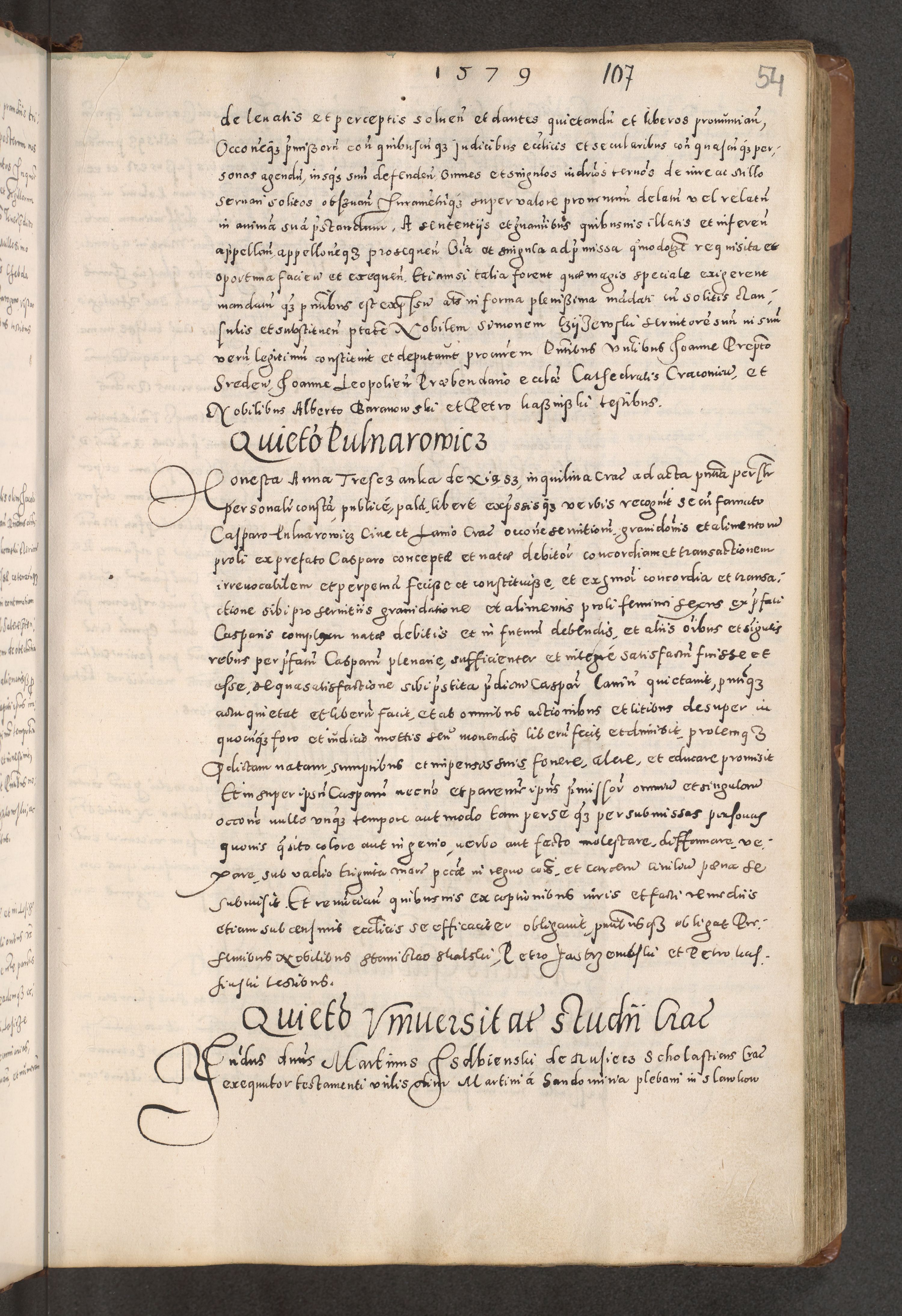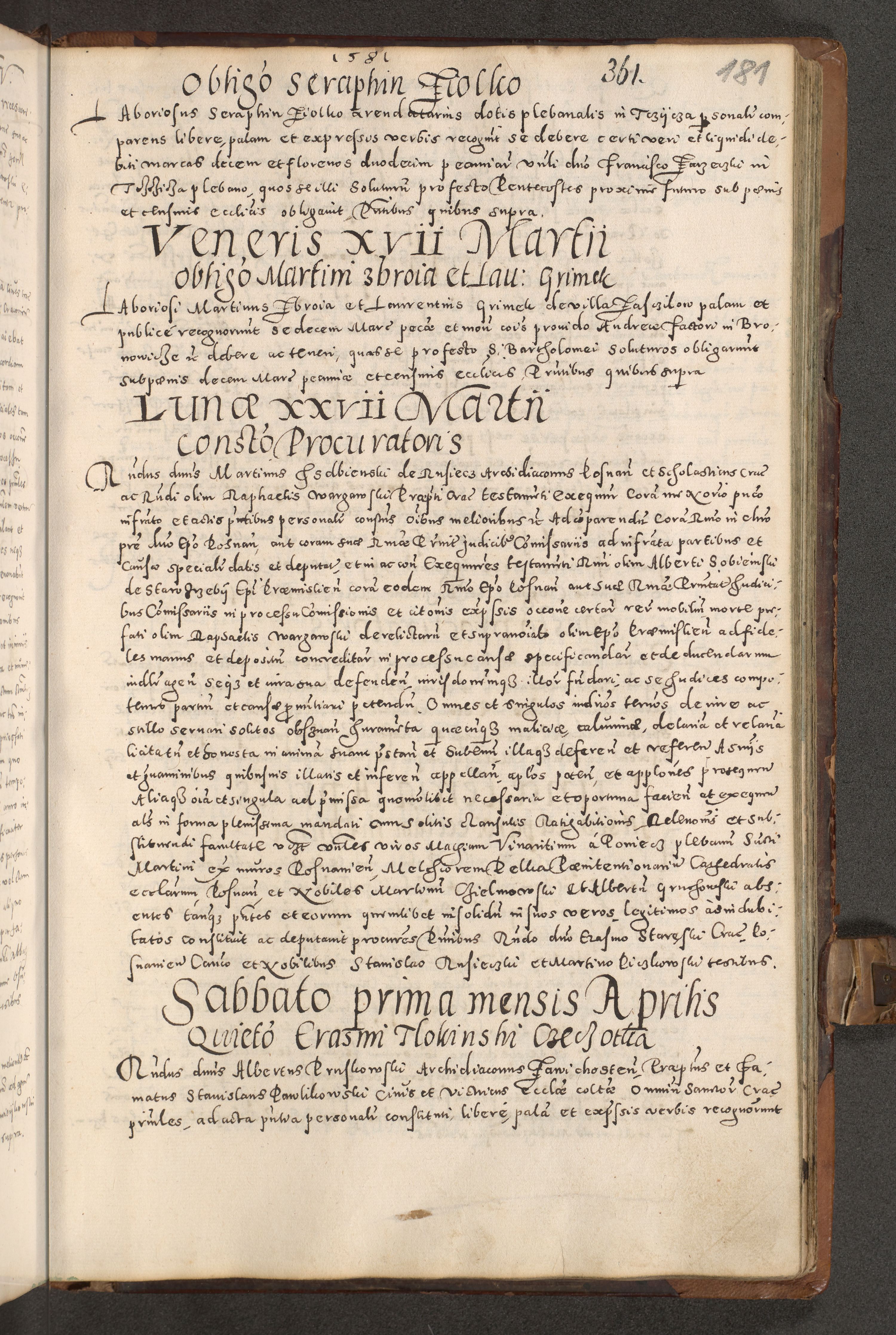 Acta actorum causarum tam diffinitivarum quam interloquutoriarum sententiarum decretorum obligationum quietatorum constuorum pro reverendum coram Reverendo Domino Alberto Nininski Custode Sandecensis Canonico et Archipresbitero Viccarioque in Spiritualibus ac Officiali Generali Cracoviensis ad Annum Domini Millesimum Qumgentesimum Septuagentesimum Nonum cuius Judictio septima Pontificat SS. nostri Domini Gregory pp. tredecimi Anno septimo inchoantur faliciter