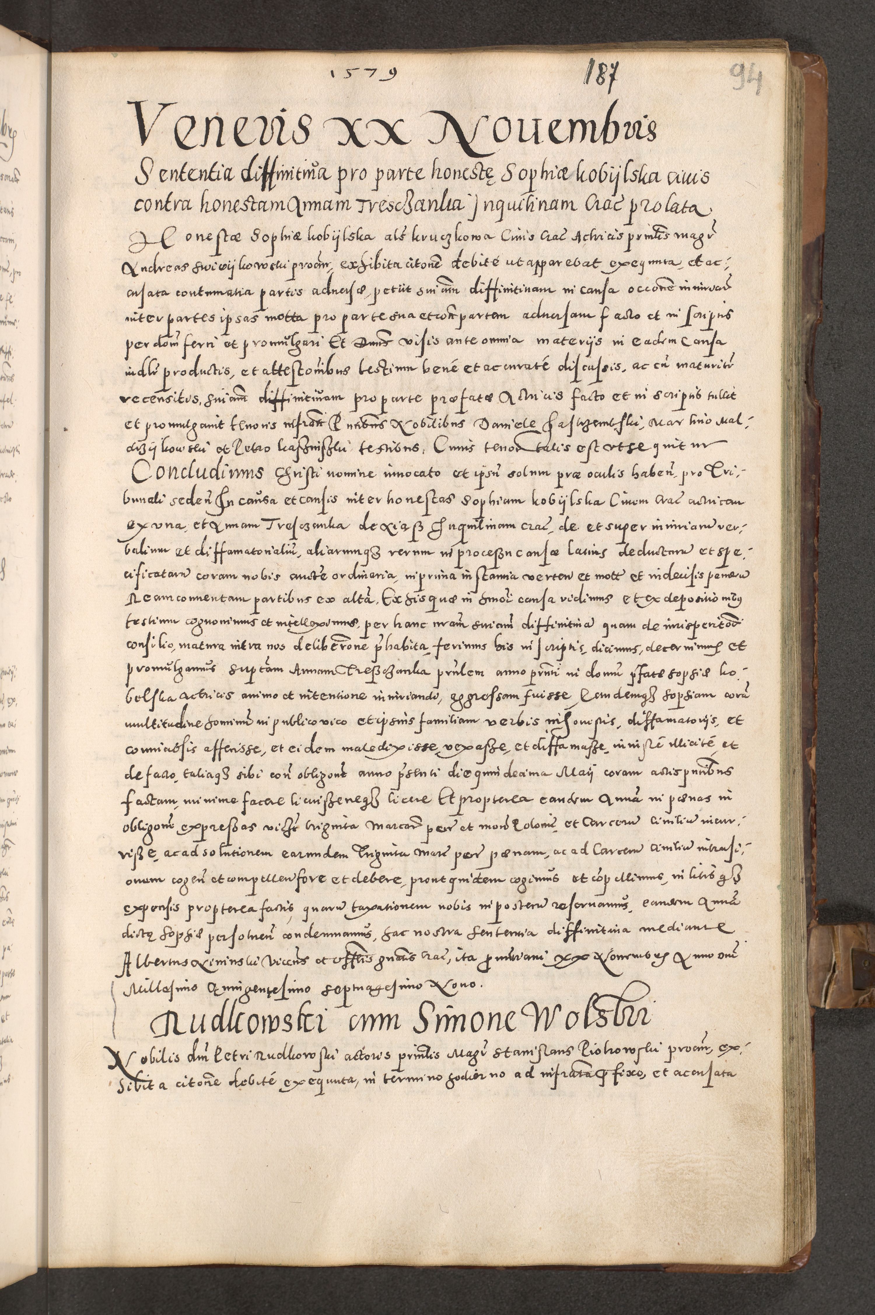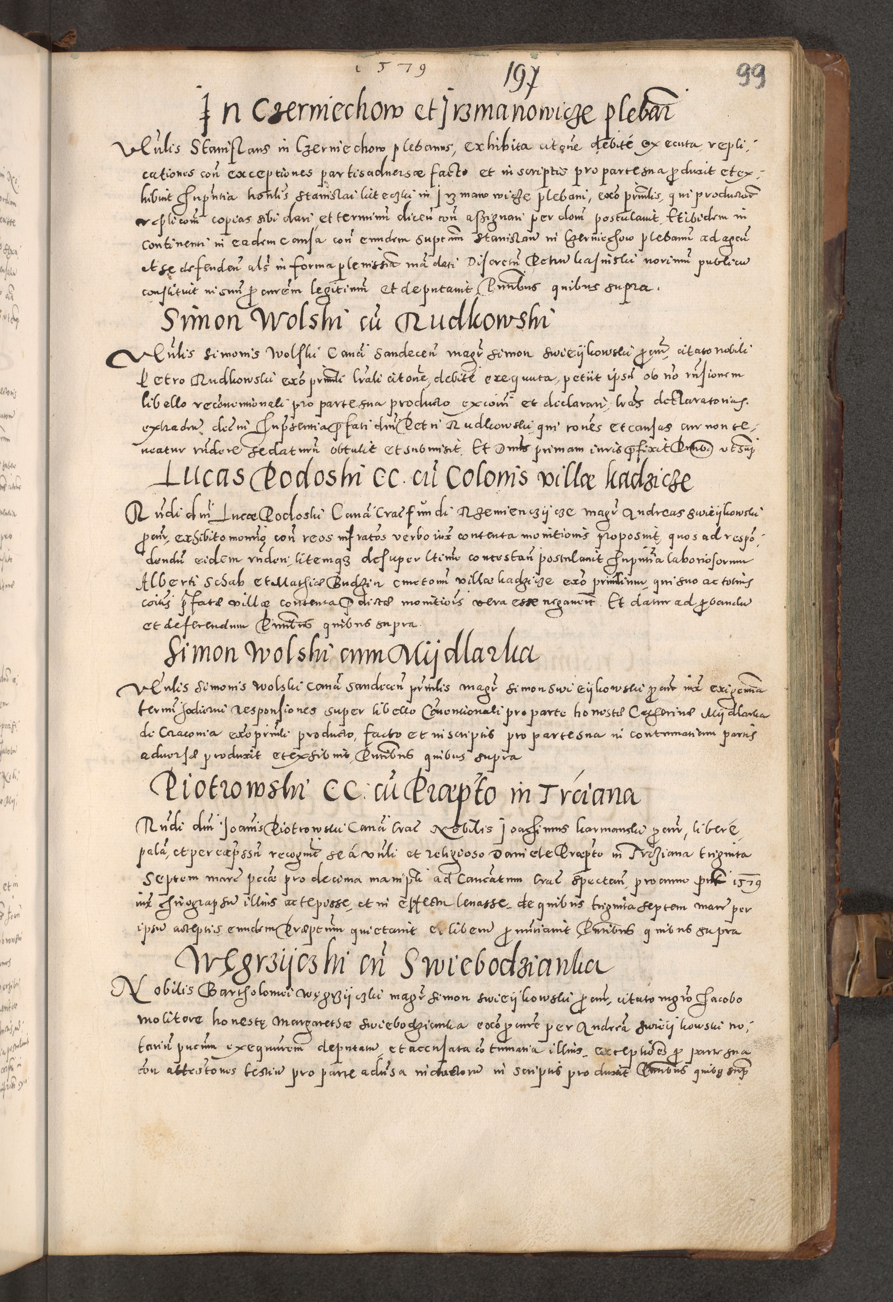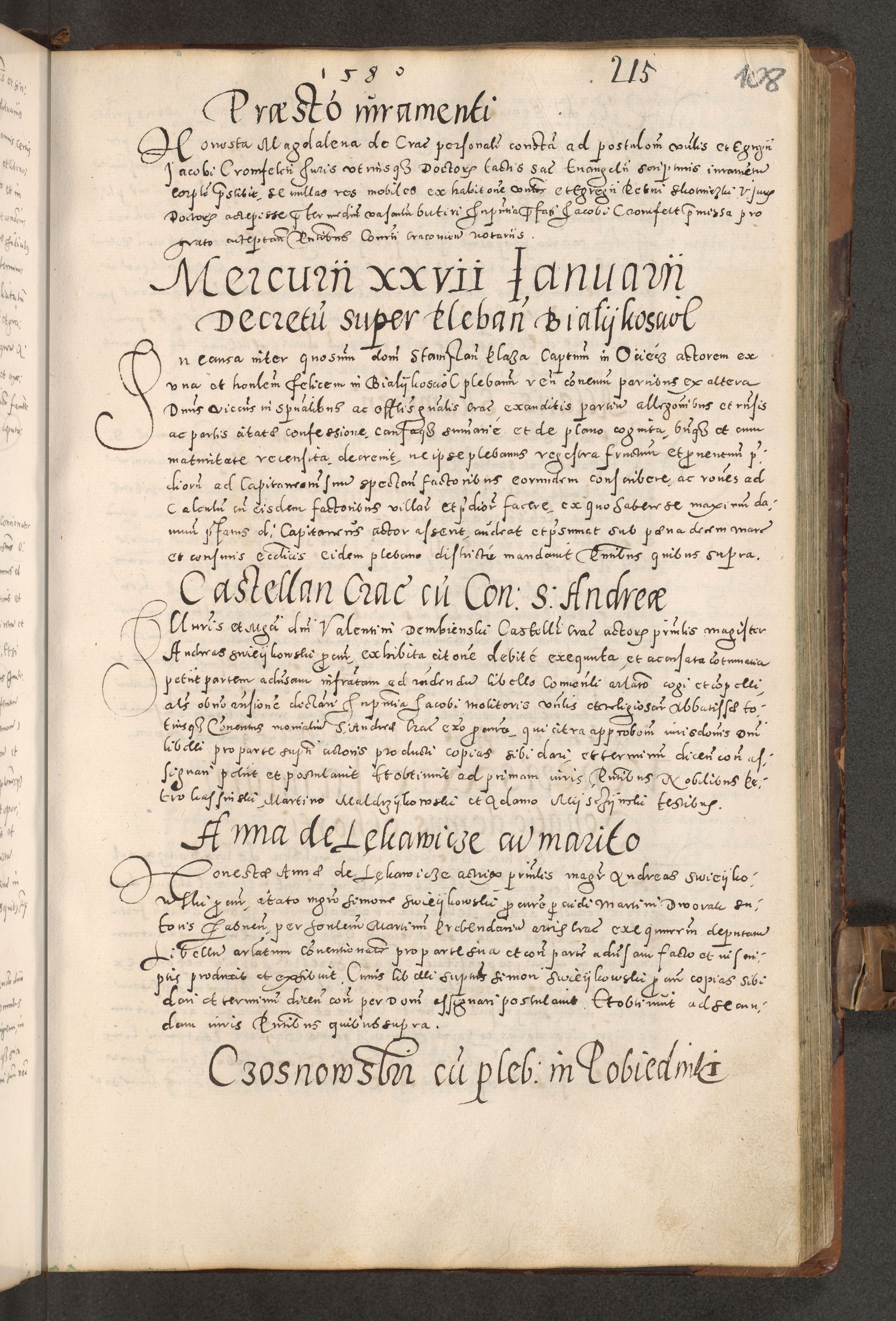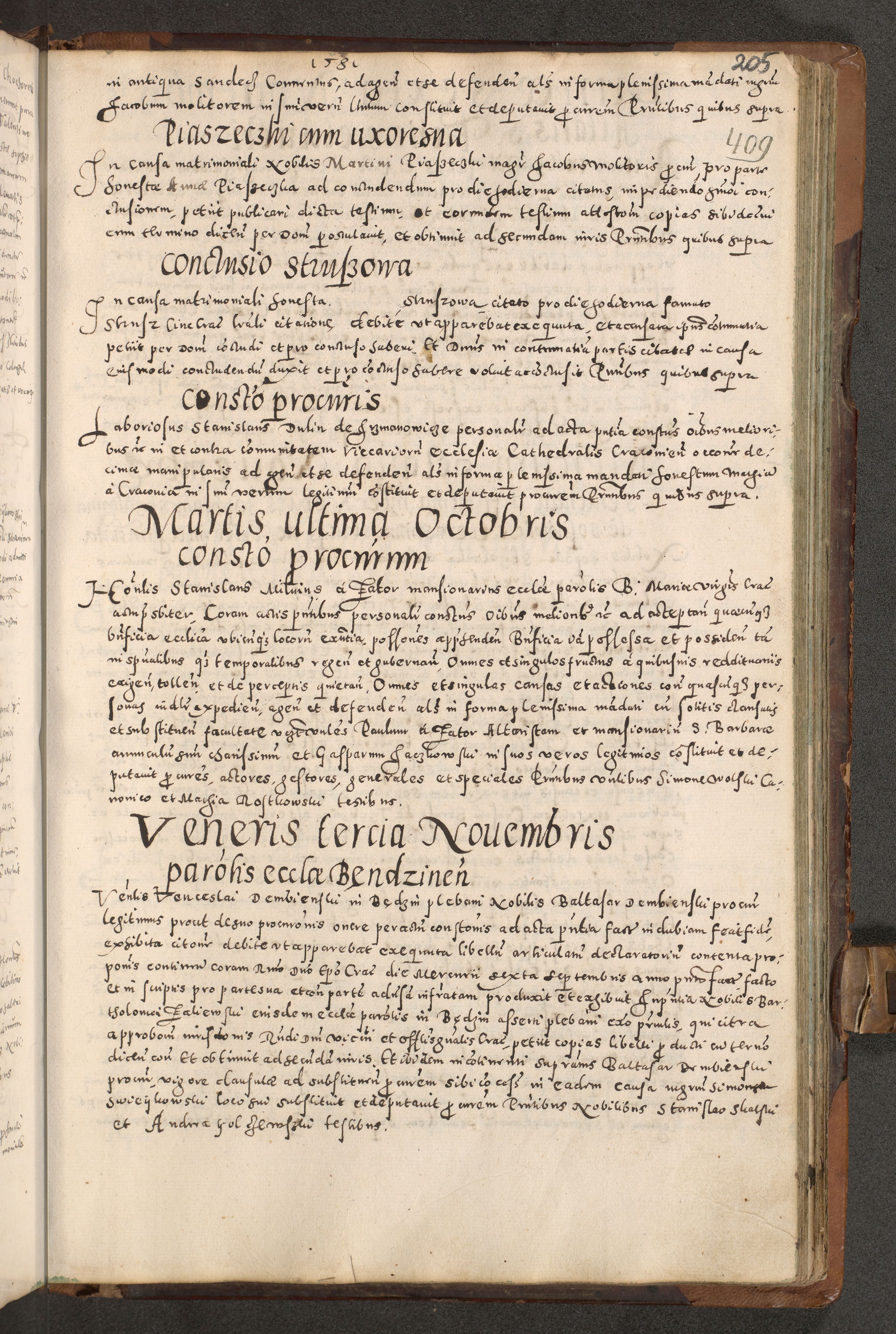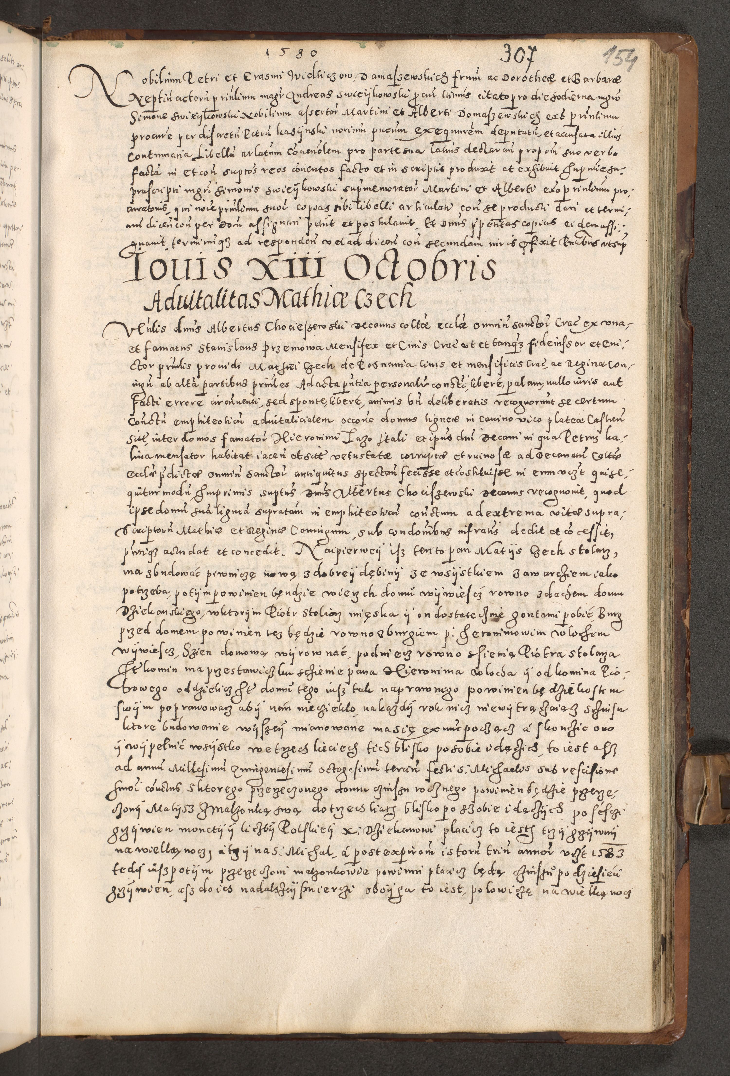 Acta actorum causarum tam diffinitivarum quam interloquutoriarum sententiarum decretorum obligationum quietatorum constuorum pro reverendum coram Reverendo Domino Alberto Nininski Custode Sandecensis Canonico et Archipresbitero Viccarioque in Spiritualibus ac Officiali Generali Cracoviensis ad Annum Domini Millesimum Qumgentesimum Septuagentesimum Nonum cuius Judictio septima Pontificat SS. nostri Domini Gregory pp. tredecimi Anno septimo inchoantur faliciter