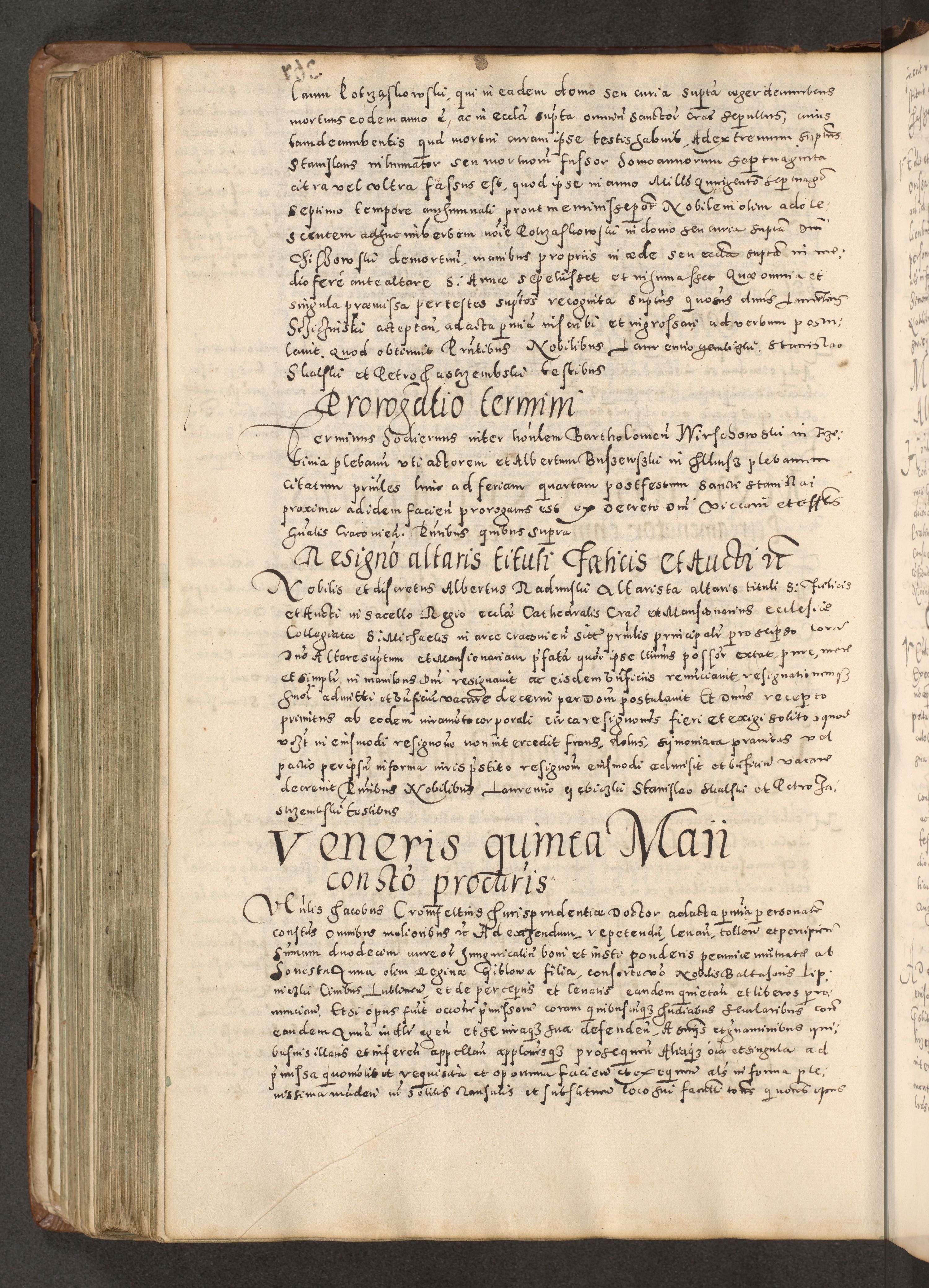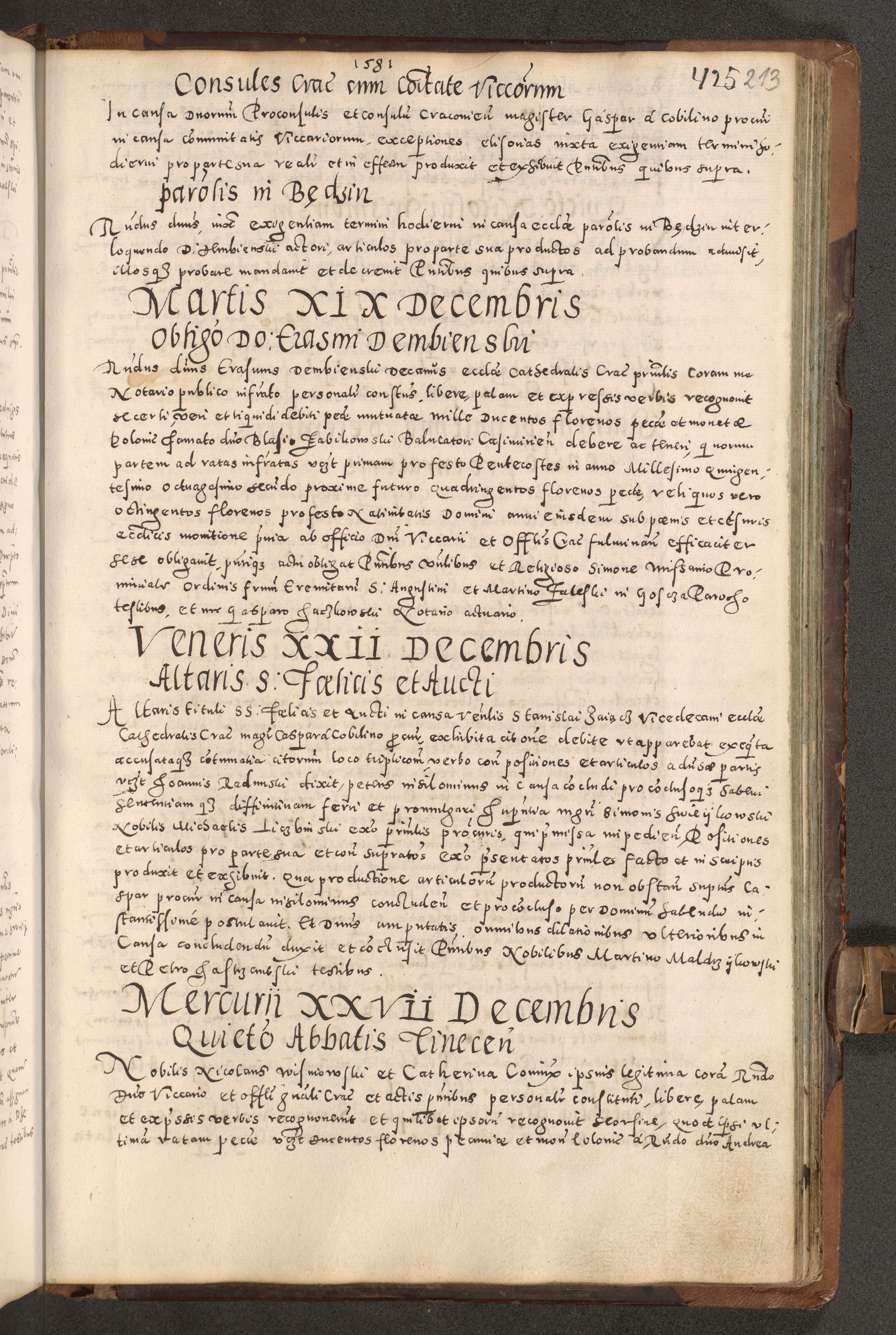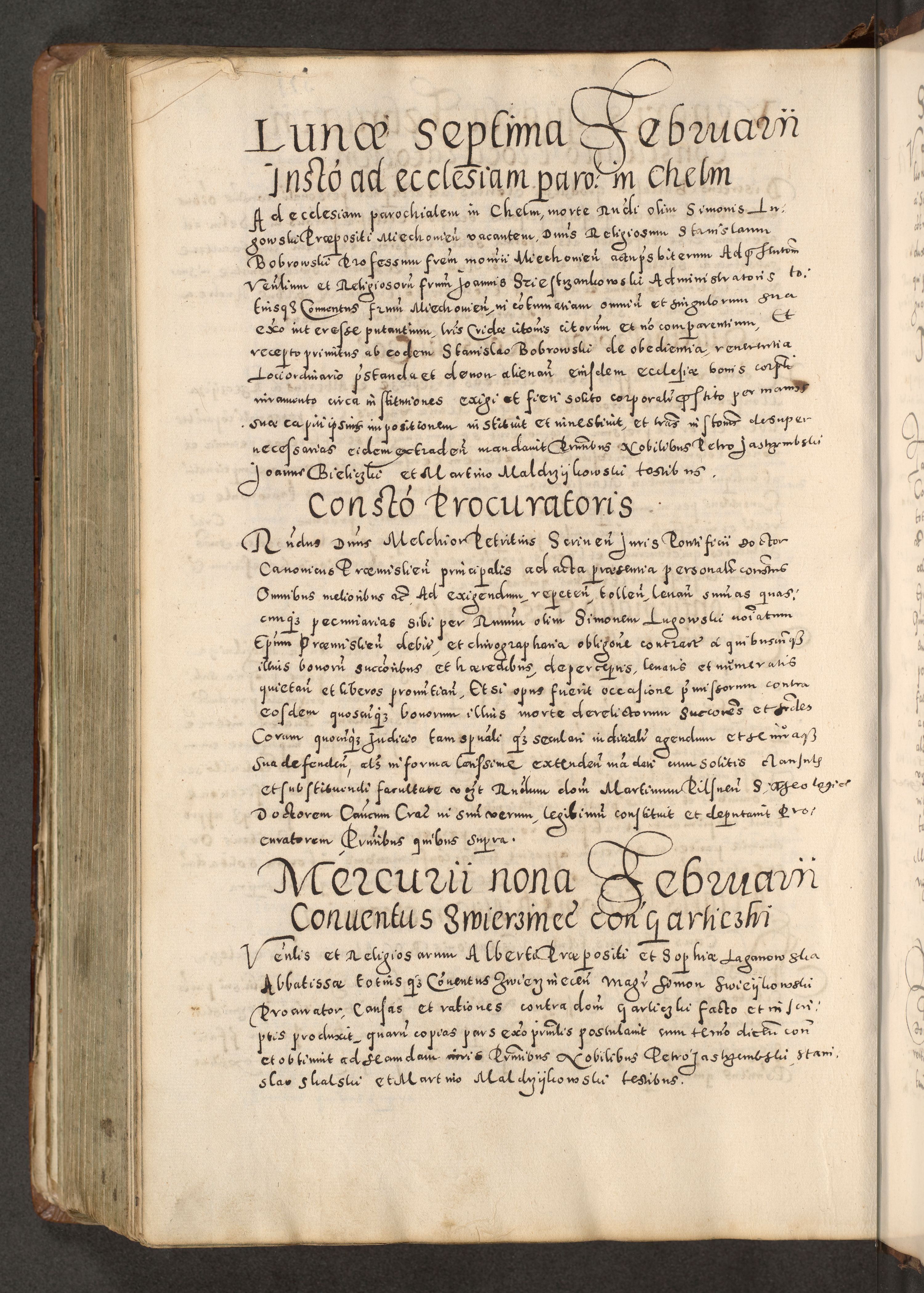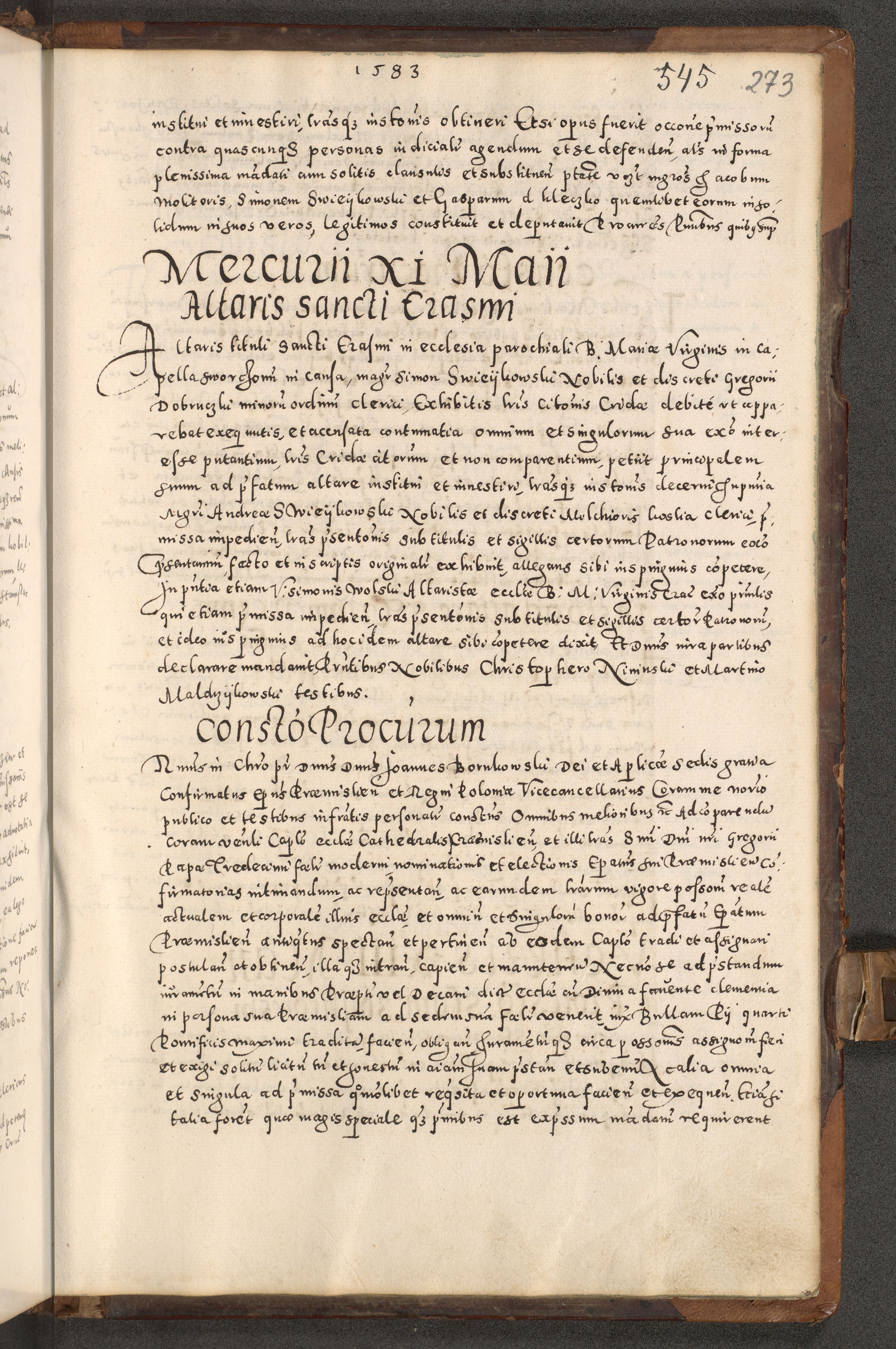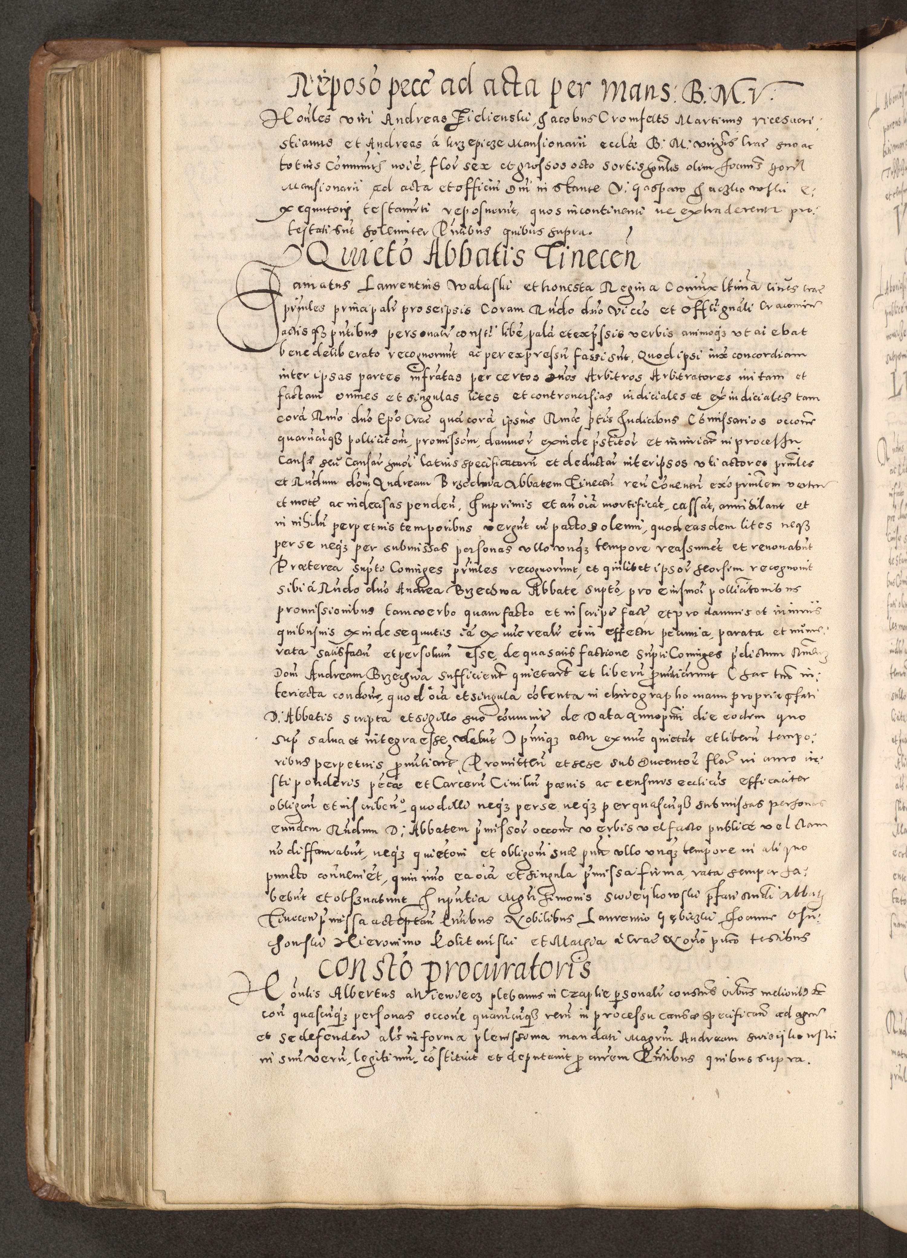 Acta actorum causarum tam diffinitivarum quam interloquutoriarum sententiarum decretorum obligationum quietatorum constuorum pro reverendum coram Reverendo Domino Alberto Nininski Custode Sandecensis Canonico et Archipresbitero Viccarioque in Spiritualibus ac Officiali Generali Cracoviensis ad Annum Domini Millesimum Qumgentesimum Septuagentesimum Nonum cuius Judictio septima Pontificat SS. nostri Domini Gregory pp. tredecimi Anno septimo inchoantur faliciter