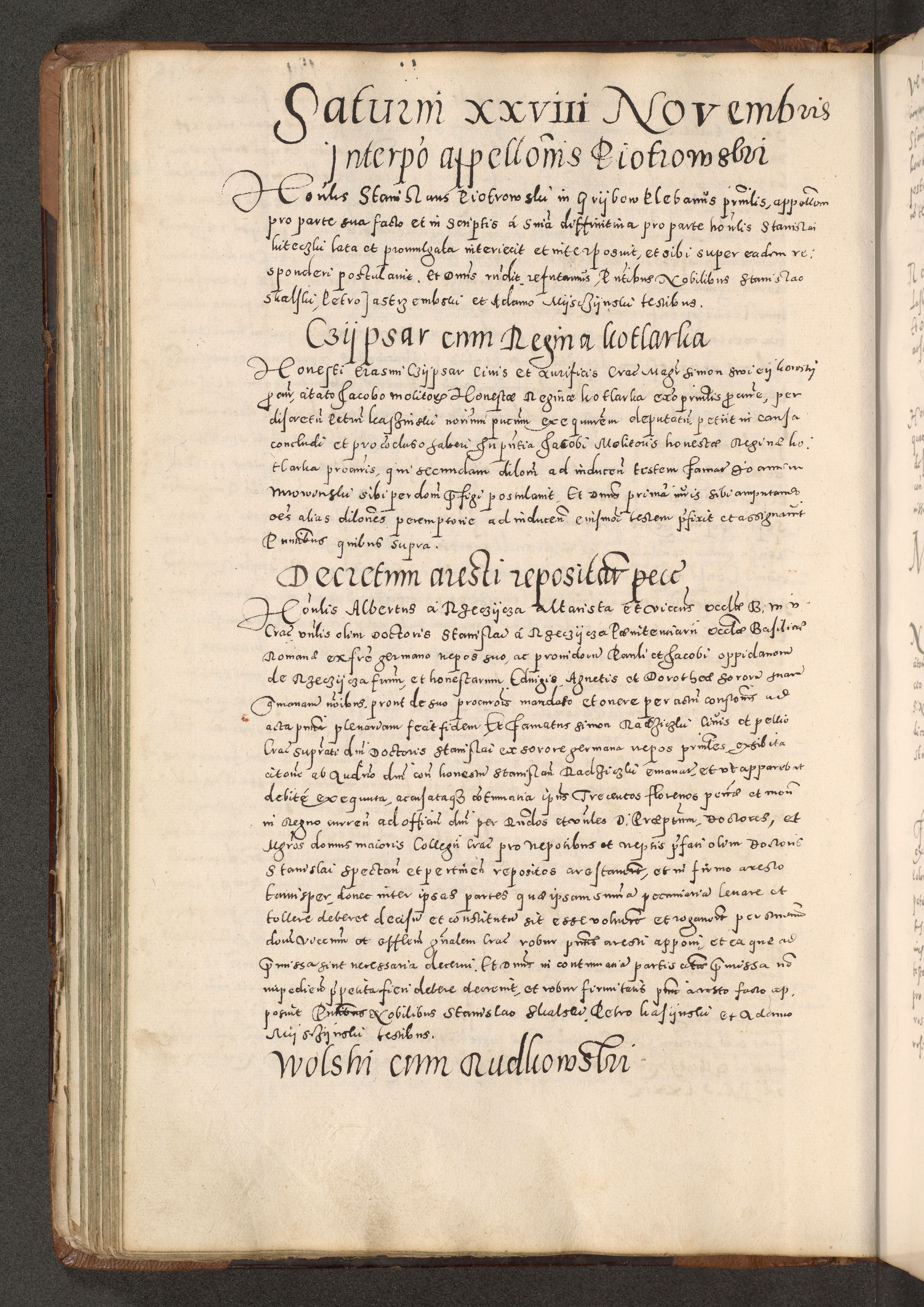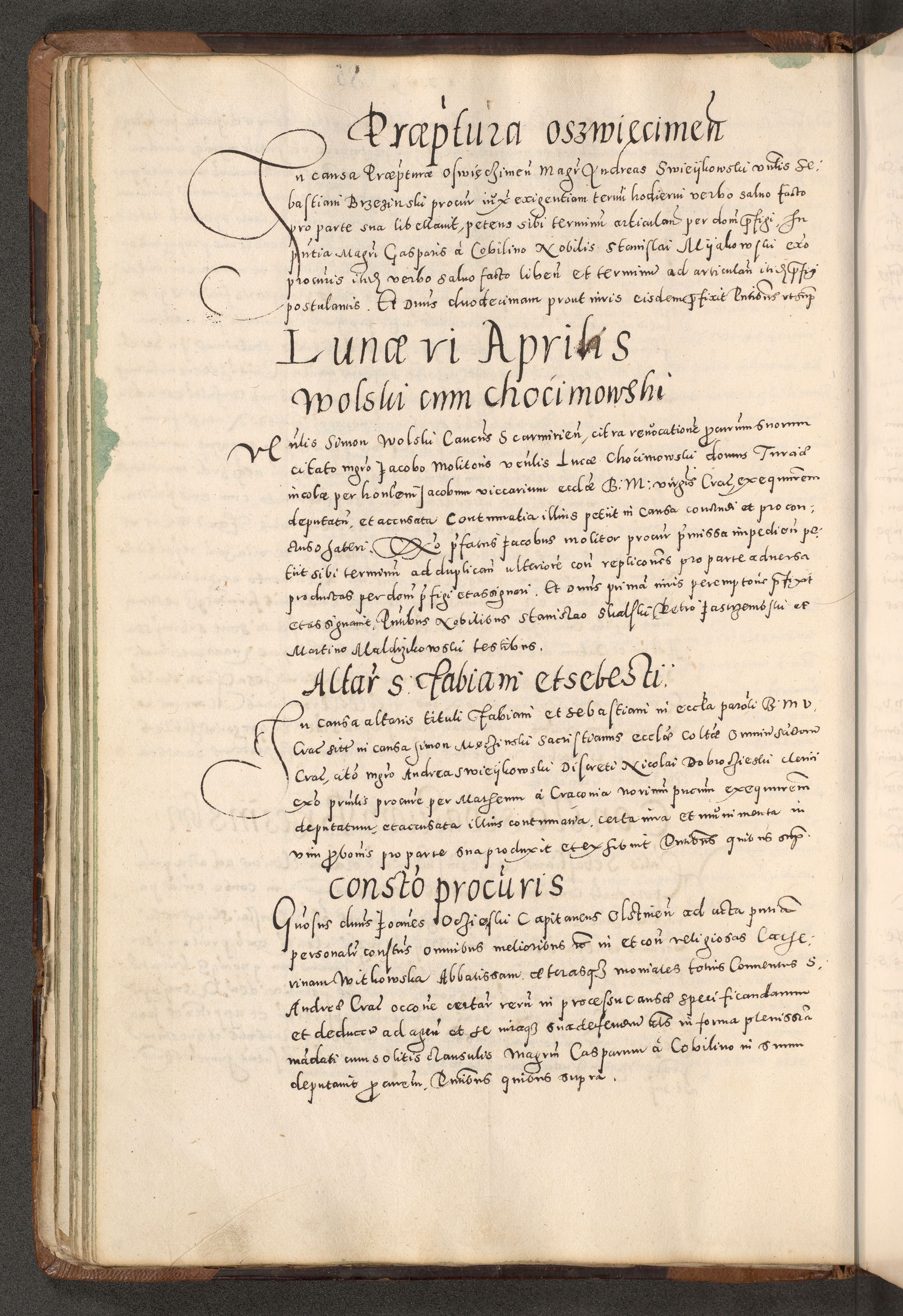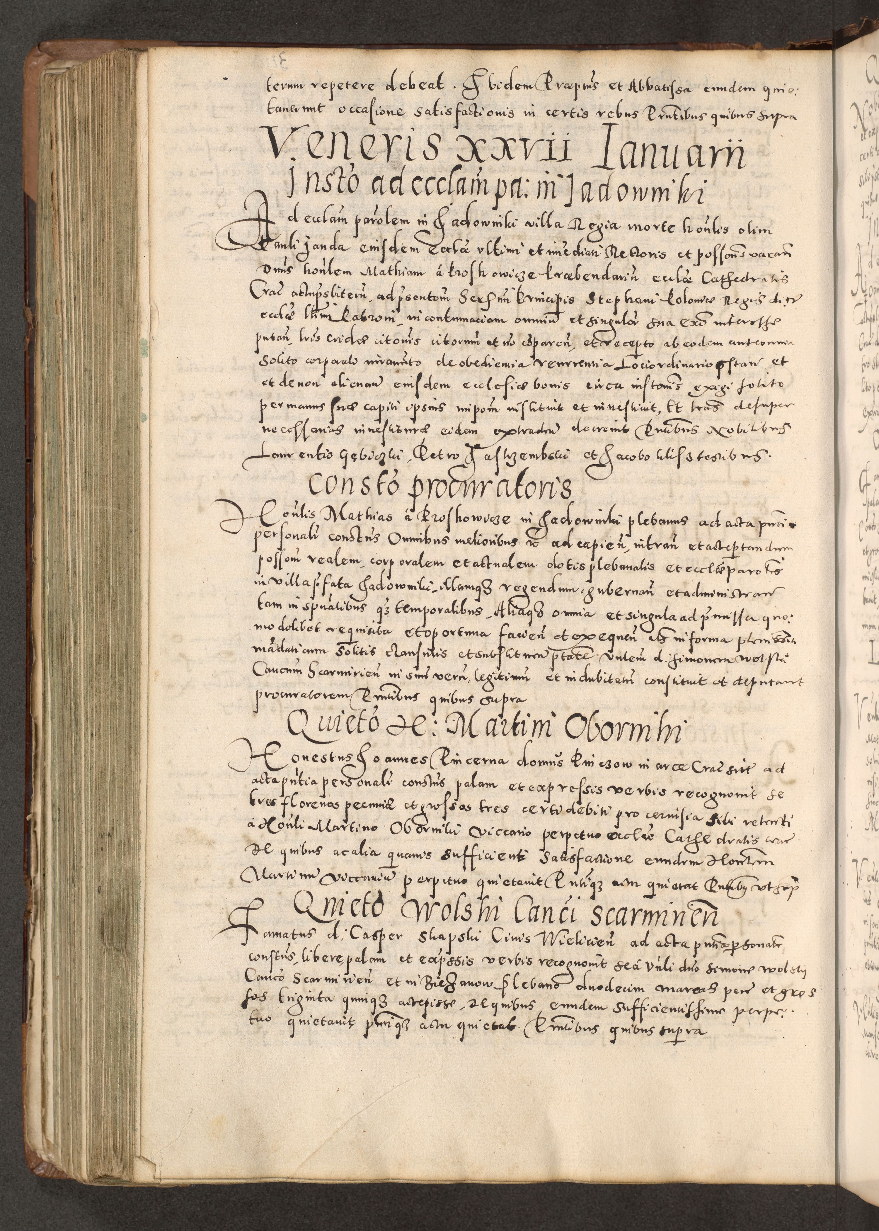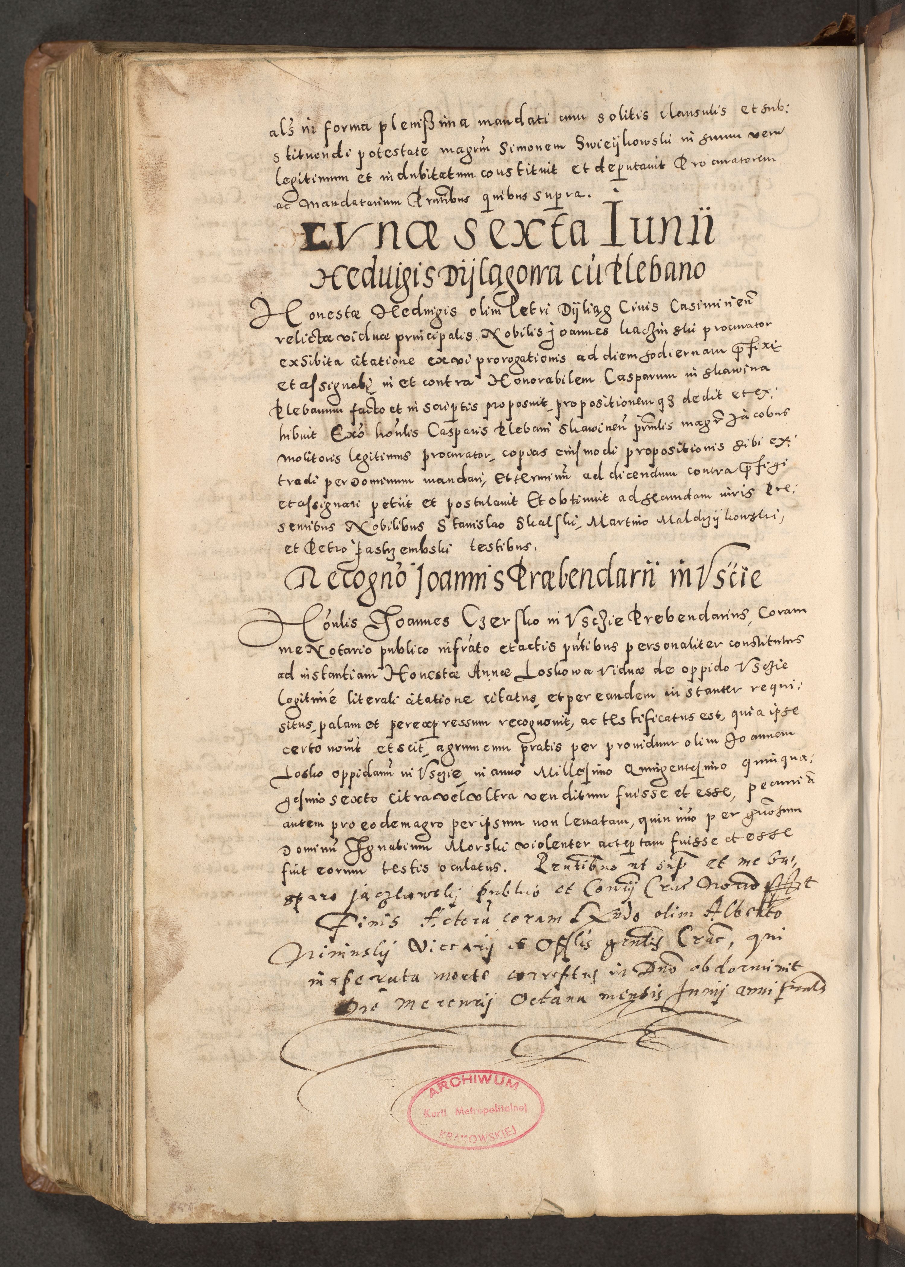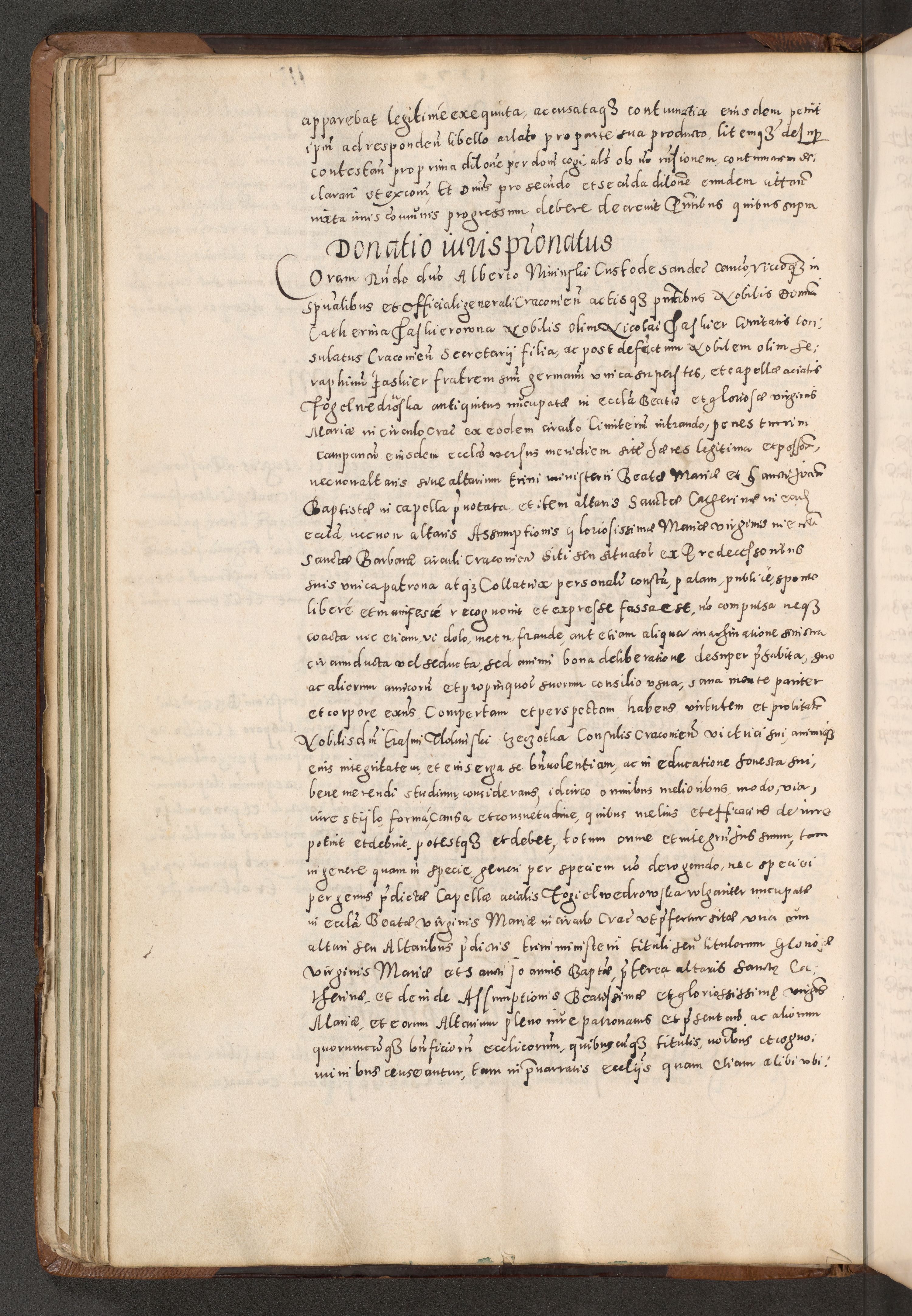 Acta actorum causarum tam diffinitivarum quam interloquutoriarum sententiarum decretorum obligationum quietatorum constuorum pro reverendum coram Reverendo Domino Alberto Nininski Custode Sandecensis Canonico et Archipresbitero Viccarioque in Spiritualibus ac Officiali Generali Cracoviensis ad Annum Domini Millesimum Qumgentesimum Septuagentesimum Nonum cuius Judictio septima Pontificat SS. nostri Domini Gregory pp. tredecimi Anno septimo inchoantur faliciter