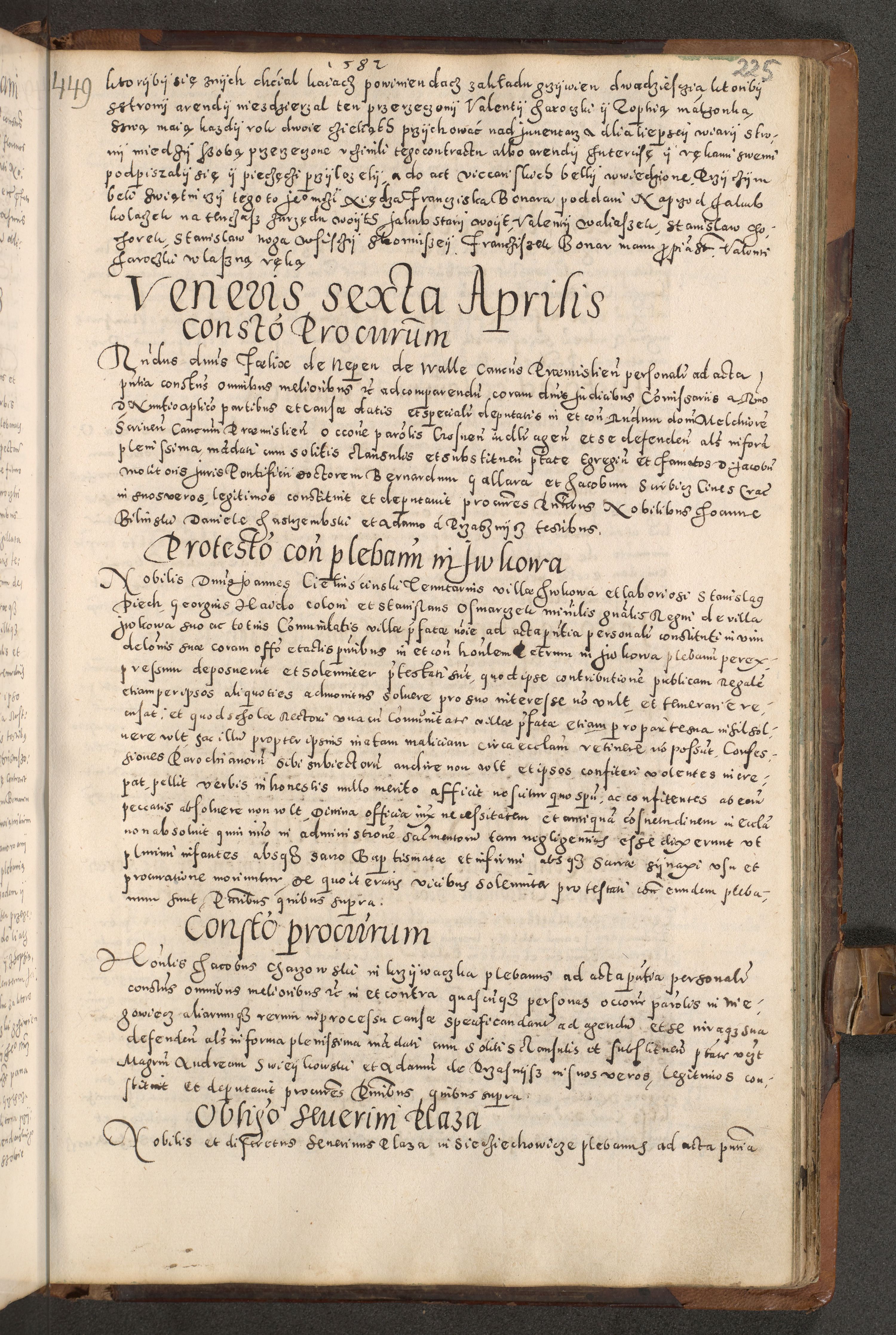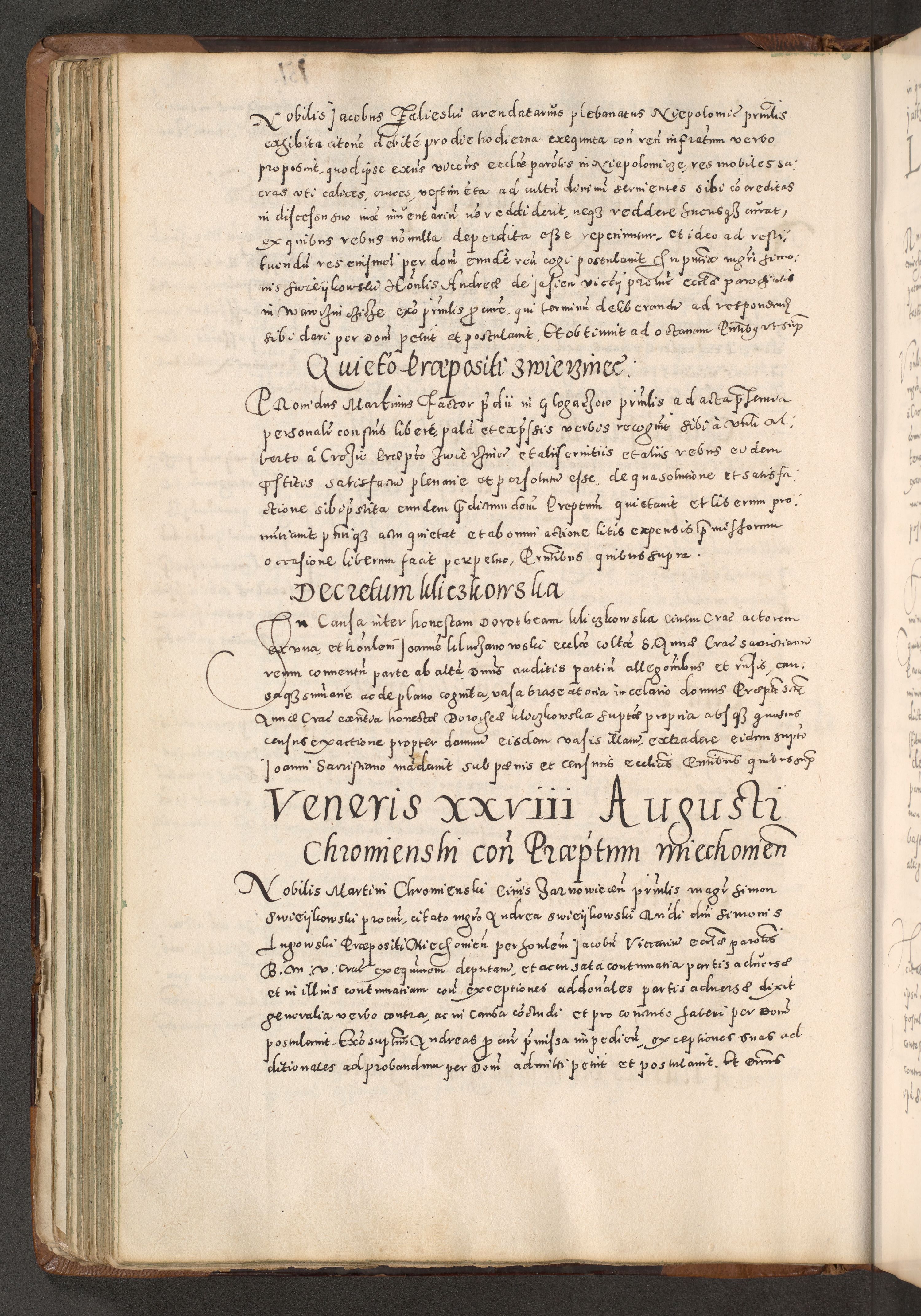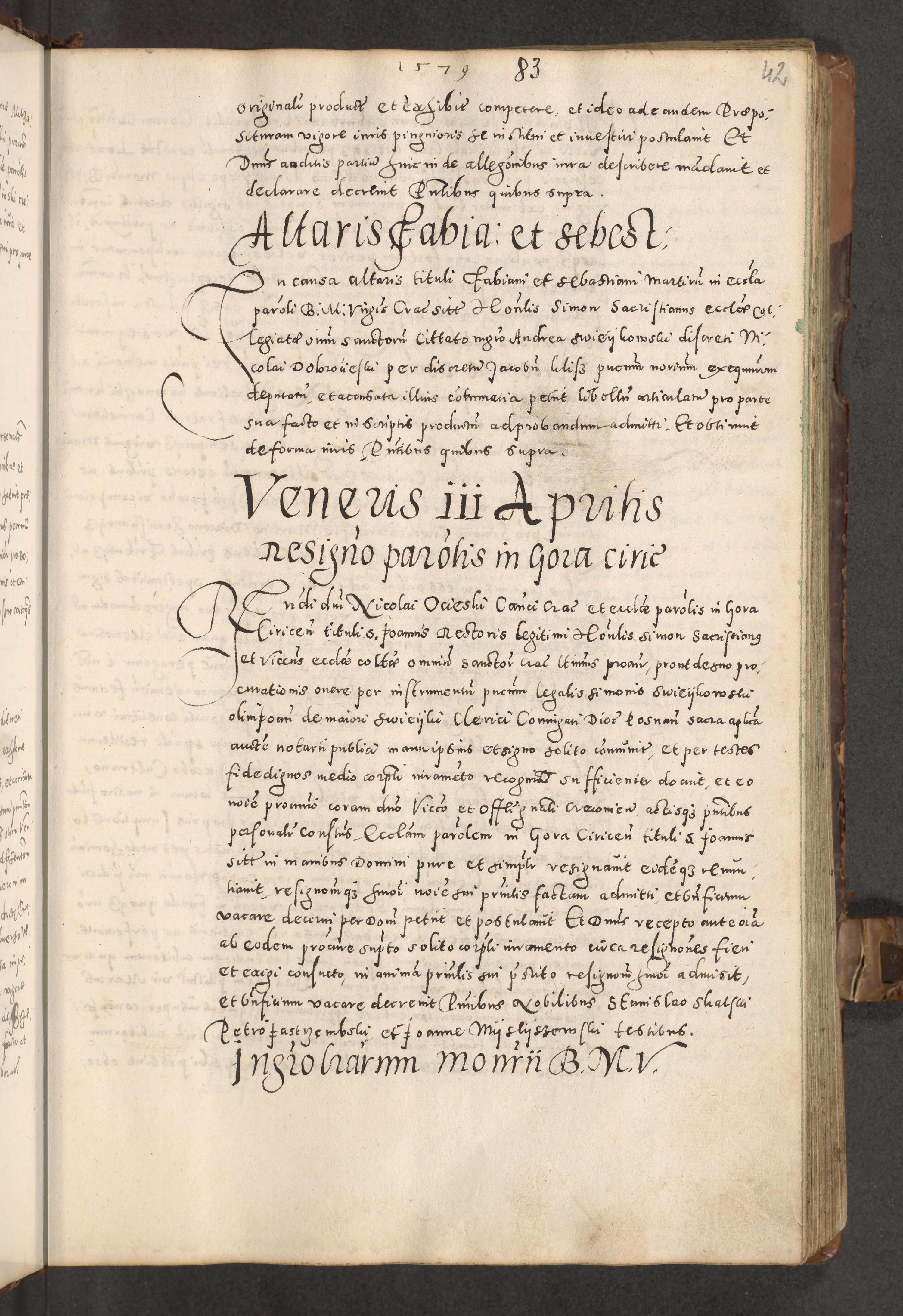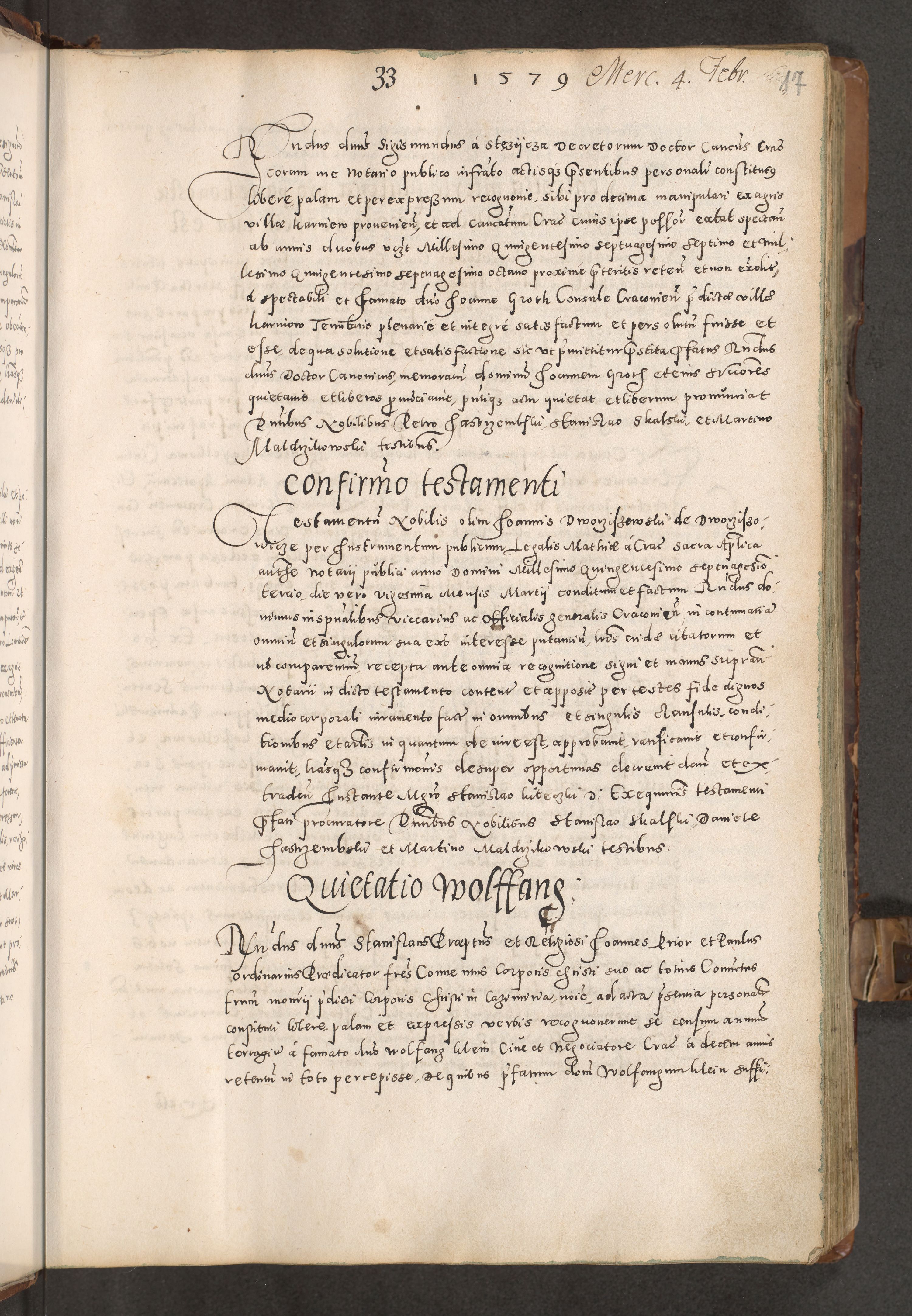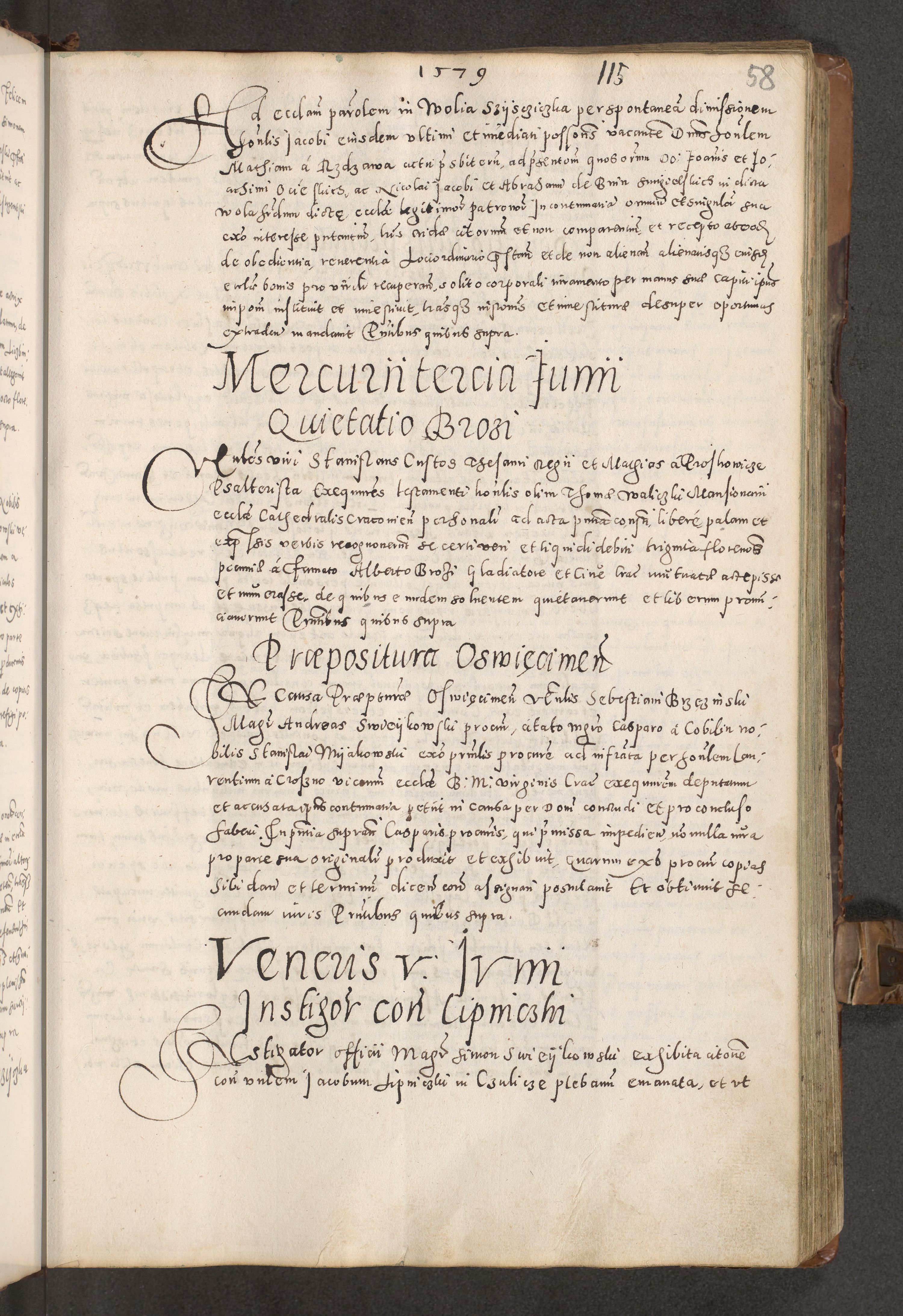 Acta actorum causarum tam diffinitivarum quam interloquutoriarum sententiarum decretorum obligationum quietatorum constuorum pro reverendum coram Reverendo Domino Alberto Nininski Custode Sandecensis Canonico et Archipresbitero Viccarioque in Spiritualibus ac Officiali Generali Cracoviensis ad Annum Domini Millesimum Qumgentesimum Septuagentesimum Nonum cuius Judictio septima Pontificat SS. nostri Domini Gregory pp. tredecimi Anno septimo inchoantur faliciter