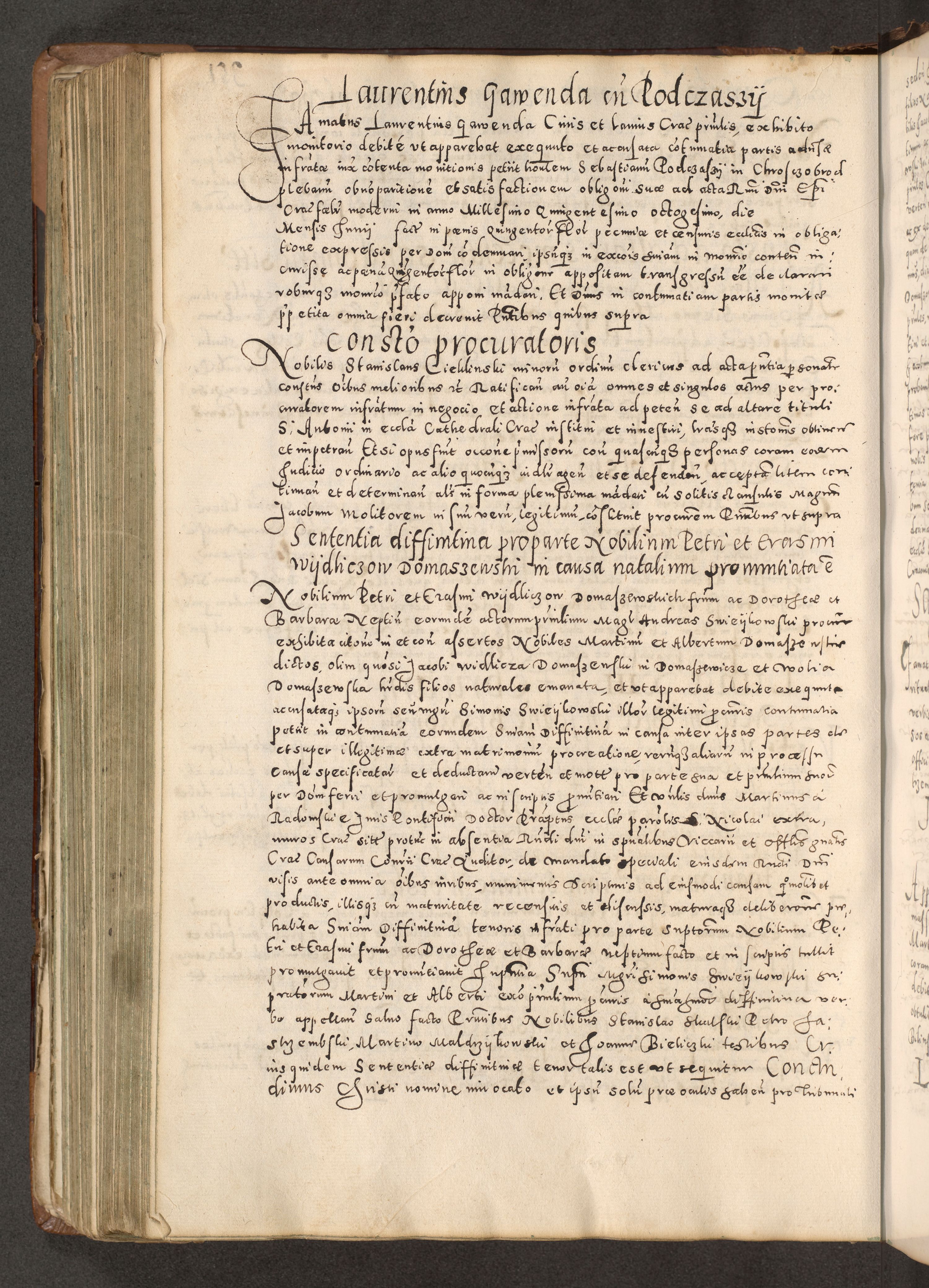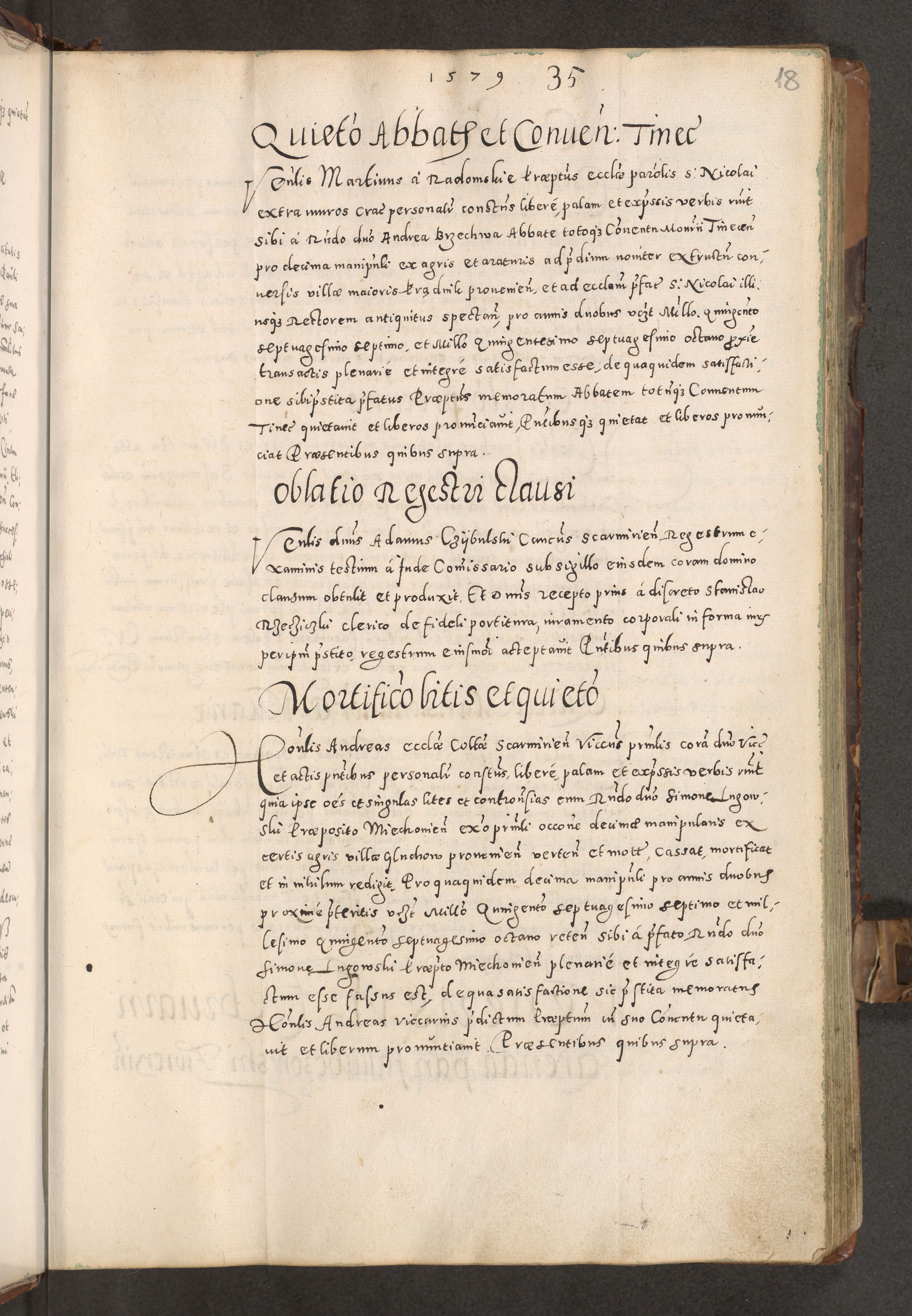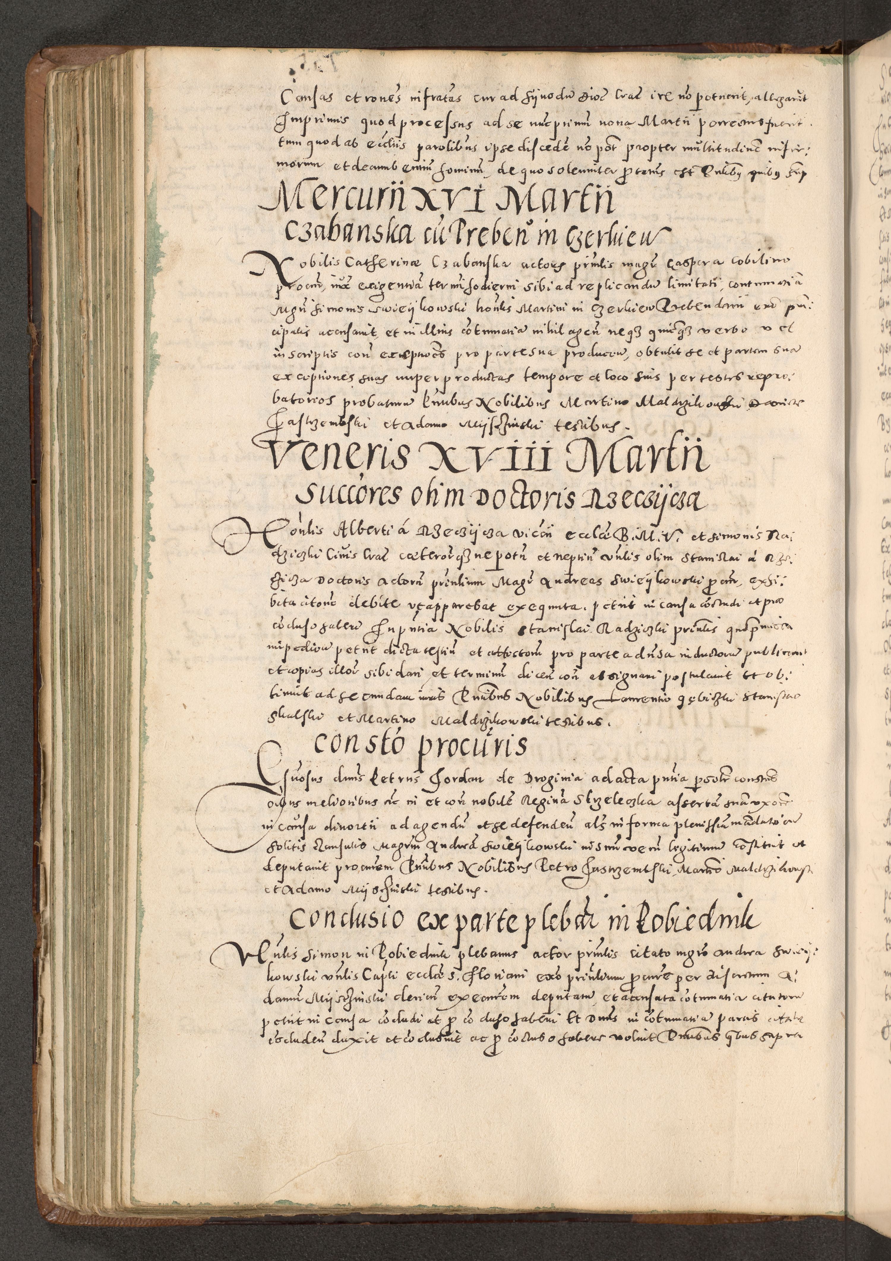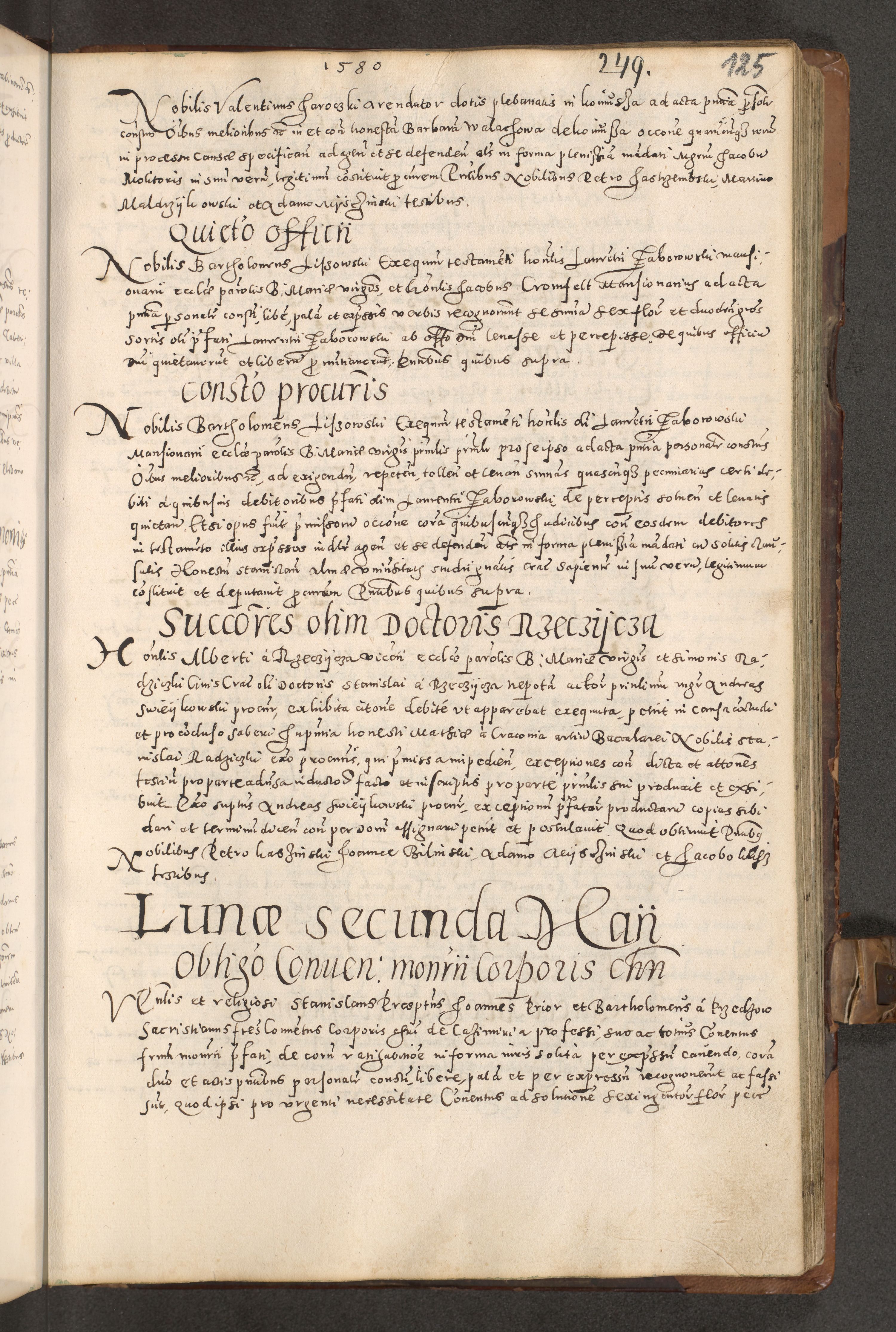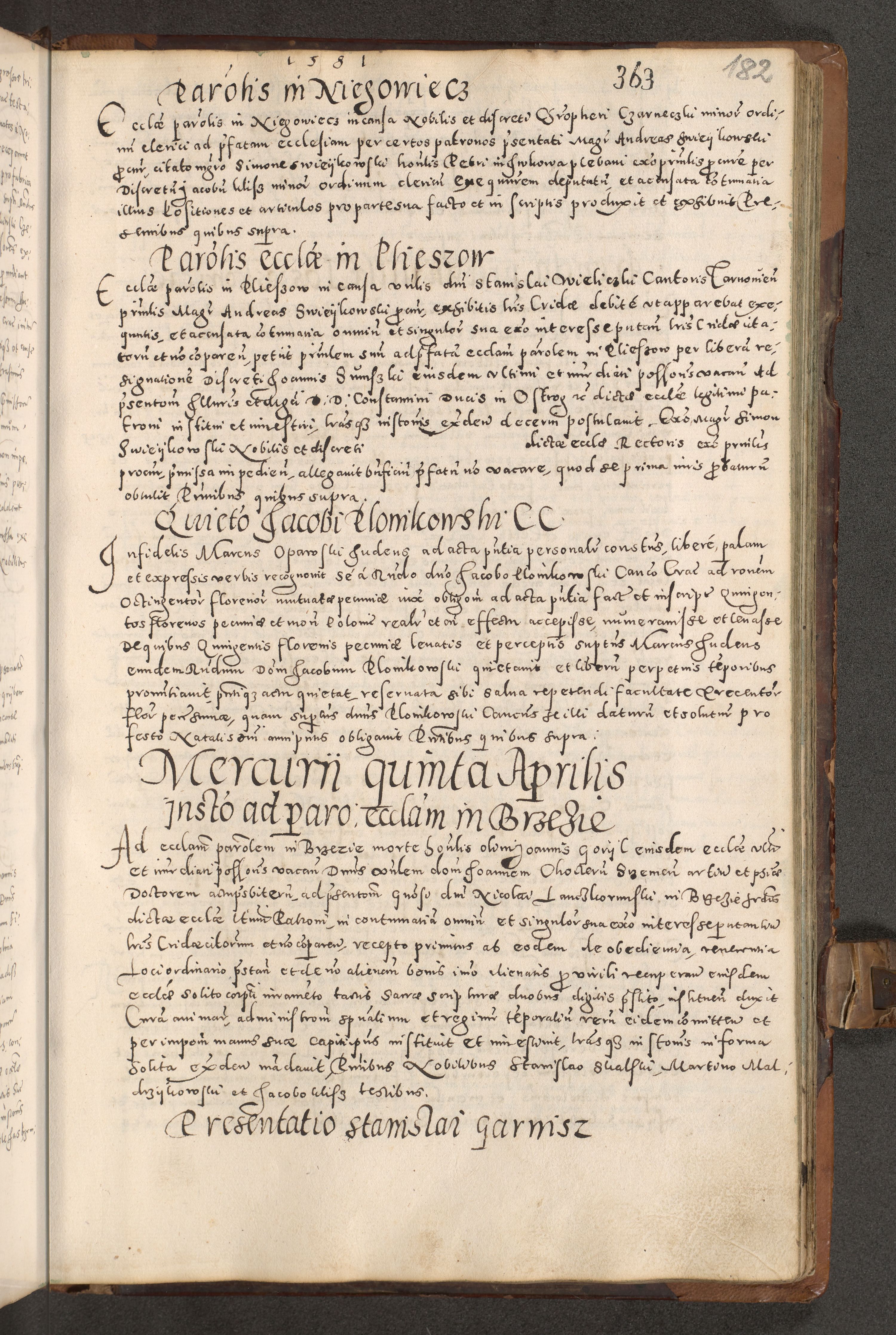 Acta actorum causarum tam diffinitivarum quam interloquutoriarum sententiarum decretorum obligationum quietatorum constuorum pro reverendum coram Reverendo Domino Alberto Nininski Custode Sandecensis Canonico et Archipresbitero Viccarioque in Spiritualibus ac Officiali Generali Cracoviensis ad Annum Domini Millesimum Qumgentesimum Septuagentesimum Nonum cuius Judictio septima Pontificat SS. nostri Domini Gregory pp. tredecimi Anno septimo inchoantur faliciter