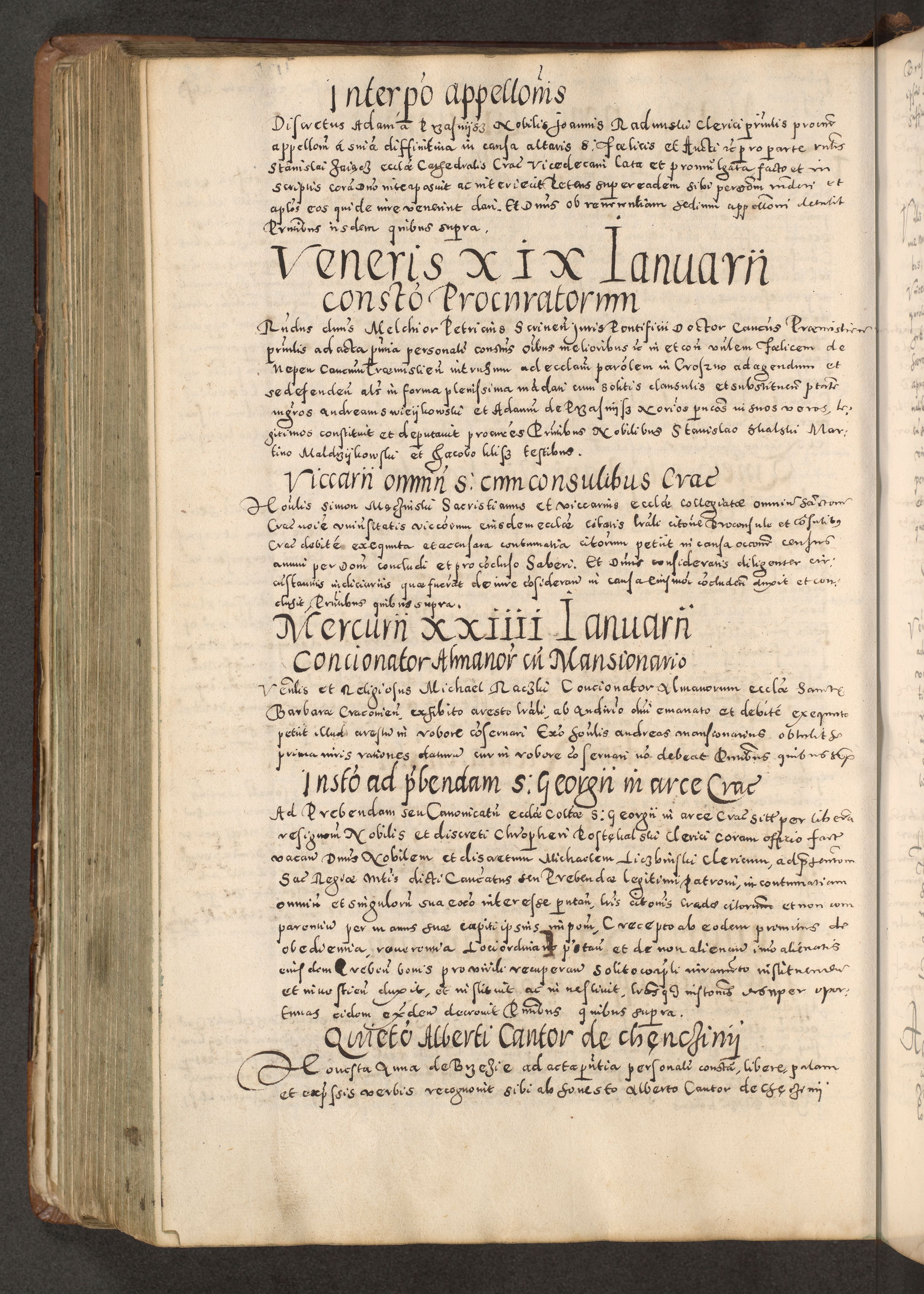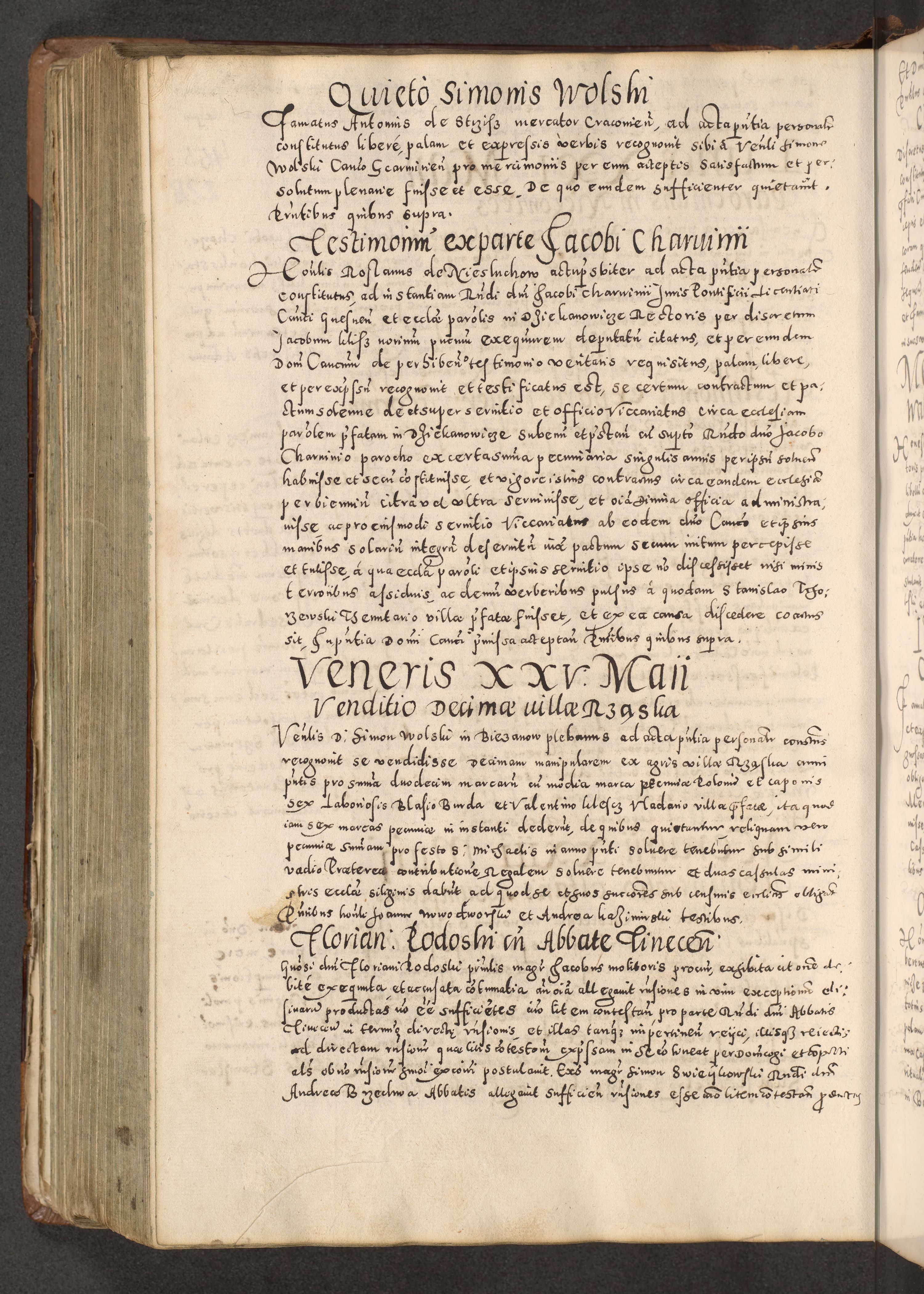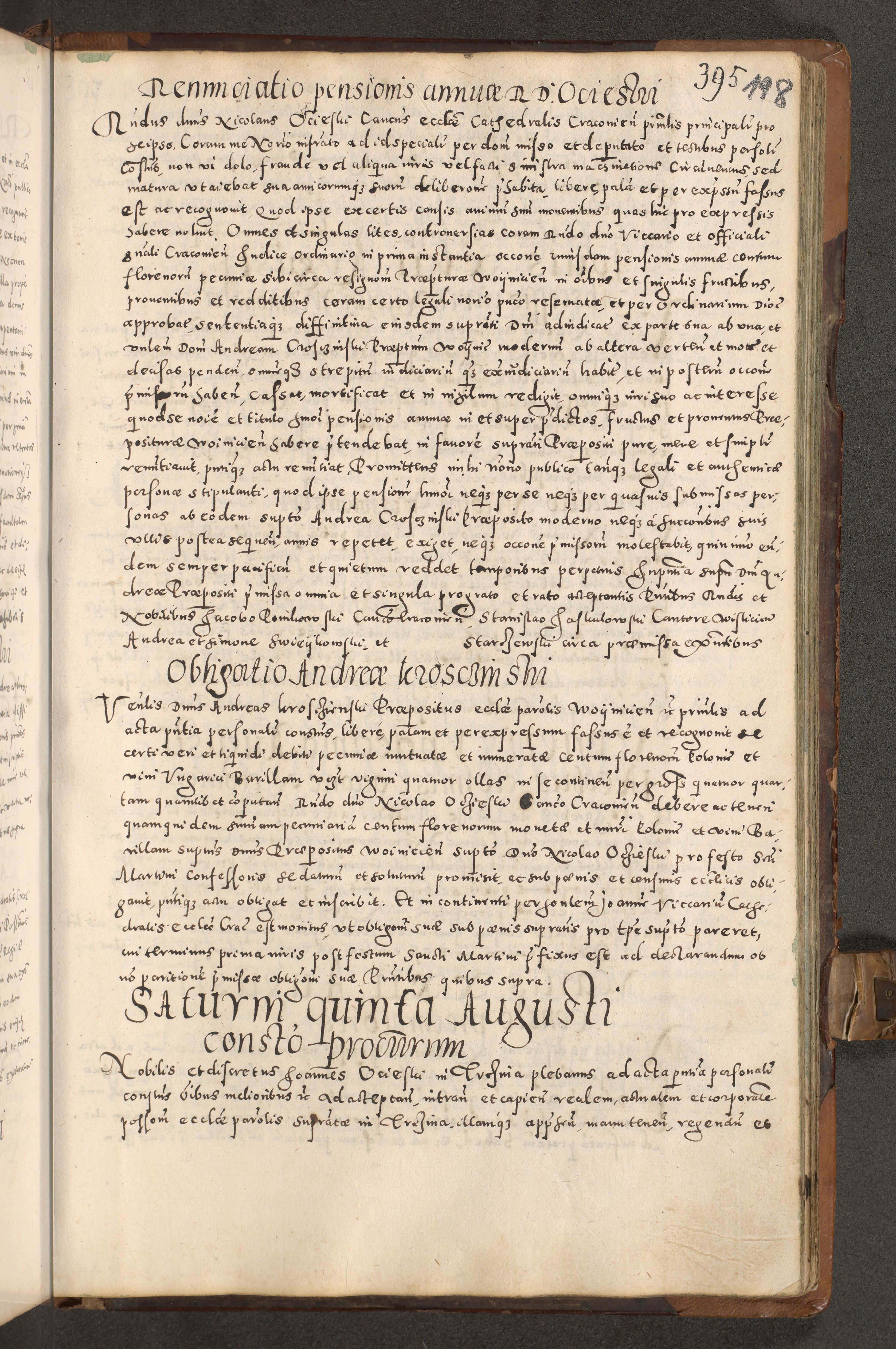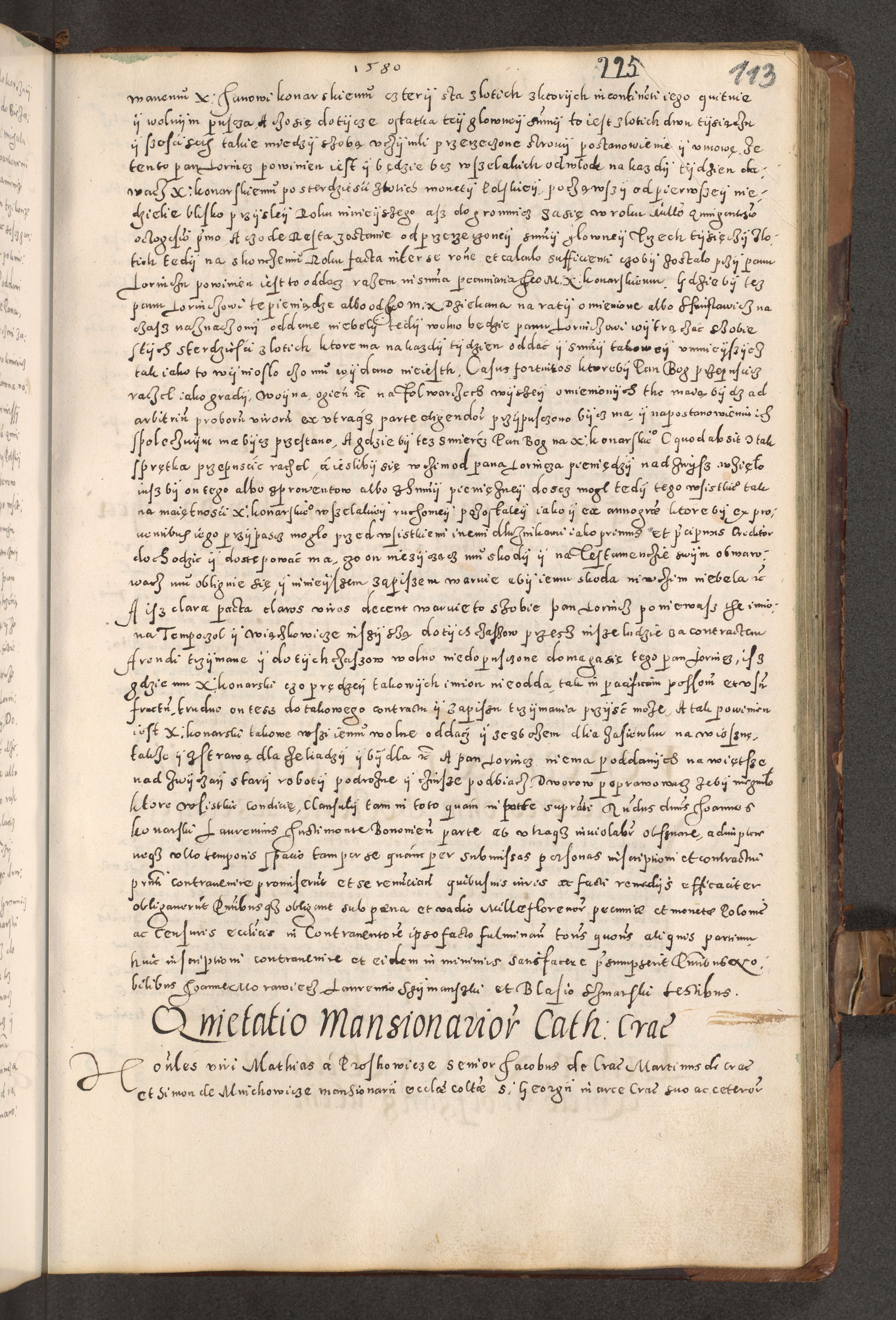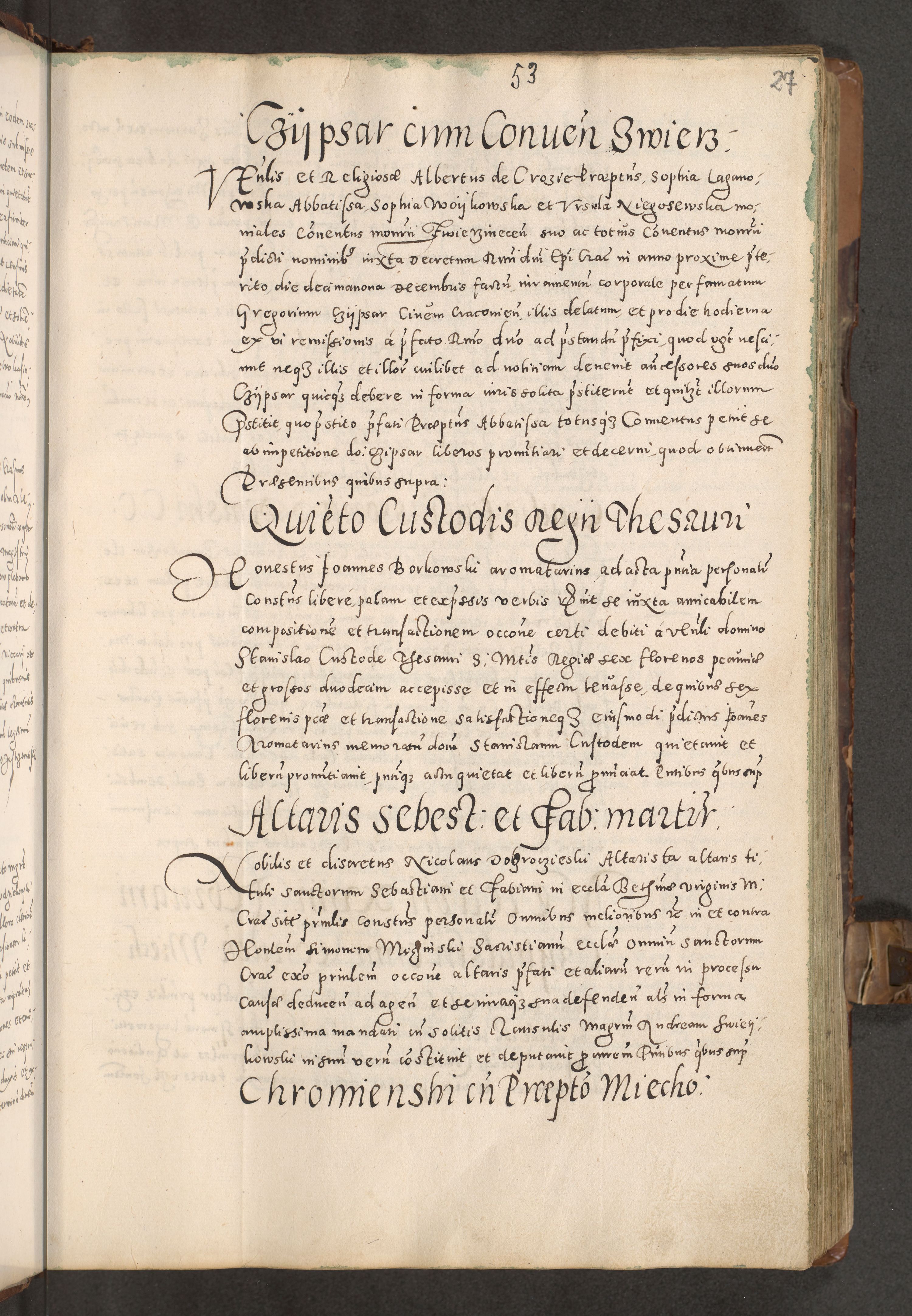 Acta actorum causarum tam diffinitivarum quam interloquutoriarum sententiarum decretorum obligationum quietatorum constuorum pro reverendum coram Reverendo Domino Alberto Nininski Custode Sandecensis Canonico et Archipresbitero Viccarioque in Spiritualibus ac Officiali Generali Cracoviensis ad Annum Domini Millesimum Qumgentesimum Septuagentesimum Nonum cuius Judictio septima Pontificat SS. nostri Domini Gregory pp. tredecimi Anno septimo inchoantur faliciter