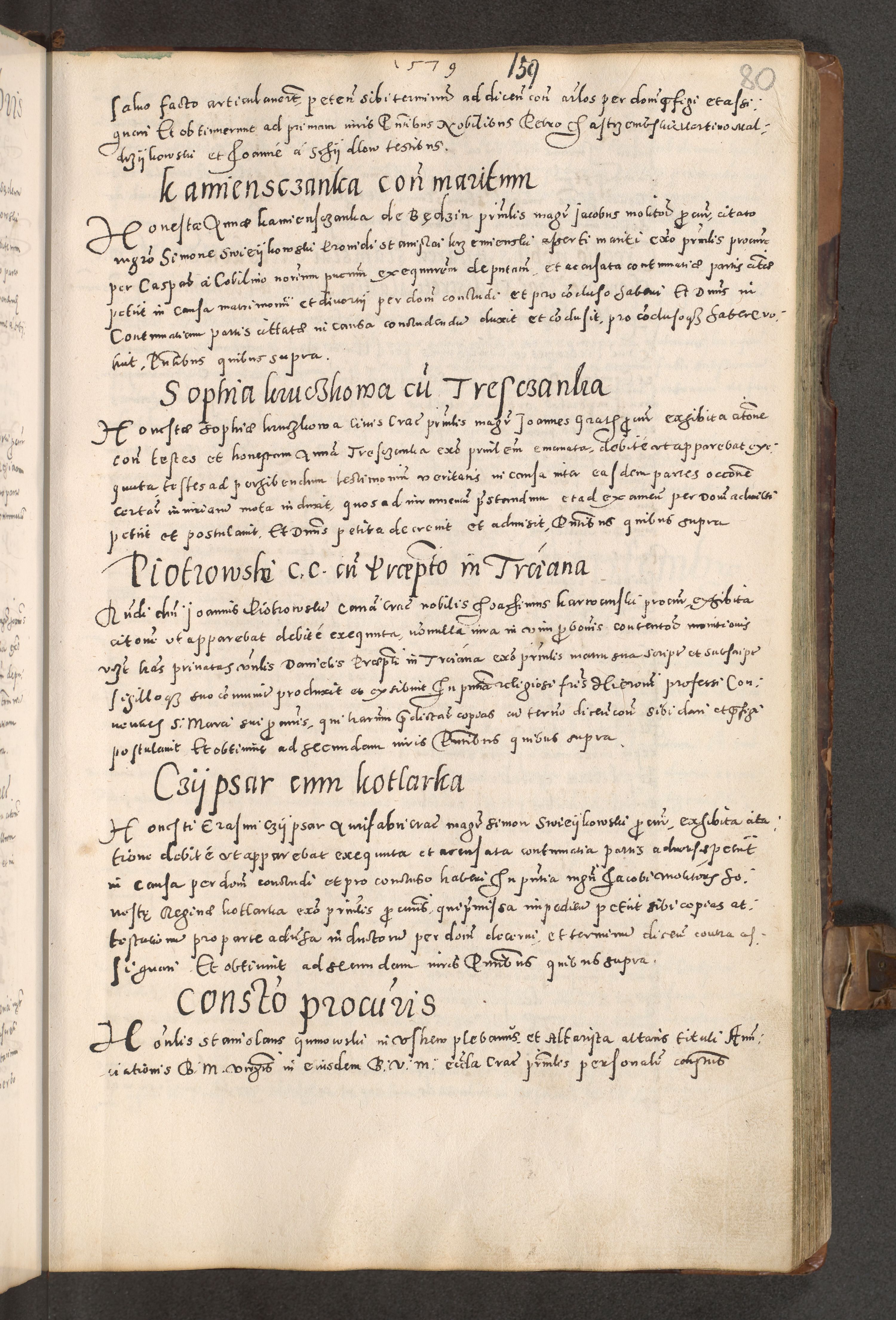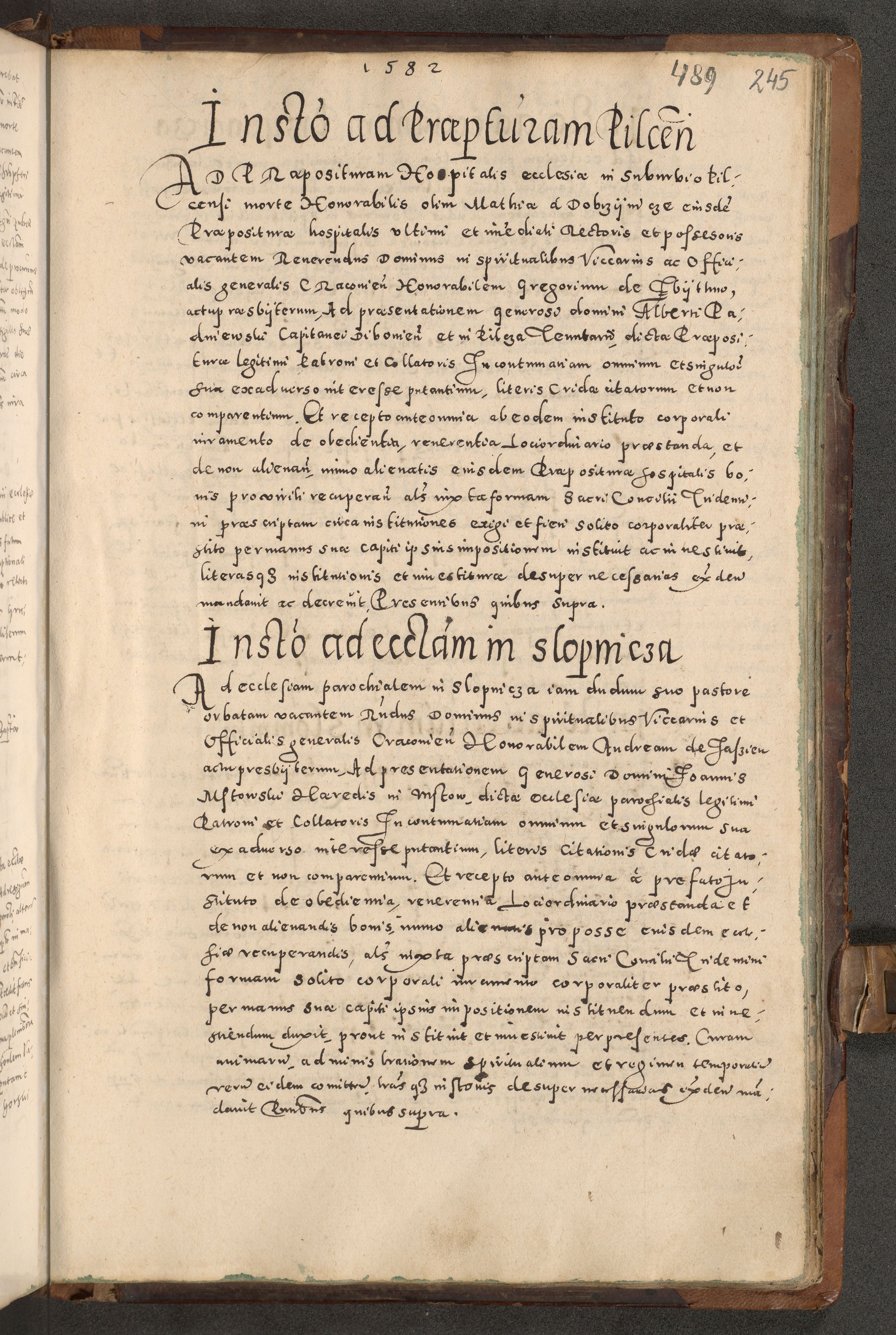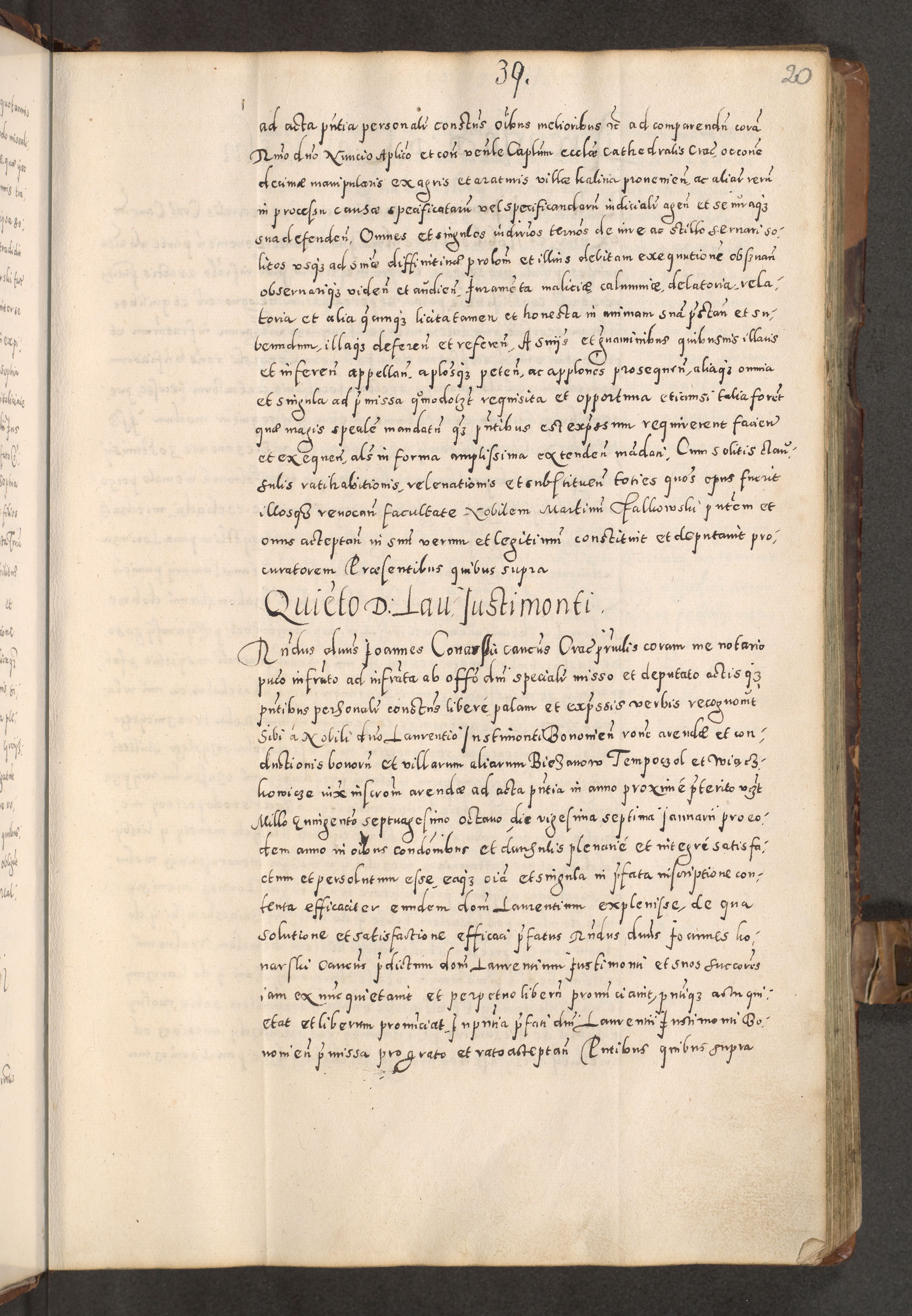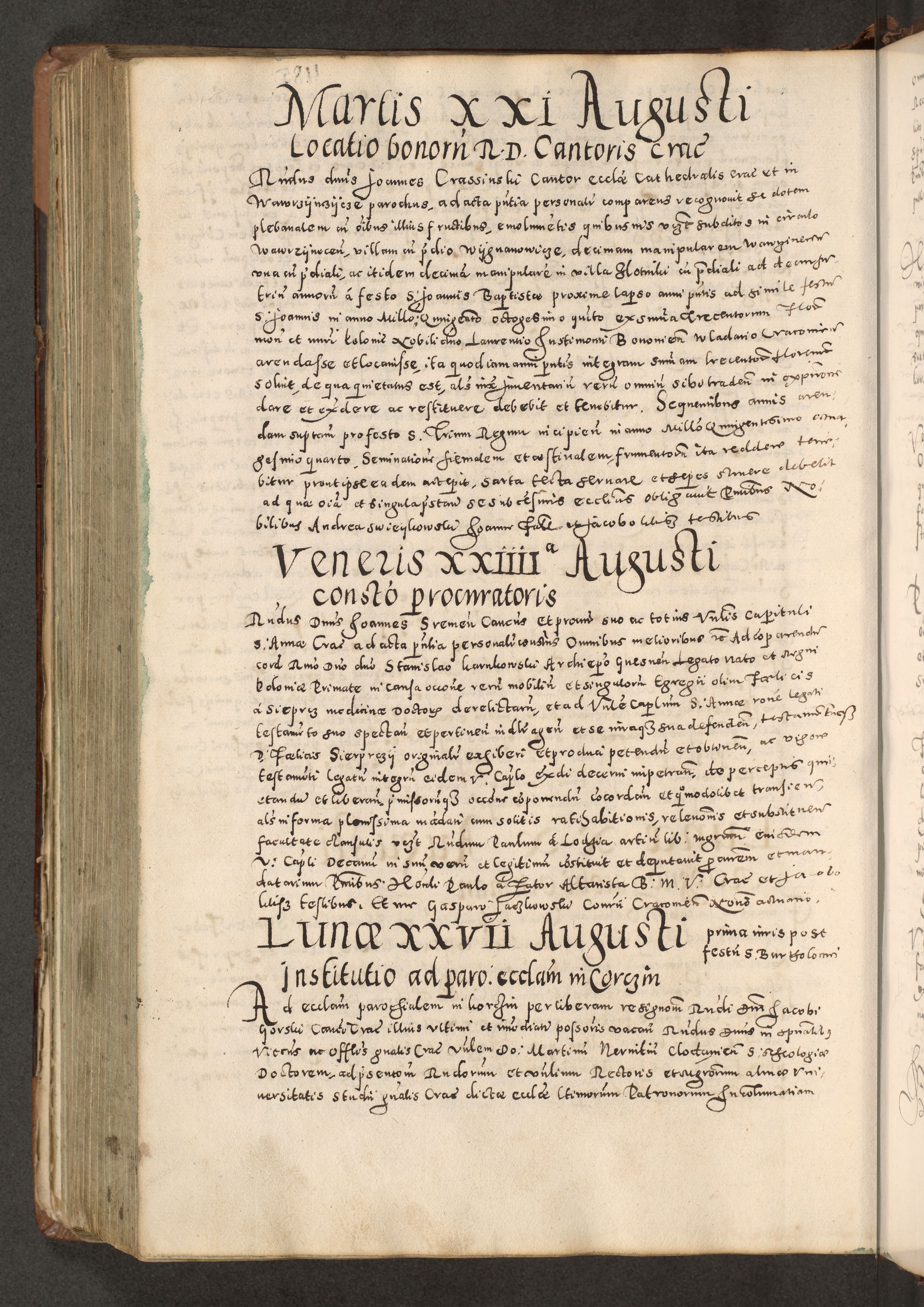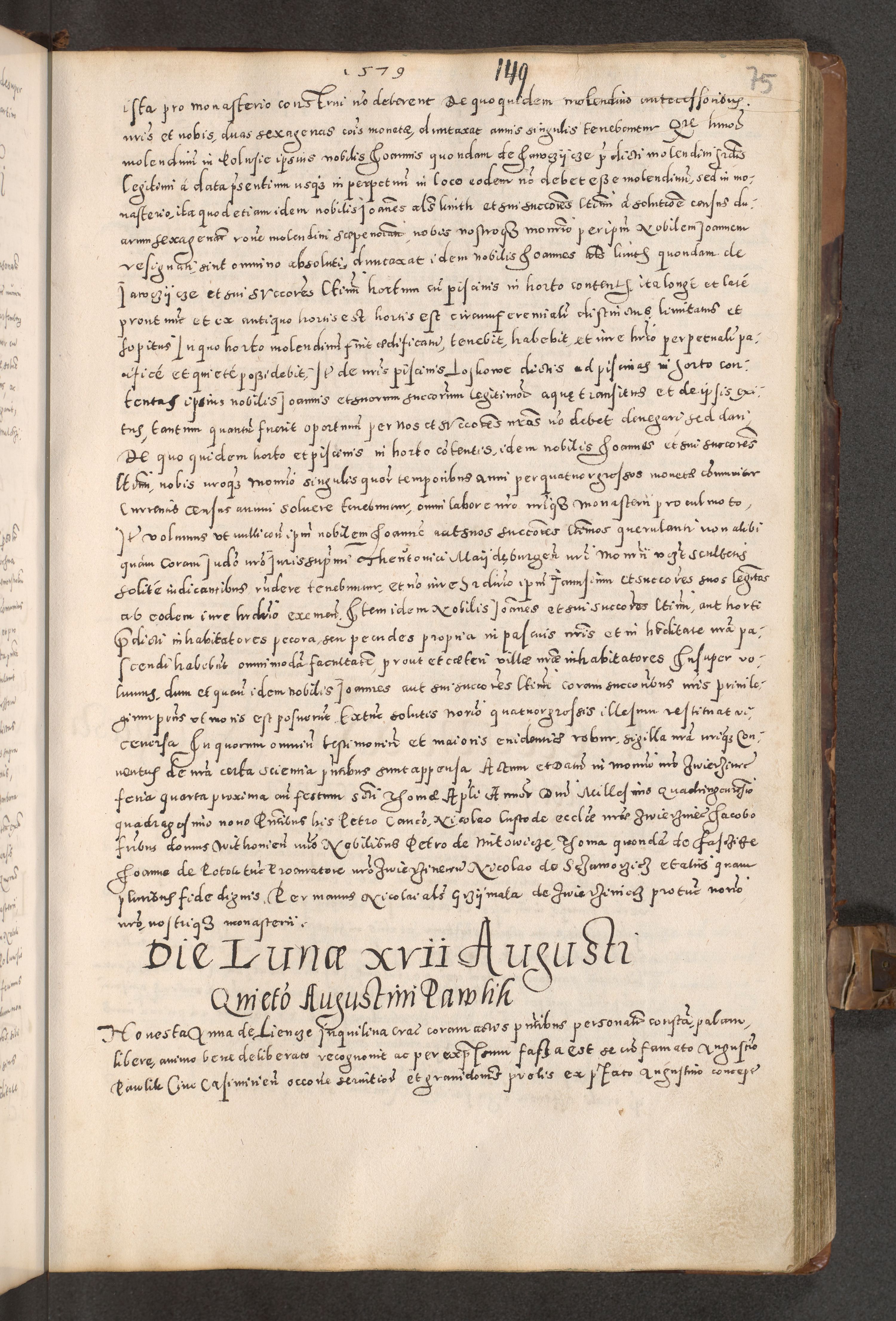 Acta actorum causarum tam diffinitivarum quam interloquutoriarum sententiarum decretorum obligationum quietatorum constuorum pro reverendum coram Reverendo Domino Alberto Nininski Custode Sandecensis Canonico et Archipresbitero Viccarioque in Spiritualibus ac Officiali Generali Cracoviensis ad Annum Domini Millesimum Qumgentesimum Septuagentesimum Nonum cuius Judictio septima Pontificat SS. nostri Domini Gregory pp. tredecimi Anno septimo inchoantur faliciter