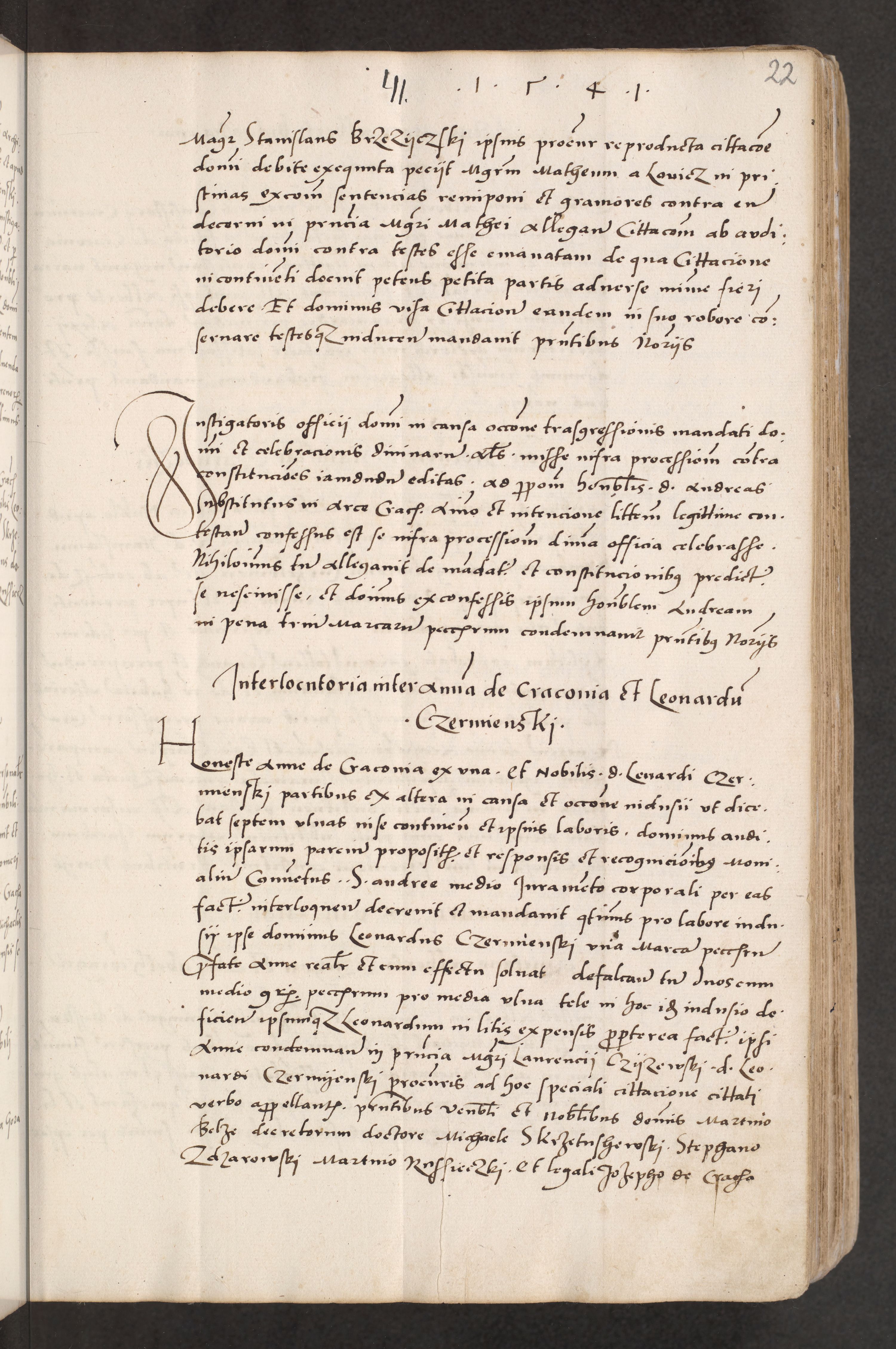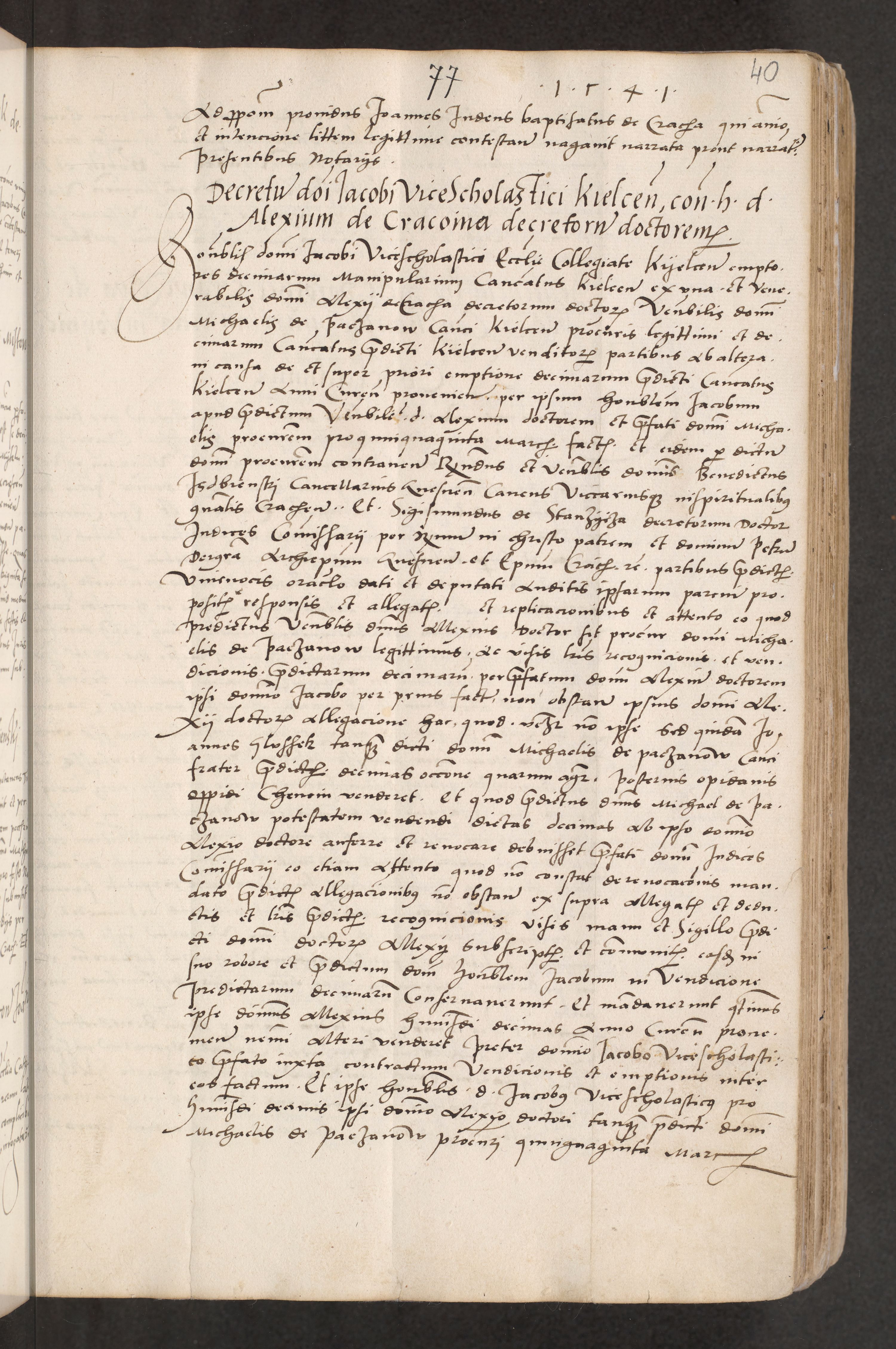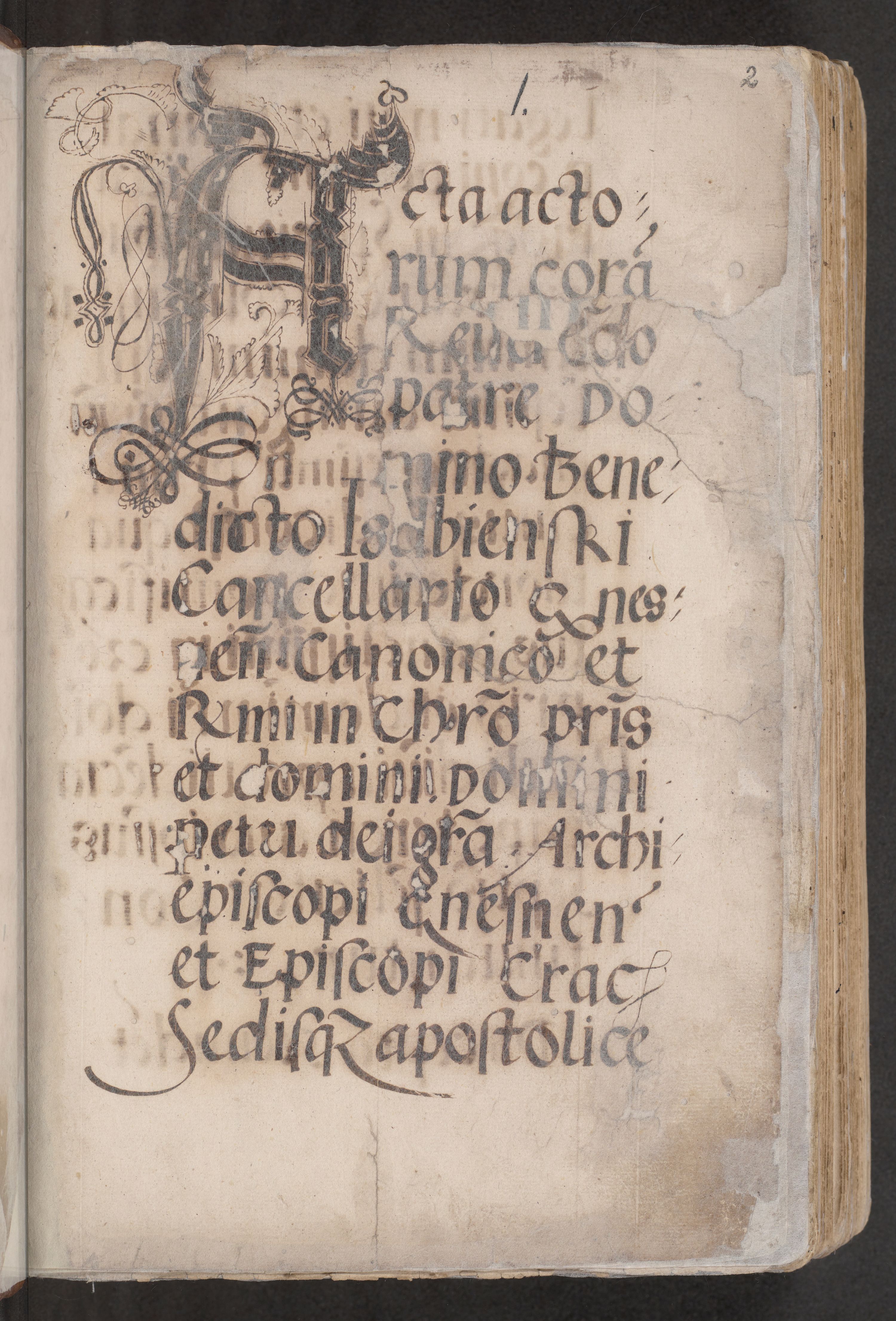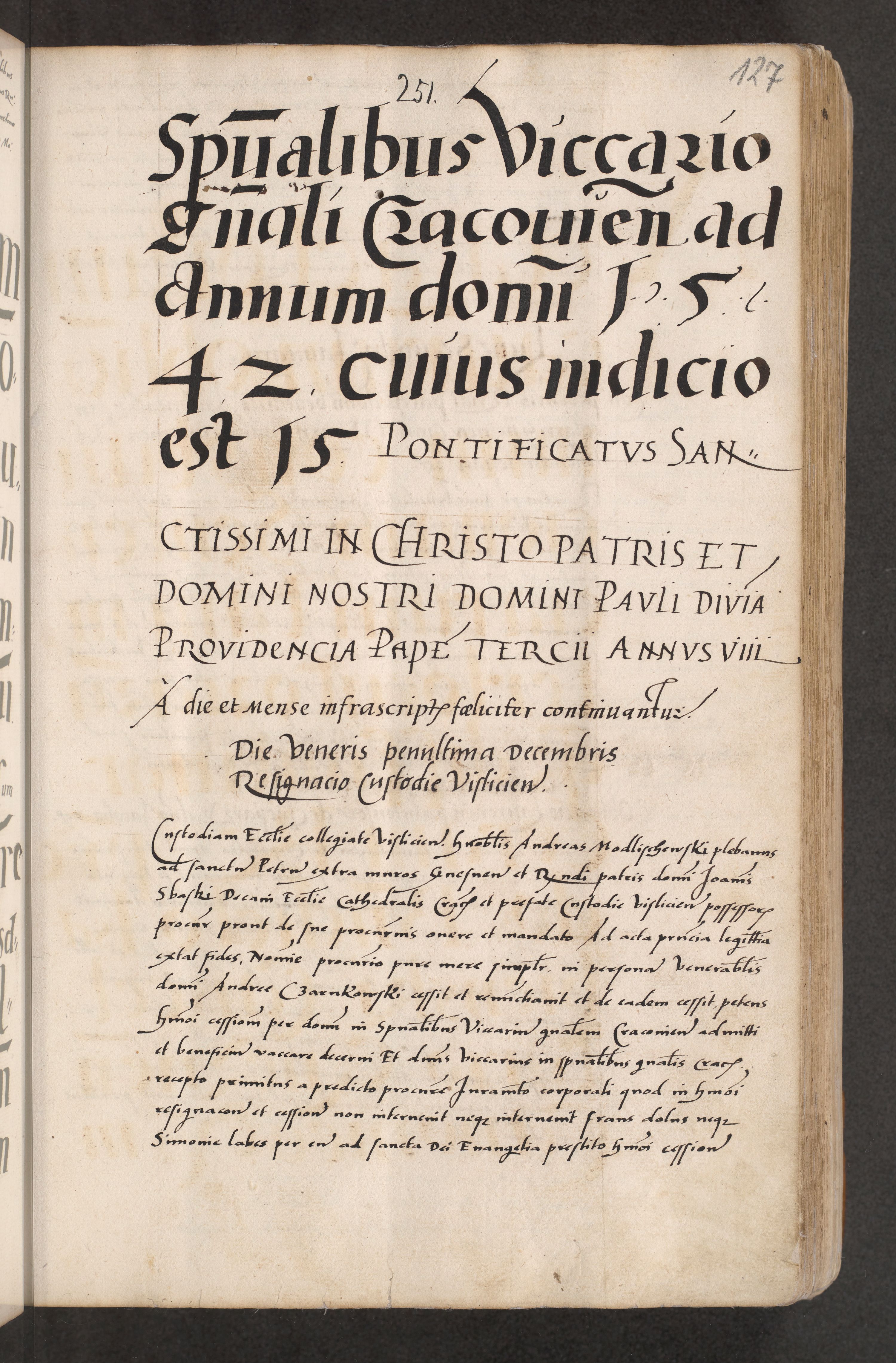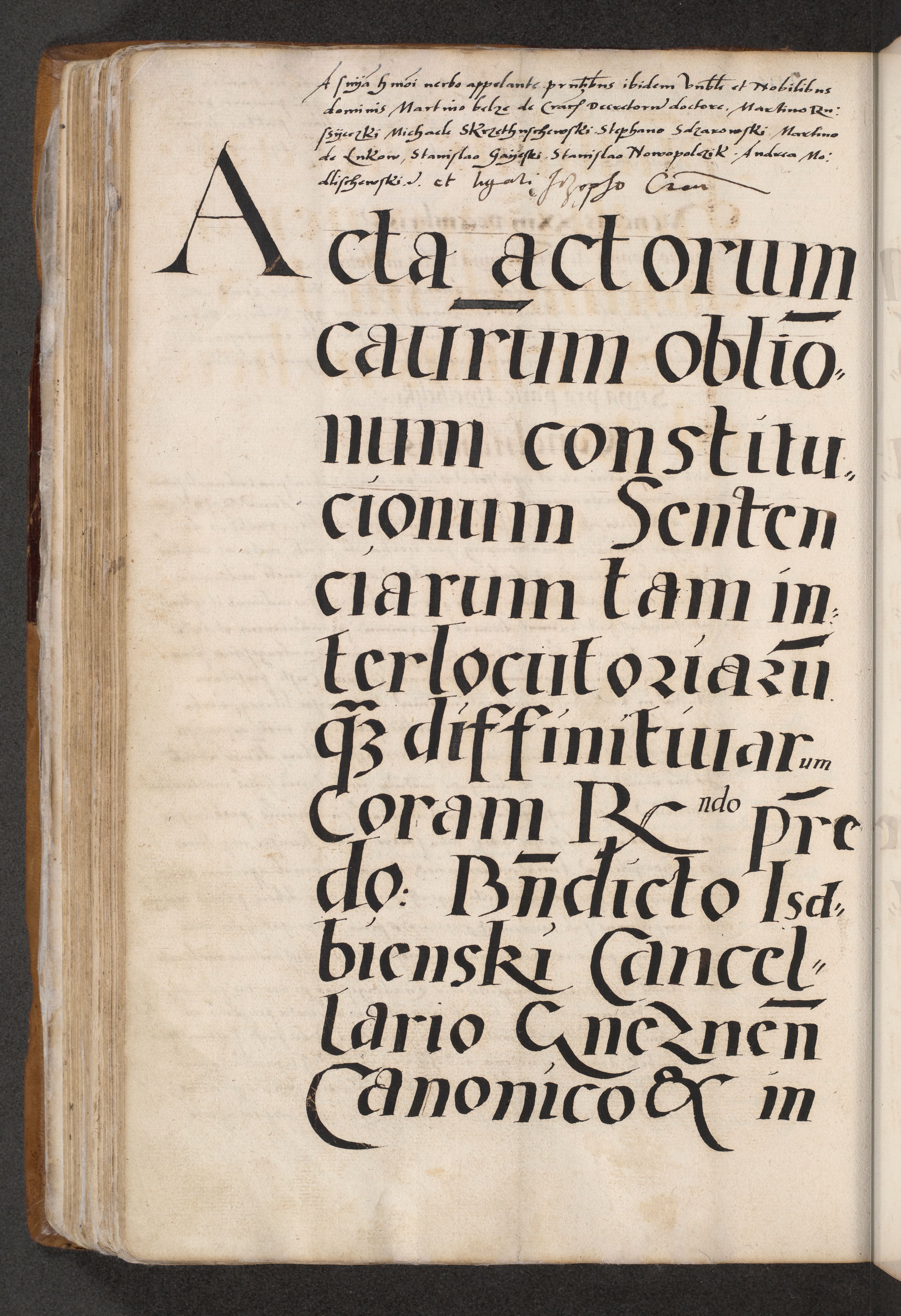 Acta actorum coram reverendo patre domino Benedicto Isdbienski cancellario Gnesnesi, canonico et reverendissimi in Christo patris et domini domini Petri Dei gratia archiepiscopi Gnesnensis et episcopi Cracoviensis sedisque apostolice legati nati et primatis Regni Polonie, vicarioque in spiritualibus generali Cracoviensi ad annum Domini millesimum quingentisimum quadragesimum primum, cuius indictio est quatuordecima, pontificatus sanctissimi in Christo patris et domini nostri domini Pauli divina providencia pape tercii, anno ipsius septimo, feliciter continuantur. Dii cepta secundent