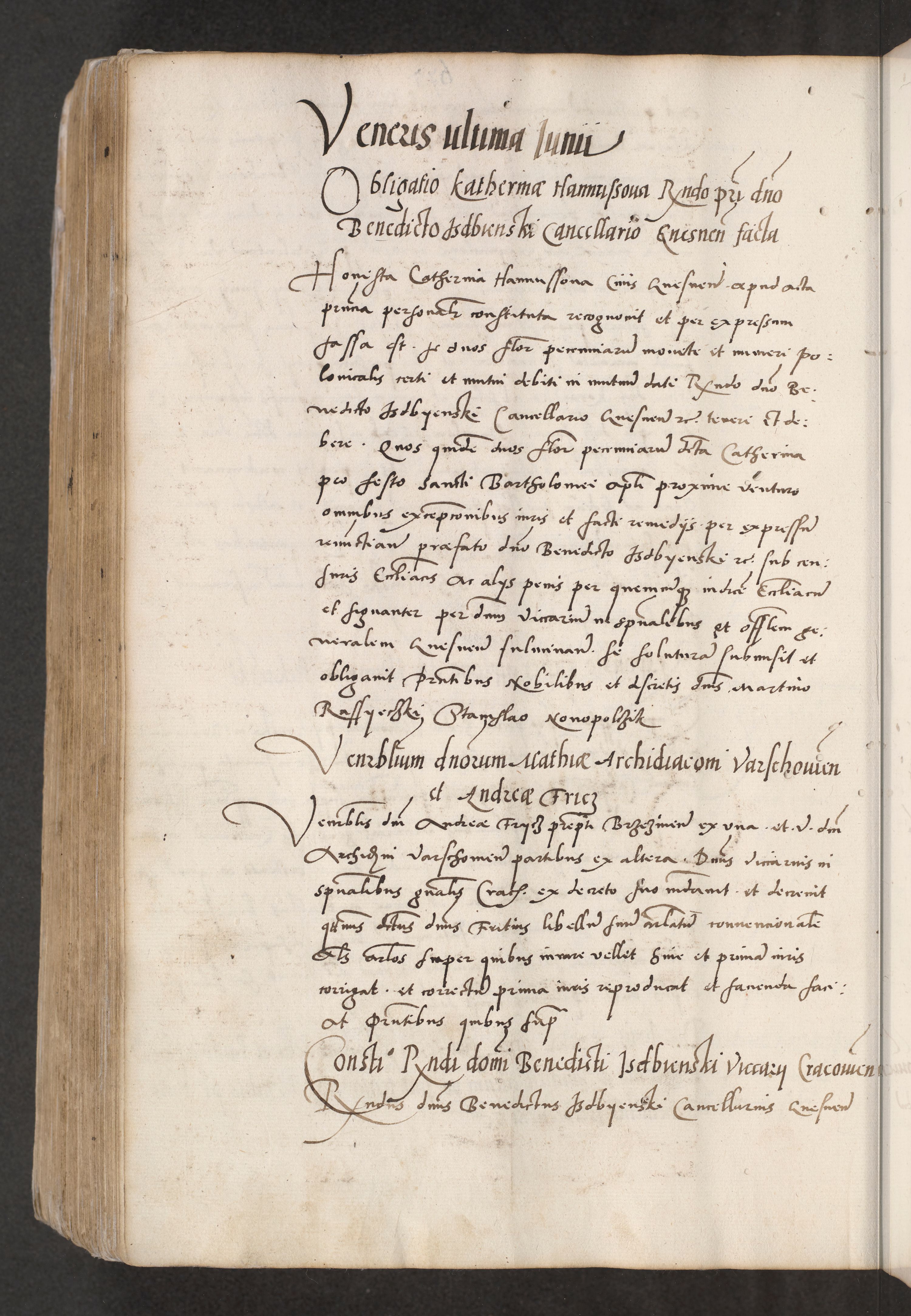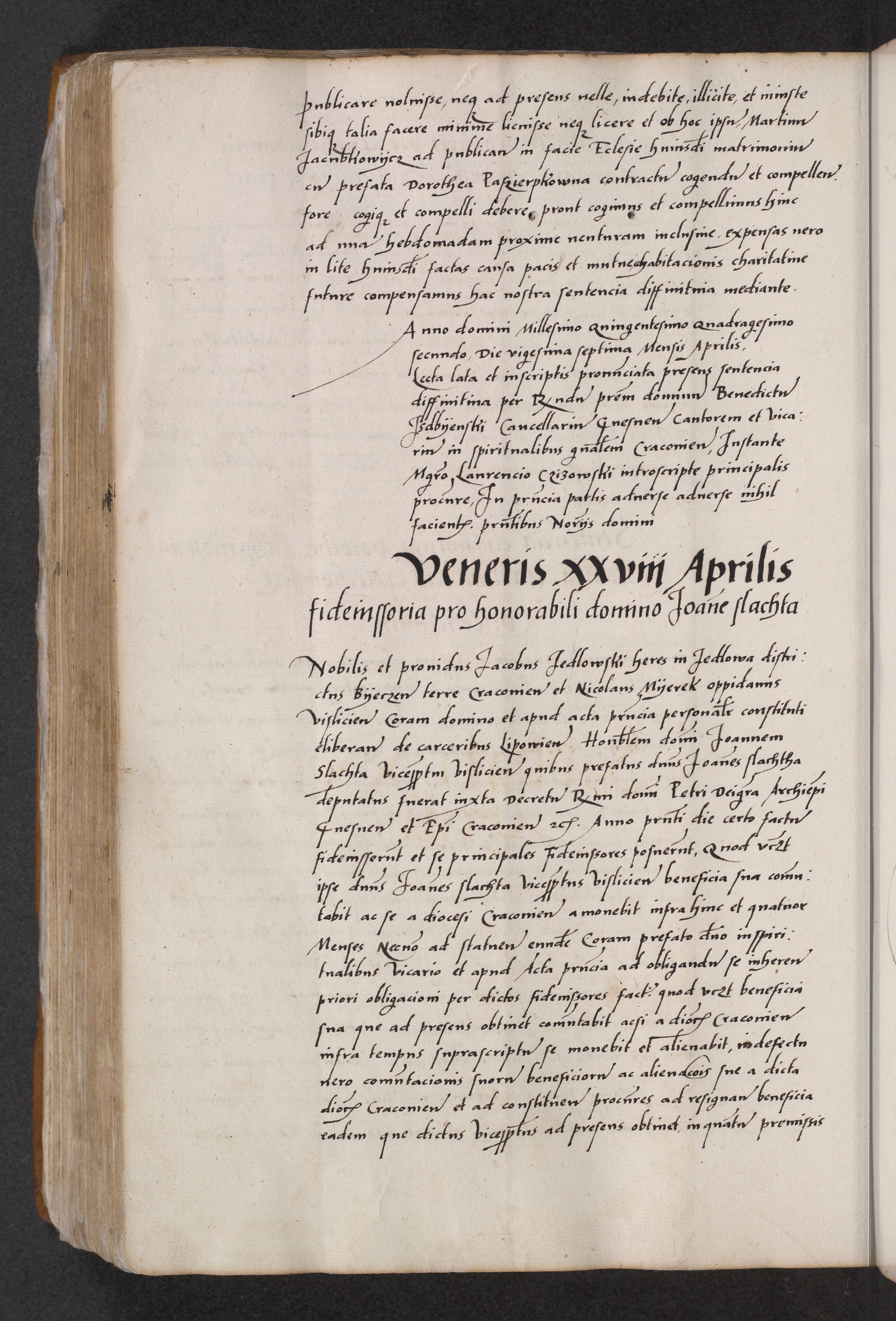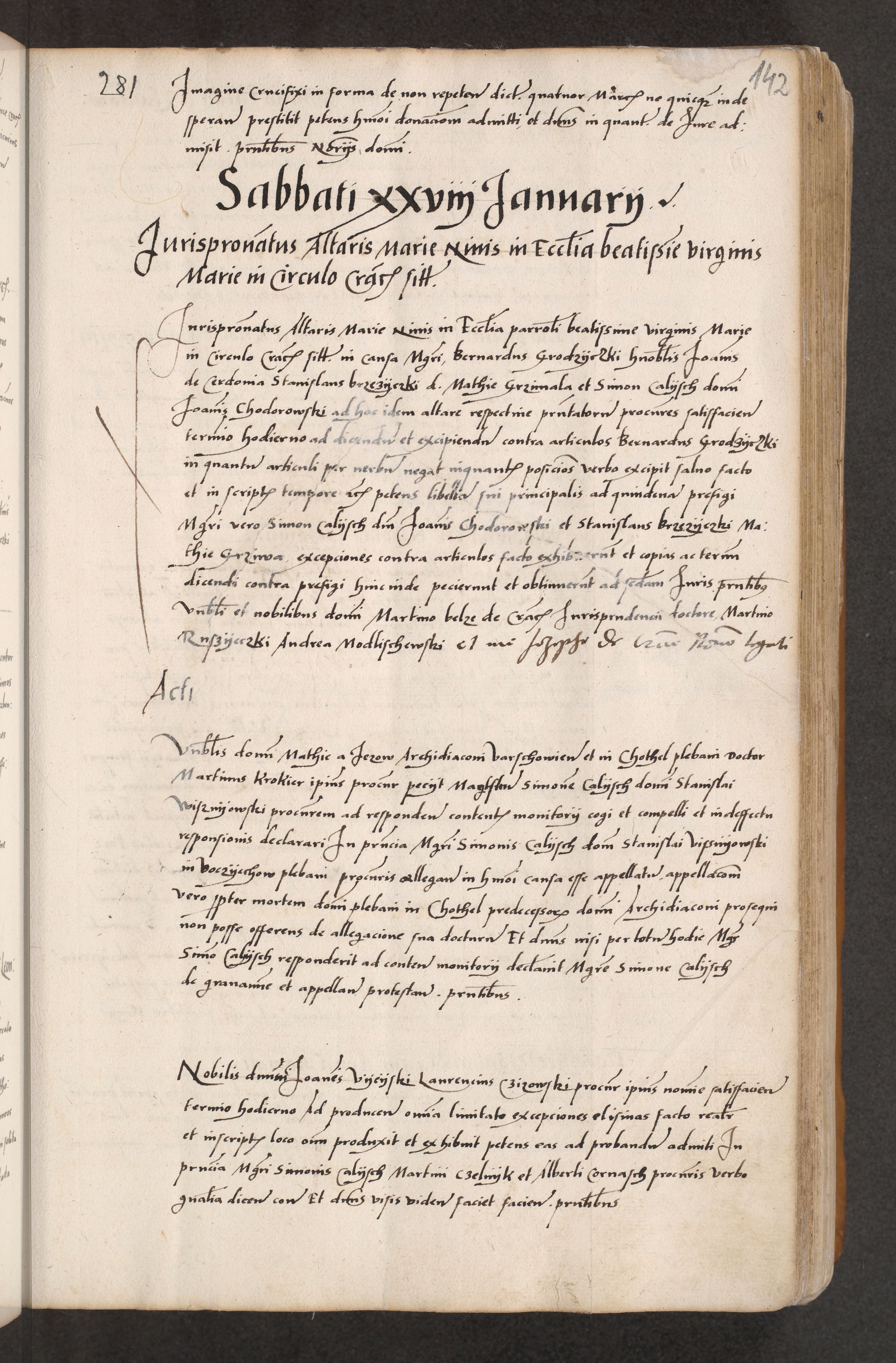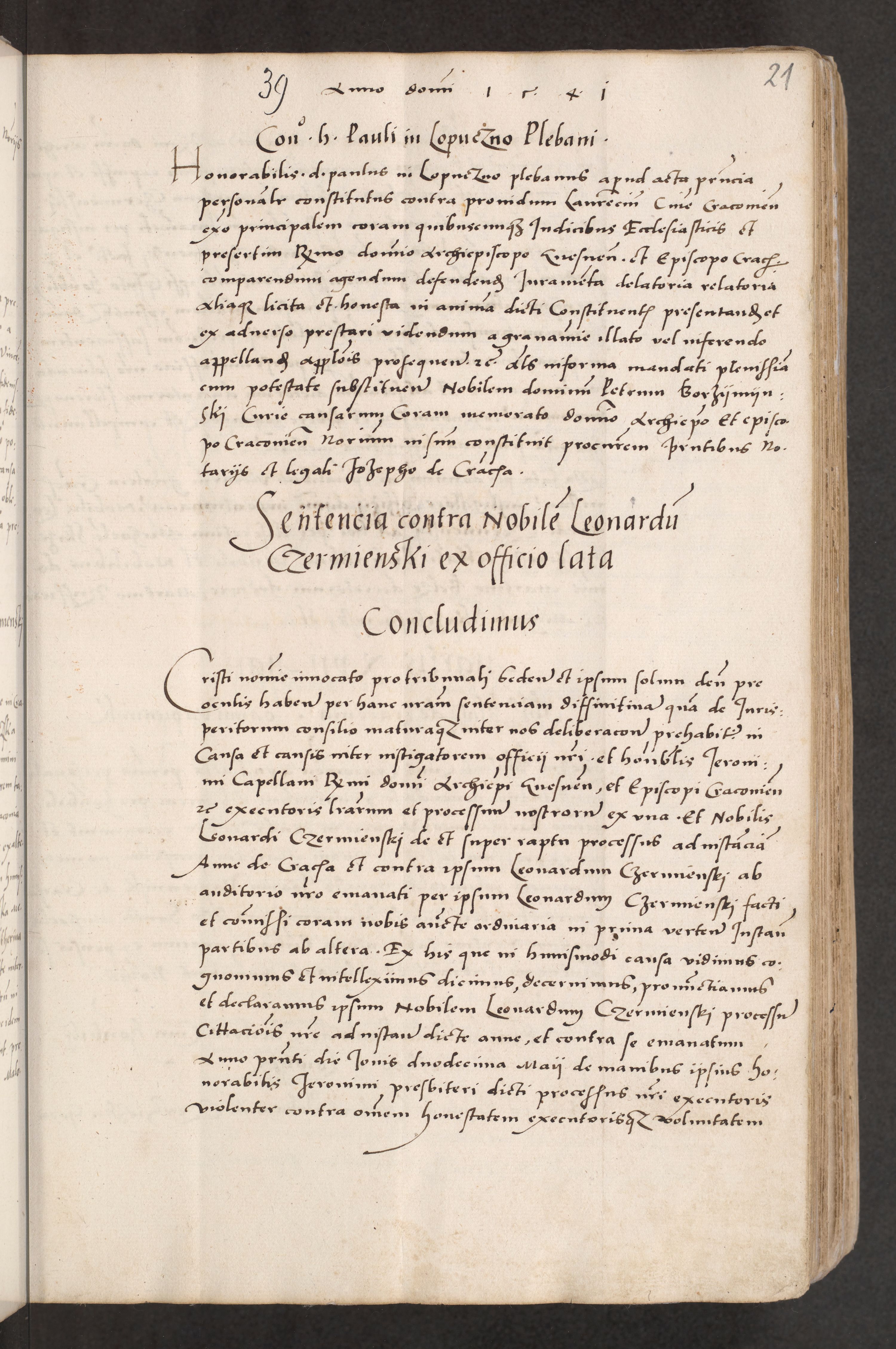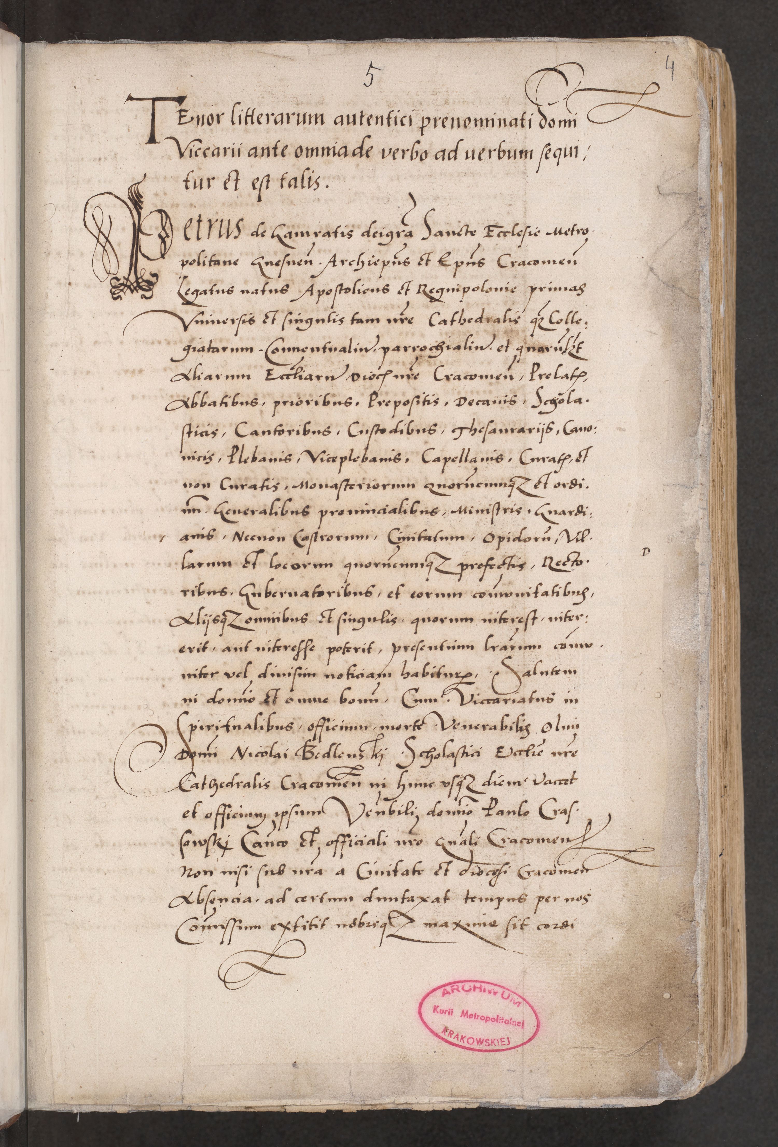 Acta actorum coram reverendo patre domino Benedicto Isdbienski cancellario Gnesnesi, canonico et reverendissimi in Christo patris et domini domini Petri Dei gratia archiepiscopi Gnesnensis et episcopi Cracoviensis sedisque apostolice legati nati et primatis Regni Polonie, vicarioque in spiritualibus generali Cracoviensi ad annum Domini millesimum quingentisimum quadragesimum primum, cuius indictio est quatuordecima, pontificatus sanctissimi in Christo patris et domini nostri domini Pauli divina providencia pape tercii, anno ipsius septimo, feliciter continuantur. Dii cepta secundent