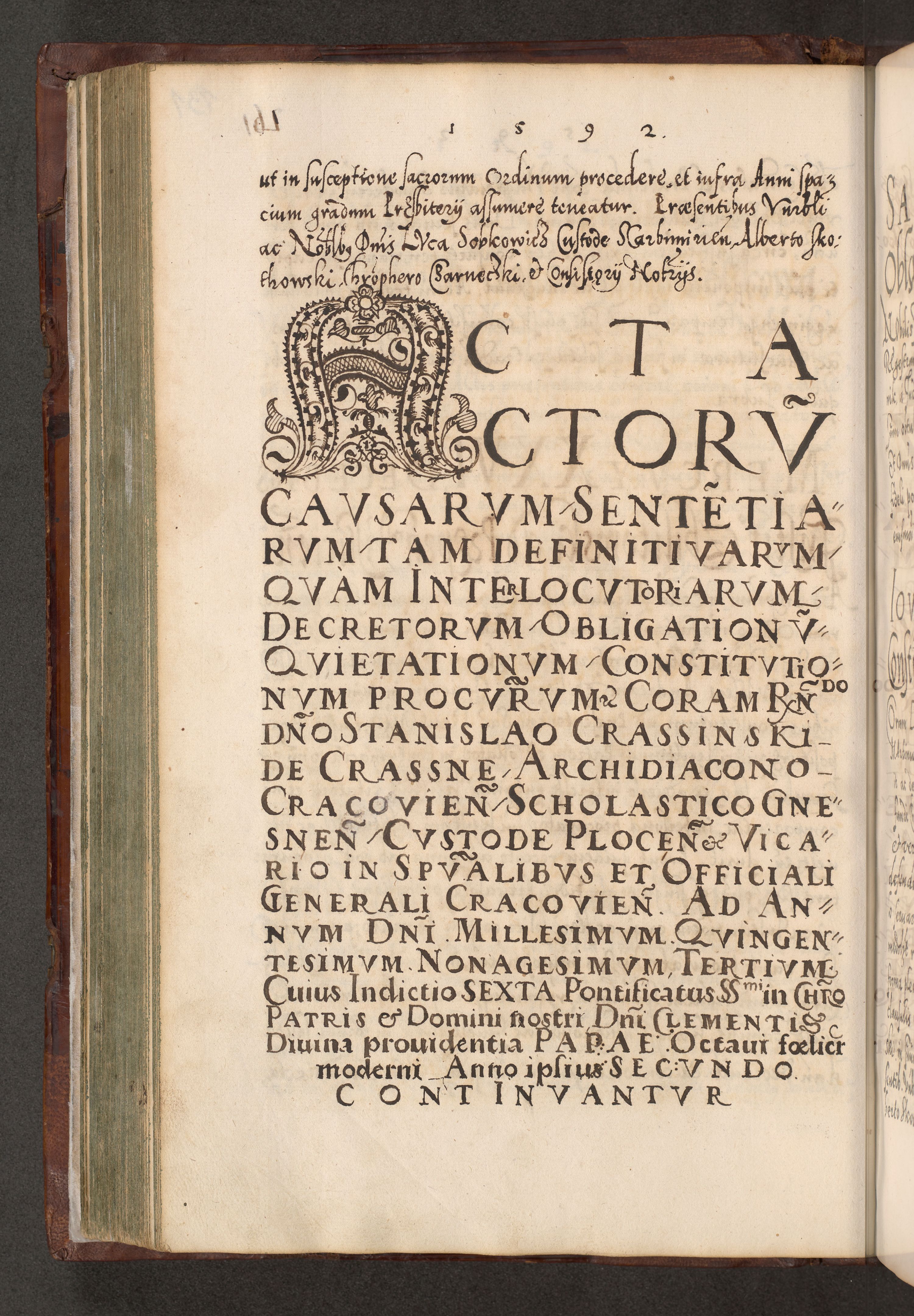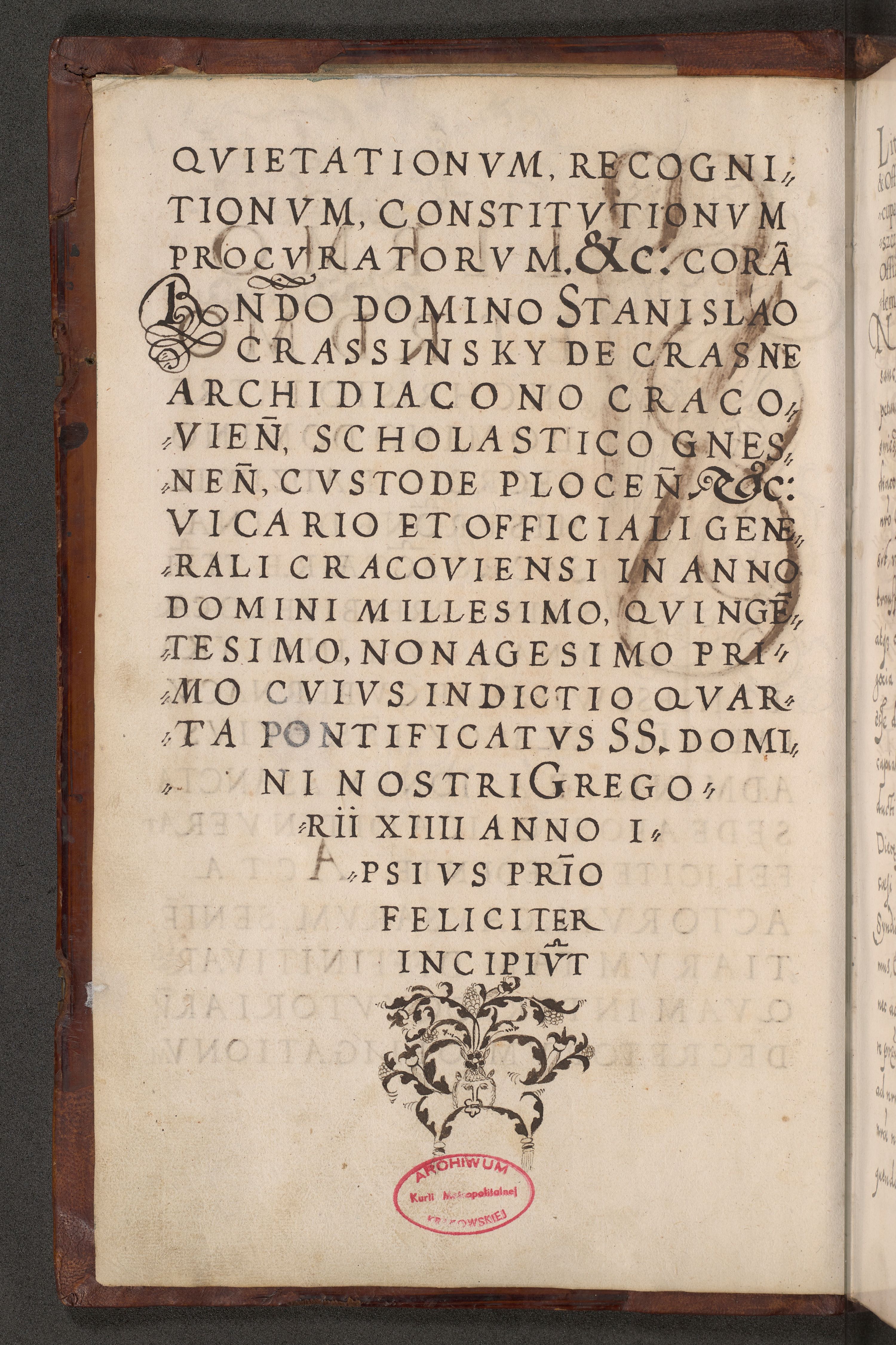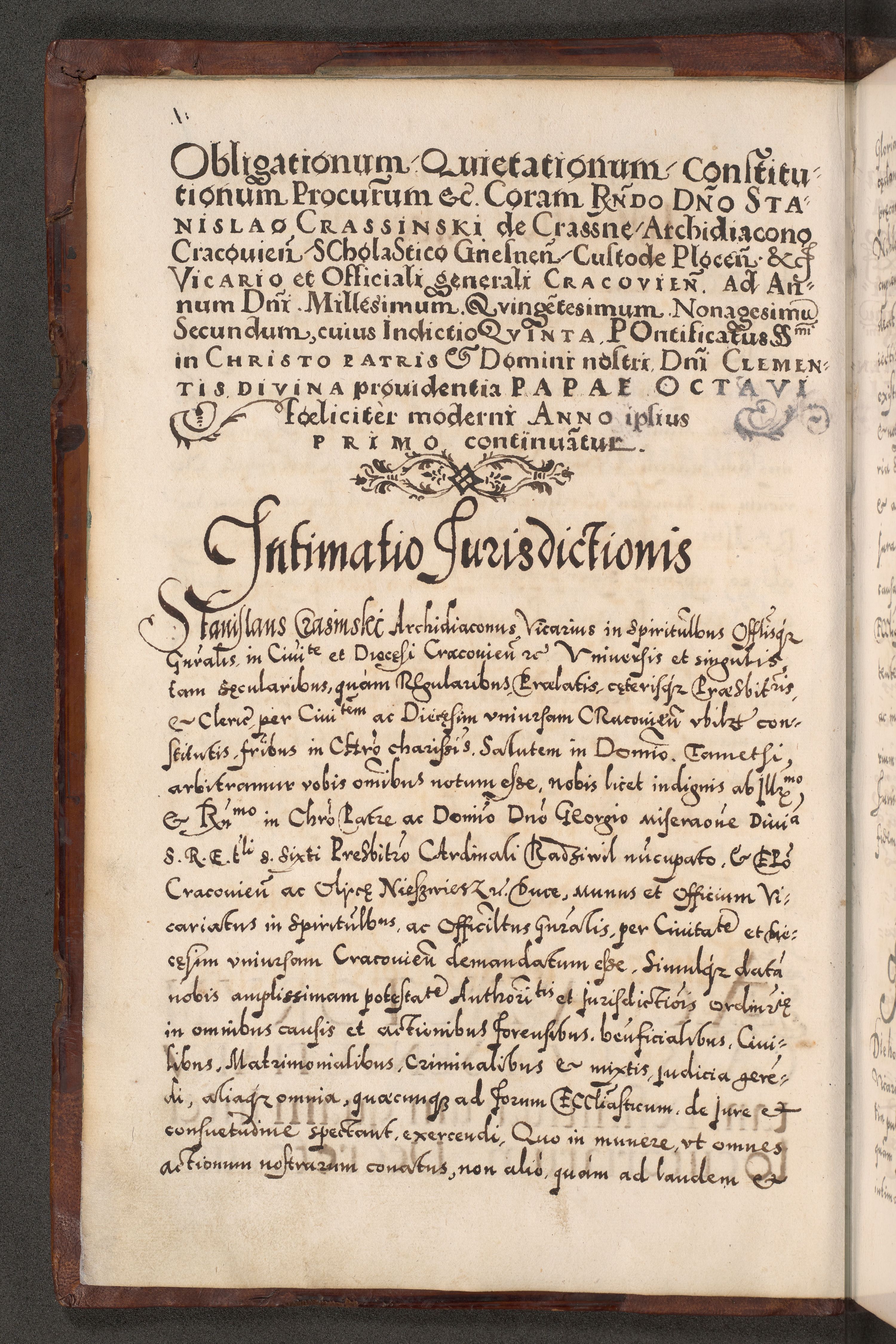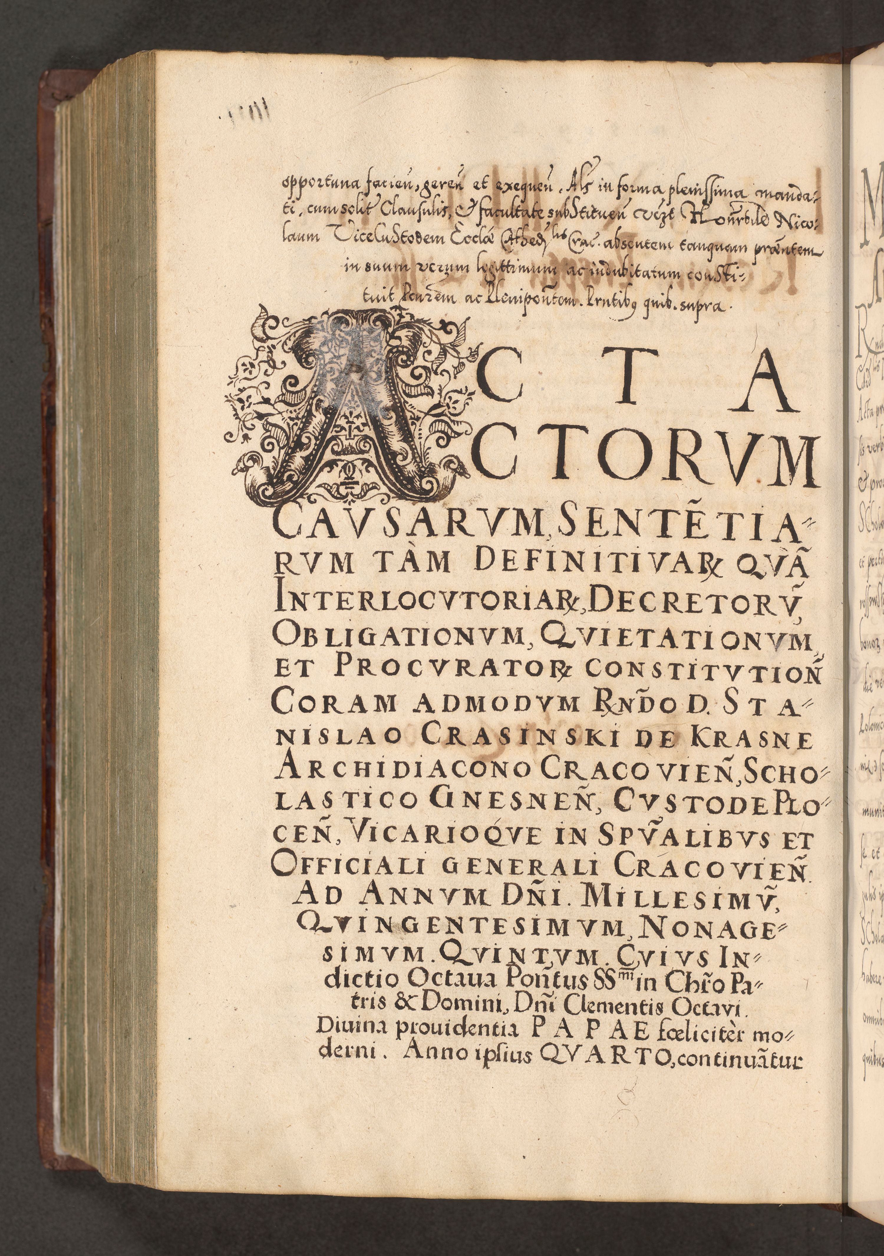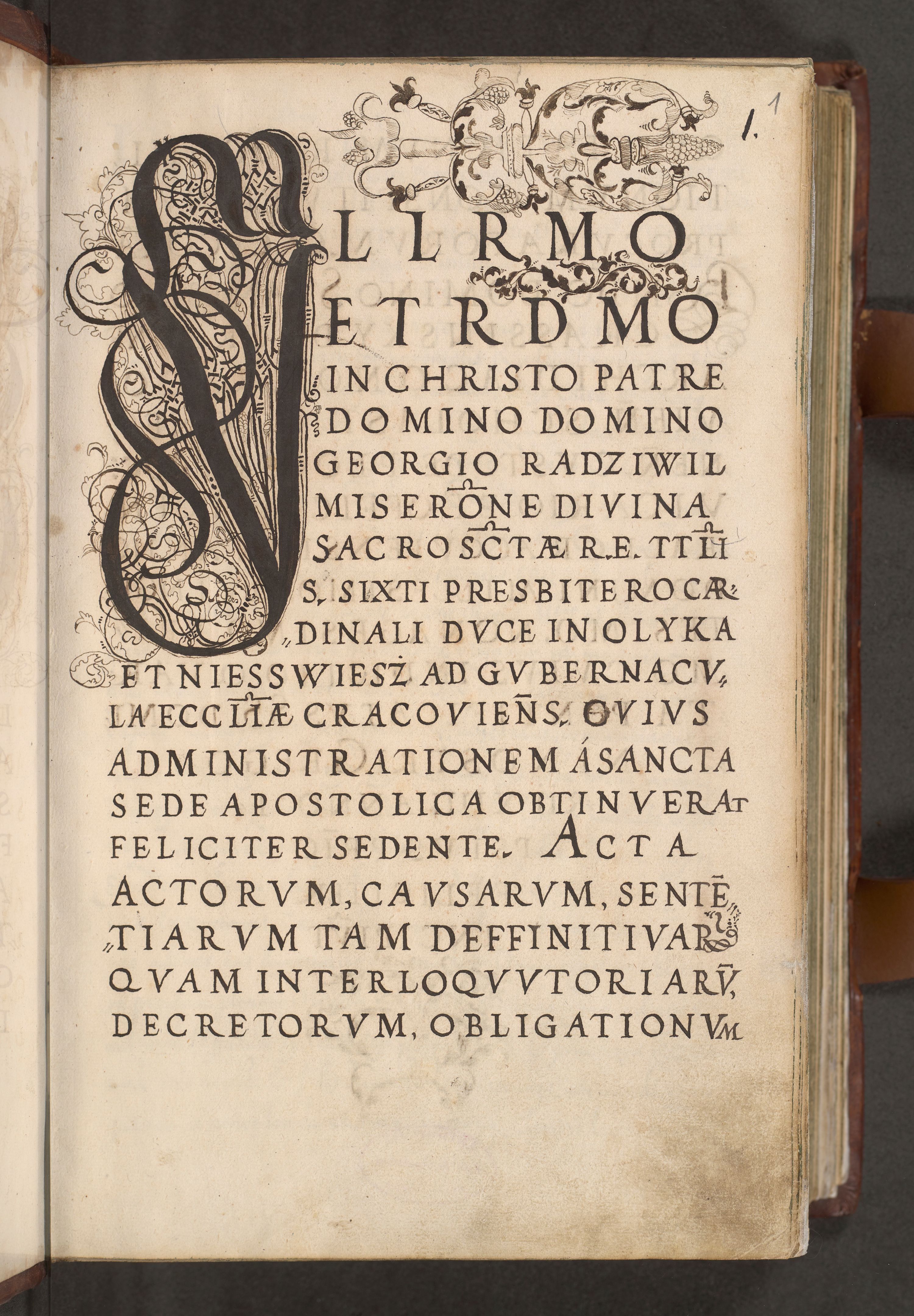 Illistrissimo et revedissimo in Christo Patre Domino Domino Georgio Rzadziwił Miserone Divina Sacrostae R. E. Tituli S. Sixti Presbitero Cardinali Duce in Olyka et Niesswiesz ad Gubernacula Ecclessiae Cracoviensis cuius administratorialem a Sancta Sede Apostolica obtinverat feliciter sedente. Acta actorum, causarum, sententiarum tam deffinitivarum quam interloquutoriarum decretorum, obligationum, quietationum, recognitionum, constitutionum procuratorum etc. coram Reverendo Domino Stanislao Crassinskz de Crasne Archidiacono Cracoviensis, Scholastico Gnesnesis, Custode Plocensis etc. Vicario et Officiali Generali Cracoviensi in Ano Domini Millesimo Quingentesimo Nonagesimo Primo cuius indictio quarta pontificatus SS. Domini Nostri Gregorii XIIII Anno I psius prio feliciter incipiut