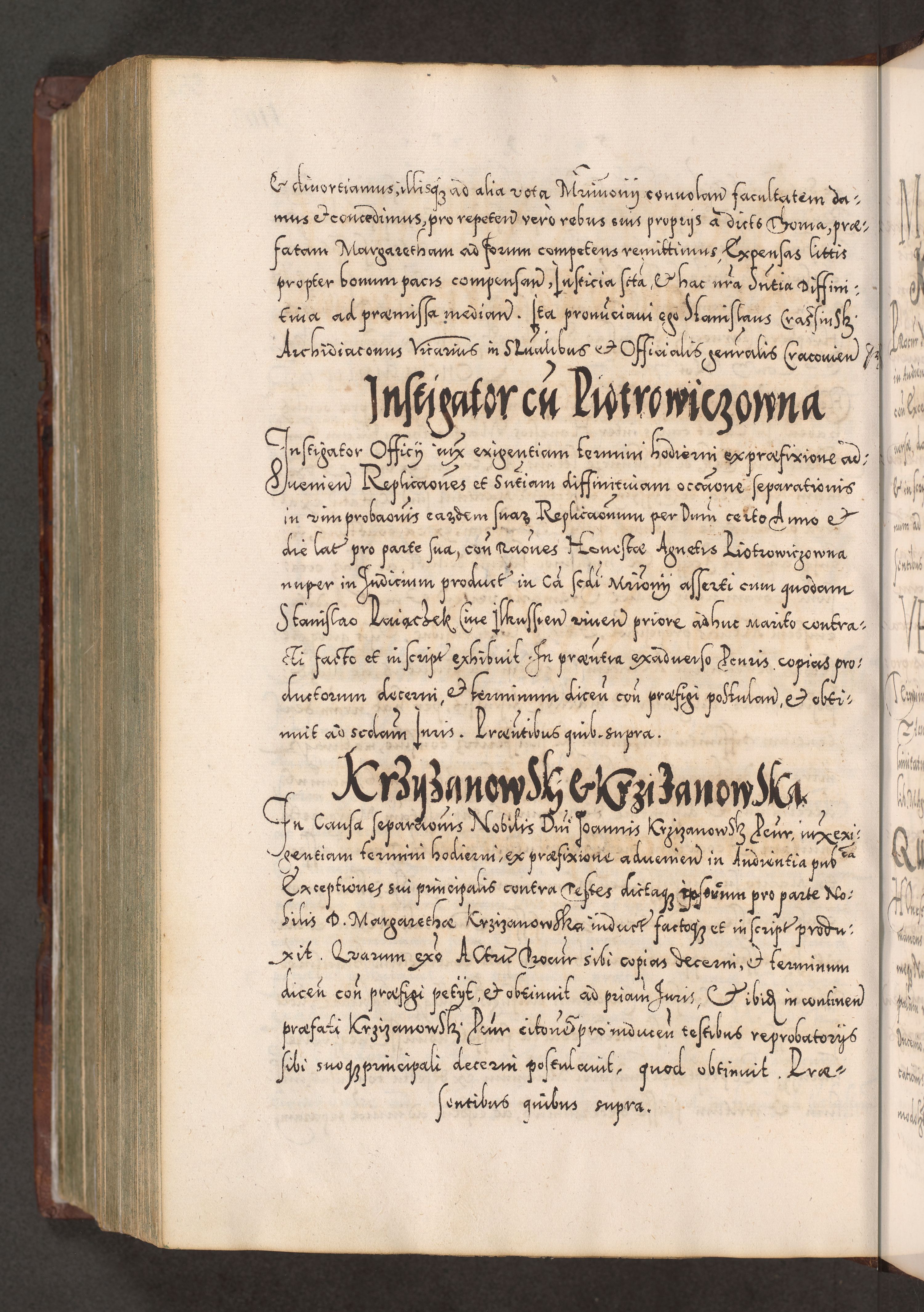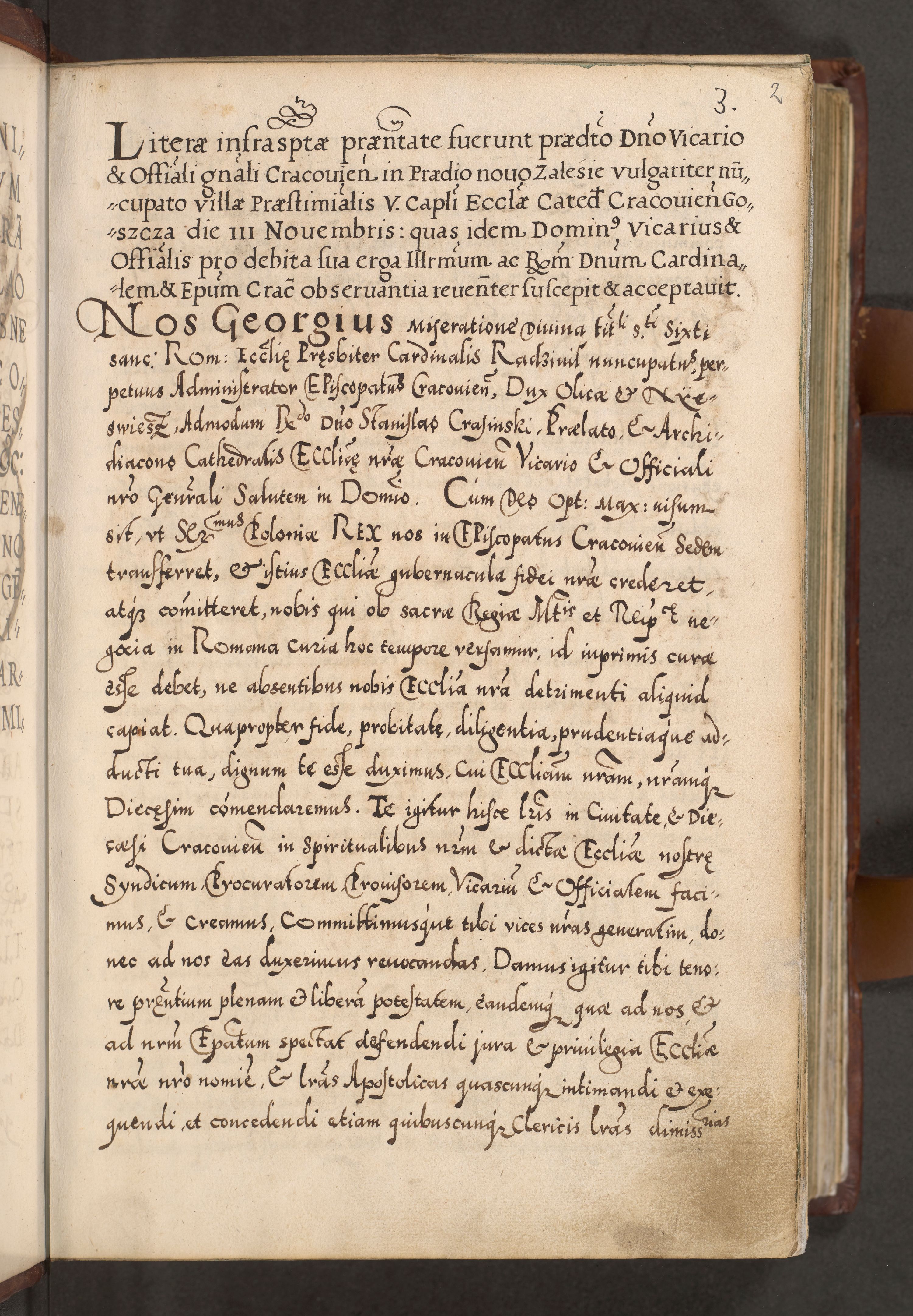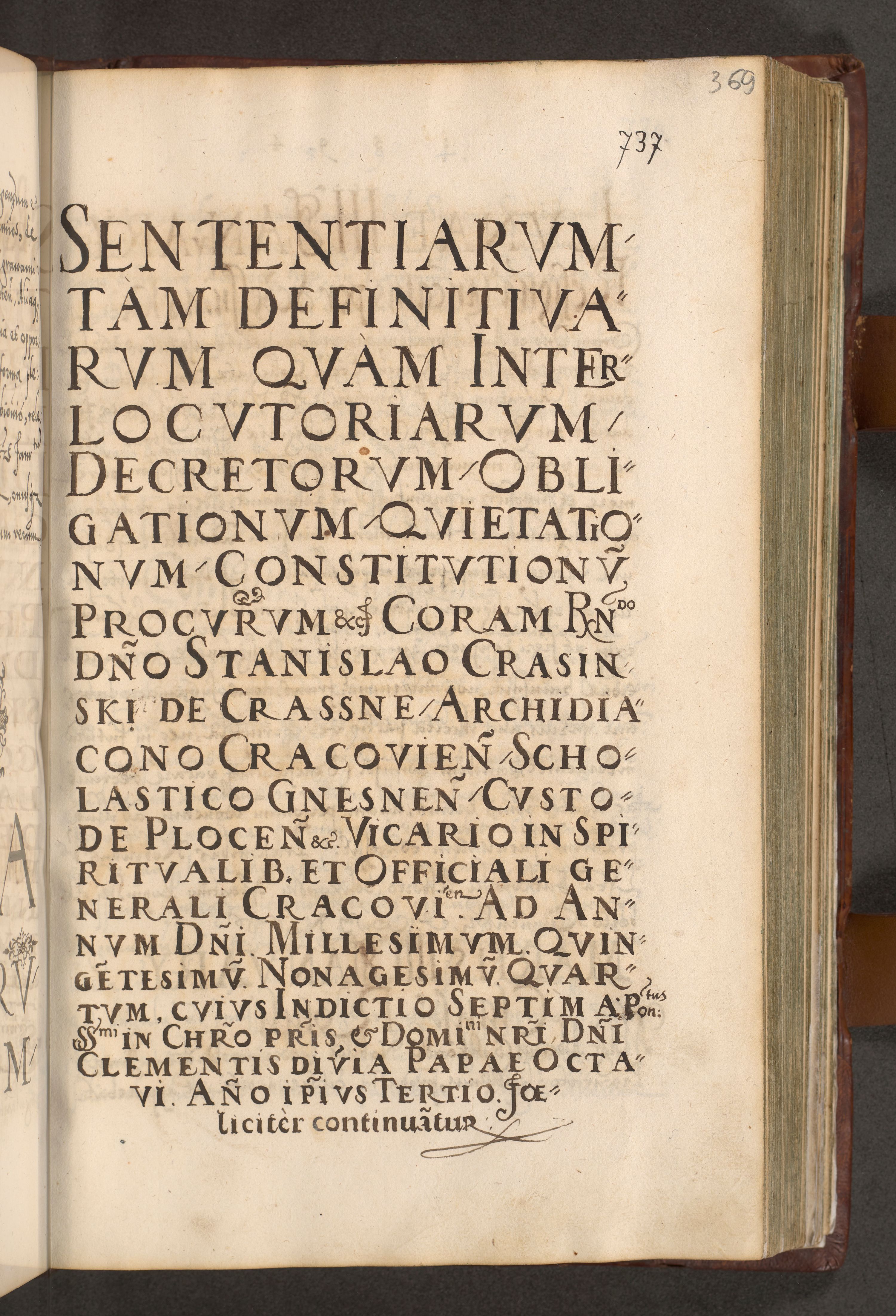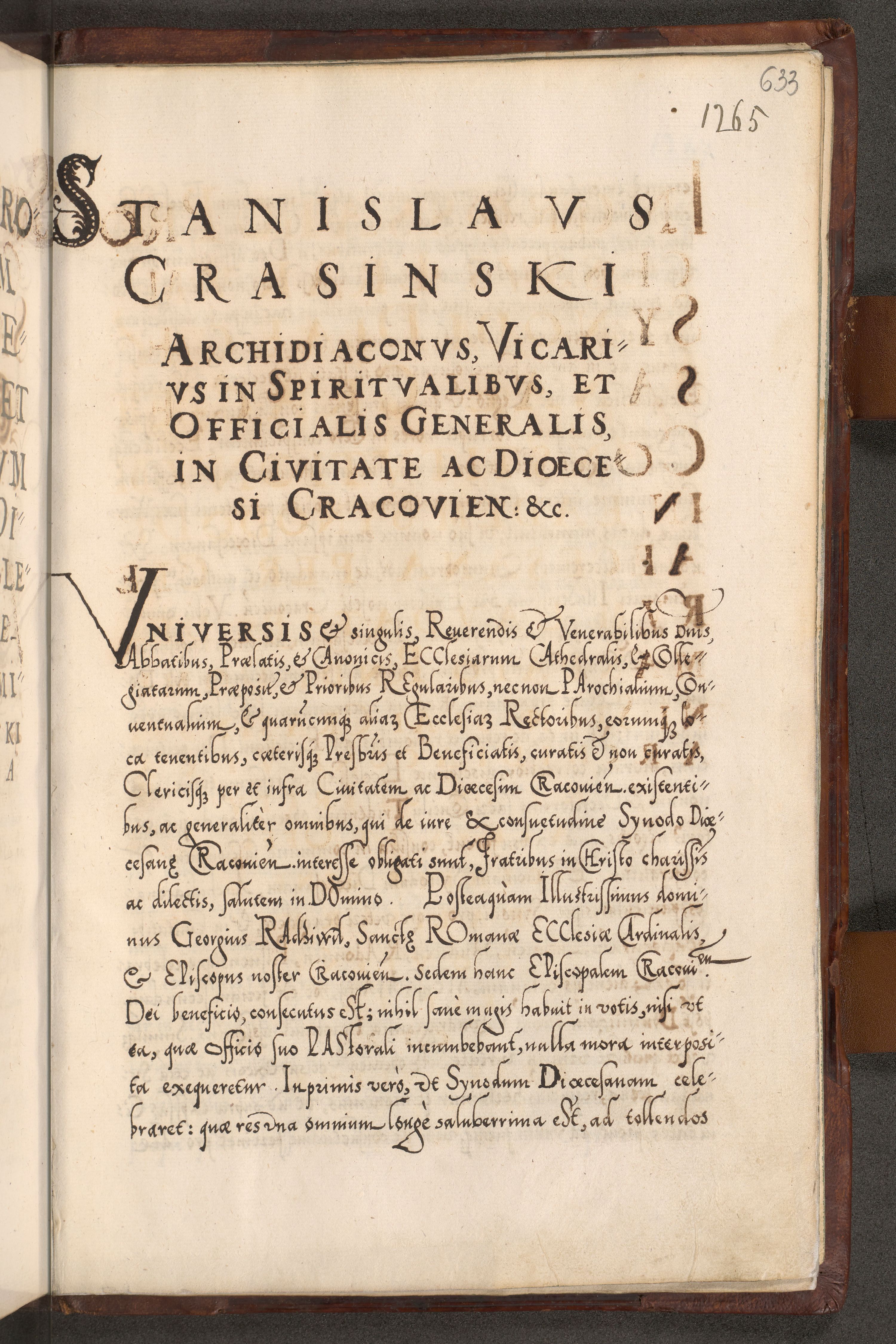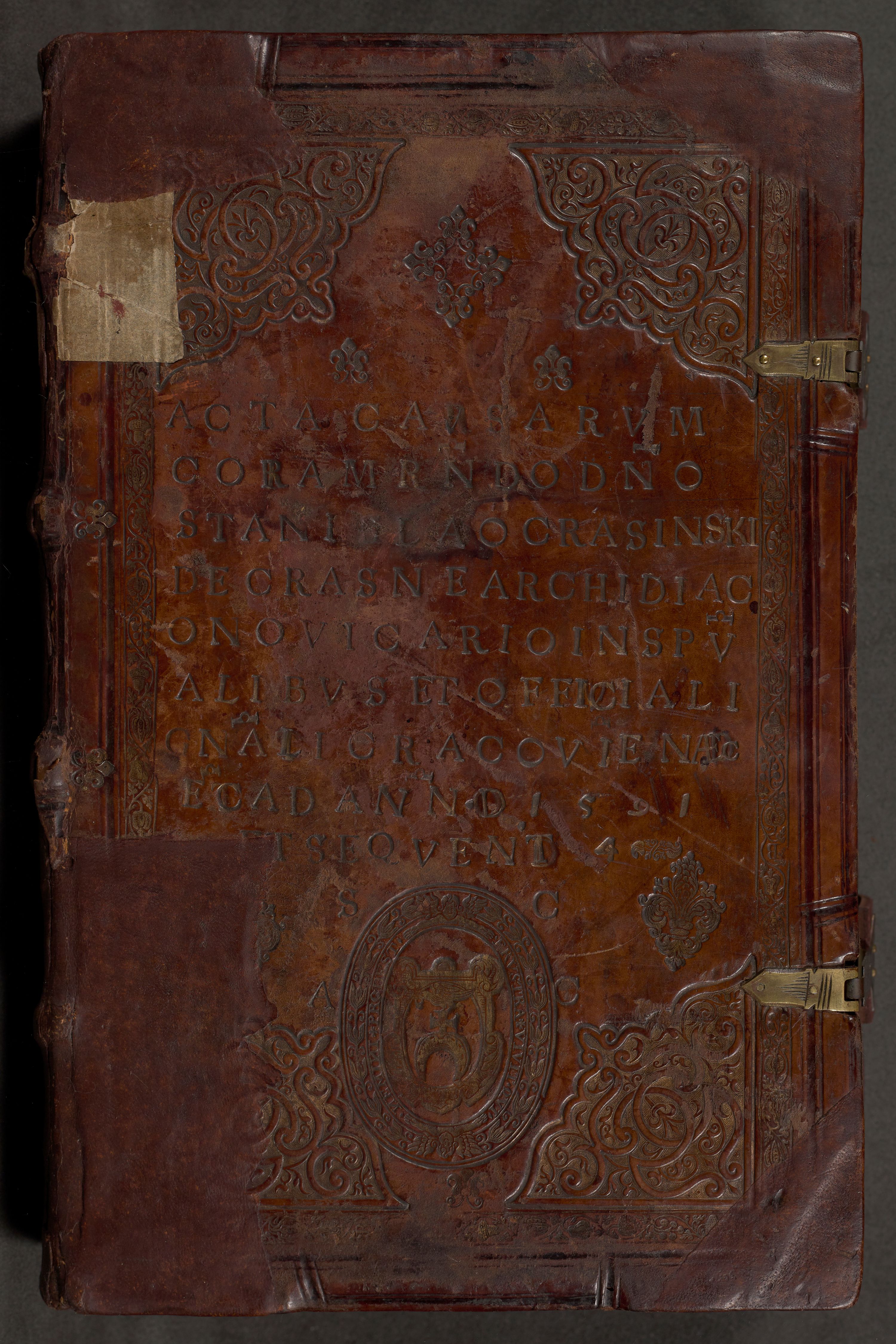 Illistrissimo et revedissimo in Christo Patre Domino Domino Georgio Rzadziwił Miserone Divina Sacrostae R. E. Tituli S. Sixti Presbitero Cardinali Duce in Olyka et Niesswiesz ad Gubernacula Ecclessiae Cracoviensis cuius administratorialem a Sancta Sede Apostolica obtinverat feliciter sedente. Acta actorum, causarum, sententiarum tam deffinitivarum quam interloquutoriarum decretorum, obligationum, quietationum, recognitionum, constitutionum procuratorum etc. coram Reverendo Domino Stanislao Crassinskz de Crasne Archidiacono Cracoviensis, Scholastico Gnesnesis, Custode Plocensis etc. Vicario et Officiali Generali Cracoviensi in Ano Domini Millesimo Quingentesimo Nonagesimo Primo cuius indictio quarta pontificatus SS. Domini Nostri Gregorii XIIII Anno I psius prio feliciter incipiut