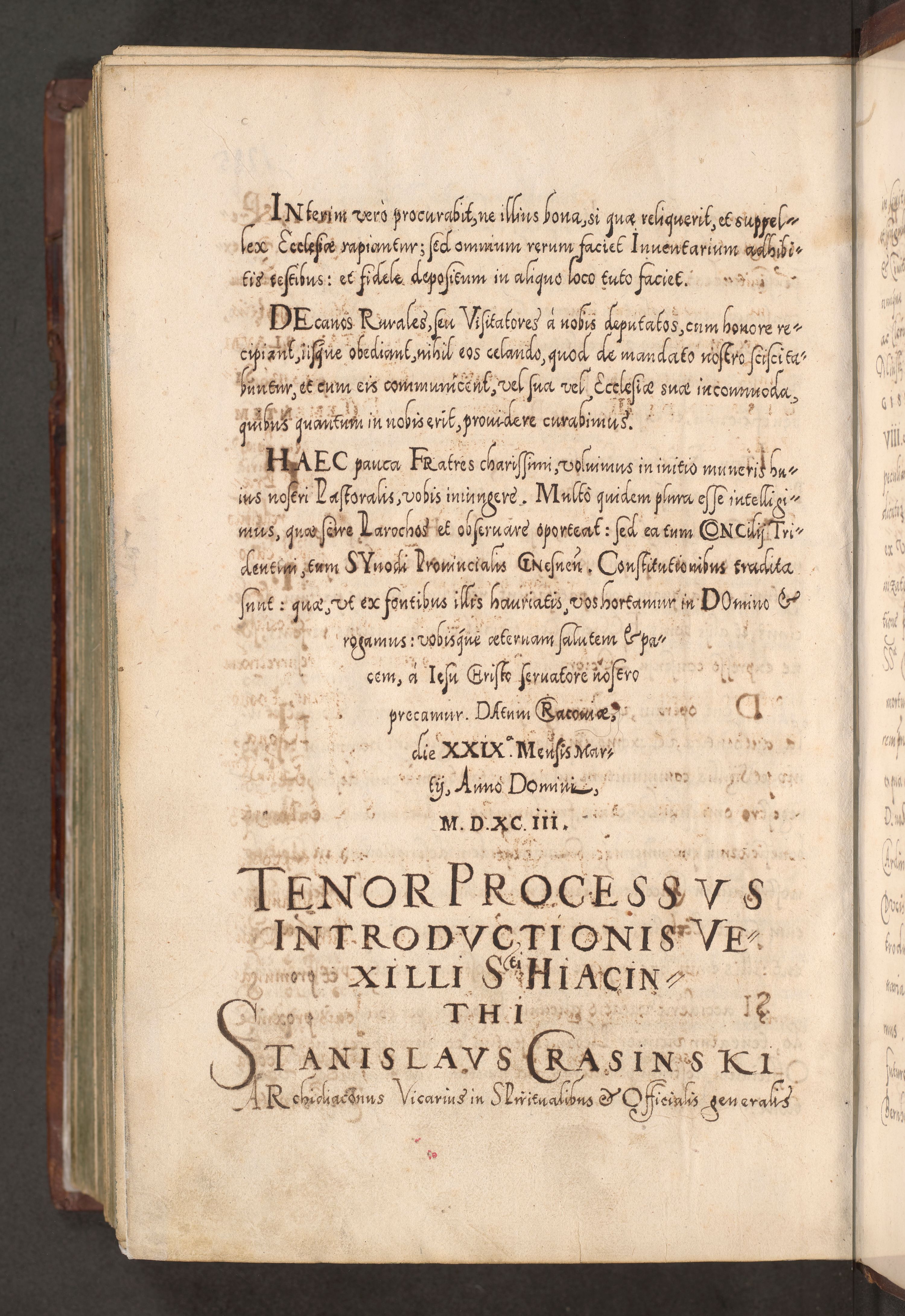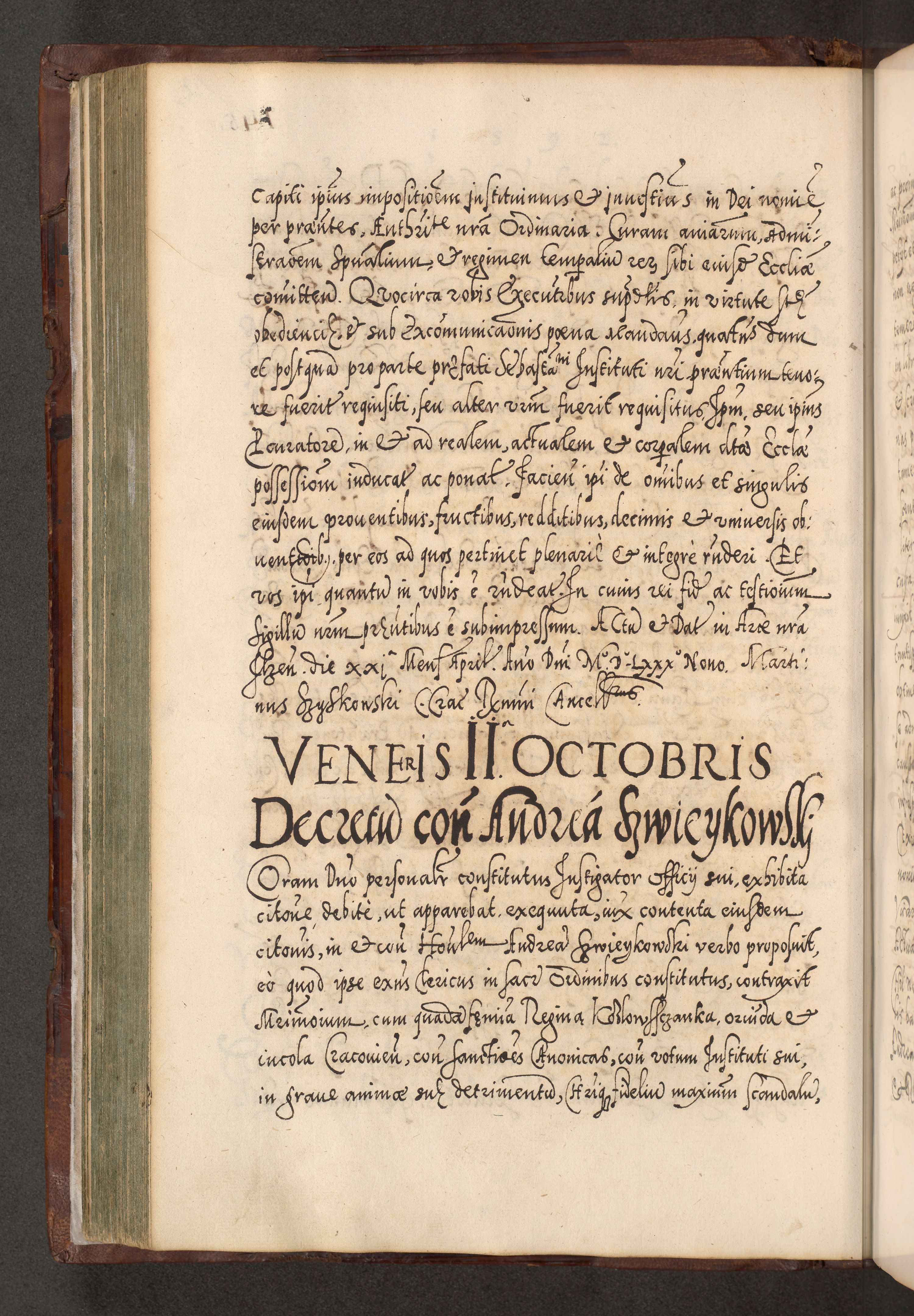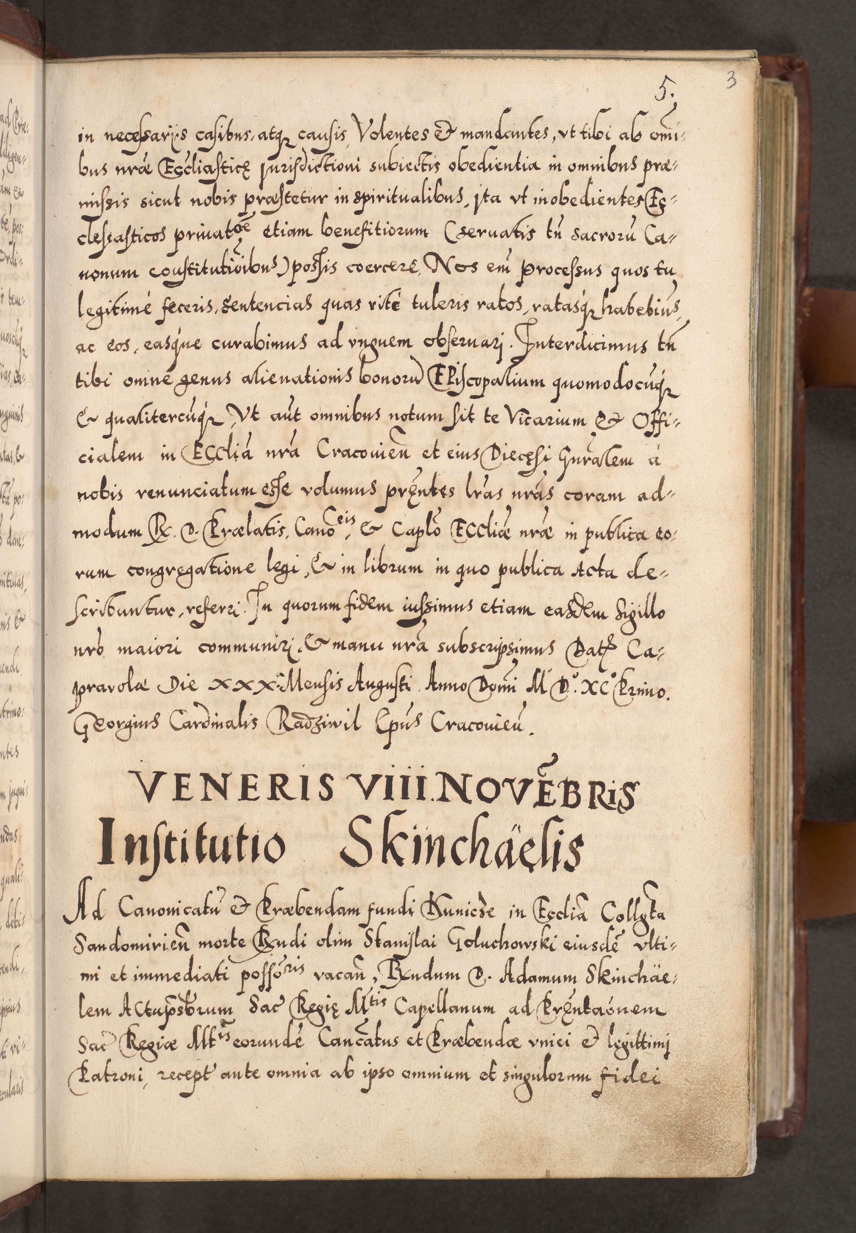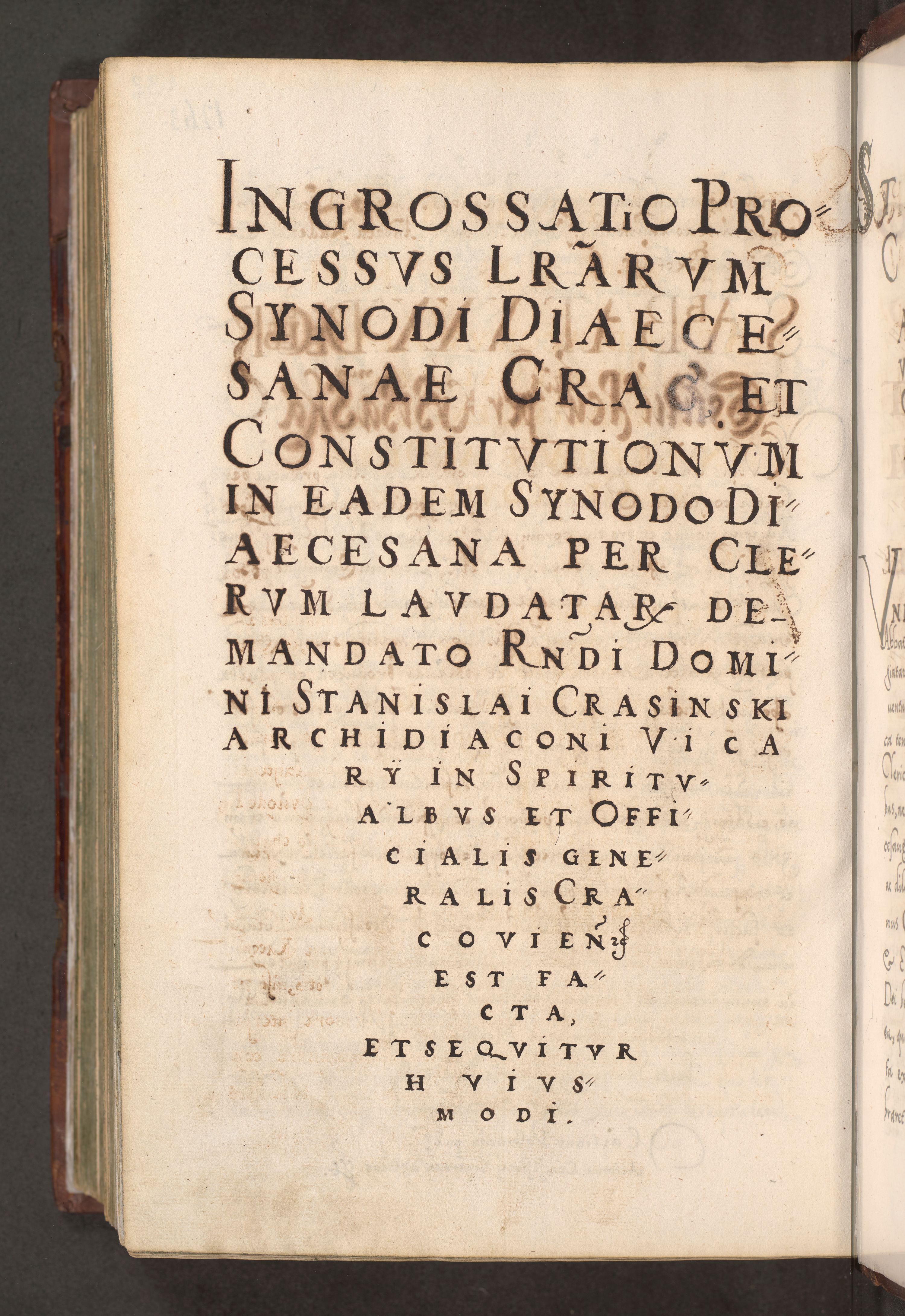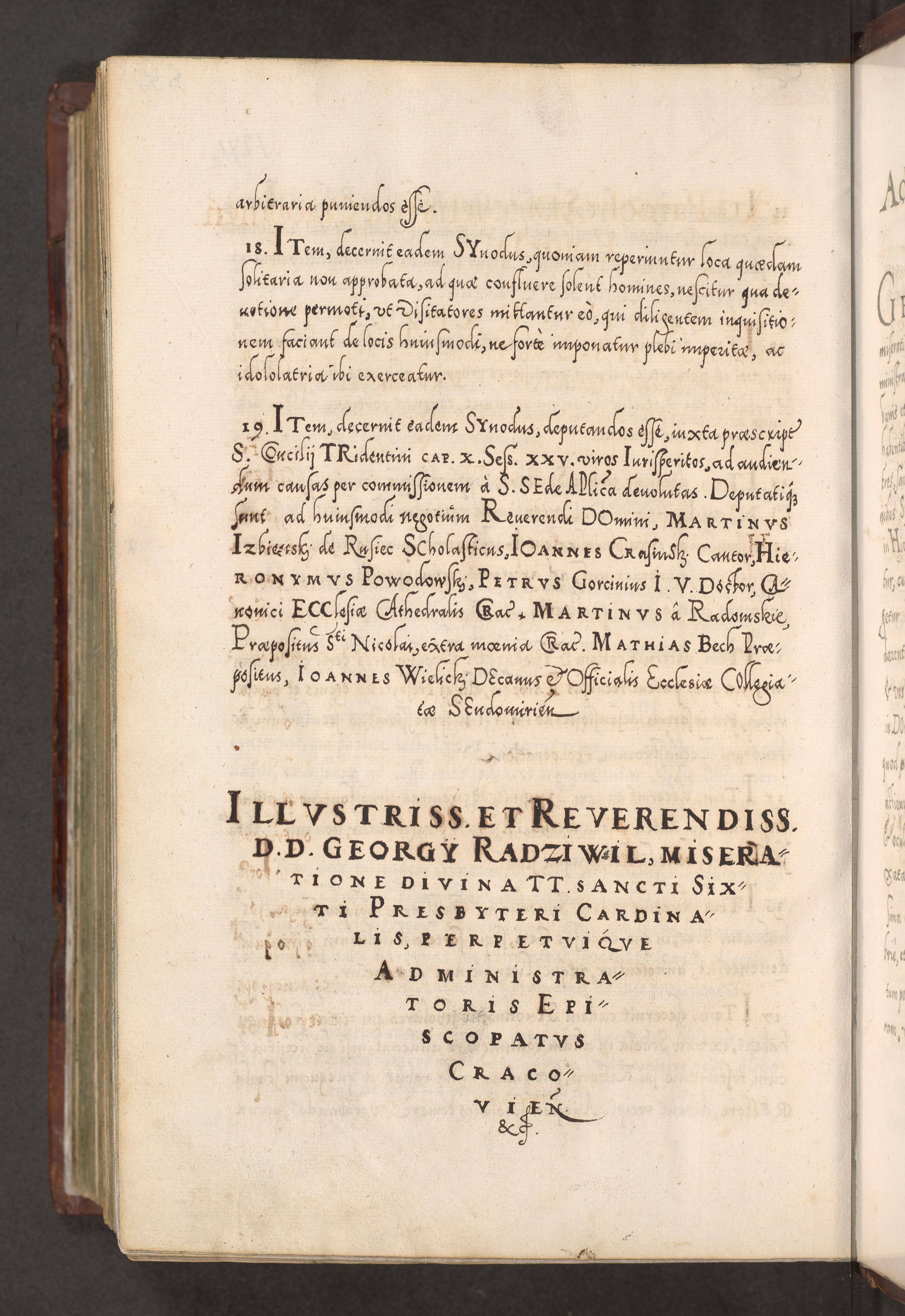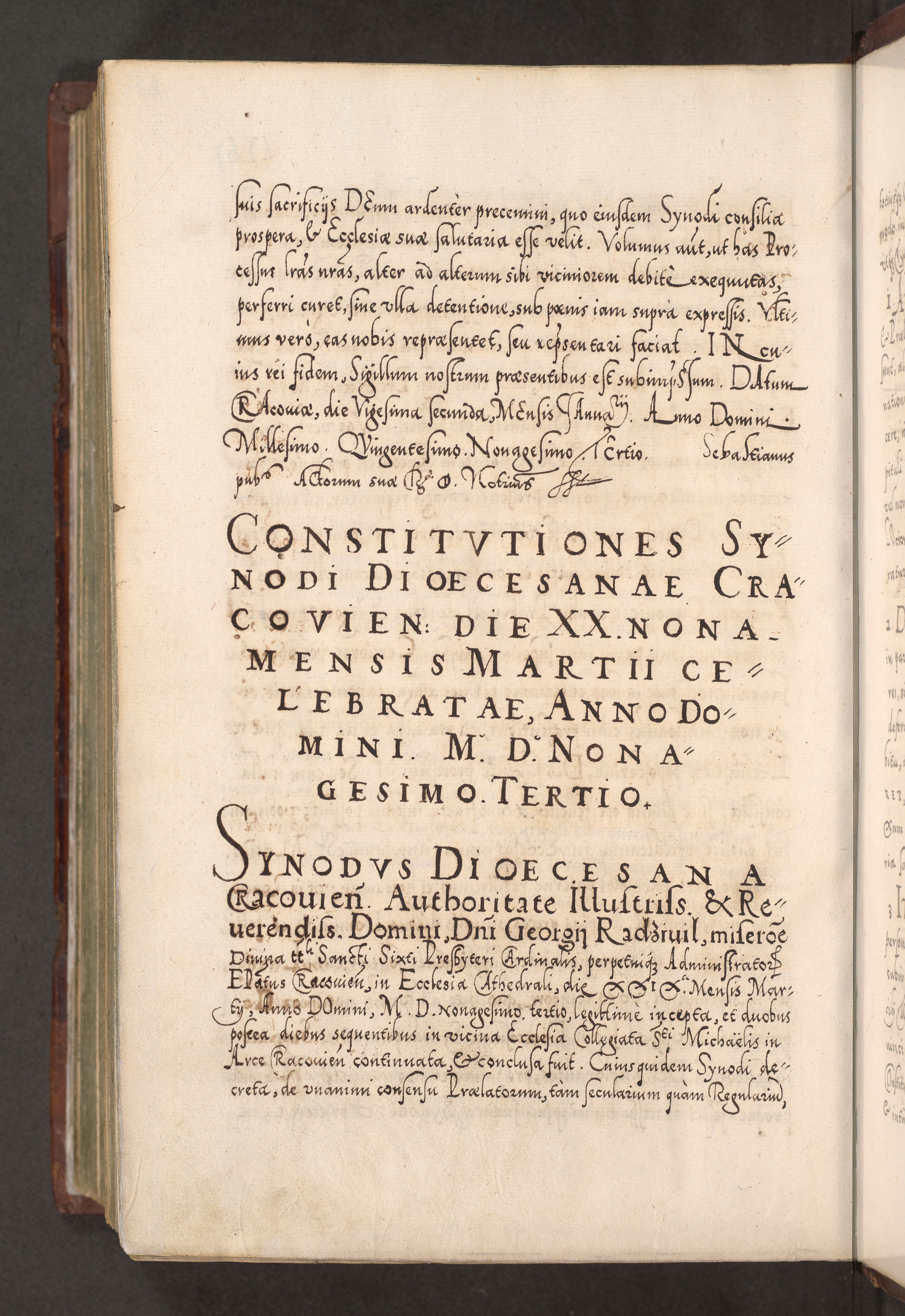 Illistrissimo et revedissimo in Christo Patre Domino Domino Georgio Rzadziwił Miserone Divina Sacrostae R. E. Tituli S. Sixti Presbitero Cardinali Duce in Olyka et Niesswiesz ad Gubernacula Ecclessiae Cracoviensis cuius administratorialem a Sancta Sede Apostolica obtinverat feliciter sedente. Acta actorum, causarum, sententiarum tam deffinitivarum quam interloquutoriarum decretorum, obligationum, quietationum, recognitionum, constitutionum procuratorum etc. coram Reverendo Domino Stanislao Crassinskz de Crasne Archidiacono Cracoviensis, Scholastico Gnesnesis, Custode Plocensis etc. Vicario et Officiali Generali Cracoviensi in Ano Domini Millesimo Quingentesimo Nonagesimo Primo cuius indictio quarta pontificatus SS. Domini Nostri Gregorii XIIII Anno I psius prio feliciter incipiut