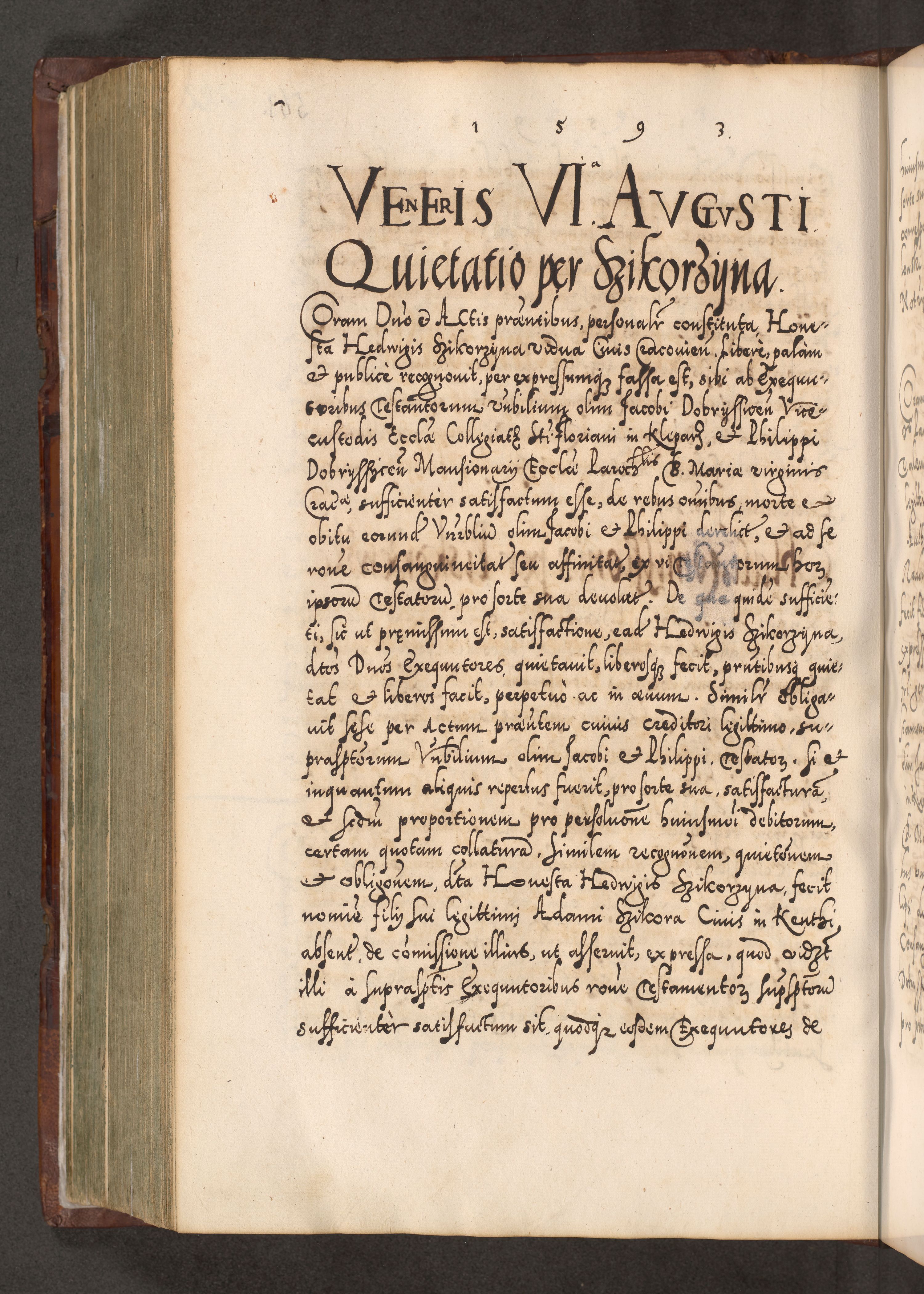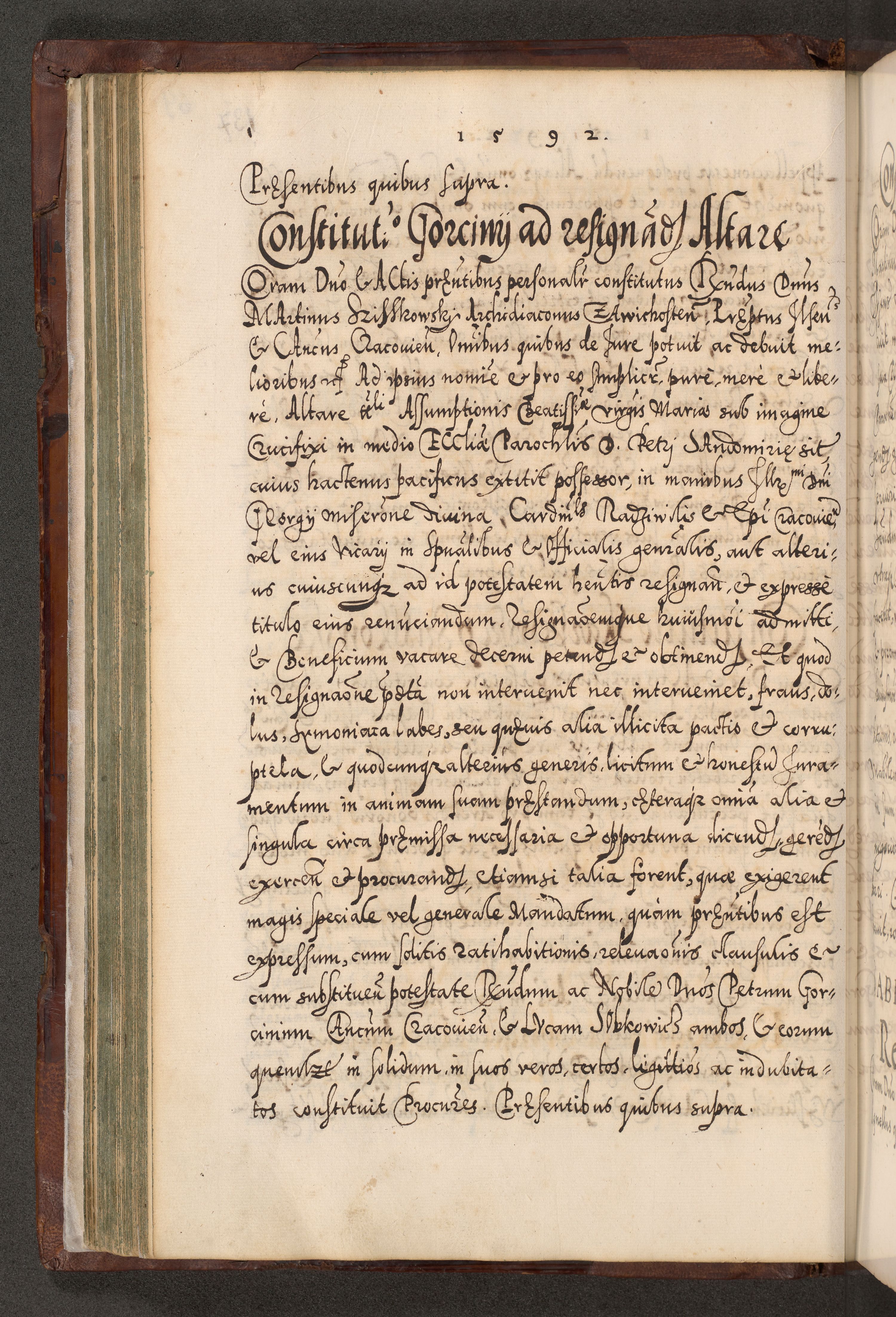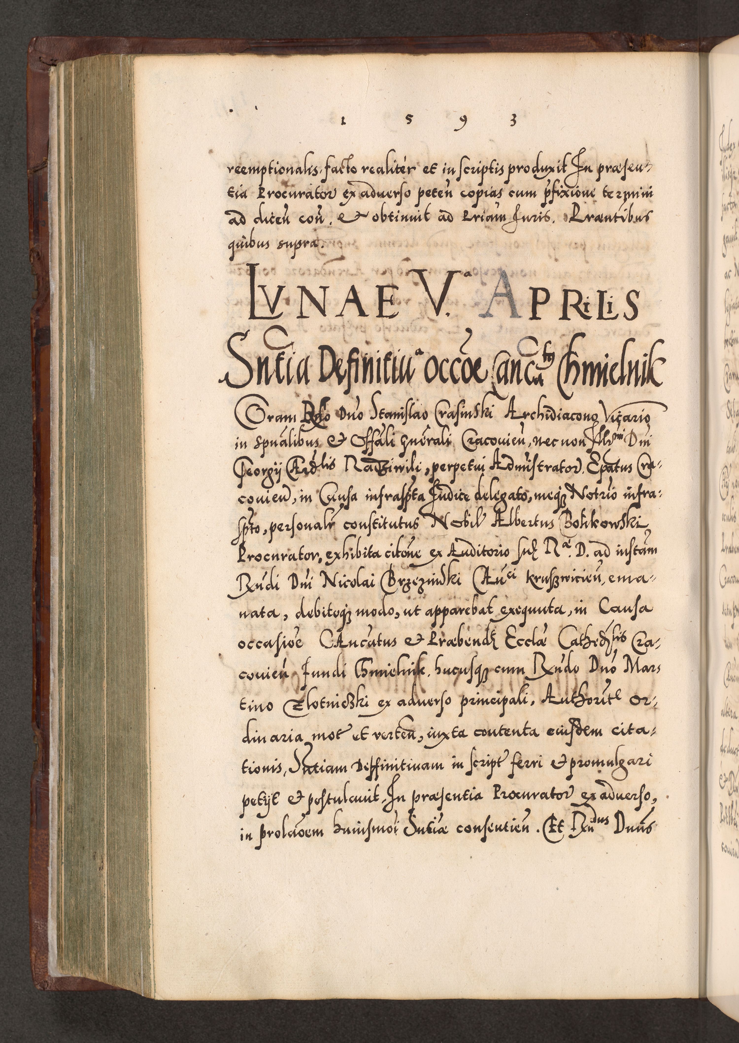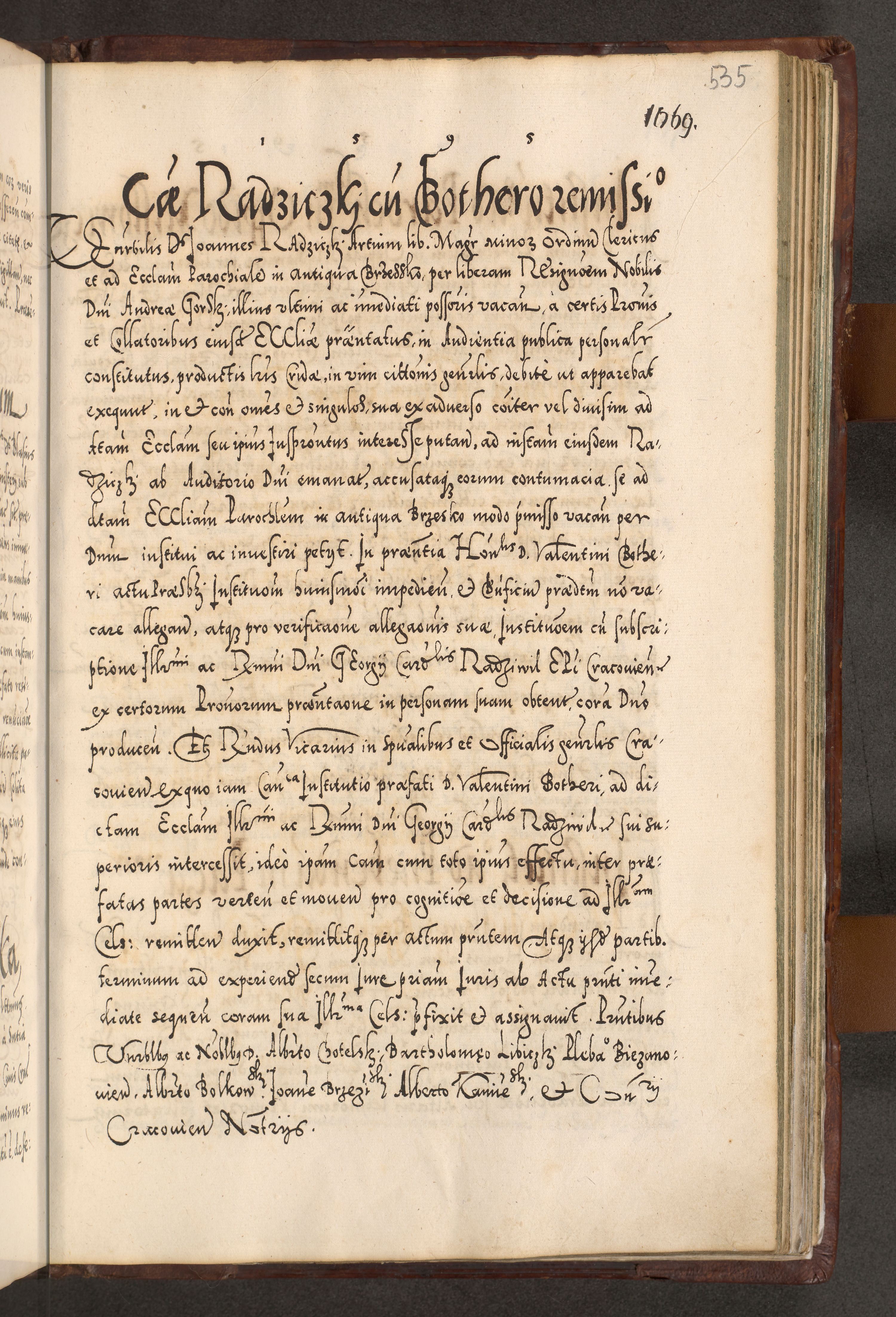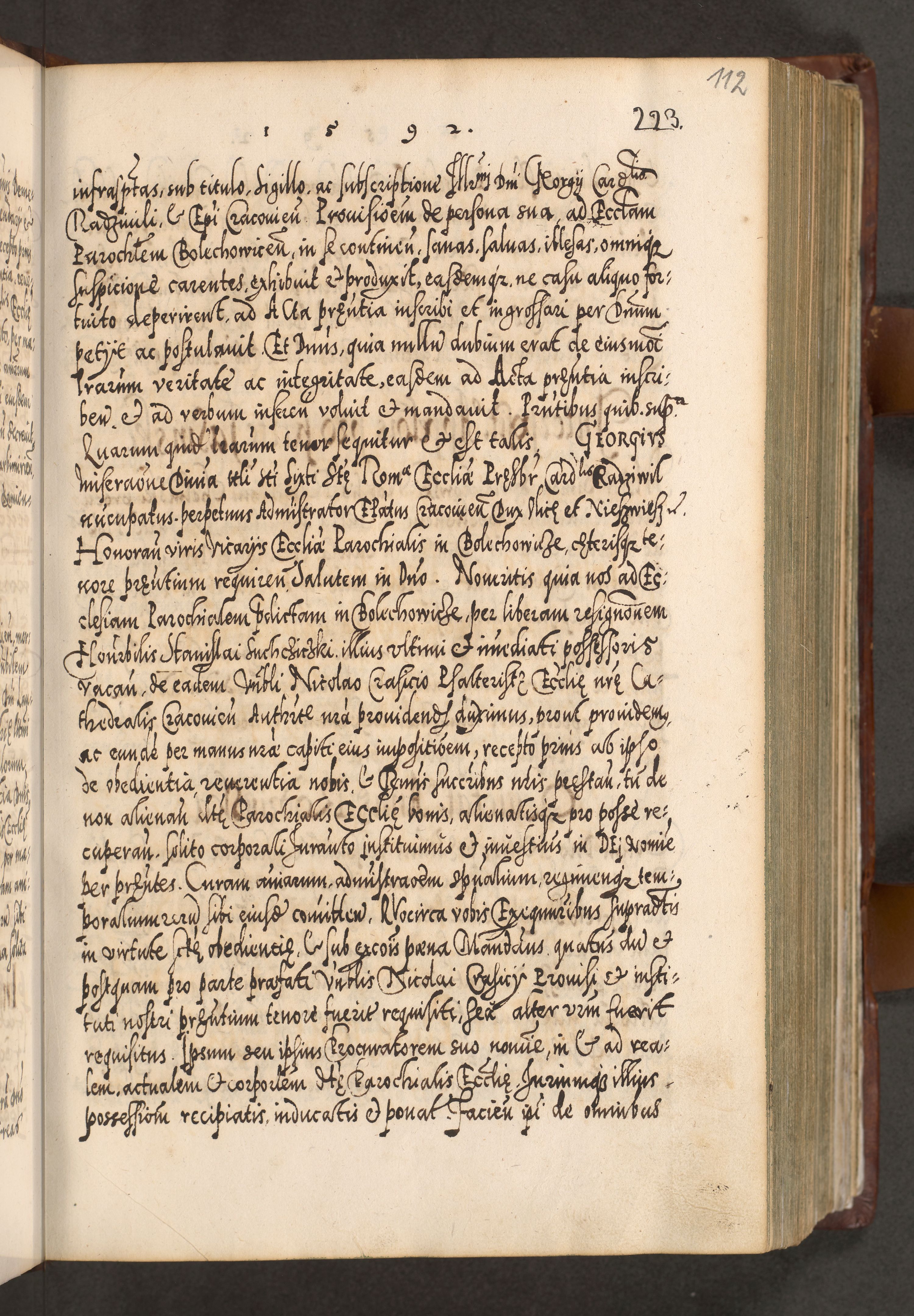 Illistrissimo et revedissimo in Christo Patre Domino Domino Georgio Rzadziwił Miserone Divina Sacrostae R. E. Tituli S. Sixti Presbitero Cardinali Duce in Olyka et Niesswiesz ad Gubernacula Ecclessiae Cracoviensis cuius administratorialem a Sancta Sede Apostolica obtinverat feliciter sedente. Acta actorum, causarum, sententiarum tam deffinitivarum quam interloquutoriarum decretorum, obligationum, quietationum, recognitionum, constitutionum procuratorum etc. coram Reverendo Domino Stanislao Crassinskz de Crasne Archidiacono Cracoviensis, Scholastico Gnesnesis, Custode Plocensis etc. Vicario et Officiali Generali Cracoviensi in Ano Domini Millesimo Quingentesimo Nonagesimo Primo cuius indictio quarta pontificatus SS. Domini Nostri Gregorii XIIII Anno I psius prio feliciter incipiut