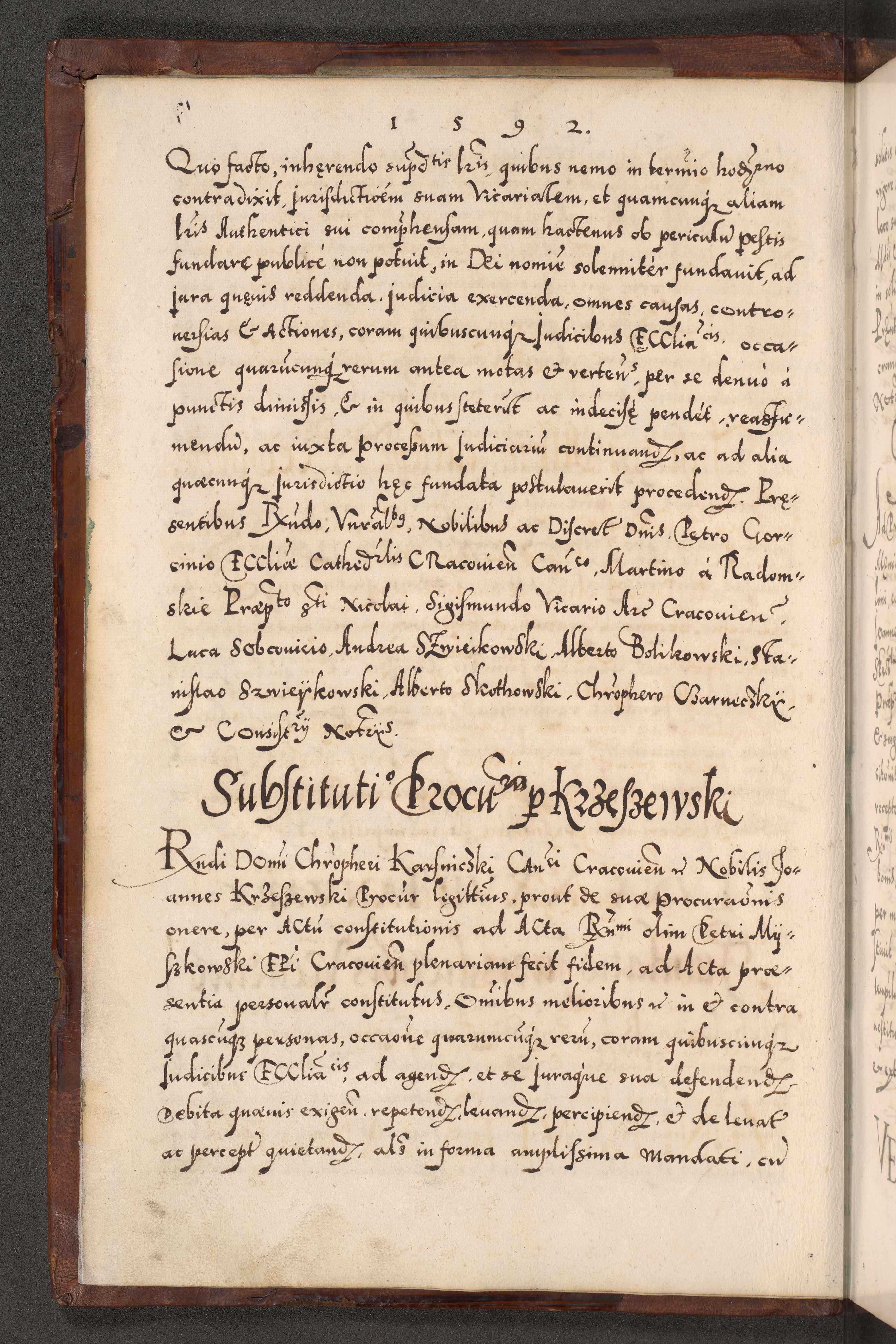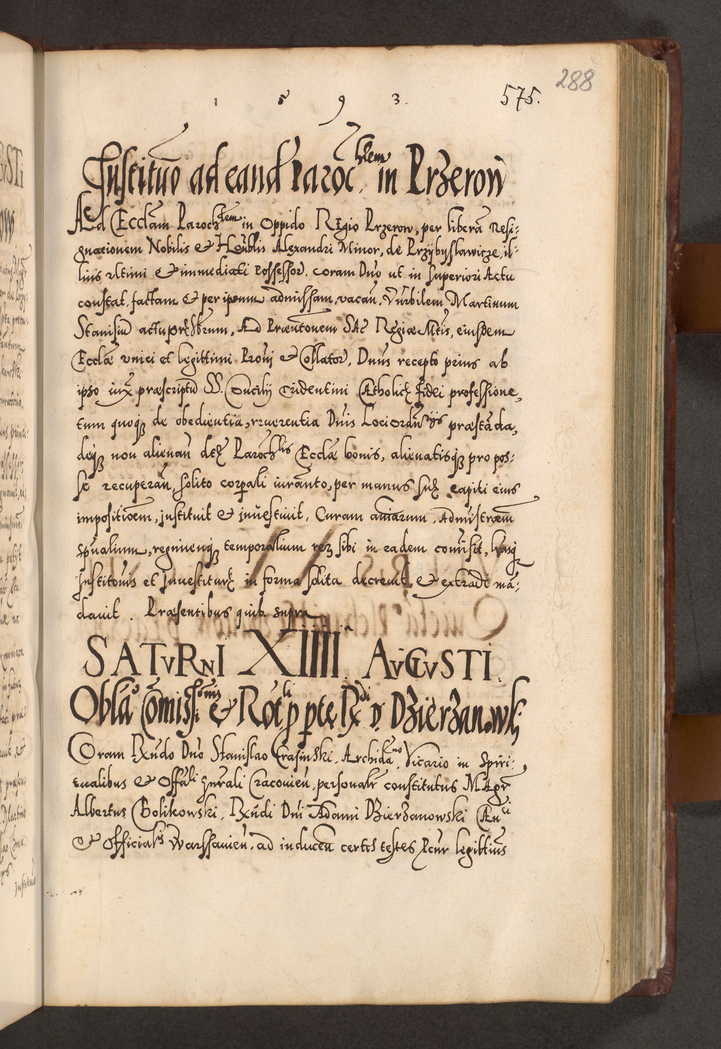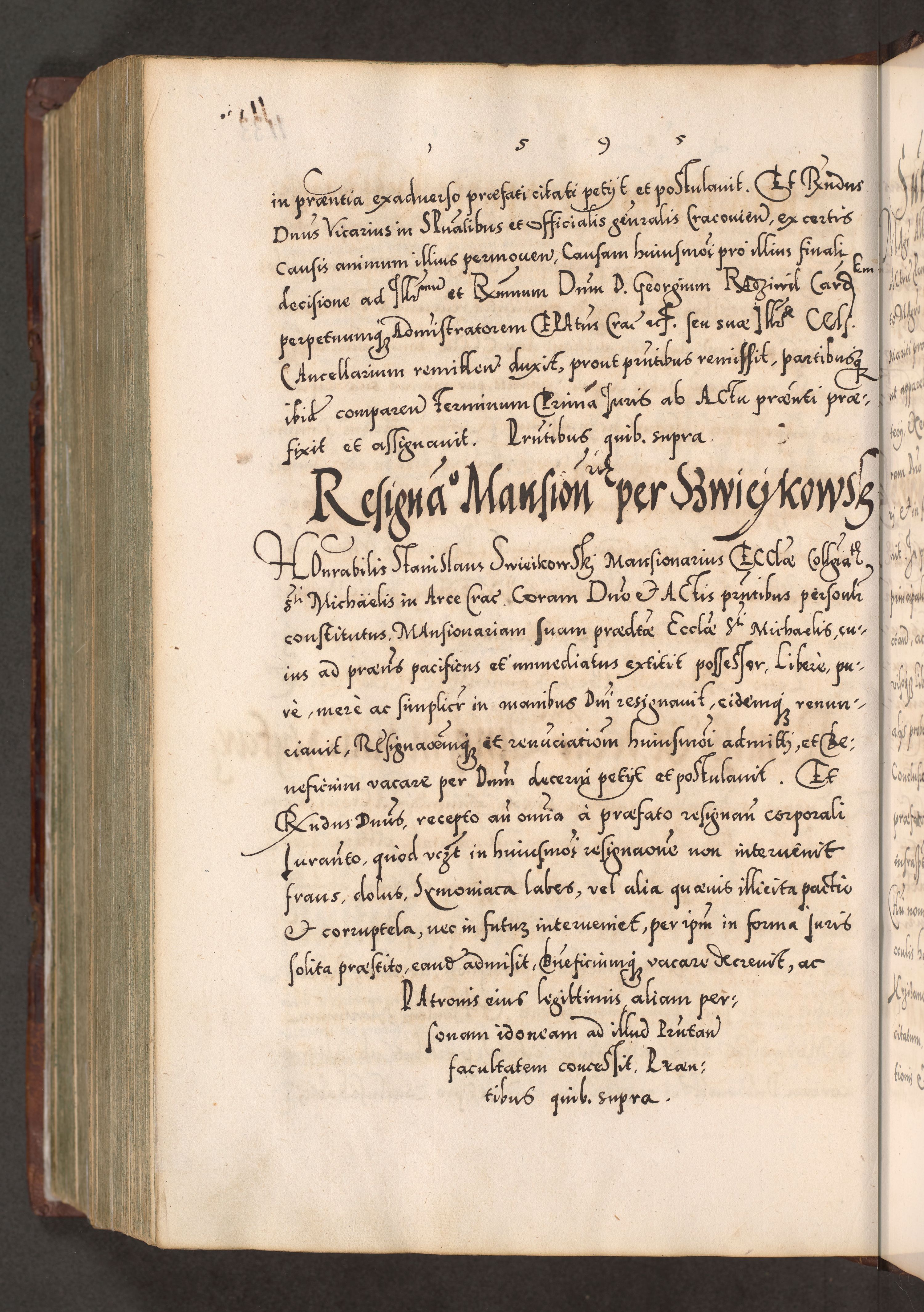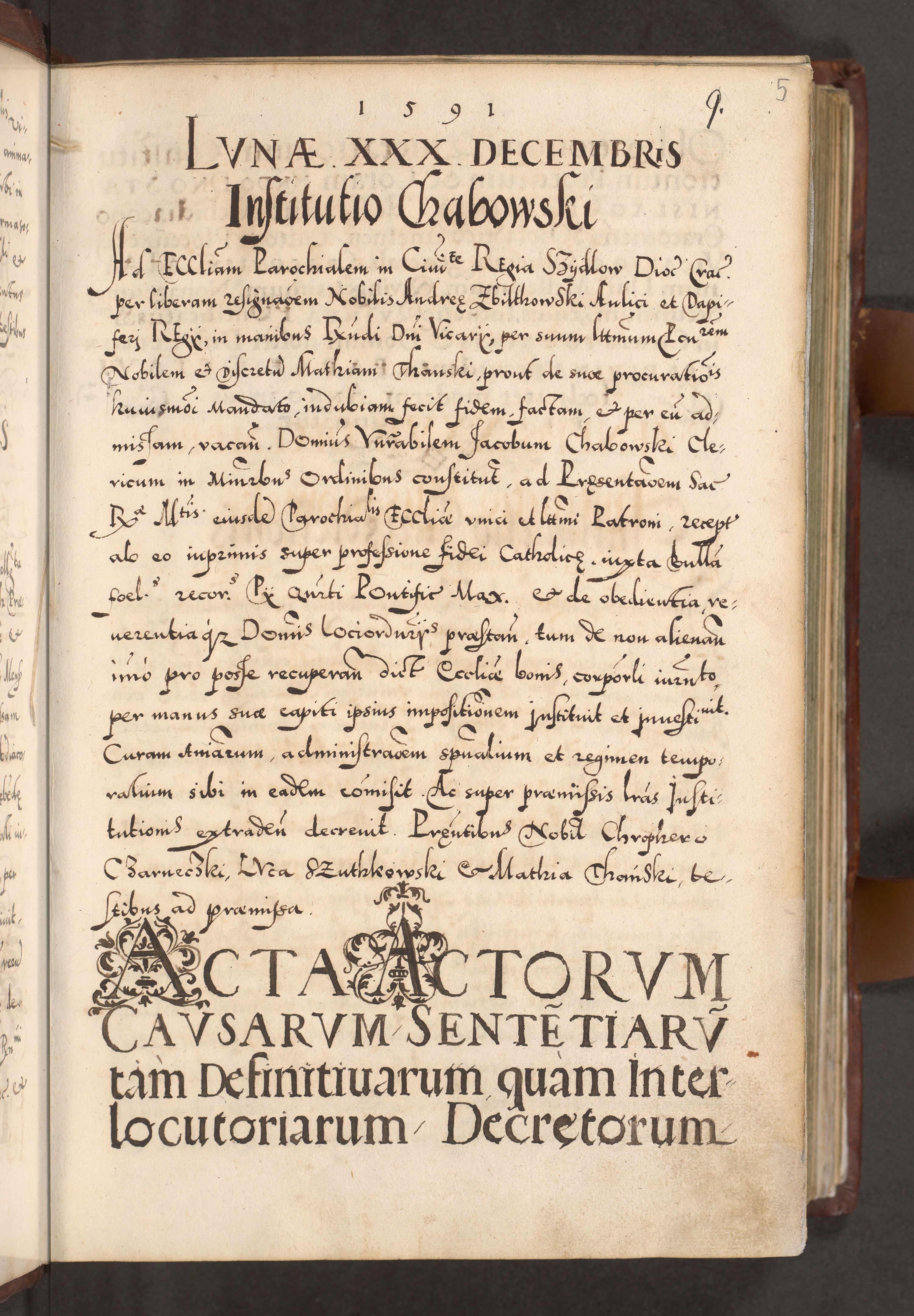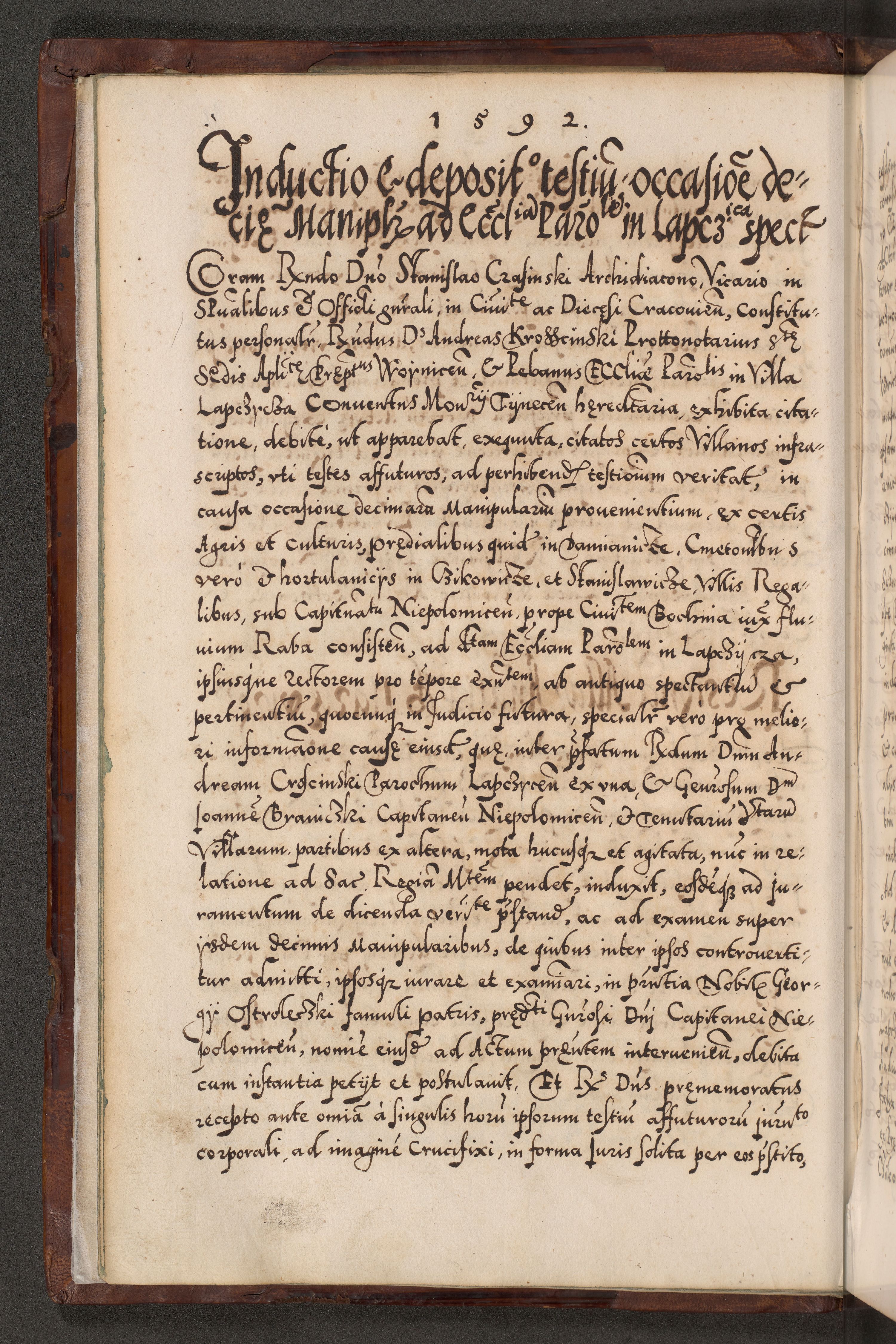 Illistrissimo et revedissimo in Christo Patre Domino Domino Georgio Rzadziwił Miserone Divina Sacrostae R. E. Tituli S. Sixti Presbitero Cardinali Duce in Olyka et Niesswiesz ad Gubernacula Ecclessiae Cracoviensis cuius administratorialem a Sancta Sede Apostolica obtinverat feliciter sedente. Acta actorum, causarum, sententiarum tam deffinitivarum quam interloquutoriarum decretorum, obligationum, quietationum, recognitionum, constitutionum procuratorum etc. coram Reverendo Domino Stanislao Crassinskz de Crasne Archidiacono Cracoviensis, Scholastico Gnesnesis, Custode Plocensis etc. Vicario et Officiali Generali Cracoviensi in Ano Domini Millesimo Quingentesimo Nonagesimo Primo cuius indictio quarta pontificatus SS. Domini Nostri Gregorii XIIII Anno I psius prio feliciter incipiut