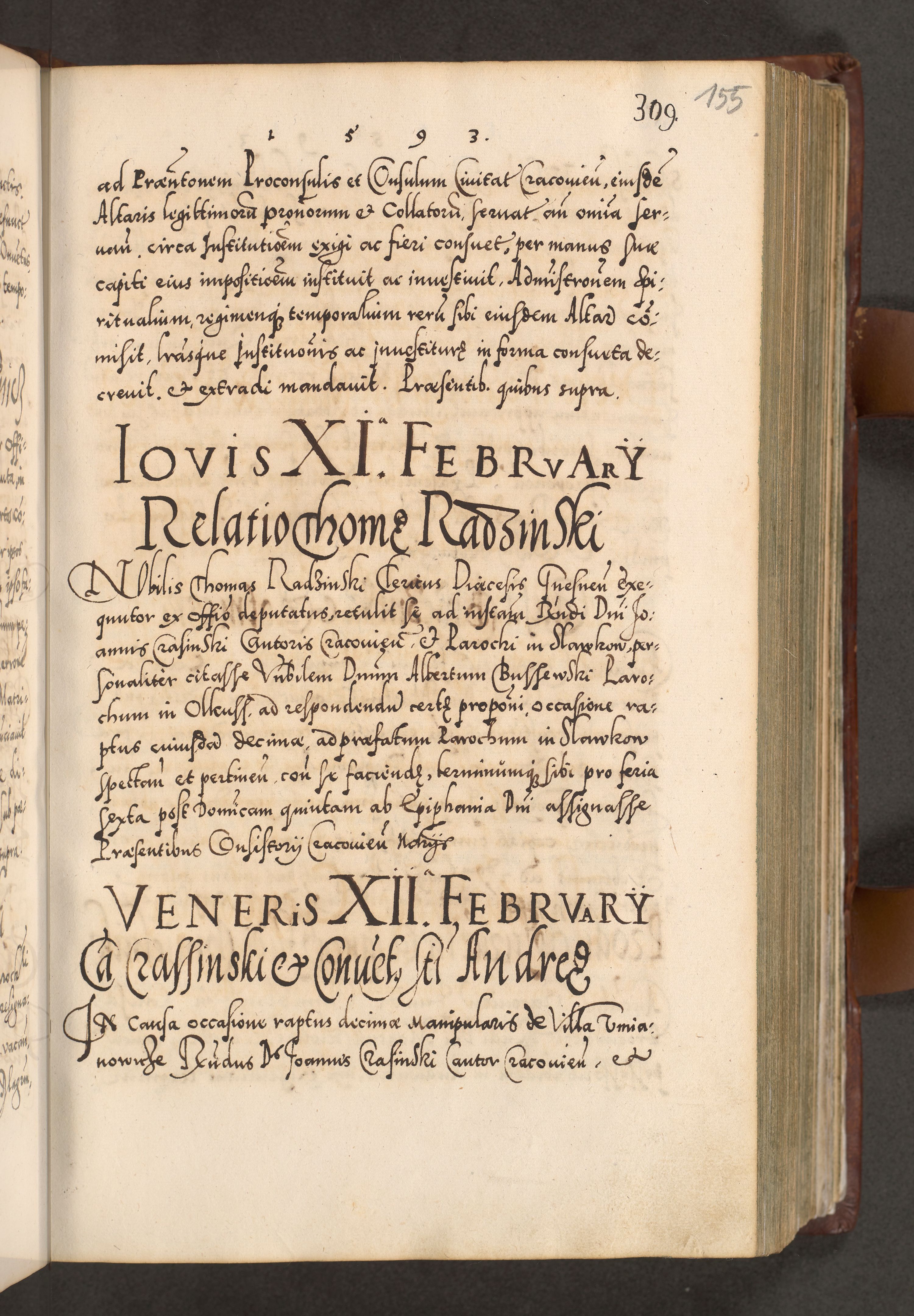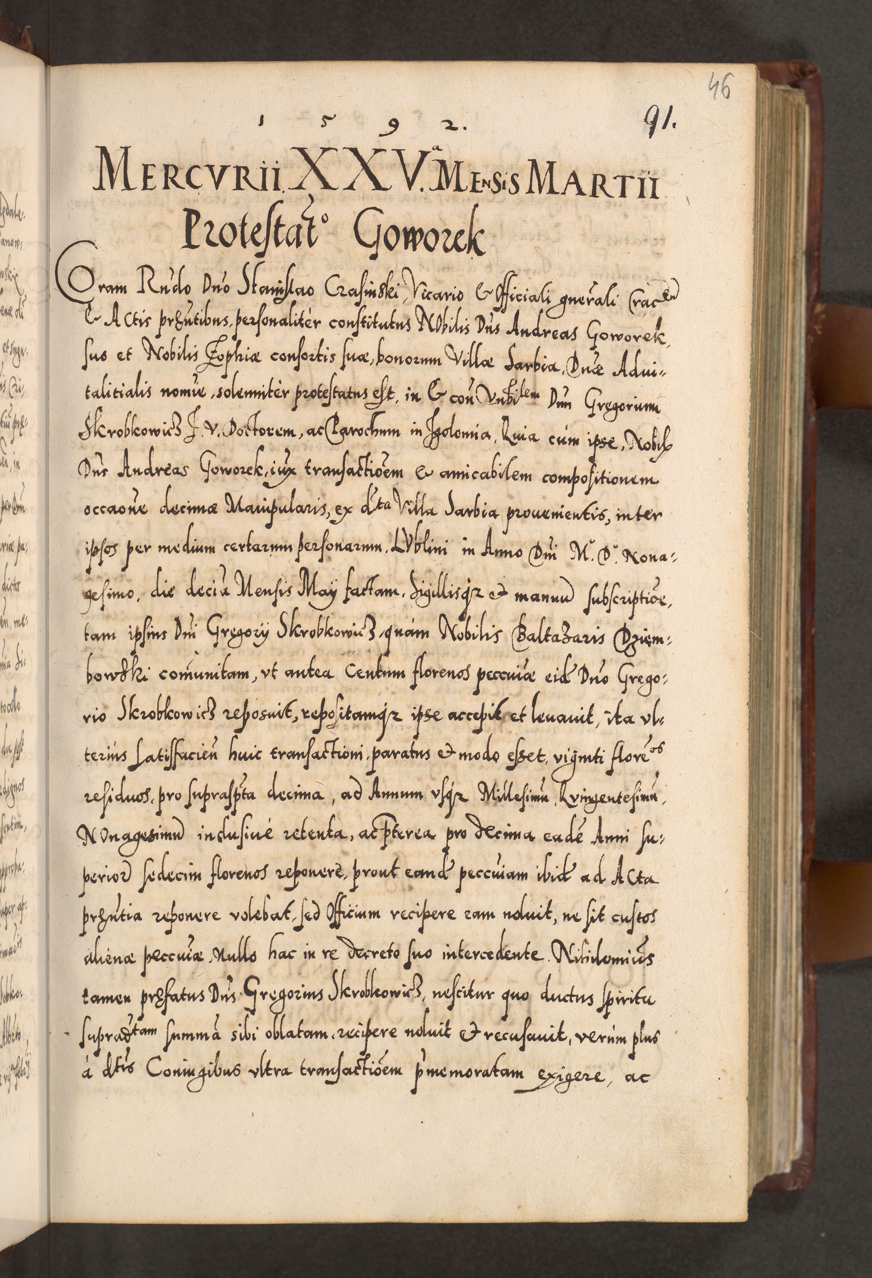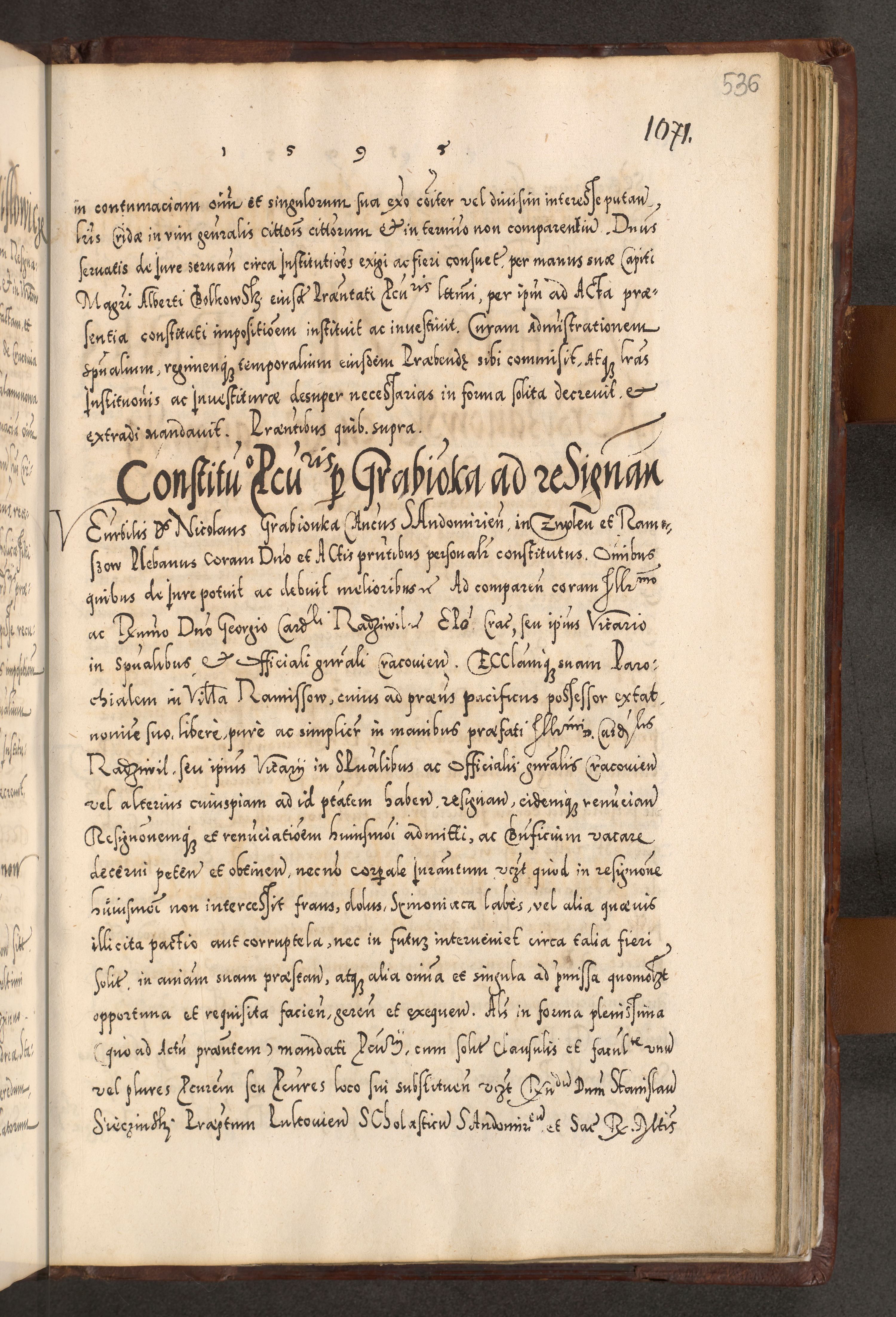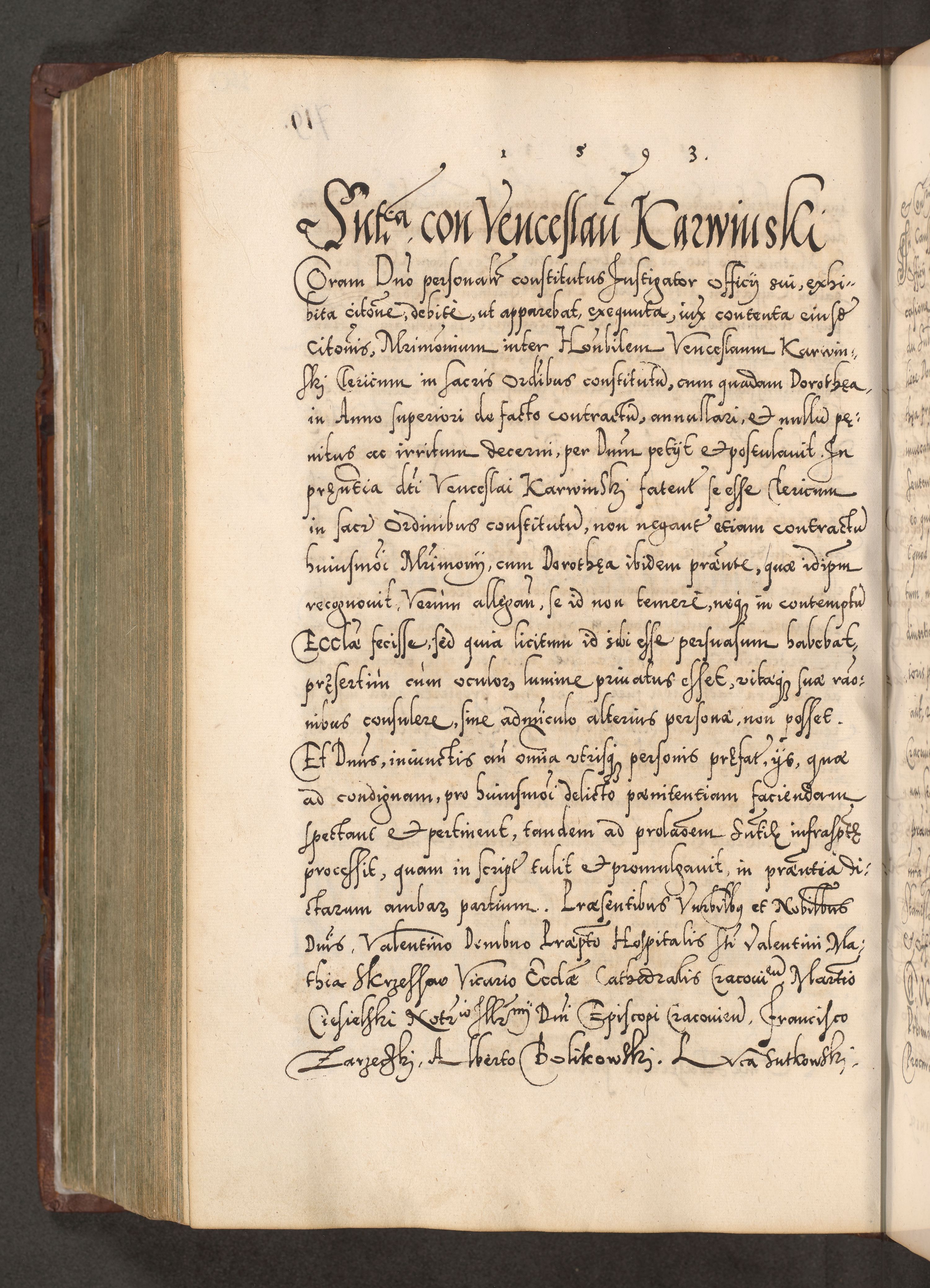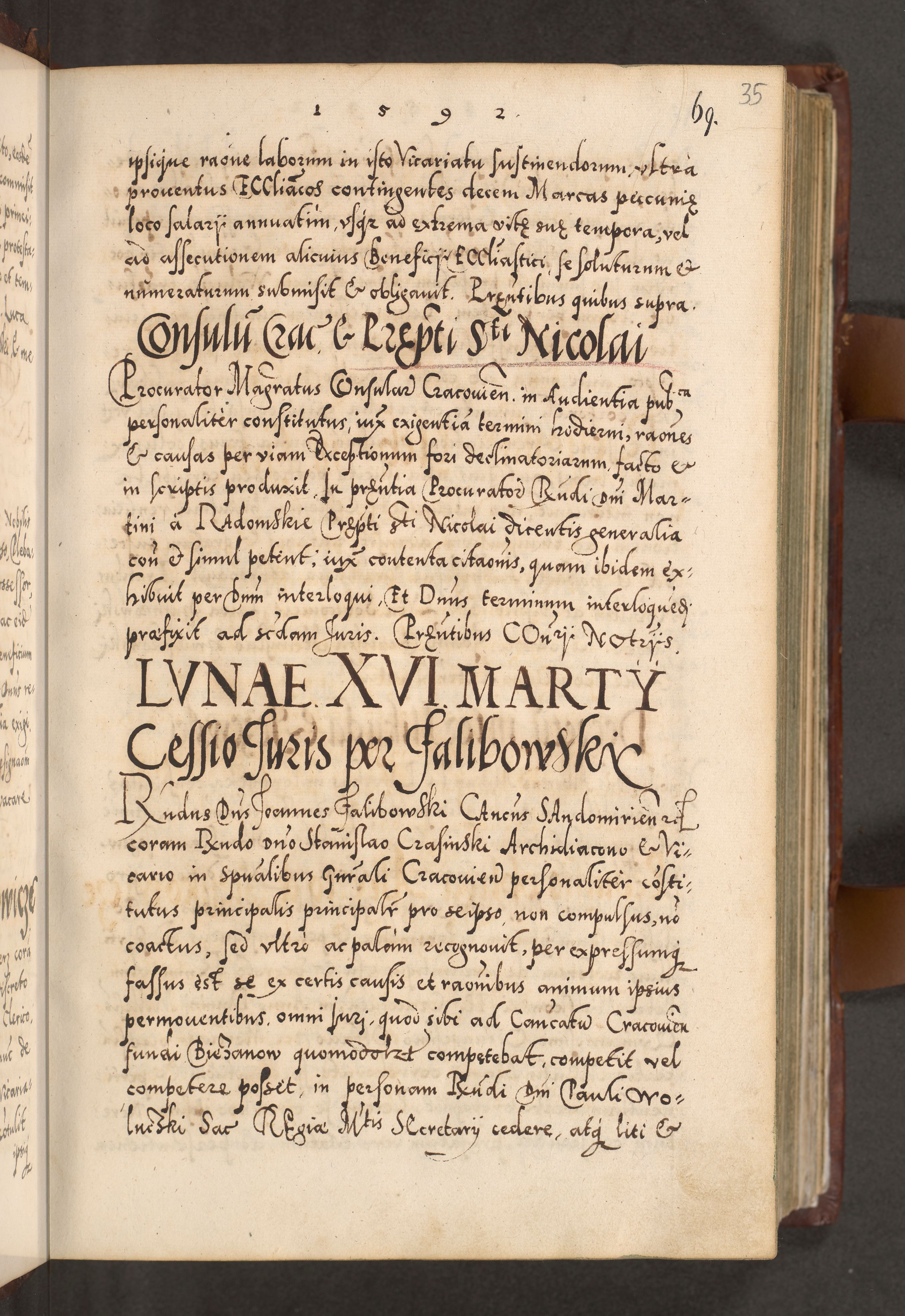 Illistrissimo et revedissimo in Christo Patre Domino Domino Georgio Rzadziwił Miserone Divina Sacrostae R. E. Tituli S. Sixti Presbitero Cardinali Duce in Olyka et Niesswiesz ad Gubernacula Ecclessiae Cracoviensis cuius administratorialem a Sancta Sede Apostolica obtinverat feliciter sedente. Acta actorum, causarum, sententiarum tam deffinitivarum quam interloquutoriarum decretorum, obligationum, quietationum, recognitionum, constitutionum procuratorum etc. coram Reverendo Domino Stanislao Crassinskz de Crasne Archidiacono Cracoviensis, Scholastico Gnesnesis, Custode Plocensis etc. Vicario et Officiali Generali Cracoviensi in Ano Domini Millesimo Quingentesimo Nonagesimo Primo cuius indictio quarta pontificatus SS. Domini Nostri Gregorii XIIII Anno I psius prio feliciter incipiut