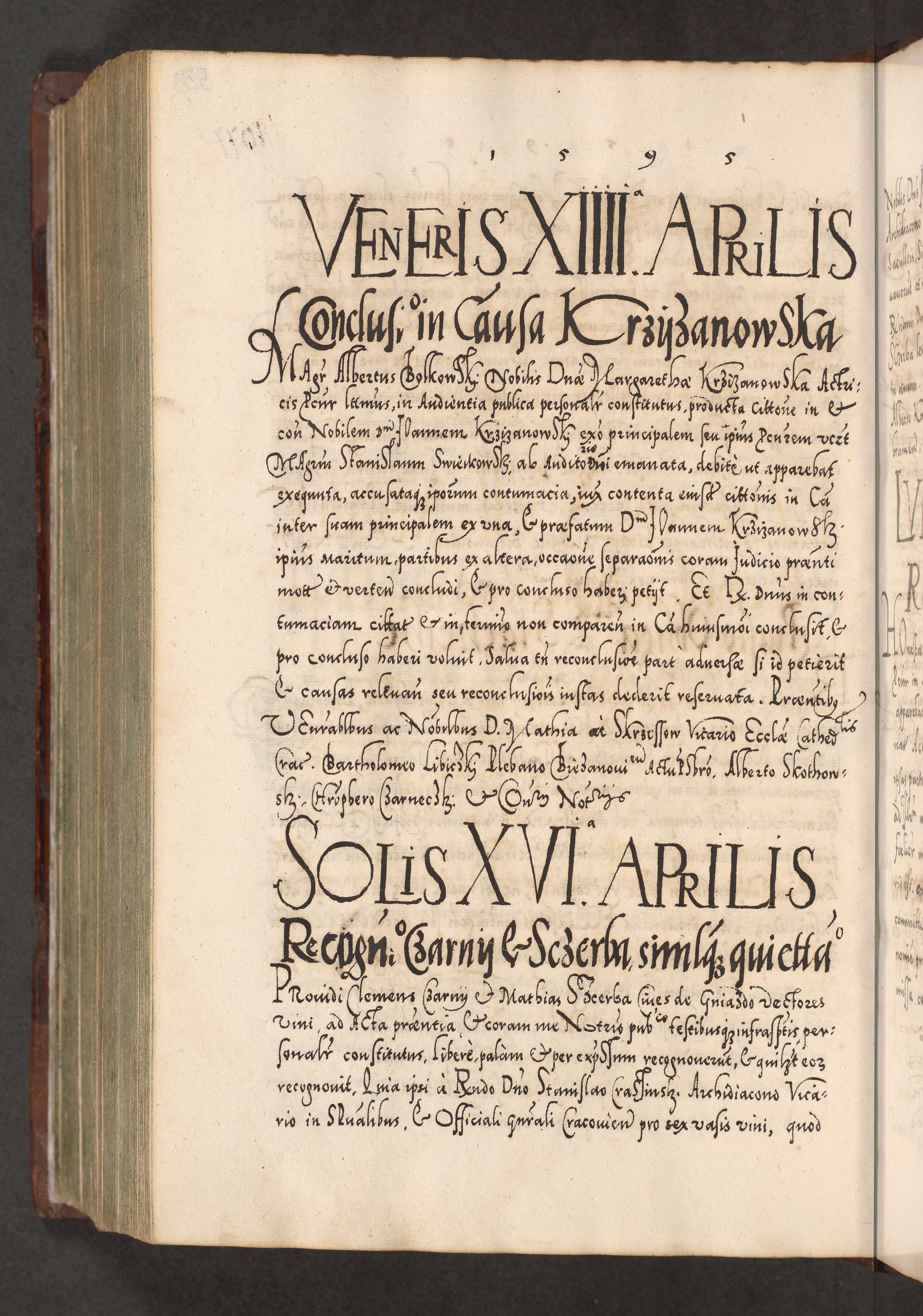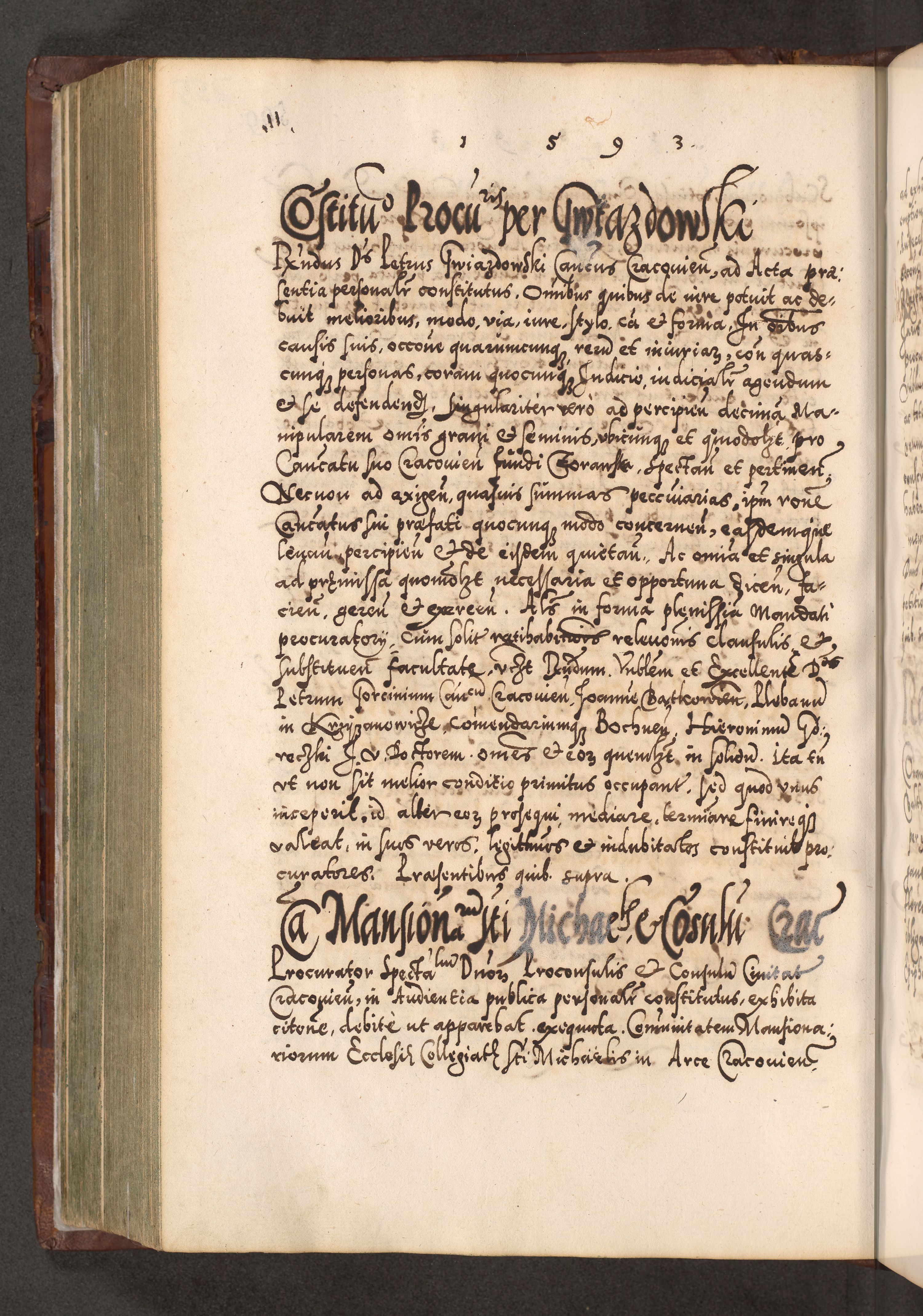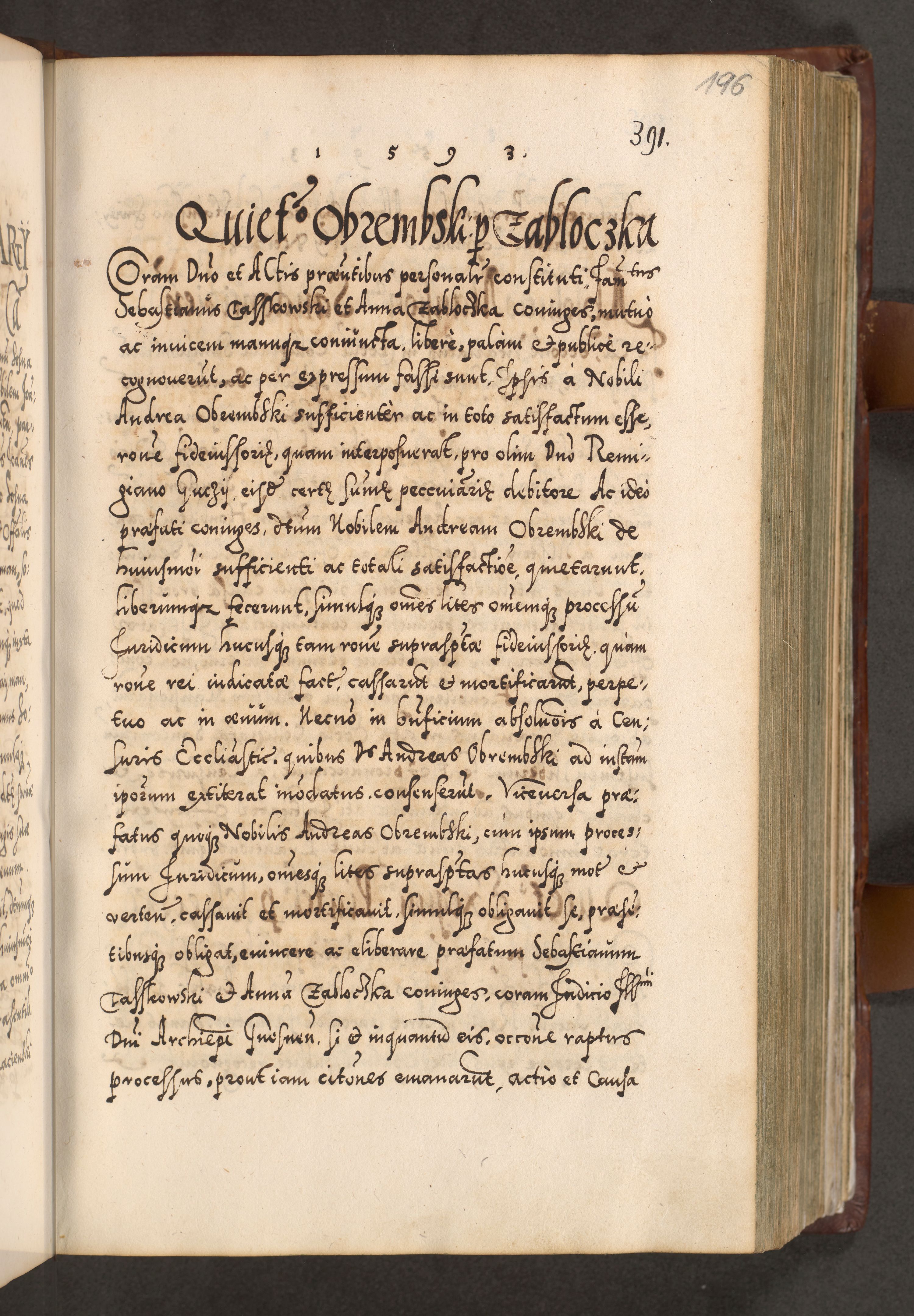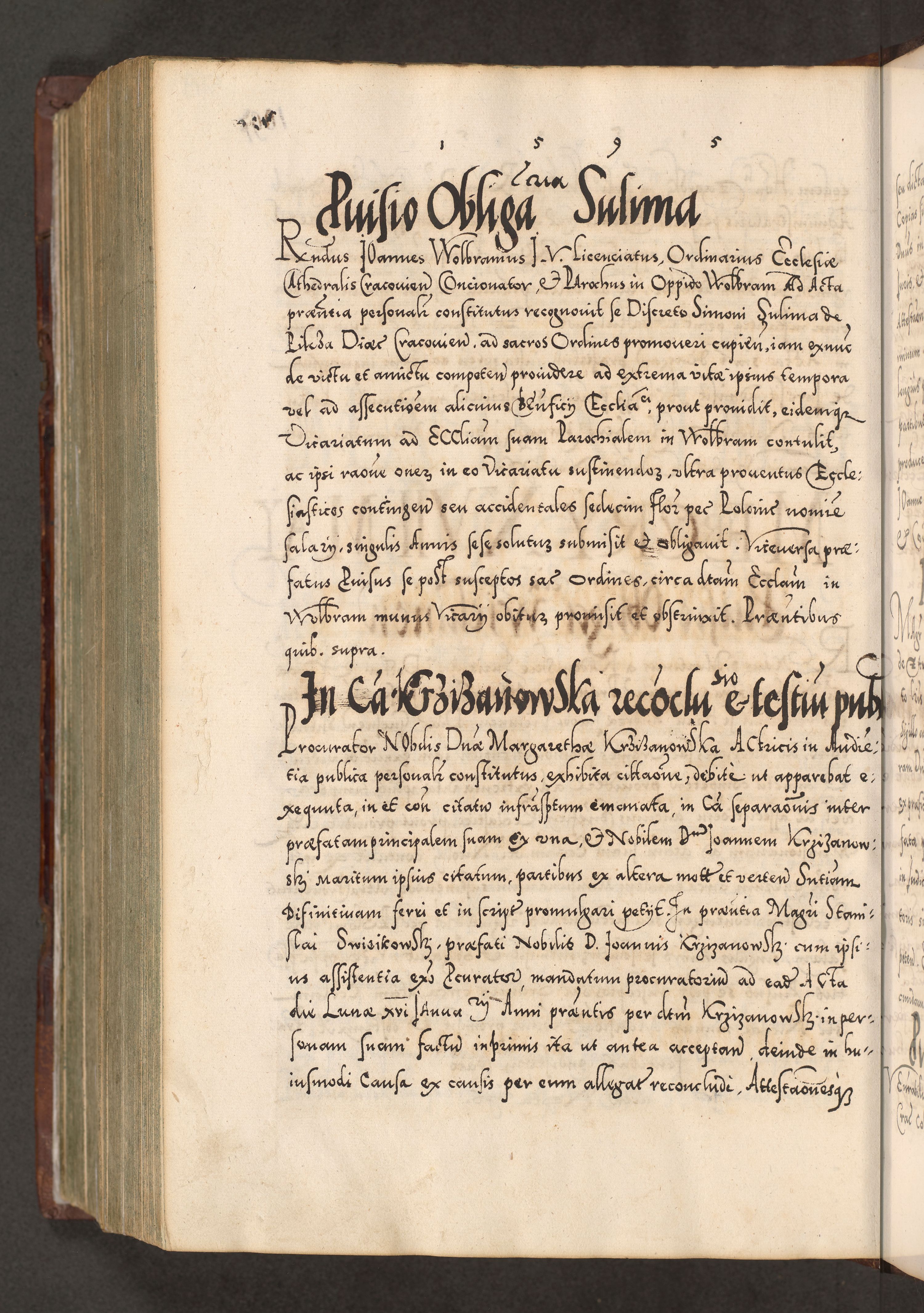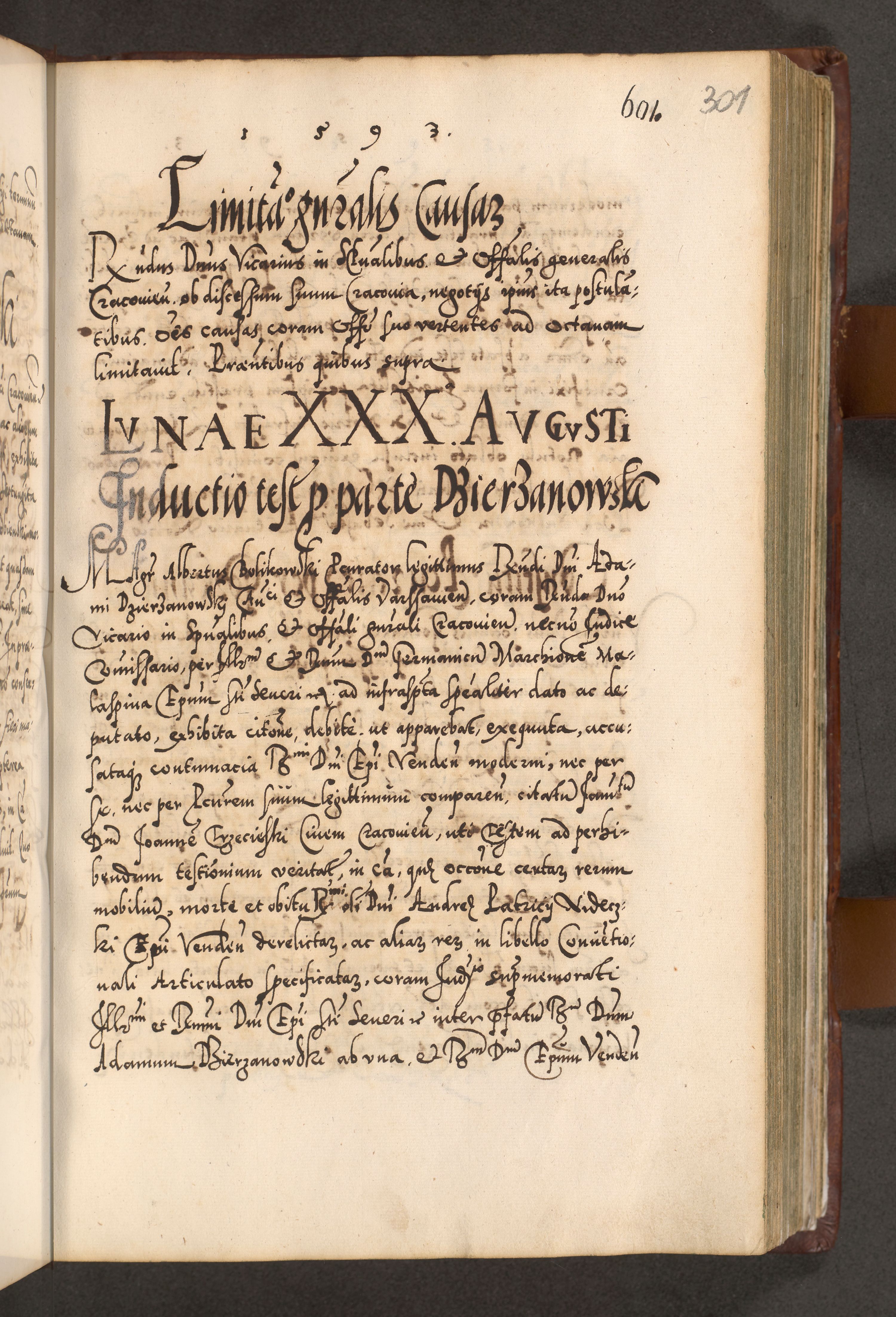Illistrissimo et revedissimo in Christo Patre Domino Domino Georgio Rzadziwił Miserone Divina Sacrostae R. E. Tituli S. Sixti Presbitero Cardinali Duce in Olyka et Niesswiesz ad Gubernacula Ecclessiae Cracoviensis cuius administratorialem a Sancta Sede Apostolica obtinverat feliciter sedente. Acta actorum, causarum, sententiarum tam deffinitivarum quam interloquutoriarum decretorum, obligationum, quietationum, recognitionum, constitutionum procuratorum etc. coram Reverendo Domino Stanislao Crassinskz de Crasne Archidiacono Cracoviensis, Scholastico Gnesnesis, Custode Plocensis etc. Vicario et Officiali Generali Cracoviensi in Ano Domini Millesimo Quingentesimo Nonagesimo Primo cuius indictio quarta pontificatus SS. Domini Nostri Gregorii XIIII Anno I psius prio feliciter incipiut