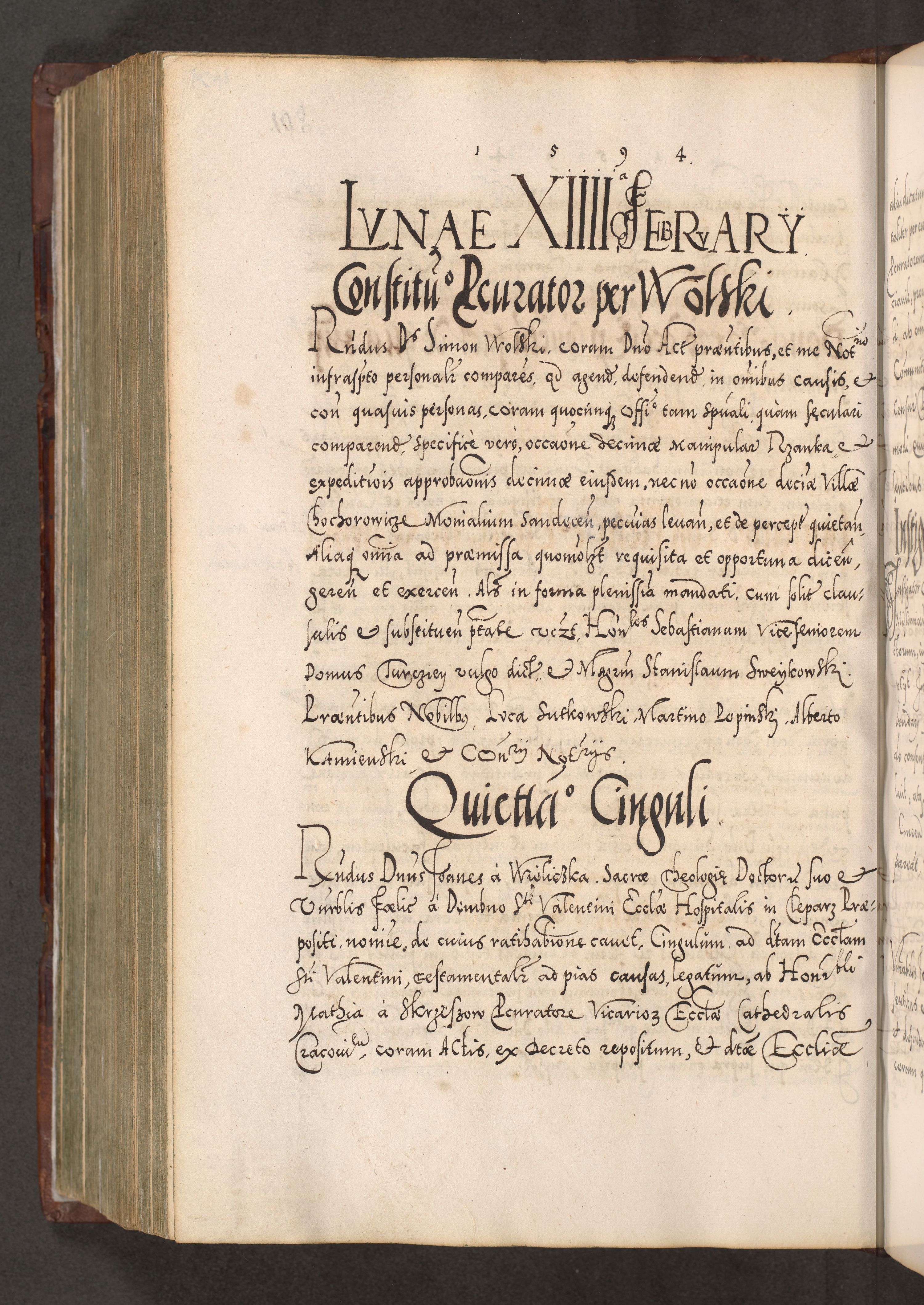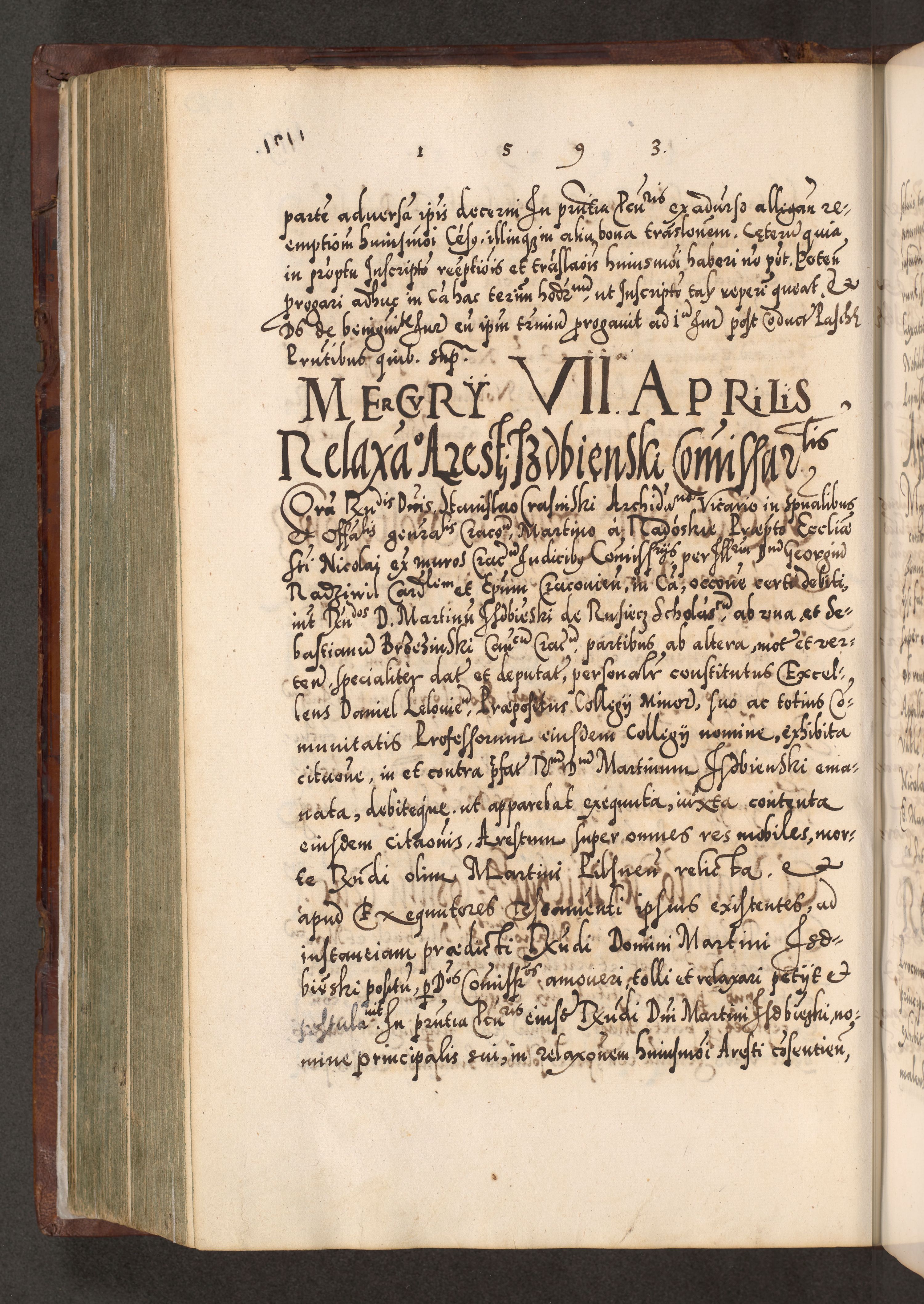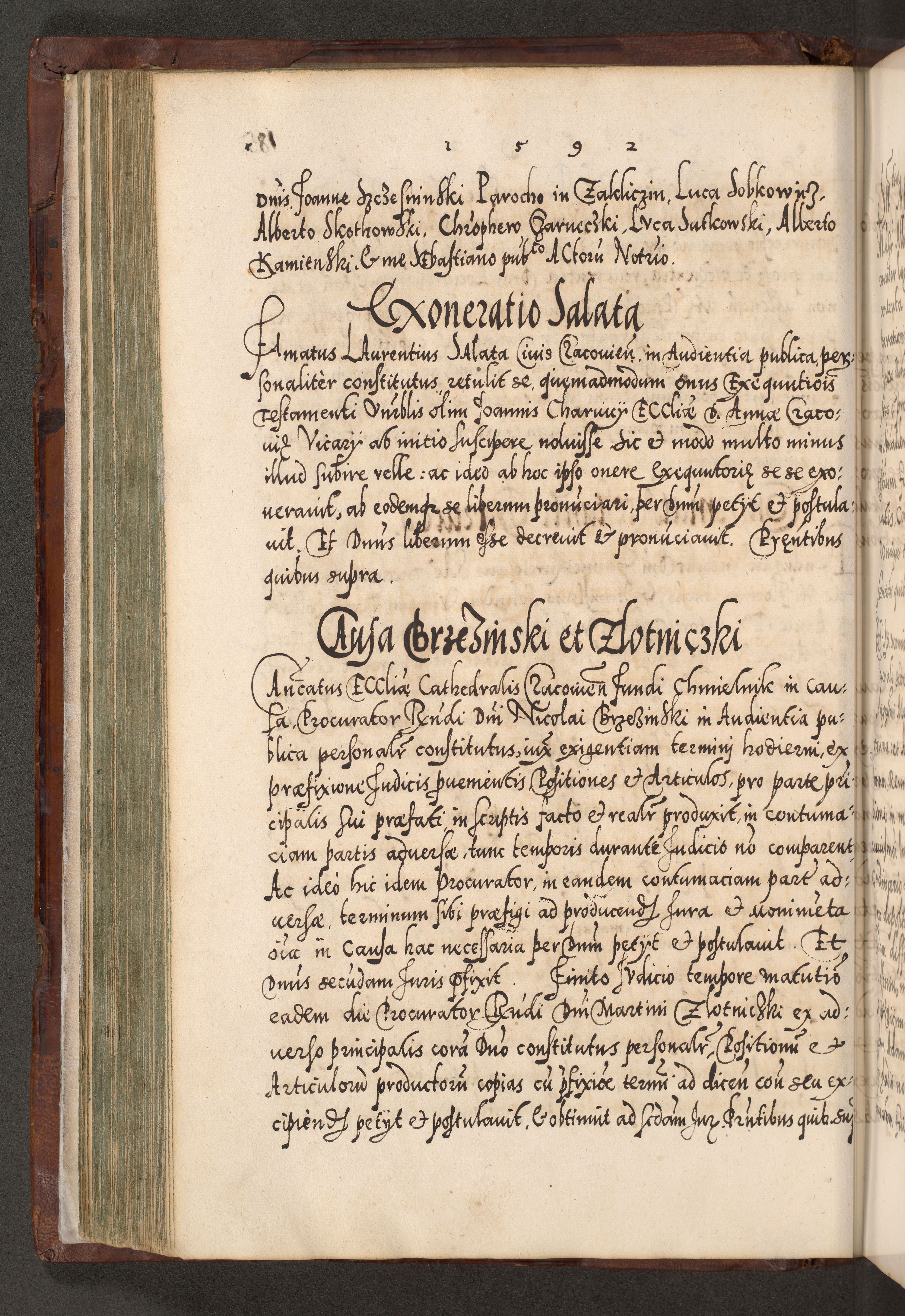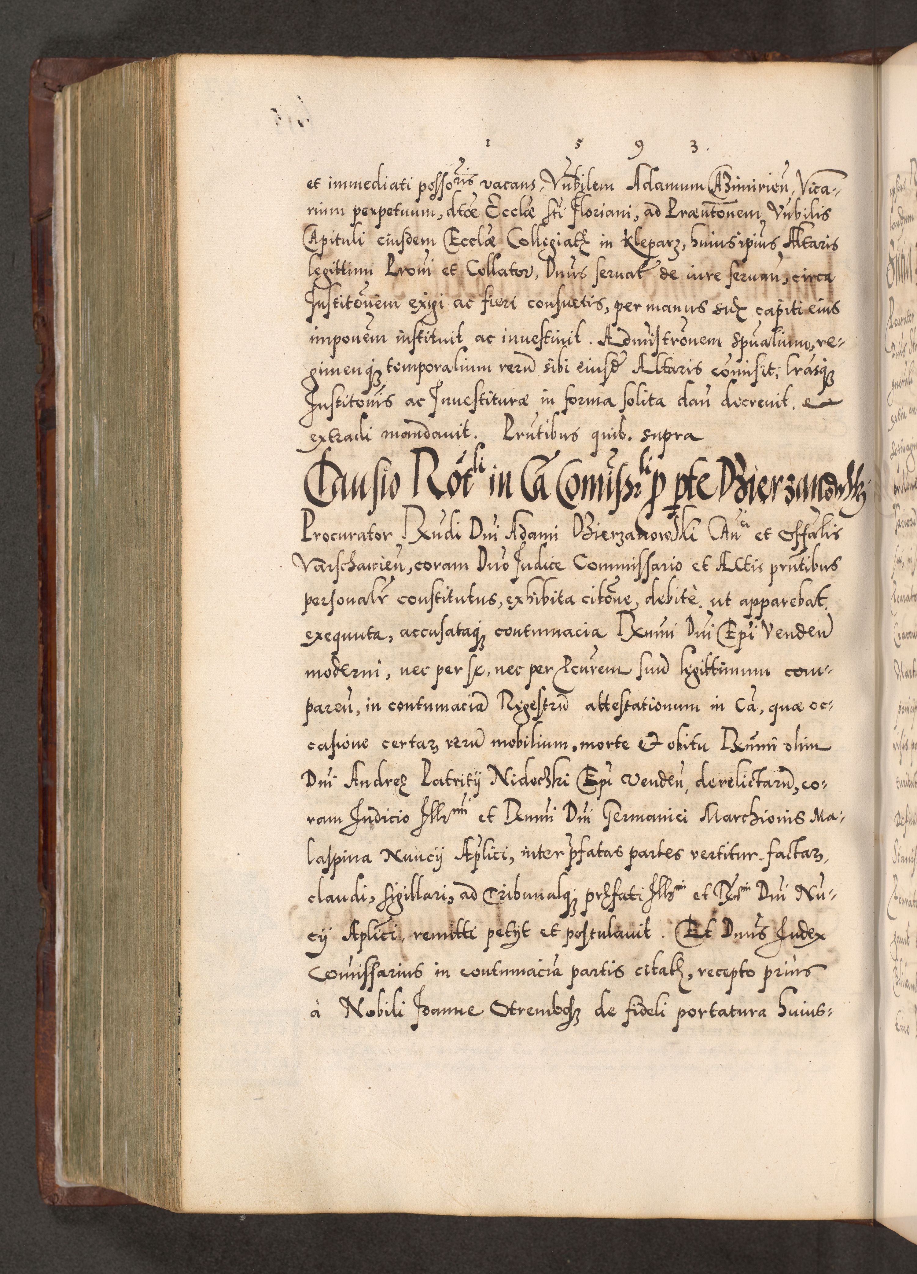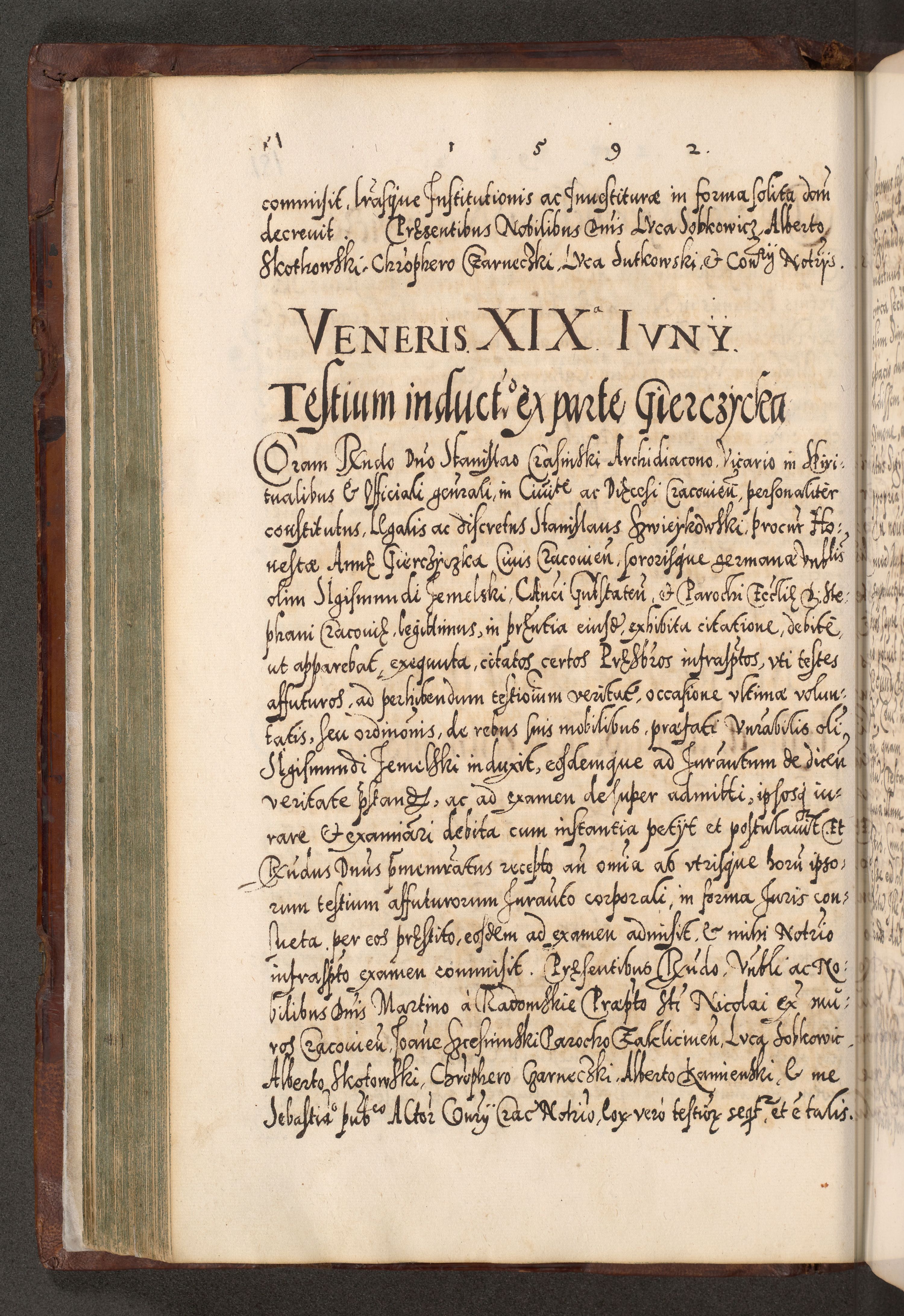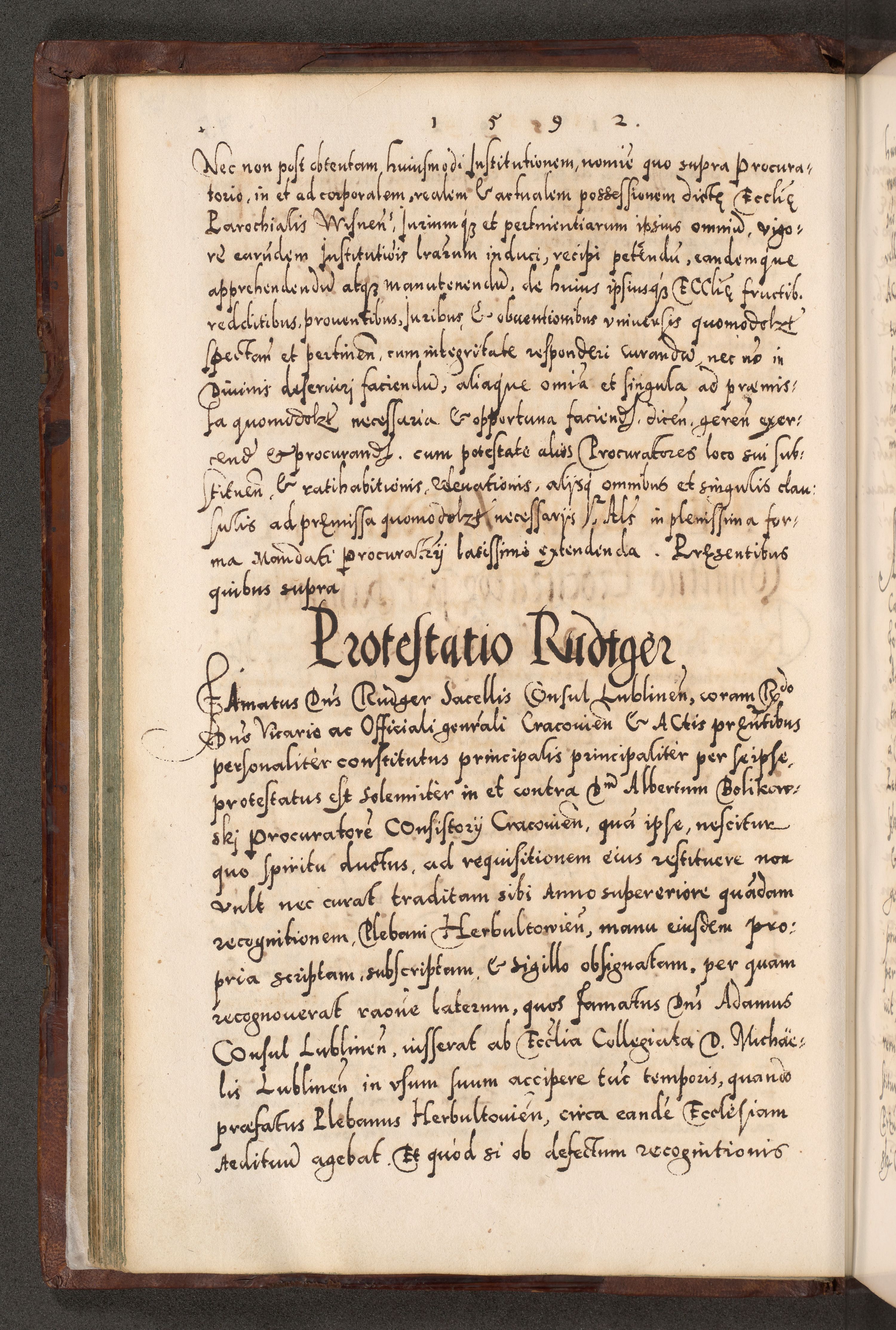 Illistrissimo et revedissimo in Christo Patre Domino Domino Georgio Rzadziwił Miserone Divina Sacrostae R. E. Tituli S. Sixti Presbitero Cardinali Duce in Olyka et Niesswiesz ad Gubernacula Ecclessiae Cracoviensis cuius administratorialem a Sancta Sede Apostolica obtinverat feliciter sedente. Acta actorum, causarum, sententiarum tam deffinitivarum quam interloquutoriarum decretorum, obligationum, quietationum, recognitionum, constitutionum procuratorum etc. coram Reverendo Domino Stanislao Crassinskz de Crasne Archidiacono Cracoviensis, Scholastico Gnesnesis, Custode Plocensis etc. Vicario et Officiali Generali Cracoviensi in Ano Domini Millesimo Quingentesimo Nonagesimo Primo cuius indictio quarta pontificatus SS. Domini Nostri Gregorii XIIII Anno I psius prio feliciter incipiut