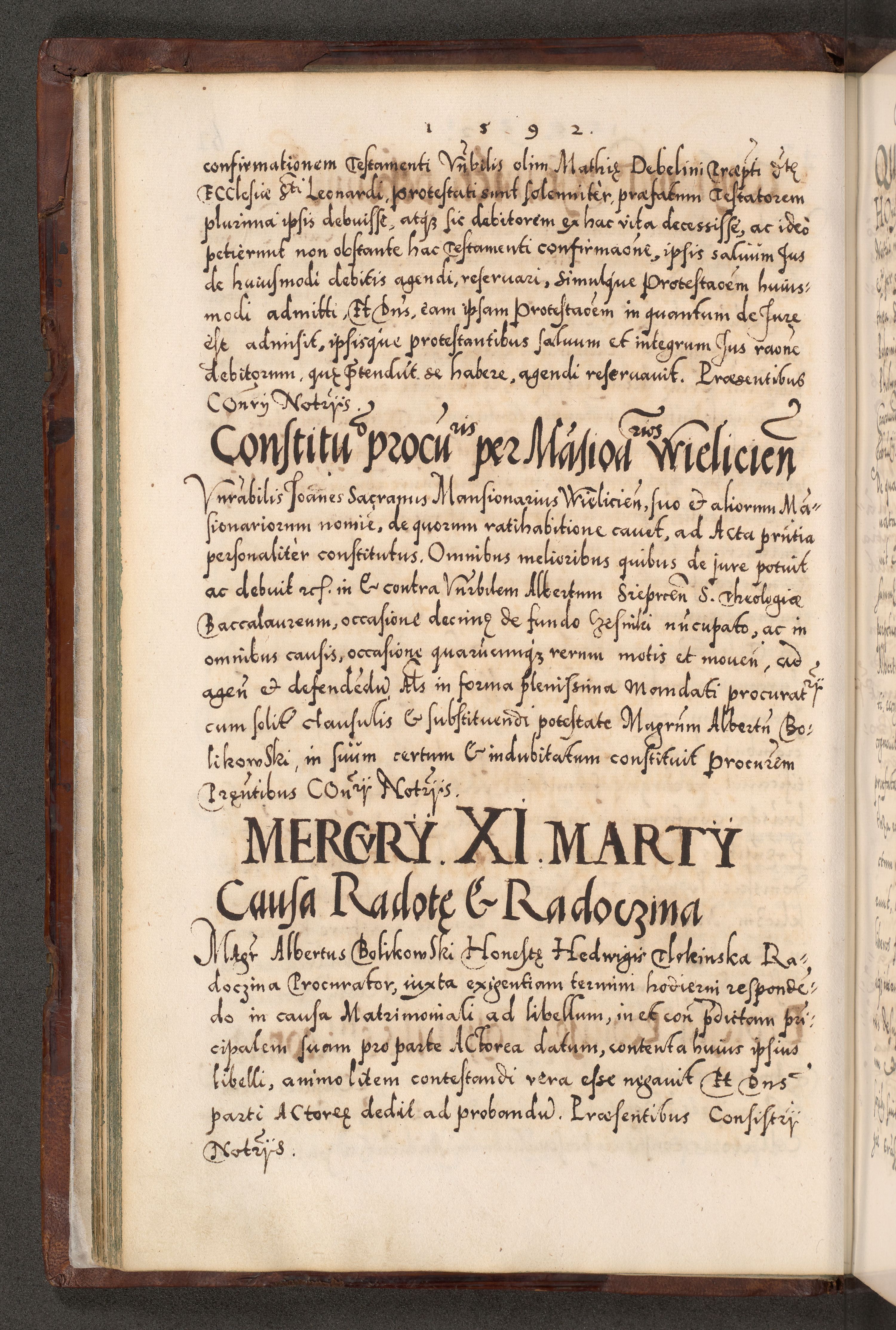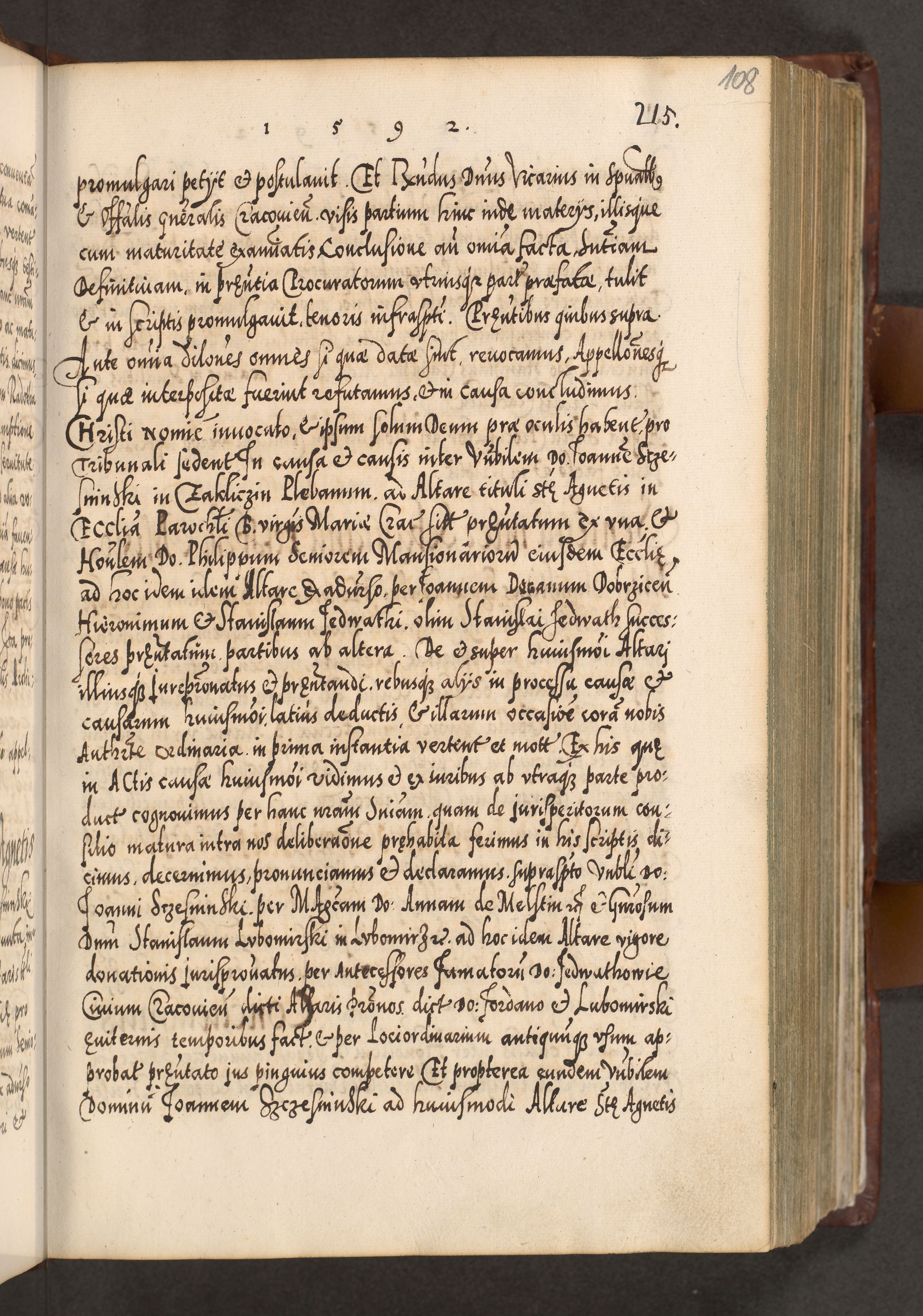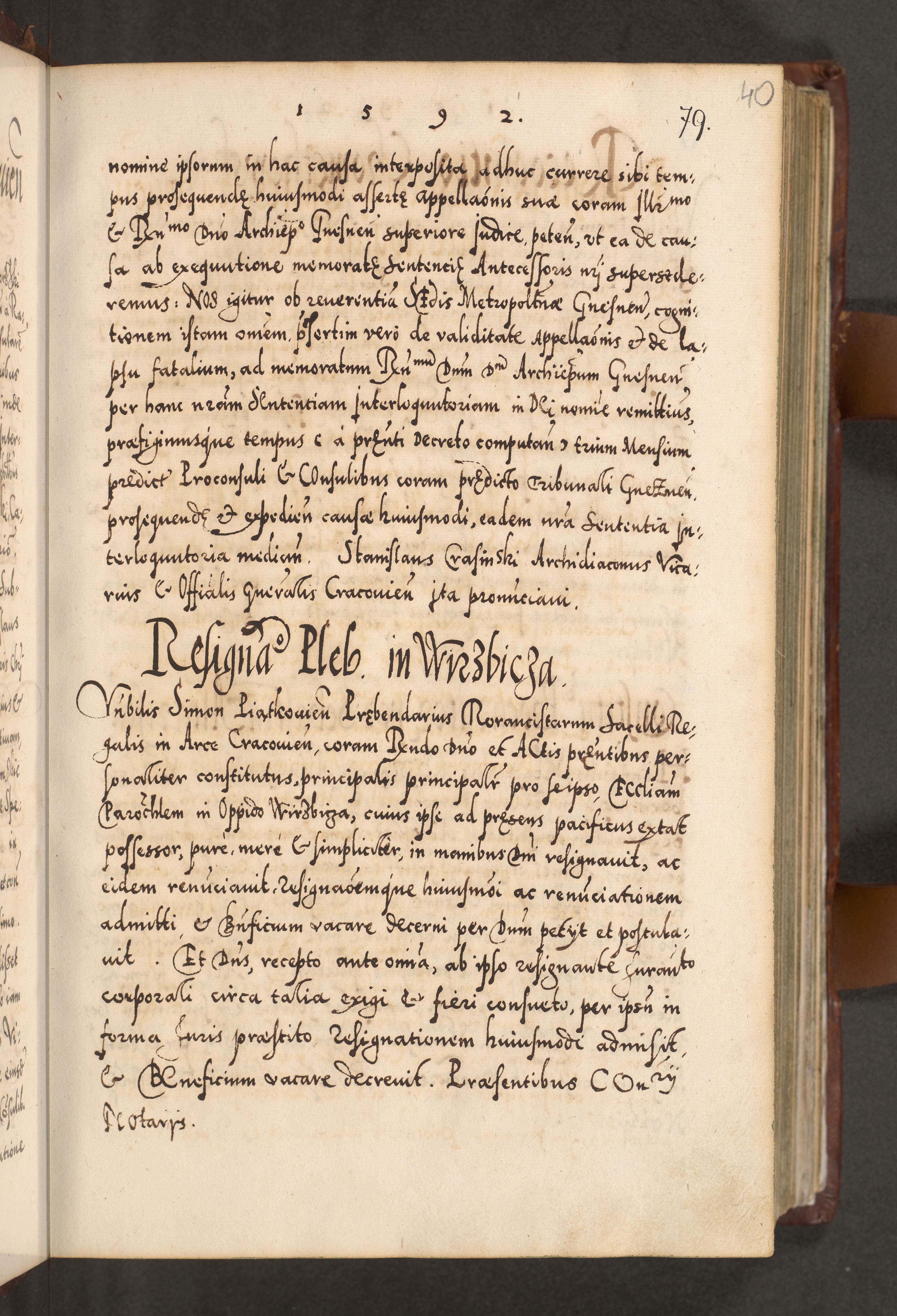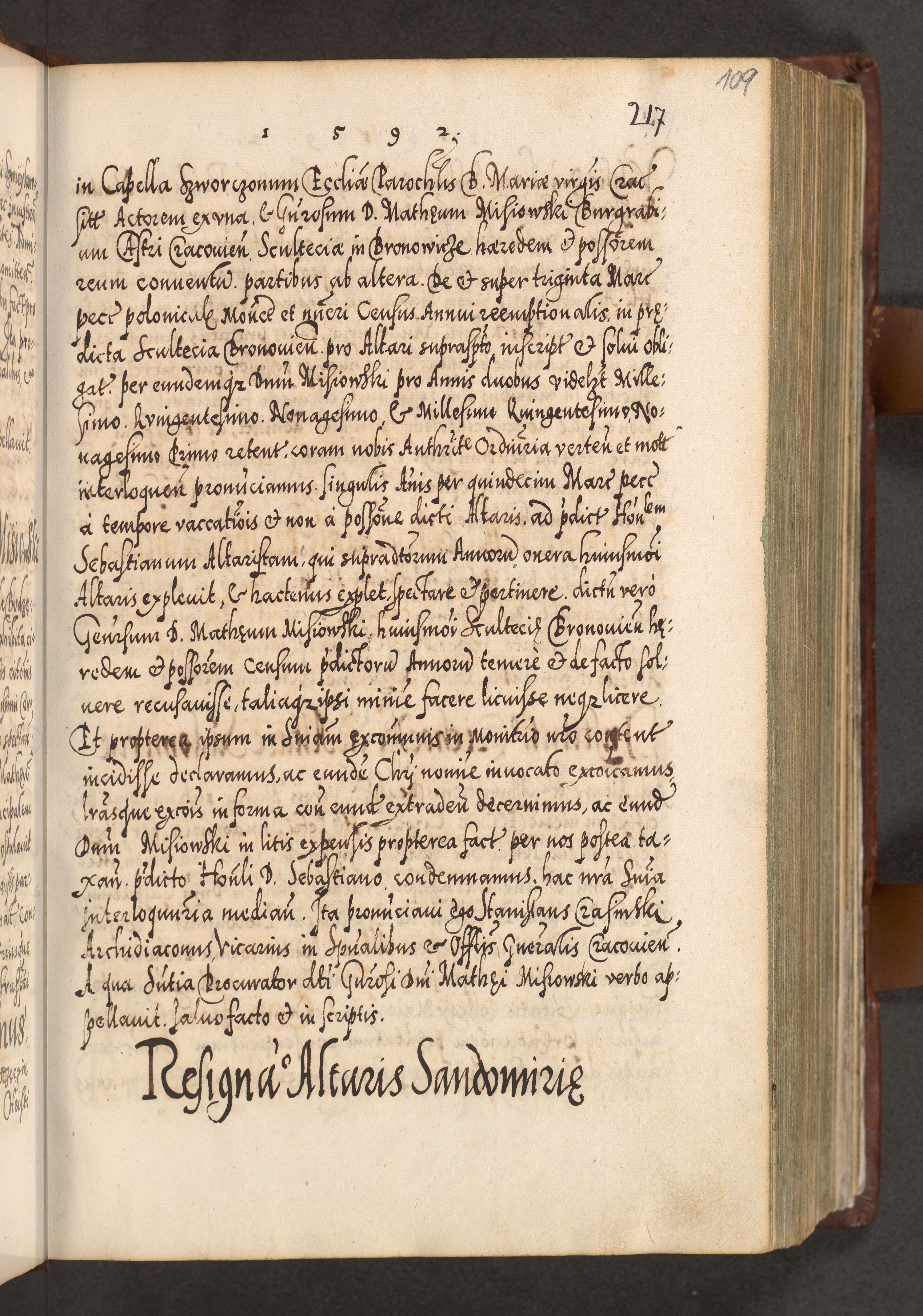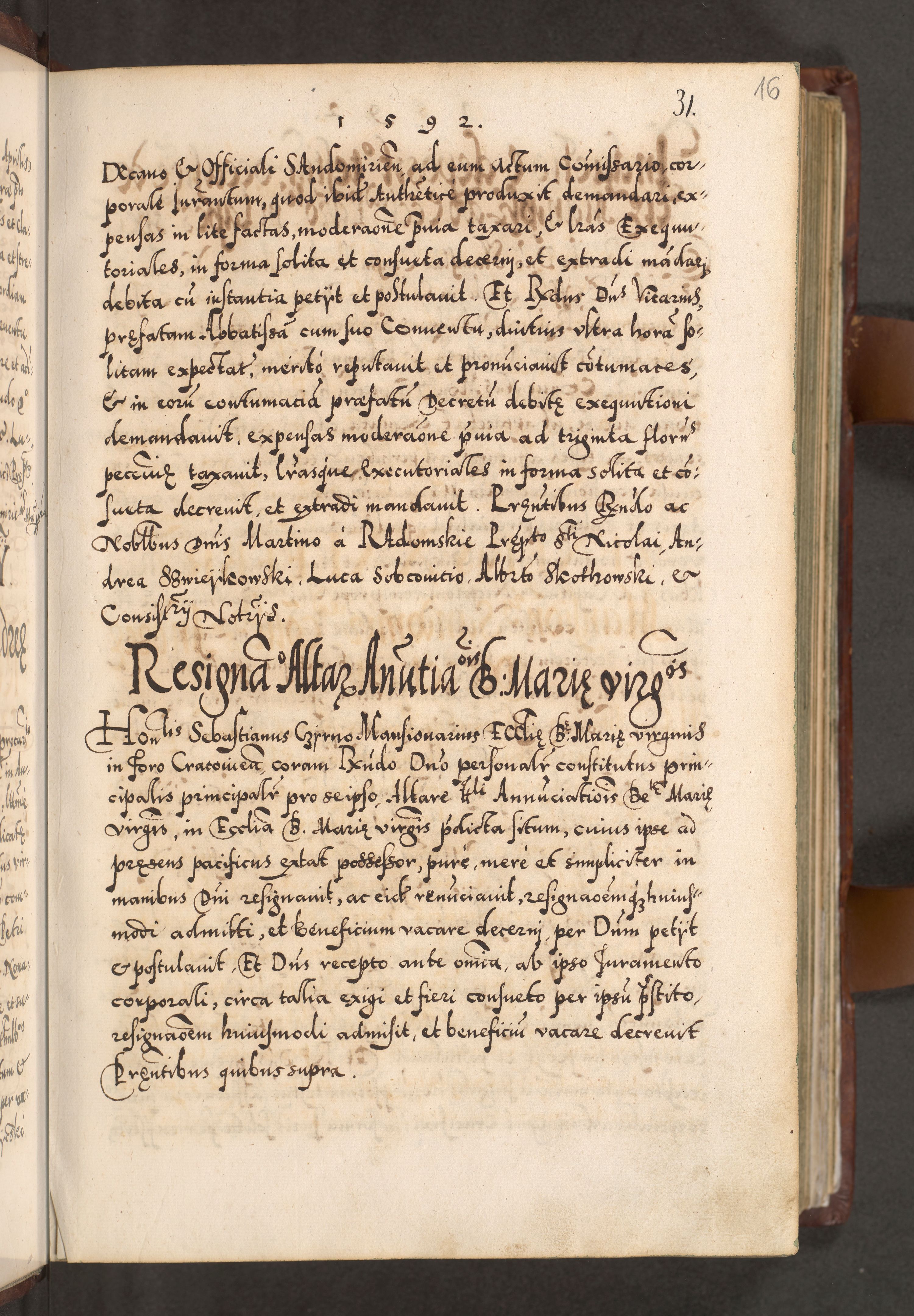Illistrissimo et revedissimo in Christo Patre Domino Domino Georgio Rzadziwił Miserone Divina Sacrostae R. E. Tituli S. Sixti Presbitero Cardinali Duce in Olyka et Niesswiesz ad Gubernacula Ecclessiae Cracoviensis cuius administratorialem a Sancta Sede Apostolica obtinverat feliciter sedente. Acta actorum, causarum, sententiarum tam deffinitivarum quam interloquutoriarum decretorum, obligationum, quietationum, recognitionum, constitutionum procuratorum etc. coram Reverendo Domino Stanislao Crassinskz de Crasne Archidiacono Cracoviensis, Scholastico Gnesnesis, Custode Plocensis etc. Vicario et Officiali Generali Cracoviensi in Ano Domini Millesimo Quingentesimo Nonagesimo Primo cuius indictio quarta pontificatus SS. Domini Nostri Gregorii XIIII Anno I psius prio feliciter incipiut