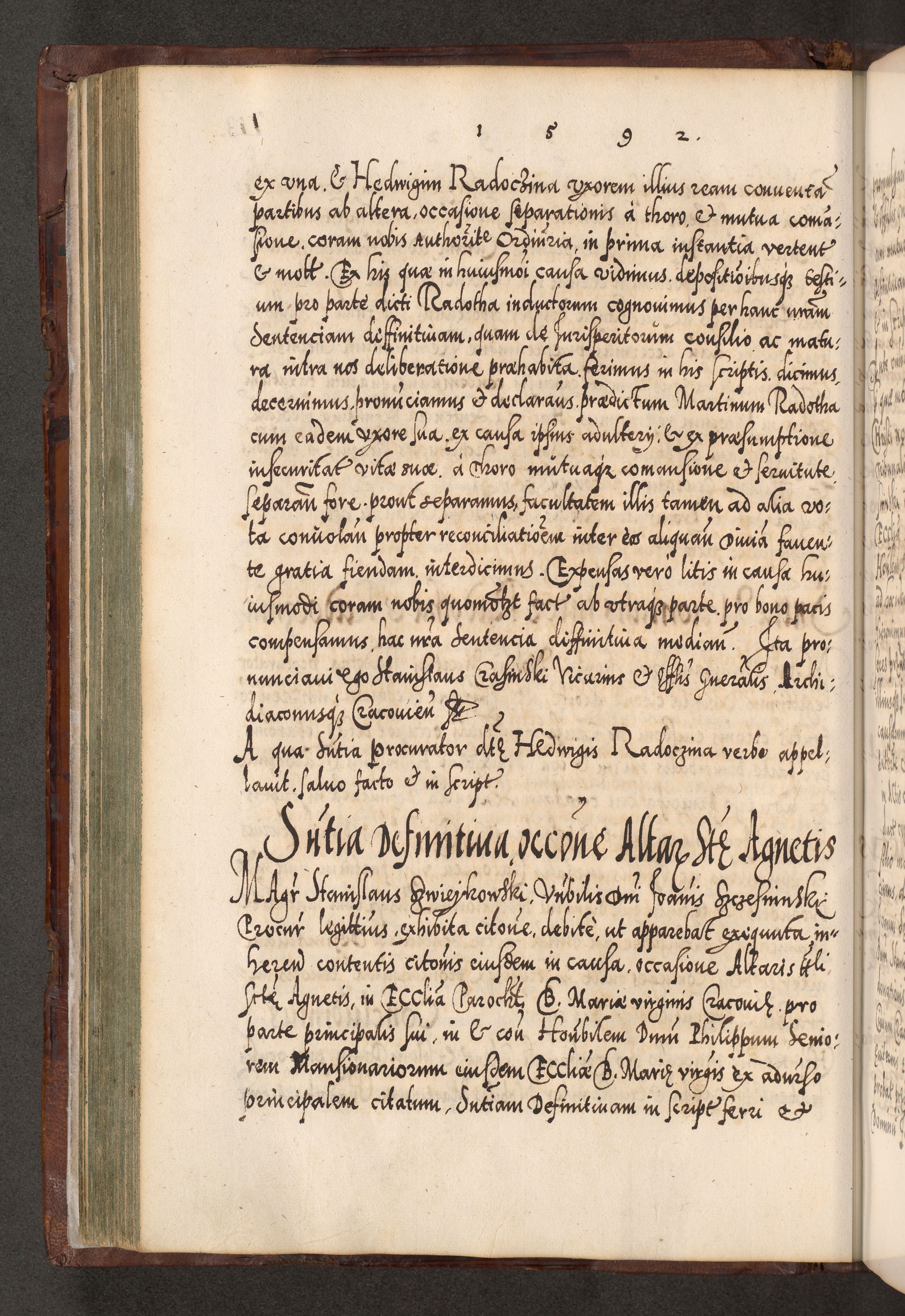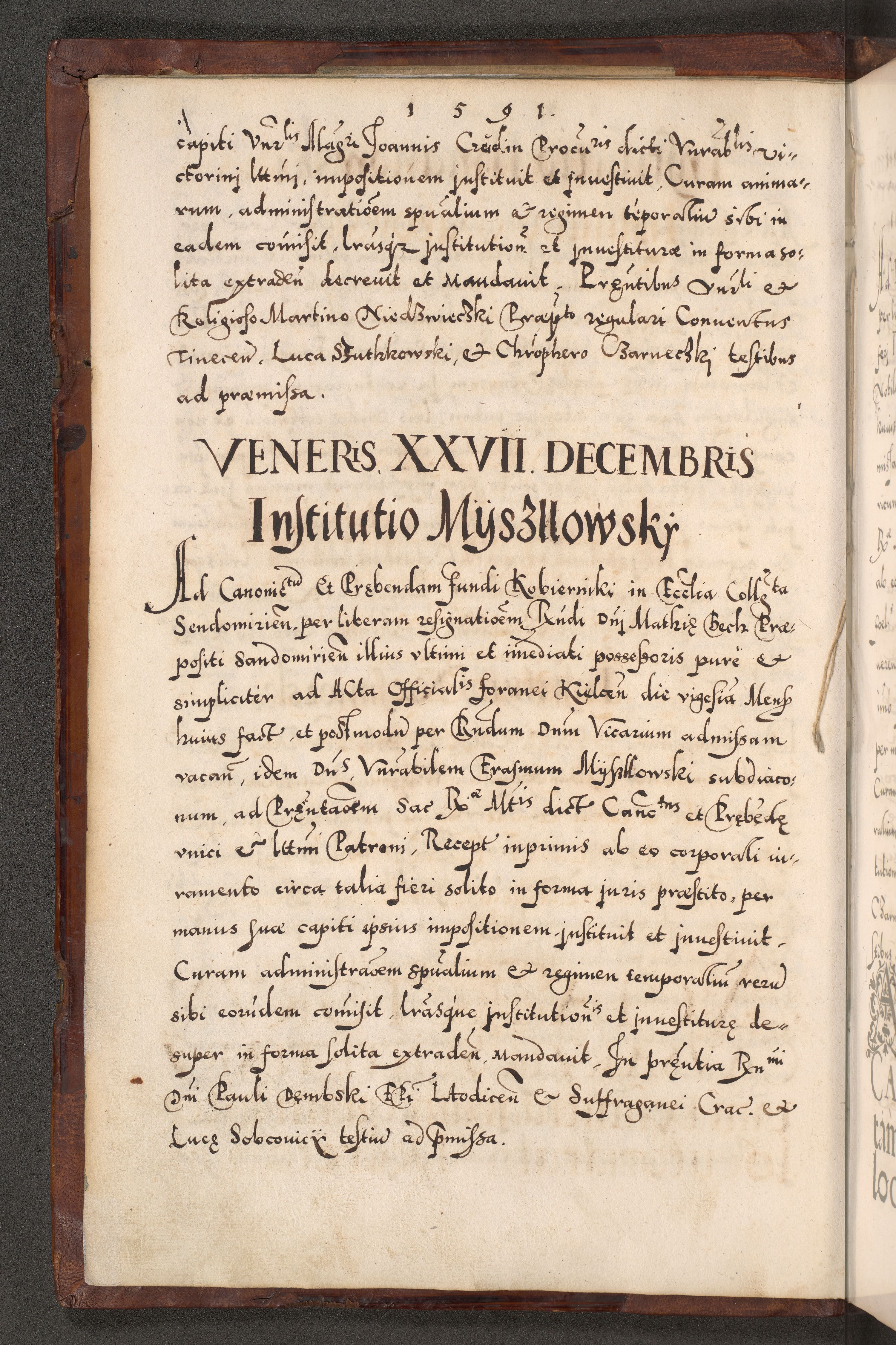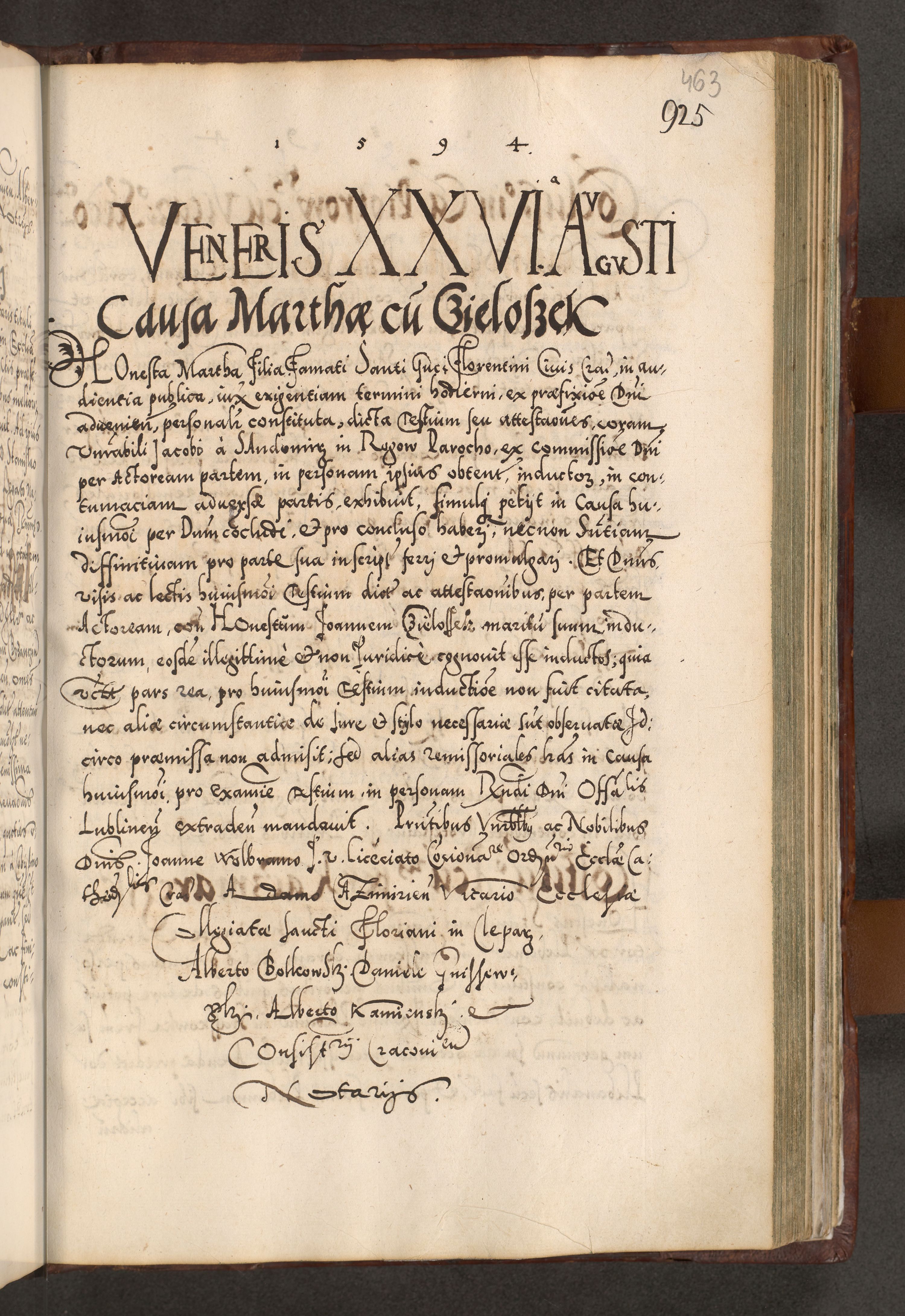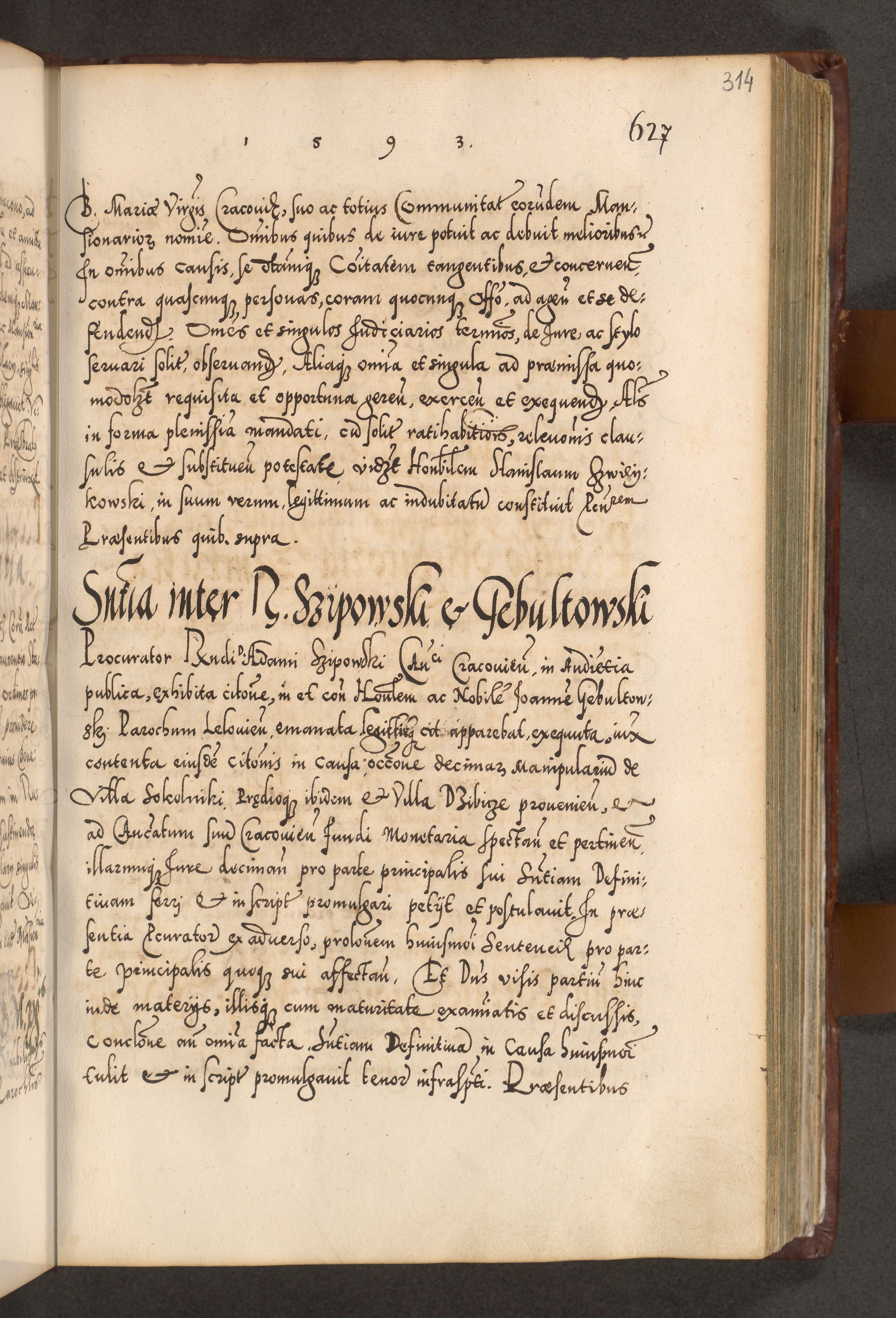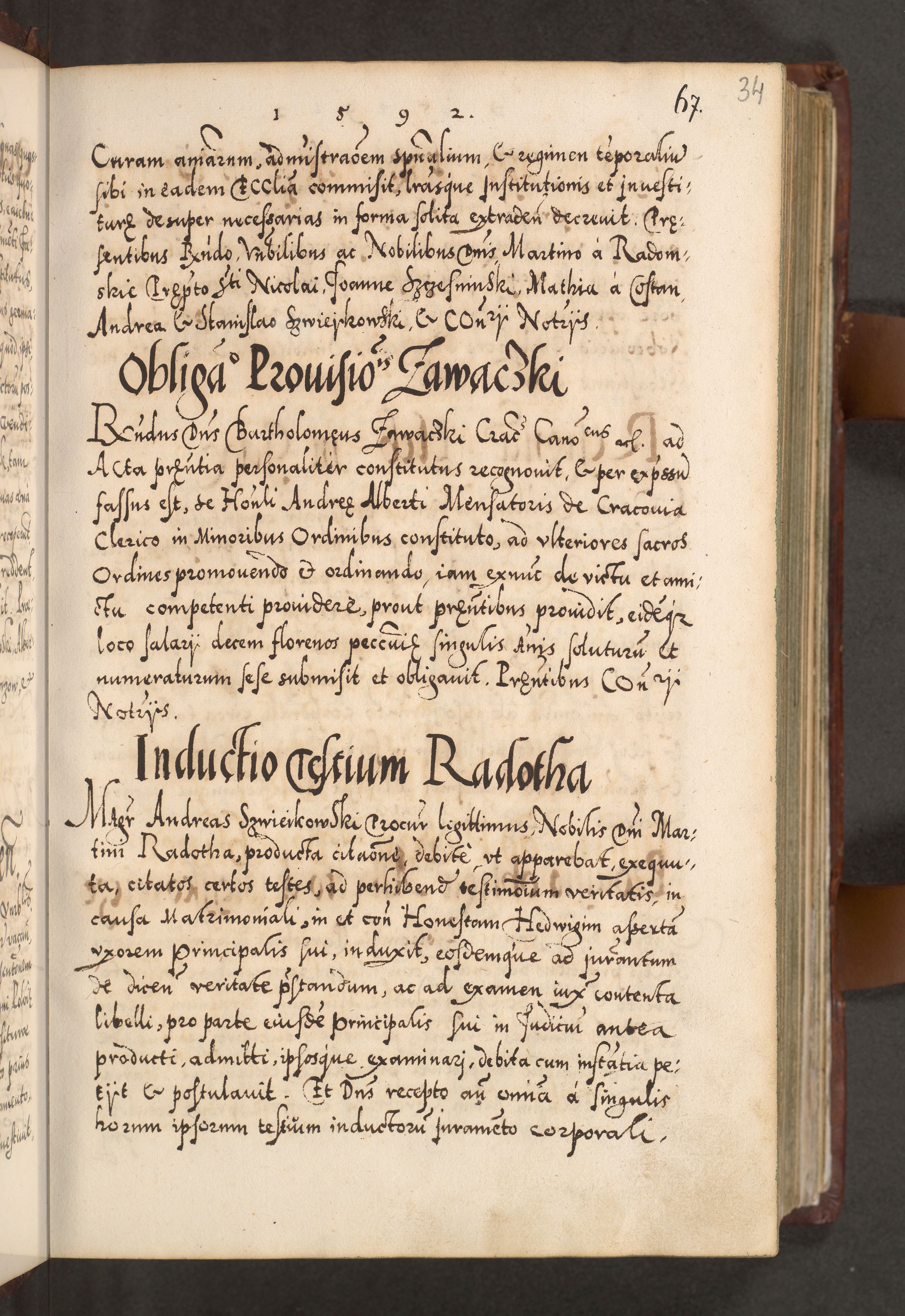 Illistrissimo et revedissimo in Christo Patre Domino Domino Georgio Rzadziwił Miserone Divina Sacrostae R. E. Tituli S. Sixti Presbitero Cardinali Duce in Olyka et Niesswiesz ad Gubernacula Ecclessiae Cracoviensis cuius administratorialem a Sancta Sede Apostolica obtinverat feliciter sedente. Acta actorum, causarum, sententiarum tam deffinitivarum quam interloquutoriarum decretorum, obligationum, quietationum, recognitionum, constitutionum procuratorum etc. coram Reverendo Domino Stanislao Crassinskz de Crasne Archidiacono Cracoviensis, Scholastico Gnesnesis, Custode Plocensis etc. Vicario et Officiali Generali Cracoviensi in Ano Domini Millesimo Quingentesimo Nonagesimo Primo cuius indictio quarta pontificatus SS. Domini Nostri Gregorii XIIII Anno I psius prio feliciter incipiut