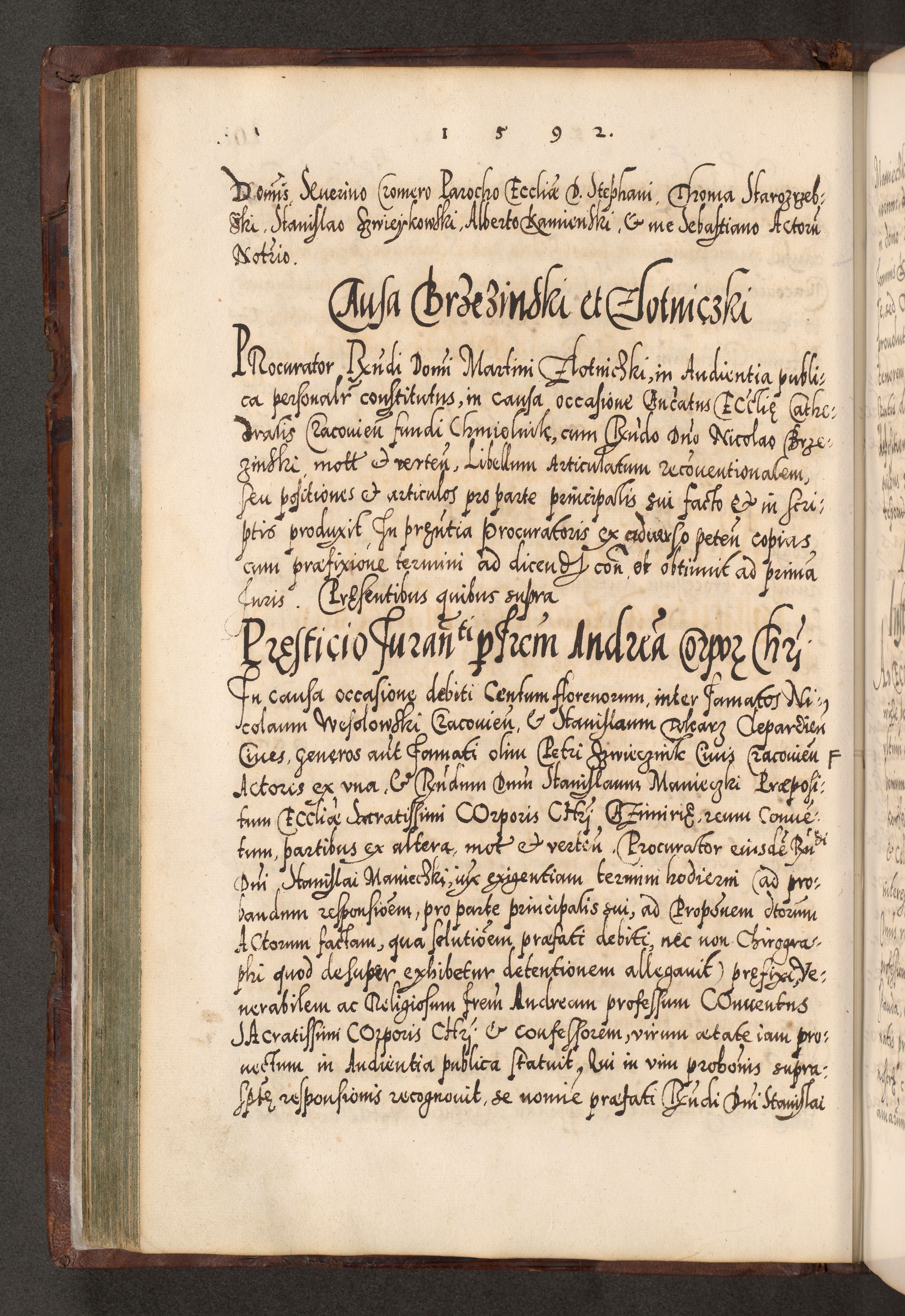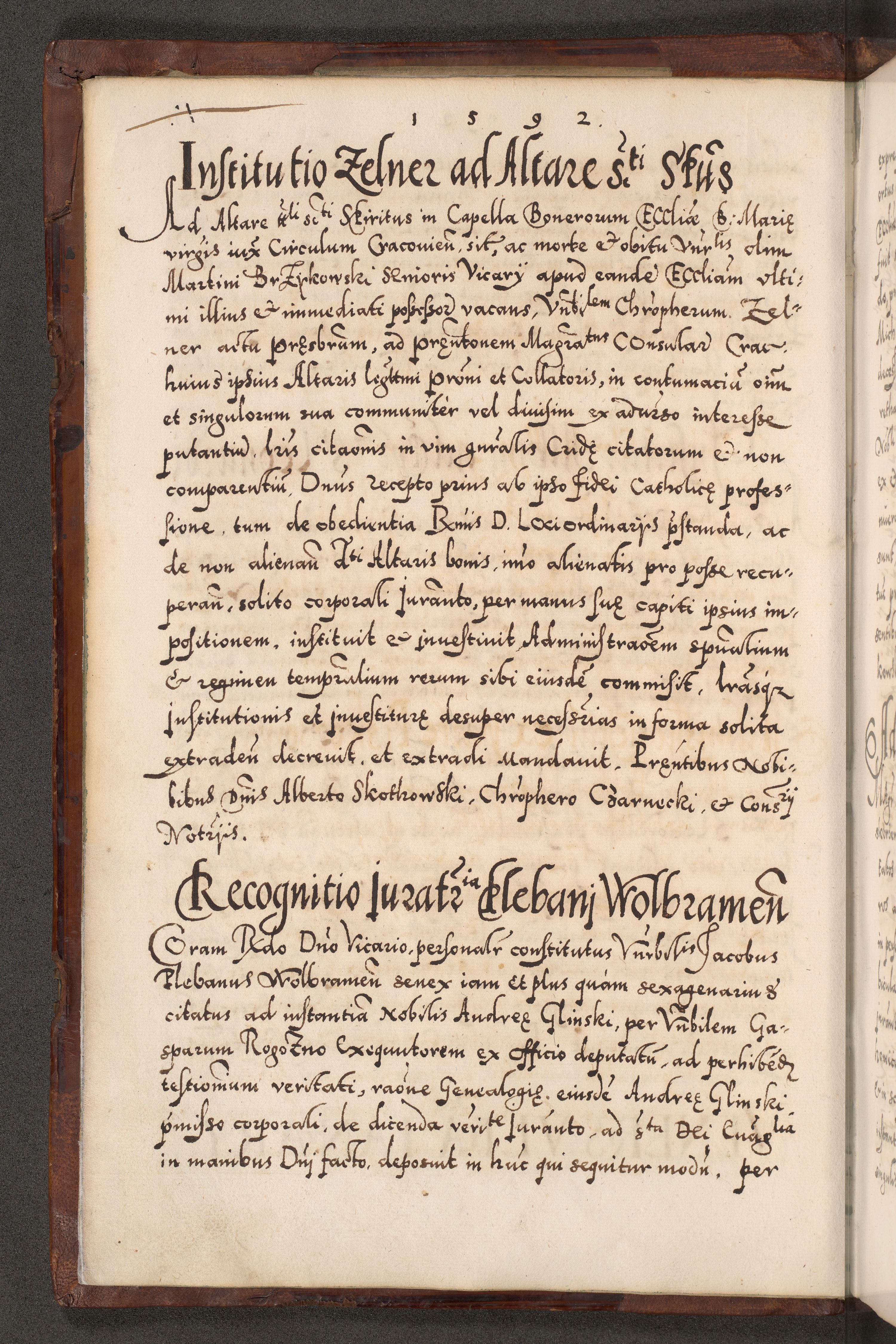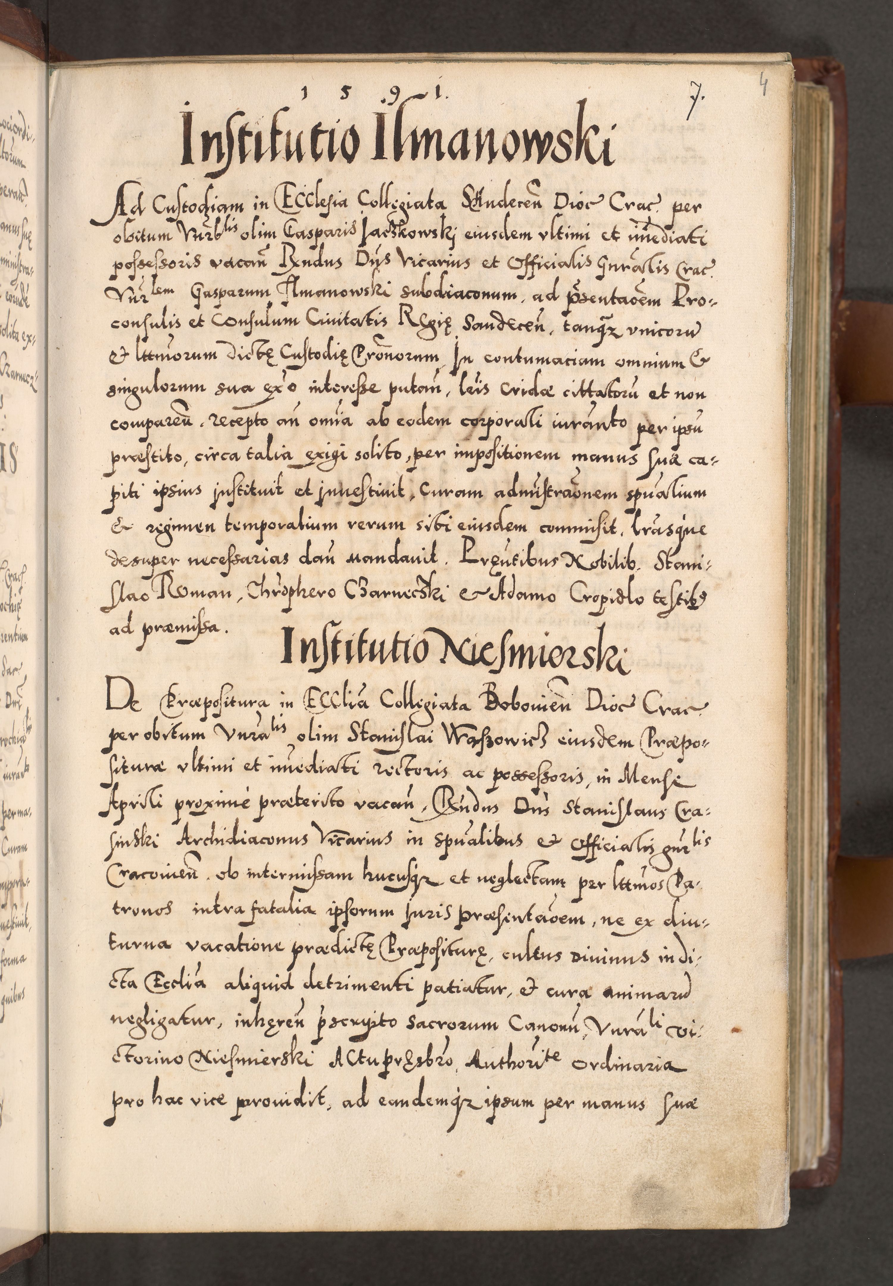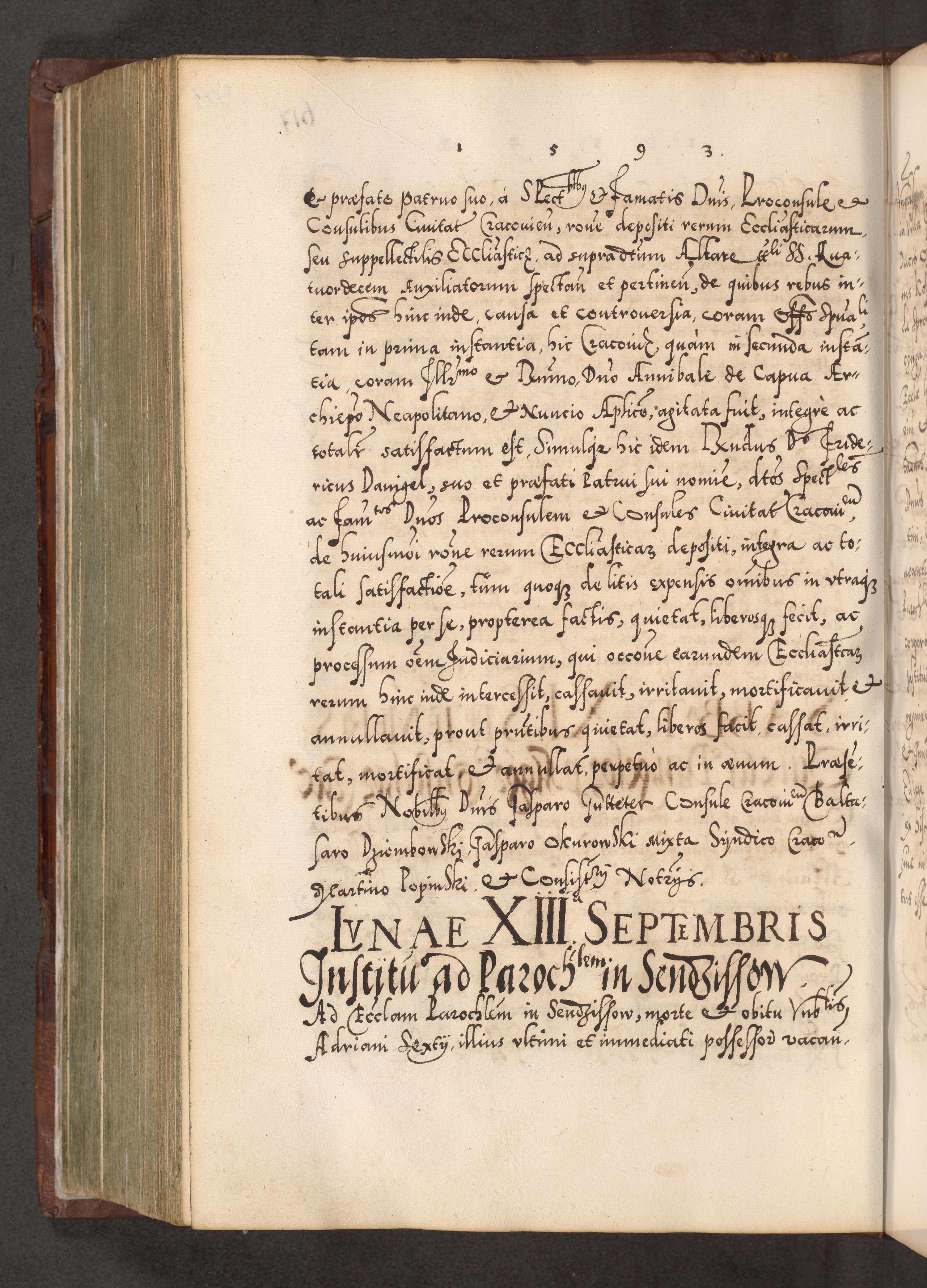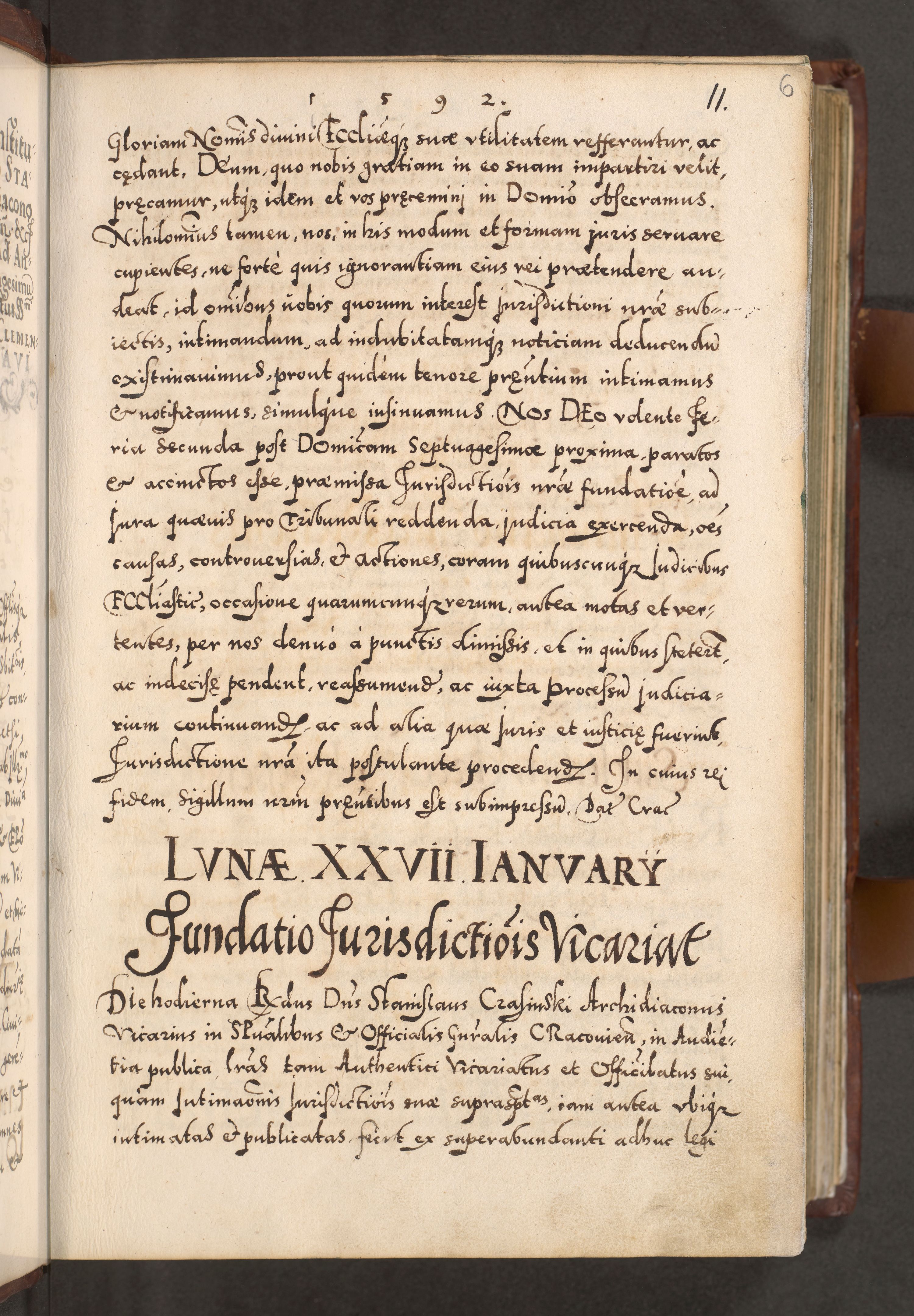 Illistrissimo et revedissimo in Christo Patre Domino Domino Georgio Rzadziwił Miserone Divina Sacrostae R. E. Tituli S. Sixti Presbitero Cardinali Duce in Olyka et Niesswiesz ad Gubernacula Ecclessiae Cracoviensis cuius administratorialem a Sancta Sede Apostolica obtinverat feliciter sedente. Acta actorum, causarum, sententiarum tam deffinitivarum quam interloquutoriarum decretorum, obligationum, quietationum, recognitionum, constitutionum procuratorum etc. coram Reverendo Domino Stanislao Crassinskz de Crasne Archidiacono Cracoviensis, Scholastico Gnesnesis, Custode Plocensis etc. Vicario et Officiali Generali Cracoviensi in Ano Domini Millesimo Quingentesimo Nonagesimo Primo cuius indictio quarta pontificatus SS. Domini Nostri Gregorii XIIII Anno I psius prio feliciter incipiut