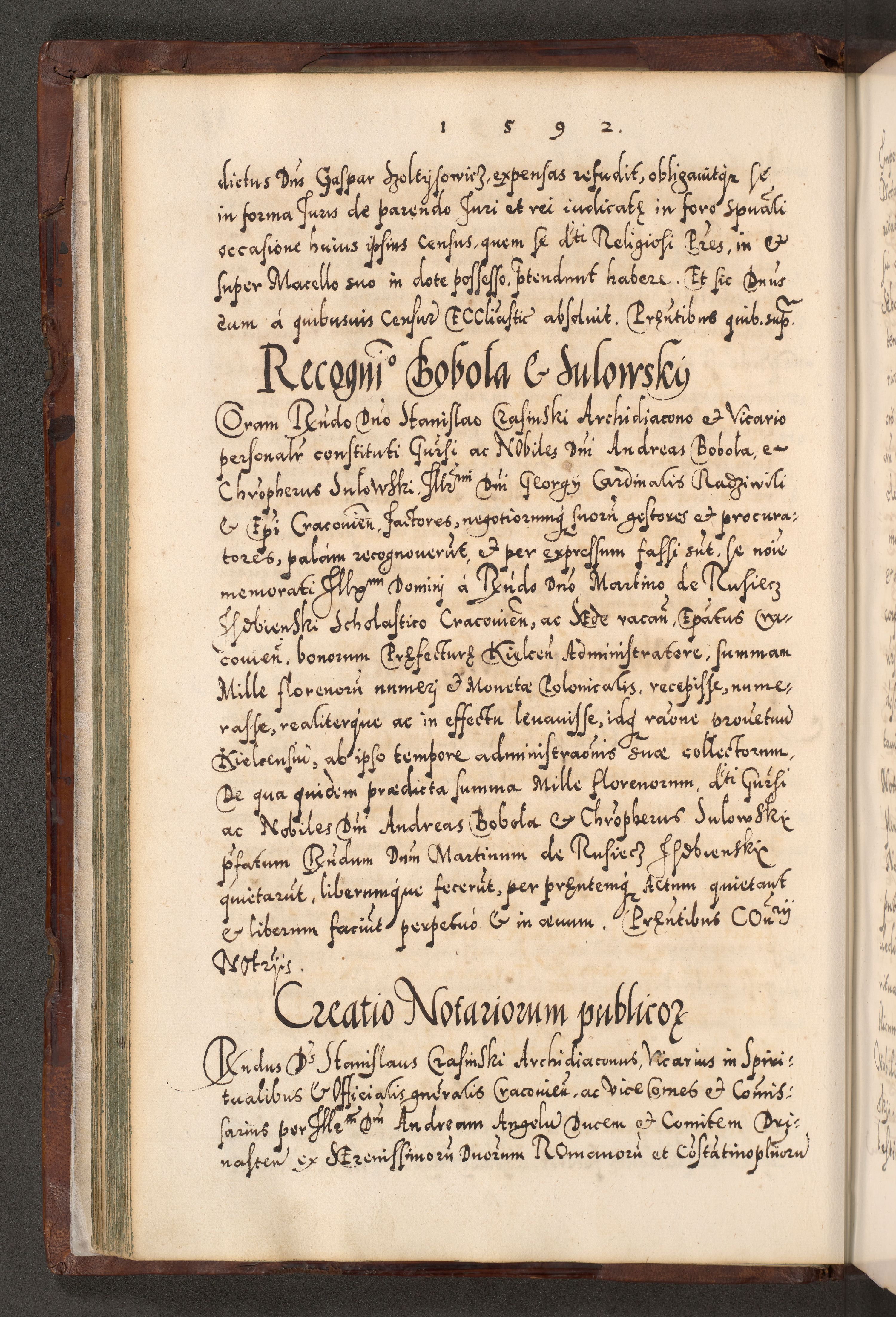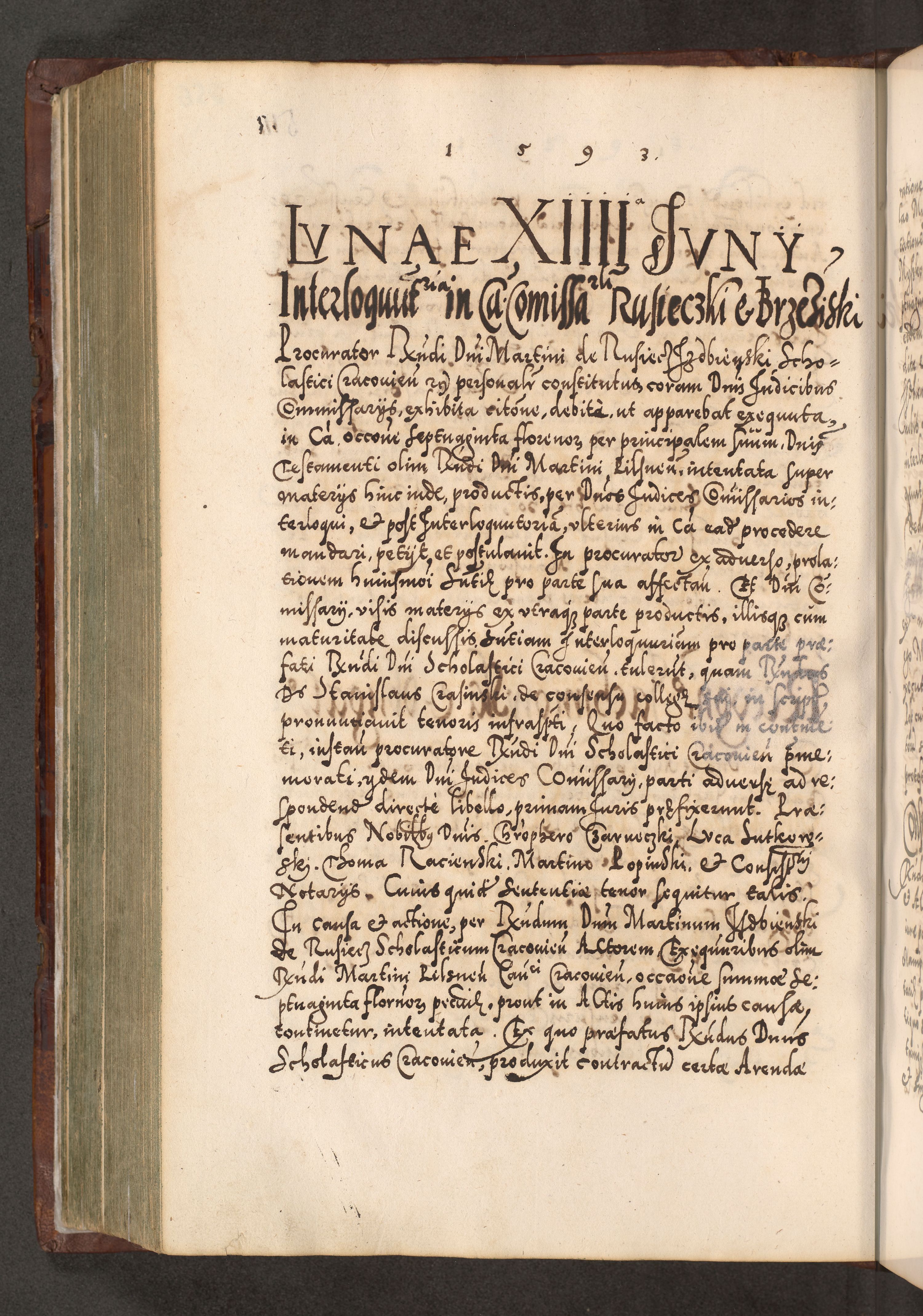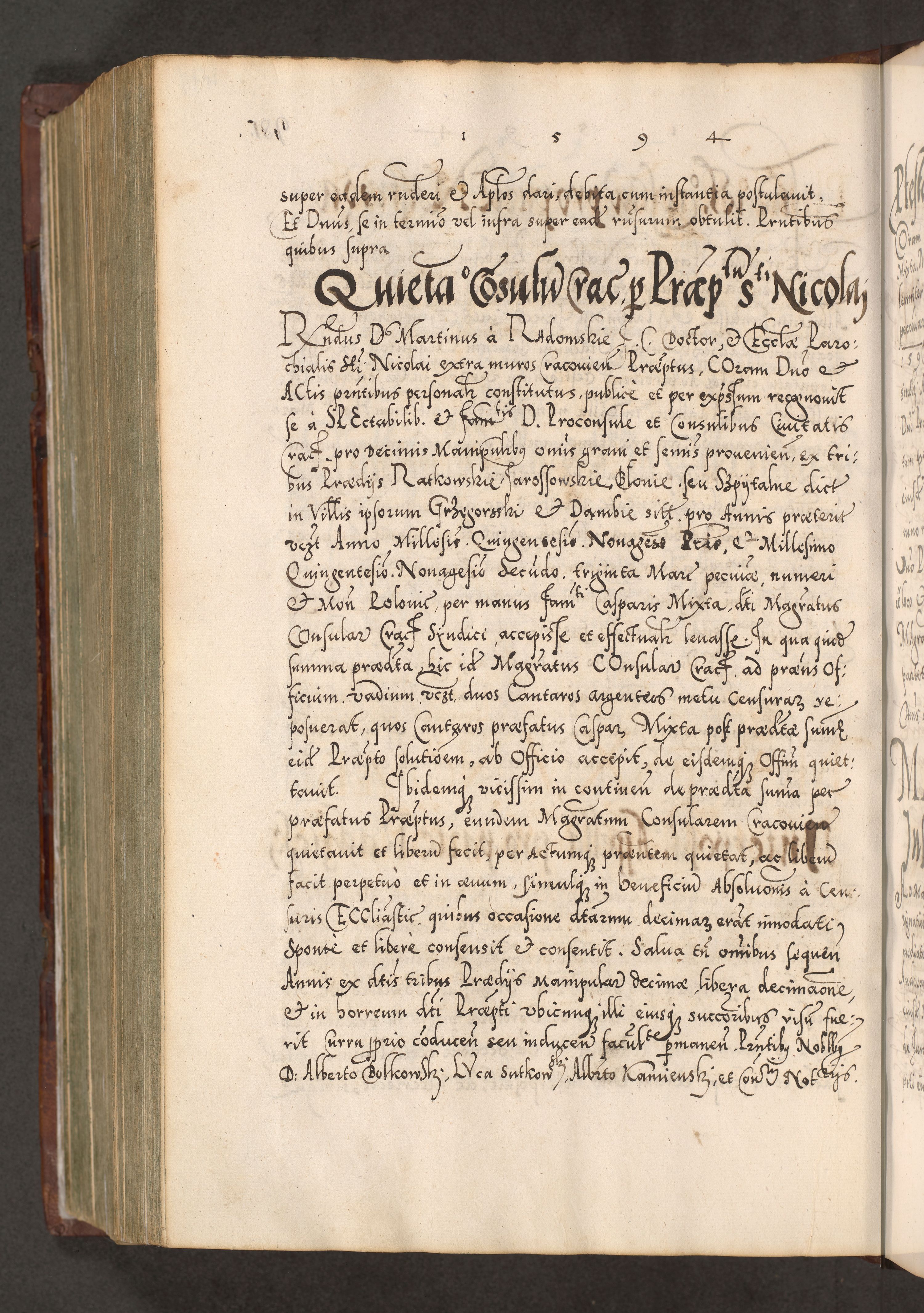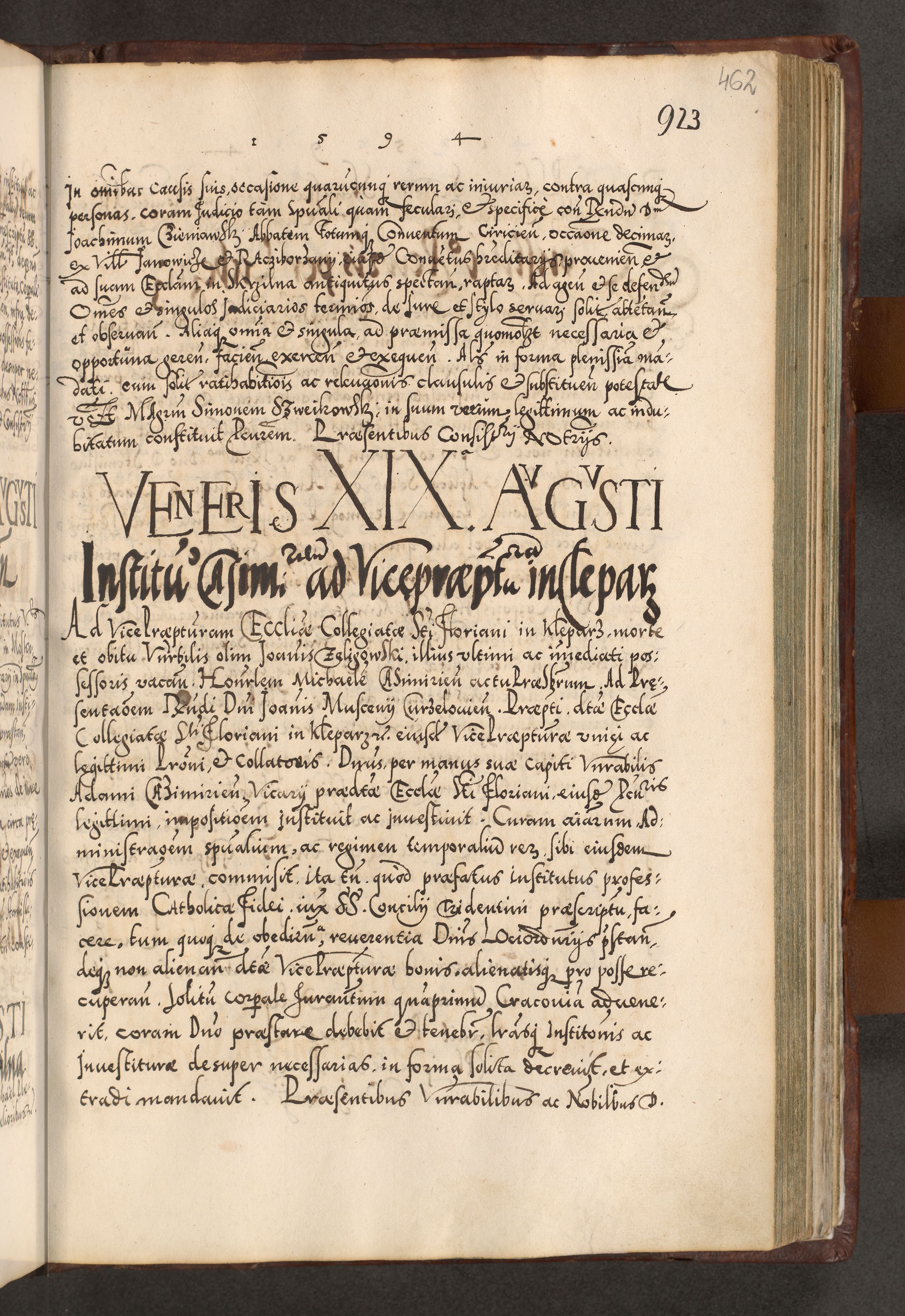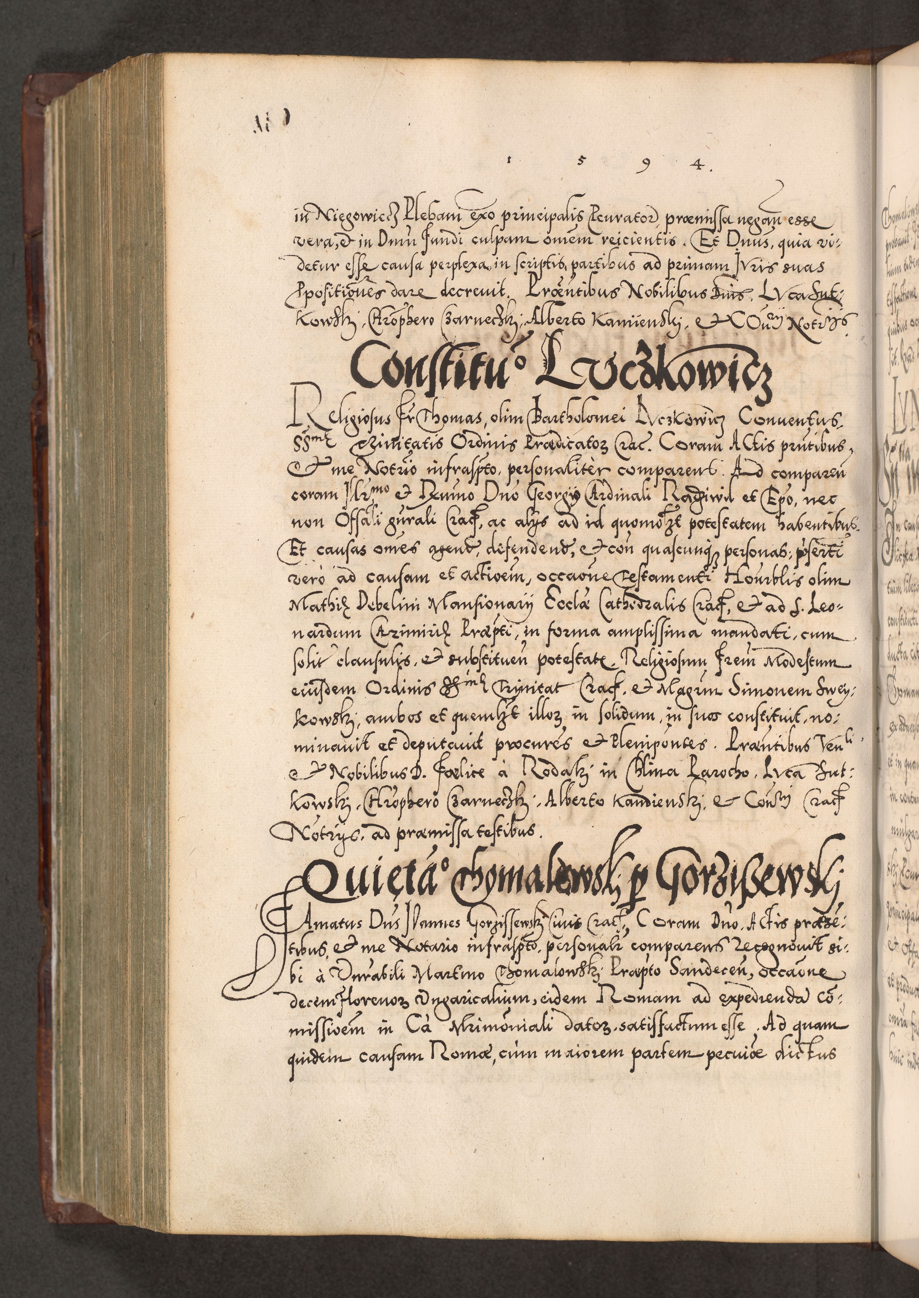 Illistrissimo et revedissimo in Christo Patre Domino Domino Georgio Rzadziwił Miserone Divina Sacrostae R. E. Tituli S. Sixti Presbitero Cardinali Duce in Olyka et Niesswiesz ad Gubernacula Ecclessiae Cracoviensis cuius administratorialem a Sancta Sede Apostolica obtinverat feliciter sedente. Acta actorum, causarum, sententiarum tam deffinitivarum quam interloquutoriarum decretorum, obligationum, quietationum, recognitionum, constitutionum procuratorum etc. coram Reverendo Domino Stanislao Crassinskz de Crasne Archidiacono Cracoviensis, Scholastico Gnesnesis, Custode Plocensis etc. Vicario et Officiali Generali Cracoviensi in Ano Domini Millesimo Quingentesimo Nonagesimo Primo cuius indictio quarta pontificatus SS. Domini Nostri Gregorii XIIII Anno I psius prio feliciter incipiut
