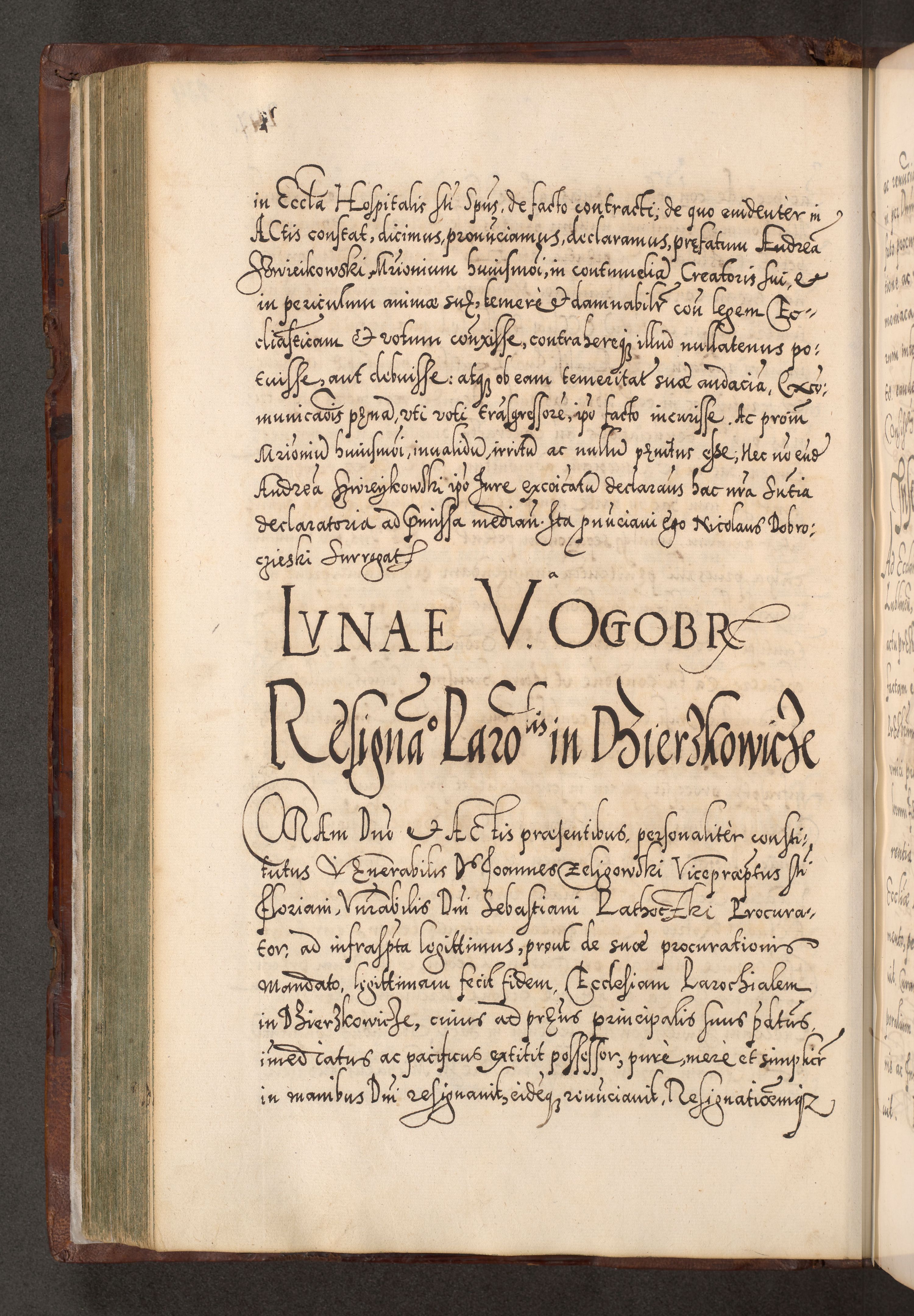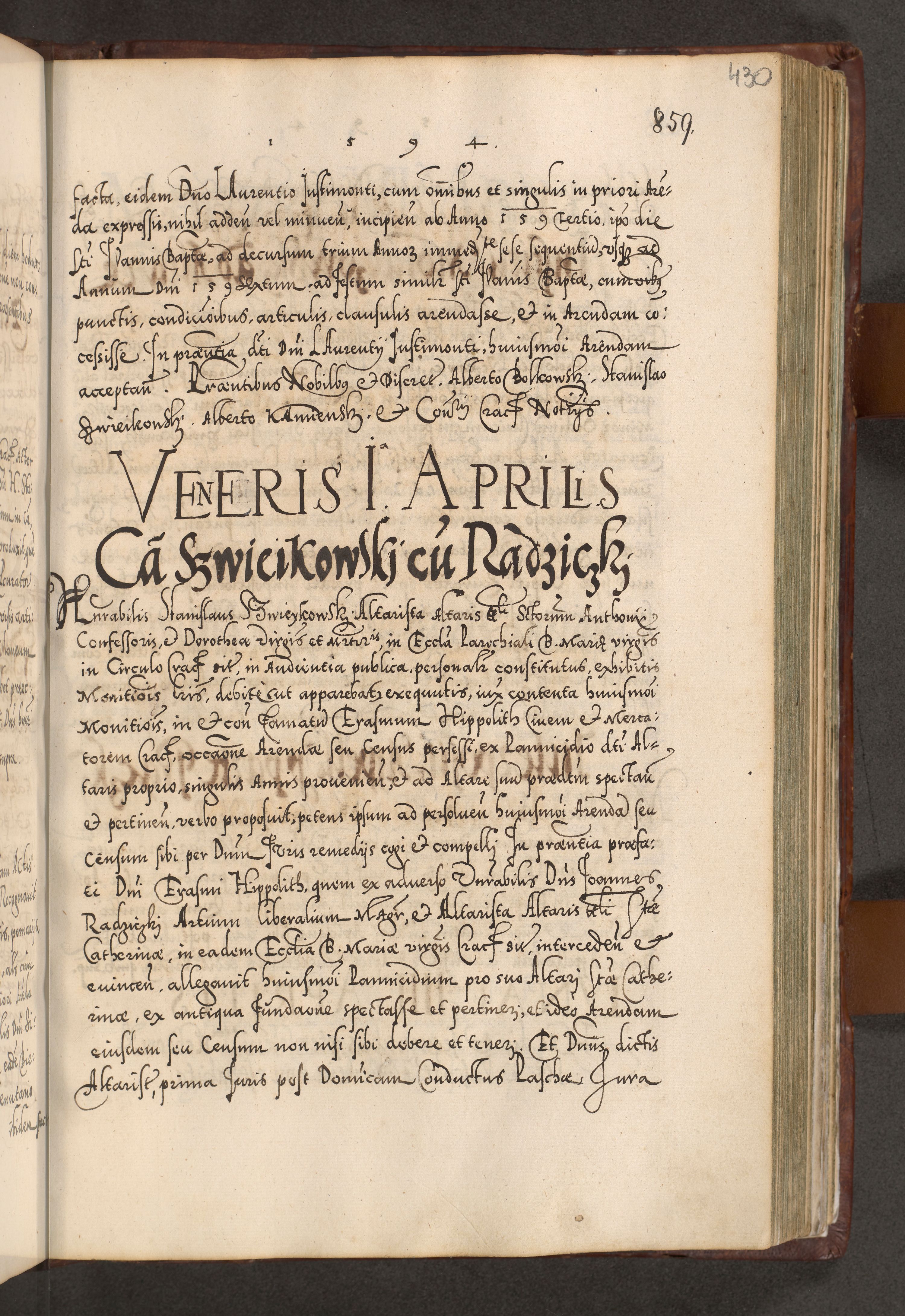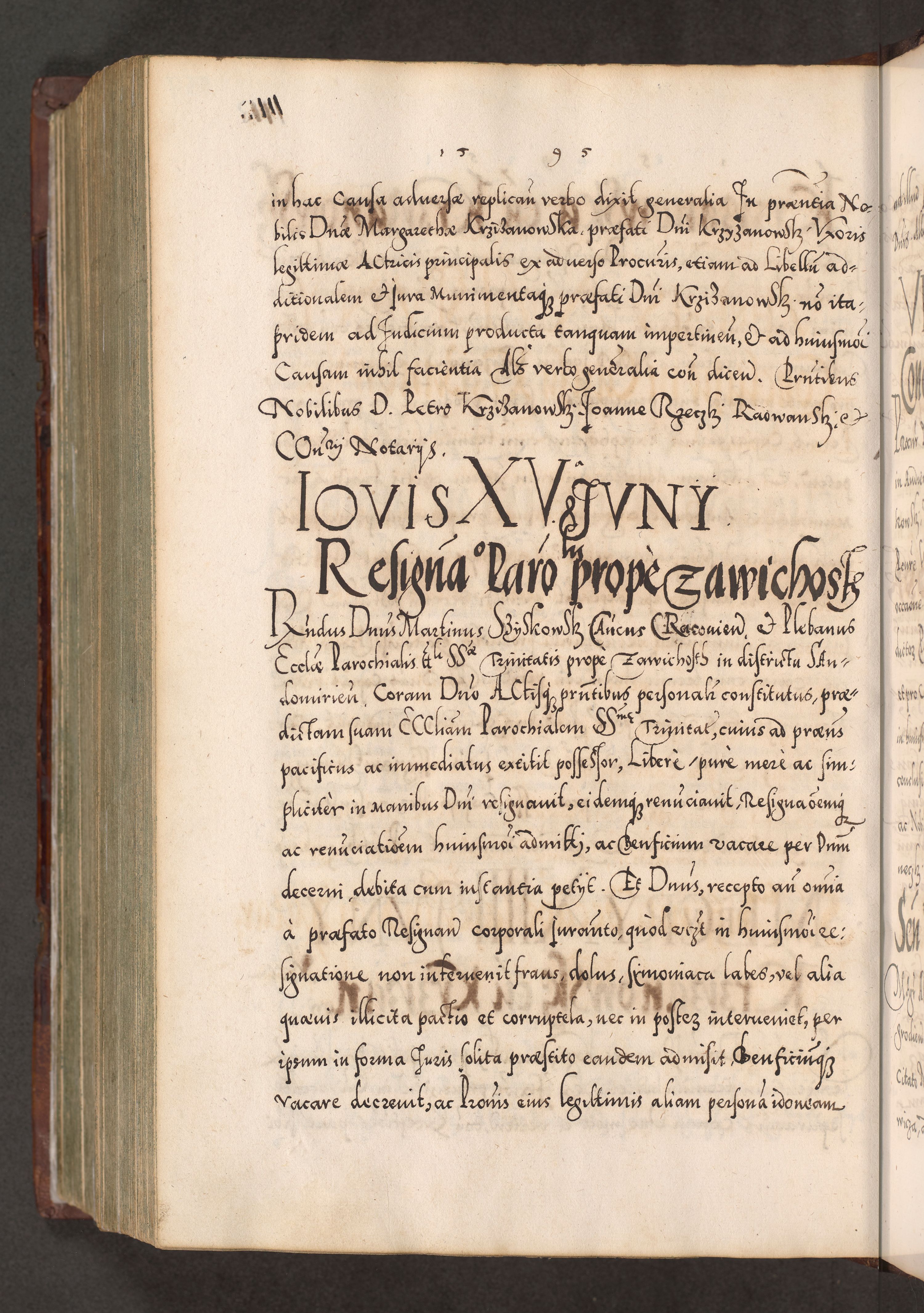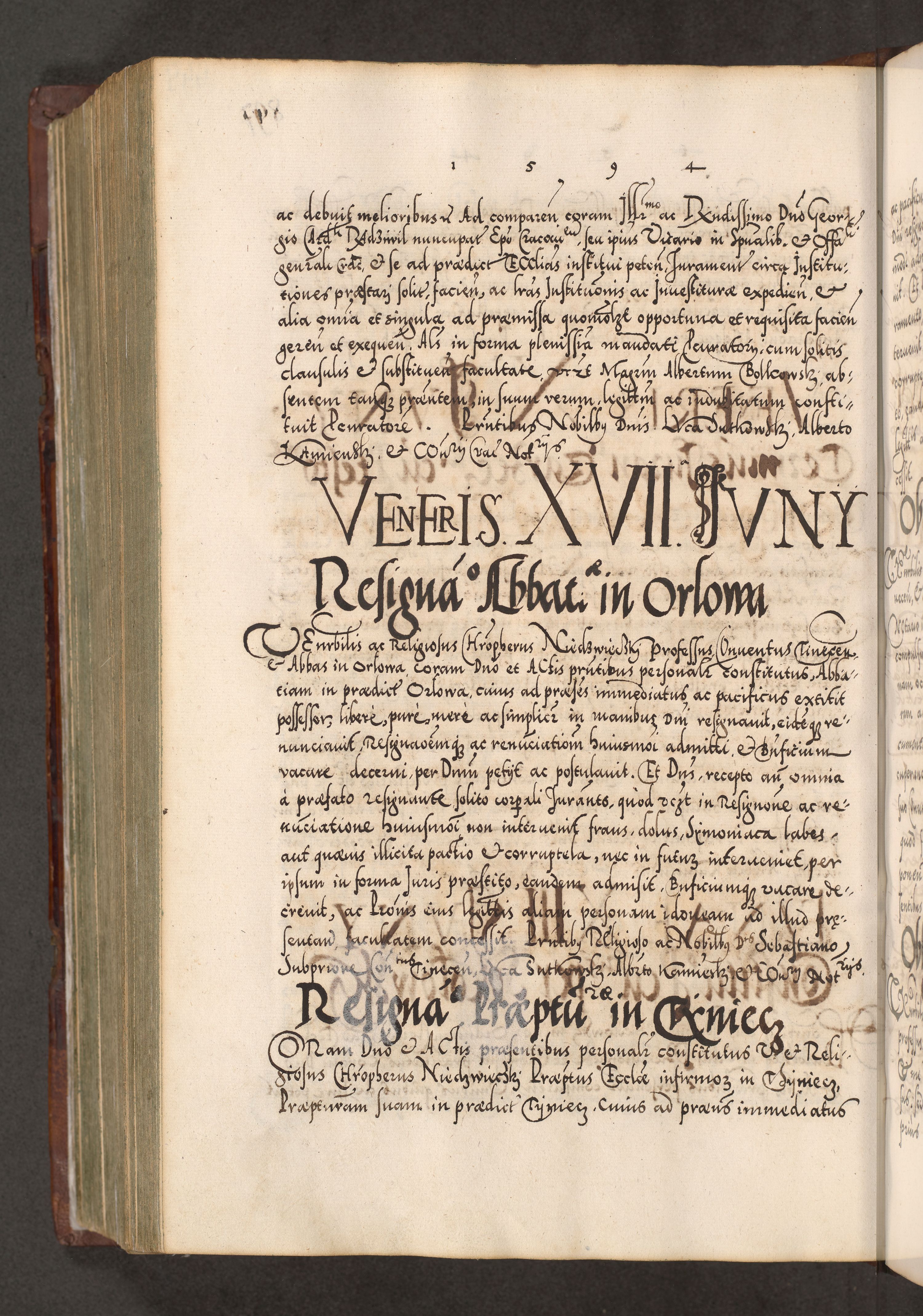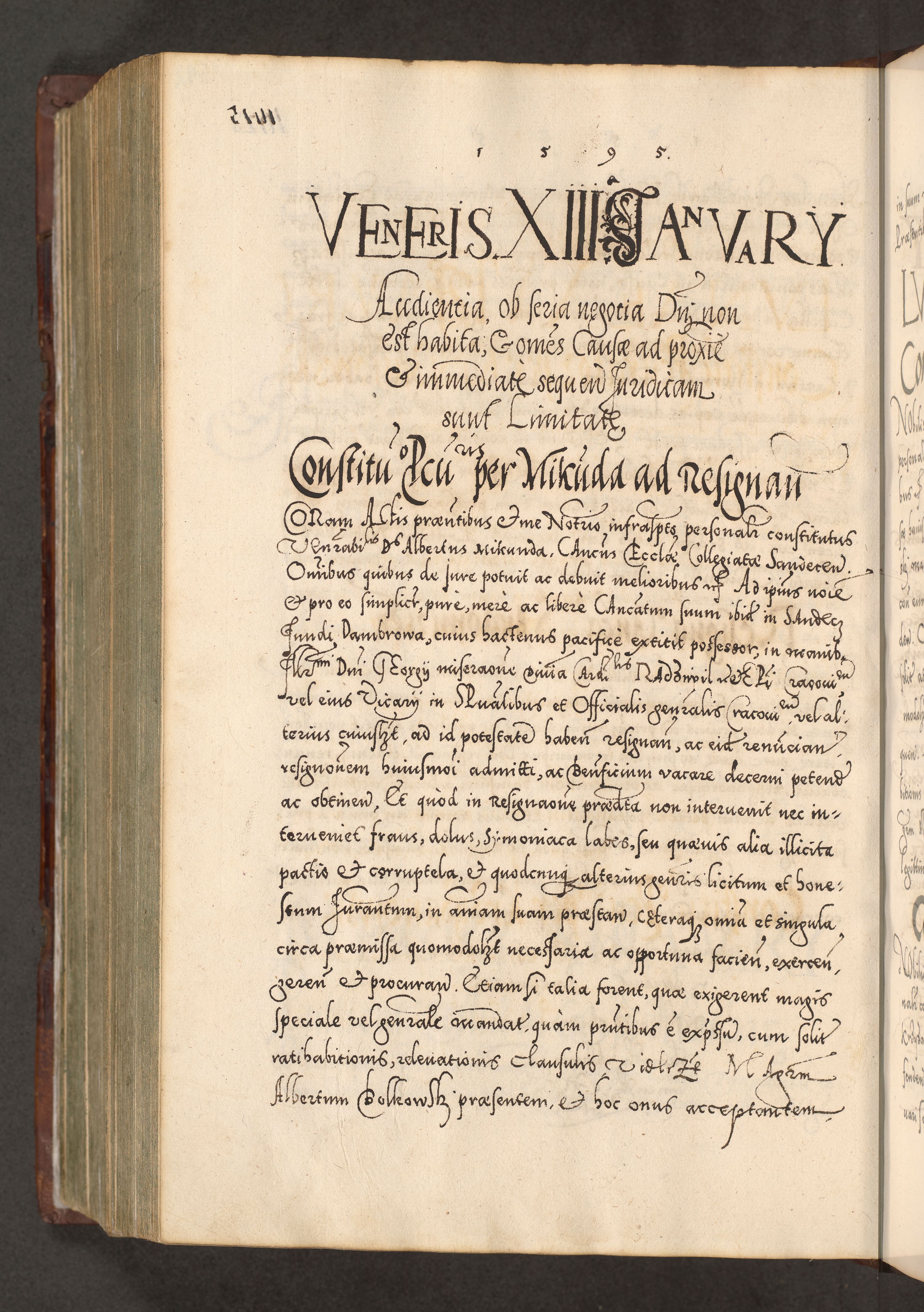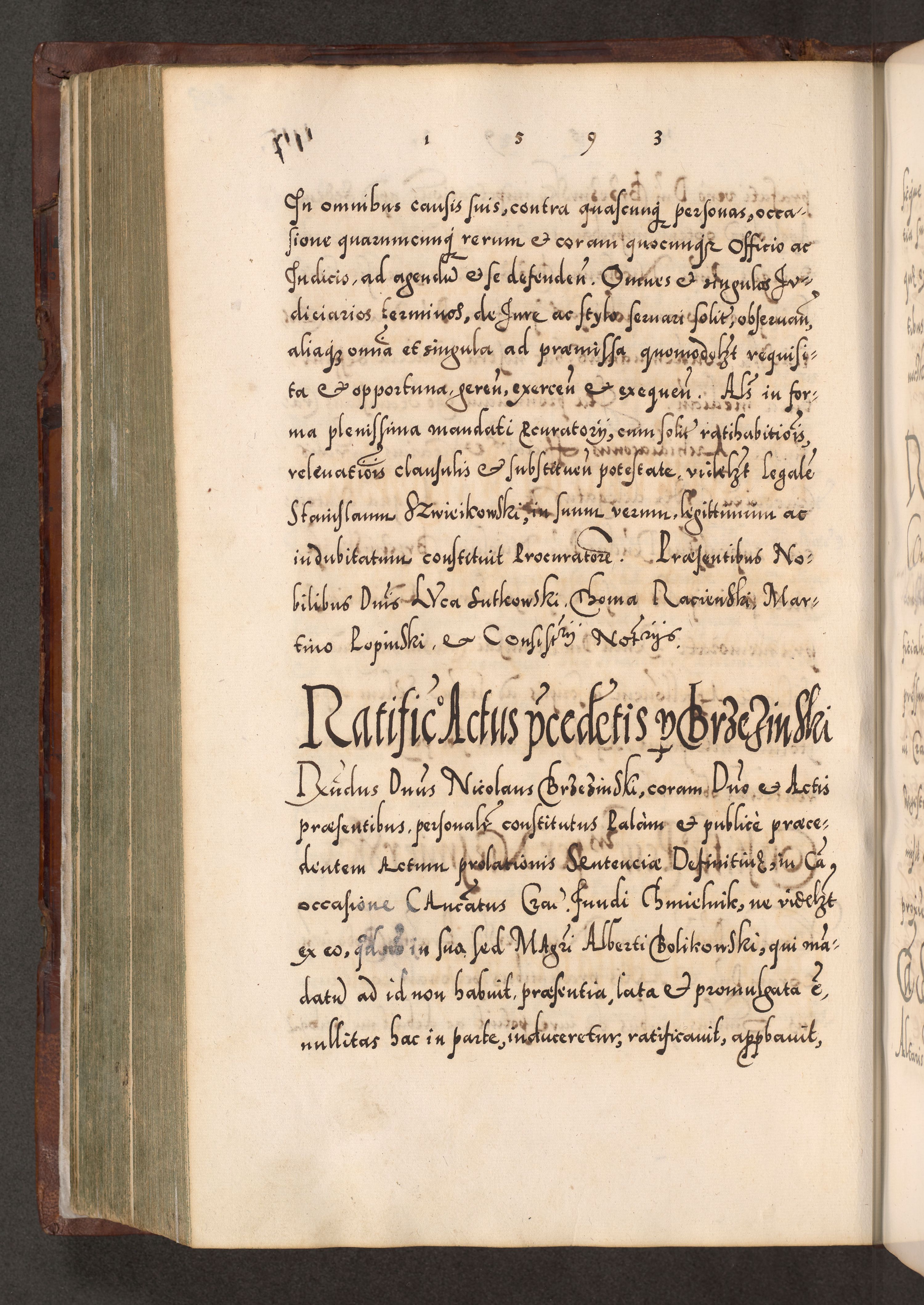Illistrissimo et revedissimo in Christo Patre Domino Domino Georgio Rzadziwił Miserone Divina Sacrostae R. E. Tituli S. Sixti Presbitero Cardinali Duce in Olyka et Niesswiesz ad Gubernacula Ecclessiae Cracoviensis cuius administratorialem a Sancta Sede Apostolica obtinverat feliciter sedente. Acta actorum, causarum, sententiarum tam deffinitivarum quam interloquutoriarum decretorum, obligationum, quietationum, recognitionum, constitutionum procuratorum etc. coram Reverendo Domino Stanislao Crassinskz de Crasne Archidiacono Cracoviensis, Scholastico Gnesnesis, Custode Plocensis etc. Vicario et Officiali Generali Cracoviensi in Ano Domini Millesimo Quingentesimo Nonagesimo Primo cuius indictio quarta pontificatus SS. Domini Nostri Gregorii XIIII Anno I psius prio feliciter incipiut