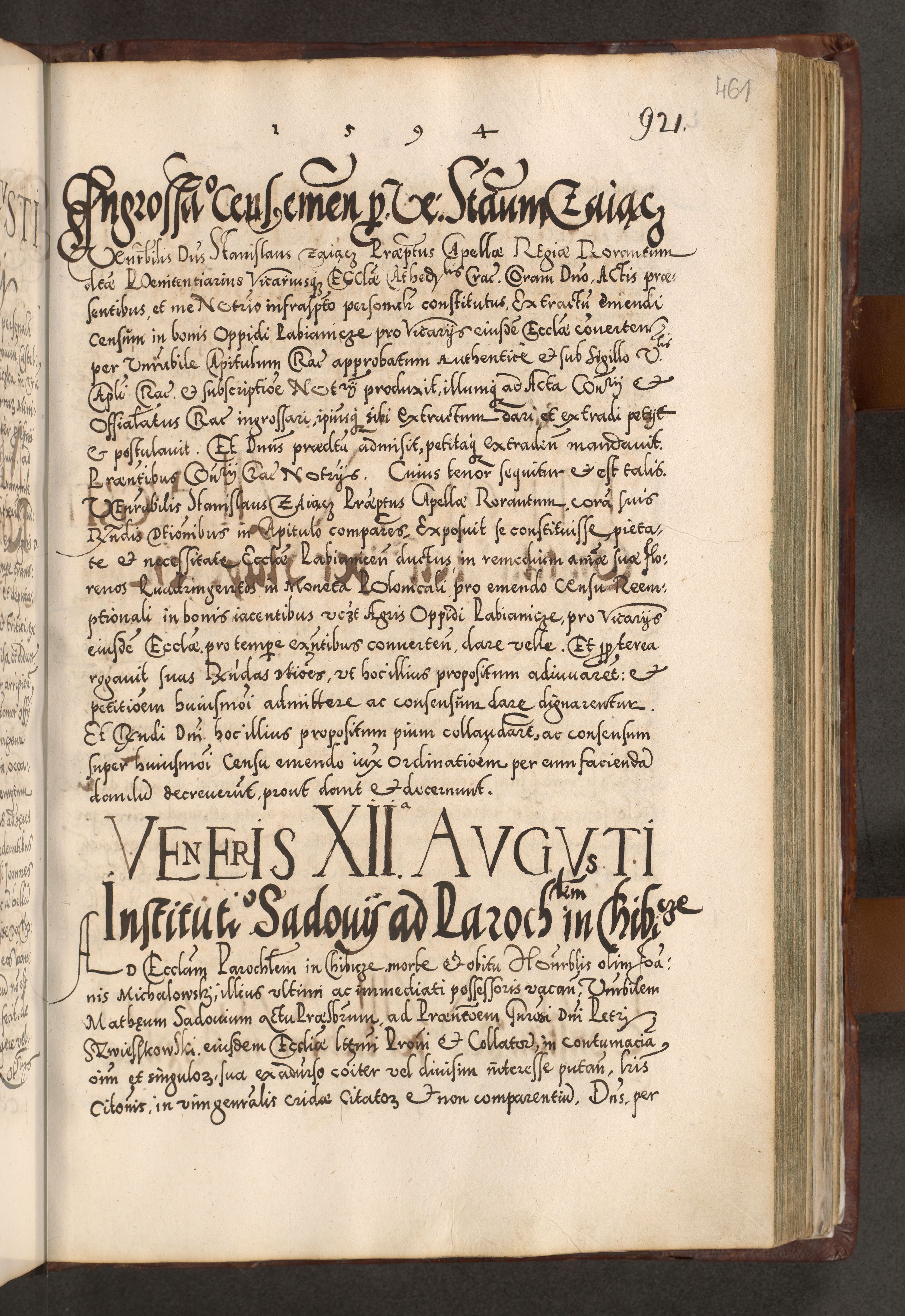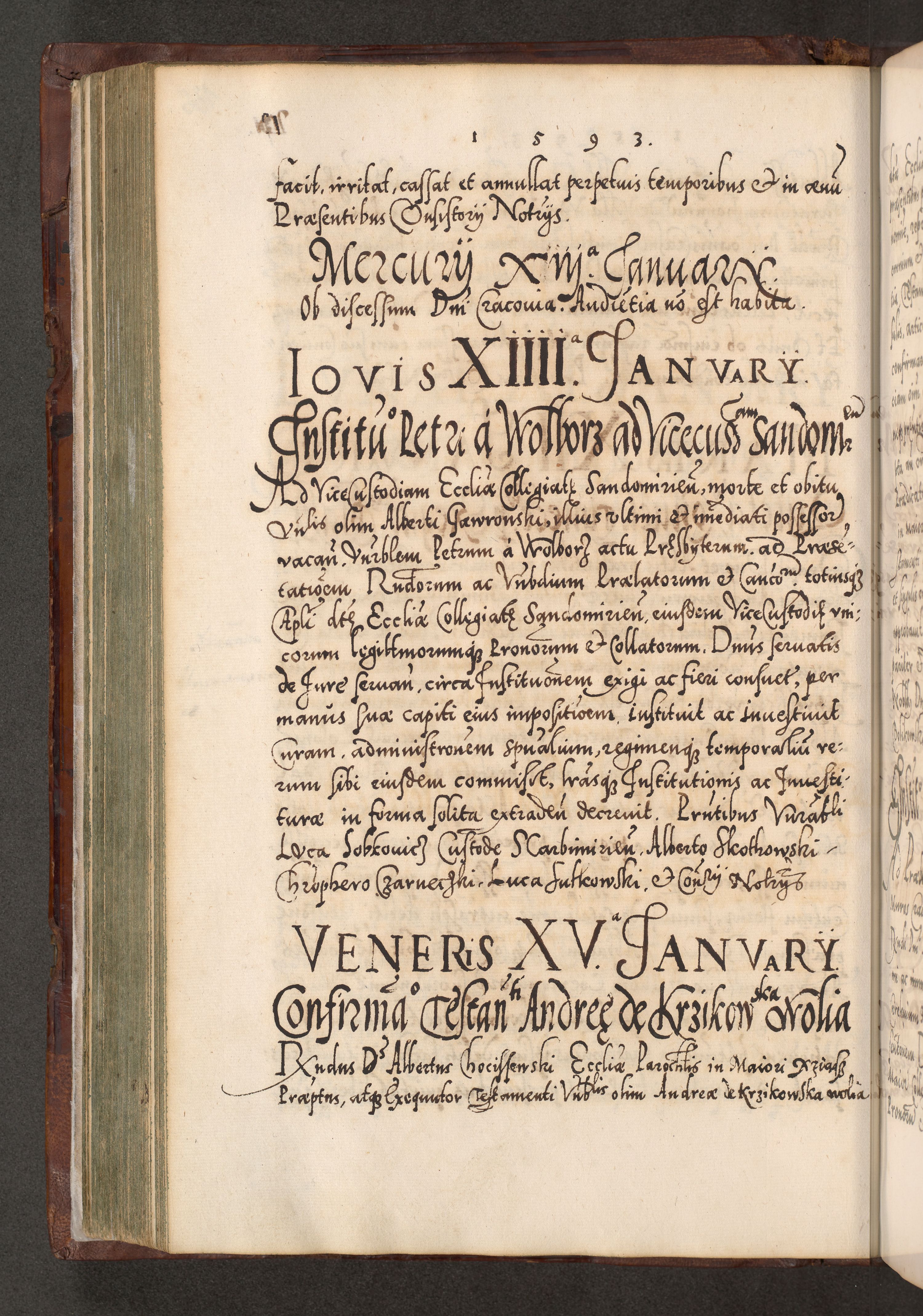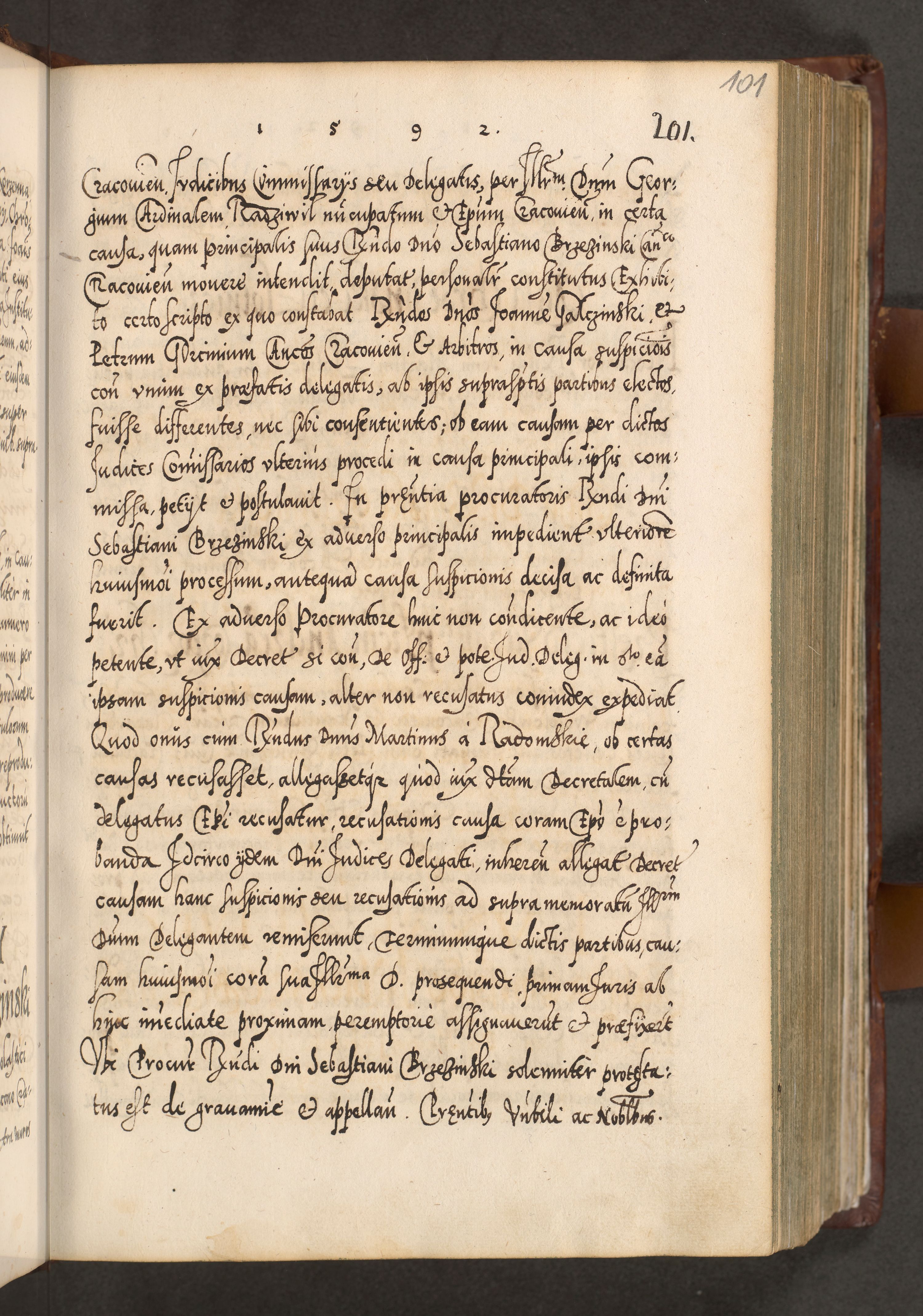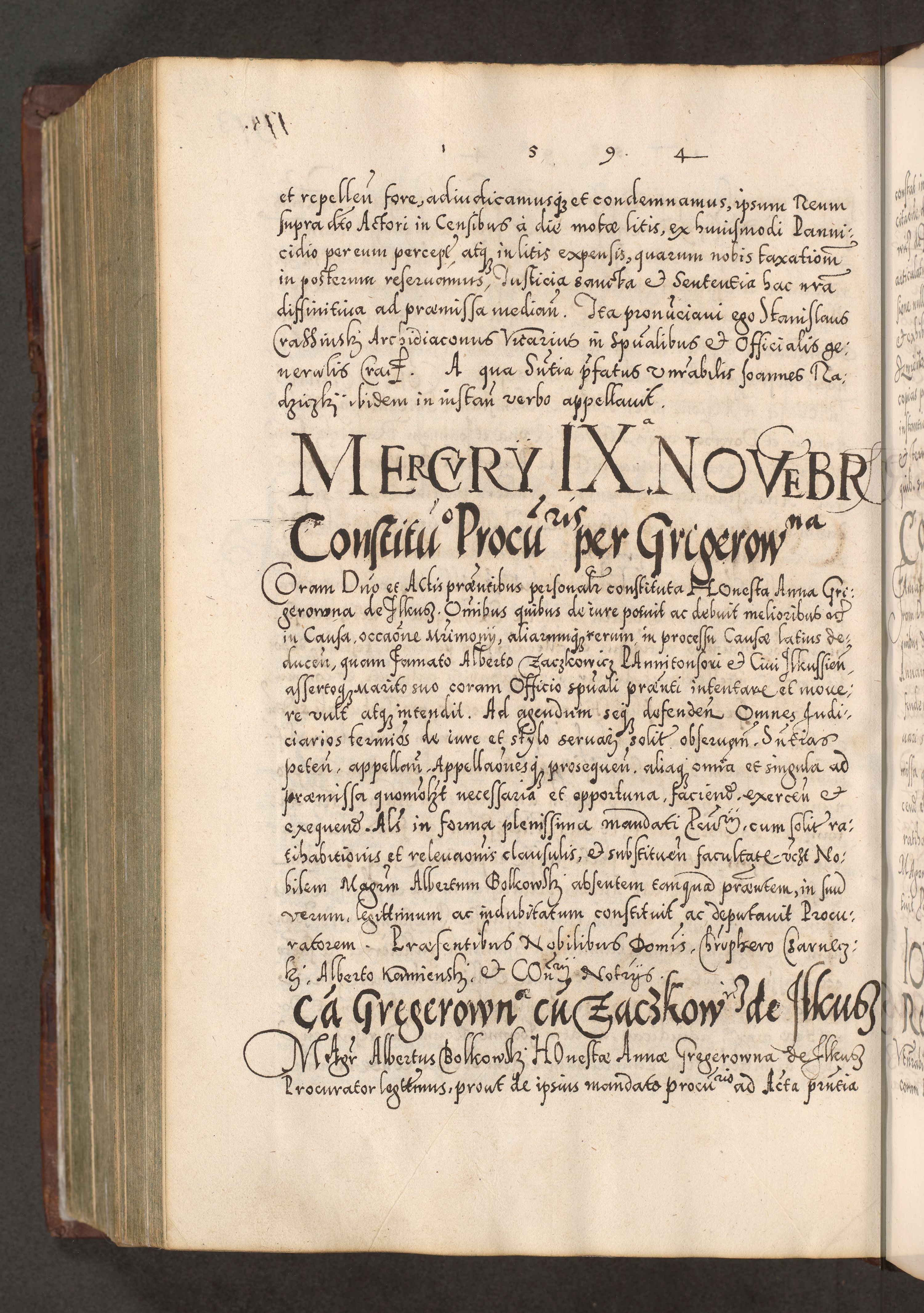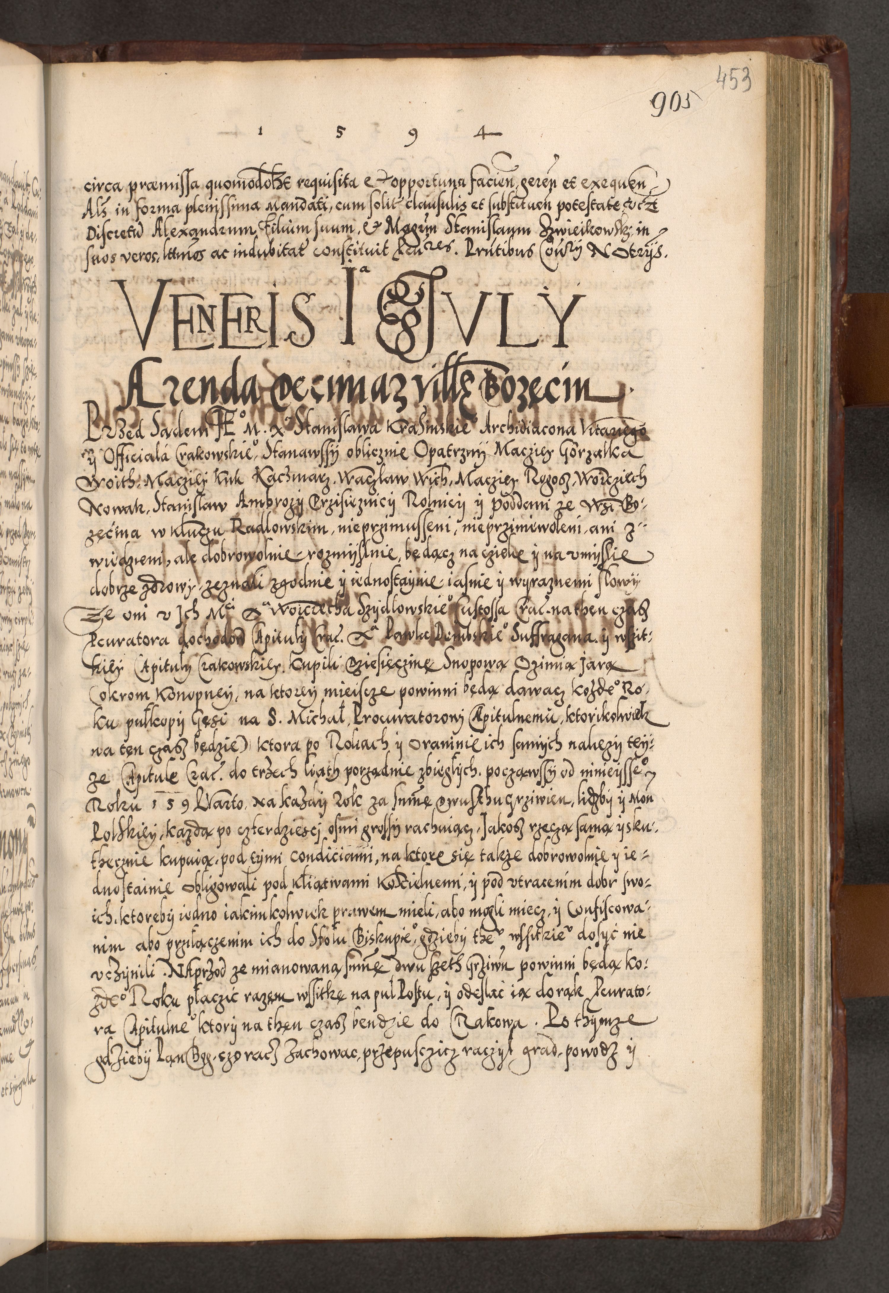 Illistrissimo et revedissimo in Christo Patre Domino Domino Georgio Rzadziwił Miserone Divina Sacrostae R. E. Tituli S. Sixti Presbitero Cardinali Duce in Olyka et Niesswiesz ad Gubernacula Ecclessiae Cracoviensis cuius administratorialem a Sancta Sede Apostolica obtinverat feliciter sedente. Acta actorum, causarum, sententiarum tam deffinitivarum quam interloquutoriarum decretorum, obligationum, quietationum, recognitionum, constitutionum procuratorum etc. coram Reverendo Domino Stanislao Crassinskz de Crasne Archidiacono Cracoviensis, Scholastico Gnesnesis, Custode Plocensis etc. Vicario et Officiali Generali Cracoviensi in Ano Domini Millesimo Quingentesimo Nonagesimo Primo cuius indictio quarta pontificatus SS. Domini Nostri Gregorii XIIII Anno I psius prio feliciter incipiut