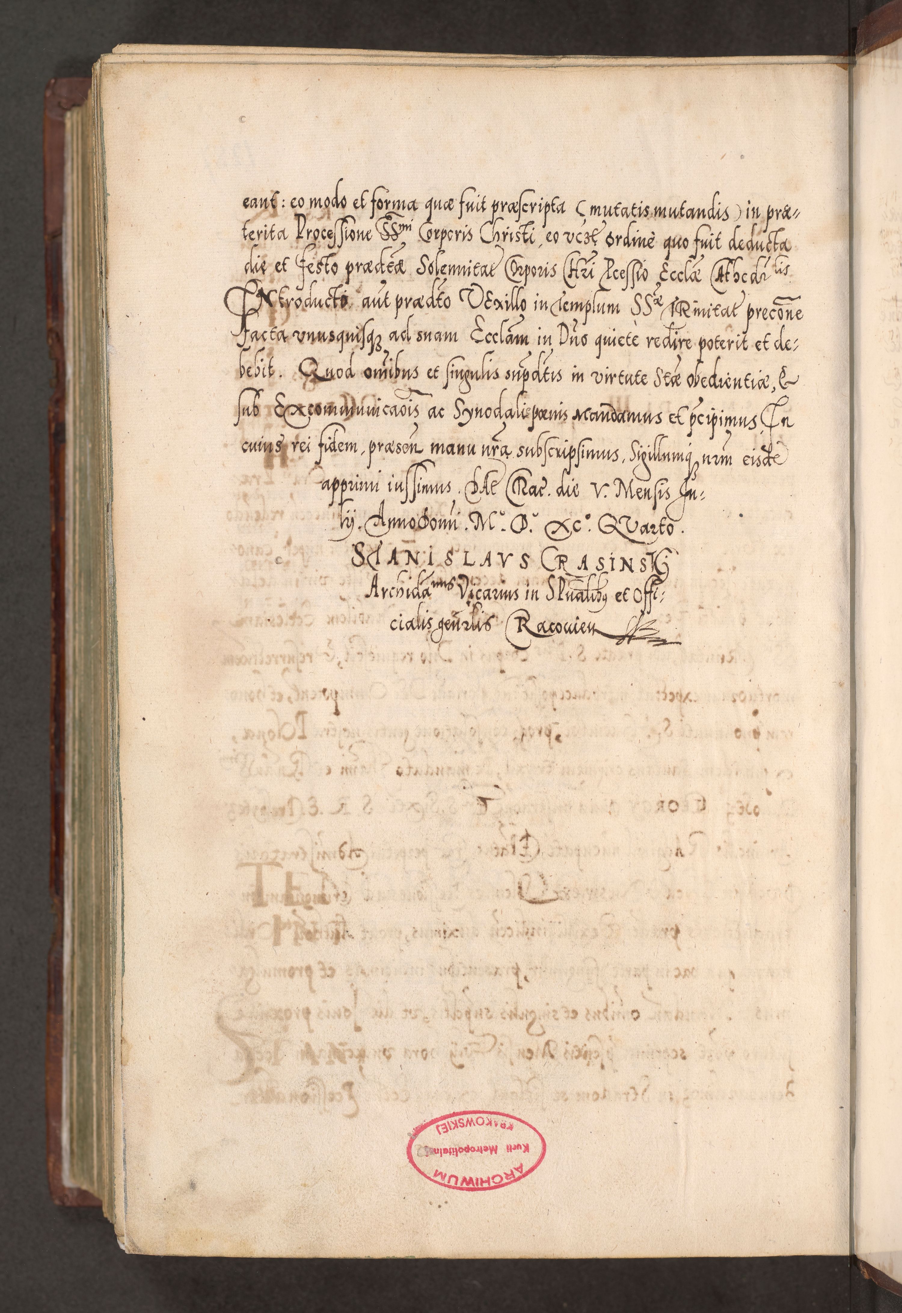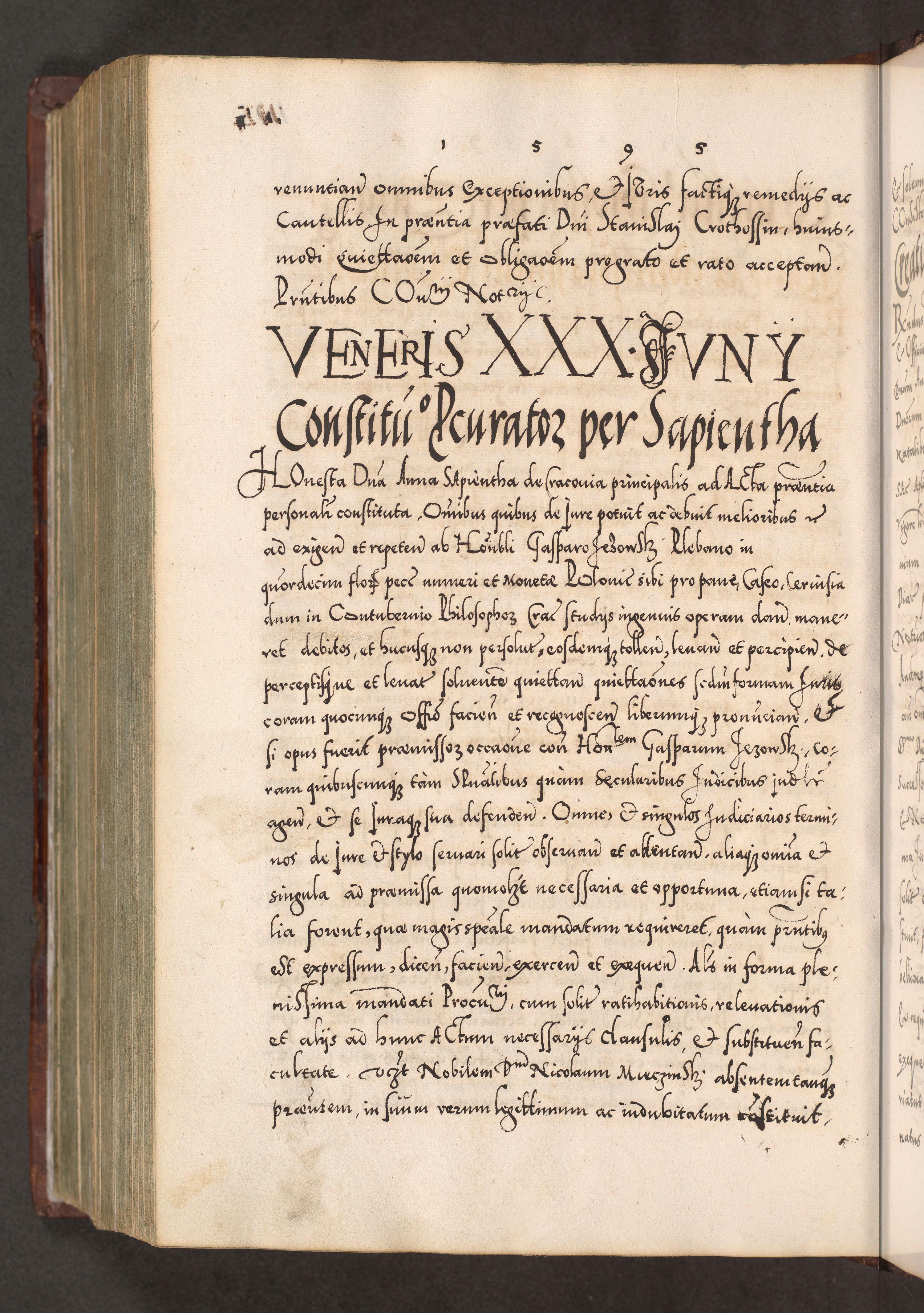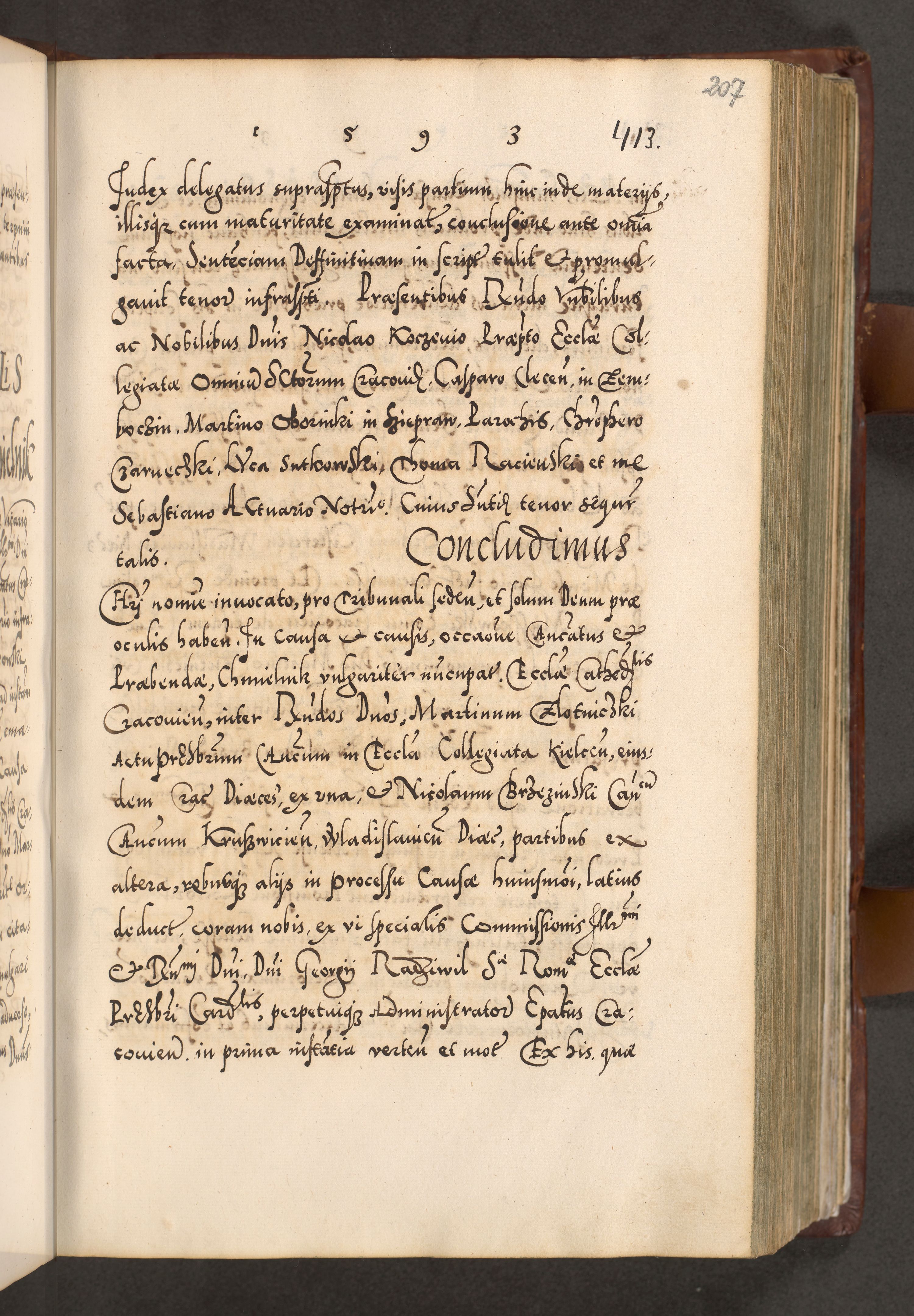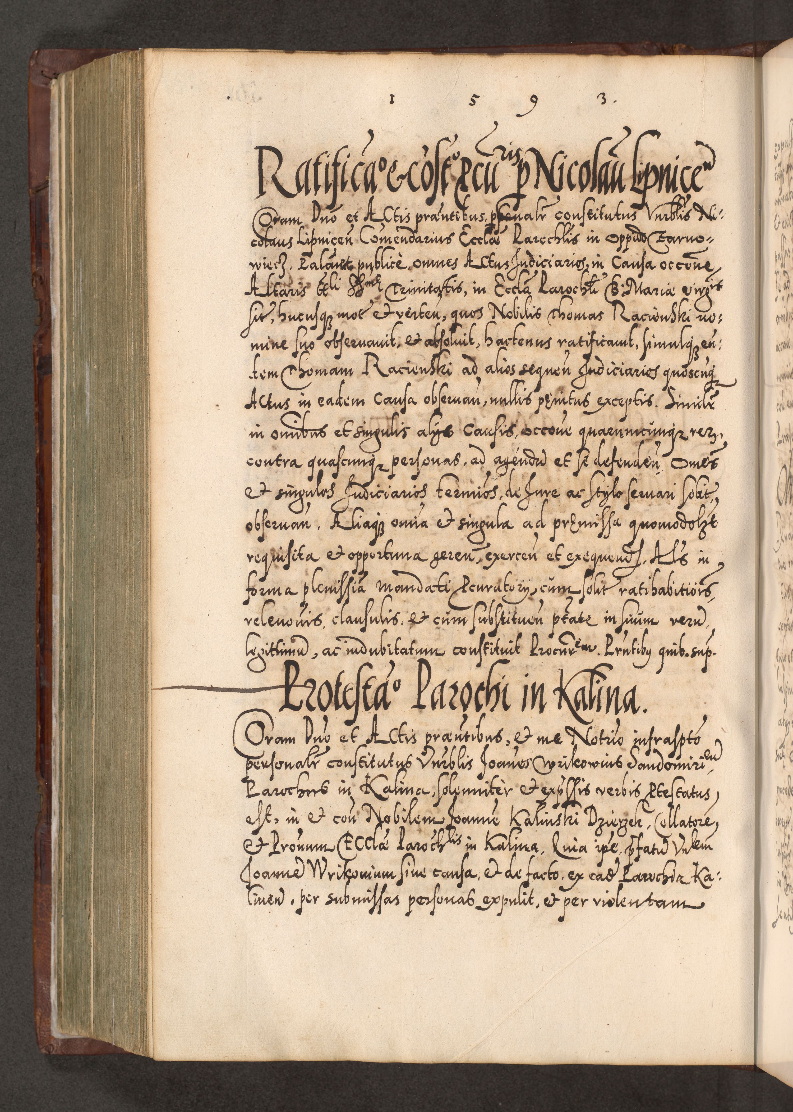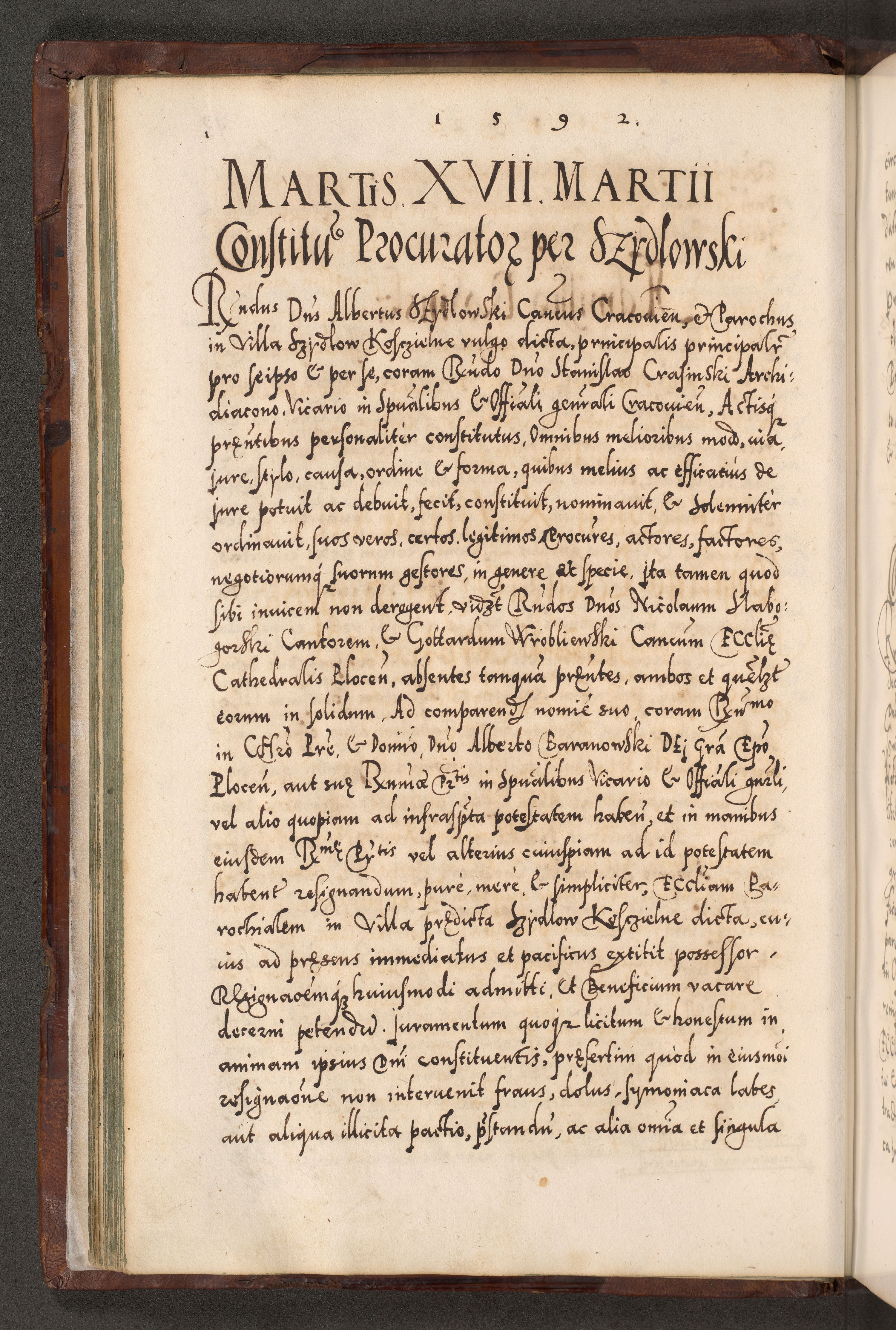 Illistrissimo et revedissimo in Christo Patre Domino Domino Georgio Rzadziwił Miserone Divina Sacrostae R. E. Tituli S. Sixti Presbitero Cardinali Duce in Olyka et Niesswiesz ad Gubernacula Ecclessiae Cracoviensis cuius administratorialem a Sancta Sede Apostolica obtinverat feliciter sedente. Acta actorum, causarum, sententiarum tam deffinitivarum quam interloquutoriarum decretorum, obligationum, quietationum, recognitionum, constitutionum procuratorum etc. coram Reverendo Domino Stanislao Crassinskz de Crasne Archidiacono Cracoviensis, Scholastico Gnesnesis, Custode Plocensis etc. Vicario et Officiali Generali Cracoviensi in Ano Domini Millesimo Quingentesimo Nonagesimo Primo cuius indictio quarta pontificatus SS. Domini Nostri Gregorii XIIII Anno I psius prio feliciter incipiut