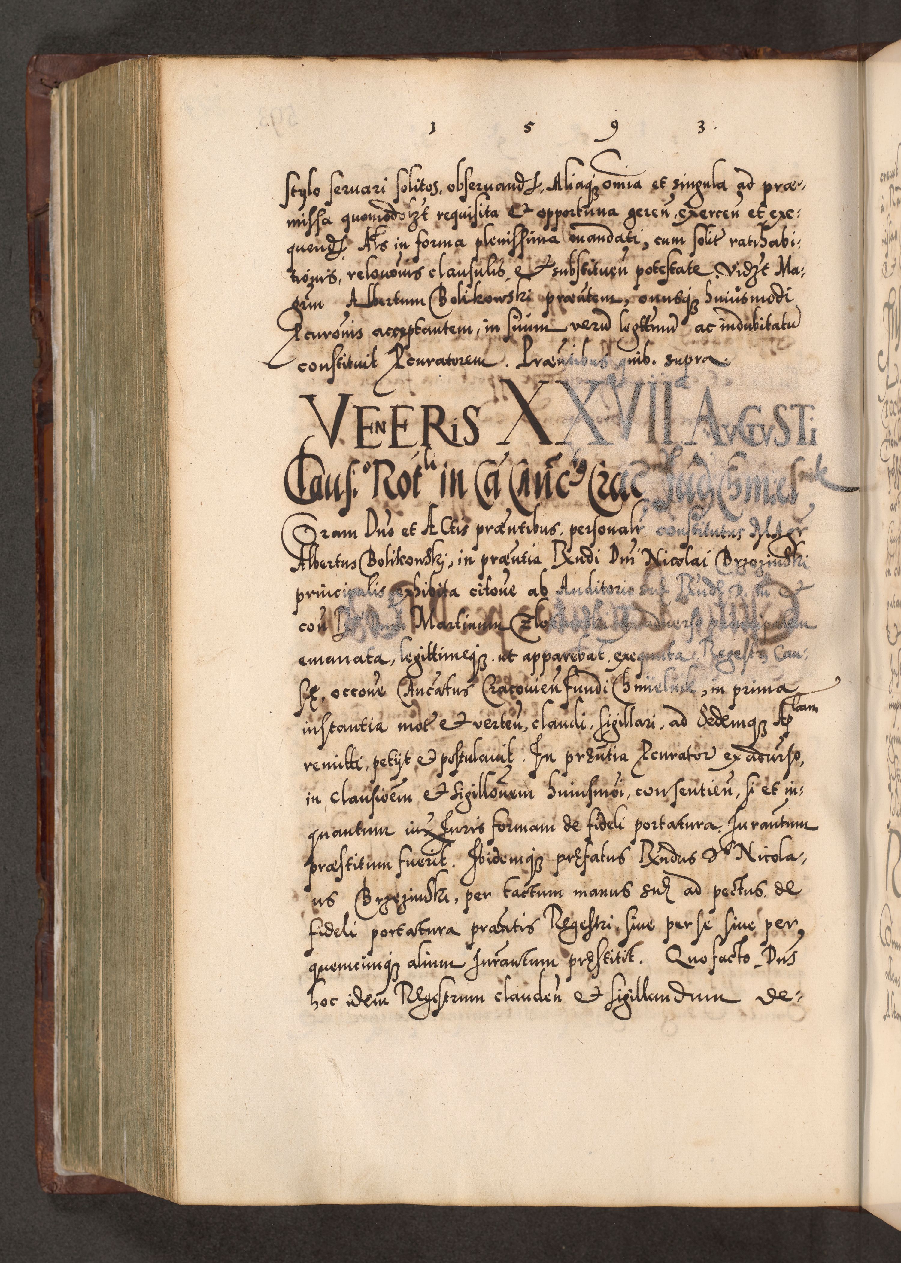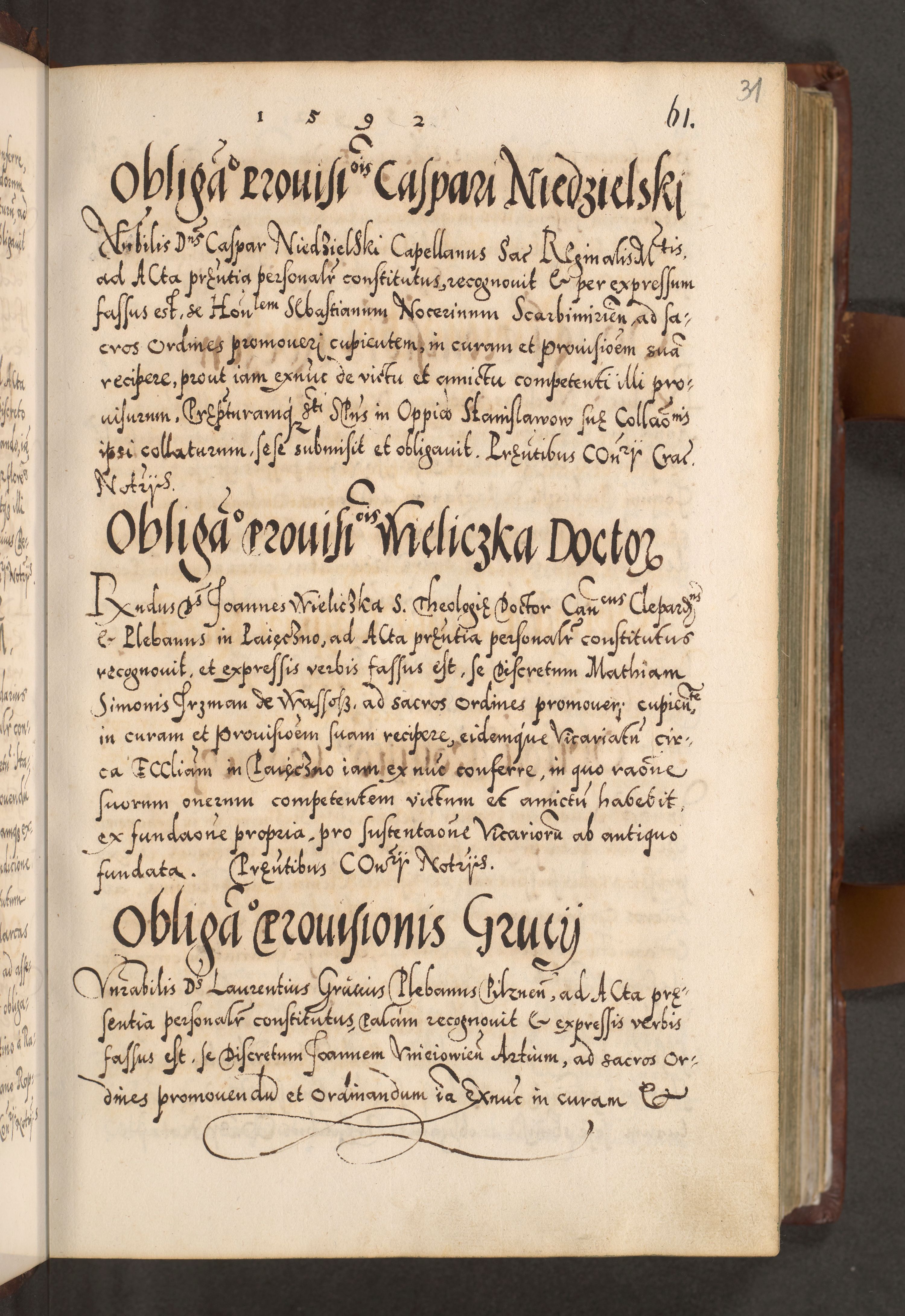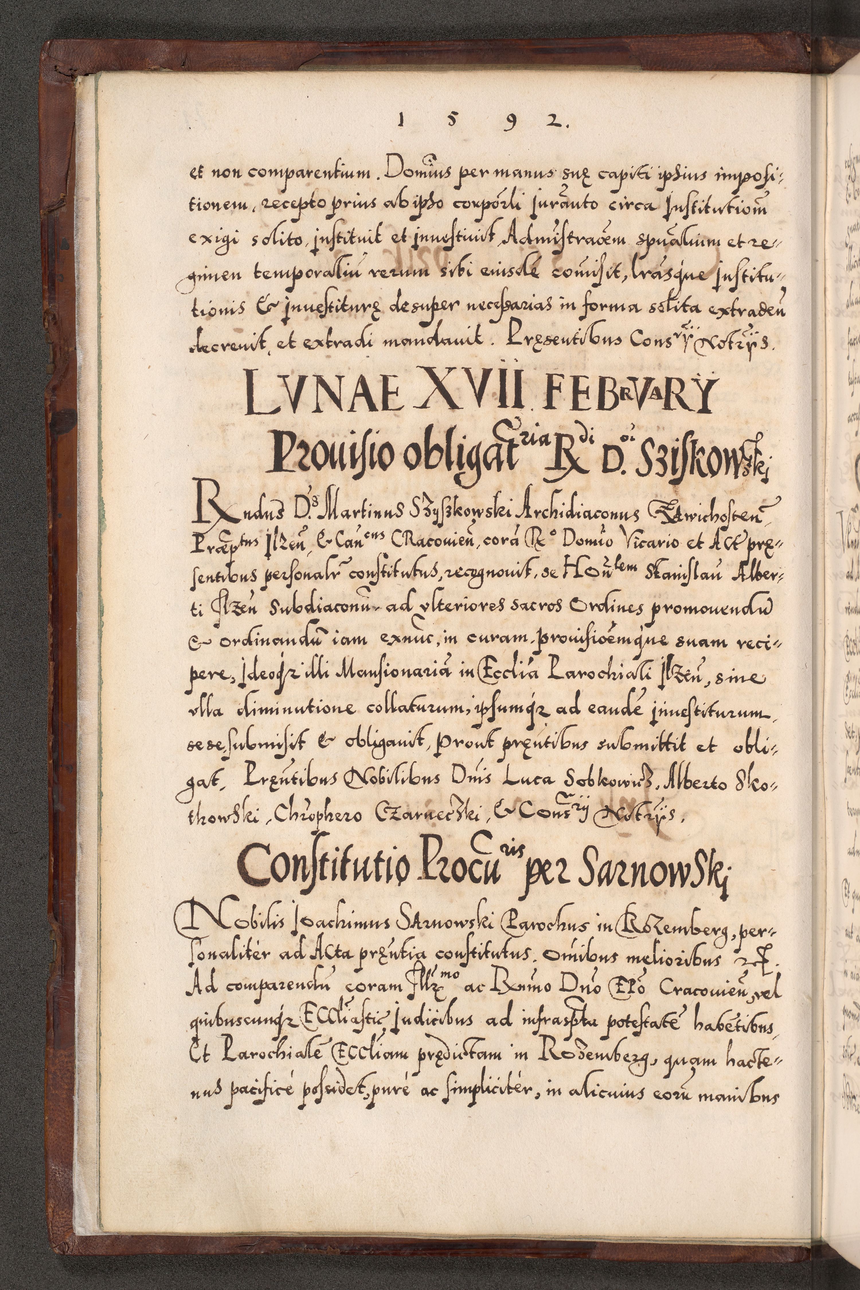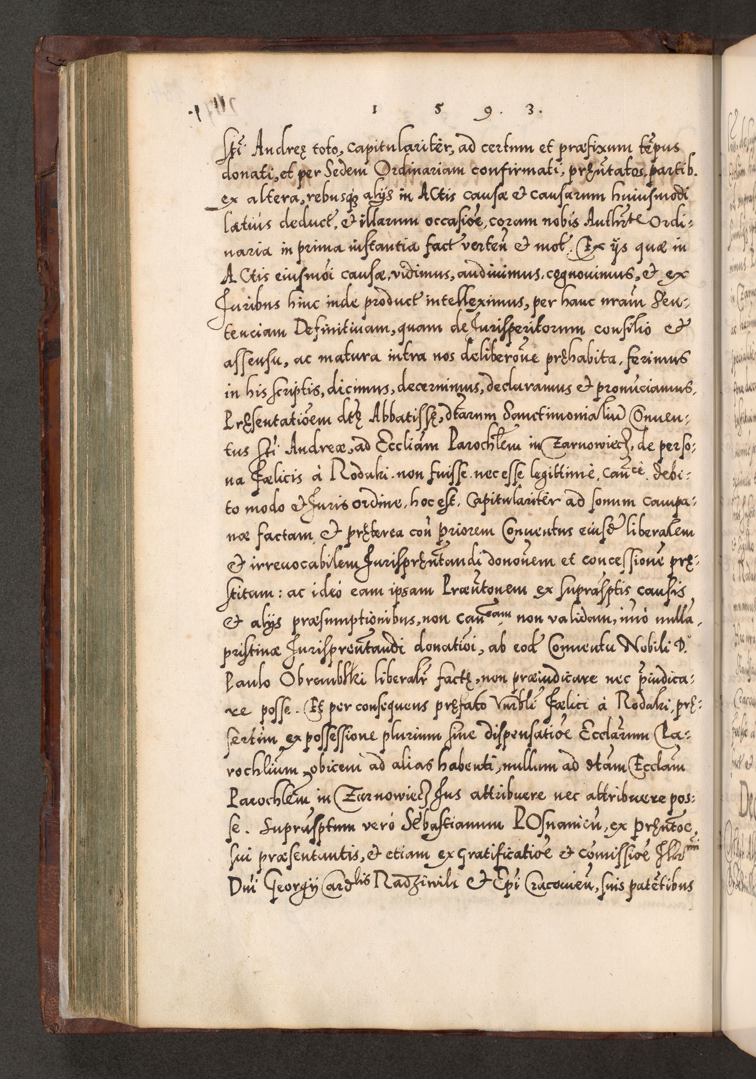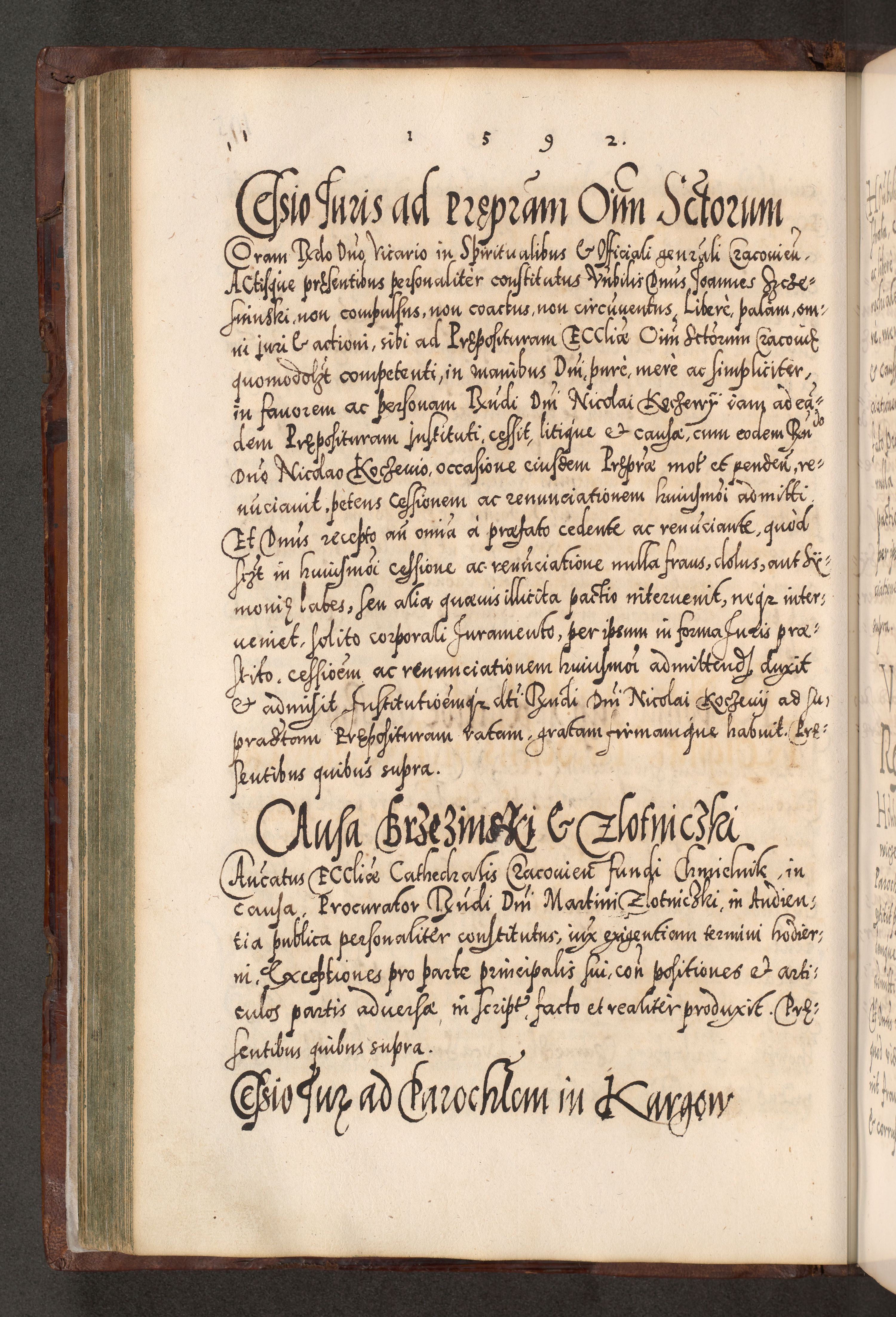 Illistrissimo et revedissimo in Christo Patre Domino Domino Georgio Rzadziwił Miserone Divina Sacrostae R. E. Tituli S. Sixti Presbitero Cardinali Duce in Olyka et Niesswiesz ad Gubernacula Ecclessiae Cracoviensis cuius administratorialem a Sancta Sede Apostolica obtinverat feliciter sedente. Acta actorum, causarum, sententiarum tam deffinitivarum quam interloquutoriarum decretorum, obligationum, quietationum, recognitionum, constitutionum procuratorum etc. coram Reverendo Domino Stanislao Crassinskz de Crasne Archidiacono Cracoviensis, Scholastico Gnesnesis, Custode Plocensis etc. Vicario et Officiali Generali Cracoviensi in Ano Domini Millesimo Quingentesimo Nonagesimo Primo cuius indictio quarta pontificatus SS. Domini Nostri Gregorii XIIII Anno I psius prio feliciter incipiut