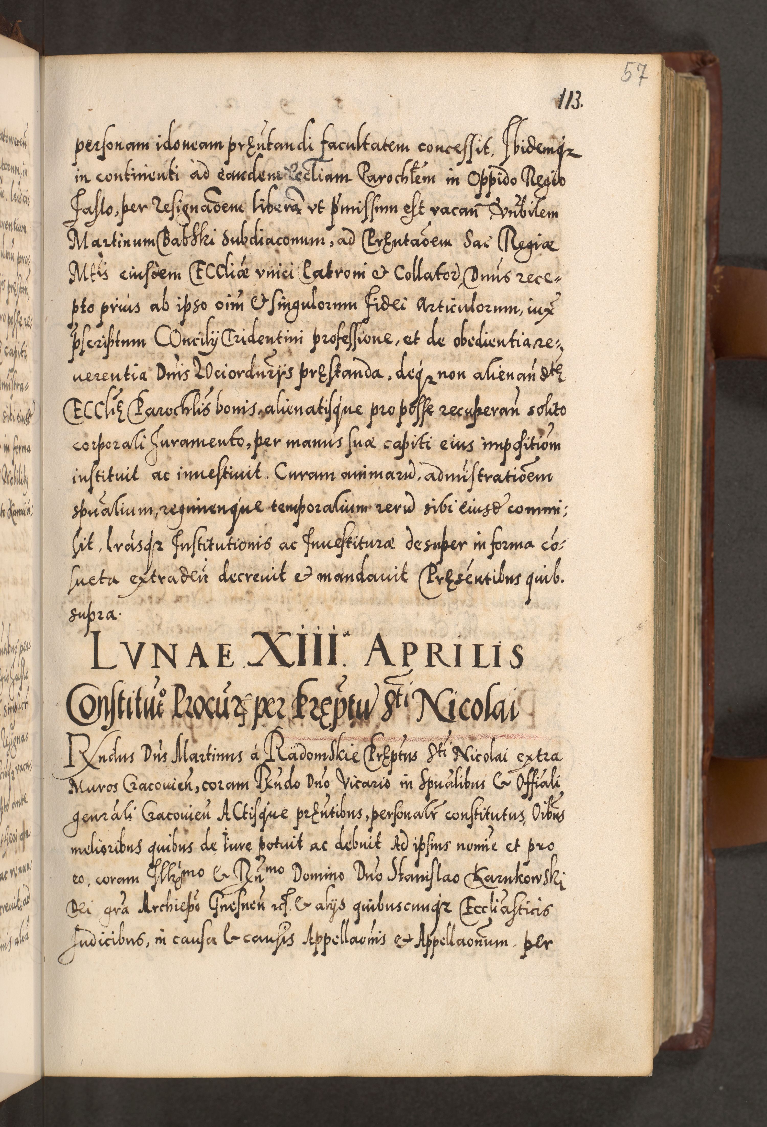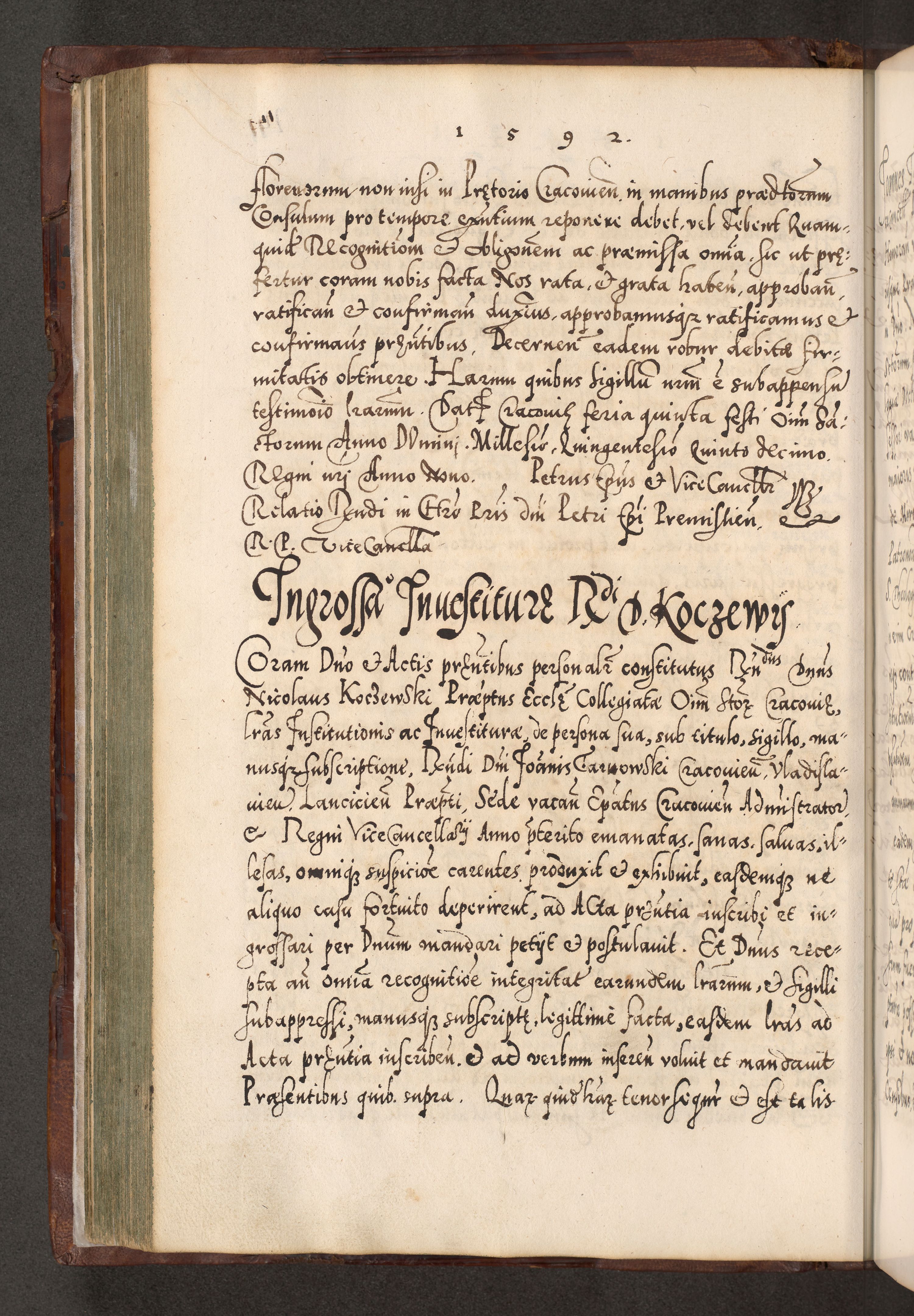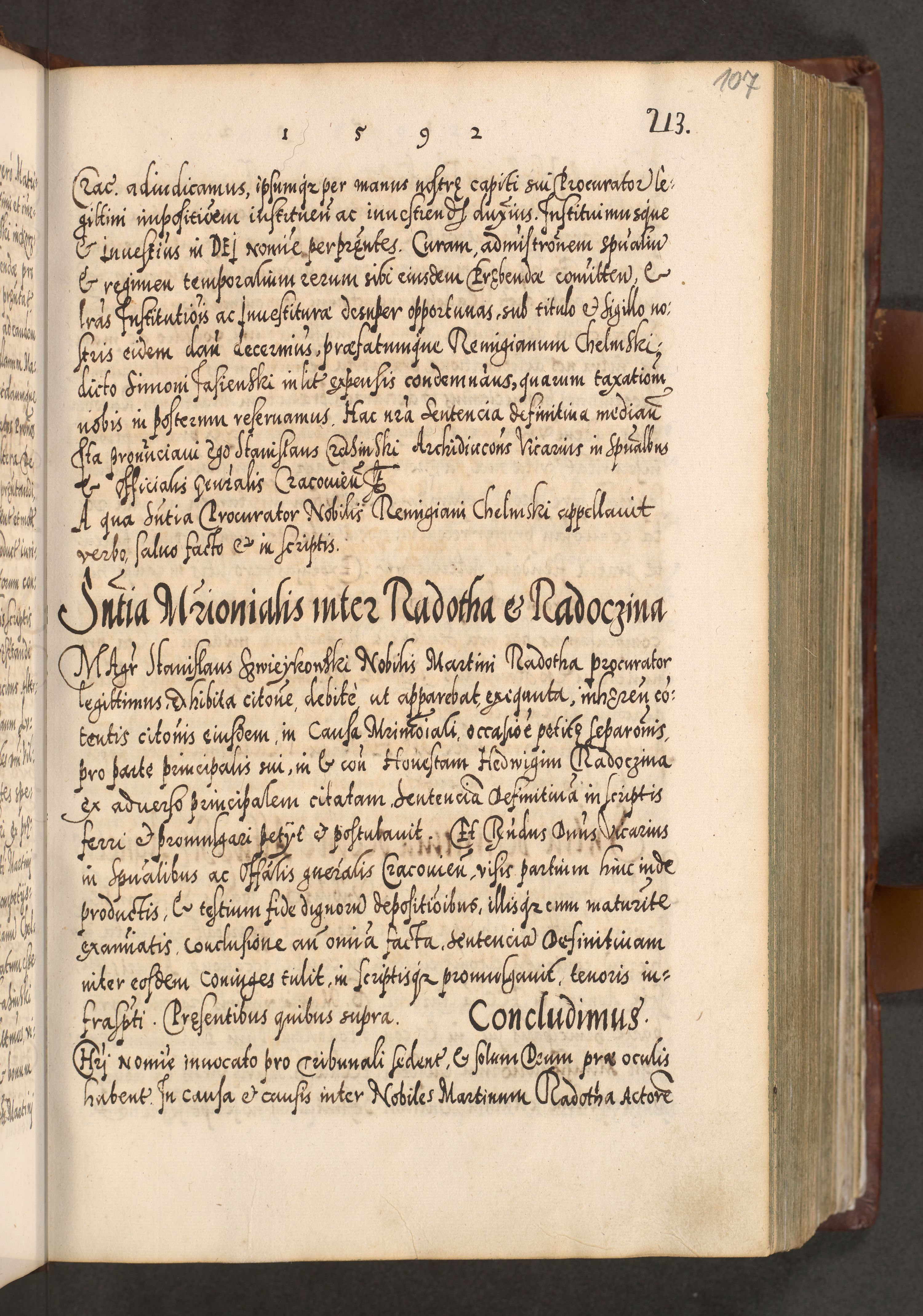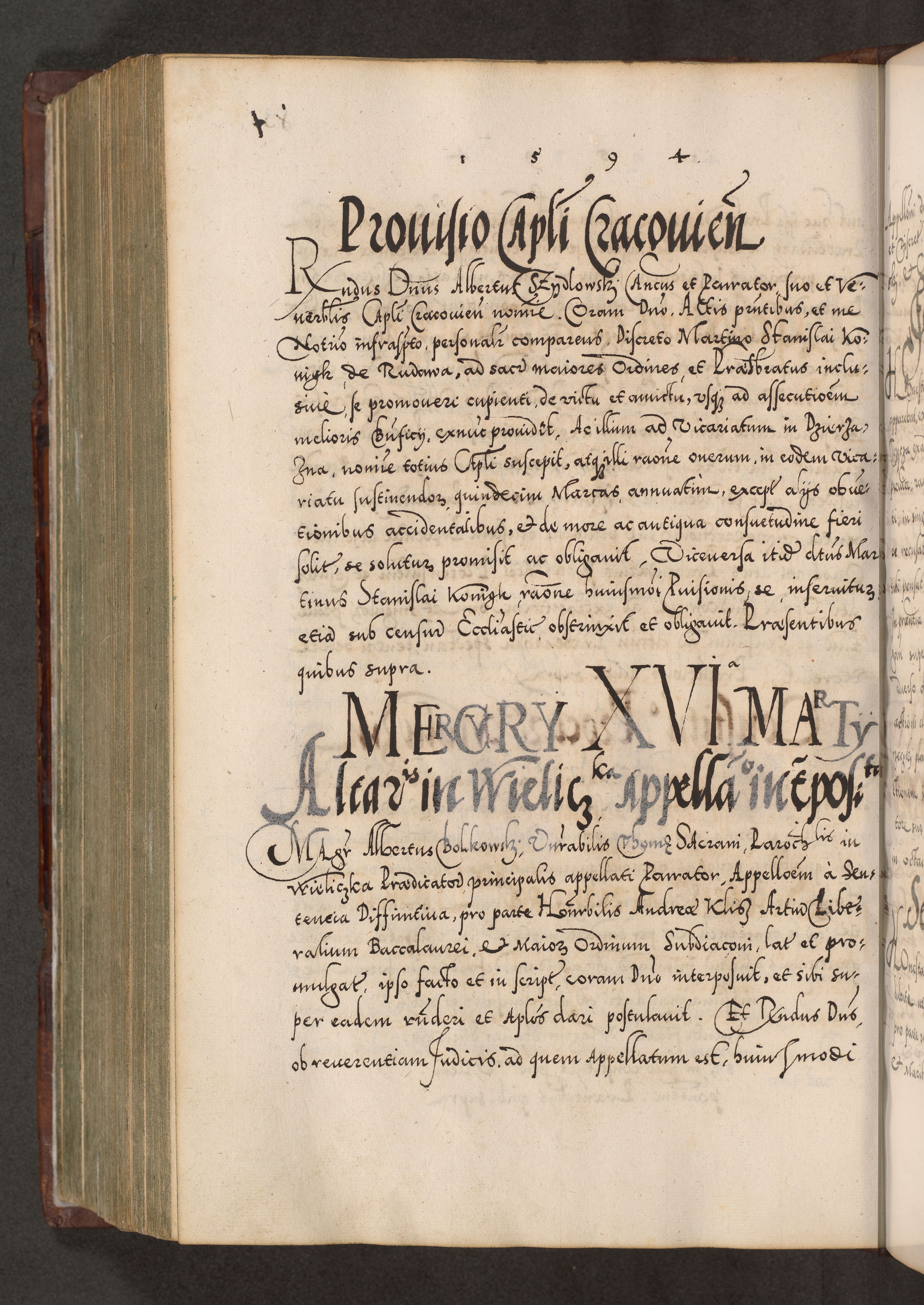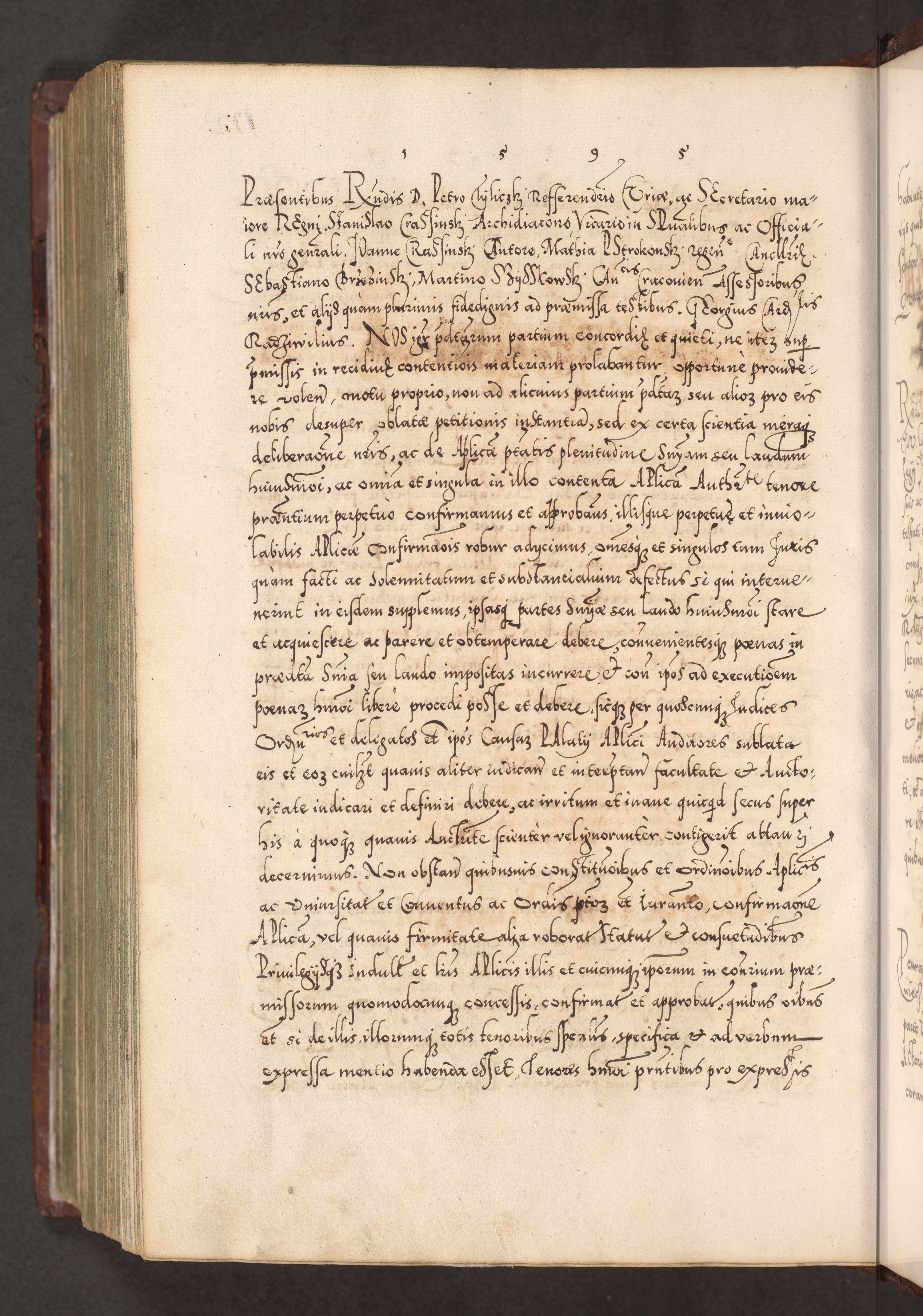 Illistrissimo et revedissimo in Christo Patre Domino Domino Georgio Rzadziwił Miserone Divina Sacrostae R. E. Tituli S. Sixti Presbitero Cardinali Duce in Olyka et Niesswiesz ad Gubernacula Ecclessiae Cracoviensis cuius administratorialem a Sancta Sede Apostolica obtinverat feliciter sedente. Acta actorum, causarum, sententiarum tam deffinitivarum quam interloquutoriarum decretorum, obligationum, quietationum, recognitionum, constitutionum procuratorum etc. coram Reverendo Domino Stanislao Crassinskz de Crasne Archidiacono Cracoviensis, Scholastico Gnesnesis, Custode Plocensis etc. Vicario et Officiali Generali Cracoviensi in Ano Domini Millesimo Quingentesimo Nonagesimo Primo cuius indictio quarta pontificatus SS. Domini Nostri Gregorii XIIII Anno I psius prio feliciter incipiut